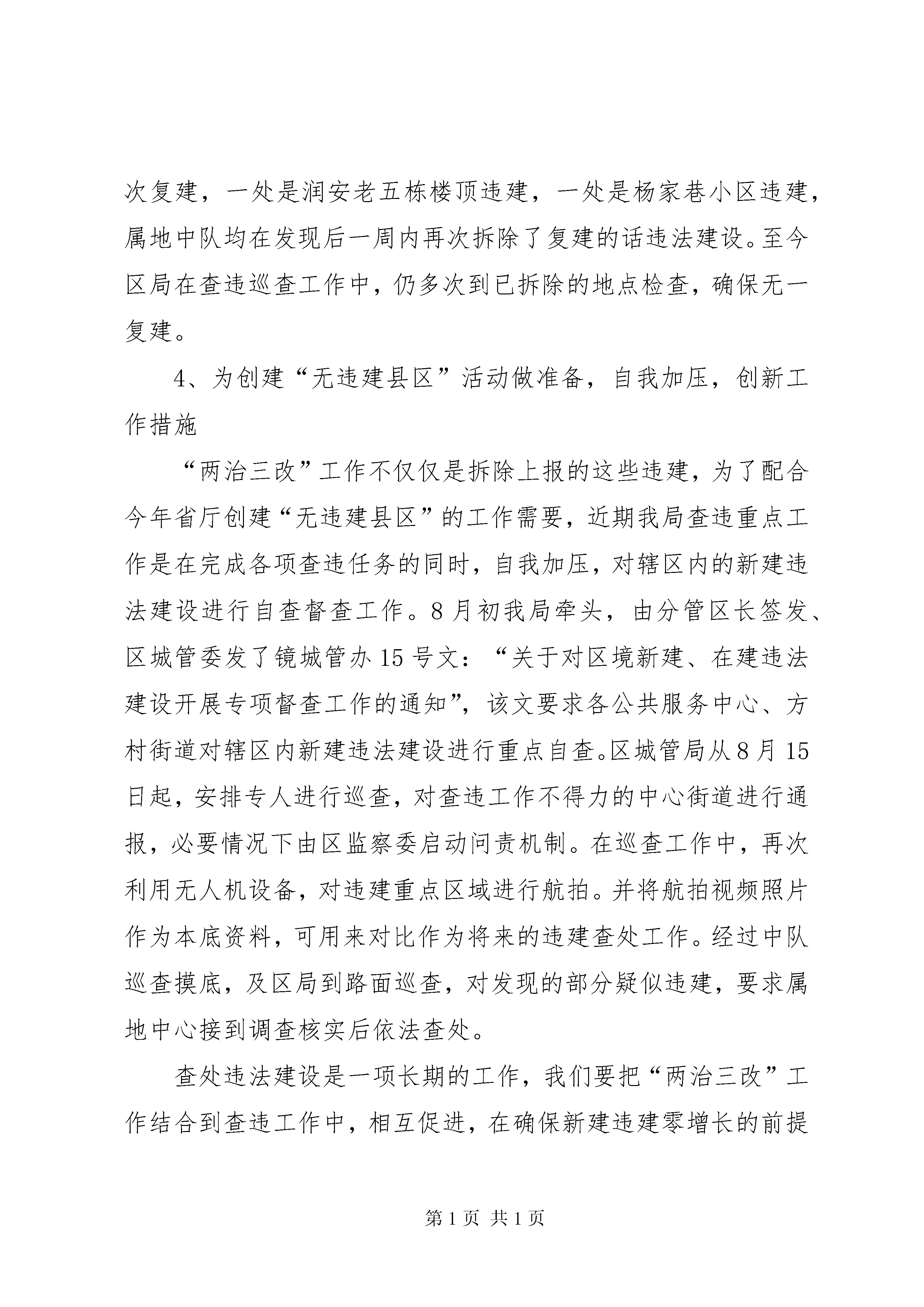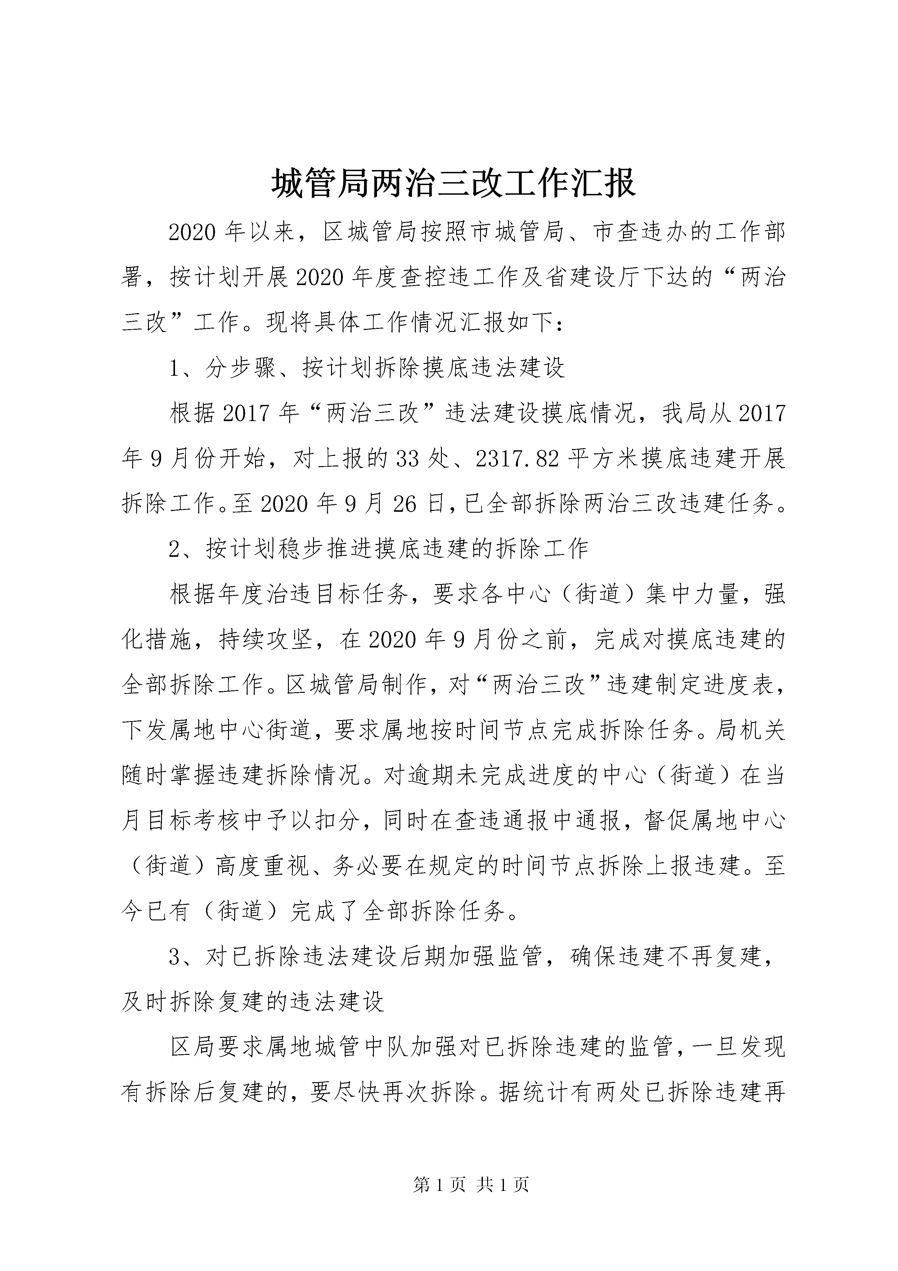 城管局两治三改工作汇报2020年以来,区城管局按照市城管局、市查违办的工作部署,按计划开展2020年度查控违工作及省建设厅下达的“两治三改”工作。现将具体工作情况汇报如下:1、分步骤、按计划拆除摸底违法建设根据2017年“两治三改”违法建设摸底情况,我局从2017年9月份开始,对上报的33处、2317.82平方米摸底违建开展拆除工作。至2020年9月26日,已全部拆除两治三改违建任务。2、按计划稳步推进摸底违建的拆除工作根据年度治违目标任务,要求各中心(街道)集中力量,强化措施,持续攻坚,在2020年9月份之前,完成对摸底违建的全部拆除工作。区城管局制作,对“两治三改”违建制定进度表,下发属地中心街道,要求属地按时间节点完成拆除任务。局机关随时掌握违建拆除情况。对逾期未完成进度的中心(街道)在当月目标考核中予以扣分,同时在查违通报中通报,督促属地中心(街道)高度重视、务必要在规定的时间节点拆除上报违建。至今已有(街道)完成了全部拆除任务。3、对已拆除违法建设后期加强监管,确保违建不再复建,及时拆除复建的违法建设区局要求属地城管中队加强对已拆除违建的监管,一旦发现有拆除后复建的,要尽快再次拆除。据统计有两处已拆除违建再次复建,一处是润安老五栋楼顶违建,一处是杨家巷小区违建,属地中队均在发现后一周内再次拆除了复建的话违法建设。至今区局在查违巡查工作中,仍多次到已拆除的地点检查,确保无一复建。4、为创建“无违建县区”活动做准备,自我加压,创新工作措施“两治三改”工作不仅仅是拆除上报的这些违建,为了配合今年省厅创建“无违建县区”的工作需要,近期我局查违重点工作是在完成各项查违任务的同时,自我加压,对辖区内的新建违法建设进行自查督查工作。8月初我局牵头,由分管区长签发、区城管委发了镜城管办15号文:“关于对区境新建、在建违法建设开展专项督查工作的通知”,该文要求各公共服务中心、方村街道对辖区内新建违法建设进行重点自查。区城管局从8月15日起,安排专人进行巡查,对查违工作不得力的中心街道进行通报,必要情况下由区监察委启动问责机制。在巡查工作中,再次利用无人机设备,对违建重点区域进行航拍。并将航拍视频照片作为本底资料,可用来对比作为将来的违建查处工作。经过中队巡查摸底,及区局到路面巡查,对发现的部分疑似违建,要求属地中心接到调查核实后依法查处。查处违法建设是一项长期的工作,我们要把“两治三改”工作结合到查违工作中,相互促进,在确保新建违建零增长的前提下,按照上级部署,逐步消化存量违法建设,力争取得查违更大的成绩。