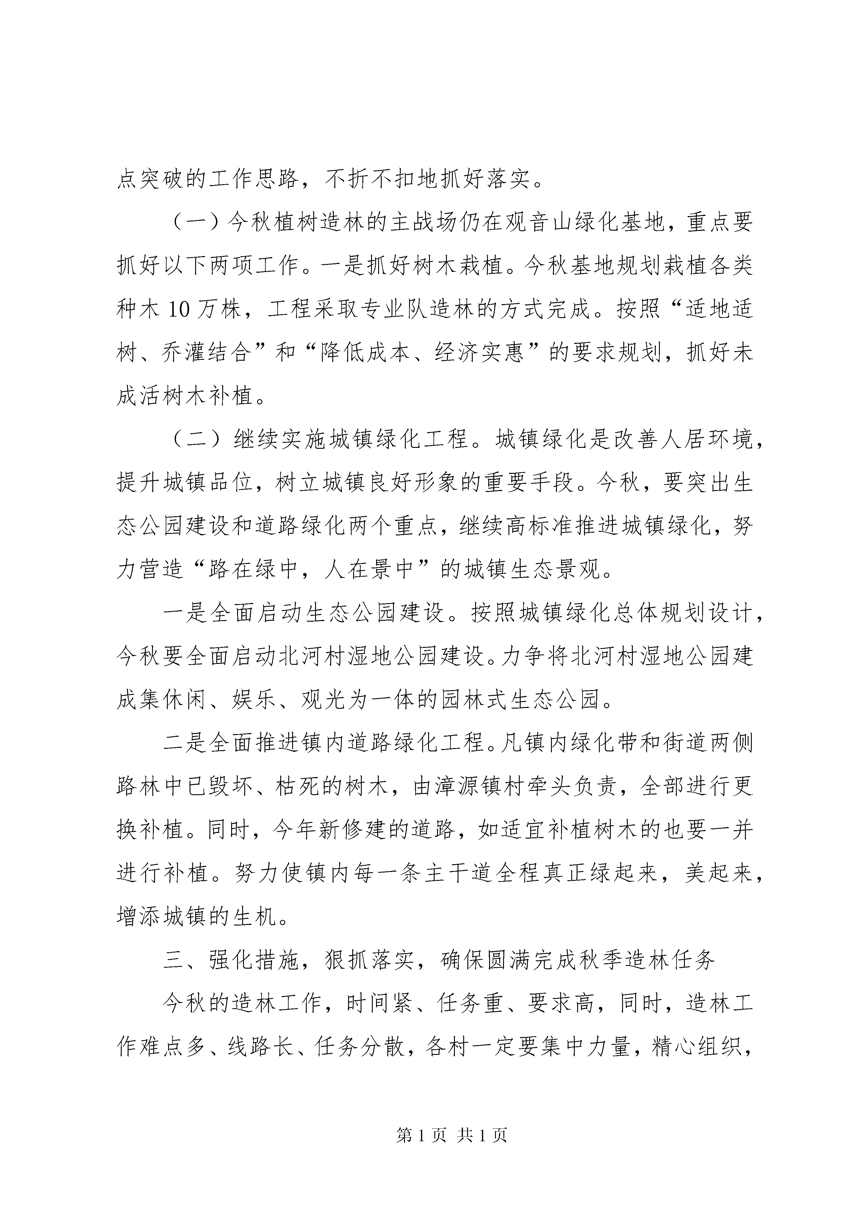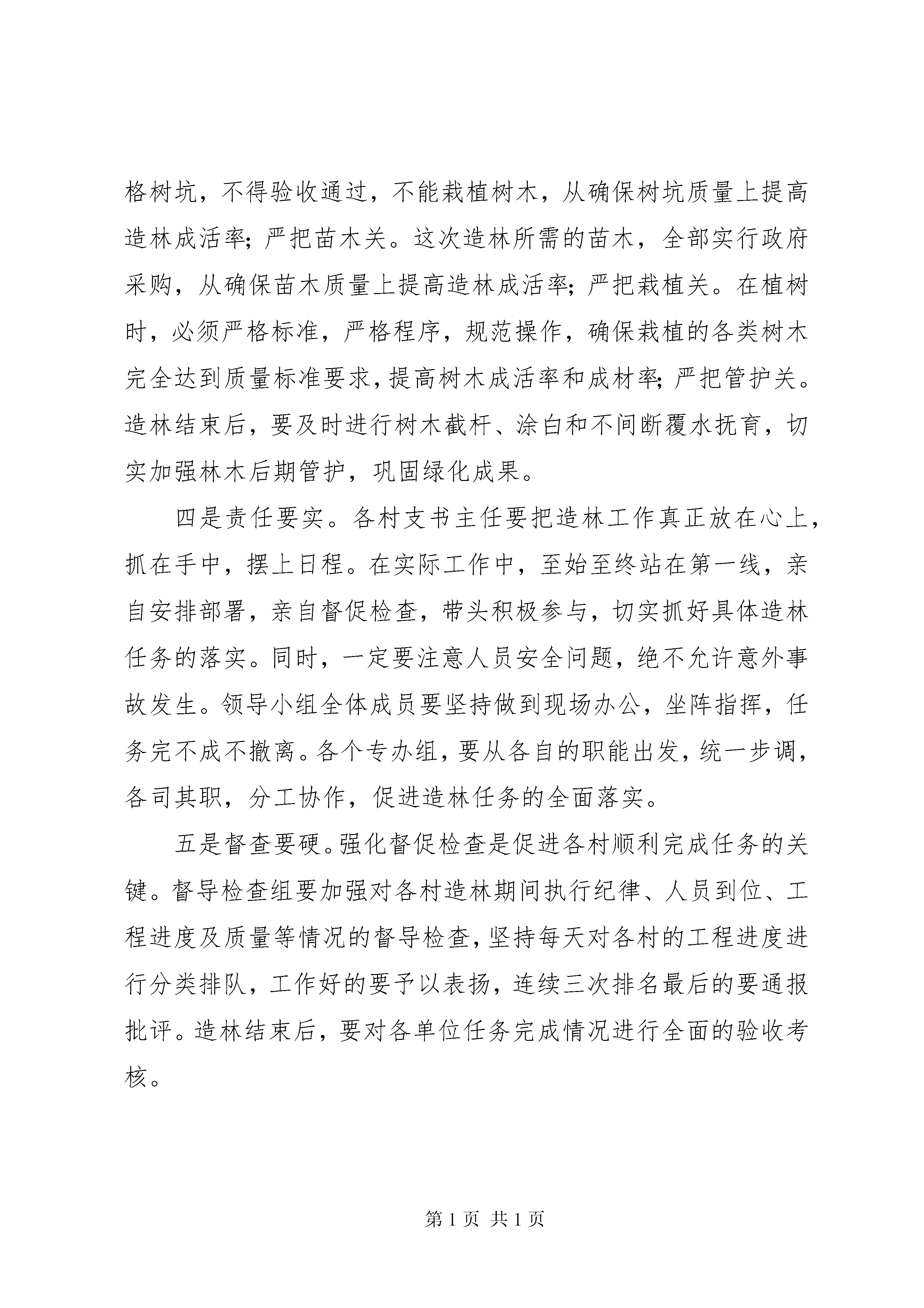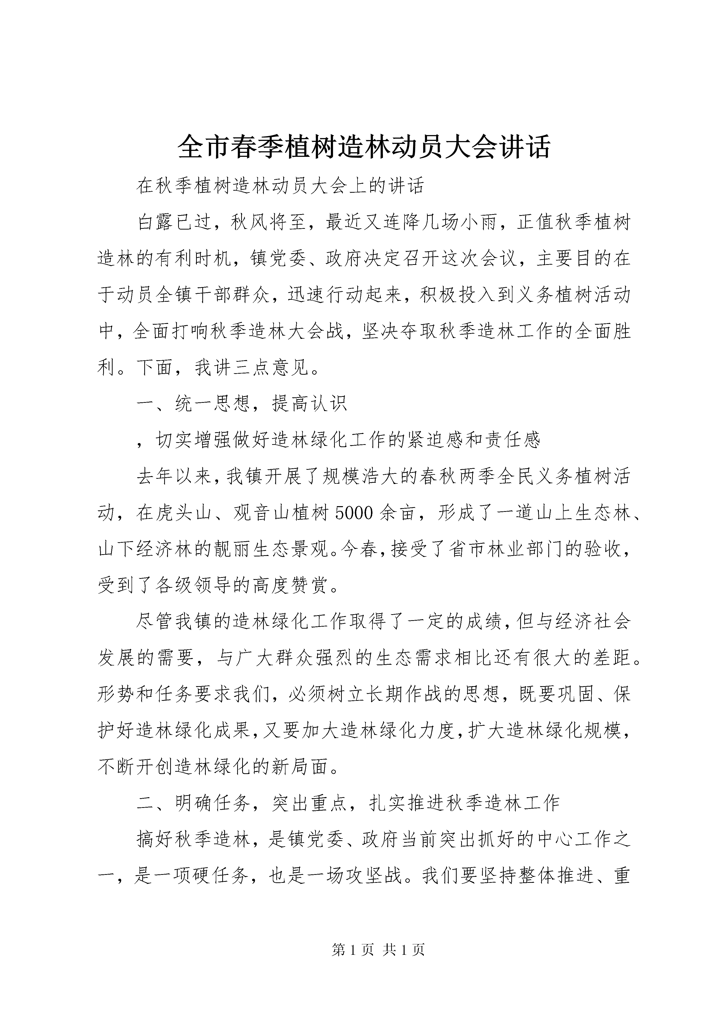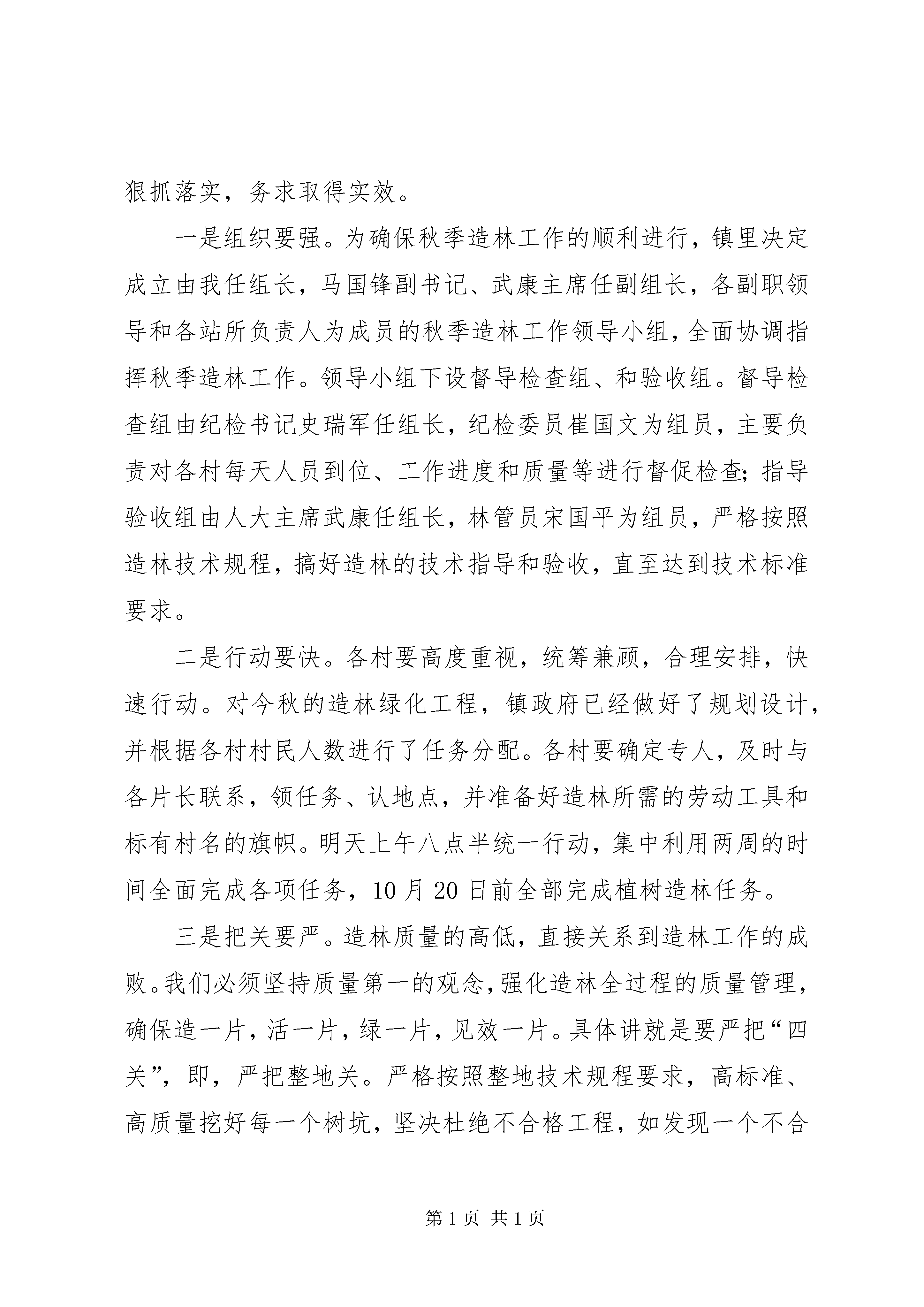 全市春季植树造林动员大会讲话在秋季植树造林动员大会上的讲话白露已过,秋风将至,最近又连降几场小雨,正值秋季植树造林的有利时机,镇党委、政府决定召开这次会议,主要目的在于动员全镇干部群众,迅速行动起来,积极投入到义务植树活动中,全面打响秋季造林大会战,坚决夺取秋季造林工作的全面胜利。下面,我讲三点意见。一、统一思想,提高认识,切实增强做好造林绿化工作的紧迫感和责任感去年以来,我镇开展了规模浩大的春秋两季全民义务植树活动,在虎头山、观音山植树5000余亩,形成了一道山上生态林、山下经济林的靓丽生态景观。今春,接受了省市林业部门的验收,受到了各级领导的高度赞赏。尽管我镇的造林绿化工作取得了一定的成绩,但与经济社会发展的需要,与广大群众强烈的生态需求相比还有很大的差距。形势和任务要求我们,必须树立长期作战的思想,既要巩固、保护好造林绿化成果,又要加大造林绿化力度,扩大造林绿化规模,不断开创造林绿化的新局面。二、明确任务,突出重点,扎实推进秋季造林工作搞好秋季造林,是镇党委、政府当前突出抓好的中心工作之一,是一项硬任务,也是一场攻坚战。我们要坚持整体推进、重点突破的工作思路,不折不扣地抓好落实。(一)今秋植树造林的主战场仍在观音山绿化基地,重点要抓好以下两项工作。一是抓好树木栽植。今秋基地规划栽植各类种木10万株,工程采取专业队造林的方式完成。按照“适地适树、乔灌结合”和“降低成本、经济实惠”的要求规划,抓好未成活树木补植。(二)继续实施城镇绿化工程。城镇绿化是改善人居环境,提升城镇品位,树立城镇良好形象的重要手段。今秋,要突出生态公园建设和道路绿化两个重点,继续高标准推进城镇绿化,努力营造“路在绿中,人在景中”的城镇生态景观。一是全面启动生态公园建设。按照城镇绿化总体规划设计,今秋要全面启动北河村湿地公园建设。力争将北河村湿地公园建成集休闲、娱乐、观光为一体的园林式生态公园。二是全面推进镇内道路绿化工程。凡镇内绿化带和街道两侧路林中已毁坏、枯死的树木,由漳源镇村牵头负责,全部进行更换补植。同时,今年新修建的道路,如适宜补植树木的也要一并进行补植。努力使镇内每一条主干道全程真正绿起来,美起来,增添城镇的生机。三、强化措施,狠抓落实,确保圆满完成秋季造林任务今秋的造林工作,时间紧、任务重、要求高,同时,造林工作难点多、线路长、任务分散,各村一定要集中力量,精心组织,狠抓落实,务求取得实效。一是组织要强。为确保秋季造林工作的顺利进行,镇里决定成立由我任组长,马国锋副书记、武康主席任副组长,各副职领导和各站所负责人为成员的秋季造林工作领导小组,全面协调指挥秋季造林工作。领导小组下设督导检查组、和验收组。督导检查组由纪检书记史瑞军任组长,纪检委员崔国文为组员,主要负责对各村每天人员到位、工作进度和质量等进行督促检查;指导验收组由人大主席武康任组长,林管员宋国平为组员,严格按照造林技术规程,搞好造林的技术指导和验收,直至达到技术标准要求。二是行动要快。各村要高度重视,统筹兼顾,合理安排,快速行动。对今秋的造林绿化工程,镇政府已经做好了规划设计,并根据各村村民人数进行了任务分配。各村要确定专人,及时与各片长联系,领任务、认地点,并准备好造林所需的劳动工具和标有村名的旗帜。明天上午八点半统一行动,集中利用两周的时间全面完成各项任务,10月20日前全部完成植树造林任务。三是把关要严。造林质量的高低,直接关系到造林工作的成败。我们必须坚持质量第一的观念,强化造林全过程的质量管理,确保造一片,活一片,绿一片,见效一片。具体讲就是要严把“四关”,即,严把整地关。严格按照整地技术规程要求,高标准、高质量挖好每一个树坑,坚决杜绝不合格工程,如发现一个不合格树坑,不得验收通过,不能栽植树木,从确保树坑质量上提高造林成活率;严把苗木关。这次造林所需的苗木,全部实行政府采购,从确保苗木质量上提高造林成活率;严把栽植关。在植树时,必须严格标准,严格程序,规范操作,确保栽植的各类树木完全达到质量标准要求,提高树木成活率和成材率;严把管护关。造林结束后,要及时进行树木截杆、涂白和不间断覆水抚育,切实加强林木后期管护,巩固绿化成果。四是责任要实。各村支书主任要把造林工作真正放在心上,抓在手中,摆上日程。在实际工作中,至始至终站在第一线,亲自安排部署,亲自督促检查,带头积极参与,切实抓好具体造林任务的落实。同时,一定要注意人员安全问题,绝不允许意外事故发生。领导小组全体成员要坚持做到现场办公,坐阵指挥,任务完不成不撤离。各个专办组,要从各自的职能出发,统一步调,各司其职,分工协作,促进造林任务的全面落实。五是督查要硬。强化督促检查是促进各村顺利完成任务的关键。督导检查组要加强对各村造林期间执行纪律、人员到位、工程进度及质量等情况的督导检查,坚持每天对各