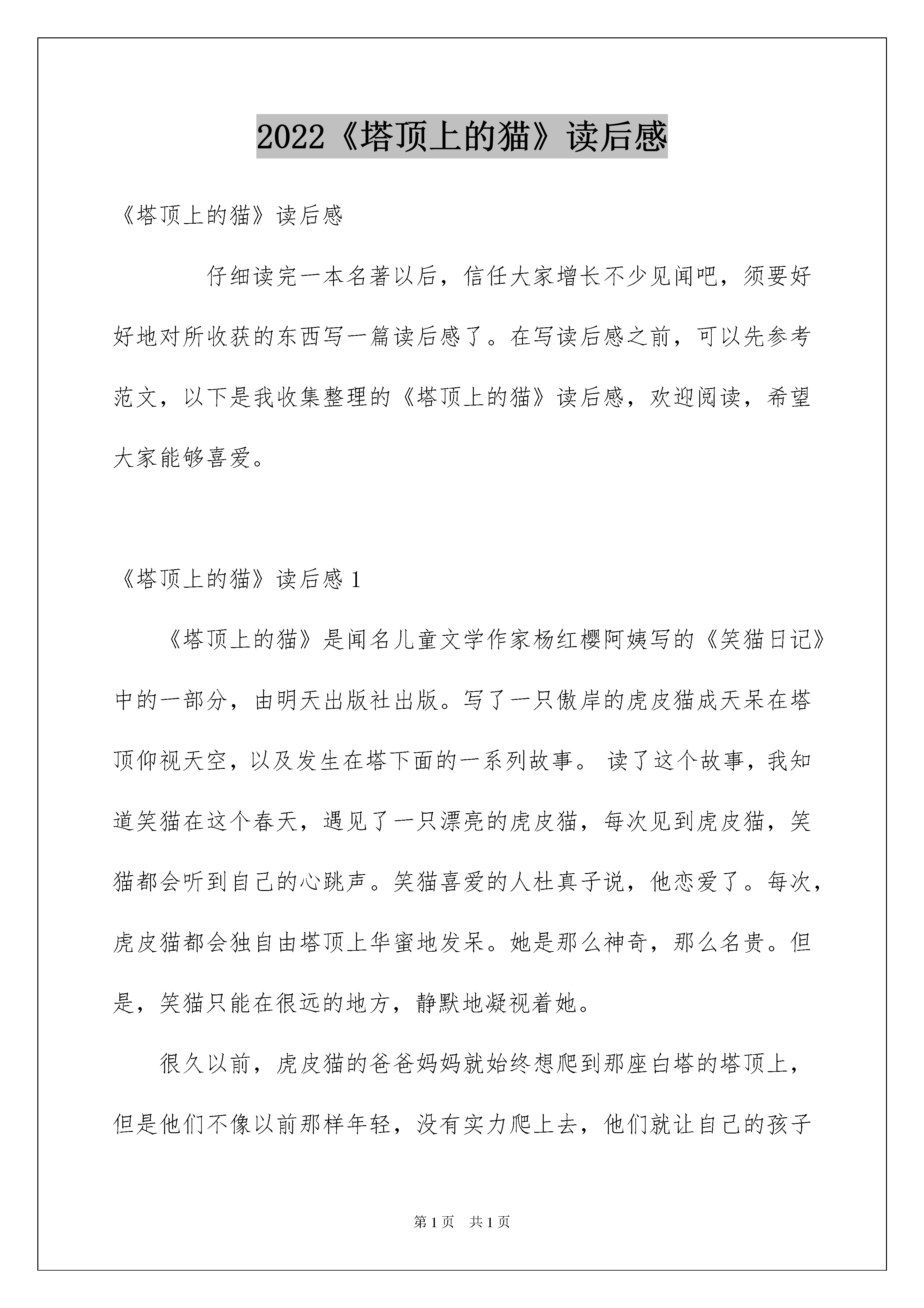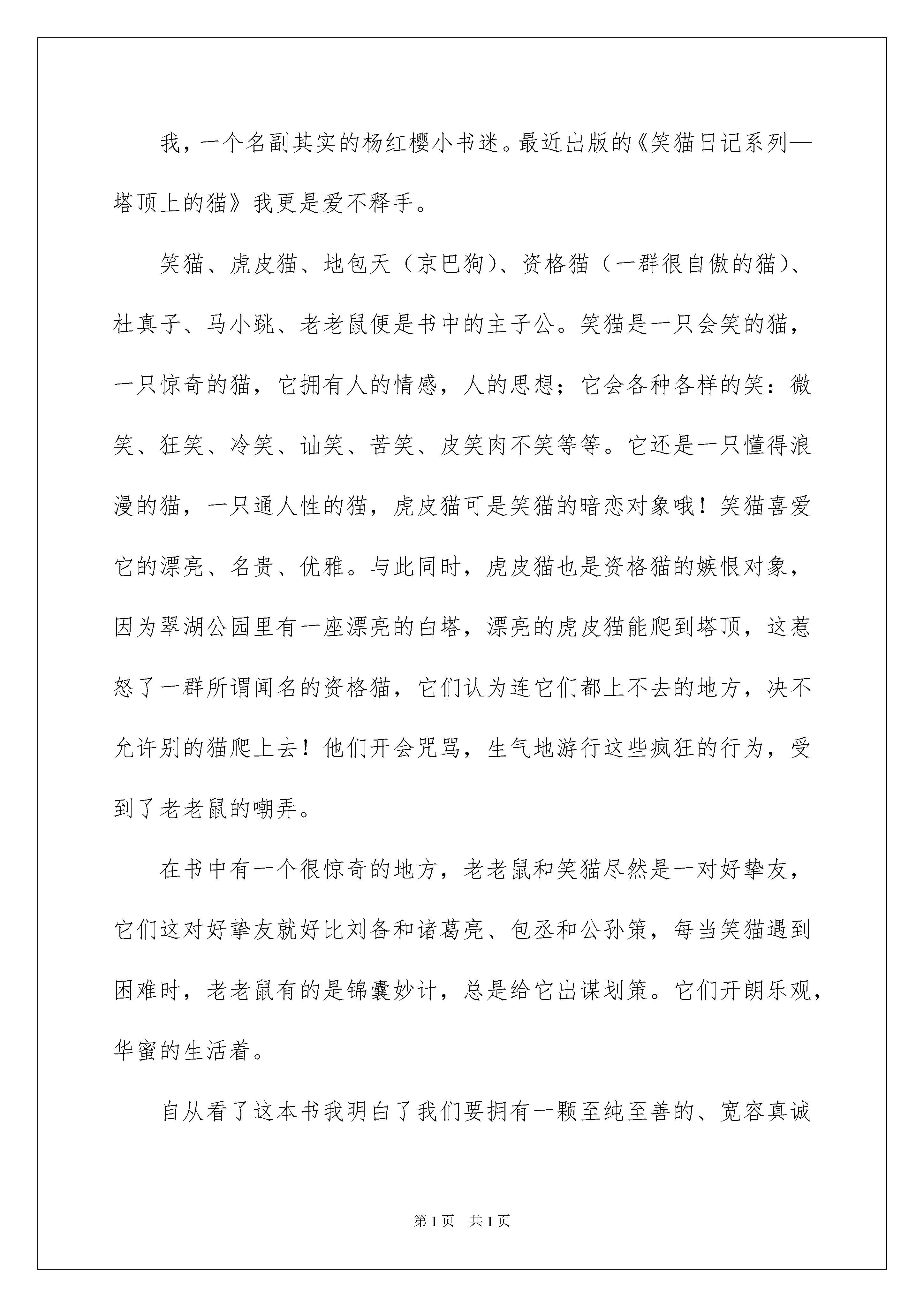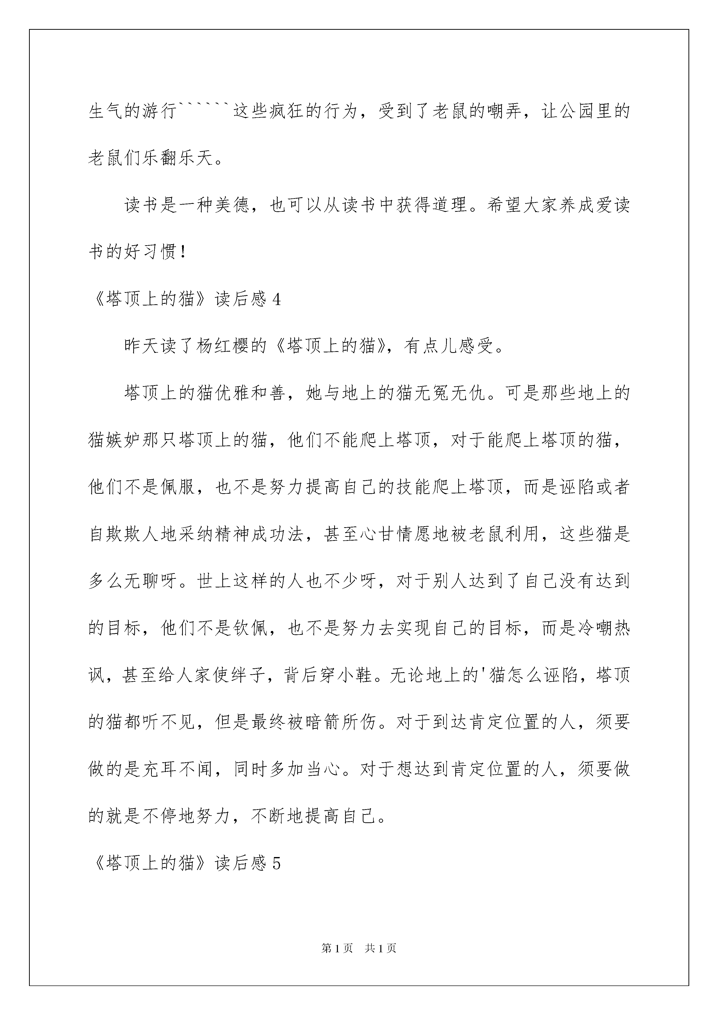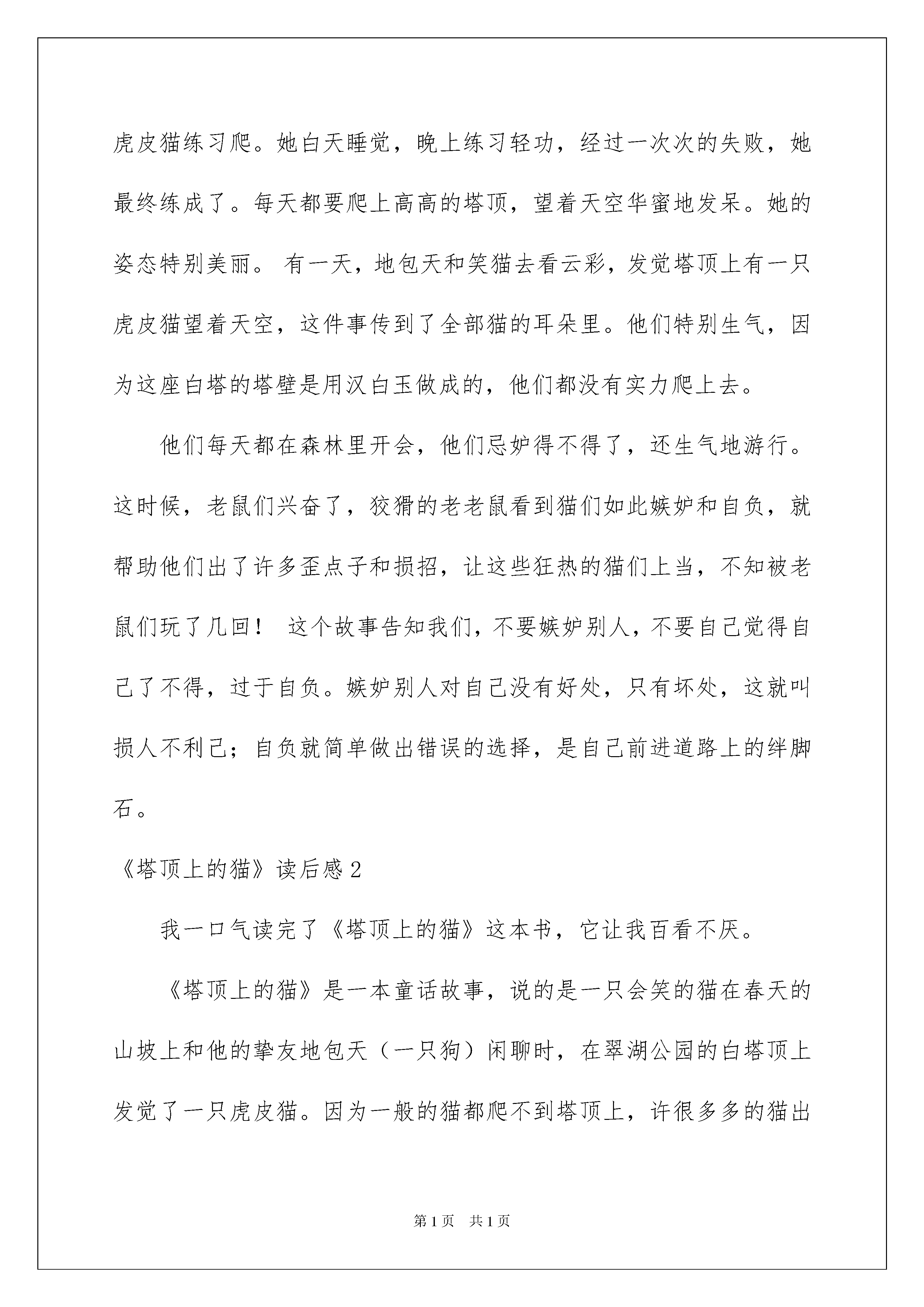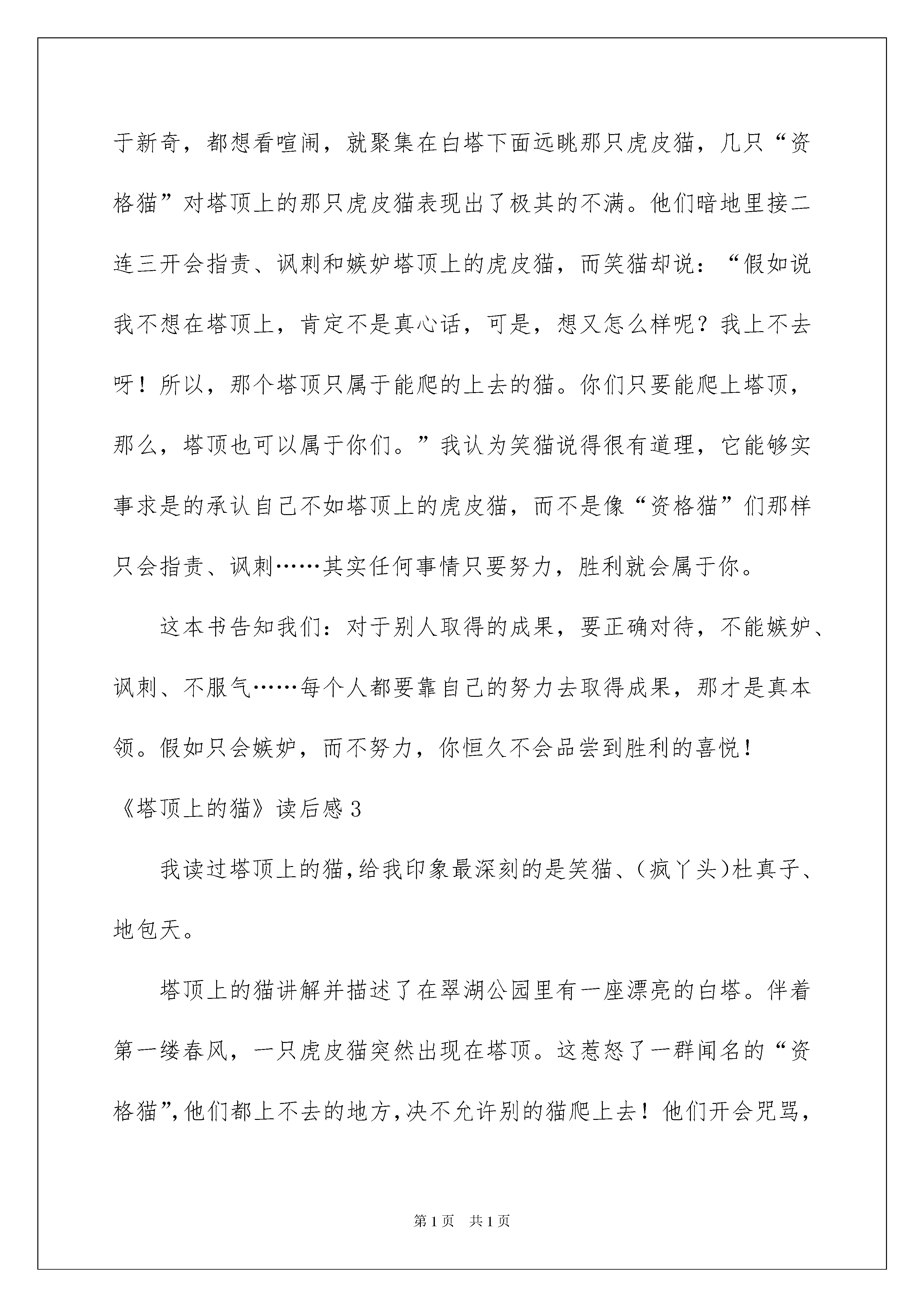 2022《塔顶上的猫》读后感《塔顶上的猫》读后感仔细读完一本名著以后,信任大家增长不少见闻吧,须要好好地对所收获的东西写一篇读后感了。在写读后感之前,可以先参考范文,以下是我收集整理的《塔顶上的猫》读后感,欢迎阅读,希望大家能够喜爱。《塔顶上的猫》读后感1《塔顶上的猫》是闻名儿童文学作家杨红樱阿姨写的《笑猫日记》中的一部分,由明天出版社出版。写了一只傲岸的虎皮猫成天呆在塔顶仰视天空,以及发生在塔下面的一系列故事。读了这个故事,我知道笑猫在这个春天,遇见了一只漂亮的虎皮猫,每次见到虎皮猫,笑猫都会听到自己的心跳声。笑猫喜爱的人杜真子说,他恋爱了。每次,虎皮猫都会独自由塔顶上华蜜地发呆。她是那么神奇,那么名贵。但是,笑猫只能在很远的地方,静默地凝视着她。很久以前,虎皮猫的爸爸妈妈就始终想爬到那座白塔的塔顶上,但是他们不像以前那样年轻,没有实力爬上去,他们就让自己的孩子虎皮猫练习爬。她白天睡觉,晚上练习轻功,经过一次次的失败,她最终练成了。每天都要爬上高高的塔顶,望着天空华蜜地发呆。她的姿态特别美丽。有一天,地包天和笑猫去看云彩,发觉塔顶上有一只虎皮猫望着天空,这件事传到了全部猫的耳朵里。他们特别生气,因为这座白塔的塔壁是用汉白玉做成的,他们都没有实力爬上去。他们每天都在森林里开会,他们忌妒得不得了,还生气地游行。这时候,老鼠们兴奋了,狡猾的老老鼠看到猫们如此嫉妒和自负,就帮助他们出了许多歪点子和损招,让这些狂热的猫们上当,不知被老鼠们玩了几回!这个故事告知我们,不要嫉妒别人,不要自己觉得自己了不得,过于自负。嫉妒别人对自己没有好处,只有坏处,这就叫损人不利己;自负就简单做出错误的选择,是自己前进道路上的绊脚石。《塔顶上的猫》读后感2我一口气读完了《塔顶上的猫》这本书,它让我百看不厌。《塔顶上的猫》是一本童话故事,说的是一只会笑的猫在春天的山坡上和他的挚友地包天(一只狗)闲聊时,在翠湖公园的白塔顶上发觉了一只虎皮猫。因为一般的猫都爬不到塔顶上,许很多多的猫出于新奇,都想看喧闹,就聚集在白塔下面远眺那只虎皮猫,几只“资格猫”对塔顶上的那只虎皮猫表现出了极其的不满。他们暗地里接二连三开会指责、讽刺和嫉妒塔顶上的虎皮猫,而笑猫却说:“假如说我不想在塔顶上,肯定不是真心话,可是,想又怎么样呢?我上不去呀!所以,那个塔顶只属于能爬的上去的猫。你们只要能爬上塔顶,那么,塔顶也可以属于你们。”我认为笑猫说得很有道理,它能够实事求是的承认自己不如塔顶上的虎皮猫,而不是像“资格猫”们那样只会指责、讽刺……其实任何事情只要努力,胜利就会属于你。这本书告知我们:对于别人取得的成果,要正确对待,不能嫉妒、讽刺、不服气……每个人都要靠自己的努力去取得成果,那才是真本领。假如只会嫉妒,而不努力,你恒久不会品尝到胜利的喜悦!《塔顶上的猫》读后感3我读过塔顶上的猫,给我印象最深刻的是笑猫、(疯丫头)杜真子、地包天。塔顶上的猫讲解并描述了在翠湖公园里有一座漂亮的白塔。伴着第一缕春风,一只虎皮猫突然出现在塔顶。这惹怒了一群闻名的“资格猫”,他们都上不去的地方,决不允许别的猫爬上去!他们开会咒骂,生气的游行``````这些疯狂的行为,受到了老鼠的嘲弄,让公园里的老鼠们乐翻乐天。读书是一种美德,也可以从读书中获得道理。希望大家养成爱读书的好习惯!《塔顶上的猫》读后感4昨天读了杨红樱的《塔顶上的猫》,有点儿感受。塔顶上的猫优雅和善,她与地上的猫无冤无仇。可是那些地上的猫嫉妒那只塔顶上的猫,他们不能爬上塔顶,对于能爬上塔顶的猫,他们不是佩服,也不是努力提高自己的技能爬上塔顶,而是诬陷或者自欺欺人地采纳精神成功法,甚至心甘情愿地被老鼠利用,这些猫是多么无聊呀。世上这样的人也不少呀,对于别人达到了自己没有达到的目标,他们不是钦佩,也不是努力去实现自己的目标,而是冷嘲热讽,甚至给人家使绊子,背后穿小鞋。无论地上的'猫怎么诬陷,塔顶的猫都听不见,但是最终被暗箭所伤。对于到达肯定位置的人,须要做的是充耳不闻,同时多加当心。对于想达到肯定位置的人,须要做的就是不停地努力,不断地提高自己。《塔顶上的猫》读后感5我,一个名副其实的杨红樱小书迷。最近出版的《笑猫日记系列—塔顶上的猫》我更是爱不释手。笑猫、虎皮猫、地包天(京巴狗)、资格猫(一群很自傲的猫)、杜真子、马小跳、老老鼠便是书中的主子公。笑猫是一只会笑的猫,一只惊奇的猫,它拥有人的情感,人的思想;它会各种各样的笑:微笑、狂笑、冷笑、讪笑、苦笑、皮笑肉不笑等等。它还是一只懂得浪漫的猫,一只通人性的猫,虎皮猫可是笑猫的暗恋对象哦!笑猫喜爱它的漂亮、名贵、优雅。与此同时,虎皮猫也是资格猫