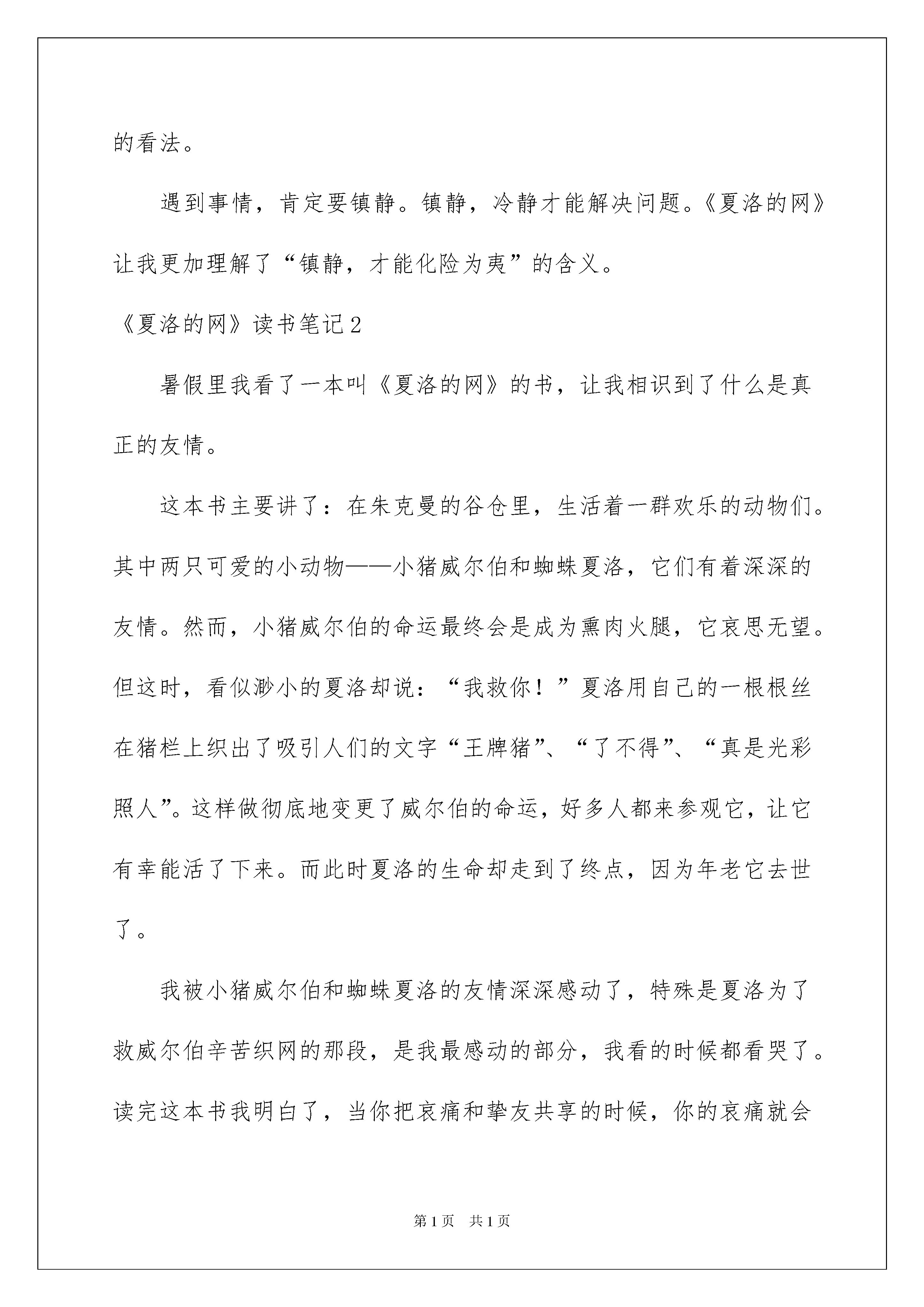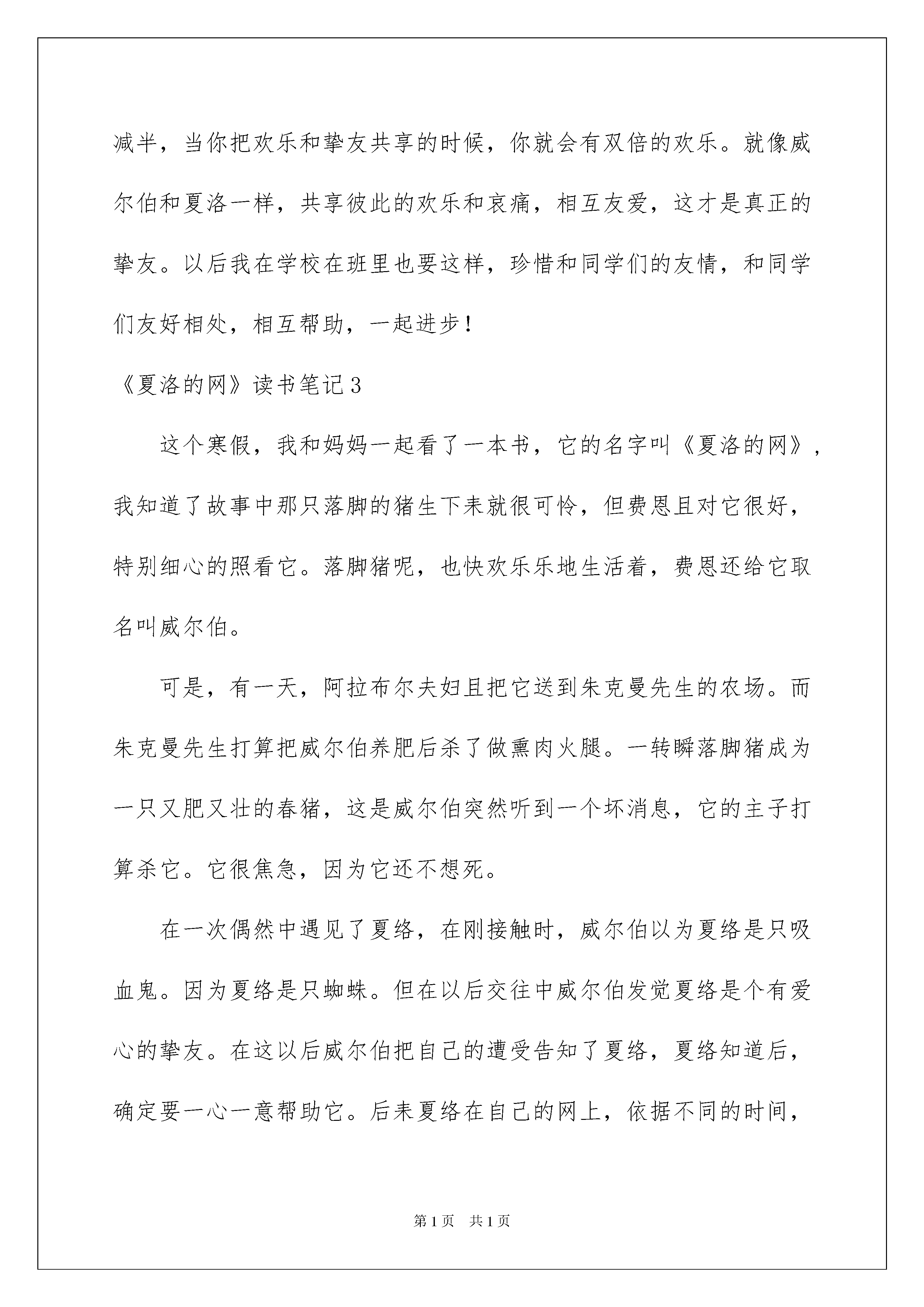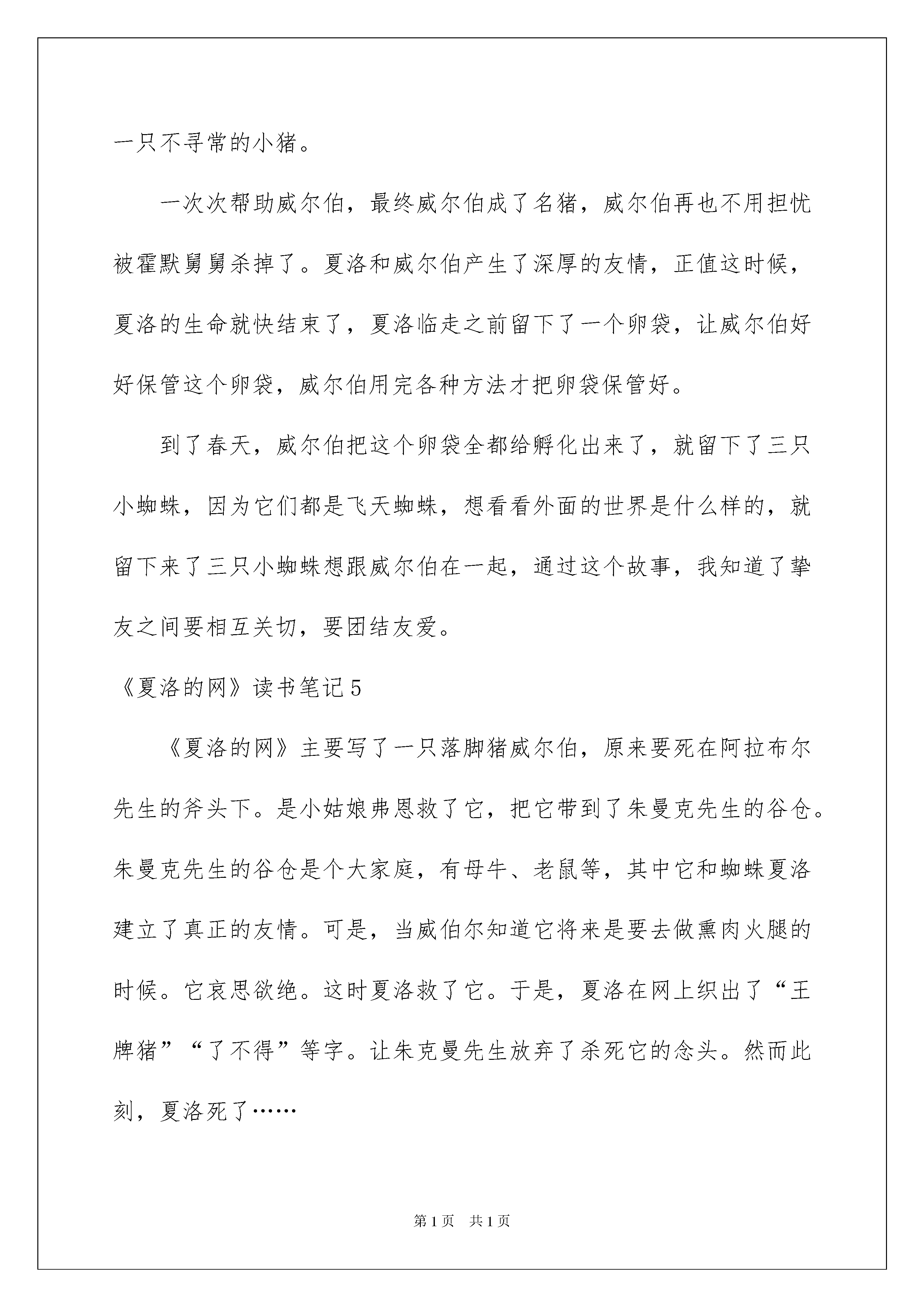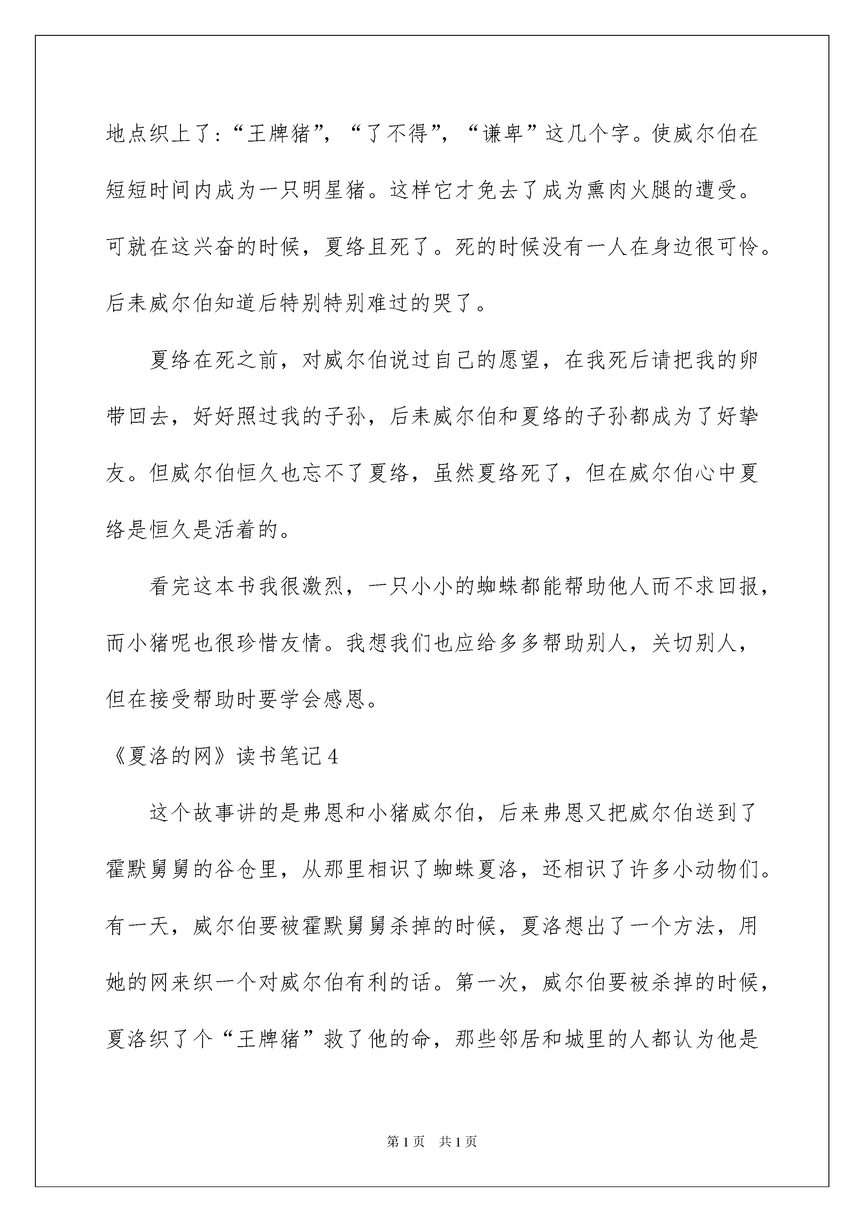 2022《夏洛的网》读书笔记《夏洛的网》读书笔记15篇读完某一作品后,大家对人生或者事物肯定产生了很多感想,是时候写一篇读书笔记好好记录一下了。那么你真的懂得怎么写读书笔记吗?以下是我为大家收集的《夏洛的网》读书笔记,希望对大家有所帮助。《夏洛的网》读书笔记1读美国大作家E.B怀特写的《夏洛的网》,让我受益匪浅。书中始终讲解并描述挽救生命,小猪威尔伯三番两次呼喊着:“我不想死呀!我不想死呀!谁来救我?”蜘蛛夏洛每次都镇静地对他说:“你不会死四的,我救你。”当威尔伯听见阿拉布尔先生对朱克曼说:“假如你的这只猪得奖,你可就有特级的火腿和熏肉吃了!”时,他一下子就吓昏了过去。而夏洛却雷打不动地坐在网上思索着:怎样才能让威尔伯活下去。最终夏洛先后在网上织出了“王牌猪、了不得、光彩照人、谦卑”这几个词,威尔伯也因此活了下来。我们应当向夏洛学习,学习她那种遇到危急,镇静冷静地去对待的看法。遇到事情,肯定要镇静。镇静,冷静才能解决问题。《夏洛的网》让我更加理解了“镇静,才能化险为夷”的含义。《夏洛的网》读书笔记2暑假里我看了一本叫《夏洛的网》的书,让我相识到了什么是真正的友情。这本书主要讲了:在朱克曼的谷仓里,生活着一群欢乐的动物们。其中两只可爱的小动物——小猪威尔伯和蜘蛛夏洛,它们有着深深的友情。然而,小猪威尔伯的命运最终会是成为熏肉火腿,它哀思无望。但这时,看似渺小的夏洛却说:“我救你!”夏洛用自己的一根根丝在猪栏上织出了吸引人们的文字“王牌猪”、“了不得”、“真是光彩照人”。这样做彻底地变更了威尔伯的命运,好多人都来参观它,让它有幸能活了下来。而此时夏洛的生命却走到了终点,因为年老它去世了。我被小猪威尔伯和蜘蛛夏洛的友情深深感动了,特殊是夏洛为了救威尔伯辛苦织网的那段,是我最感动的部分,我看的时候都看哭了。读完这本书我明白了,当你把哀痛和挚友共享的时候,你的哀痛就会减半,当你把欢乐和挚友共享的时候,你就会有双倍的欢乐。就像威尔伯和夏洛一样,共享彼此的欢乐和哀痛,相互友爱,这才是真正的挚友。以后我在学校在班里也要这样,珍惜和同学们的友情,和同学们友好相处,相互帮助,一起进步!《夏洛的网》读书笔记3这个寒假,我和妈妈一起看了一本书,它的名字叫《夏洛的网》,我知道了故事中那只落脚的猪生下耒就很可怜,但费恩且对它很好,特别细心的照看它。落脚猪呢,也快欢乐乐地生活着,费恩还给它取名叫威尔伯。可是,有一天,阿拉布尔夫妇且把它送到朱克曼先生的农场。而朱克曼先生打算把威尔伯养肥后杀了做熏肉火腿。一转瞬落脚猪成为一只又肥又壮的春猪,这是威尔伯突然听到一个坏消息,它的主子打算杀它。它很焦急,因为它还不想死。在一次偶然中遇见了夏络,在刚接触时,威尔伯以为夏络是只吸血鬼。因为夏络是只蜘蛛。但在以后交往中威尔伯发觉夏络是个有爱心的挚友。在这以后威尔伯把自己的遭受告知了夏络,夏络知道后,确定要一心一意帮助它。后耒夏络在自己的网上,依据不同的时间,地点织上了:“王牌猪”,“了不得”,“谦卑”这几个字。使威尔伯在短短时间内成为一只明星猪。这样它才免去了成为熏肉火腿的遭受。可就在这兴奋的时候,夏络且死了。死的时候没有一人在身边很可怜。后耒威尔伯知道后特别特别难过的哭了。夏络在死之前,对威尔伯说过自己的愿望,在我死后请把我的卵带回去,好好照过我的子孙,后耒威尔伯和夏络的子孙都成为了好挚友。但威尔伯恒久也忘不了夏络,虽然夏络死了,但在威尔伯心中夏络是恒久是活着的。看完这本书我很激烈,一只小小的蜘蛛都能帮助他人而不求回报,而小猪呢也很珍惜友情。我想我们也应给多多帮助别人,关切别人,但在接受帮助时要学会感恩。《夏洛的网》读书笔记4这个故事讲的是弗恩和小猪威尔伯,后来弗恩又把威尔伯送到了霍默舅舅的谷仓里,从那里相识了蜘蛛夏洛,还相识了许多小动物们。有一天,威尔伯要被霍默舅舅杀掉的时候,夏洛想出了一个方法,用她的网来织一个对威尔伯有利的话。第一次,威尔伯要被杀掉的时候,夏洛织了个“王牌猪”救了他的命,那些邻居和城里的人都认为他是一只不寻常的小猪。一次次帮助威尔伯,最终威尔伯成了名猪,威尔伯再也不用担忧被霍默舅舅杀掉了。夏洛和威尔伯产生了深厚的友情,正值这时候,夏洛的生命就快结束了,夏洛临走之前留下了一个卵袋,让威尔伯好好保管这个卵袋,威尔伯用完各种方法才把卵袋保管好。到了春天,威尔伯把这个卵袋全都给孵化出来了,就留下了三只小蜘蛛,因为它们都是飞天蜘蛛,想看看外面的世界是什么样的,就留下来了三只小蜘蛛想跟威尔伯在一起,通过这个故事,我知道了挚友之间要相互关切,要团结友爱。《夏洛的网》读书笔记5《夏洛的网》主要写了一只落脚猪威尔