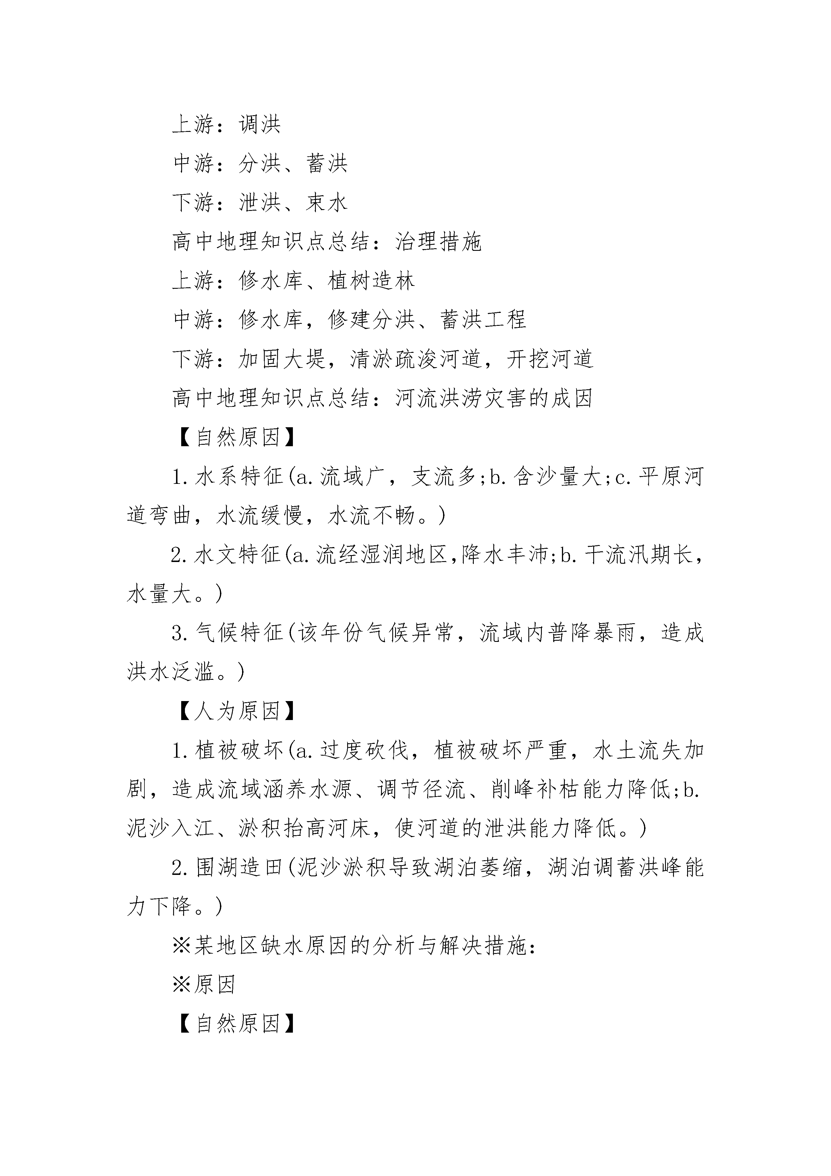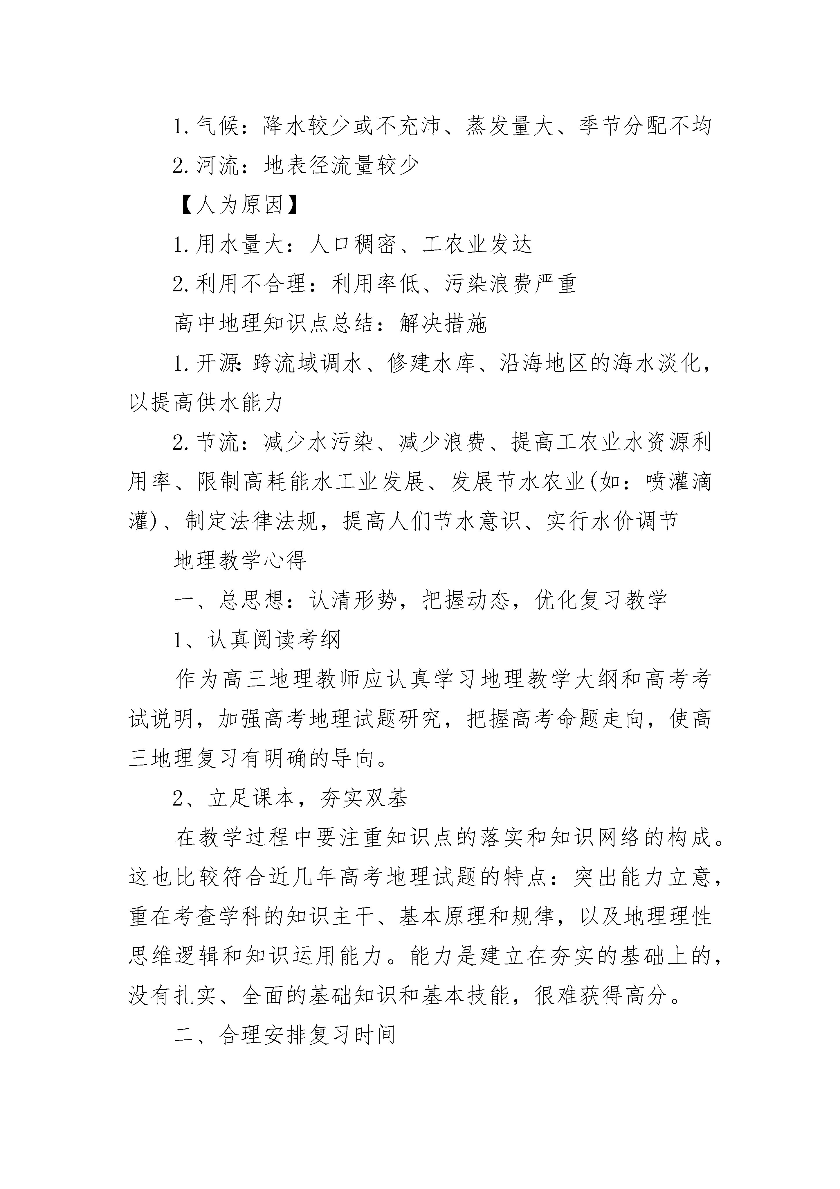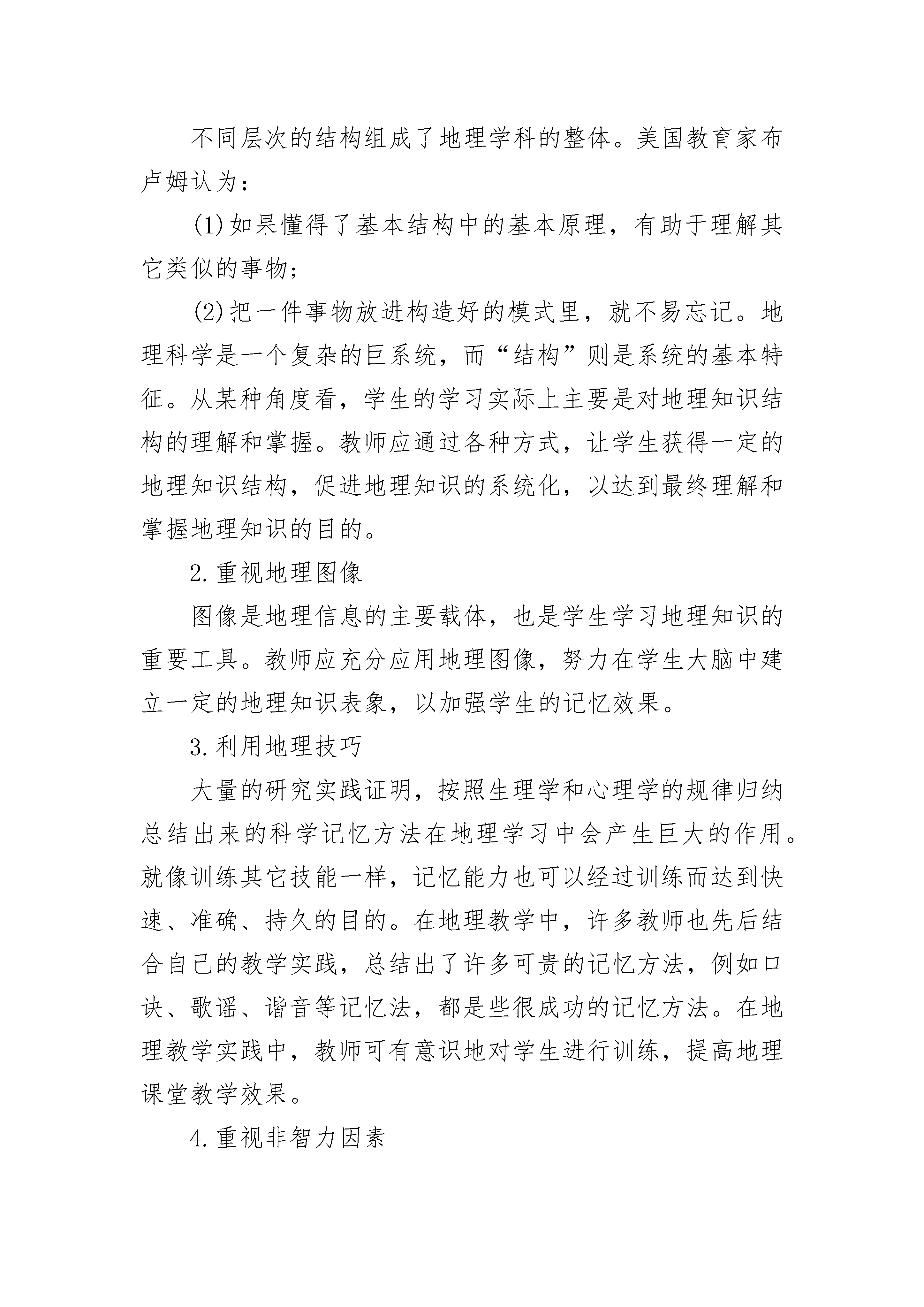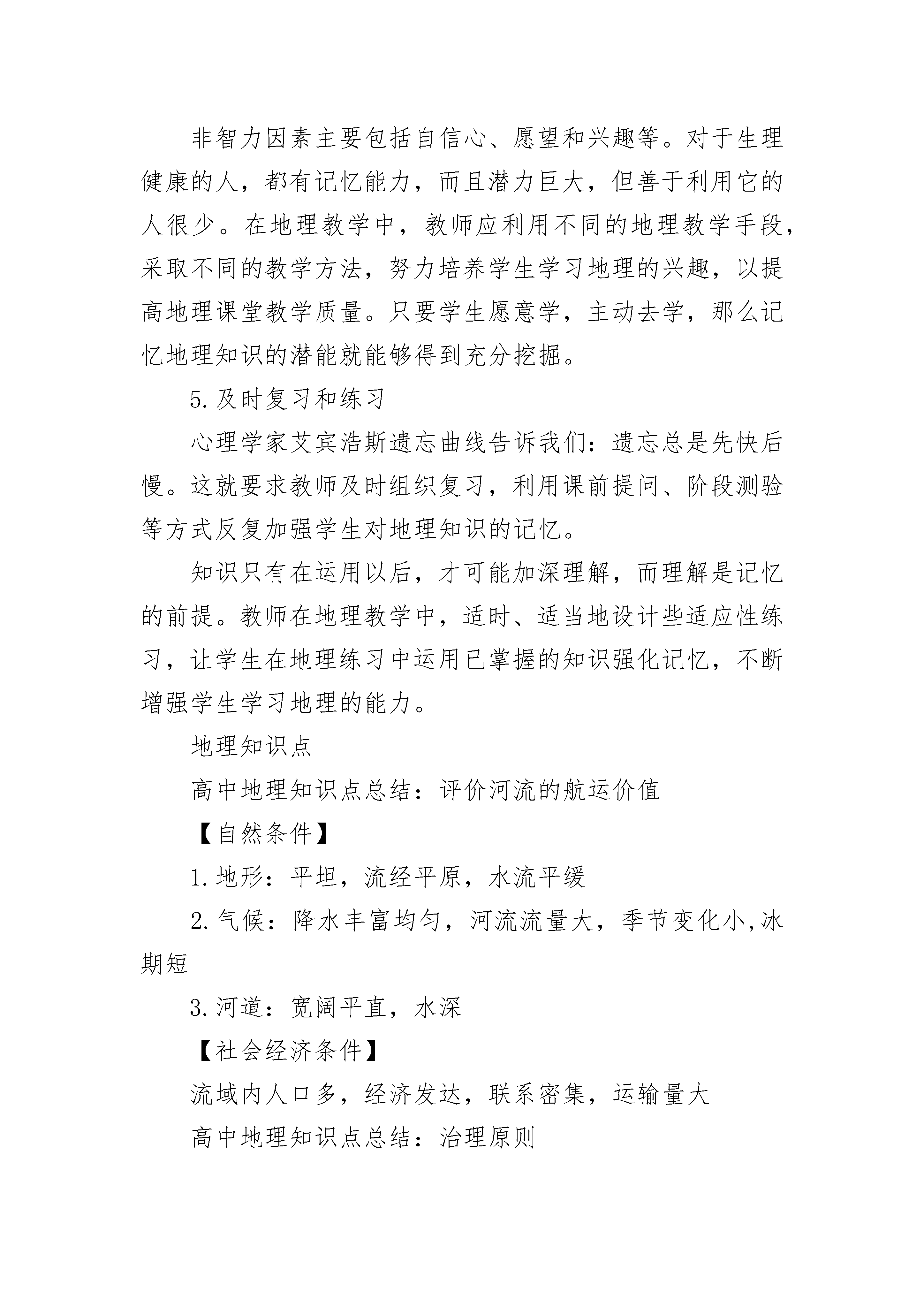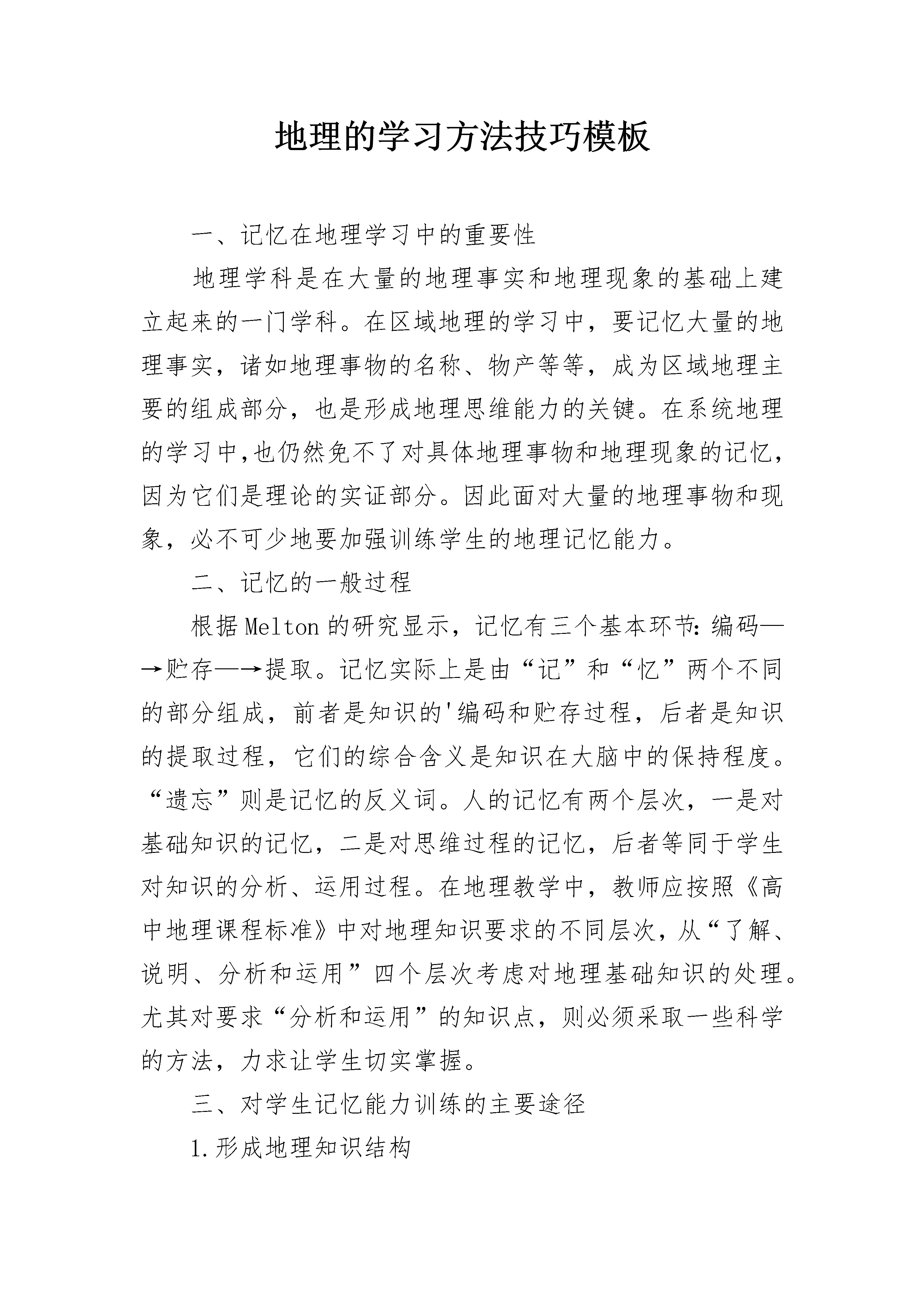 地理的学习方法技巧模板一、记忆在地理学习中的重要性地理学科是在大量的地理事实和地理现象的基础上建立起来的一门学科。在区域地理的学习中,要记忆大量的地理事实,诸如地理事物的名称、物产等等,成为区域地理主要的组成部分,也是形成地理思维能力的关键。在系统地理的学习中,也仍然免不了对具体地理事物和地理现象的记忆,因为它们是理论的实证部分。因此面对大量的地理事物和现象,必不可少地要加强训练学生的地理记忆能力。二、记忆的一般过程根据Melton的研究显示,记忆有三个基本环节:编码—→贮存—→提取。记忆实际上是由“记”和“忆”两个不同的部分组成,前者是知识的'编码和贮存过程,后者是知识的提取过程,它们的综合含义是知识在大脑中的保持程度。“遗忘”则是记忆的反义词。人的记忆有两个层次,一是对基础知识的记忆,二是对思维过程的记忆,后者等同于学生对知识的分析、运用过程。在地理教学中,教师应按照《高中地理课程标准》中对地理知识要求的不同层次,从“了解、说明、分析和运用”四个层次考虑对地理基础知识的处理。尤其对要求“分析和运用”的知识点,则必须采取一些科学的方法,力求让学生切实掌握。三、对学生记忆能力训练的主要途径1.形成地理知识结构不同层次的结构组成了地理学科的整体。美国教育家布卢姆认为:(1)如果懂得了基本结构中的基本原理,有助于理解其它类似的事物;(2)把一件事物放进构造好的模式里,就不易忘记。地理科学是一个复杂的巨系统,而“结构”则是系统的基本特征。从某种角度看,学生的学习实际上主要是对地理知识结构的理解和掌握。教师应通过各种方式,让学生获得一定的地理知识结构,促进地理知识的系统化,以达到最终理解和掌握地理知识的目的。2.重视地理图像图像是地理信息的主要载体,也是学生学习地理知识的重要工具。教师应充分应用地理图像,努力在学生大脑中建立一定的地理知识表象,以加强学生的记忆效果。3.利用地理技巧大量的研究实践证明,按照生理学和心理学的规律归纳总结出来的科学记忆方法在地理学习中会产生巨大的作用。就像训练其它技能一样,记忆能力也可以经过训练而达到快速、准确、持久的目的。在地理教学中,许多教师也先后结合自己的教学实践,总结出了许多可贵的记忆方法,例如口诀、歌谣、谐音等记忆法,都是些很成功的记忆方法。在地理教学实践中,教师可有意识地对学生进行训练,提高地理课堂教学效果。4.重视非智力因素非智力因素主要包括自信心、愿望和兴趣等。对于生理健康的人,都有记忆能力,而且潜力巨大,但善于利用它的人很少。在地理教学中,教师应利用不同的地理教学手段,采取不同的教学方法,努力培养学生学习地理的兴趣,以提高地理课堂教学质量。只要学生愿意学,主动去学,那么记忆地理知识的潜能就能够得到充分挖掘。5.及时复习和练习心理学家艾宾浩斯遗忘曲线告诉我们:遗忘总是先快后慢。这就要求教师及时组织复习,利用课前提问、阶段测验等方式反复加强学生对地理知识的记忆。知识只有在运用以后,才可能加深理解,而理解是记忆的前提。教师在地理教学中,适时、适当地设计些适应性练习,让学生在地理练习中运用已掌握的知识强化记忆,不断增强学生学习地理的能力。地理知识点高中地理知识点总结:评价河流的航运价值【自然条件】1.地形:平坦,流经平原,水流平缓2.气候:降水丰富均匀,河流流量大,季节变化小,冰期短3.河道:宽阔平直,水深【社会经济条件】流域内人口多,经济发达,联系密集,运输量大高中地理知识点总结:治理原则上游:调洪中游:分洪、蓄洪下游:泄洪、束水高中地理知识点总结:治理措施上游:修水库、植树造林中游:修水库,修建分洪、蓄洪工程下游:加固大堤,清淤疏浚河道,开挖河道高中地理知识点总结:河流洪涝灾害的成因【自然原因】1.水系特征(a.流域广,支流多;b.含沙量大;c.平原河道弯曲,水流缓慢,水流不畅。)2.水文特征(a.流经湿润地区,降水丰沛;b.干流汛期长,水量大。)3.气候特征(该年份气候异常,流域内普降暴雨,造成洪水泛滥。)【人为原因】1.植被破坏(a.过度砍伐,植被破坏严重,水土流失加剧,造成流域涵养水源、调节径流、削峰补枯能力降低;b.泥沙入江、淤积抬高河床,使河道的泄洪能力降低。)2.围湖造田(泥沙淤积导致湖泊萎缩,湖泊调蓄洪峰能力下降。)※某地区缺水原因的分析与解决措施:※原因【自然原因】1.气候:降水较少或不充沛、蒸发量大、季节分配不均2.河流:地表径流量较少【人为原因】1.用水量大:人口稠密、工农业发达2.利用不合理:利用率低、污染浪费严重高中地理知识点总结:解决措施1.开源:跨流域调水、修建水库、沿海地区的海水淡化,以提高供水能力2.节流:减少水污染、减少浪费、提高工农业水资源利用率、限制高耗能水工业发展、发展节水农业(如:喷灌滴灌)、制定法律法规,提高人们节水意识、实行水价调节地理教学心得