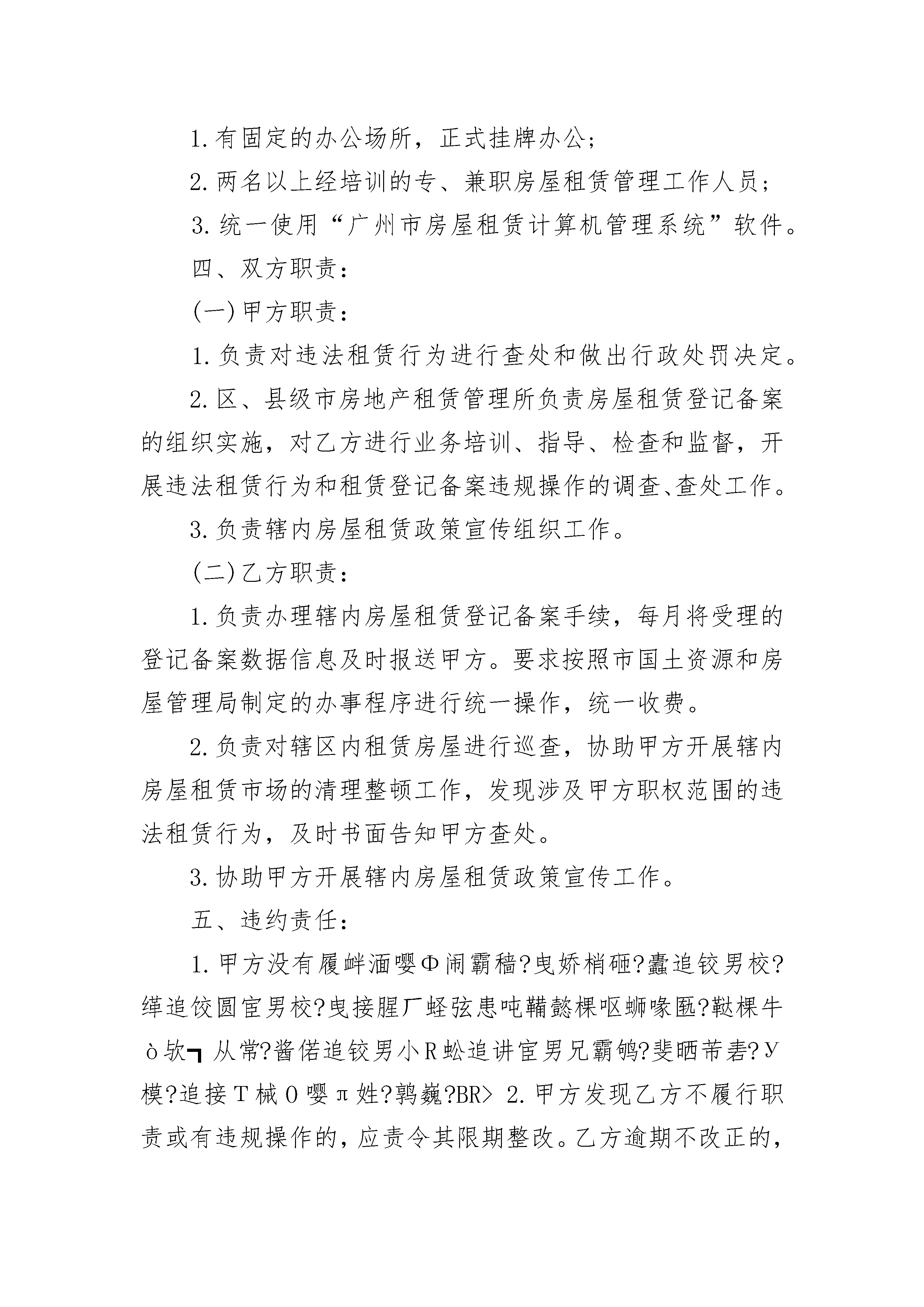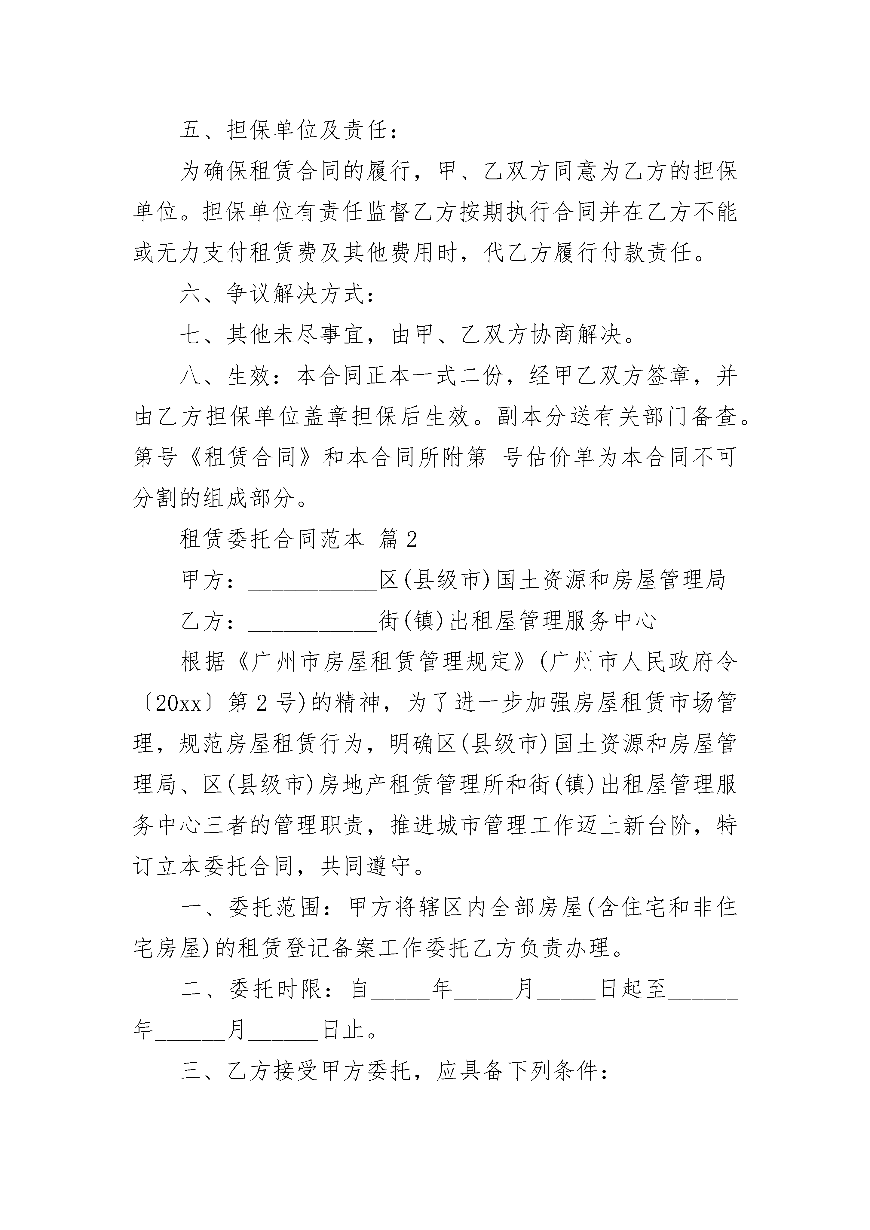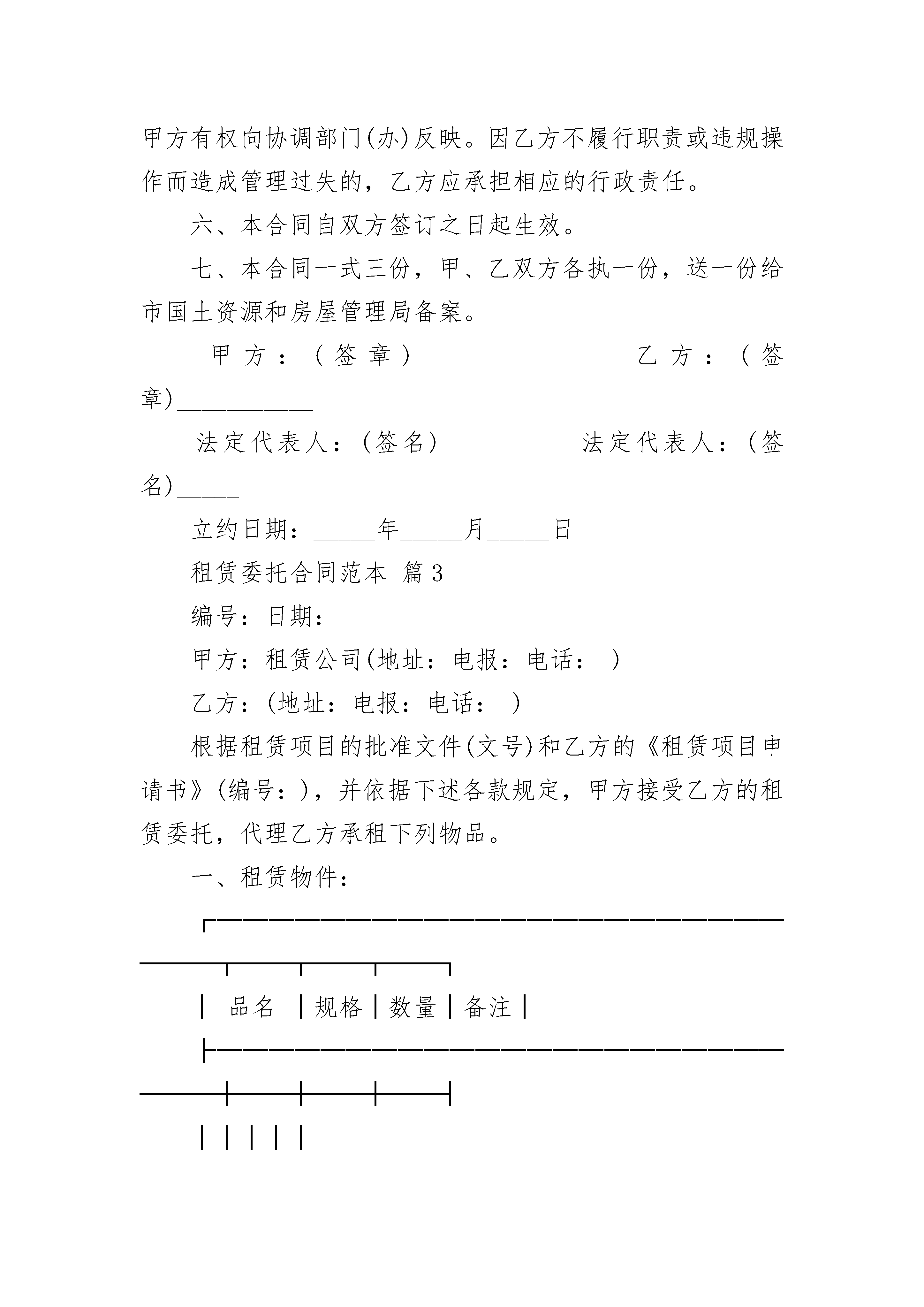 租赁委托合同范本租赁委托合同范本(精选24篇)租赁委托合同范本篇1编号:日期:甲方:地址:电话:乙方:地址:电话:根据租赁项目的批准文件和乙方的《租赁项目申请书》(编号:),并依据下述各款规定,甲方接受乙方的租赁委托,代理乙方承租下列物品:一、租赁物件品名、规格、数量:设备成交单价、总值和其他交易条款,均按第号《订货协议书》规定办理。二、租赁费及有关条件:1.租赁费总额:(大写:)。租赁期自提单交付之日起算,自租赁期起算日起满个月的当天为第一次支付日,以后每满个月支付1次,共支付次,至租赁期结束。2.其他有关费用,如本合同附表《估价单》所列。3.在本合同生效日后30天内,甲方将按照租赁业务和国际贸易习惯做法,代表乙方签订租赁合同。该租赁合同生效后,甲乙双方均有履行该合同的责任和义务。三、租赁物件交接:1.租赁物件装船后,甲方应适时向乙方发出“到货通知”,并负责在到货后代办进口许可、报关、保险、提货、托运等有关手续,所需费用由乙方承担。2.乙方接货后,应立即在商检部门的督导下开箱检验。检验无误后,即可安装使用。如检验结果与合同及其附件规定不符,应立即申请商检部门检验并出具商检证书,最迟应在合同规定的索赔期到期日10天前,通知甲方对外提出索赔。四、费用结算办法:1.本合同附表所列国内外费用系估算额,实际支付时,按附表说明事项办理。2.有关各期租赁费的结算办法,乙方应在甲方发出的付款通知规定的期限内,将本期应支付的租赁费划拨至甲方账户。甲方在对外结算后,以原始发票金额为准开据结算清单,多退少补。倘乙方未能按期划拨,甲方将依据本合同通过银行向乙方开户行(账号:)托收。在此情况下,甲方按本期迟付额每月向乙方加收%的违约金,不足一个月按一个月计算。3.本合同附表所列明的国内有关费用,系指乙方应向国内有关单位交纳的进口关税、进口工商税、港口、陆运杂费和银行费用等概算额。结算办法同本款第1、2条。4.甲方代理费按租赁费总额的%,于到货时一次性计收。不足5万美元的租赁项目,按%计收,结算办法同本款第2条。五、担保单位及责任:为确保租赁合同的履行,甲、乙双方同意为乙方的担保单位。担保单位有责任监督乙方按期执行合同并在乙方不能或无力支付租赁费及其他费用时,代乙方履行付款责任。六、争议解决方式:七、其他未尽事宜,由甲、乙双方协商解决。八、生效:本合同正本一式二份,经甲乙双方签章,并由乙方担保单位盖章担保后生效。副本分送有关部门备查。第号《租赁合同》和本合同所附第号估价单为本合同不可分割的组成部分。租赁委托合同范本篇2甲方:___________区(县级市)国土资源和房屋管理局乙方:___________街(镇)出租屋管理服务中心根据《广州市房屋租赁管理规定》(广州市人民政府令〔20xx〕第2号)的精神,为了进一步加强房屋租赁市场管理,规范房屋租赁行为,明确区(县级市)国土资源和房屋管理局、区(县级市)房地产租赁管理所和街(镇)出租屋管理服务中心三者的管理职责,推进城市管理工作迈上新台阶,特订立本委托合同,共同遵守。一、委托范围:甲方将辖区内全部房屋(含住宅和非住宅房屋)的租赁登记备案工作委托乙方负责办理。二、委托时限:自_____年_____月_____日起至______年______月______日止。三、乙方接受甲方委托,应具备下列条件:1.有固定的办公场所,正式挂牌办公;2.两名以上经培训的专、兼职房屋租赁管理工作人员;3.统一使用“广州市房屋租赁计算机管理系统”软件。四、双方职责:(一)甲方职责:1.负责对违法租赁行为进行查处和做出行政处罚决定。2.区、县级市房地产租赁管理所负责房屋租赁登记备案的组织实施,对乙方进行业务培训、指导、检查和监督,开展违法租赁行为和租赁登记备案违规操作的调查、查处工作。3.负责辖内房屋租赁政策宣传组织工作。(二)乙方职责:1.负责办理辖内房屋租赁登记备案手续,每月将受理的登记备案数据信息及时报送甲方。要求按照市国土资源和房屋管理局制定的办事程序进行统一操作,统一收费。2.负责对辖区内租赁房屋进行巡查,协助甲方开展辖内房屋租赁市场的清理整顿工作,发现涉及甲方职权范围的违法租赁行为,及时书面告知甲方查处。3.协助甲方开展辖内房屋租赁政策宣传工作。五、违约责任:1.甲方没有履衅湎嘤Φ闹霸穑?曳娇梢砸?蠹追铰男校?缂追饺圆宦男校?曳接腥ㄏ蛏弦患吨鞴懿棵呕蛳喙匦?鞑棵牛ò欤┓从常?酱偌追铰男小R蚣追讲宦男兄霸鸲?斐晒芾砉?У模?追接Τ械O嘤π姓?鹑巍?BR>2.甲方发现乙方不履行职责或有违规操作的,应责令其限期整改。乙方逾期不改正的,甲方有权向协调部门(办)反映。因乙方不履行职责或违规操作而造成管理过失的,乙方应承担相应的行政责任。六、本合同自双方签订之日起生效。七、本合同一式三份,甲、乙双方各执一份,送一份给市国土资