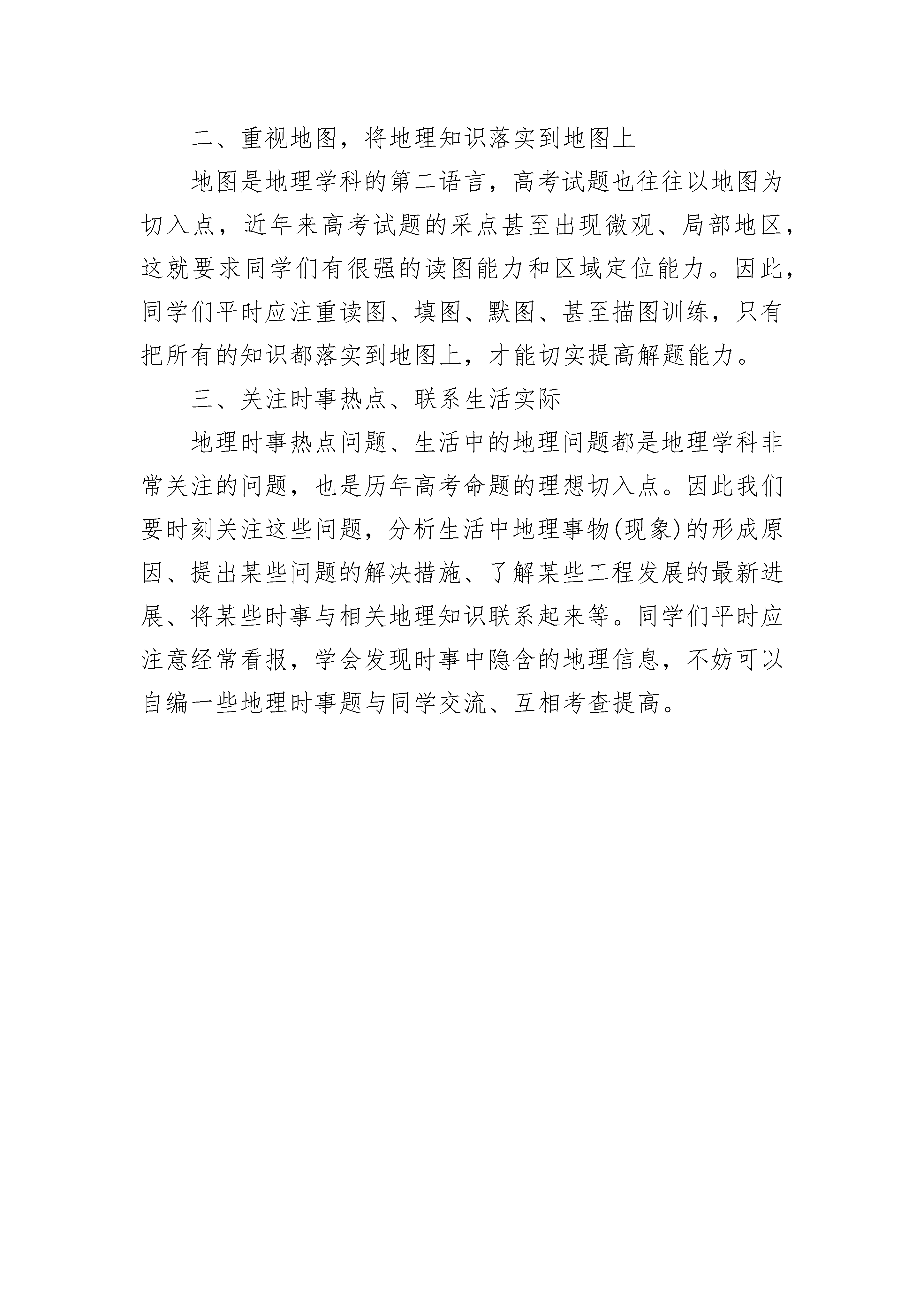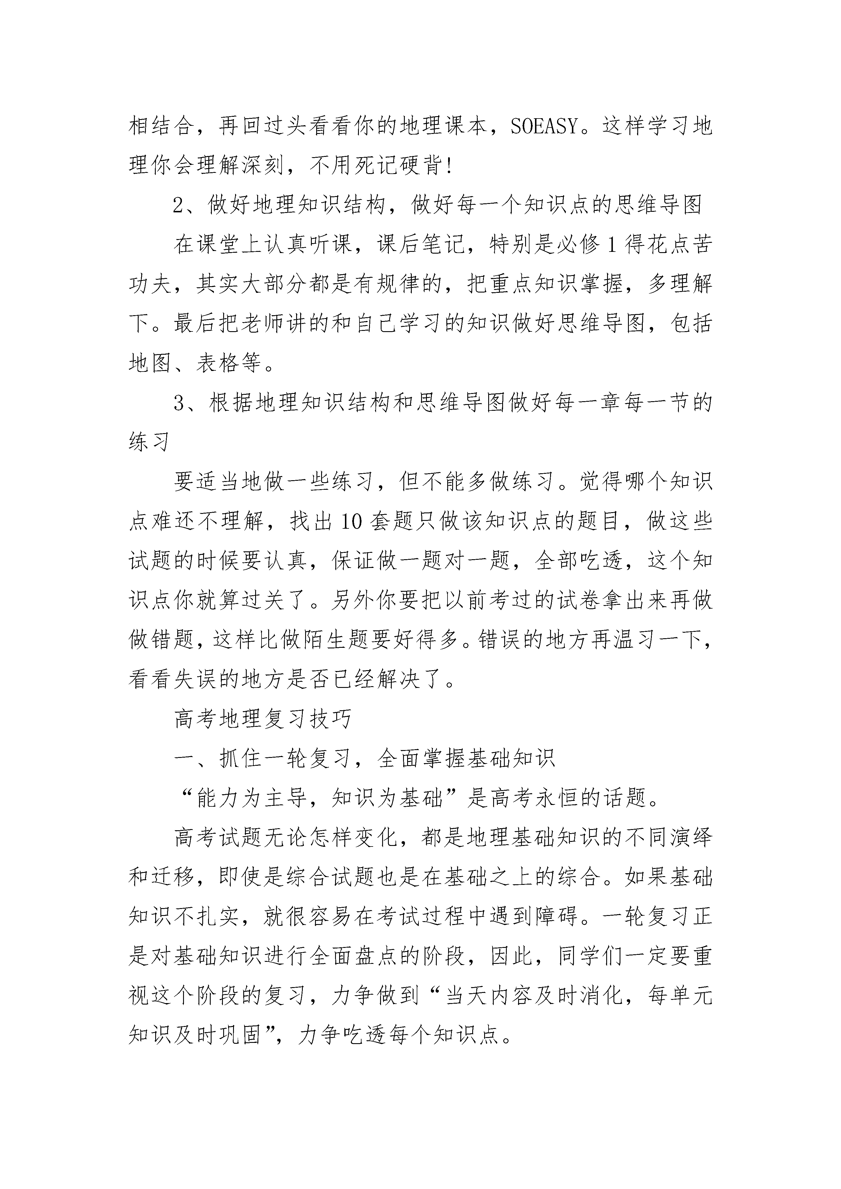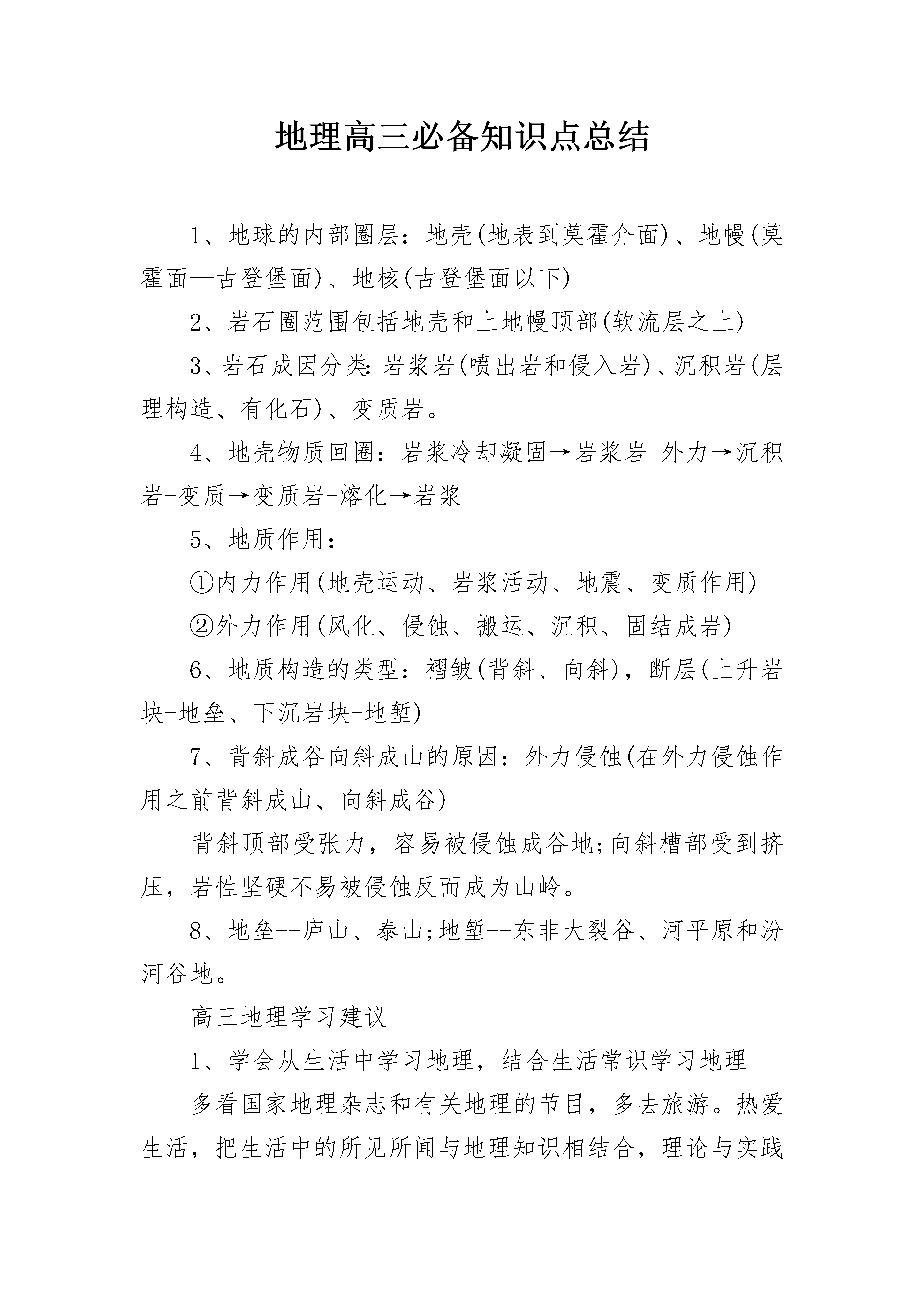 地理高三必备知识点总结1、地球的内部圈层:地壳(地表到莫霍介面)、地幔(莫霍面—古登堡面)、地核(古登堡面以下)2、岩石圈范围包括地壳和上地幔顶部(软流层之上)3、岩石成因分类:岩浆岩(喷出岩和侵入岩)、沉积岩(层理构造、有化石)、变质岩。4、地壳物质回圈:岩浆冷却凝固→岩浆岩-外力→沉积岩-变质→变质岩-熔化→岩浆5、地质作用:①内力作用(地壳运动、岩浆活动、地震、变质作用)②外力作用(风化、侵蚀、搬运、沉积、固结成岩)6、地质构造的类型:褶皱(背斜、向斜),断层(上升岩块-地垒、下沉岩块-地堑)7、背斜成谷向斜成山的原因:外力侵蚀(在外力侵蚀作用之前背斜成山、向斜成谷)背斜顶部受张力,容易被侵蚀成谷地;向斜槽部受到挤压,岩性坚硬不易被侵蚀反而成为山岭。8、地垒--庐山、泰山;地堑--东非大裂谷、河平原和汾河谷地。高三地理学习建议1、学会从生活中学习地理,结合生活常识学习地理多看国家地理杂志和有关地理的节目,多去旅游。热爱生活,把生活中的所见所闻与地理知识相结合,理论与实践相结合,再回过头看看你的地理课本,SOEASY。这样学习地理你会理解深刻,不用死记硬背!2、做好地理知识结构,做好每一个知识点的思维导图在课堂上认真听课,课后笔记,特别是必修1得花点苦功夫,其实大部分都是有规律的,把重点知识掌握,多理解下。最后把老师讲的和自己学习的知识做好思维导图,包括地图、表格等。3、根据地理知识结构和思维导图做好每一章每一节的练习要适当地做一些练习,但不能多做练习。觉得哪个知识点难还不理解,找出10套题只做该知识点的题目,做这些试题的时候要认真,保证做一题对一题,全部吃透,这个知识点你就算过关了。另外你要把以前考过的试卷拿出来再做做错题,这样比做陌生题要好得多。错误的地方再温习一下,看看失误的地方是否已经解决了。高考地理复习技巧一、抓住一轮复习,全面掌握基础知识“能力为主导,知识为基础”是高考永恒的话题。高考试题无论怎样变化,都是地理基础知识的不同演绎和迁移,即使是综合试题也是在基础之上的综合。如果基础知识不扎实,就很容易在考试过程中遇到障碍。一轮复习正是对基础知识进行全面盘点的阶段,因此,同学们一定要重视这个阶段的复习,力争做到“当天内容及时消化,每单元知识及时巩固”,力争吃透每个知识点。二、重视地图,将地理知识落实到地图上地图是地理学科的第二语言,高考试题也往往以地图为切入点,近年来高考试题的采点甚至出现微观、局部地区,这就要求同学们有很强的读图能力和区域定位能力。因此,同学们平时应注重读图、填图、默图、甚至描图训练,只有把所有的知识都落实到地图上,才能切实提高解题能力。三、关注时事热点、联系生活实际地理时事热点问题、生活中的地理问题都是地理学科非常关注的问题,也是历年高考命题的理想切入点。因此我们要时刻关注这些问题,分析生活中地理事物(现象)的形成原因、提出某些问题的解决措施、了解某些工程发展的最新进展、将某些时事与相关地理知识联系起来等。同学们平时应注意经常看报,学会发现时事中隐含的地理信息,不妨可以自编一些地理时事题与同学交流、互相考查提高。