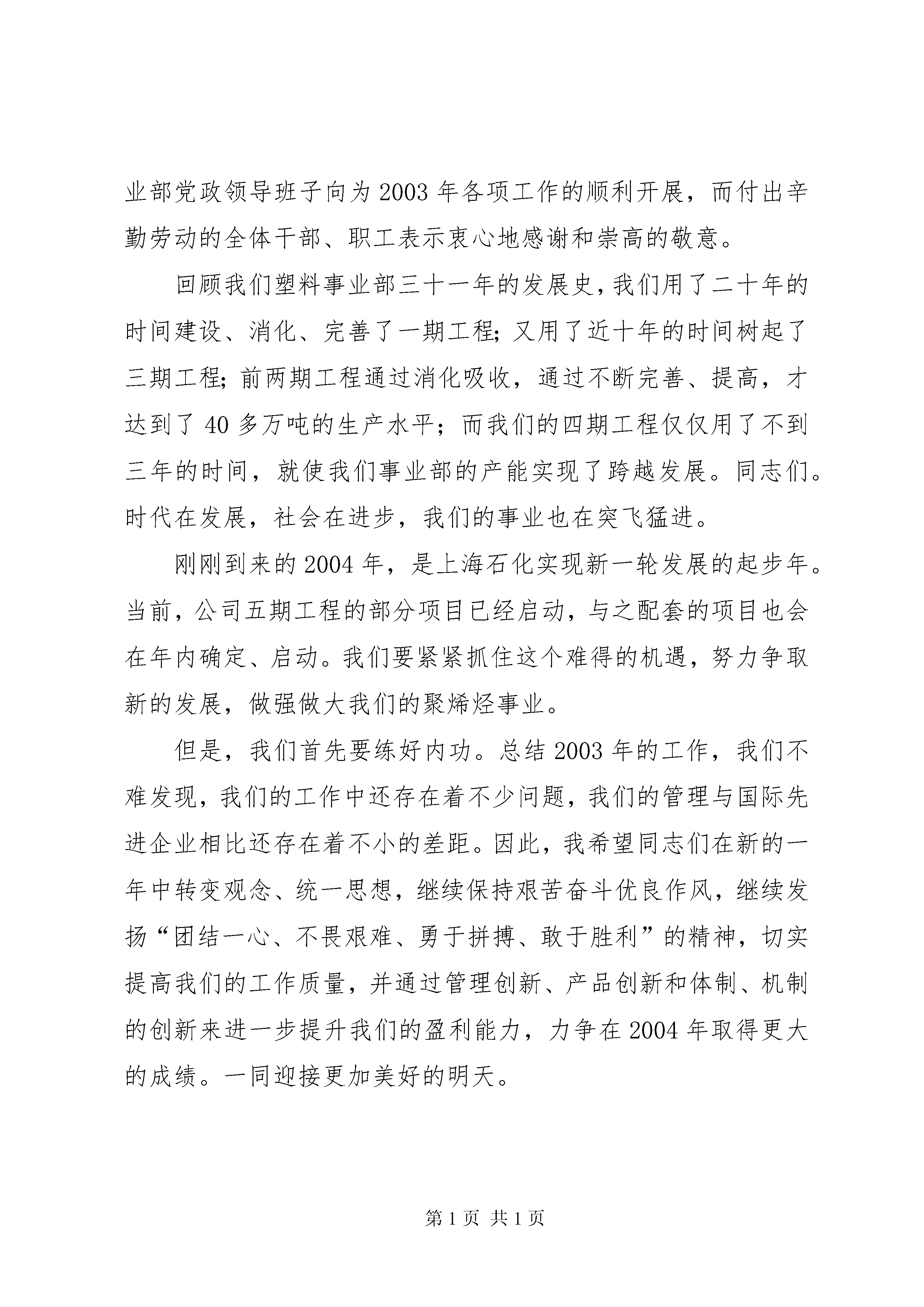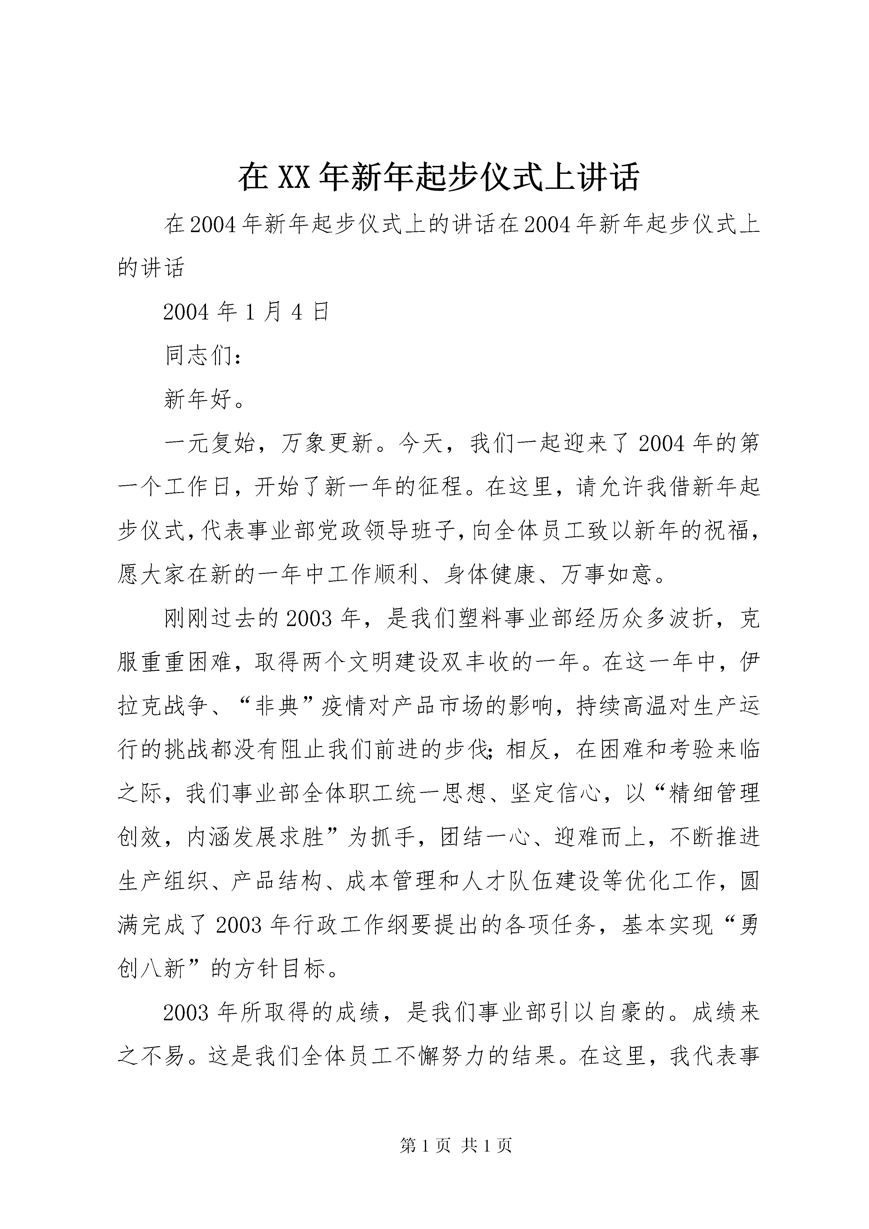 在XX年新年起步仪式上讲话在2004年新年起步仪式上的讲话在2004年新年起步仪式上的讲话2004年1月4日同志们:新年好。一元复始,万象更新。今天,我们一起迎来了2004年的第一个工作日,开始了新一年的征程。在这里,请允许我借新年起步仪式,代表事业部党政领导班子,向全体员工致以新年的祝福,愿大家在新的一年中工作顺利、身体健康、万事如意。刚刚过去的2003年,是我们塑料事业部经历众多波折,克服重重困难,取得两个文明建设双丰收的一年。在这一年中,伊拉克战争、“非典”疫情对产品市场的影响,持续高温对生产运行的挑战都没有阻止我们前进的步伐;相反,在困难和考验来临之际,我们事业部全体职工统一思想、坚定信心,以“精细管理创效,内涵发展求胜”为抓手,团结一心、迎难而上,不断推进生产组织、产品结构、成本管理和人才队伍建设等优化工作,圆满完成了2003年行政工作纲要提出的各项任务,基本实现“勇创八新”的方针目标。2003年所取得的成绩,是我们事业部引以自豪的。成绩来之不易。这是我们全体员工不懈努力的结果。在这里,我代表事业部党政领导班子向为2003年各项工作的顺利开展,而付出辛勤劳动的全体干部、职工表示衷心地感谢和崇高的敬意。回顾我们塑料事业部三十一年的发展史,我们用了二十年的时间建设、消化、完善了一期工程;又用了近十年的时间树起了三期工程;前两期工程通过消化吸收,通过不断完善、提高,才达到了40多万吨的生产水平;而我们的四期工程仅仅用了不到三年的时间,就使我们事业部的产能实现了跨越发展。同志们。时代在发展,社会在进步,我们的事业也在突飞猛进。刚刚到来的2004年,是上海石化实现新一轮发展的起步年。当前,公司五期工程的部分项目已经启动,与之配套的项目也会在年内确定、启动。我们要紧紧抓住这个难得的机遇,努力争取新的发展,做强做大我们的聚烯烃事业。但是,我们首先要练好内功。总结2003年的工作,我们不难发现,我们的工作中还存在着不少问题,我们的管理与国际先进企业相比还存在着不小的差距。因此,我希望同志们在新的一年中转变观念、统一思想,继续保持艰苦奋斗优良作风,继续发扬“团结一心、不畏艰难、勇于拼搏、敢于胜利”的精神,切实提高我们的工作质量,并通过管理创新、产品创新和体制、机制的创新来进一步提升我们的盈利能力,力争在2004年取得更大的成绩。一同迎接更加美好的明天。最后,祝同志们新年快乐,家庭幸福。