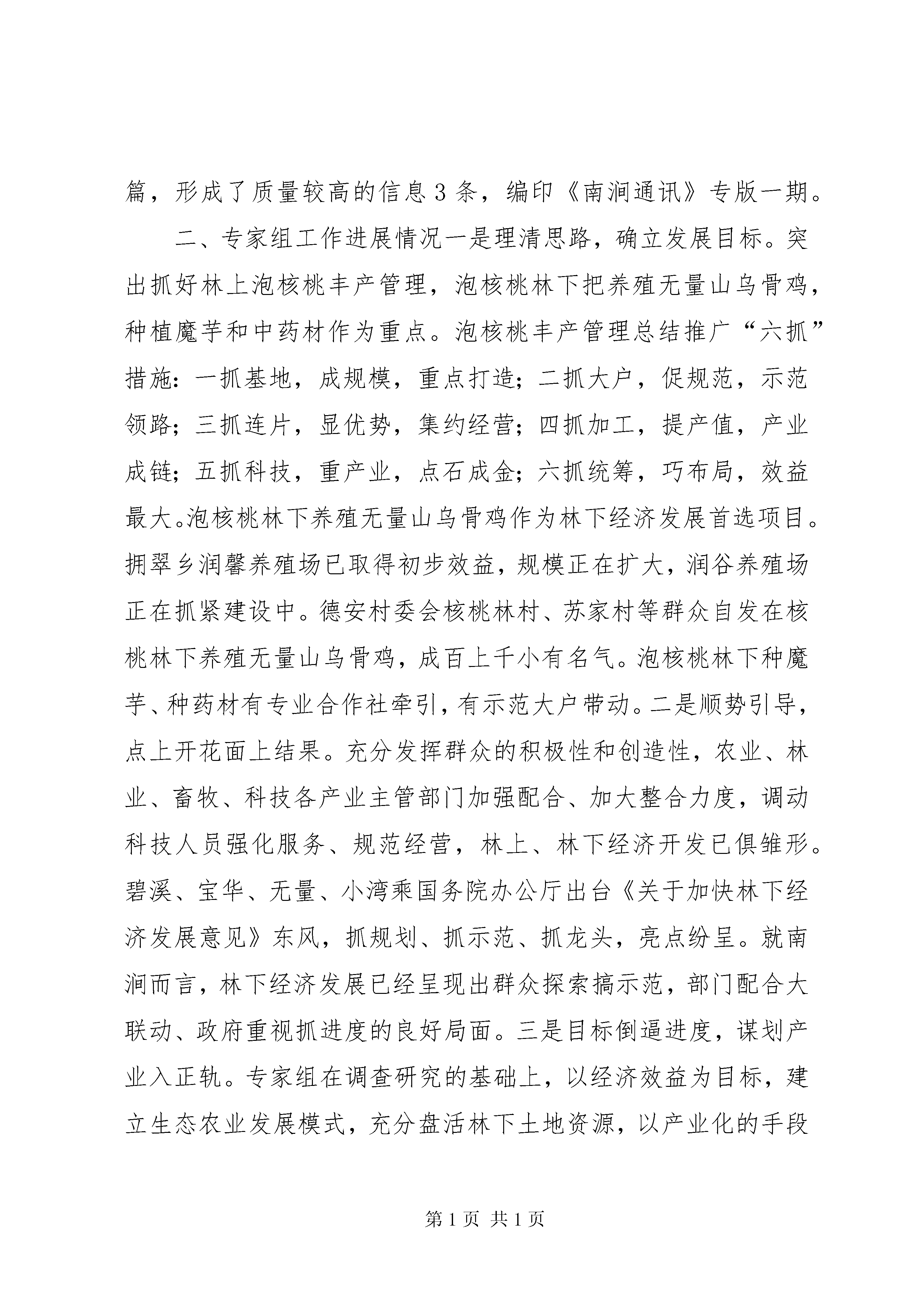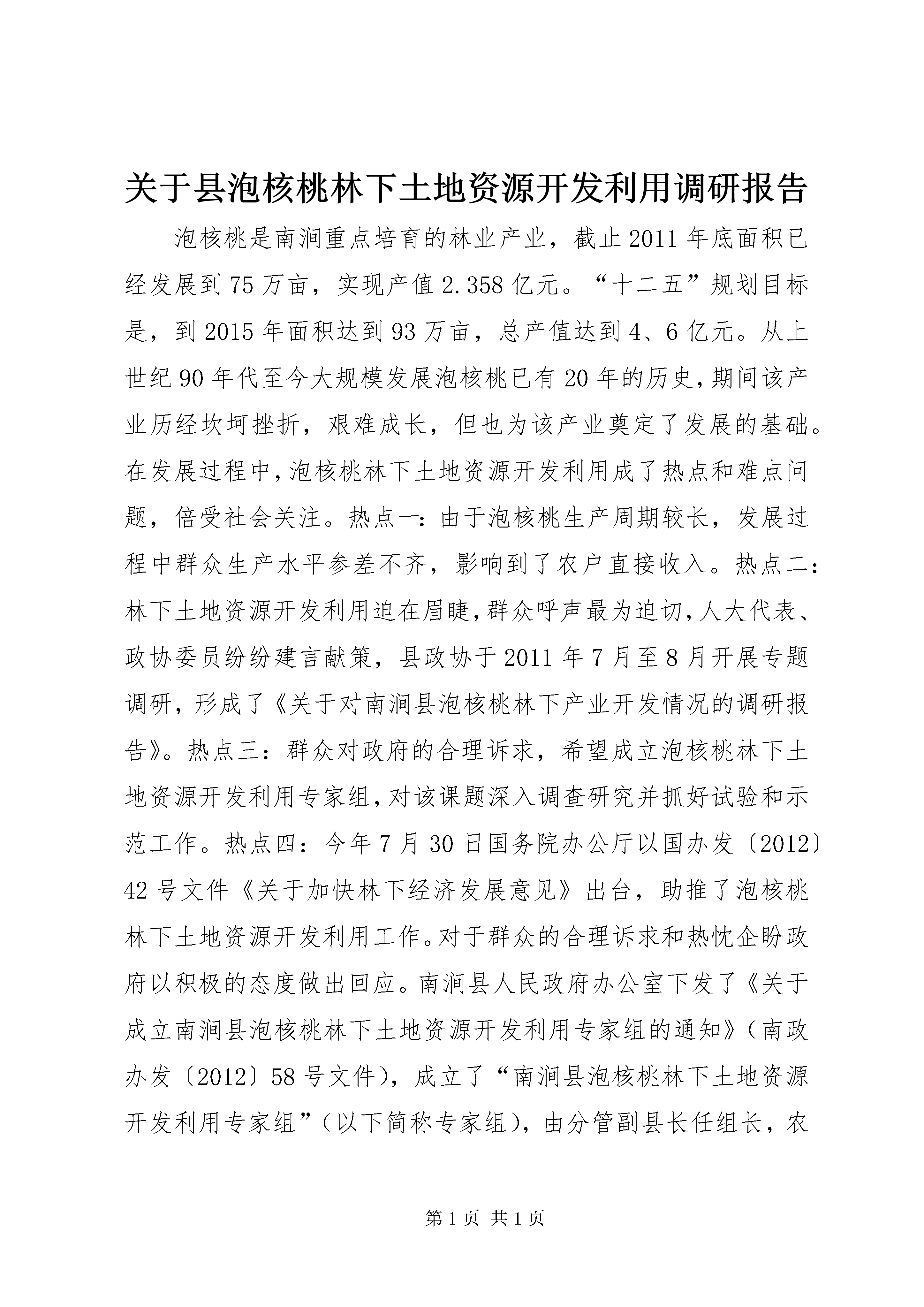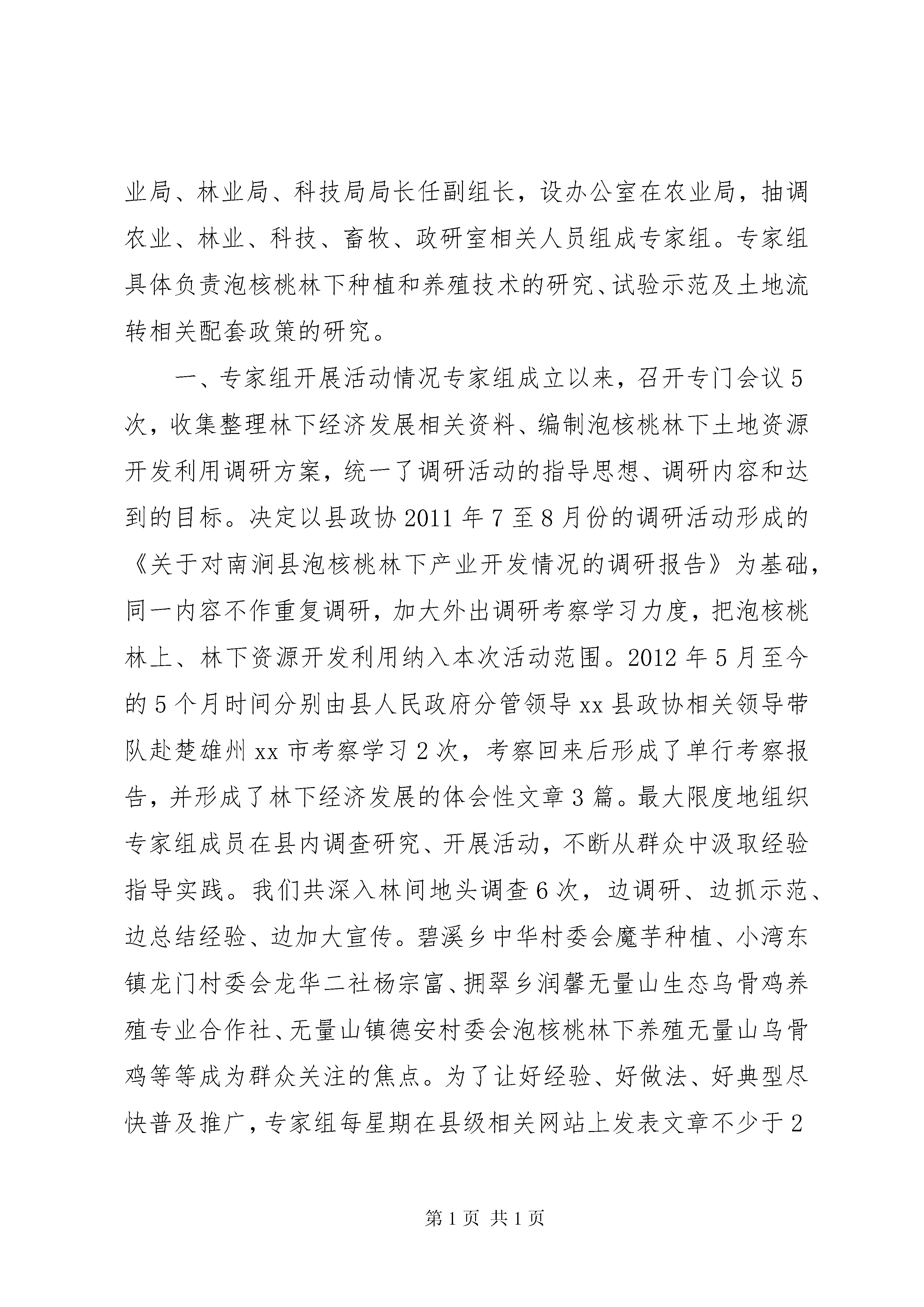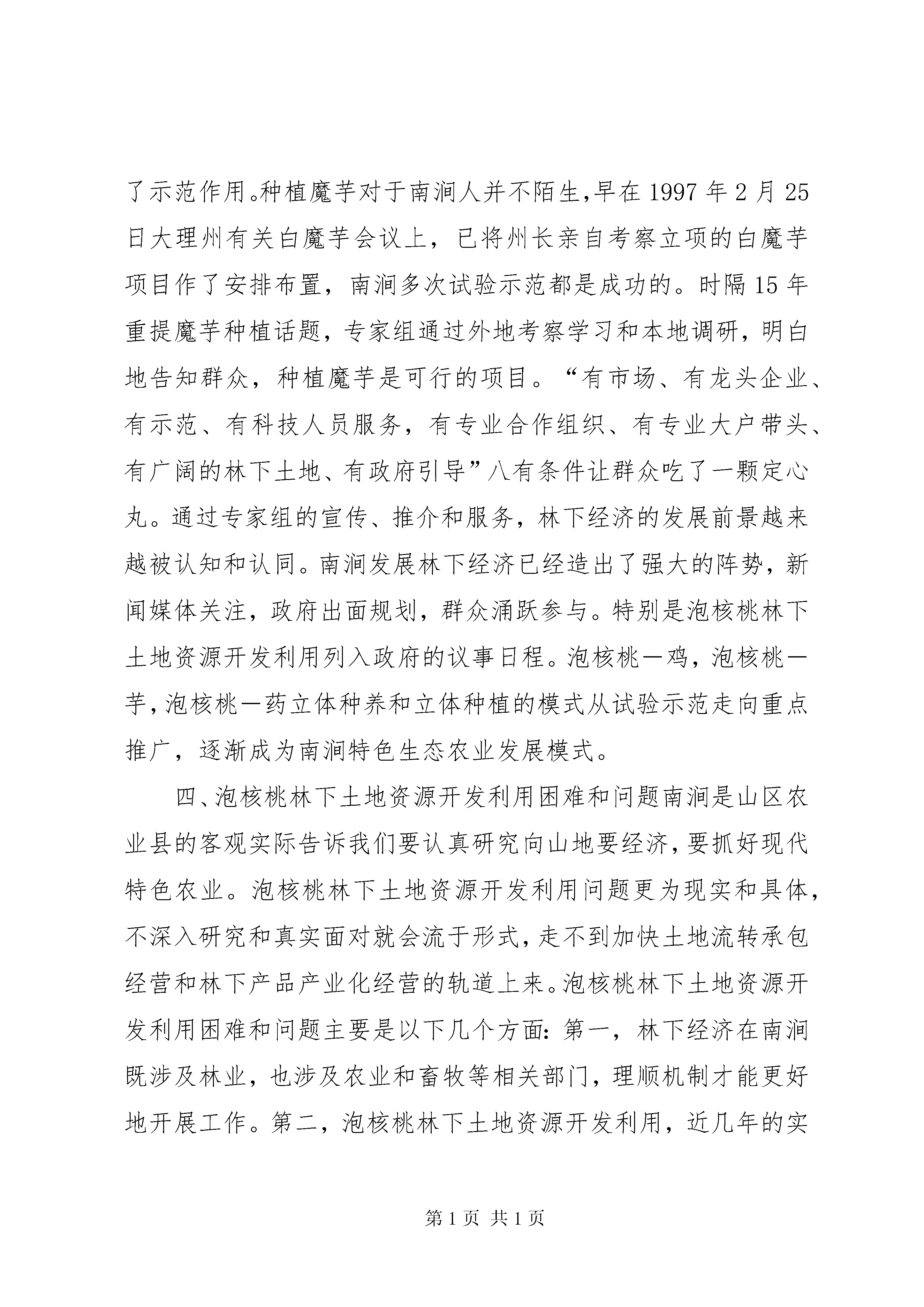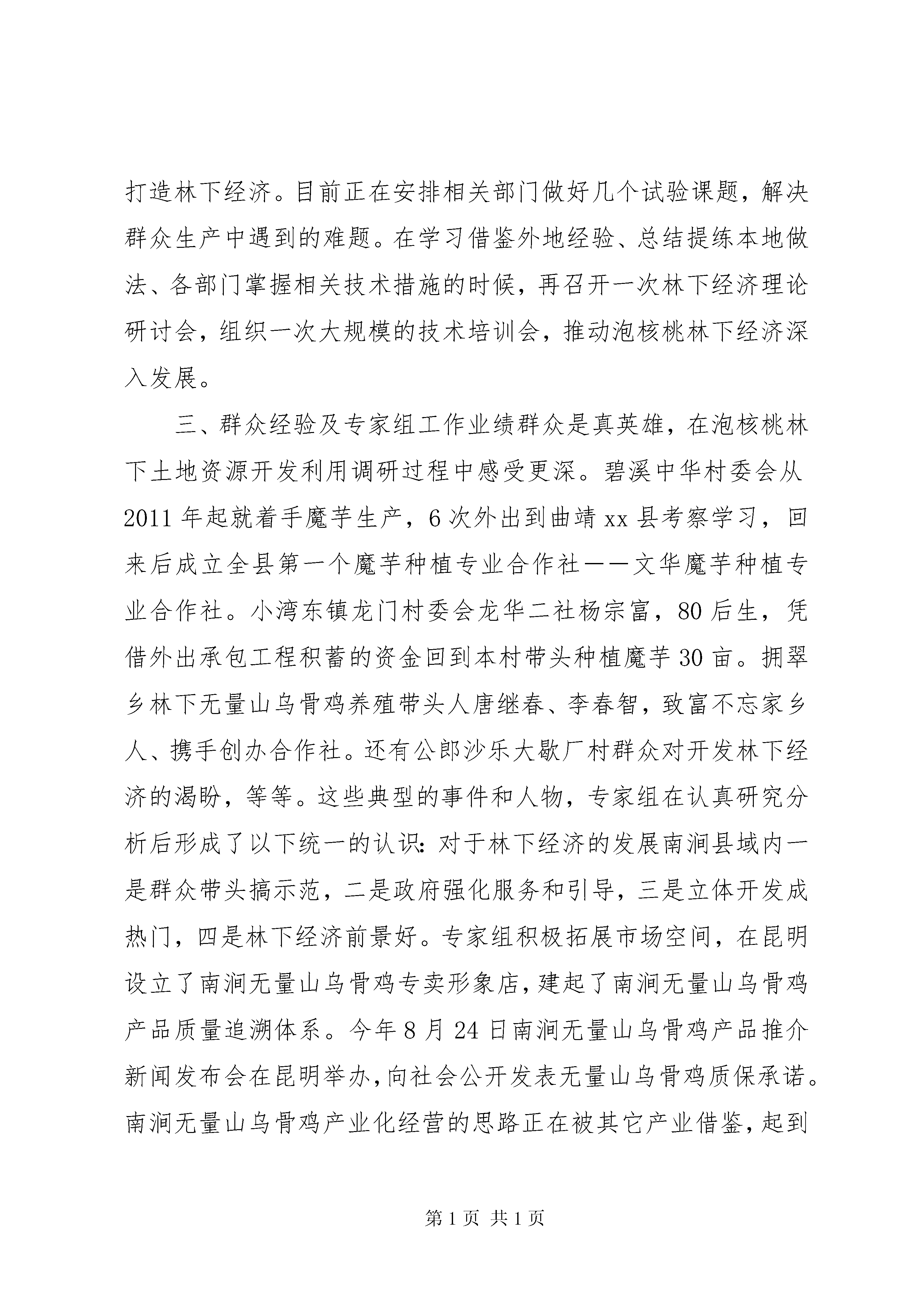 关于县泡核桃林下土地资源开发利用调研报告泡核桃是南涧重点培育的林业产业,截止2011年底面积已经发展到75万亩,实现产值2.358亿元。“十二五”规划目标是,到2015年面积达到93万亩,总产值达到4、6亿元。从上世纪90年代至今大规模发展泡核桃已有20年的历史,期间该产业历经坎坷挫折,艰难成长,但也为该产业奠定了发展的基础。在发展过程中,泡核桃林下土地资源开发利用成了热点和难点问题,倍受社会关注。热点一:由于泡核桃生产周期较长,发展过程中群众生产水平参差不齐,影响到了农户直接收入。热点二:林下土地资源开发利用迫在眉睫,群众呼声最为迫切,人大代表、政协委员纷纷建言献策,县政协于2011年7月至8月开展专题调研,形成了《关于对南涧县泡核桃林下产业开发情况的调研报告》。热点三:群众对政府的合理诉求,希望成立泡核桃林下土地资源开发利用专家组,对该课题深入调查研究并抓好试验和示范工作。热点四:今年7月30日国务院办公厅以国办发〔2012〕42号文件《关于加快林下经济发展意见》出台,助推了泡核桃林下土地资源开发利用工作。对于群众的合理诉求和热忱企盼政府以积极的态度做出回应。南涧县人民政府办公室下发了《关于成立南涧县泡核桃林下土地资源开发利用专家组的通知》(南政办发〔2012〕58号文件),成立了“南涧县泡核桃林下土地资源开发利用专家组”(以下简称专家组),由分管副县长任组长,农业局、林业局、科技局局长任副组长,设办公室在农业局,抽调农业、林业、科技、畜牧、政研室相关人员组成专家组。专家组具体负责泡核桃林下种植和养殖技术的研究、试验示范及土地流转相关配套政策的研究。一、专家组开展活动情况专家组成立以来,召开专门会议5次,收集整理林下经济发展相关资料、编制泡核桃林下土地资源开发利用调研方案,统一了调研活动的指导思想、调研内容和达到的目标。决定以县政协2011年7至8月份的调研活动形成的《关于对南涧县泡核桃林下产业开发情况的调研报告》为基础,同一内容不作重复调研,加大外出调研考察学习力度,把泡核桃林上、林下资源开发利用纳入本次活动范围。2012年5月至今的5个月时间分别由县人民政府分管领导xx县政协相关领导带队赴楚雄州xx市考察学习2次,考察回来后形成了单行考察报告,并形成了林下经济发展的体会性文章3篇。最大限度地组织专家组成员在县内调查研究、开展活动,不断从群众中汲取经验指导实践。我们共深入林间地头调查6次,边调研、边抓示范、边总结经验、边加大宣传。碧溪乡中华村委会魔芋种植、小湾东镇龙门村委会龙华二社杨宗富、拥翠乡润馨无量山生态乌骨鸡养殖专业合作社、无量山镇德安村委会泡核桃林下养殖无量山乌骨鸡等等成为群众关注的焦点。为了让好经验、好做法、好典型尽快普及推广,专家组每星期在县级相关网站上发表文章不少于2篇,形成了质量较高的信息3条,编印《南涧通讯》专版一期。二、专家组工作进展情况一是理清思路,确立发展目标。突出抓好林上泡核桃丰产管理,泡核桃林下把养殖无量山乌骨鸡,种植魔芋和中药材作为重点。泡核桃丰产管理总结推广“六抓”措施:一抓基地,成规模,重点打造;二抓大户,促规范,示范领路;三抓连片,显优势,集约经营;四抓加工,提产值,产业成链;五抓科技,重产业,点石成金;六抓统筹,巧布局,效益最大。泡核桃林下养殖无量山乌骨鸡作为林下经济发展首选项目。拥翠乡润馨养殖场已取得初步效益,规模正在扩大,润谷养殖场正在抓紧建设中。德安村委会核桃林村、苏家村等群众自发在核桃林下养殖无量山乌骨鸡,成百上千小有名气。泡核桃林下种魔芋、种药材有专业合作社牵引,有示范大户带动。二是顺势引导,点上开花面上结果。充分发挥群众的积极性和创造性,农业、林业、畜牧、科技各产业主管部门加强配合、加大整合力度,调动科技人员强化服务、规范经营,林上、林下经济开发已俱雏形。碧溪、宝华、无量、小湾乘国务院办公厅出台《关于加快林下经济发展意见》东风,抓规划、抓示范、抓龙头,亮点纷呈。就南涧而言,林下经济发展已经呈现出群众探索搞示范,部门配合大联动、政府重视抓进度的良好局面。三是目标倒逼进度,谋划产业入正轨。专家组在调查研究的基础上,以经济效益为目标,建立生态农业发展模式,充分盘活林下土地资源,以产业化的手段打造林下经济。目前正在安排相关部门做好几个试验课题,解决群众生产中遇到的难题。在学习借鉴外地经验、总结提练本地做法、各部门掌握相关技术措施的时候,再召开一次林下经济理论研讨会,组织一次大规模的技术培训会,推动泡核桃林下经济深入发展。三、群众经验及专家组工作业绩群众是真英雄,在泡核桃林下土地资源开发利用调研过程中感受更深。碧溪中华村委会从2011年起就着手魔芋生产,6次外出到曲靖xx县考察学习,回来后成立全县第一个魔芋种植专业合作社――文华魔芋种植专业合作社。小湾东镇