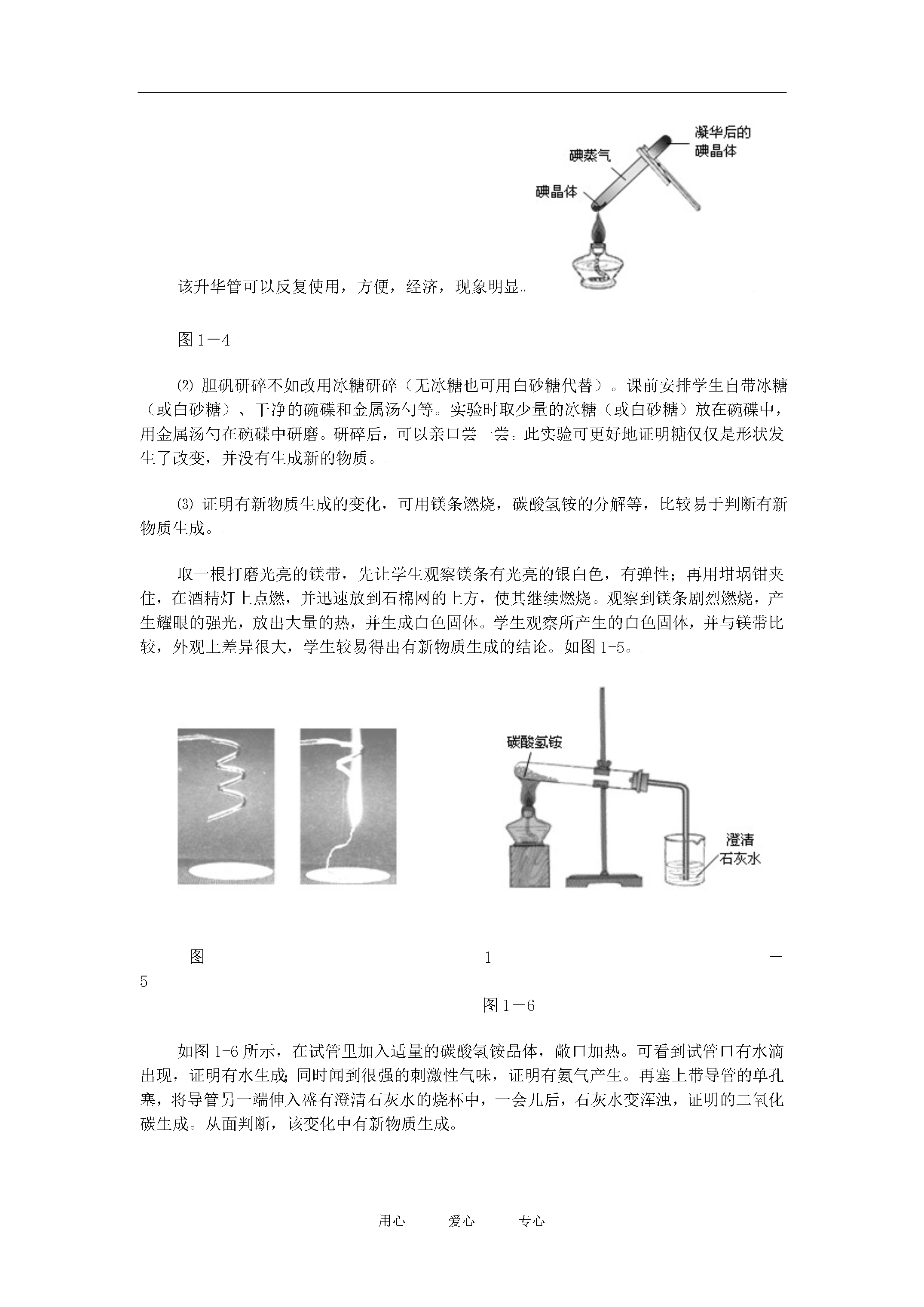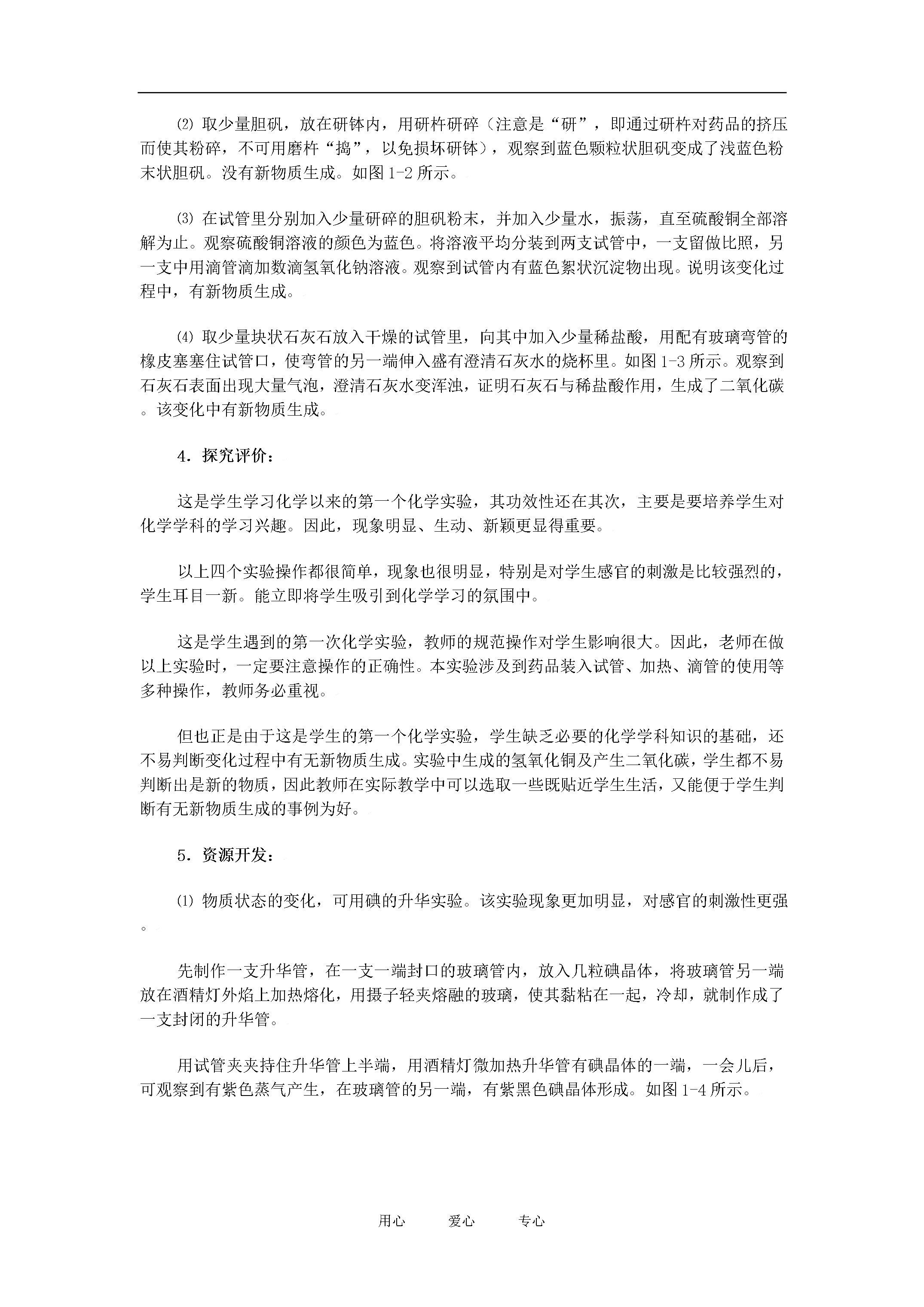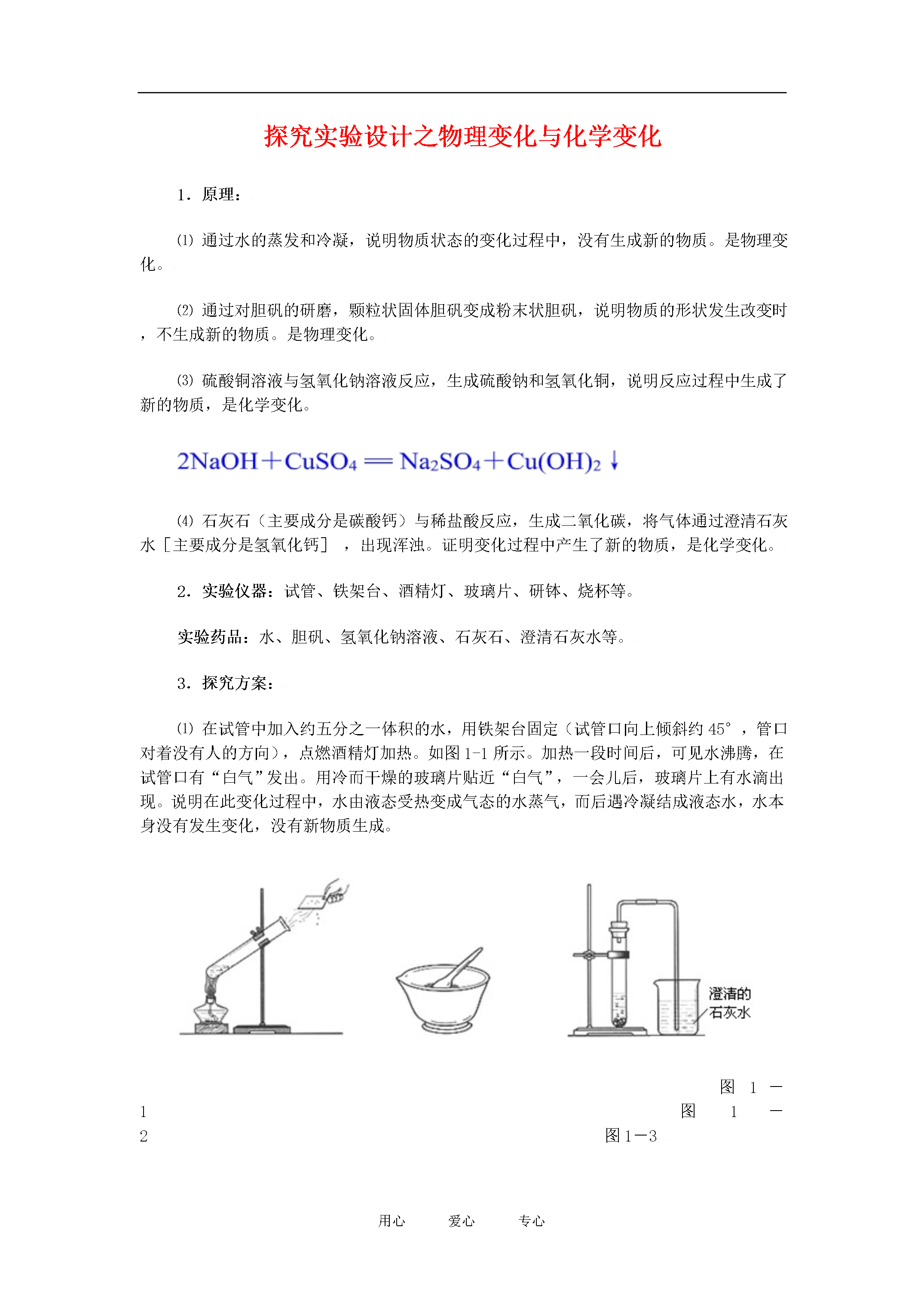 用心爱心专心探究实验设计之物理变化与化学变化1.原理:⑴通过水的蒸发和冷凝,说明物质状态的变化过程中,没有生成新的物质。是物理变化。⑵通过对胆矾的研磨,颗粒状固体胆矾变成粉末状胆矾,说明物质的形状发生改变时,不生成新的物质。是物理变化。⑶硫酸铜溶液与氢氧化钠溶液反应,生成硫酸钠和氢氧化铜,说明反应过程中生成了新的物质,是化学变化。⑷石灰石(主要成分是碳酸钙)与稀盐酸反应,生成二氧化碳,将气体通过澄清石灰水[主要成分是氢氧化钙],出现浑浊。证明变化过程中产生了新的物质,是化学变化。2.实验仪器:试管、铁架台、酒精灯、玻璃片、研钵、烧杯等。实验药品:水、胆矾、氢氧化钠溶液、石灰石、澄清石灰水等。3.探究方案:⑴在试管中加入约五分之一体积的水,用铁架台固定(试管口向上倾斜约45°,管口对着没有人的方向),点燃酒精灯加热。如图1-1所示。加热一段时间后,可见水沸腾,在试管口有“白气”发出。用冷而干燥的玻璃片贴近“白气”,一会儿后,玻璃片上有水滴出现。说明在此变化过程中,水由液态受热变成气态的水蒸气,而后遇冷凝结成液态水,水本身没有发生变化,没有新物质生成。图1-1图1-2图1-3⑵取少量胆矾,放在研钵内,用研杵研碎(注意是“研”,即通过研杵对药品的挤压而使其粉碎,不可用磨杵“捣”,以免损坏研钵),观察到蓝色颗粒状胆矾变成了浅蓝色粉末状胆矾。没有新物质生成。如图1-2所示。⑶在试管里分别加入少量研碎的胆矾粉末,并加入少量水,振荡,直至硫酸铜全部溶解为止。观察硫酸铜溶液的颜色为蓝色。将溶液平均分装到两支试管中,一支留做比照,另一支中用滴管滴加数滴氢氧化钠溶液。观察到试管内有蓝色絮状沉淀物出现。说明该变化过程中,有新物质生成。⑷取少量块状石灰石放入干燥的试管里,向其中加入少量稀盐酸,用配有玻璃弯管的橡皮塞塞住试管口,使弯管的另一端伸入盛有澄清石灰水的烧杯里。如图1-3所示。观察到石灰石表面出现大量气泡,澄清石灰水变浑浊,证明石灰石与稀盐酸作用,生成了二氧化碳。该变化中有新物质生成。4.探究评价:这是学生学习化学以来的第一个化学实验,其功效性还在其次,主要是要培养学生对化学学科的学习兴趣。因此,现象明显、生动、新颖更显得重要。以上四个实验操作都很简单,现象也很明显,特别是对学生感官的刺激是比较强烈的,学生耳目一新。能立即将学生吸引到化学学习的氛围中。这是学生遇到的第一次化学实验,教师的规范操作对学生影响很大。因此,老师在做以上实验时,一定要注意操作的正确性。本实验涉及到药品装入试管、加热、滴管的使用等多种操作,教师务必重视。但也正是由于这是学生的第一个化学实验,学生缺乏必要的化学学科知识的基础,还不易判断变化过程中有无新物质生成。实验中生成的氢氧化铜及产生二氧化碳,学生都不易判断出是新的物质,因此教师在实际教学中可以选取一些既贴近学生生活,又能便于学生判断有无新物质生成的事例为好。5.资源开发:⑴物质状态的变化,可用碘的升华实验。该实验现象更加明显,对感官的刺激性更强。先制作一支升华管,在一支一端封口的玻璃管内,放入几粒碘晶体,将玻璃管另一端放在酒精灯外焰上加热熔化,用摄子轻夹熔融的玻璃,使其黏粘在一起,冷却,就制作成了一支封闭的升华管。用试管夹夹持住升华管上半端,用酒精灯微加热升华管有碘晶体的一端,一会儿后,可观察到有紫色蒸气产生,在玻璃管的另一端,有紫黑色碘晶体形成。如图1-4所示。该升华管可以反复使用,方便,经济,现象明显。图1-4⑵胆矾研碎不如改用冰糖研碎(无冰糖也可用白砂糖代替)。课前安排学生自带冰糖(或白砂糖)、干净的碗碟和金属汤勺等。实验时取少量的冰糖(或白砂糖)放在碗碟中,用金属汤勺在碗碟中研磨。研碎后,可以亲口尝一尝。此实验可更好地证明糖仅仅是形状发生了改变,并没有生成新的物质。⑶证明有新物质生成的变化,可用镁条燃烧,碳酸氢铵的分解等,比较易于判断有新物质生成。取一根打磨光亮的镁带,先让学生观察镁条有光亮的银白色,有弹性;再用坩埚钳夹住,在酒精灯上点燃,并迅速放到石棉网的上方,使其继续燃烧。观察到镁条剧烈燃烧,产生耀眼的强光,放出大量的热,并生成白色固体。学生观察所产生的白色固体,并与镁带比较,外观上差异很大,学生较易得出有新物质生成的结论。如图1-5。图1-5图1-6如图1-6所示,在试管里加入适量的碳酸氢铵晶体,敞口加热。可看到试管口有水滴出现,证明有水生成;同时闻到很强的刺激性气味,证明有氨气产生。再塞上带导管的单孔塞,将导管另一端伸入盛有澄清石灰水的烧杯中,一会儿后,石灰水变浑浊,证明的二氧化碳生成。从面判断,该变化中有新物质生成。