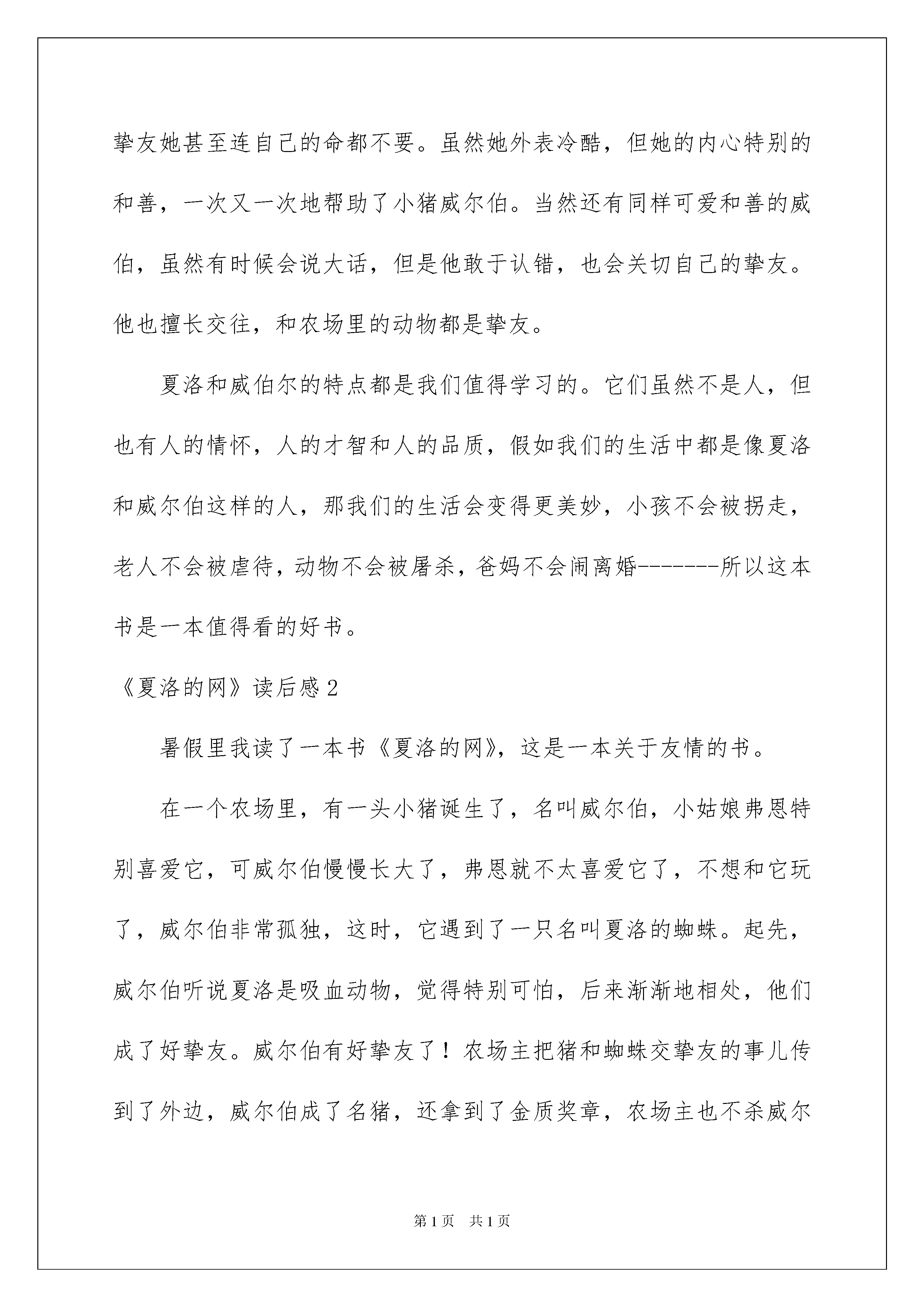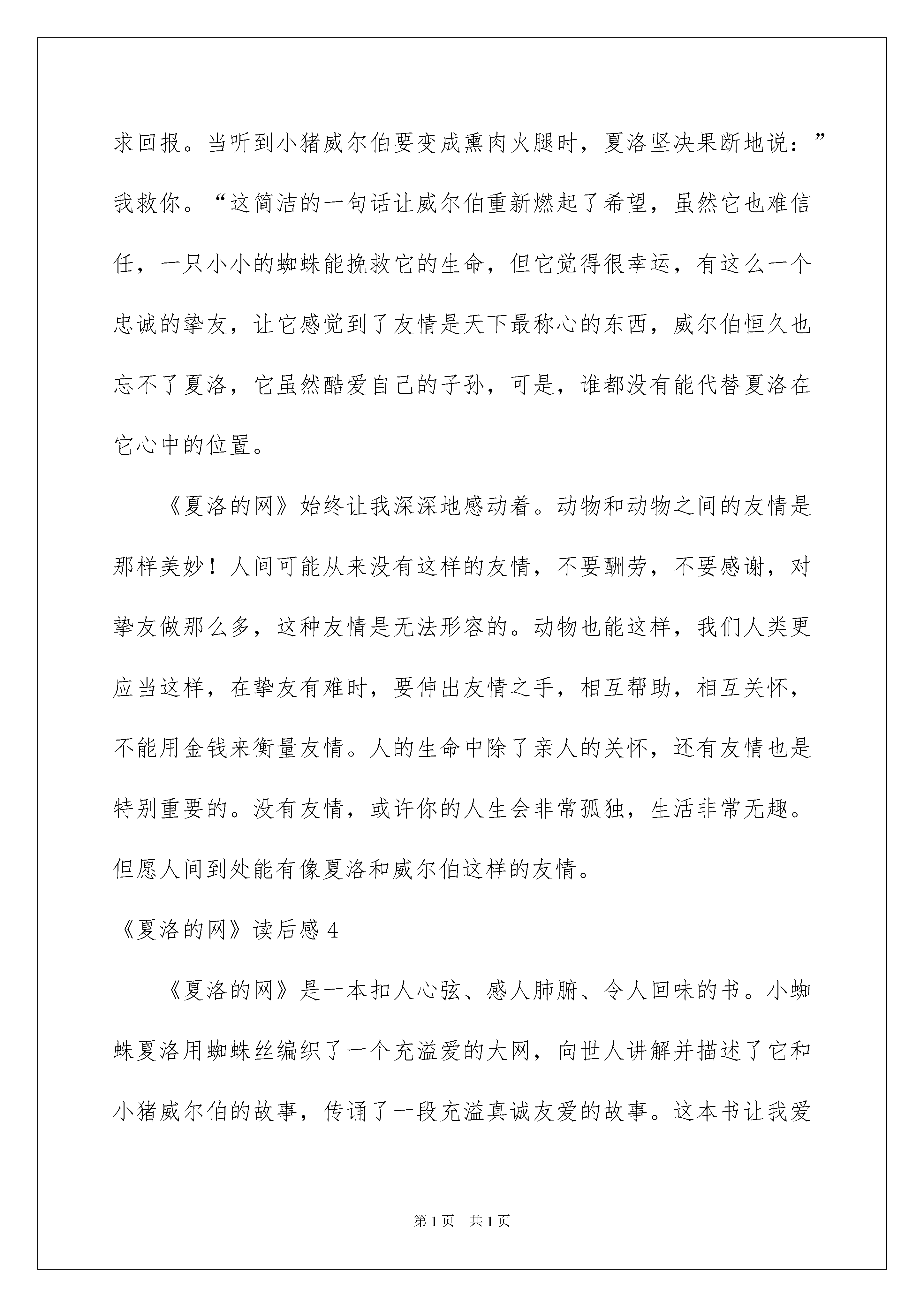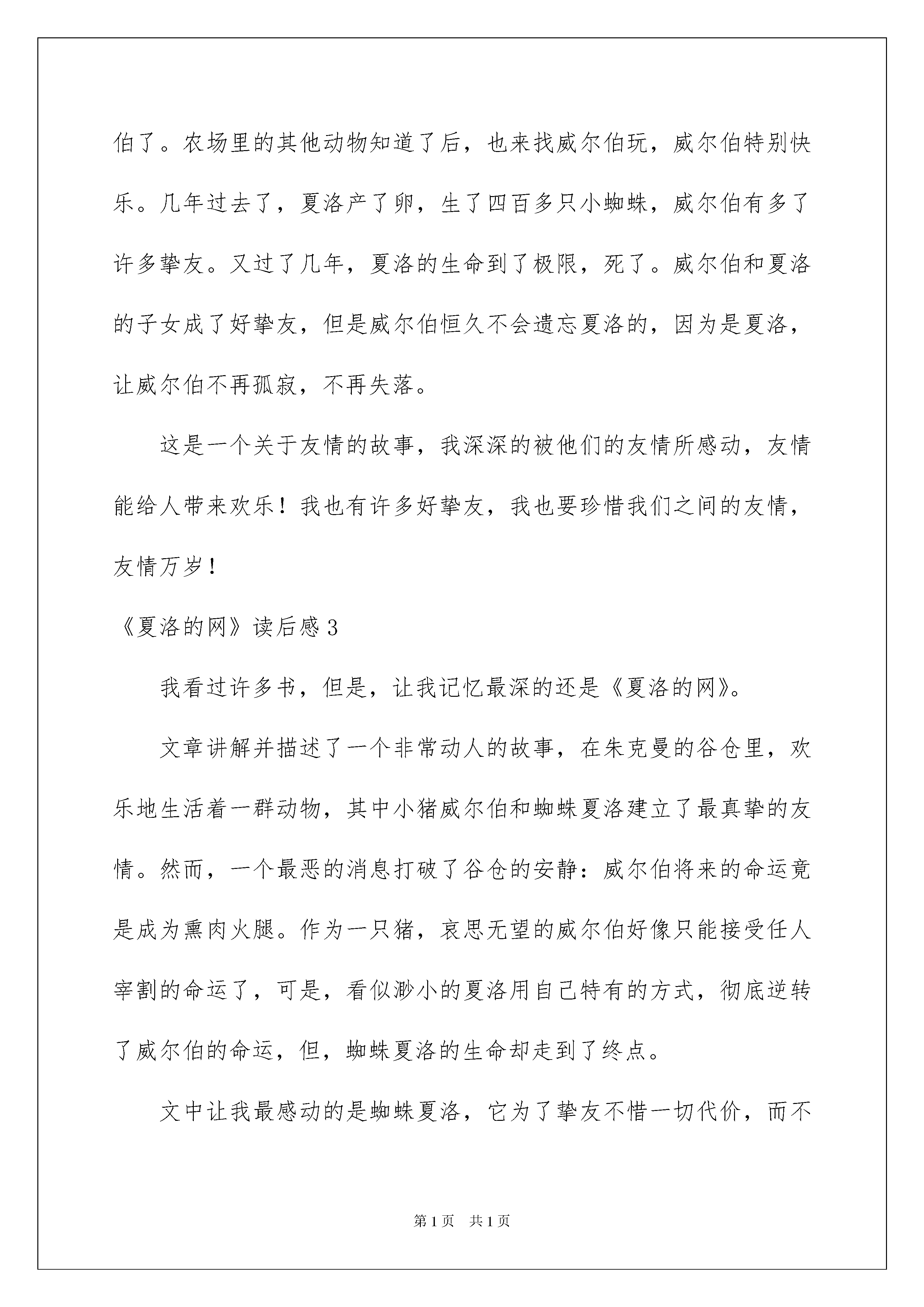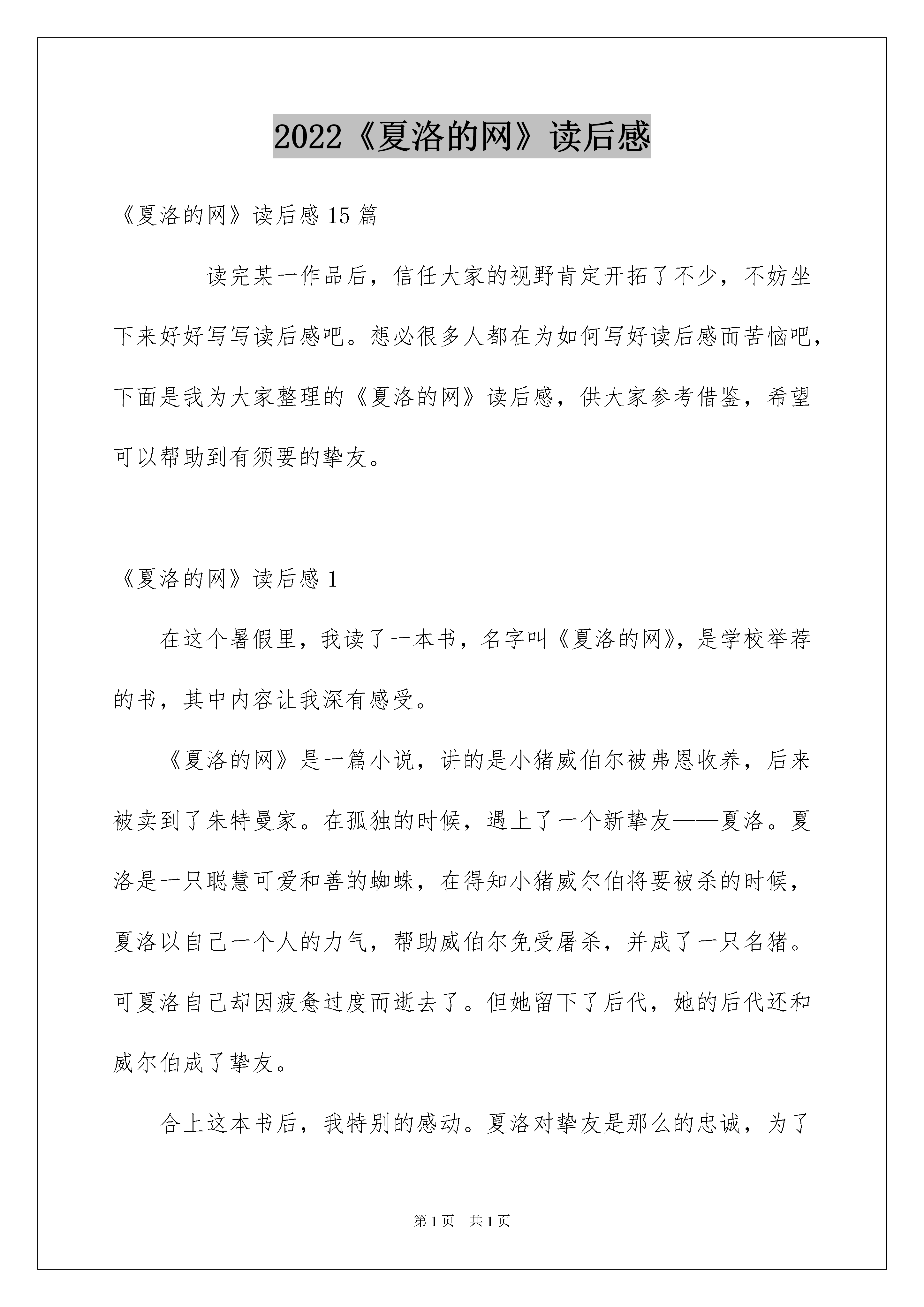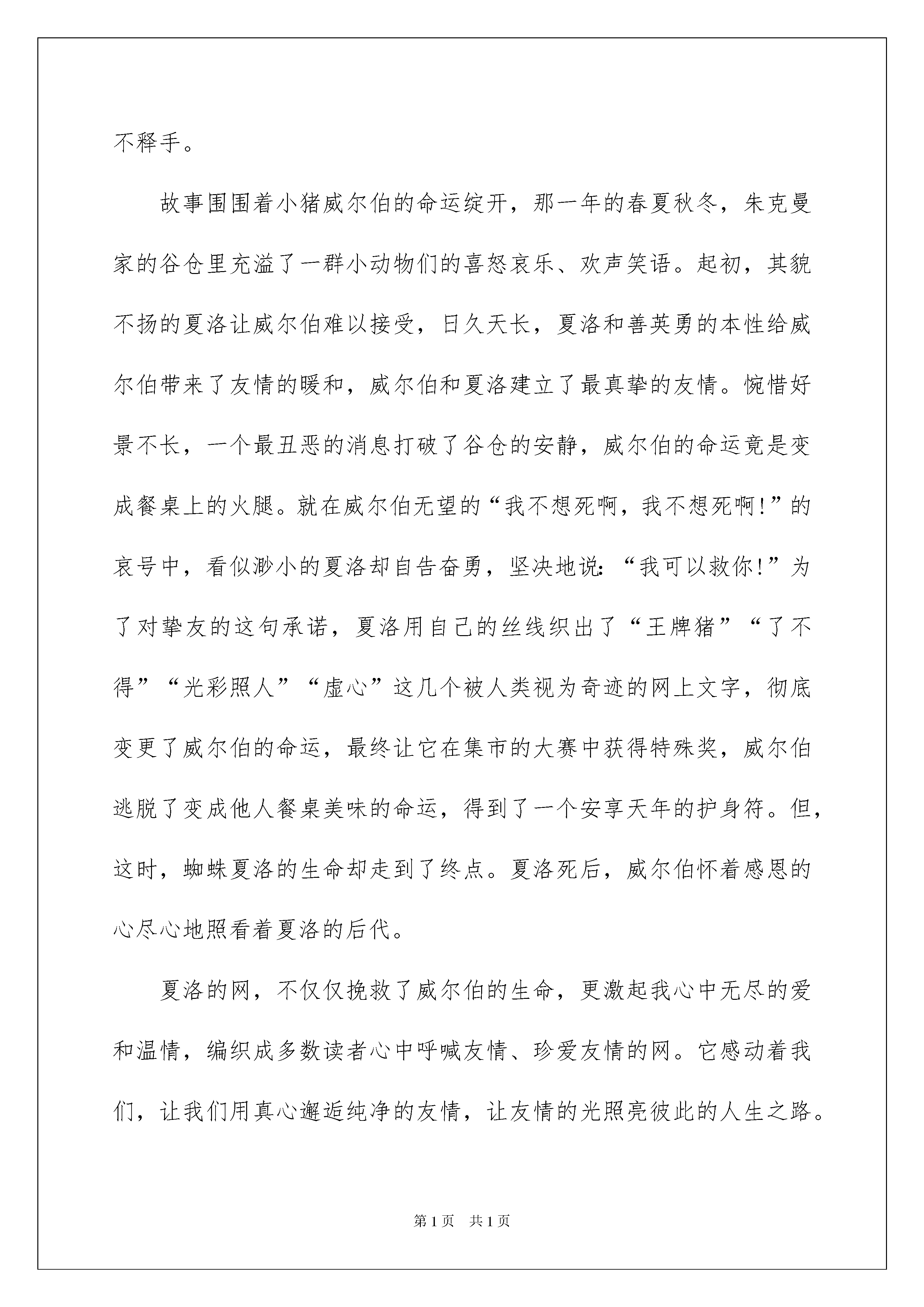 2022《夏洛的网》读后感《夏洛的网》读后感15篇读完某一作品后,信任大家的视野肯定开拓了不少,不妨坐下来好好写写读后感吧。想必很多人都在为如何写好读后感而苦恼吧,下面是我为大家整理的《夏洛的网》读后感,供大家参考借鉴,希望可以帮助到有须要的挚友。《夏洛的网》读后感1在这个暑假里,我读了一本书,名字叫《夏洛的网》,是学校举荐的书,其中内容让我深有感受。《夏洛的网》是一篇小说,讲的是小猪威伯尔被弗恩收养,后来被卖到了朱特曼家。在孤独的时候,遇上了一个新挚友——夏洛。夏洛是一只聪慧可爱和善的蜘蛛,在得知小猪威尔伯将要被杀的时候,夏洛以自己一个人的力气,帮助威伯尔免受屠杀,并成了一只名猪。可夏洛自己却因疲惫过度而逝去了。但她留下了后代,她的后代还和威尔伯成了挚友。合上这本书后,我特别的感动。夏洛对挚友是那么的忠诚,为了挚友她甚至连自己的命都不要。虽然她外表冷酷,但她的内心特别的和善,一次又一次地帮助了小猪威尔伯。当然还有同样可爱和善的威伯,虽然有时候会说大话,但是他敢于认错,也会关切自己的挚友。他也擅长交往,和农场里的动物都是挚友。夏洛和威伯尔的特点都是我们值得学习的。它们虽然不是人,但也有人的情怀,人的才智和人的品质,假如我们的生活中都是像夏洛和威尔伯这样的人,那我们的生活会变得更美妙,小孩不会被拐走,老人不会被虐待,动物不会被屠杀,爸妈不会闹离婚-------所以这本书是一本值得看的好书。《夏洛的网》读后感2暑假里我读了一本书《夏洛的网》,这是一本关于友情的书。在一个农场里,有一头小猪诞生了,名叫威尔伯,小姑娘弗恩特别喜爱它,可威尔伯慢慢长大了,弗恩就不太喜爱它了,不想和它玩了,威尔伯非常孤独,这时,它遇到了一只名叫夏洛的蜘蛛。起先,威尔伯听说夏洛是吸血动物,觉得特别可怕,后来渐渐地相处,他们成了好挚友。威尔伯有好挚友了!农场主把猪和蜘蛛交挚友的事儿传到了外边,威尔伯成了名猪,还拿到了金质奖章,农场主也不杀威尔伯了。农场里的其他动物知道了后,也来找威尔伯玩,威尔伯特别快乐。几年过去了,夏洛产了卵,生了四百多只小蜘蛛,威尔伯有多了许多挚友。又过了几年,夏洛的生命到了极限,死了。威尔伯和夏洛的子女成了好挚友,但是威尔伯恒久不会遗忘夏洛的,因为是夏洛,让威尔伯不再孤寂,不再失落。这是一个关于友情的故事,我深深的被他们的友情所感动,友情能给人带来欢乐!我也有许多好挚友,我也要珍惜我们之间的友情,友情万岁!《夏洛的网》读后感3我看过许多书,但是,让我记忆最深的还是《夏洛的网》。文章讲解并描述了一个非常动人的故事,在朱克曼的谷仓里,欢乐地生活着一群动物,其中小猪威尔伯和蜘蛛夏洛建立了最真挚的友情。然而,一个最恶的消息打破了谷仓的安静:威尔伯将来的命运竟是成为熏肉火腿。作为一只猪,哀思无望的威尔伯好像只能接受任人宰割的命运了,可是,看似渺小的夏洛用自己特有的方式,彻底逆转了威尔伯的命运,但,蜘蛛夏洛的生命却走到了终点。文中让我最感动的是蜘蛛夏洛,它为了挚友不惜一切代价,而不求回报。当听到小猪威尔伯要变成熏肉火腿时,夏洛坚决果断地说:”我救你。“这简洁的一句话让威尔伯重新燃起了希望,虽然它也难信任,一只小小的蜘蛛能挽救它的生命,但它觉得很幸运,有这么一个忠诚的挚友,让它感觉到了友情是天下最称心的东西,威尔伯恒久也忘不了夏洛,它虽然酷爱自己的子孙,可是,谁都没有能代替夏洛在它心中的位置。《夏洛的网》始终让我深深地感动着。动物和动物之间的友情是那样美妙!人间可能从来没有这样的友情,不要酬劳,不要感谢,对挚友做那么多,这种友情是无法形容的。动物也能这样,我们人类更应当这样,在挚友有难时,要伸出友情之手,相互帮助,相互关怀,不能用金钱来衡量友情。人的生命中除了亲人的关怀,还有友情也是特别重要的。没有友情,或许你的人生会非常孤独,生活非常无趣。但愿人间到处能有像夏洛和威尔伯这样的友情。《夏洛的网》读后感4《夏洛的网》是一本扣人心弦、感人肺腑、令人回味的书。小蜘蛛夏洛用蜘蛛丝编织了一个充溢爱的大网,向世人讲解并描述了它和小猪威尔伯的故事,传诵了一段充溢真诚友爱的故事。这本书让我爱不释手。故事围围着小猪威尔伯的命运绽开,那一年的春夏秋冬,朱克曼家的谷仓里充溢了一群小动物们的喜怒哀乐、欢声笑语。起初,其貌不扬的夏洛让威尔伯难以接受,日久天长,夏洛和善英勇的本性给威尔伯带来了友情的暖和,威尔伯和夏洛建立了最真挚的友情。惋惜好景不长,一个最丑恶的消息打破了谷仓的安静,威尔伯的命运竟是变成餐桌上的火腿。就在威尔伯无望的“我不想死啊,我不想死啊!”的哀号中,看似渺小的夏洛却自告奋勇,坚决地说:“我可以救你!”为了
