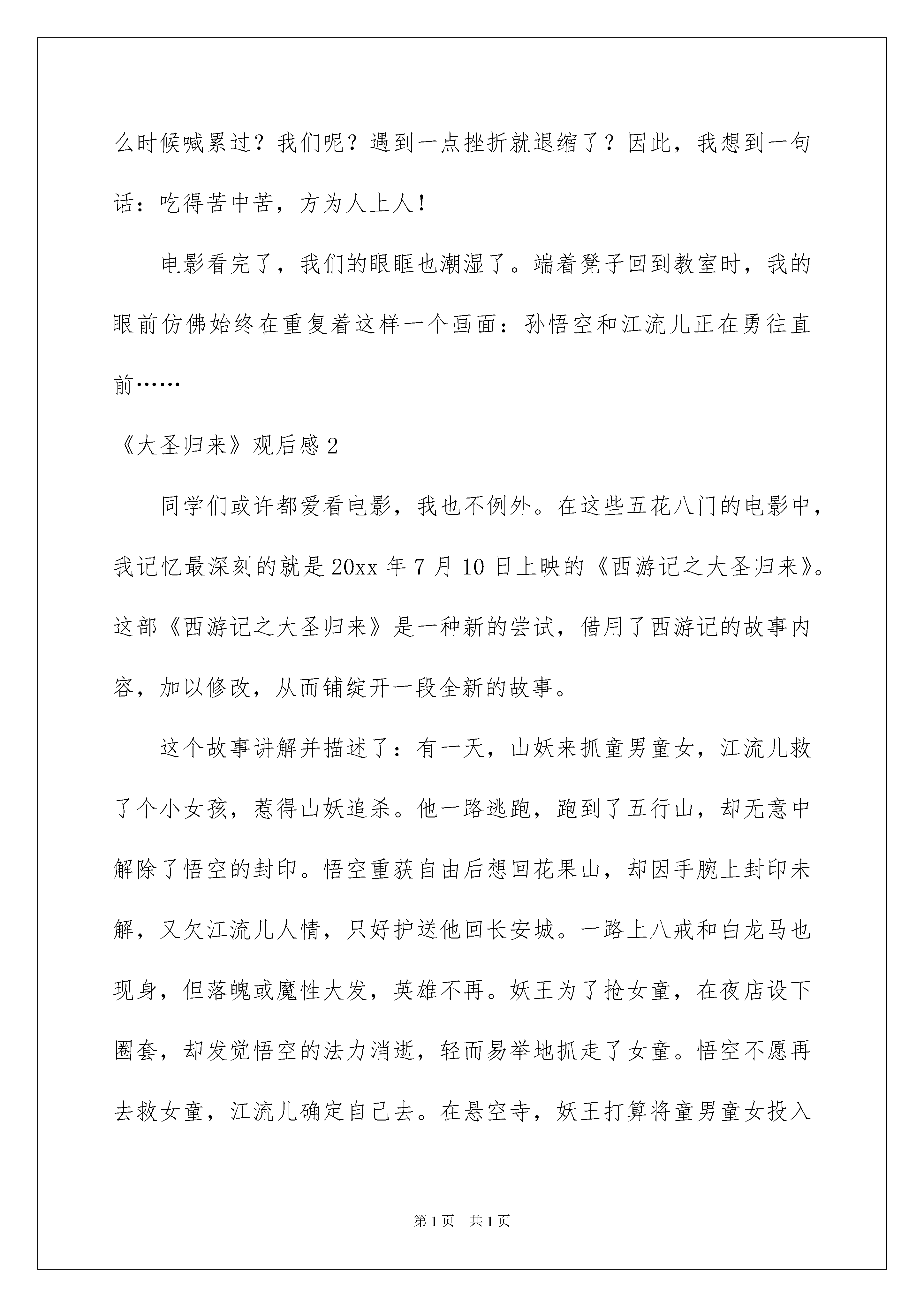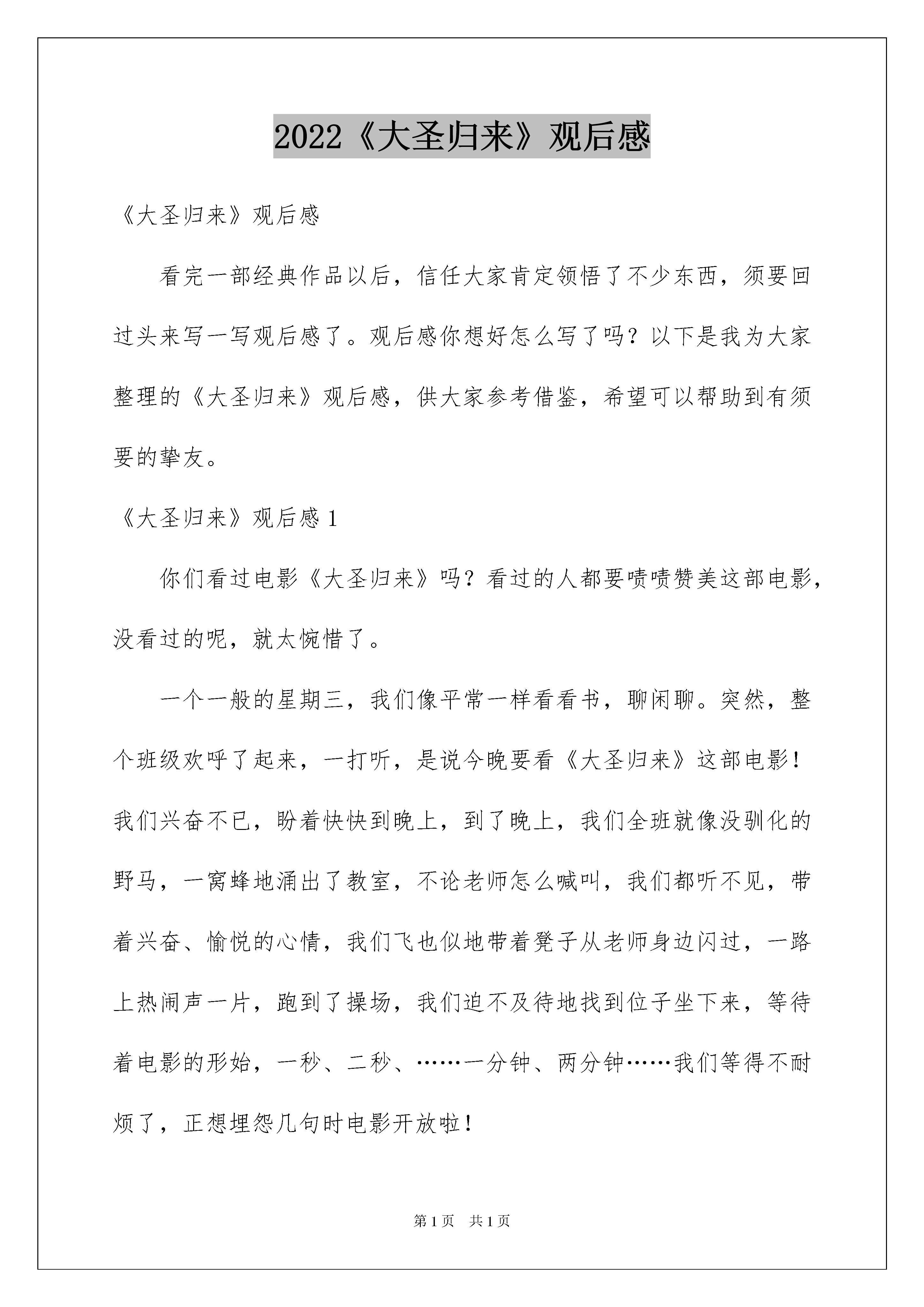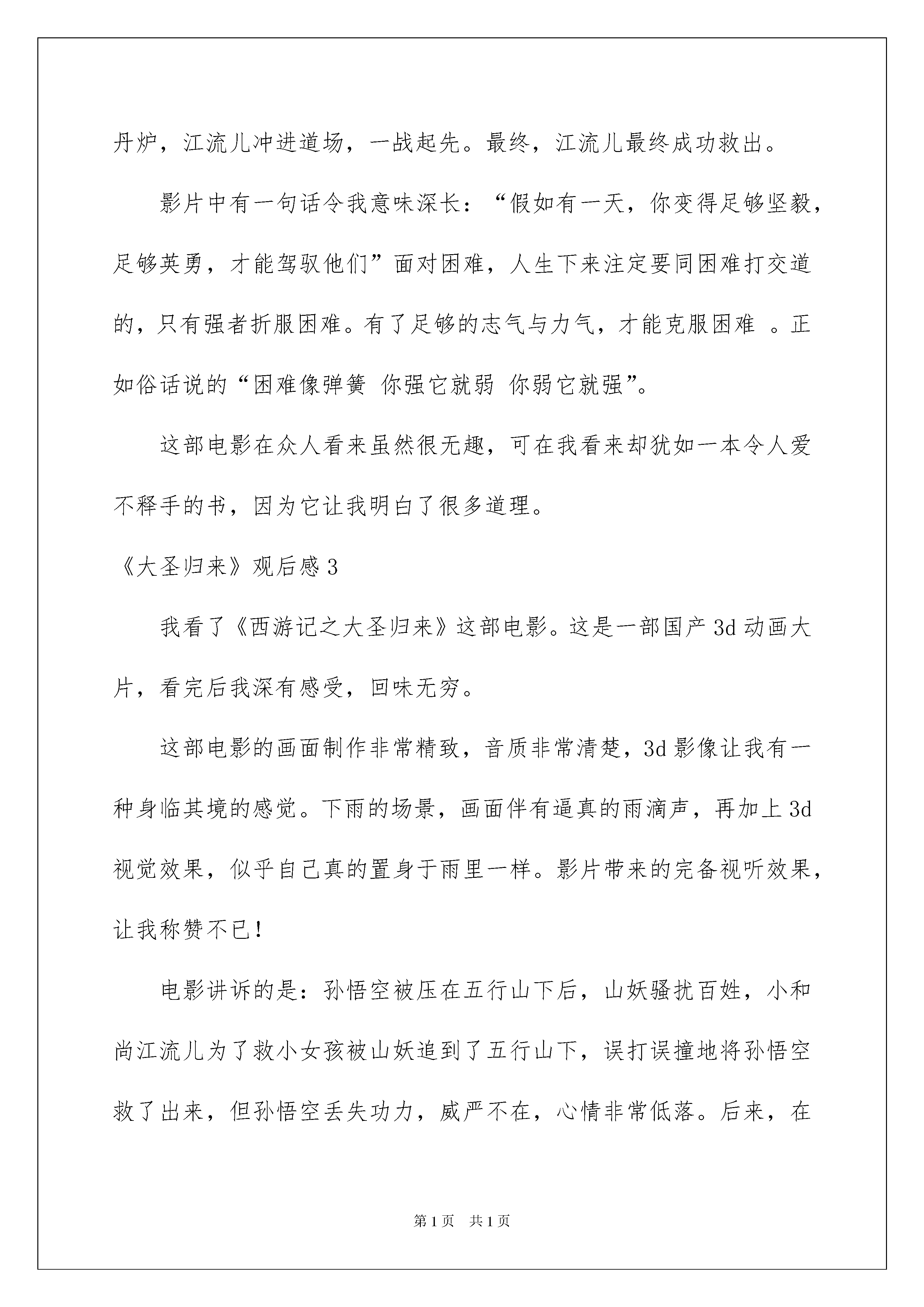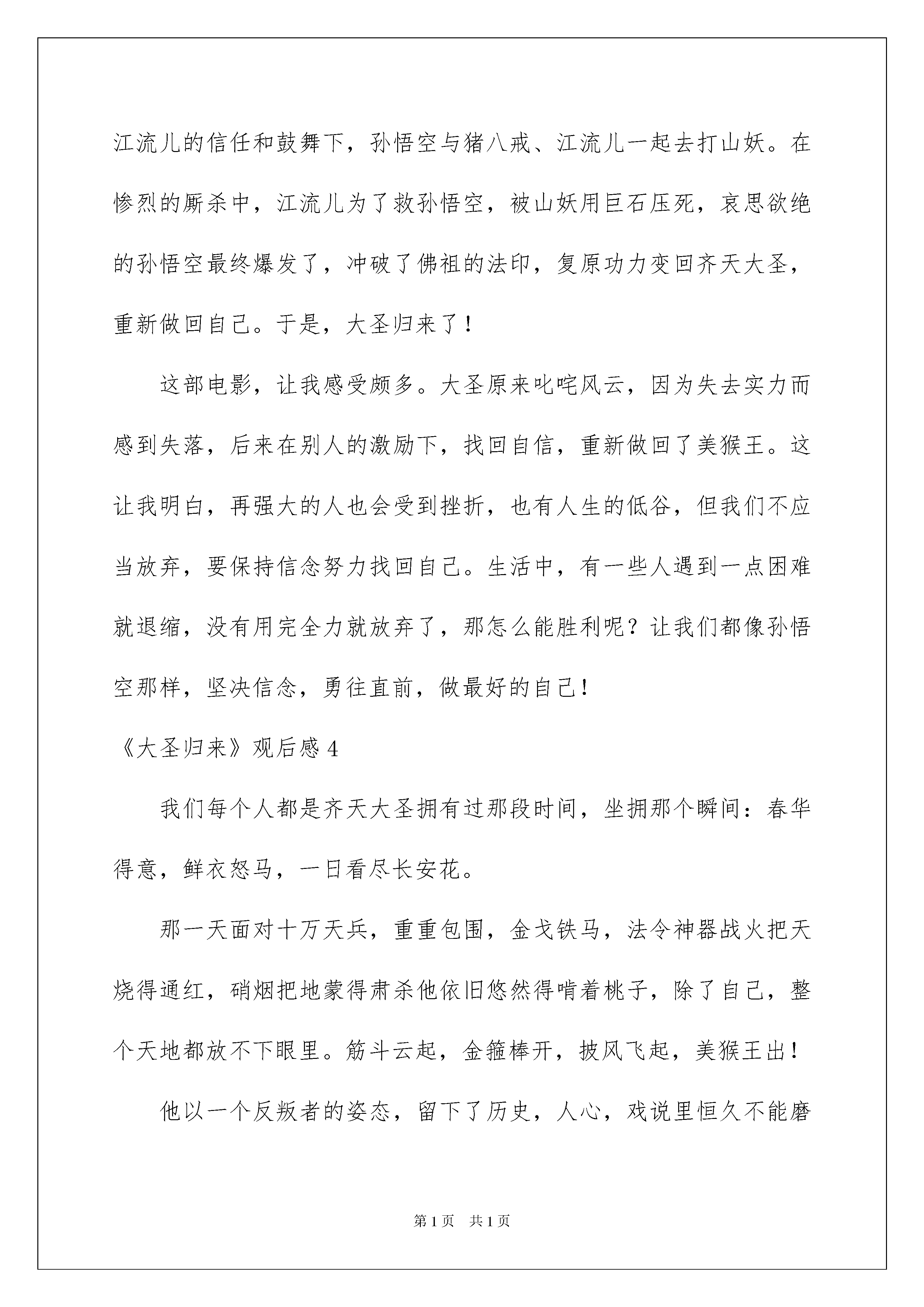 2022《大圣归来》观后感《大圣归来》观后感看完一部经典作品以后,信任大家肯定领悟了不少东西,须要回过头来写一写观后感了。观后感你想好怎么写了吗?以下是我为大家整理的《大圣归来》观后感,供大家参考借鉴,希望可以帮助到有须要的挚友。《大圣归来》观后感1你们看过电影《大圣归来》吗?看过的人都要啧啧赞美这部电影,没看过的呢,就太惋惜了。一个一般的星期三,我们像平常一样看看书,聊闲聊。突然,整个班级欢呼了起来,一打听,是说今晚要看《大圣归来》这部电影!我们兴奋不已,盼着快快到晚上,到了晚上,我们全班就像没驯化的野马,一窝蜂地涌出了教室,不论老师怎么喊叫,我们都听不见,带着兴奋、愉悦的心情,我们飞也似地带着凳子从老师身边闪过,一路上热闹声一片,跑到了操场,我们迫不及待地找到位子坐下来,等待着电影的形始,一秒、二秒、……一分钟、两分钟……我们等得不耐烦了,正想埋怨几句时电影开放啦!我看到的是小男孩江流儿等和孙悟空冒险的故事,这个故事,我看了后学会什么是关怀,而且特别的感人,我最有感受的一段就是最终的结尾,讲解并描述的是:妖王发觉了孙悟空的法力尽失,于是轻而易举地抢走了女童傻丫头,孙悟空再也不自信,嘴里始终说着:“不管了,不管了”他以前可是大圣啊,一个筋斗就是十万八千里,现在呢,他只不过是一只一般的猴子而已,江流儿看着他不去解救女童,确定自己去冒险,眼看妖王已经要把男童,女童给烧死了,江流儿确定和妖王决一死战!在激烈的斗争中,他不当心被很多乱石压住了身躯。这时悟空赶来了,他急迫地扒开一块块沉重的石头,望见一只弱小的手,举着,但又无助地倒下了……孙悟空以为江流儿死了,“啊……”孙悟空朝天长长地吼了一声,泪水挂满了他的脸颊,掉在手中齐天大圣的玩偶上。手上的封印被他友情的泪水解开了,他再次成为了齐天大圣!!孙悟空拼尽了全力,把妖王给战胜了!这时,从他身后传来了一声弱小的叫喊:“大……圣……”看到这里一股暖流从我心里涌起,江流儿没死!是呀,做人就是要有志气,就是要坚持。就像那些校级运动员们不管有多大的风风雨雨,他们都不惧怕,你只要英勇面对,才会胜利,像他们跑了一圈又一圈,练了一次又次,什么时候喊累过?我们呢?遇到一点挫折就退缩了?因此,我想到一句话:吃得苦中苦,方为人上人!电影看完了,我们的眼眶也潮湿了。端着凳子回到教室时,我的眼前仿佛始终在重复着这样一个画面:孙悟空和江流儿正在勇往直前……《大圣归来》观后感2同学们或许都爱看电影,我也不例外。在这些五花八门的电影中,我记忆最深刻的就是20xx年7月10日上映的《西游记之大圣归来》。这部《西游记之大圣归来》是一种新的尝试,借用了西游记的故事内容,加以修改,从而铺绽开一段全新的故事。这个故事讲解并描述了:有一天,山妖来抓童男童女,江流儿救了个小女孩,惹得山妖追杀。他一路逃跑,跑到了五行山,却无意中解除了悟空的封印。悟空重获自由后想回花果山,却因手腕上封印未解,又欠江流儿人情,只好护送他回长安城。一路上八戒和白龙马也现身,但落魄或魔性大发,英雄不再。妖王为了抢女童,在夜店设下圈套,却发觉悟空的法力消逝,轻而易举地抓走了女童。悟空不愿再去救女童,江流儿确定自己去。在悬空寺,妖王打算将童男童女投入丹炉,江流儿冲进道场,一战起先。最终,江流儿最终成功救出。影片中有一句话令我意味深长:“假如有一天,你变得足够坚毅,足够英勇,才能驾驭他们”面对困难,人生下来注定要同困难打交道的,只有强者折服困难。有了足够的志气与力气,才能克服困难。正如俗话说的“困难像弹簧你强它就弱你弱它就强”。这部电影在众人看来虽然很无趣,可在我看来却犹如一本令人爱不释手的书,因为它让我明白了很多道理。《大圣归来》观后感3我看了《西游记之大圣归来》这部电影。这是一部国产3d动画大片,看完后我深有感受,回味无穷。这部电影的画面制作非常精致,音质非常清楚,3d影像让我有一种身临其境的感觉。下雨的场景,画面伴有逼真的雨滴声,再加上3d视觉效果,似乎自己真的置身于雨里一样。影片带来的完备视听效果,让我称赞不已!电影讲诉的是:孙悟空被压在五行山下后,山妖骚扰百姓,小和尚江流儿为了救小女孩被山妖追到了五行山下,误打误撞地将孙悟空救了出来,但孙悟空丢失功力,威严不在,心情非常低落。后来,在江流儿的信任和鼓舞下,孙悟空与猪八戒、江流儿一起去打山妖。在惨烈的厮杀中,江流儿为了救孙悟空,被山妖用巨石压死,哀思欲绝的孙悟空最终爆发了,冲破了佛祖的法印,复原功力变回齐天大圣,重新做回自己。于是,大圣归来了!这部电影,让我感受颇多。大圣原来叱咤风云,因为失去实力而感到失落,后来在别人的激励下,找回自信,重新做回了美