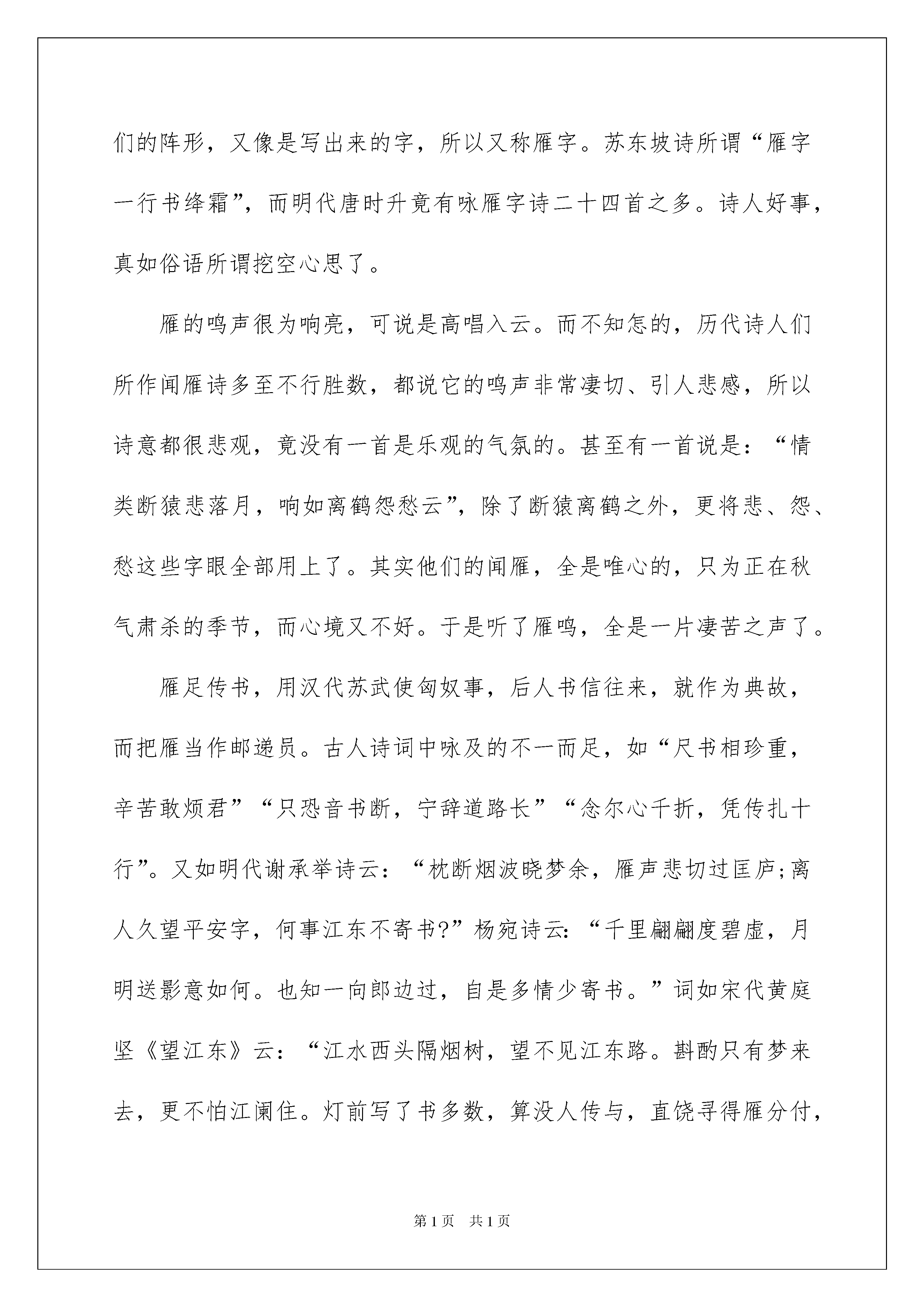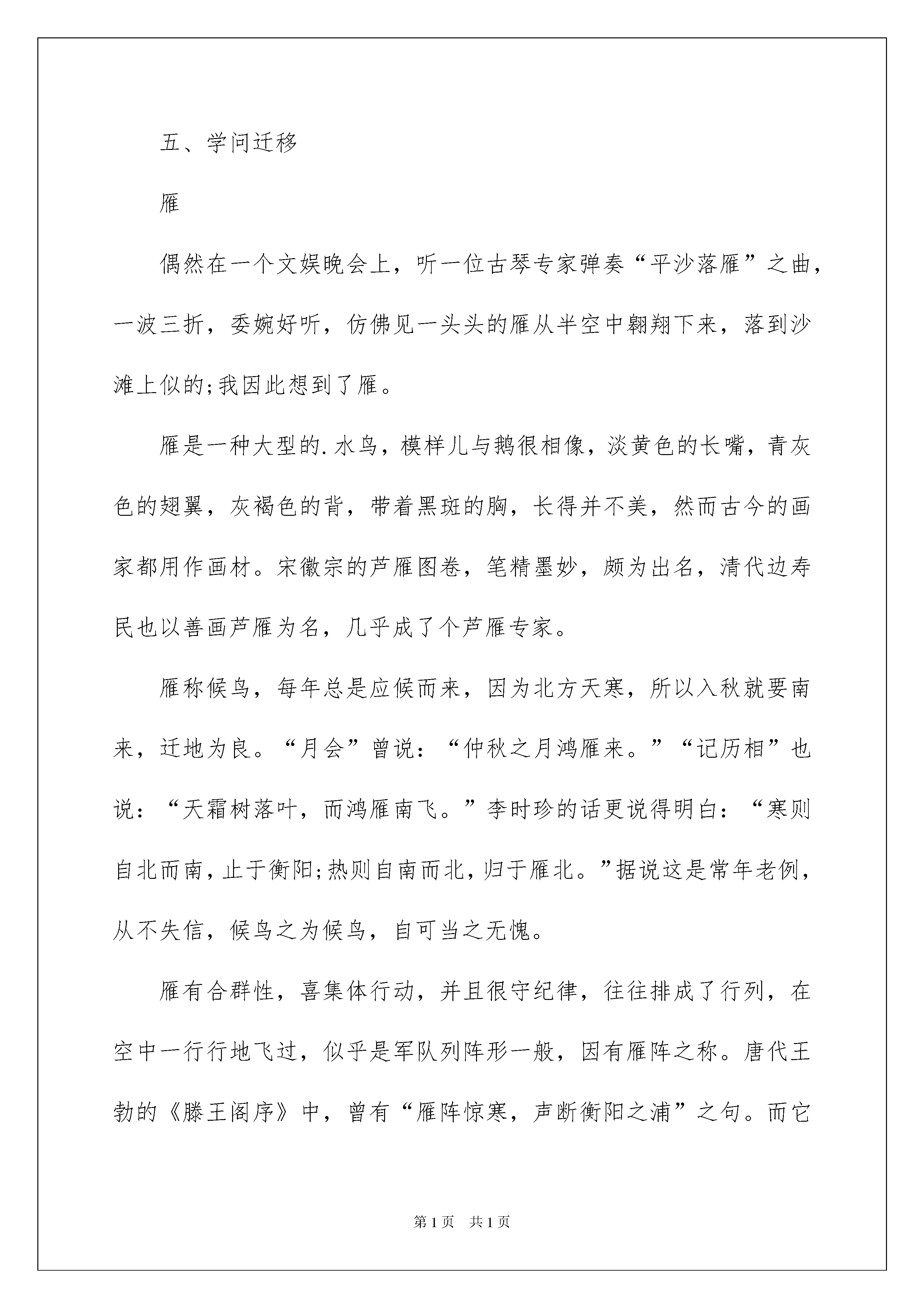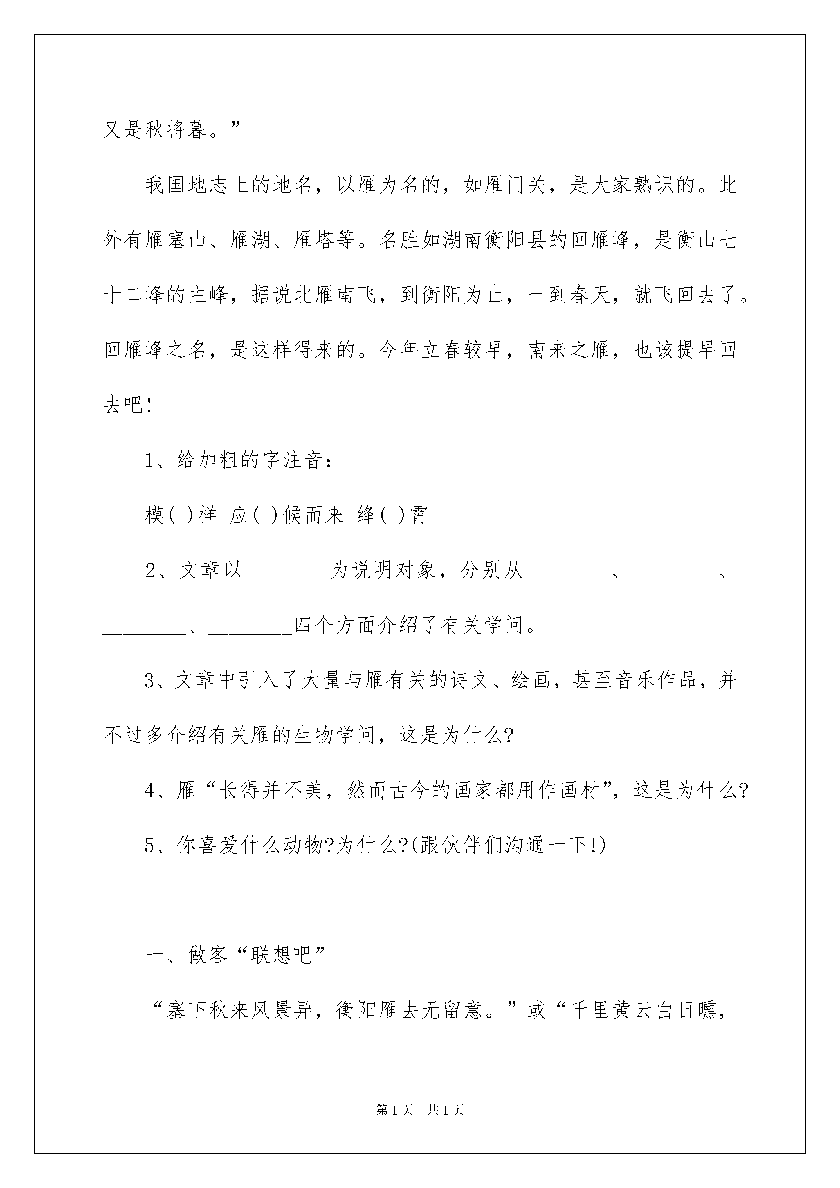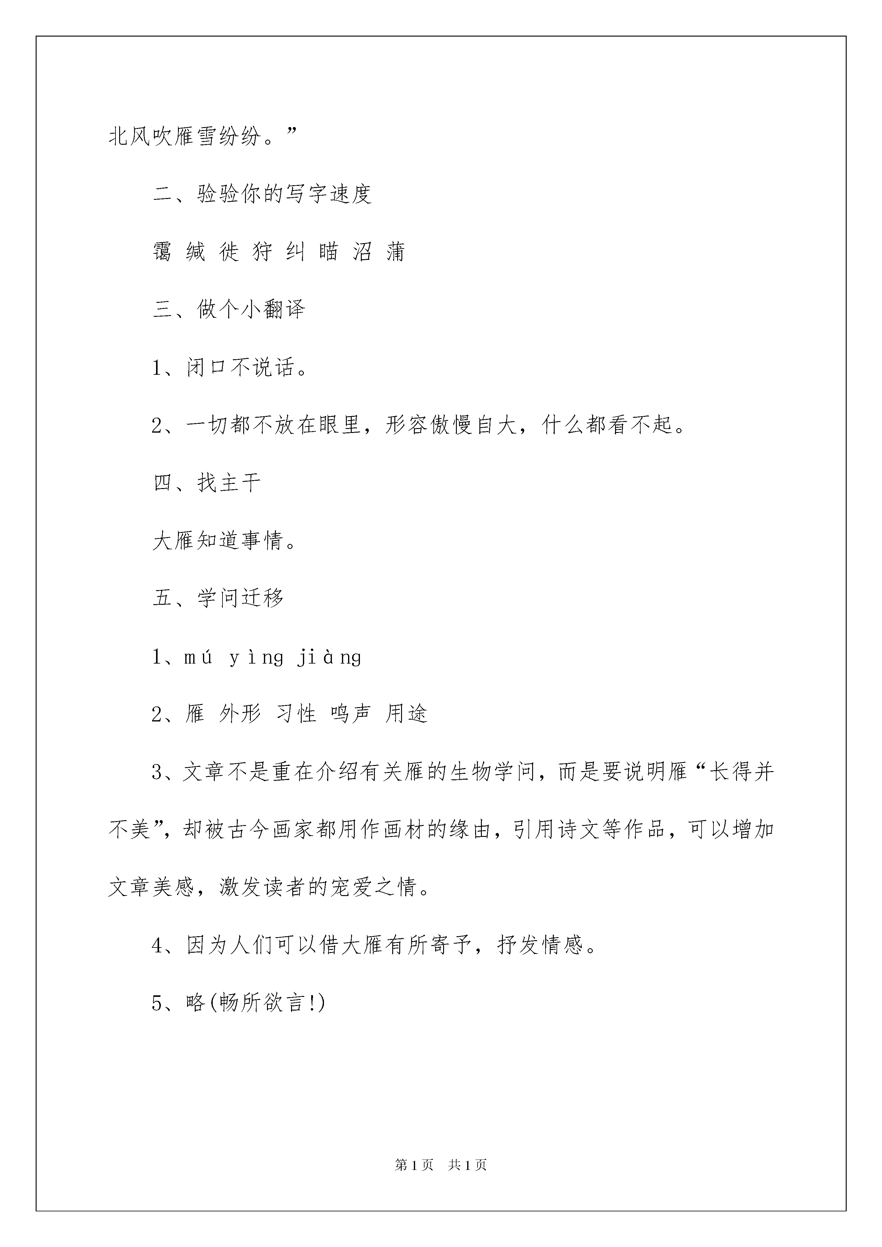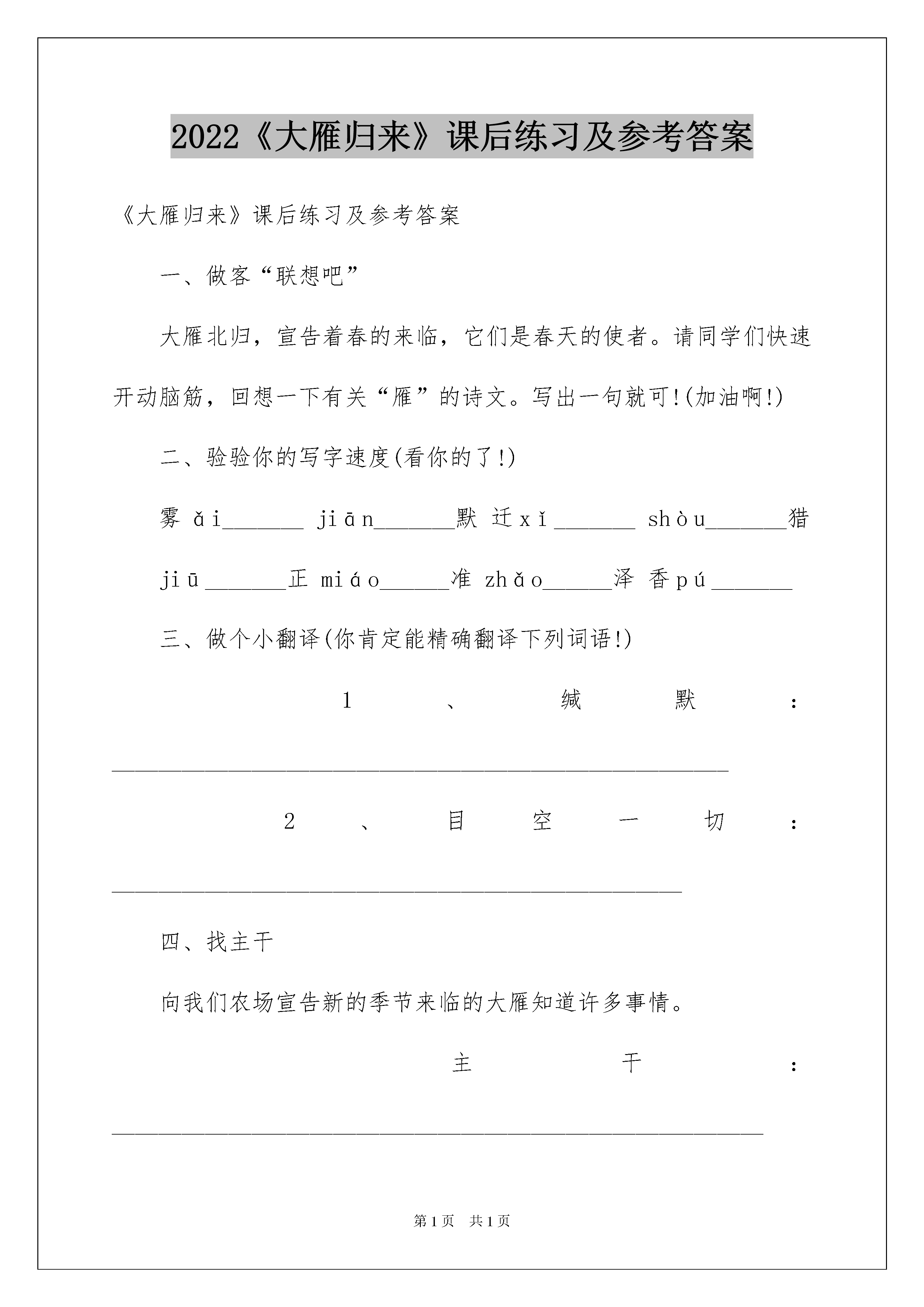 2022《大雁归来》课后练习及参考答案《大雁归来》课后练习及参考答案一、做客“联想吧”大雁北归,宣告着春的来临,它们是春天的使者。请同学们快速开动脑筋,回想一下有关“雁”的诗文。写出一句就可!(加油啊!)二、验验你的写字速度(看你的了!)雾ǎi_______jiān_______默迁xǐ_______shòu_______猎jiū_______正miáo______准zhǎo______泽香pú_______三、做个小翻译(你肯定能精确翻译下列词语!)1、缄默:_____________________________________________________2、目空一切:_________________________________________________四、找主干向我们农场宣告新的季节来临的大雁知道许多事情。主干:________________________________________________________五、学问迁移雁偶然在一个文娱晚会上,听一位古琴专家弹奏“平沙落雁”之曲,一波三折,委婉好听,仿佛见一头头的雁从半空中翱翔下来,落到沙滩上似的;我因此想到了雁。雁是一种大型的.水鸟,模样儿与鹅很相像,淡黄色的长嘴,青灰色的翅翼,灰褐色的背,带着黑斑的胸,长得并不美,然而古今的画家都用作画材。宋徽宗的芦雁图卷,笔精墨妙,颇为出名,清代边寿民也以善画芦雁为名,几乎成了个芦雁专家。雁称候鸟,每年总是应候而来,因为北方天寒,所以入秋就要南来,迁地为良。“月会”曾说:“仲秋之月鸿雁来。”“记历相”也说:“天霜树落叶,而鸿雁南飞。”李时珍的话更说得明白:“寒则自北而南,止于衡阳;热则自南而北,归于雁北。”据说这是常年老例,从不失信,候鸟之为候鸟,自可当之无愧。雁有合群性,喜集体行动,并且很守纪律,往往排成了行列,在空中一行行地飞过,似乎是军队列阵形一般,因有雁阵之称。唐代王勃的《滕王阁序》中,曾有“雁阵惊寒,声断衡阳之浦”之句。而它们的阵形,又像是写出来的字,所以又称雁字。苏东坡诗所谓“雁字一行书绛霜”,而明代唐时升竟有咏雁字诗二十四首之多。诗人好事,真如俗语所谓挖空心思了。雁的鸣声很为响亮,可说是高唱入云。而不知怎的,历代诗人们所作闻雁诗多至不行胜数,都说它的鸣声非常凄切、引人悲感,所以诗意都很悲观,竟没有一首是乐观的气氛的。甚至有一首说是:“情类断猿悲落月,响如离鹤怨愁云”,除了断猿离鹤之外,更将悲、怨、愁这些字眼全部用上了。其实他们的闻雁,全是唯心的,只为正在秋气肃杀的季节,而心境又不好。于是听了雁鸣,全是一片凄苦之声了。雁足传书,用汉代苏武使匈奴事,后人书信往来,就作为典故,而把雁当作邮递员。古人诗词中咏及的不一而足,如“尺书相珍重,辛苦敢烦君”“只恐音书断,宁辞道路长”“念尔心千折,凭传扎十行”。又如明代谢承举诗云:“枕断烟波晓梦余,雁声悲切过匡庐;离人久望平安字,何事江东不寄书?”杨宛诗云:“千里翩翩度碧虚,月明送影意如何。也知一向郎边过,自是多情少寄书。”词如宋代黄庭坚《望江东》云:“江水西头隔烟树,望不见江东路。斟酌只有梦来去,更不怕江阑住。灯前写了书多数,算没人传与,直饶寻得雁分付,又是秋将暮。”我国地志上的地名,以雁为名的,如雁门关,是大家熟识的。此外有雁塞山、雁湖、雁塔等。名胜如湖南衡阳县的回雁峰,是衡山七十二峰的主峰,据说北雁南飞,到衡阳为止,一到春天,就飞回去了。回雁峰之名,是这样得来的。今年立春较早,南来之雁,也该提早回去吧!1、给加粗的字注音:模()样应()候而来绛()霄2、文章以________为说明对象,分别从________、________、________、________四个方面介绍了有关学问。3、文章中引入了大量与雁有关的诗文、绘画,甚至音乐作品,并不过多介绍有关雁的生物学问,这是为什么?4、雁“长得并不美,然而古今的画家都用作画材”,这是为什么?5、你喜爱什么动物?为什么?(跟伙伴们沟通一下!)一、做客“联想吧”“塞下秋来风景异,衡阳雁去无留意。”或“千里黄云白日曛,北风吹雁雪纷纷。”二、验验你的写字速度霭缄徙狩纠瞄沼蒲三、做个小翻译1、闭口不说话。2、一切都不放在眼里,形容傲慢自大,什么都看不起。四、找主干大雁知道事情。五、学问迁移1、múyìnɡjiànɡ2、雁外形习性鸣声用途3、文章不是重在介绍有关雁的生物学问,而是要说明雁“长得并不美”,却被古今画家都用作画材的缘由,引用诗文等作品,可以增加文章美感,激发读者的宠爱之情。4、因为人们可以借大雁有所寄予,抒发情感。5、略(畅所欲言!)本文来源