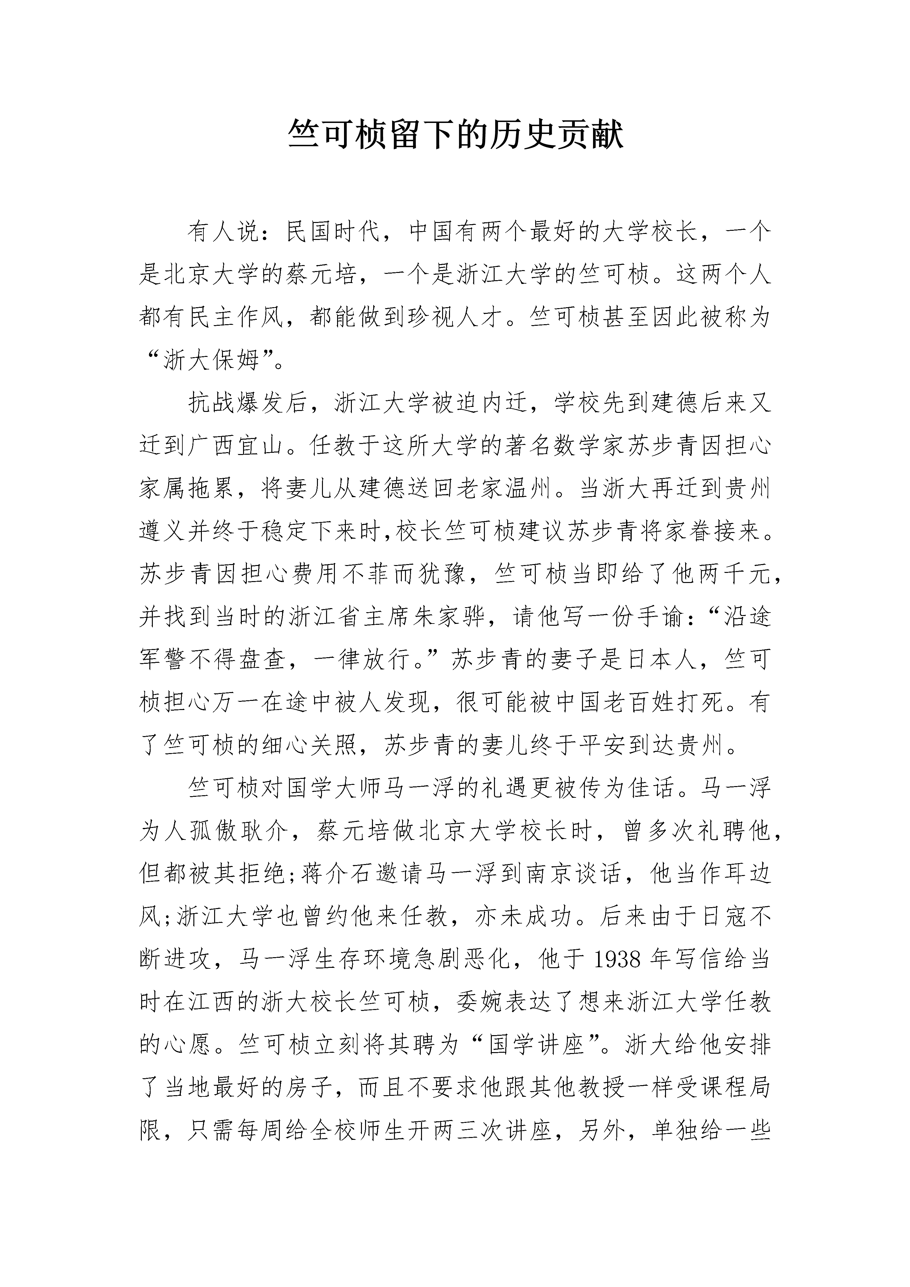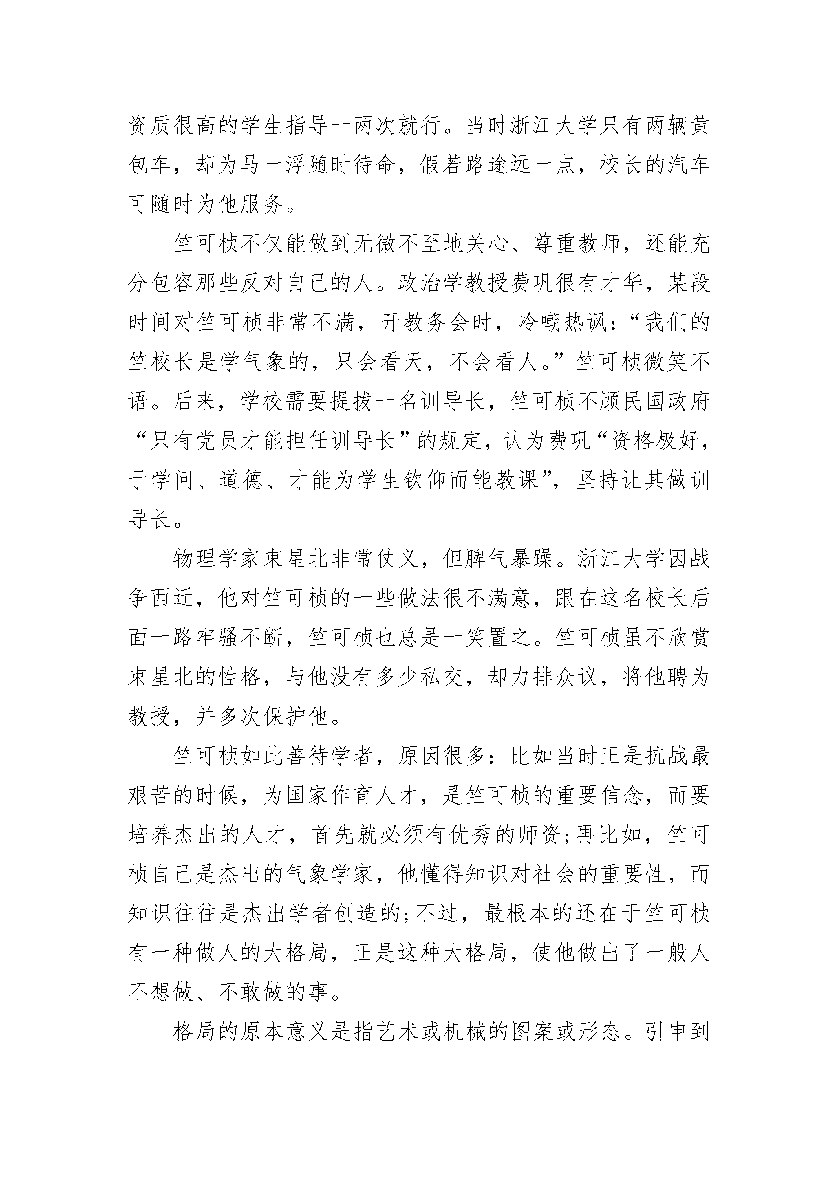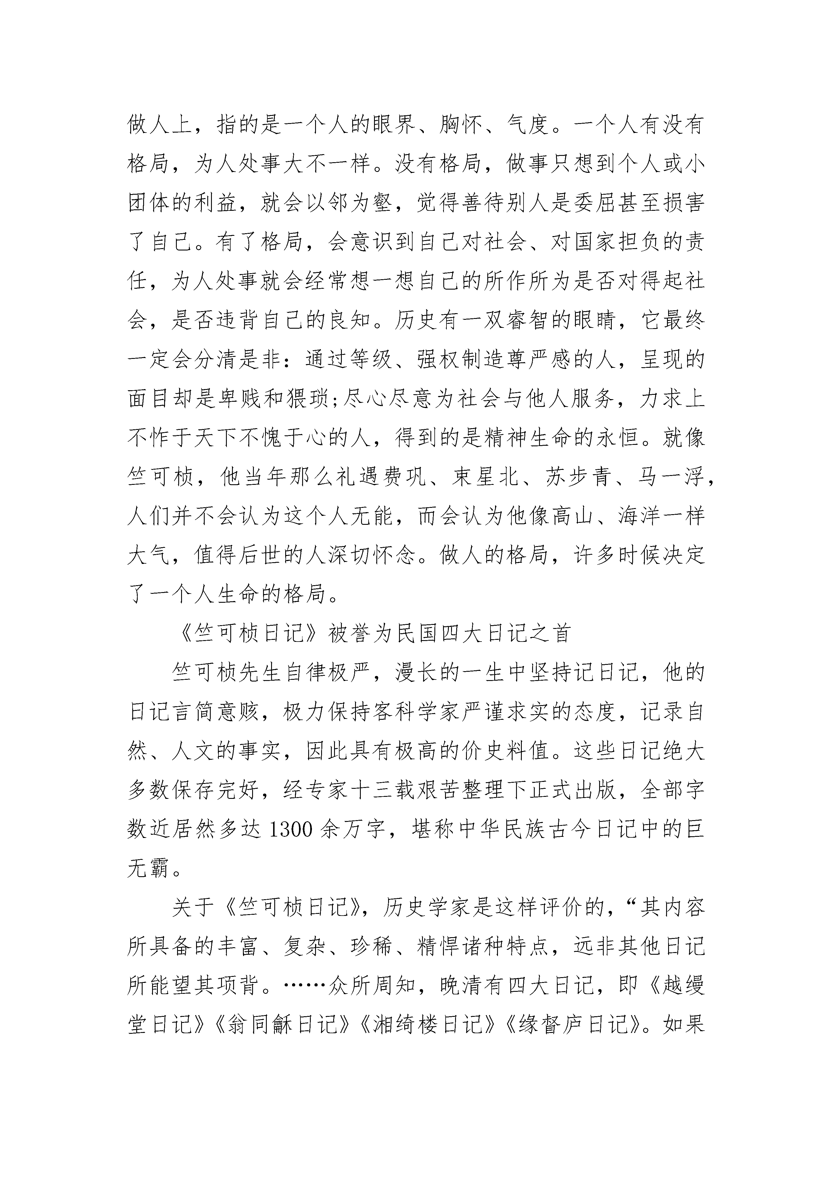 竺可桢留下的历史贡献有人说:民国时代,中国有两个最好的大学校长,一个是北京大学的蔡元培,一个是浙江大学的竺可桢。这两个人都有民主作风,都能做到珍视人才。竺可桢甚至因此被称为“浙大保姆”。抗战爆发后,浙江大学被迫内迁,学校先到建德后来又迁到广西宜山。任教于这所大学的著名数学家苏步青因担心家属拖累,将妻儿从建德送回老家温州。当浙大再迁到贵州遵义并终于稳定下来时,校长竺可桢建议苏步青将家眷接来。苏步青因担心费用不菲而犹豫,竺可桢当即给了他两千元,并找到当时的浙江省主席朱家骅,请他写一份手谕:“沿途军警不得盘查,一律放行。”苏步青的妻子是日本人,竺可桢担心万一在途中被人发现,很可能被中国老百姓打死。有了竺可桢的细心关照,苏步青的妻儿终于平安到达贵州。竺可桢对国学大师马一浮的礼遇更被传为佳话。马一浮为人孤傲耿介,蔡元培做北京大学校长时,曾多次礼聘他,但都被其拒绝;蒋介石邀请马一浮到南京谈话,他当作耳边风;浙江大学也曾约他来任教,亦未成功。后来由于日寇不断进攻,马一浮生存环境急剧恶化,他于1938年写信给当时在江西的浙大校长竺可桢,委婉表达了想来浙江大学任教的心愿。竺可桢立刻将其聘为“国学讲座”。浙大给他安排了当地最好的房子,而且不要求他跟其他教授一样受课程局限,只需每周给全校师生开两三次讲座,另外,单独给一些资质很高的学生指导一两次就行。当时浙江大学只有两辆黄包车,却为马一浮随时待命,假若路途远一点,校长的汽车可随时为他服务。竺可桢不仅能做到无微不至地关心、尊重教师,还能充分包容那些反对自己的人。政治学教授费巩很有才华,某段时间对竺可桢非常不满,开教务会时,冷嘲热讽:“我们的竺校长是学气象的,只会看天,不会看人。”竺可桢微笑不语。后来,学校需要提拔一名训导长,竺可桢不顾民国政府“只有党员才能担任训导长”的规定,认为费巩“资格极好,于学问、道德、才能为学生钦仰而能教课”,坚持让其做训导长。物理学家束星北非常仗义,但脾气暴躁。浙江大学因战争西迁,他对竺可桢的一些做法很不满意,跟在这名校长后面一路牢骚不断,竺可桢也总是一笑置之。竺可桢虽不欣赏束星北的性格,与他没有多少私交,却力排众议,将他聘为教授,并多次保护他。竺可桢如此善待学者,原因很多:比如当时正是抗战最艰苦的时候,为国家作育人才,是竺可桢的重要信念,而要培养杰出的人才,首先就必须有优秀的师资;再比如,竺可桢自己是杰出的气象学家,他懂得知识对社会的重要性,而知识往往是杰出学者创造的;不过,最根本的还在于竺可桢有一种做人的大格局,正是这种大格局,使他做出了一般人不想做、不敢做的事。格局的原本意义是指艺术或机械的图案或形态。引申到做人上,指的是一个人的眼界、胸怀、气度。一个人有没有格局,为人处事大不一样。没有格局,做事只想到个人或小团体的利益,就会以邻为壑,觉得善待别人是委屈甚至损害了自己。有了格局,会意识到自己对社会、对国家担负的责任,为人处事就会经常想一想自己的所作所为是否对得起社会,是否违背自己的良知。历史有一双睿智的眼睛,它最终一定会分清是非:通过等级、强权制造尊严感的人,呈现的面目却是卑贱和猥琐;尽心尽意为社会与他人服务,力求上不怍于天下不愧于心的人,得到的是精神生命的永恒。就像竺可桢,他当年那么礼遇费巩、束星北、苏步青、马一浮,人们并不会认为这个人无能,而会认为他像高山、海洋一样大气,值得后世的人深切怀念。做人的格局,许多时候决定了一个人生命的格局。《竺可桢日记》被誉为民国四大日记之首竺可桢先生自律极严,漫长的一生中坚持记日记,他的日记言简意赅,极力保持客科学家严谨求实的态度,记录自然、人文的事实,因此具有极高的价史料值。这些日记绝大多数保存完好,经专家十三载艰苦整理下正式出版,全部字数近居然多达1300余万字,堪称中华民族古今日记中的巨无霸。关于《竺可桢日记》,历史学家是这样评价的,“其内容所具备的丰富、复杂、珍稀、精悍诸种特点,远非其他日记所能望其项背。……众所周知,晚清有四大日记,即《越缦堂日记》《翁同龢日记》《湘绮楼日记》《缘督庐日记》。如果要选民国四大日记,以笔者个人十多年的阅读经验而言,这四大日记应该是《竺可桢日记》《顾颉刚日记》、金毓黻《静晤室日记》《吴宓日记》(正续编)。《竺可桢日记》毫无疑问是首选,无人可企及”(引自《上海书评》)还有人这样评价:“《竺可桢日记》为1948-1949年这两年特殊的历史场景及芸芸众生无意间画了一幅如《清明上河图》那样恢宏的历史长卷。或者更确切地说,这是一幅炮火纷飞笼罩之下的战乱流离图,天崩地塌,方死方生,各种各样的人物在这股不可阻挡的历史大潮流中沉浮飘移,给后世的史家研究提供了许许多多难得、鲜活的史料。”