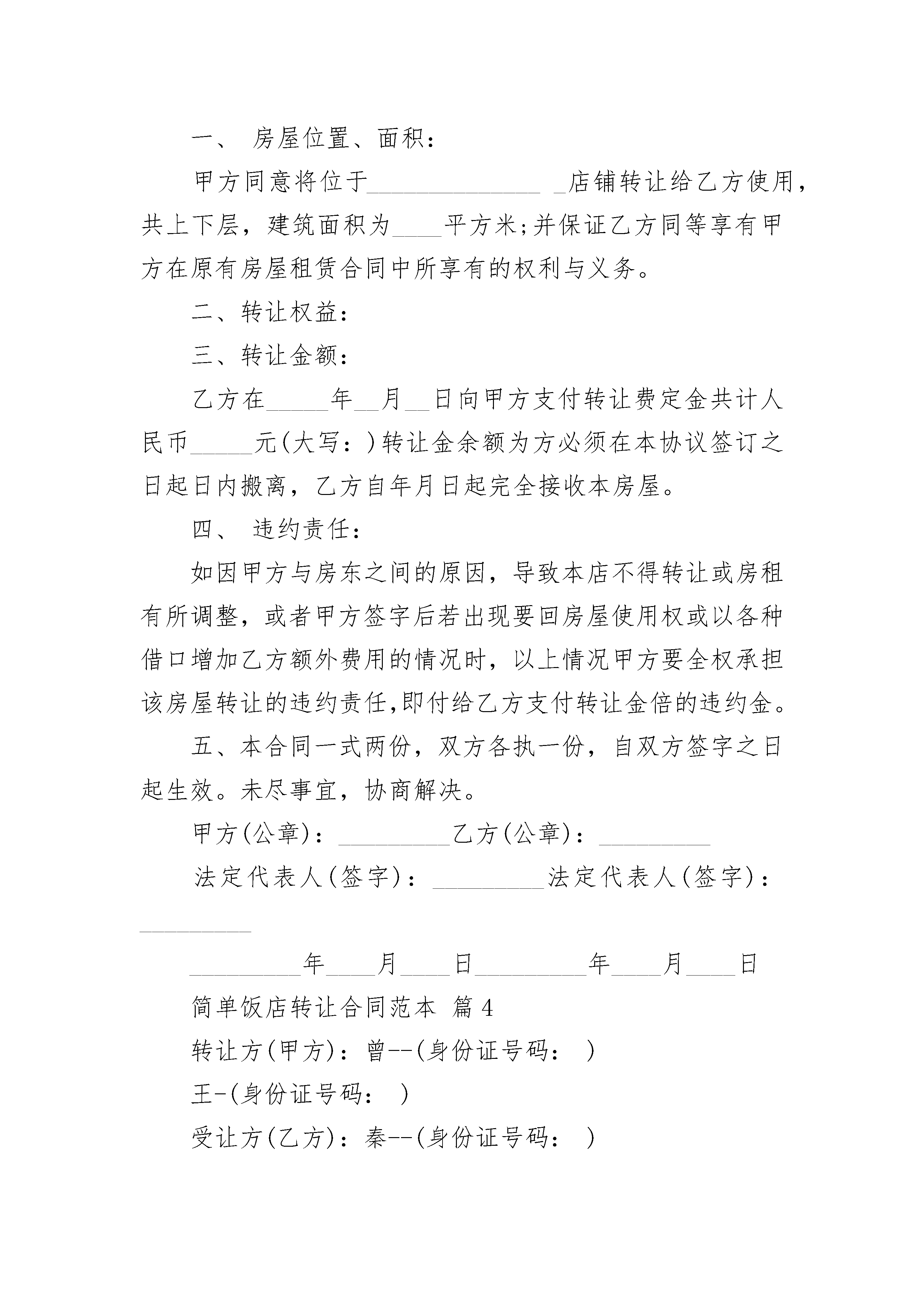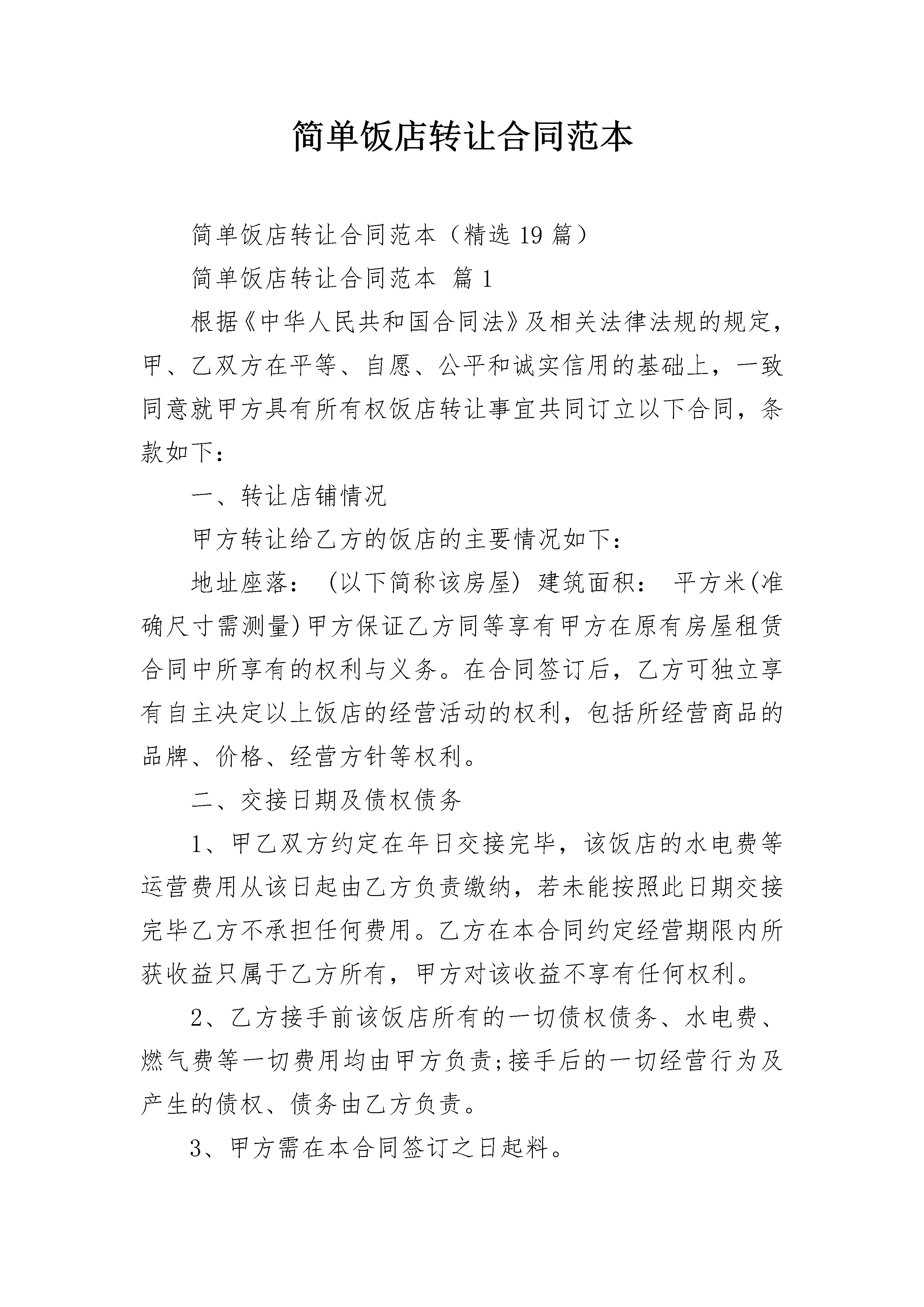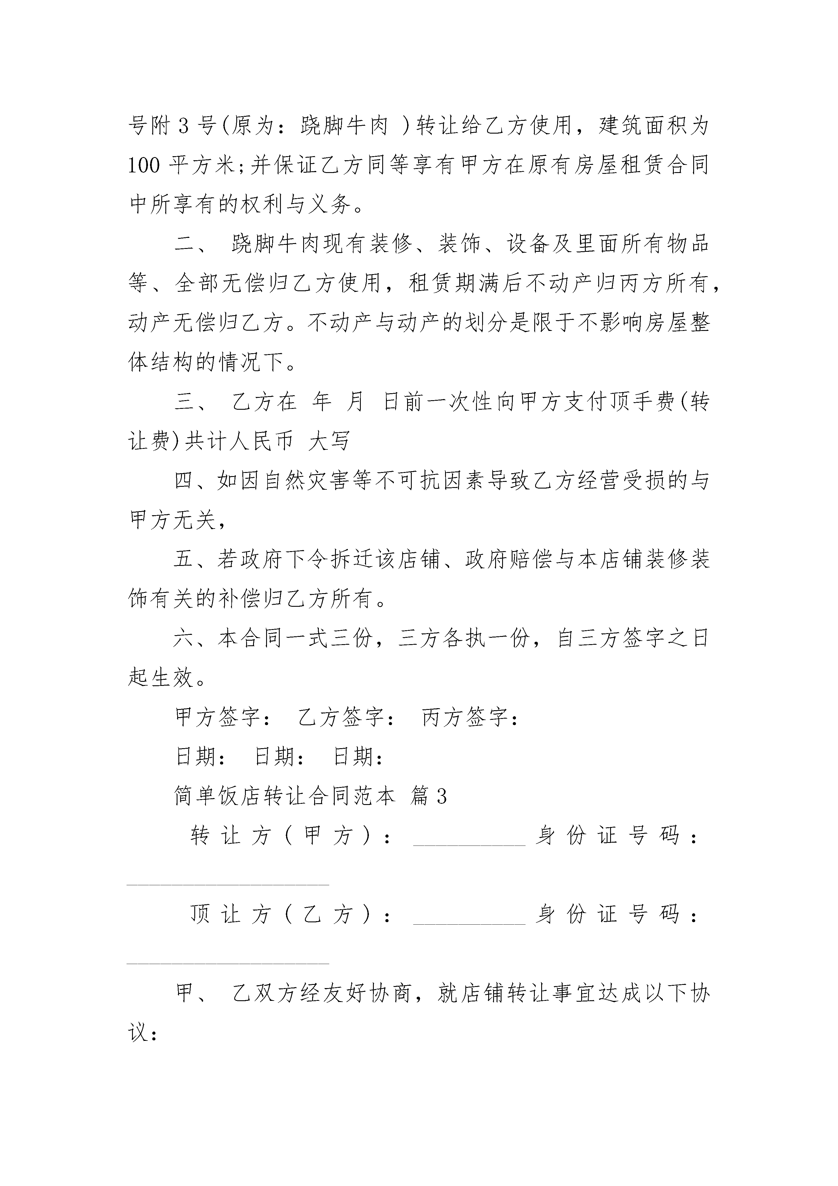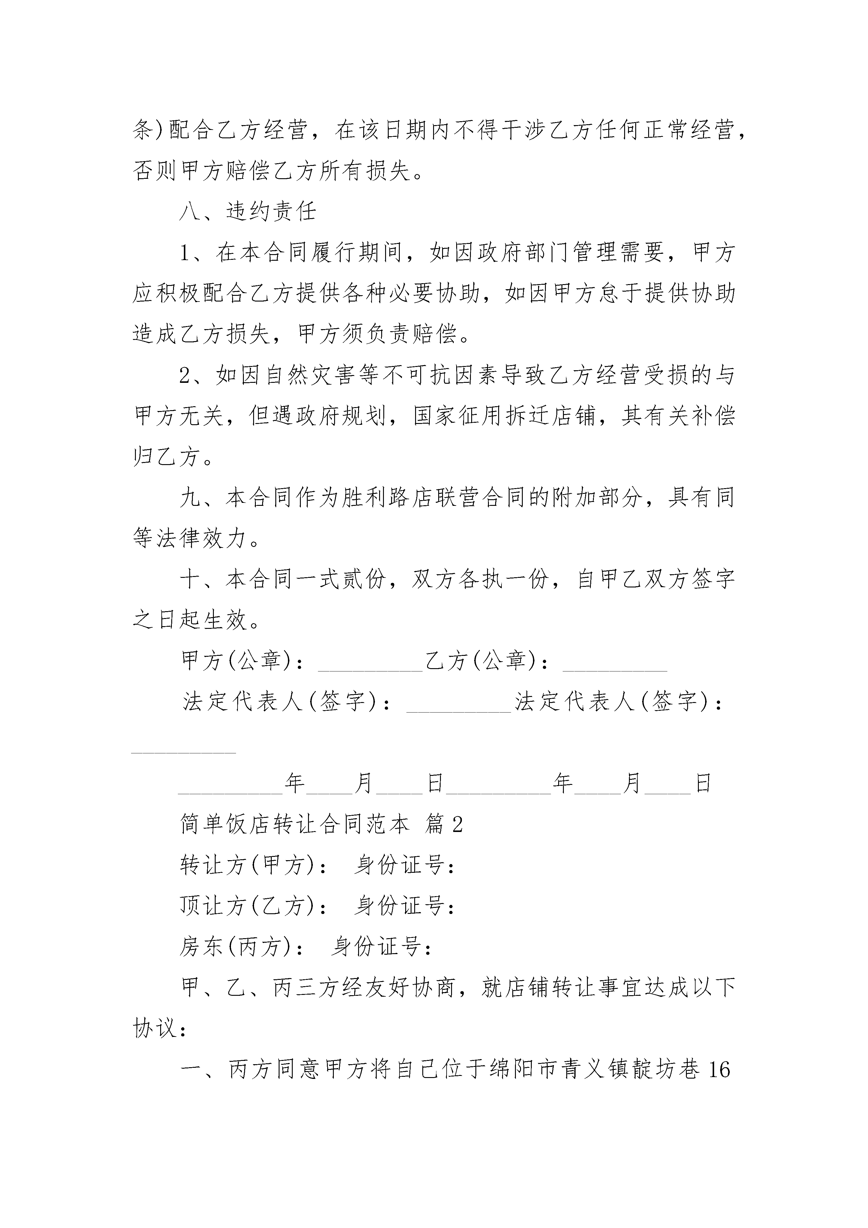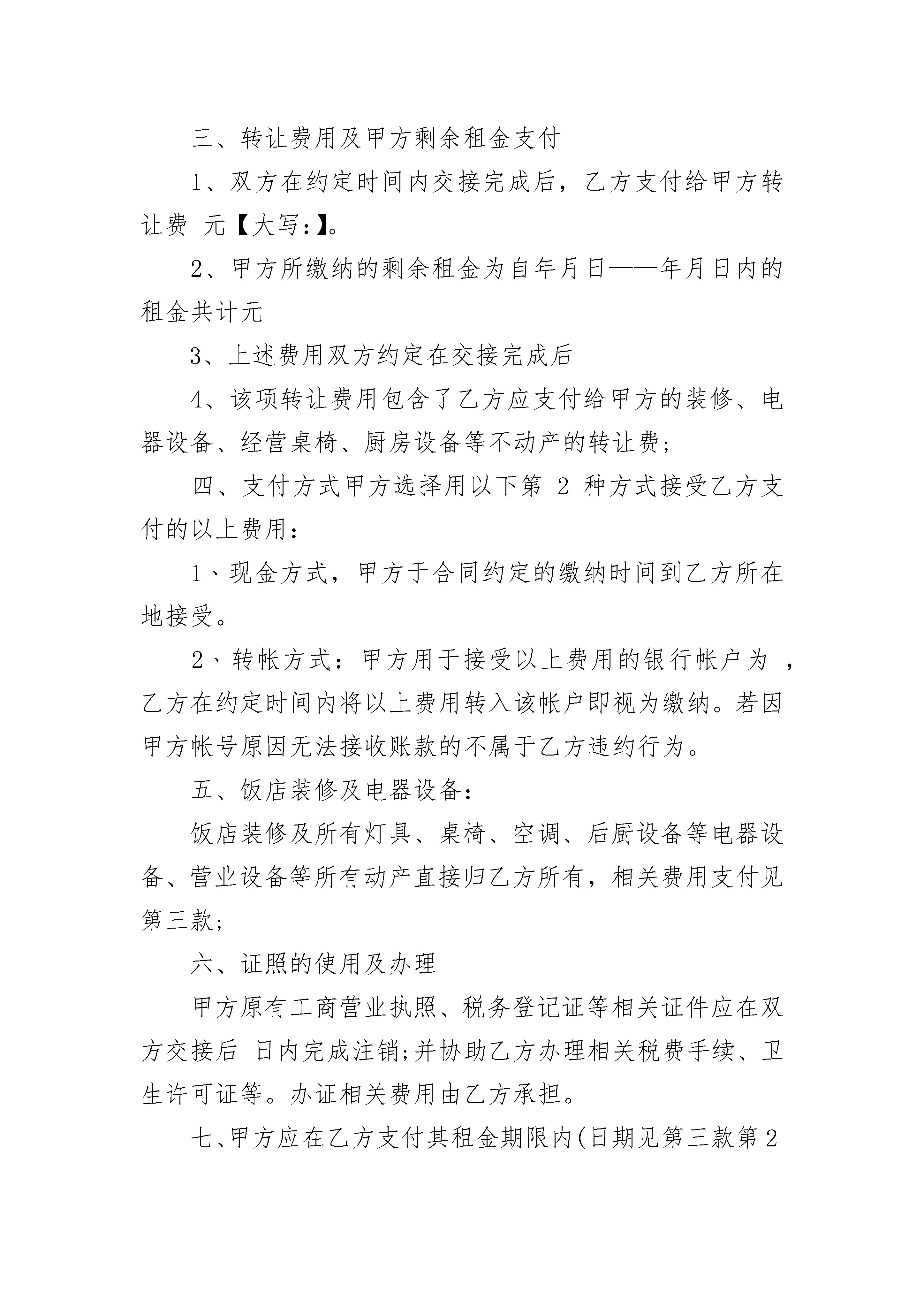 简单饭店转让合同范本简单饭店转让合同范本(精选19篇)简单饭店转让合同范本篇1根据《中华人民共和国合同法》及相关法律法规的规定,甲、乙双方在平等、自愿、公平和诚实信用的基础上,一致同意就甲方具有所有权饭店转让事宜共同订立以下合同,条款如下:一、转让店铺情况甲方转让给乙方的饭店的主要情况如下:地址座落:(以下简称该房屋)建筑面积:平方米(准确尺寸需测量)甲方保证乙方同等享有甲方在原有房屋租赁合同中所享有的权利与义务。在合同签订后,乙方可独立享有自主决定以上饭店的经营活动的权利,包括所经营商品的品牌、价格、经营方针等权利。二、交接日期及债权债务1、甲乙双方约定在年日交接完毕,该饭店的水电费等运营费用从该日起由乙方负责缴纳,若未能按照此日期交接完毕乙方不承担任何费用。乙方在本合同约定经营期限内所获收益只属于乙方所有,甲方对该收益不享有任何权利。2、乙方接手前该饭店所有的一切债权债务、水电费、燃气费等一切费用均由甲方负责;接手后的一切经营行为及产生的债权、债务由乙方负责。3、甲方需在本合同签订之日起料。三、转让费用及甲方剩余租金支付1、双方在约定时间内交接完成后,乙方支付给甲方转让费元【大写:】。2、甲方所缴纳的剩余租金为自年月日——年月日内的租金共计元3、上述费用双方约定在交接完成后4、该项转让费用包含了乙方应支付给甲方的装修、电器设备、经营桌椅、厨房设备等不动产的转让费;四、支付方式甲方选择用以下第2种方式接受乙方支付的以上费用:1﹑现金方式,甲方于合同约定的缴纳时间到乙方所在地接受。2﹑转帐方式:甲方用于接受以上费用的银行帐户为,乙方在约定时间内将以上费用转入该帐户即视为缴纳。若因甲方帐号原因无法接收账款的不属于乙方违约行为。五、饭店装修及电器设备:饭店装修及所有灯具、桌椅、空调、后厨设备等电器设备、营业设备等所有动产直接归乙方所有,相关费用支付见第三款;六、证照的使用及办理甲方原有工商营业执照、税务登记证等相关证件应在双方交接后日内完成注销;并协助乙方办理相关税费手续、卫生许可证等。办证相关费用由乙方承担。七、甲方应在乙方支付其租金期限内(日期见第三款第2条)配合乙方经营,在该日期内不得干涉乙方任何正常经营,否则甲方赔偿乙方所有损失。八、违约责任1、在本合同履行期间,如因政府部门管理需要,甲方应积极配合乙方提供各种必要协助,如因甲方怠于提供协助造成乙方损失,甲方须负责赔偿。2、如因自然灾害等不可抗因素导致乙方经营受损的与甲方无关,但遇政府规划,国家征用拆迁店铺,其有关补偿归乙方。九、本合同作为胜利路店联营合同的附加部分,具有同等法律效力。十、本合同一式贰份,双方各执一份,自甲乙双方签字之日起生效。甲方(公章):_________乙方(公章):_________法定代表人(签字):_________法定代表人(签字):__________________年____月____日_________年____月____日简单饭店转让合同范本篇2转让方(甲方):身份证号:顶让方(乙方):身份证号:房东(丙方):身份证号:甲、乙、丙三方经友好协商,就店铺转让事宜达成以下协议:一、丙方同意甲方将自己位于绵阳市青义镇靛坊巷16号附3号(原为:跷脚牛肉)转让给乙方使用,建筑面积为100平方米;并保证乙方同等享有甲方在原有房屋租赁合同中所享有的权利与义务。二、跷脚牛肉现有装修、装饰、设备及里面所有物品等、全部无偿归乙方使用,租赁期满后不动产归丙方所有,动产无偿归乙方。不动产与动产的划分是限于不影响房屋整体结构的情况下。三、乙方在年月日前一次性向甲方支付顶手费(转让费)共计人民币大写四、如因自然灾害等不可抗因素导致乙方经营受损的与甲方无关,五、若政府下令拆迁该店铺、政府赔偿与本店铺装修装饰有关的补偿归乙方所有。六、本合同一式三份,三方各执一份,自三方签字之日起生效。甲方签字:乙方签字:丙方签字:日期:日期:日期:简单饭店转让合同范本篇3转让方(甲方):__________身份证号码:__________________顶让方(乙方):__________身份证号码:__________________甲、乙双方经友好协商,就店铺转让事宜达成以下协议:一、房屋位置、面积:甲方同意将位于_______________店铺转让给乙方使用,共上下层,建筑面积为____平方米;并保证乙方同等享有甲方在原有房屋租赁合同中所享有的权利与义务。二、转让权益:三、转让金额:乙方在_____年__月__日向甲方支付转让费定金共计人民币_____元(大写:)转让金余额为方必须在本协议签订之日起日内搬离,乙方自年月日起完全接收本房屋。四、违约责任:如因甲方与房东之间的原因,导致本店不得转让或房租有所调整,或者甲方签字后若出现要回房屋使用权或以各种借口增加乙方额外费用的