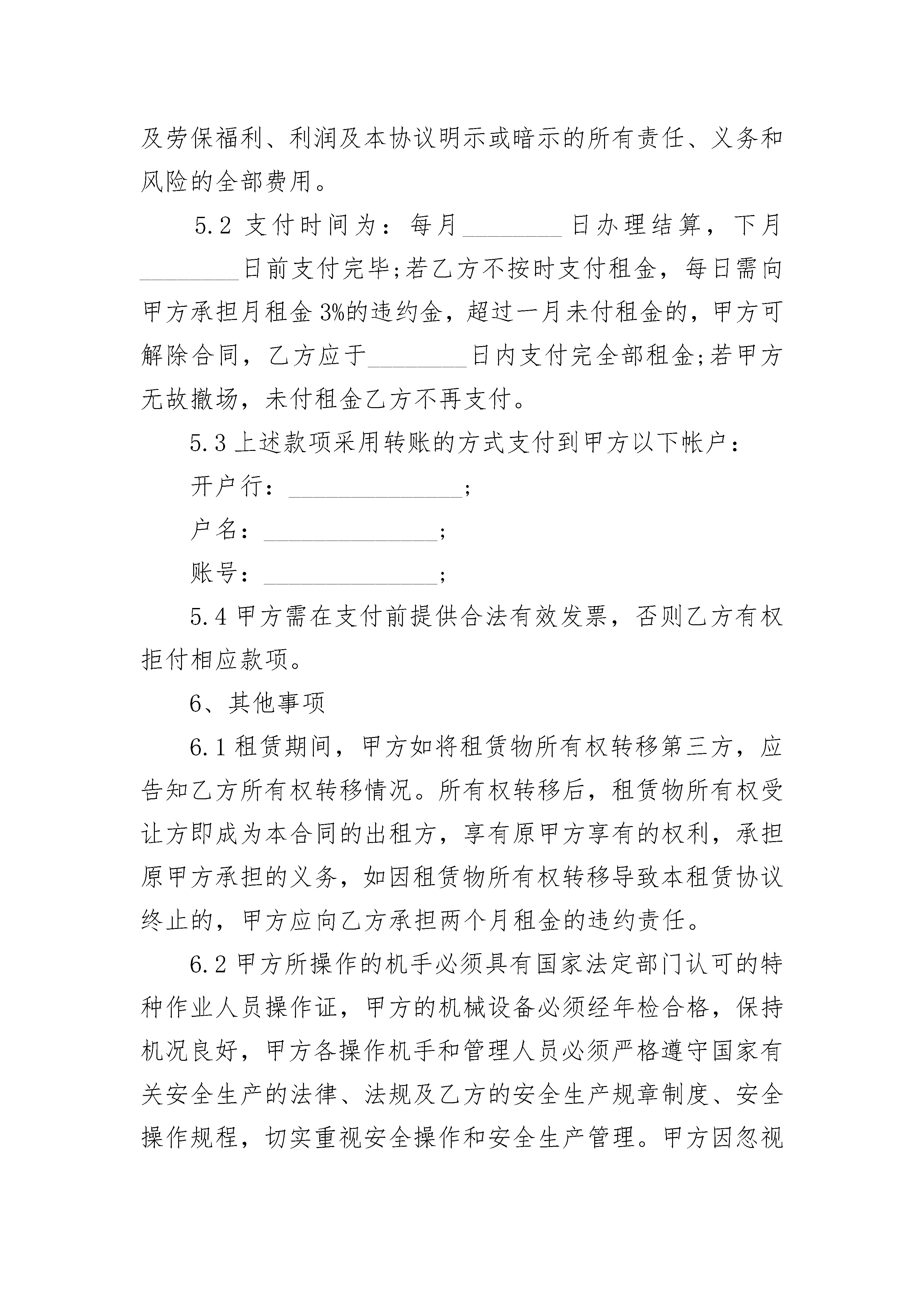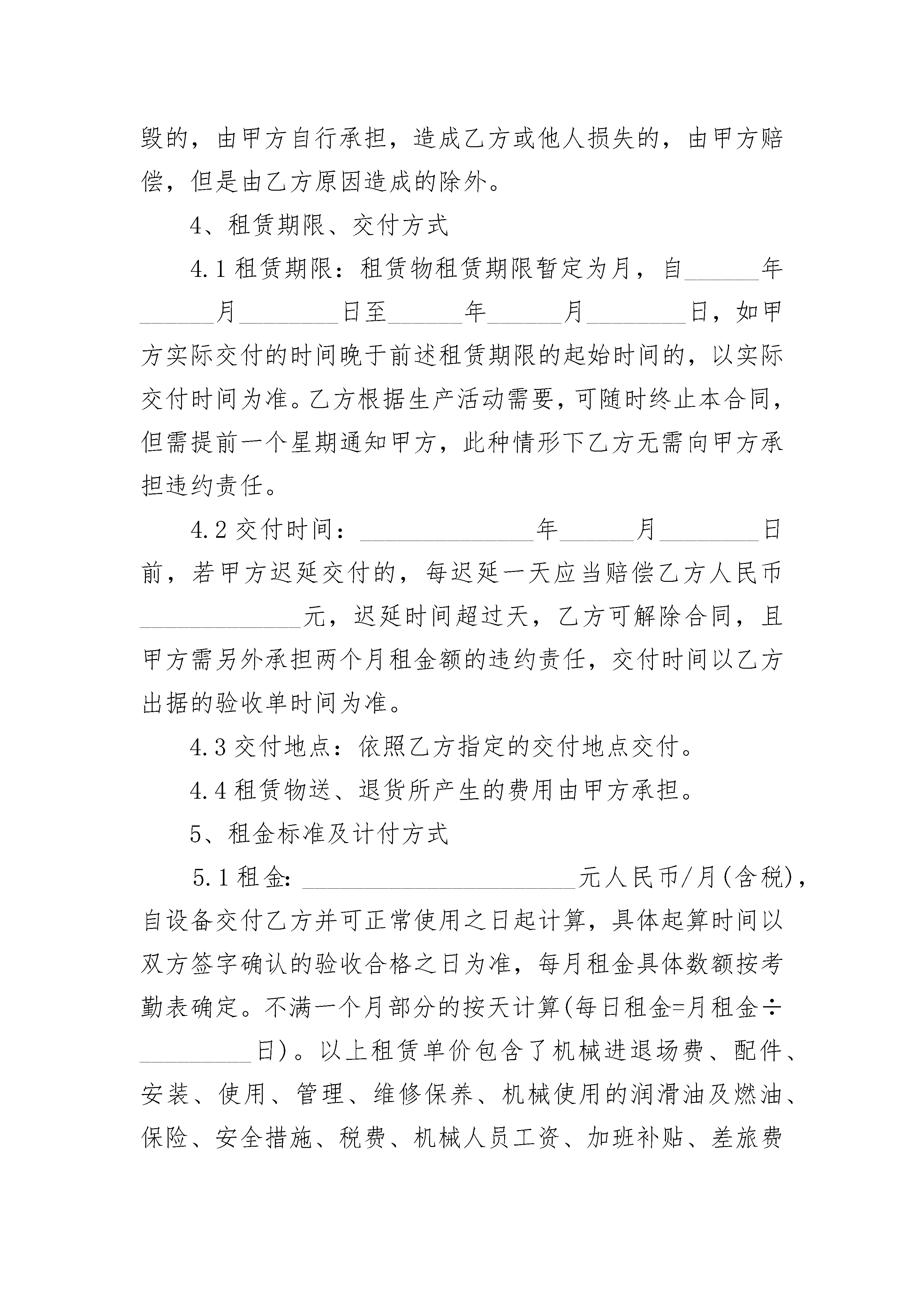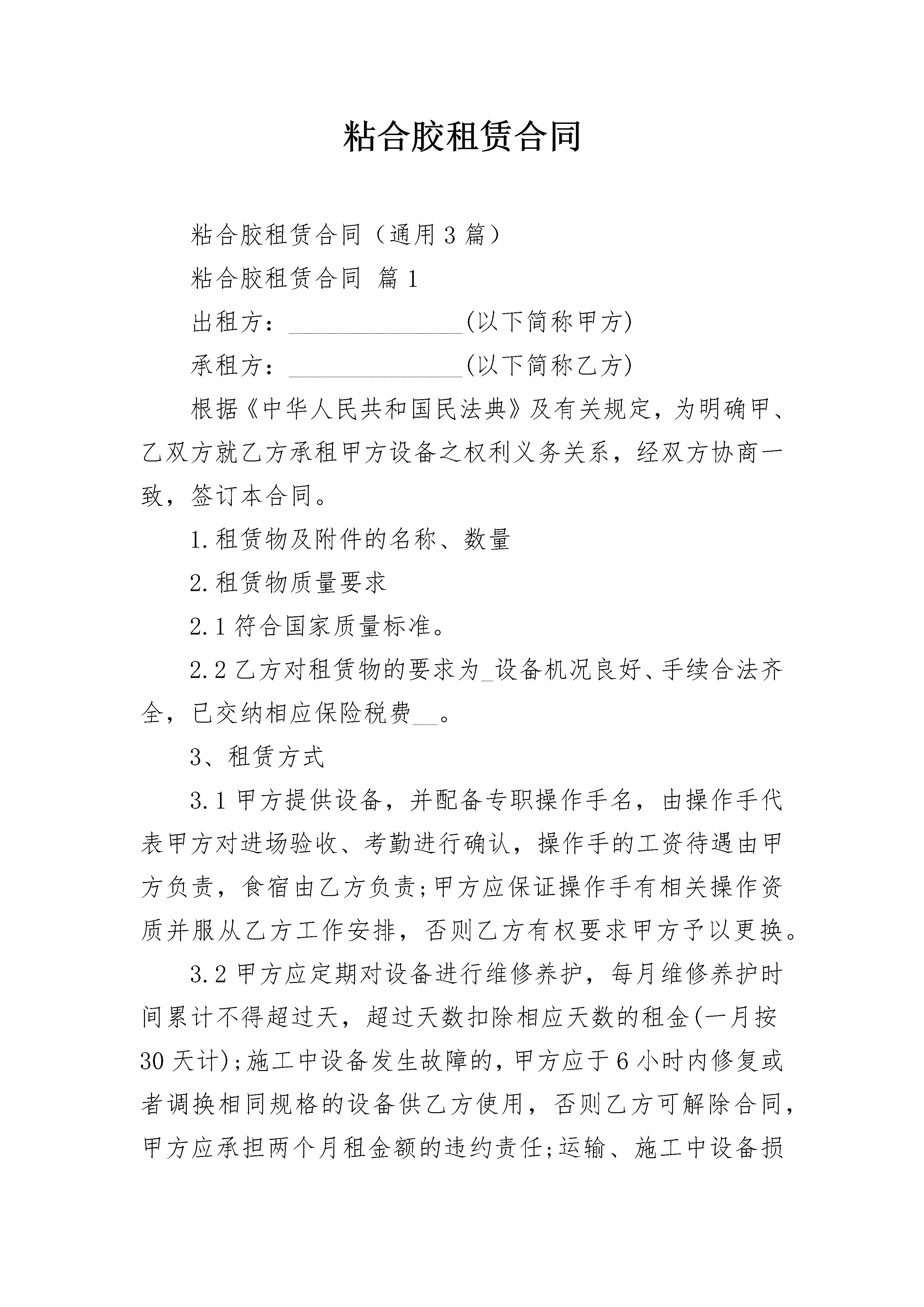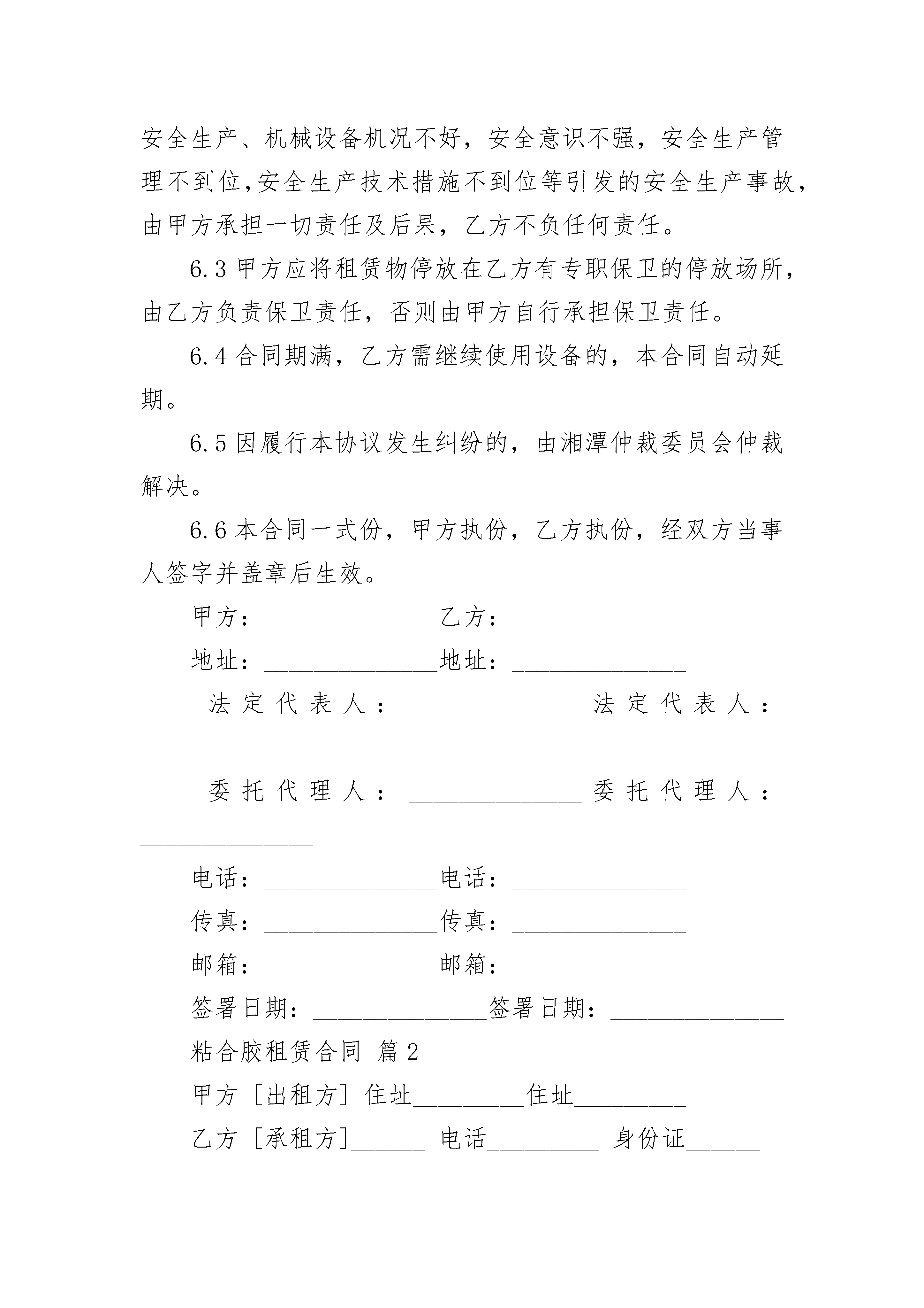 粘合胶租赁合同粘合胶租赁合同(通用3篇)粘合胶租赁合同篇1出租方:______________(以下简称甲方)承租方:______________(以下简称乙方)根据《中华人民共和国民法典》及有关规定,为明确甲、乙双方就乙方承租甲方设备之权利义务关系,经双方协商一致,签订本合同。1.租赁物及附件的名称、数量2.租赁物质量要求2.1符合国家质量标准。2.2乙方对租赁物的要求为_设备机况良好、手续合法齐全,已交纳相应保险税费__。3、租赁方式3.1甲方提供设备,并配备专职操作手名,由操作手代表甲方对进场验收、考勤进行确认,操作手的工资待遇由甲方负责,食宿由乙方负责;甲方应保证操作手有相关操作资质并服从乙方工作安排,否则乙方有权要求甲方予以更换。3.2甲方应定期对设备进行维修养护,每月维修养护时间累计不得超过天,超过天数扣除相应天数的租金(一月按30天计);施工中设备发生故障的,甲方应于6小时内修复或者调换相同规格的设备供乙方使用,否则乙方可解除合同,甲方应承担两个月租金额的违约责任;运输、施工中设备损毁的,由甲方自行承担,造成乙方或他人损失的,由甲方赔偿,但是由乙方原因造成的除外。4、租赁期限、交付方式4.1租赁期限:租赁物租赁期限暂定为月,自______年______月________日至______年______月________日,如甲方实际交付的时间晚于前述租赁期限的起始时间的,以实际交付时间为准。乙方根据生产活动需要,可随时终止本合同,但需提前一个星期通知甲方,此种情形下乙方无需向甲方承担违约责任。4.2交付时间:______________年______月________日前,若甲方迟延交付的,每迟延一天应当赔偿乙方人民币_____________元,迟延时间超过天,乙方可解除合同,且甲方需另外承担两个月租金额的违约责任,交付时间以乙方出据的验收单时间为准。4.3交付地点:依照乙方指定的交付地点交付。4.4租赁物送、退货所产生的费用由甲方承担。5、租金标准及计付方式5.1租金:______________________元人民币/月(含税),自设备交付乙方并可正常使用之日起计算,具体起算时间以双方签字确认的验收合格之日为准,每月租金具体数额按考勤表确定。不满一个月部分的按天计算(每日租金=月租金÷_________日)。以上租赁单价包含了机械进退场费、配件、安装、使用、管理、维修保养、机械使用的润滑油及燃油、保险、安全措施、税费、机械人员工资、加班补贴、差旅费及劳保福利、利润及本协议明示或暗示的所有责任、义务和风险的全部费用。5.2支付时间为:每月________日办理结算,下月________日前支付完毕;若乙方不按时支付租金,每日需向甲方承担月租金3%的违约金,超过一月未付租金的,甲方可解除合同,乙方应于________日内支付完全部租金;若甲方无故撤场,未付租金乙方不再支付。5.3上述款项采用转账的方式支付到甲方以下帐户:开户行:______________;户名:______________;账号:______________;5.4甲方需在支付前提供合法有效发票,否则乙方有权拒付相应款项。6、其他事项6.1租赁期间,甲方如将租赁物所有权转移第三方,应告知乙方所有权转移情况。所有权转移后,租赁物所有权受让方即成为本合同的出租方,享有原甲方享有的权利,承担原甲方承担的义务,如因租赁物所有权转移导致本租赁协议终止的,甲方应向乙方承担两个月租金的违约责任。6.2甲方所操作的机手必须具有国家法定部门认可的特种作业人员操作证,甲方的机械设备必须经年检合格,保持机况良好,甲方各操作机手和管理人员必须严格遵守国家有关安全生产的法律、法规及乙方的安全生产规章制度、安全操作规程,切实重视安全操作和安全生产管理。甲方因忽视安全生产、机械设备机况不好,安全意识不强,安全生产管理不到位,安全生产技术措施不到位等引发的安全生产事故,由甲方承担一切责任及后果,乙方不负任何责任。6.3甲方应将租赁物停放在乙方有专职保卫的停放场所,由乙方负责保卫责任,否则由甲方自行承担保卫责任。6.4合同期满,乙方需继续使用设备的,本合同自动延期。6.5因履行本协议发生纠纷的,由湘潭仲裁委员会仲裁解决。6.6本合同一式份,甲方执份,乙方执份,经双方当事人签字并盖章后生效。甲方:______________乙方:______________地址:______________地址:______________法定代表人:______________法定代表人:______________委托代理人:______________委托代理人:______________电话:______________电话:______________传真:__________