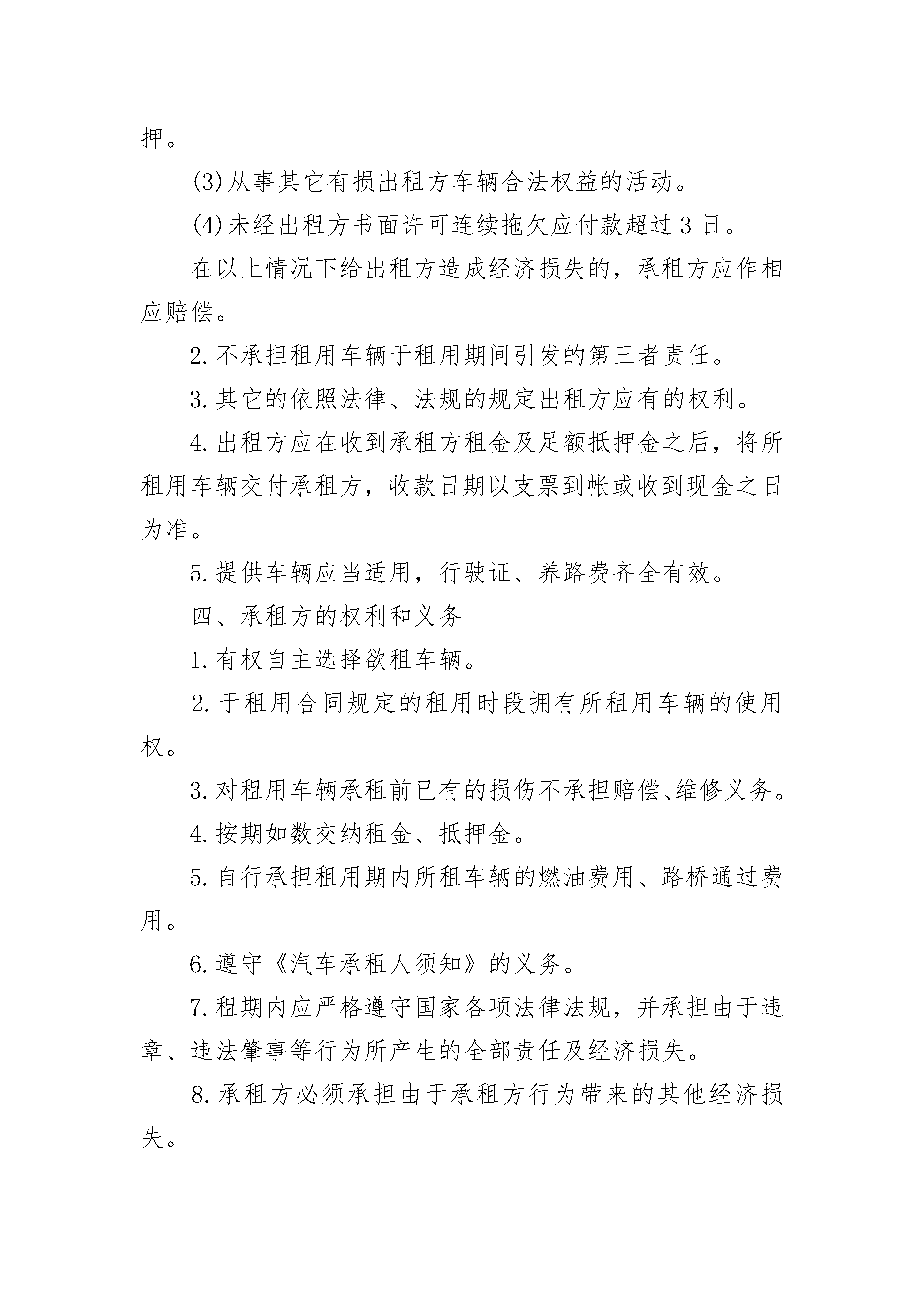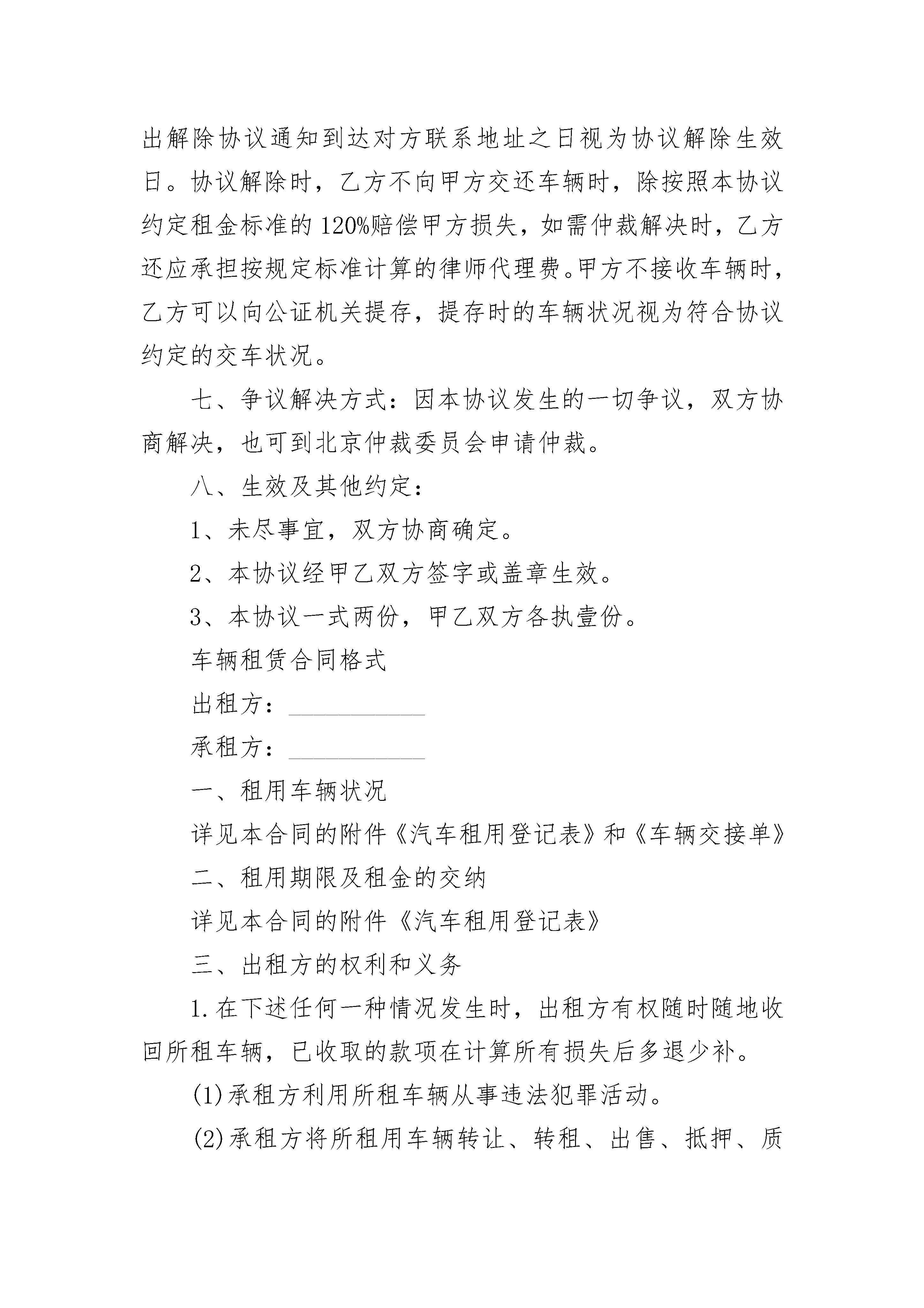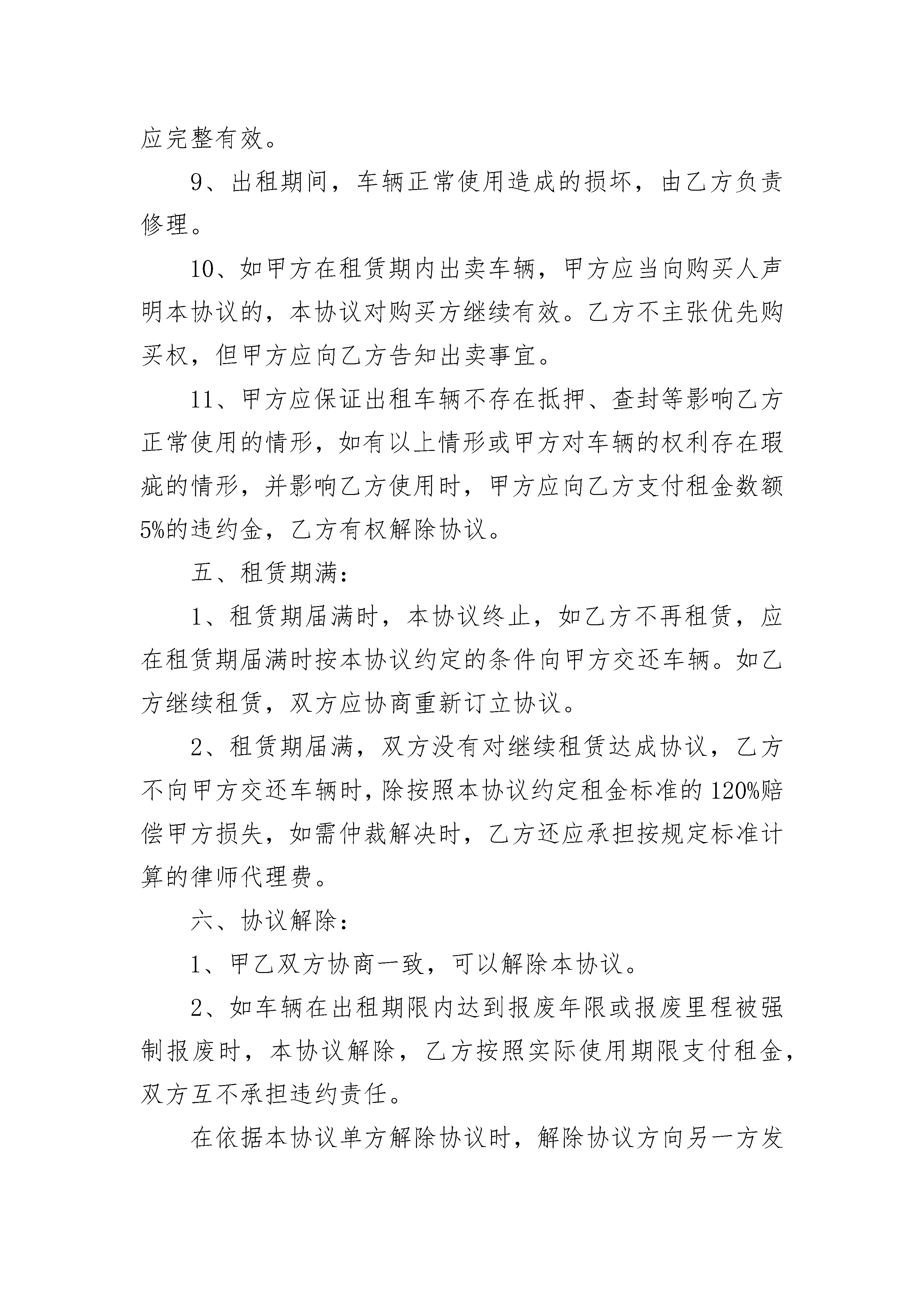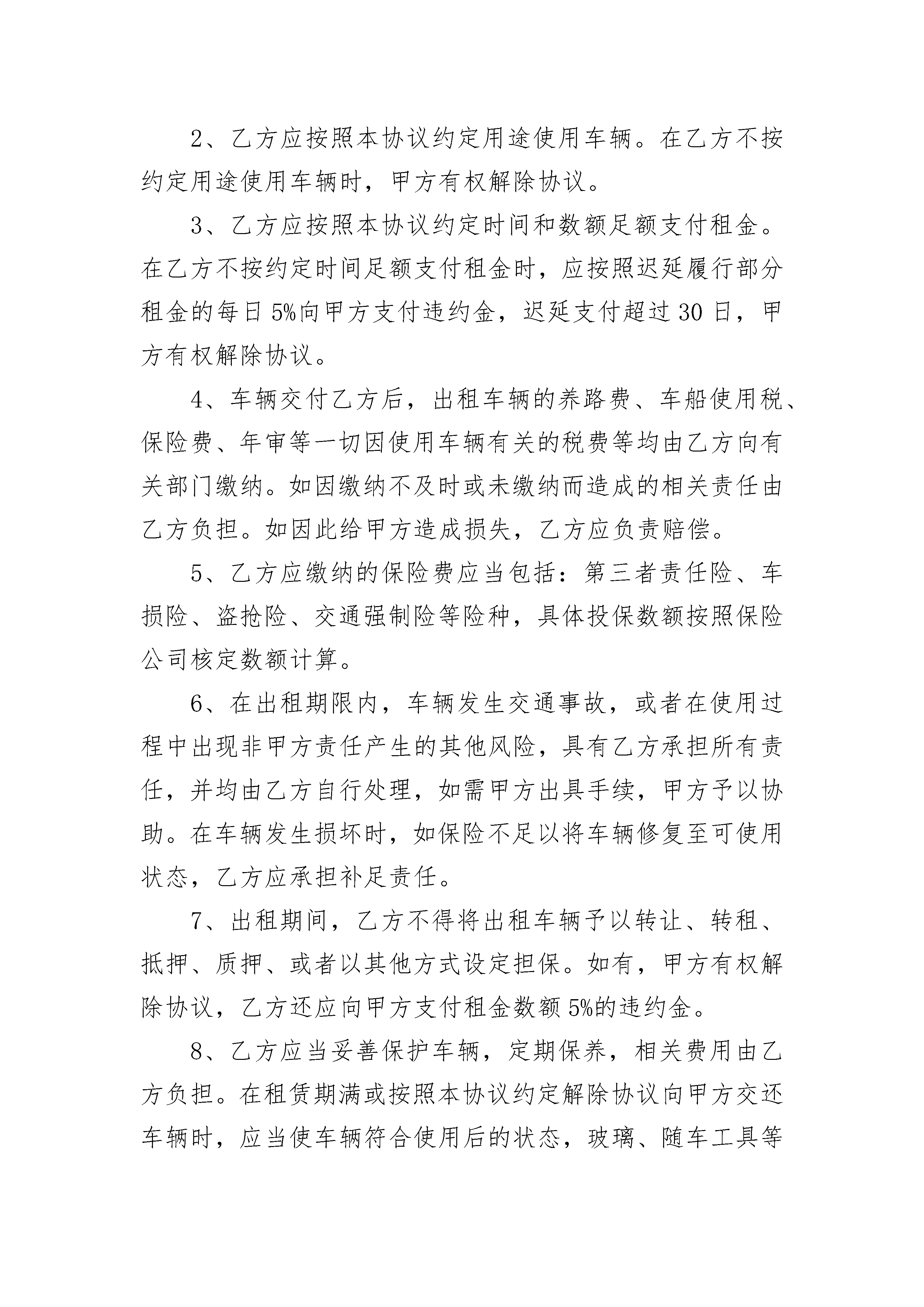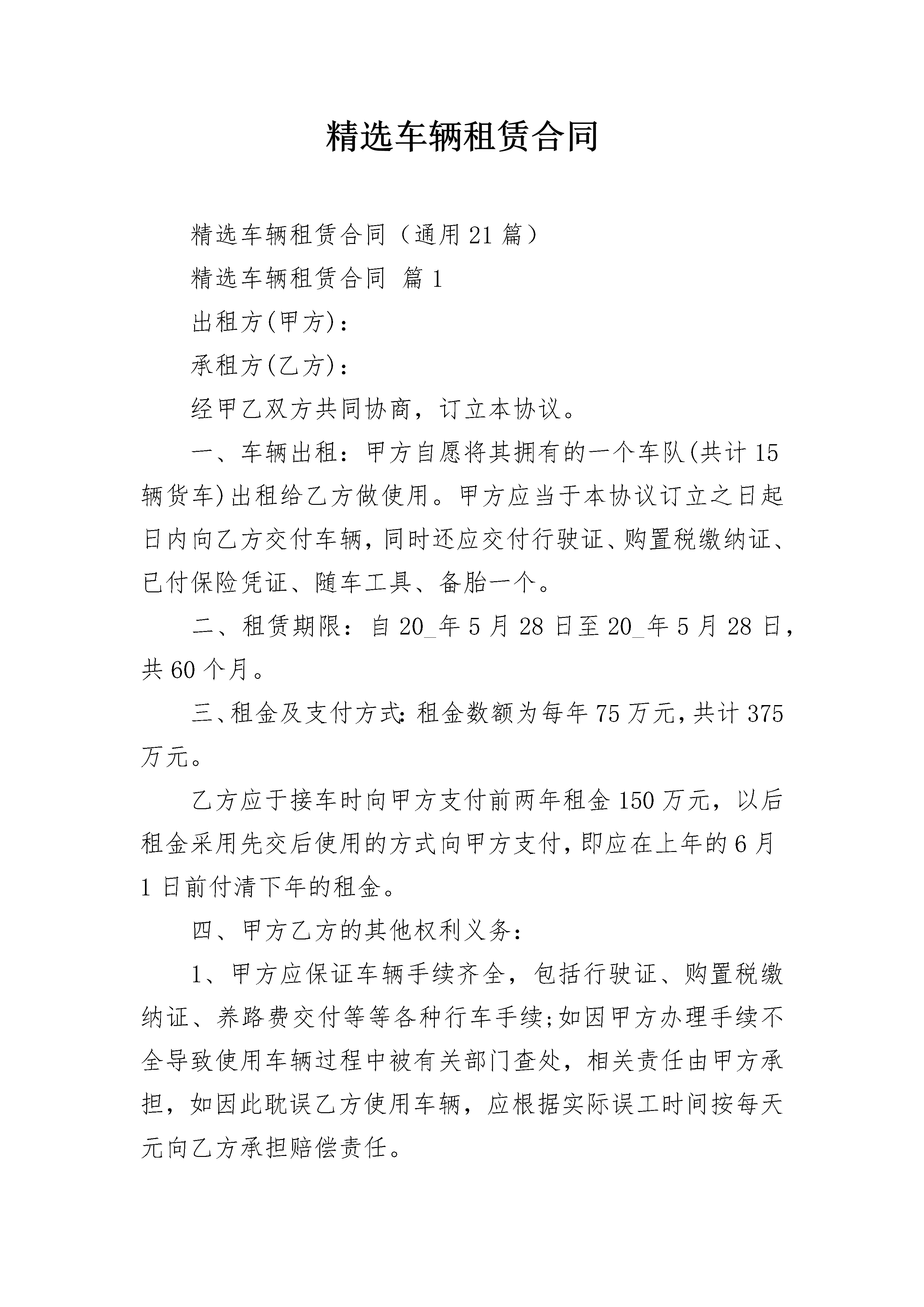 精选车辆租赁合同精选车辆租赁合同(通用21篇)精选车辆租赁合同篇1出租方(甲方):承租方(乙方):经甲乙双方共同协商,订立本协议。一、车辆出租:甲方自愿将其拥有的一个车队(共计15辆货车)出租给乙方做使用。甲方应当于本协议订立之日起日内向乙方交付车辆,同时还应交付行驶证、购置税缴纳证、已付保险凭证、随车工具、备胎一个。二、租赁期限:自20_年5月28日至20_年5月28日,共60个月。三、租金及支付方式:租金数额为每年75万元,共计375万元。乙方应于接车时向甲方支付前两年租金150万元,以后租金采用先交后使用的方式向甲方支付,即应在上年的6月1日前付清下年的租金。四、甲方乙方的其他权利义务:1、甲方应保证车辆手续齐全,包括行驶证、购置税缴纳证、养路费交付等等各种行车手续;如因甲方办理手续不全导致使用车辆过程中被有关部门查处,相关责任由甲方承担,如因此耽误乙方使用车辆,应根据实际误工时间按每天元向乙方承担赔偿责任。2、乙方应按照本协议约定用途使用车辆。在乙方不按约定用途使用车辆时,甲方有权解除协议。3、乙方应按照本协议约定时间和数额足额支付租金。在乙方不按约定时间足额支付租金时,应按照迟延履行部分租金的每日5%向甲方支付违约金,迟延支付超过30日,甲方有权解除协议。4、车辆交付乙方后,出租车辆的养路费、车船使用税、保险费、年审等一切因使用车辆有关的税费等均由乙方向有关部门缴纳。如因缴纳不及时或未缴纳而造成的相关责任由乙方负担。如因此给甲方造成损失,乙方应负责赔偿。5、乙方应缴纳的保险费应当包括:第三者责任险、车损险、盗抢险、交通强制险等险种,具体投保数额按照保险公司核定数额计算。6、在出租期限内,车辆发生交通事故,或者在使用过程中出现非甲方责任产生的其他风险,具有乙方承担所有责任,并均由乙方自行处理,如需甲方出具手续,甲方予以协助。在车辆发生损坏时,如保险不足以将车辆修复至可使用状态,乙方应承担补足责任。7、出租期间,乙方不得将出租车辆予以转让、转租、抵押、质押、或者以其他方式设定担保。如有,甲方有权解除协议,乙方还应向甲方支付租金数额5%的违约金。8、乙方应当妥善保护车辆,定期保养,相关费用由乙方负担。在租赁期满或按照本协议约定解除协议向甲方交还车辆时,应当使车辆符合使用后的状态,玻璃、随车工具等应完整有效。9、出租期间,车辆正常使用造成的损坏,由乙方负责修理。10、如甲方在租赁期内出卖车辆,甲方应当向购买人声明本协议的,本协议对购买方继续有效。乙方不主张优先购买权,但甲方应向乙方告知出卖事宜。11、甲方应保证出租车辆不存在抵押、查封等影响乙方正常使用的情形,如有以上情形或甲方对车辆的权利存在瑕疵的情形,并影响乙方使用时,甲方应向乙方支付租金数额5%的违约金,乙方有权解除协议。五、租赁期满:1、租赁期届满时,本协议终止,如乙方不再租赁,应在租赁期届满时按本协议约定的条件向甲方交还车辆。如乙方继续租赁,双方应协商重新订立协议。2、租赁期届满,双方没有对继续租赁达成协议,乙方不向甲方交还车辆时,除按照本协议约定租金标准的120%赔偿甲方损失,如需仲裁解决时,乙方还应承担按规定标准计算的律师代理费。六、协议解除:1、甲乙双方协商一致,可以解除本协议。2、如车辆在出租期限内达到报废年限或报废里程被强制报废时,本协议解除,乙方按照实际使用期限支付租金,双方互不承担违约责任。在依据本协议单方解除协议时,解除协议方向另一方发出解除协议通知到达对方联系地址之日视为协议解除生效日。协议解除时,乙方不向甲方交还车辆时,除按照本协议约定租金标准的120%赔偿甲方损失,如需仲裁解决时,乙方还应承担按规定标准计算的律师代理费。甲方不接收车辆时,乙方可以向公证机关提存,提存时的车辆状况视为符合协议约定的交车状况。七、争议解决方式:因本协议发生的一切争议,双方协商解决,也可到北京仲裁委员会申请仲裁。八、生效及其他约定:1、未尽事宜,双方协商确定。2、本协议经甲乙双方签字或盖章生效。3、本协议一式两份,甲乙双方各执壹份。车辆租赁合同格式出租方:___________承租方:___________一、租用车辆状况详见本合同的附件《汽车租用登记表》和《车辆交接单》二、租用期限及租金的交纳详见本合同的附件《汽车租用登记表》三、出租方的权利和义务1.在下述任何一种情况发生时,出租方有权随时随地收回所租车辆,已收取的款项在计算所有损失后多退少补。(1)承租方利用所租车辆从事违法犯罪活动。(2)承租方将所租用车辆转让、转租、出售、抵押、质押。(3)从事其它有损出租方车辆合法权益的活动。(4)未经出租方书面许可连续拖欠应付款超过3日。在以上情况下给出租方造成经济损失的,承租方应作相应赔偿。2.不承担租用车辆于租用期间引发的第三者责任。3.其它的依照法律、法规的规定出