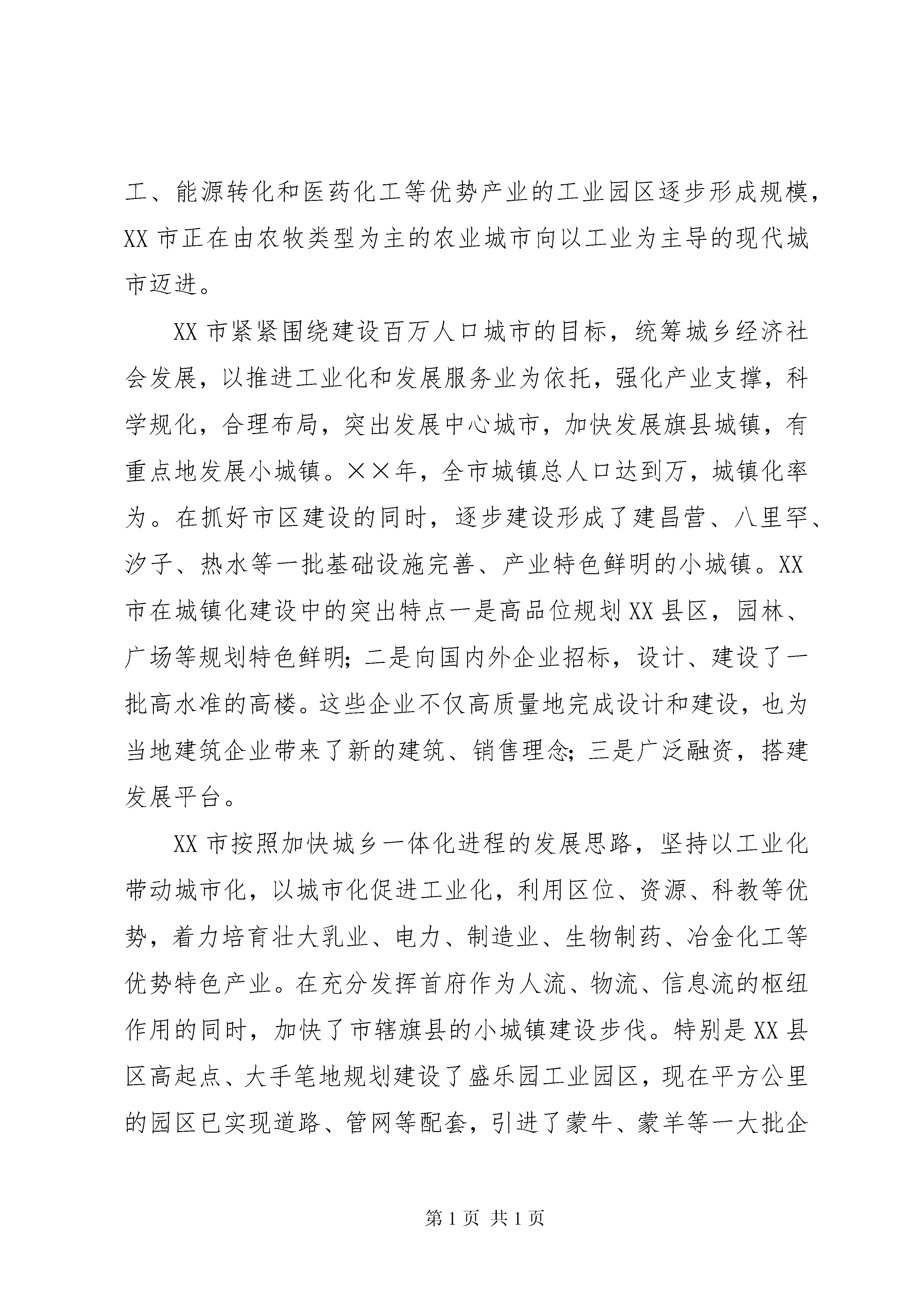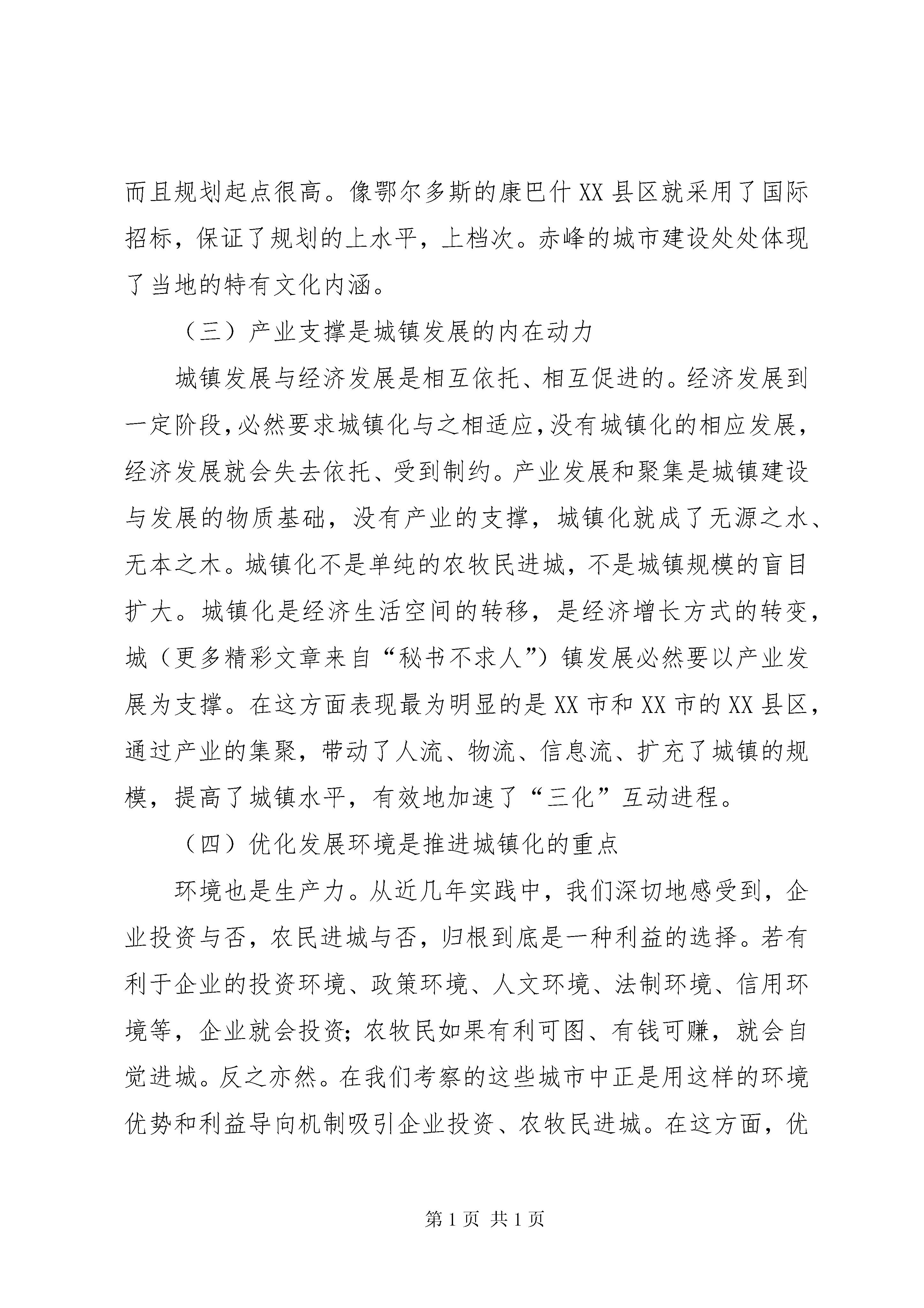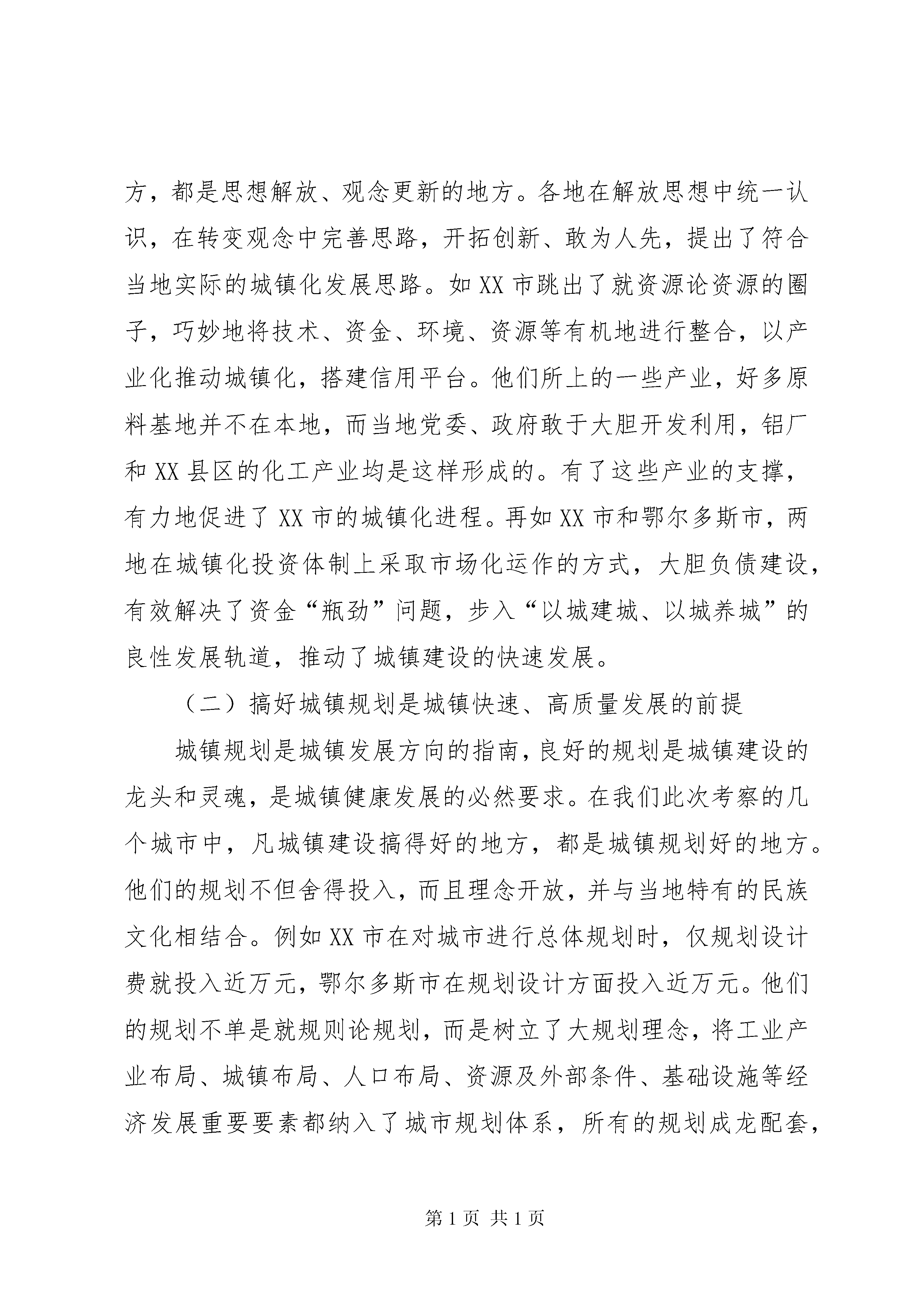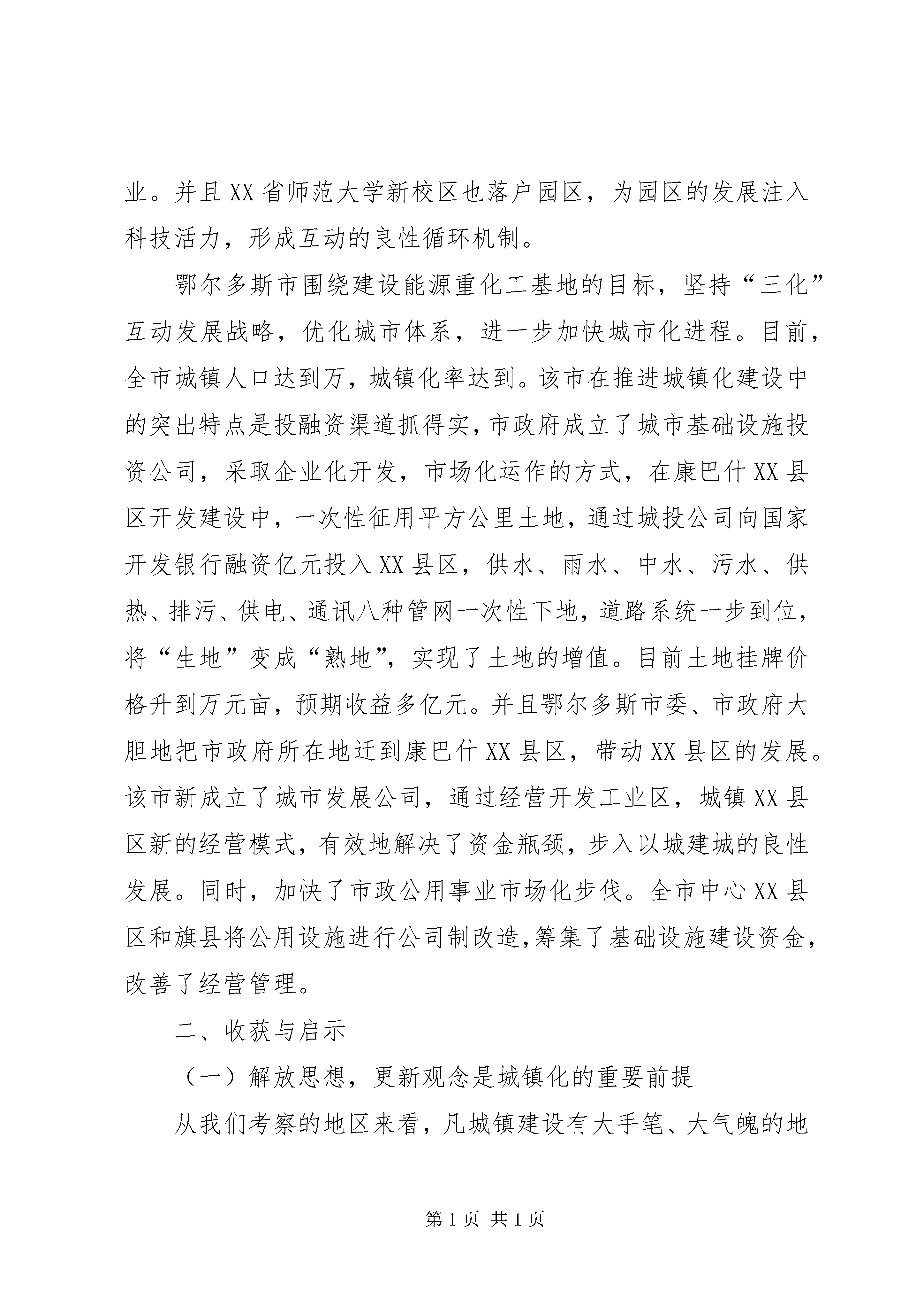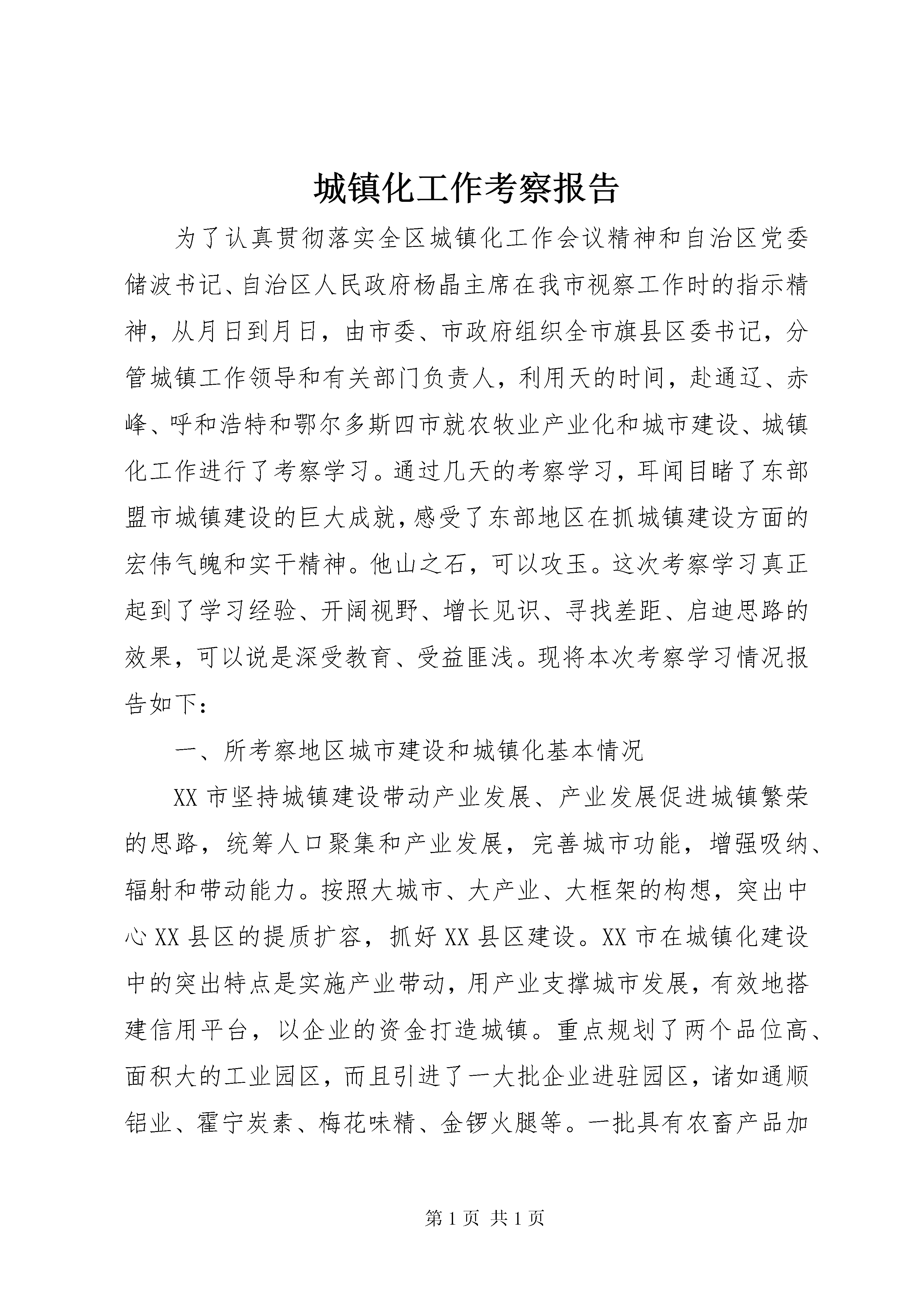 城镇化工作考察报告为了认真贯彻落实全区城镇化工作会议精神和自治区党委储波书记、自治区人民政府杨晶主席在我市视察工作时的指示精神,从月日到月日,由市委、市政府组织全市旗县区委书记,分管城镇工作领导和有关部门负责人,利用天的时间,赴通辽、赤峰、呼和浩特和鄂尔多斯四市就农牧业产业化和城市建设、城镇化工作进行了考察学习。通过几天的考察学习,耳闻目睹了东部盟市城镇建设的巨大成就,感受了东部地区在抓城镇建设方面的宏伟气魄和实干精神。他山之石,可以攻玉。这次考察学习真正起到了学习经验、开阔视野、增长见识、寻找差距、启迪思路的效果,可以说是深受教育、受益匪浅。现将本次考察学习情况报告如下:一、所考察地区城市建设和城镇化基本情况XX市坚持城镇建设带动产业发展、产业发展促进城镇繁荣的思路,统筹人口聚集和产业发展,完善城市功能,增强吸纳、辐射和带动能力。按照大城市、大产业、大框架的构想,突出中心XX县区的提质扩容,抓好XX县区建设。XX市在城镇化建设中的突出特点是实施产业带动,用产业支撑城市发展,有效地搭建信用平台,以企业的资金打造城镇。重点规划了两个品位高、面积大的工业园区,而且引进了一大批企业进驻园区,诸如通顺铝业、霍宁炭素、梅花味精、金锣火腿等。一批具有农畜产品加工、能源转化和医药化工等优势产业的工业园区逐步形成规模,XX市正在由农牧类型为主的农业城市向以工业为主导的现代城市迈进。XX市紧紧围绕建设百万人口城市的目标,统筹城乡经济社会发展,以推进工业化和发展服务业为依托,强化产业支撑,科学规化,合理布局,突出发展中心城市,加快发展旗县城镇,有重点地发展小城镇。××年,全市城镇总人口达到万,城镇化率为。在抓好市区建设的同时,逐步建设形成了建昌营、八里罕、汐子、热水等一批基础设施完善、产业特色鲜明的小城镇。XX市在城镇化建设中的突出特点一是高品位规划XX县区,园林、广场等规划特色鲜明;二是向国内外企业招标,设计、建设了一批高水准的高楼。这些企业不仅高质量地完成设计和建设,也为当地建筑企业带来了新的建筑、销售理念;三是广泛融资,搭建发展平台。XX市按照加快城乡一体化进程的发展思路,坚持以工业化带动城市化,以城市化促进工业化,利用区位、资源、科教等优势,着力培育壮大乳业、电力、制造业、生物制药、冶金化工等优势特色产业。在充分发挥首府作为人流、物流、信息流的枢纽作用的同时,加快了市辖旗县的小城镇建设步伐。特别是XX县区高起点、大手笔地规划建设了盛乐园工业园区,现在平方公里的园区已实现道路、管网等配套,引进了蒙牛、蒙羊等一大批企业。并且XX省师范大学新校区也落户园区,为园区的发展注入科技活力,形成互动的良性循环机制。鄂尔多斯市围绕建设能源重化工基地的目标,坚持“三化”互动发展战略,优化城市体系,进一步加快城市化进程。目前,全市城镇人口达到万,城镇化率达到。该市在推进城镇化建设中的突出特点是投融资渠道抓得实,市政府成立了城市基础设施投资公司,采取企业化开发,市场化运作的方式,在康巴什XX县区开发建设中,一次性征用平方公里土地,通过城投公司向国家开发银行融资亿元投入XX县区,供水、雨水、中水、污水、供热、排污、供电、通讯八种管网一次性下地,道路系统一步到位,将“生地”变成“熟地”,实现了土地的增值。目前土地挂牌价格升到万元亩,预期收益多亿元。并且鄂尔多斯市委、市政府大胆地把市政府所在地迁到康巴什XX县区,带动XX县区的发展。该市新成立了城市发展公司,通过经营开发工业区,城镇XX县区新的经营模式,有效地解决了资金瓶颈,步入以城建城的良性发展。同时,加快了市政公用事业市场化步伐。全市中心XX县区和旗县将公用设施进行公司制改造,筹集了基础设施建设资金,改善了经营管理。二、收获与启示(一)解放思想,更新观念是城镇化的重要前提从我们考察的地区来看,凡城镇建设有大手笔、大气魄的地方,都是思想解放、观念更新的地方。各地在解放思想中统一认识,在转变观念中完善思路,开拓创新、敢为人先,提出了符合当地实际的城镇化发展思路。如XX市跳出了就资源论资源的圈子,巧妙地将技术、资金、环境、资源等有机地进行整合,以产业化推动城镇化,搭建信用平台。他们所上的一些产业,好多原料基地并不在本地,而当地党委、政府敢于大胆开发利用,铝厂和XX县区的化工产业均是这样形成的。有了这些产业的支撑,有力地促进了XX市的城镇化进程。再如XX市和鄂尔多斯市,两地在城镇化投资体制上采取市场化运作的方式,大胆负债建设,有效解决了资金“瓶劲”问题,步入“以城建城、以城养城”的良性发展轨道,推动了城镇建设的快速发展。(二)搞好城镇规划是城镇快速、高质量发展的前提城镇规划是城镇发展方向的指南,良好的规划是城镇建设的龙头和灵魂,是城镇健康发展的必然要求。在我们此次考察的几个城市中,凡城镇建设搞得