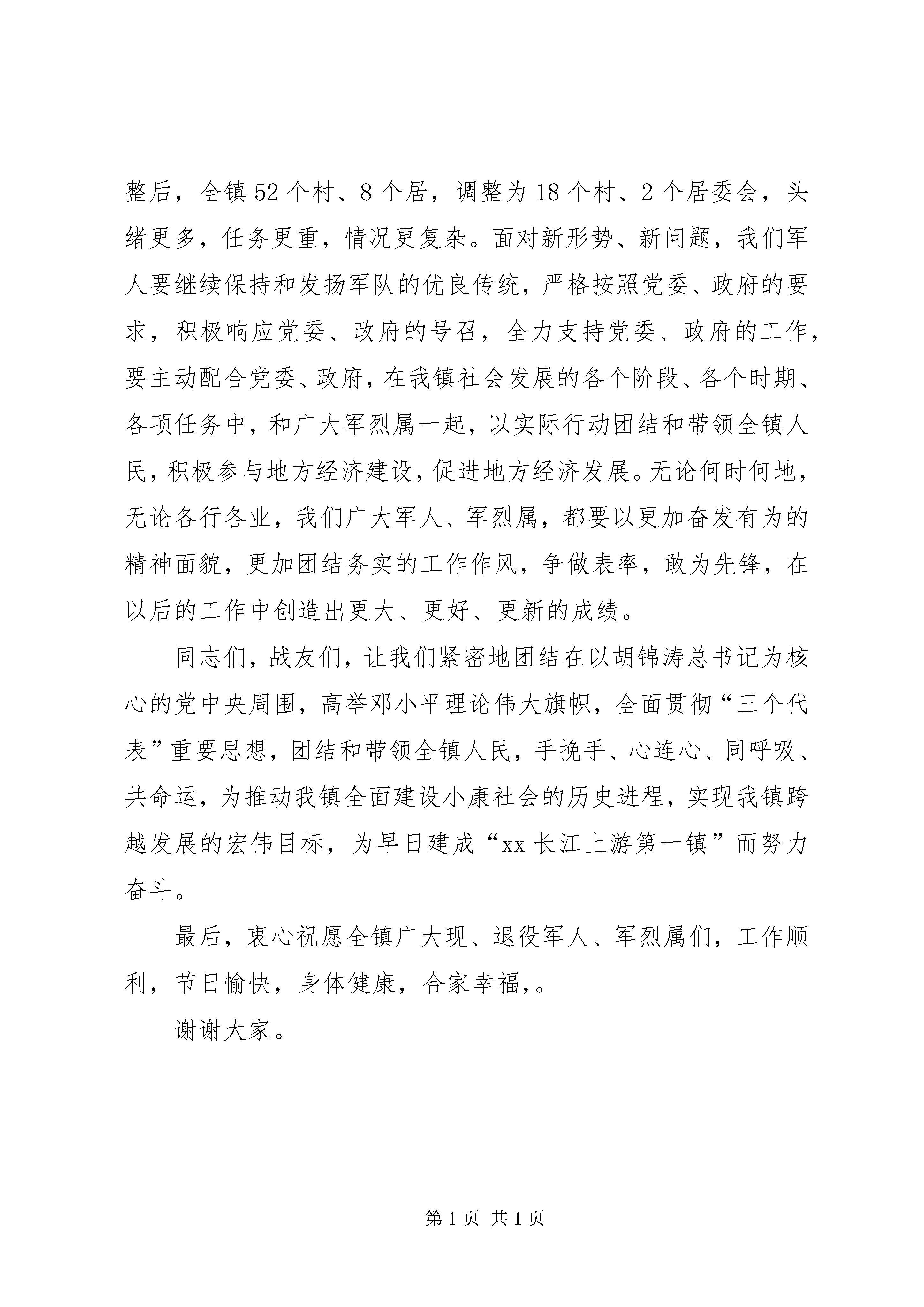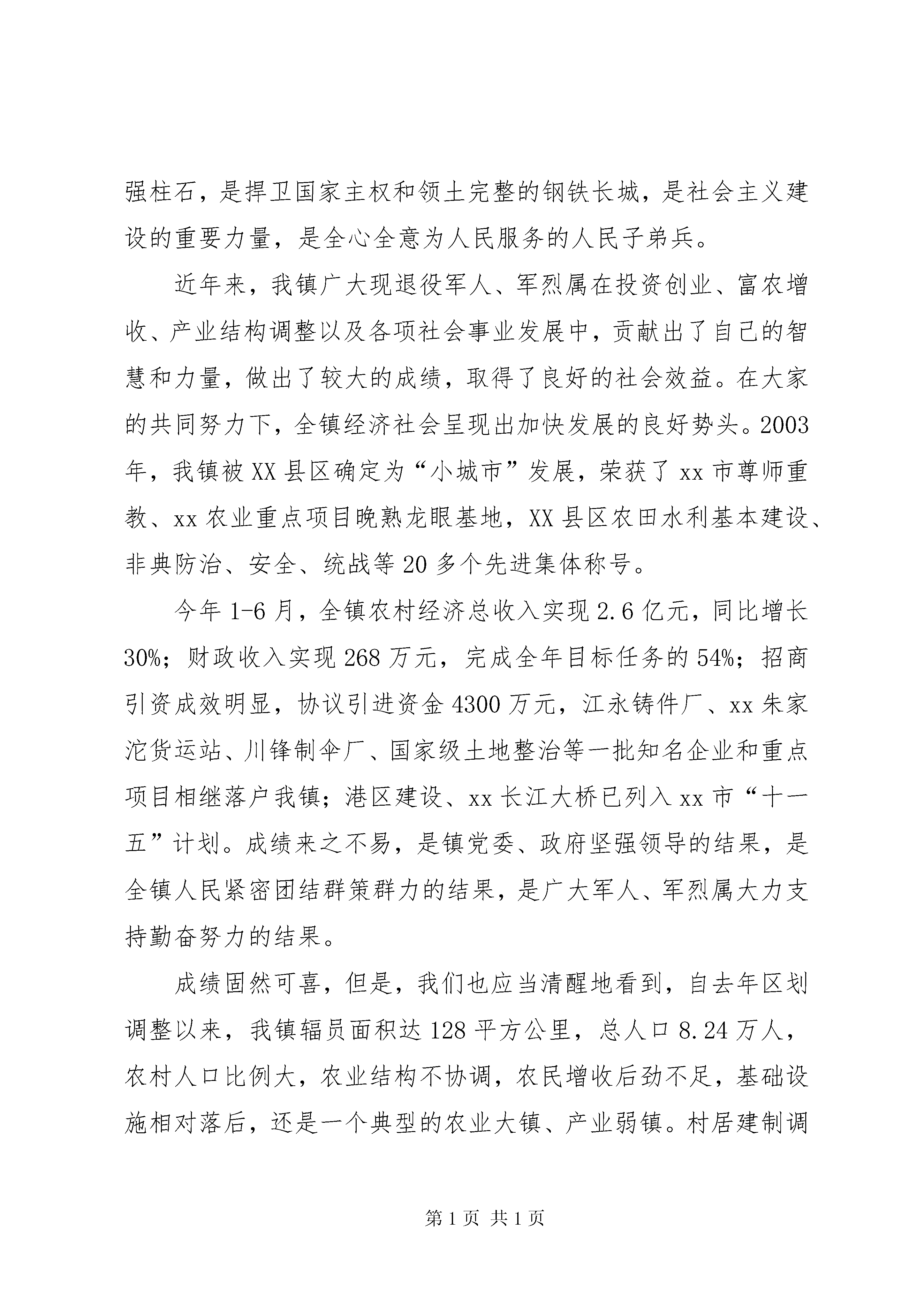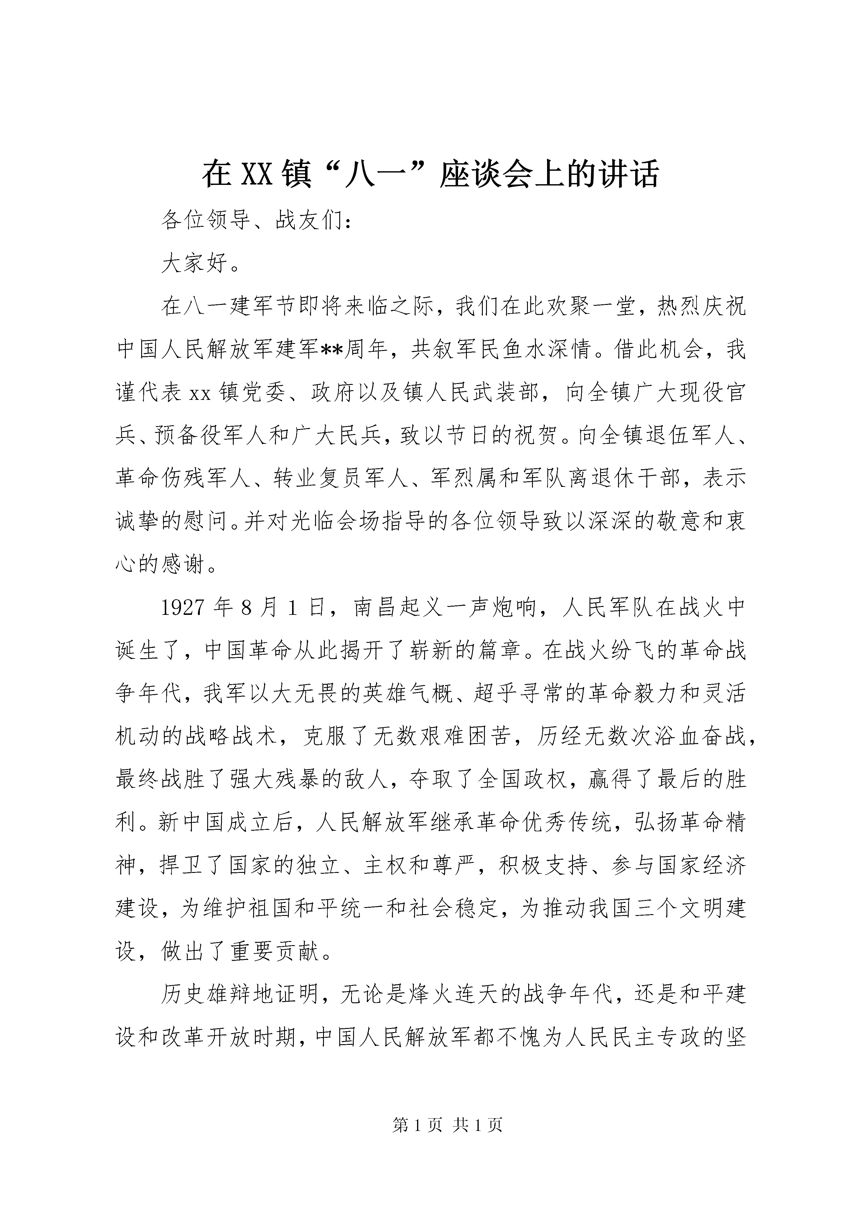 在XX镇“八一”座谈会上的讲话各位领导、战友们:大家好。在八一建军节即将来临之际,我们在此欢聚一堂,热烈庆祝中国人民解放军建军**周年,共叙军民鱼水深情。借此机会,我谨代表xx镇党委、政府以及镇人民武装部,向全镇广大现役官兵、预备役军人和广大民兵,致以节日的祝贺。向全镇退伍军人、革命伤残军人、转业复员军人、军烈属和军队离退休干部,表示诚挚的慰问。并对光临会场指导的各位领导致以深深的敬意和衷心的感谢。1927年8月1日,南昌起义一声炮响,人民军队在战火中诞生了,中国革命从此揭开了崭新的篇章。在战火纷飞的革命战争年代,我军以大无畏的英雄气概、超乎寻常的革命毅力和灵活机动的战略战术,克服了无数艰难困苦,历经无数次浴血奋战,最终战胜了强大残暴的敌人,夺取了全国政权,赢得了最后的胜利。新中国成立后,人民解放军继承革命优秀传统,弘扬革命精神,捍卫了国家的独立、主权和尊严,积极支持、参与国家经济建设,为维护祖国和平统一和社会稳定,为推动我国三个文明建设,做出了重要贡献。历史雄辩地证明,无论是烽火连天的战争年代,还是和平建设和改革开放时期,中国人民解放军都不愧为人民民主专政的坚强柱石,是捍卫国家主权和领土完整的钢铁长城,是社会主义建设的重要力量,是全心全意为人民服务的人民子弟兵。近年来,我镇广大现退役军人、军烈属在投资创业、富农增收、产业结构调整以及各项社会事业发展中,贡献出了自己的智慧和力量,做出了较大的成绩,取得了良好的社会效益。在大家的共同努力下,全镇经济社会呈现出加快发展的良好势头。2003年,我镇被XX县区确定为“小城市”发展,荣获了xx市尊师重教、xx农业重点项目晚熟龙眼基地,XX县区农田水利基本建设、非典防治、安全、统战等20多个先进集体称号。今年1-6月,全镇农村经济总收入实现2.6亿元,同比增长30%;财政收入实现268万元,完成全年目标任务的54%;招商引资成效明显,协议引进资金4300万元,江永铸件厂、xx朱家沱货运站、川锋制伞厂、国家级土地整治等一批知名企业和重点项目相继落户我镇;港区建设、xx长江大桥已列入xx市“十一五”计划。成绩来之不易,是镇党委、政府坚强领导的结果,是全镇人民紧密团结群策群力的结果,是广大军人、军烈属大力支持勤奋努力的结果。成绩固然可喜,但是,我们也应当清醒地看到,自去年区划调整以来,我镇辐员面积达128平方公里,总人口8.24万人,农村人口比例大,农业结构不协调,农民增收后劲不足,基础设施相对落后,还是一个典型的农业大镇、产业弱镇。村居建制调整后,全镇52个村、8个居,调整为18个村、2个居委会,头绪更多,任务更重,情况更复杂。面对新形势、新问题,我们军人要继续保持和发扬军队的优良传统,严格按照党委、政府的要求,积极响应党委、政府的号召,全力支持党委、政府的工作,要主动配合党委、政府,在我镇社会发展的各个阶段、各个时期、各项任务中,和广大军烈属一起,以实际行动团结和带领全镇人民,积极参与地方经济建设,促进地方经济发展。无论何时何地,无论各行各业,我们广大军人、军烈属,都要以更加奋发有为的精神面貌,更加团结务实的工作作风,争做表率,敢为先锋,在以后的工作中创造出更大、更好、更新的成绩。同志们,战友们,让我们紧密地团结在以胡锦涛总书记为核心的党中央周围,高举邓小平理论伟大旗帜,全面贯彻“三个代表”重要思想,团结和带领全镇人民,手挽手、心连心、同呼吸、共命运,为推动我镇全面建设小康社会的历史进程,实现我镇跨越发展的宏伟目标,为早日建成“xx长江上游第一镇”而努力奋斗。最后,衷心祝愿全镇广大现、退役军人、军烈属们,工作顺利,节日愉快,身体健康,合家幸福,。谢谢大家。