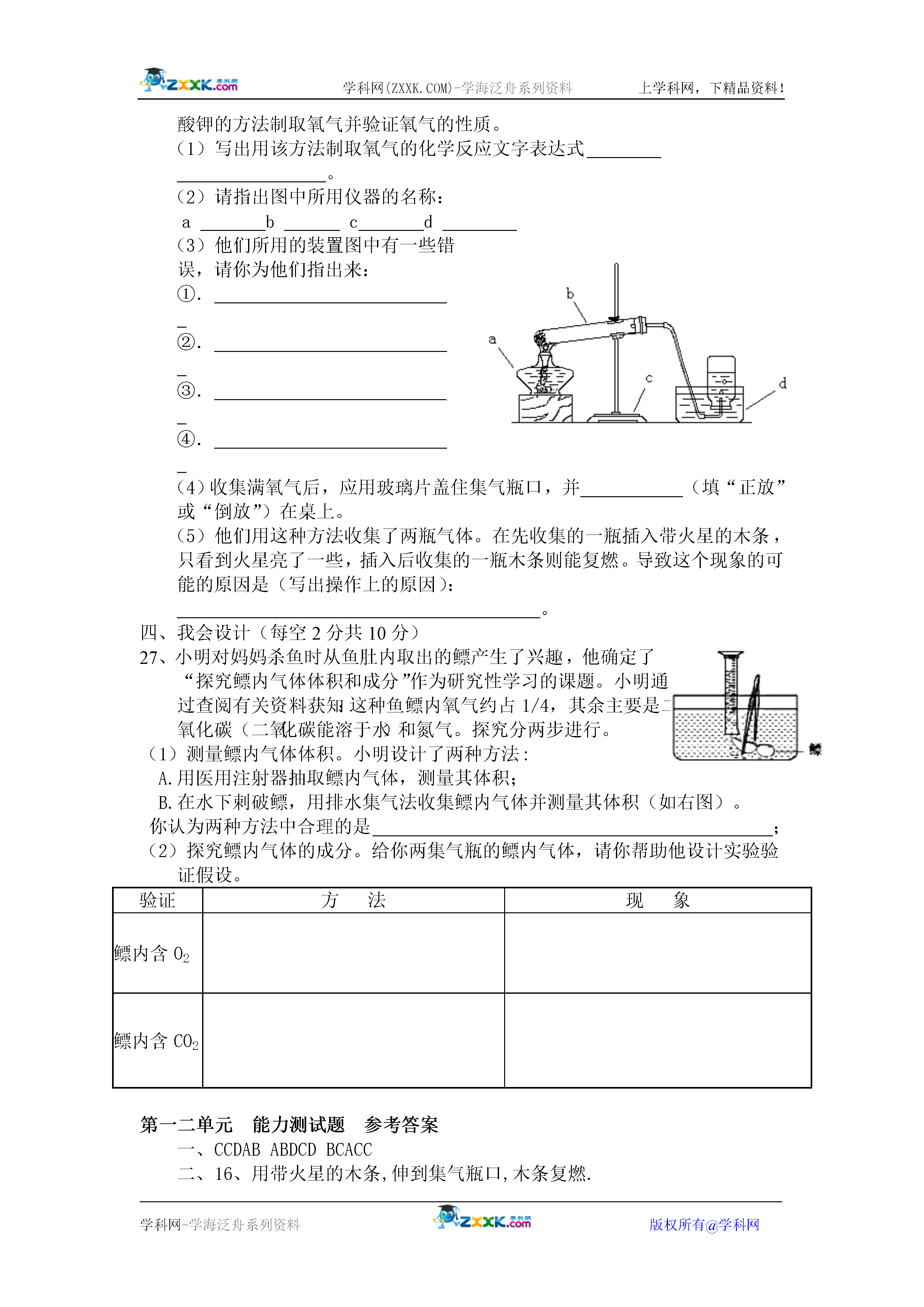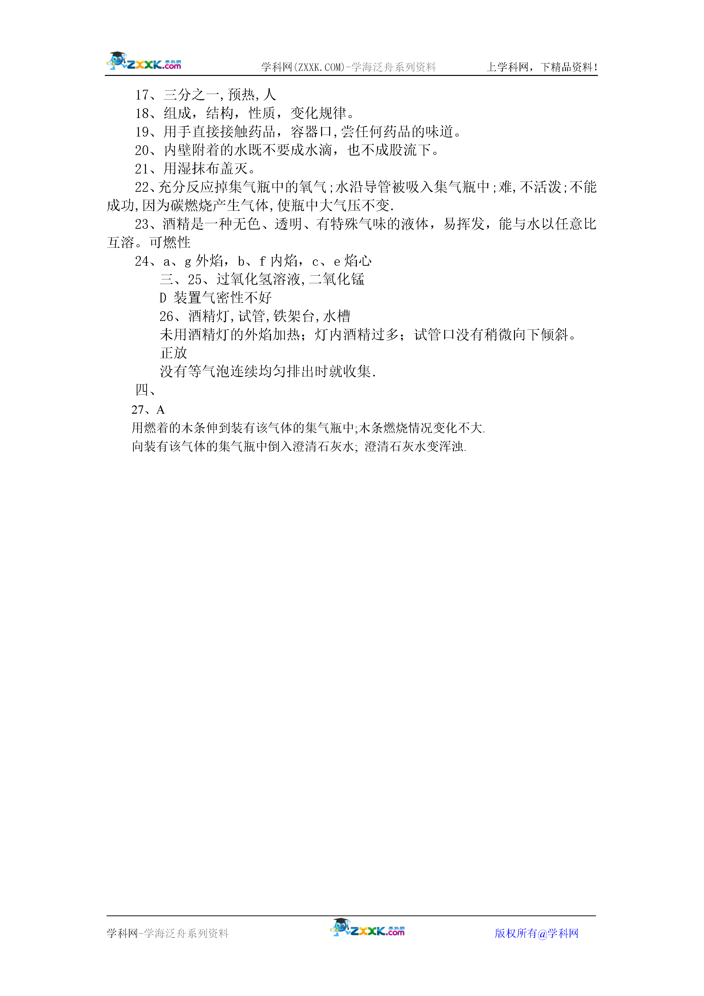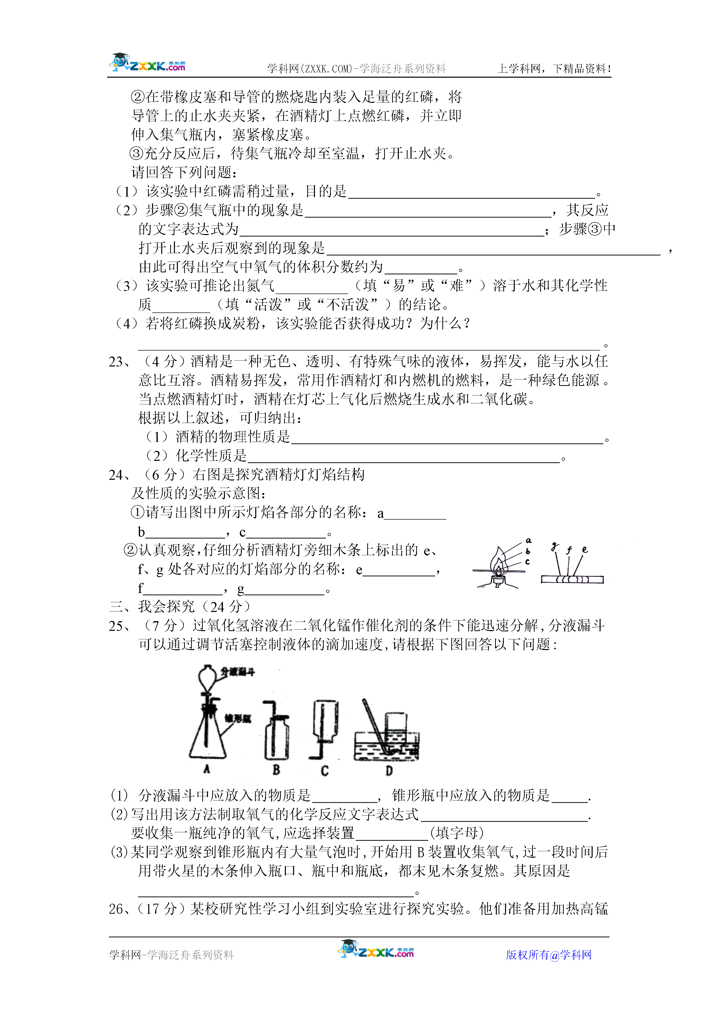 学科网(ZXXK.COM)-学海泛舟系列资料上学科网,下精品资料!学科网-学海泛舟系列资料版权所有@学科网2007-2008学年度蓬鸥中学初三化学第一二单元测试题班级姓名座号一、我会选:(每小题只有一个正确选项符合题意)(2分×15=30分)题日123456789101112131415答案1、下列成语中,一定包含有化学变化的是()A.木已成舟B.花香四溢C.烛炬成灰D.滴水成冰2、实验室可用于制取氧气的药品是()A.空气B.二氧化锰C.高锰酸钾或过氧化氢D.过氧化氢或二氧化锰3、关于“绿色化学”特点概述错误的是()A.采用无毒无害的原料,生产有利环保、人体健康、安全的产品。B.在无毒、无害的条件下反应,减少废物向环境排放。C.充分利用能源、资源,提高原子利用率、使原料的原子都成为产品。D.充分利用绿色原料进行化工生产,产出绿颜色产品。4、下列反应属于分解反应的是()通电点燃A.水——氧气+氢气B.铁+氧气——四氧化三铁点燃点燃C.铝+氧气——氧化铝D.石蜡+氧气——二氧化碳+水5、随着“绿色奥运”的理念逐渐深入人心,空气质量日益受到人们的关注。下列物质中,未计入监测空气污染指数项目的是()A.氮气B.二氧化硫C.一氧化碳D.可吸入颗粒物6、下列有关催化剂的说法中错误的是()A.催化剂就是二氧化锰B.催化剂能改变其他物质的化学反应速度C.在化学反应前后催化剂的质量没有改变D.在化学反应前后催化剂的化学性质没有改变7、对滴管正确使用方法叙述错误的是()A.滴瓶上的滴管专用,取用试剂后不要洗涤立即放回原位。B.非专用滴管可连续在不同试剂瓶中吸液。C.滴管吸液后,不要平放和倒置,不得放在桌上或它处。D.用滴管向试管中滴加试剂时,滴管要悬空,不得伸入试管或与试管壁接触。8、下列药品图标中,属腐蚀品的是()ABCD9、给3mL液体加热,需使用的仪器有()①试管②烧杯③试管夹④酒精灯⑤蒸发皿⑥石棉网⑦铁架台(带铁圈)A.①③④⑤B.②④⑥C.①③④D.②④⑥⑦10、如下图所示,王欢同学操作正确的是()11、对物质进行分类是学习化学的一种方法。“冰红茶”“雪碧饮料”“生理盐水”和“矿泉水”均属于()A.纯净物B.混合物C.氧化物D.无法判断12、下列物质的性质中,属于化学性质的是()A.酒精能挥发B.甲烷密度小于空气C.汽油能燃烧D.氯化氢气体极易溶于水13、实验室制取氧气大致可分为以下几个步骤:a将高锰酸钾装入试管,用带导管的橡皮塞塞紧试管口,并把它固定在铁架台上;b检查装置的气密性;c点燃酒精灯给试管加热;d用排水法收集氧气;e熄灭酒精灯;f将导气管从水中取出.正确的操作顺序是()A.bacdfeB.abcdefC.bacdefD.abcdfe14、小强用托盘天平称5.0克食盐,当指针不在分度盘中央而偏右时,就开始称量。称量后天平达到平衡时(指针在分度盘中央),则实际称量的食盐的质量A.等于5.0克B.小于5.0克C.大于5.0克D.无法判断15、下列实验现象的描述正确的是()A.木碳在氧气中燃烧产生明亮的黄色火焰B.磷在氧气中燃烧产生大量的白雾C.硫在氧气中燃烧发出蓝紫色火焰,生成带刺激性气味的气体D.硫在空气中燃烧发出淡蓝色火焰,生成无色无味的气体二、我会填:(36分)16、向上排空气法收集氧气时,验满的方法是用_______________放在_________,如果_______________就说明氧气已满。17、给试管里的液体加热,液体体积一般不超过试管容积的,加热前先使试管在火焰上来回移动,这种方法叫,加热时应不时地上下移动试管;为了避免伤人,加热时切记不可使试管口对着。18、化学是研究物质的以及规律的科学。19、实验室用的药品有的有毒性,有的有腐蚀性.为了安全不能用手,不要把鼻孔凑到去闻气体的气味,绝对不可品尝。20、玻璃仪器内壁洗干净的标准是。21、实验中,若不小心将酒精灯碰翻在桌上,桌上酒落的酒精燃烧起来,最简捷有效的扑灭方法是。22、(11分)某同学设计了测定空气中氧气含量的实验,实验装置如图。该同学的实验步骤如下:①将图中的集气瓶分为5等份,并作好标记。②在带橡皮塞和导管的燃烧匙内装入足量的红磷,将导管上的止水夹夹紧,在酒精灯上点燃红磷,并立即伸入集气瓶内,塞紧橡皮塞。③充分反应后,待集气瓶冷却至室温,打开止水夹。请回答下列问题:(1)该实验中红磷需稍过量,目的是。(2)步骤②集气瓶中的现象是,其反应的文字表达式为;步骤③中打开