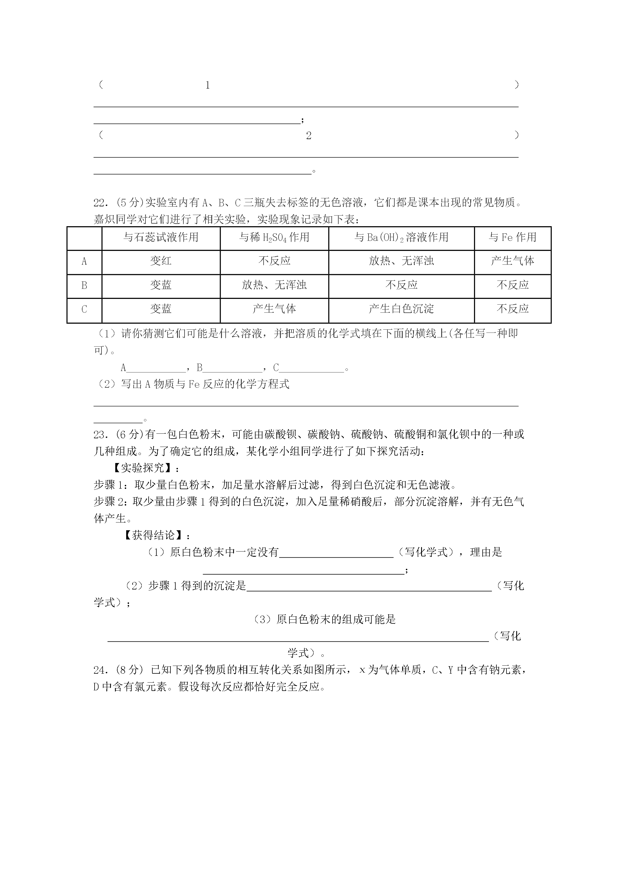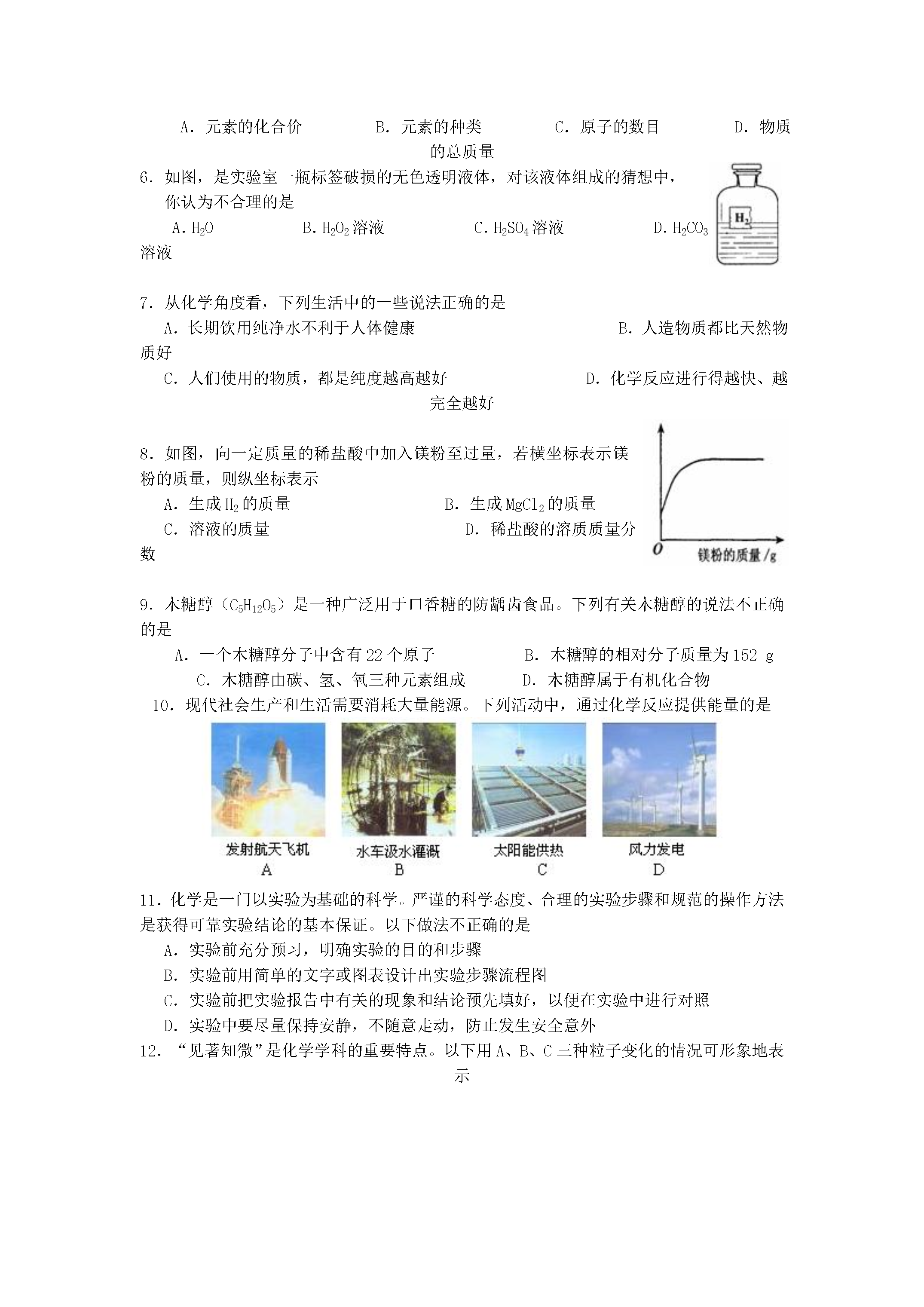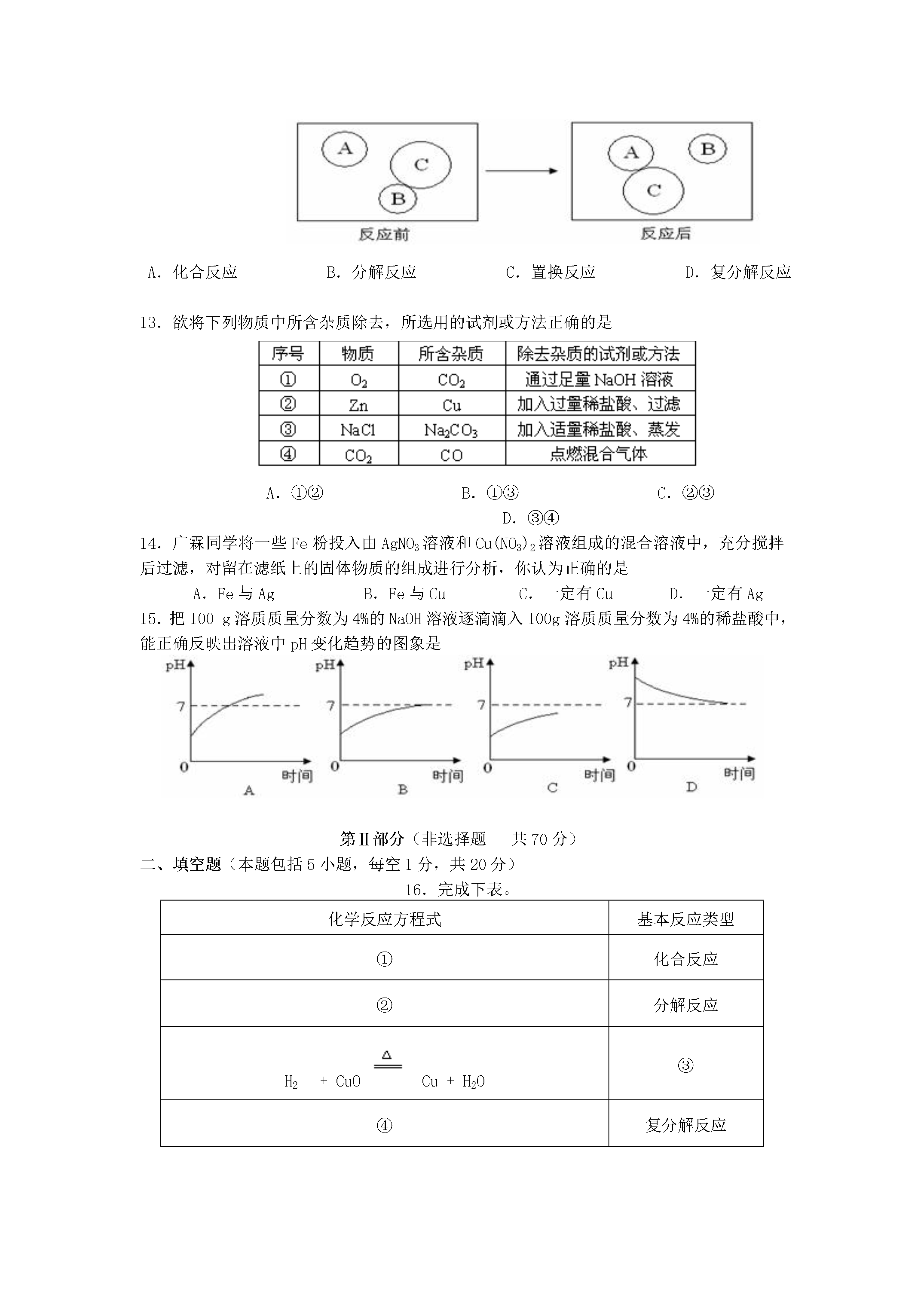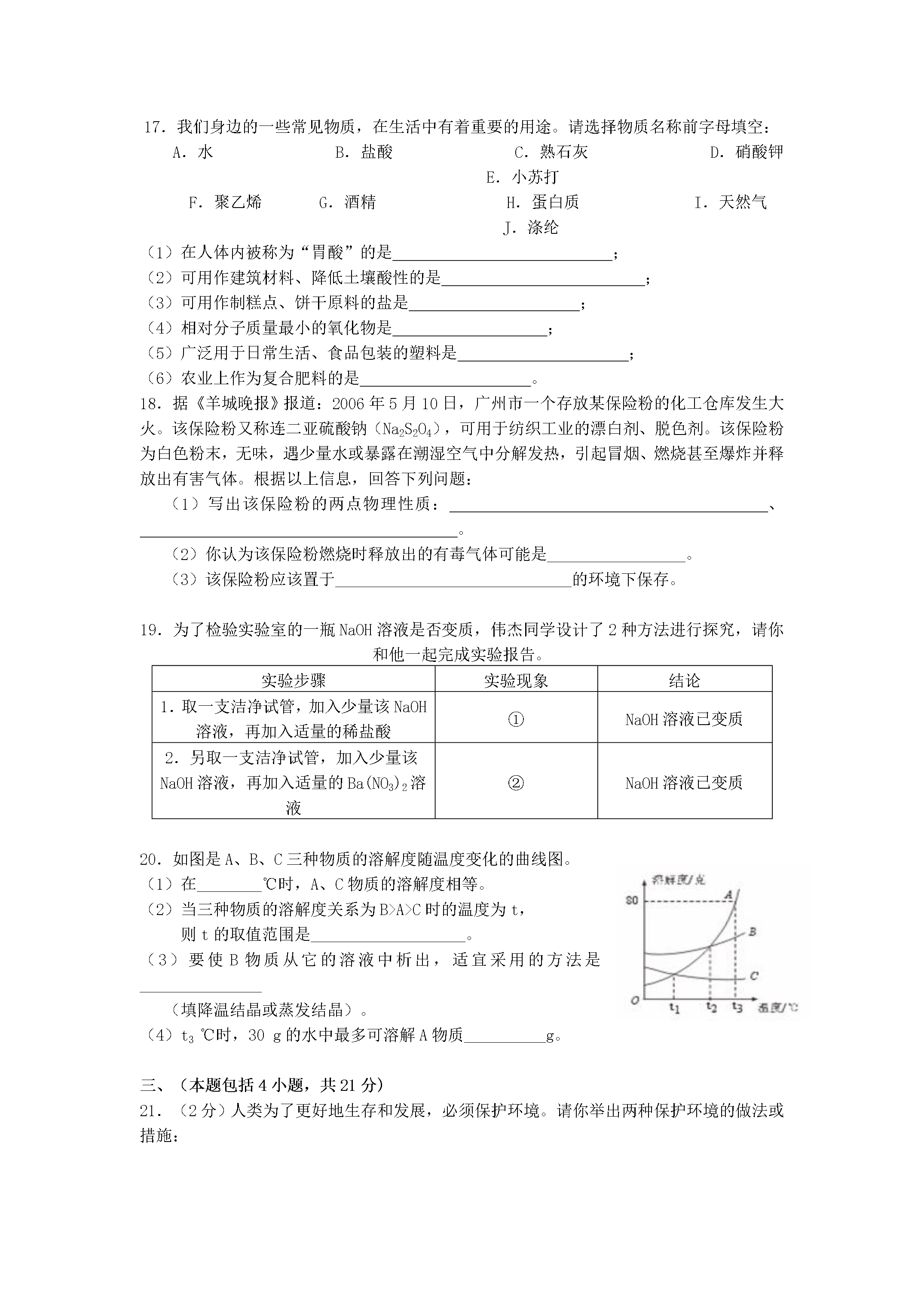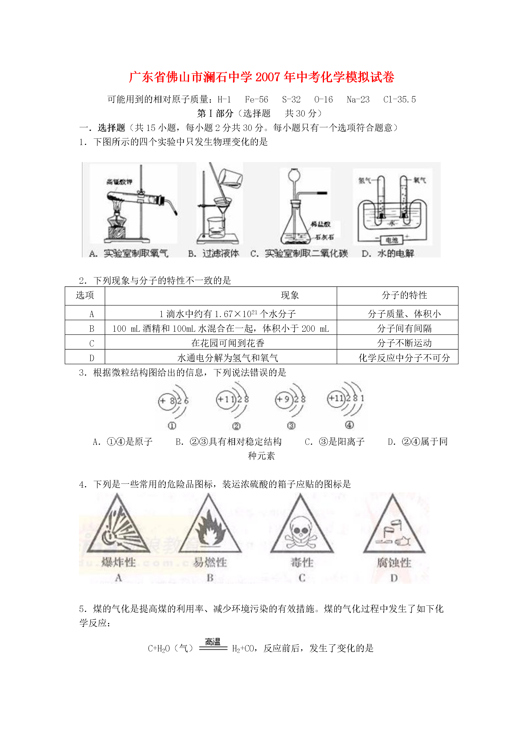 广东省佛山市澜石中学2007年中考化学模拟试卷可能用到的相对原子质量:H-1Fe-56S-32O-16Na-23Cl-35.5第Ⅰ部分(选择题共30分)一.选择题(共15小题,每小题2分共30分。每小题只有一个选项符合题意)1.下图所示的四个实验中只发生物理变化的是2.下列现象与分子的特性不一致的是选项现象分子的特性A1滴水中约有1.67×1021个水分子分子质量、体积小B100mL酒精和100mL水混合在一起,体积小于200mL分子间有间隔C在花园可闻到花香分子不断运动D水通电分解为氢气和氧气化学反应中分子不可分3.根据微粒结构图给出的信息,下列说法错误的是A.①④是原子B.②③具有相对稳定结构C.③是阳离子D.②④属于同种元素4.下列是一些常用的危险品图标,装运浓硫酸的箱子应贴的图标是5.煤的气化是提高煤的利用率、减少环境污染的有效措施。煤的气化过程中发生了如下化学反应:C+H2O(气)H2+CO,反应前后,发生了变化的是A.元素的化合价B.元素的种类C.原子的数目D.物质的总质量6.如图,是实验室一瓶标签破损的无色透明液体,对该液体组成的猜想中,你认为不合理的是A.H2OB.H2O2溶液C.H2SO4溶液D.H2CO3溶液7.从化学角度看,下列生活中的一些说法正确的是A.长期饮用纯净水不利于人体健康B.人造物质都比天然物质好C.人们使用的物质,都是纯度越高越好D.化学反应进行得越快、越完全越好8.如图,向一定质量的稀盐酸中加入镁粉至过量,若横坐标表示镁粉的质量,则纵坐标表示A.生成H2的质量B.生成MgCl2的质量C.溶液的质量D.稀盐酸的溶质质量分数9.木糖醇(C5H12O5)是一种广泛用于口香糖的防龋齿食品。下列有关木糖醇的说法不正确的是A.一个木糖醇分子中含有22个原子B.木糖醇的相对分子质量为152gC.木糖醇由碳、氢、氧三种元素组成D.木糖醇属于有机化合物10.现代社会生产和生活需要消耗大量能源。下列活动中,通过化学反应提供能量的是11.化学是一门以实验为基础的科学。严谨的科学态度、合理的实验步骤和规范的操作方法是获得可靠实验结论的基本保证。以下做法不正确的是A.实验前充分预习,明确实验的目的和步骤B.实验前用简单的文字或图表设计出实验步骤流程图C.实验前把实验报告中有关的现象和结论预先填好,以便在实验中进行对照D.实验中要尽量保持安静,不随意走动,防止发生安全意外12.“见著知微”是化学学科的重要特点。以下用A、B、C三种粒子变化的情况可形象地表示A.化合反应B.分解反应C.置换反应D.复分解反应13.欲将下列物质中所含杂质除去,所选用的试剂或方法正确的是A.①②B.①③C.②③D.③④14.广霖同学将一些Fe粉投入由AgNO3溶液和Cu(NO3)2溶液组成的混合溶液中,充分搅拌后过滤,对留在滤纸上的固体物质的组成进行分析,你认为正确的是A.Fe与AgB.Fe与CuC.一定有CuD.一定有Ag15.把100g溶质质量分数为4%的NaOH溶液逐滴滴入100g溶质质量分数为4%的稀盐酸中,能正确反映出溶液中pH变化趋势的图象是第Ⅱ部分(非选择题共70分)二、填空题(本题包括5小题,每空1分,共20分)16.完成下表。化学反应方程式基本反应类型①化合反应②分解反应H2+CuOCu+H2O③④复分解反应17.我们身边的一些常见物质,在生活中有着重要的用途。请选择物质名称前字母填空:A.水B.盐酸C.熟石灰D.硝酸钾E.小苏打F.聚乙烯G.酒精H.蛋白质I.天然气J.涤纶(1)在人体内被称为“胃酸”的是;(2)可用作建筑材料、降低土壤酸性的是;(3)可用作制糕点、饼干原料的盐是;(4)相对分子质量最小的氧化物是;(5)广泛用于日常生活、食品包装的塑料是;(6)农业上作为复合肥料的是。18.据《羊城晚报》报道:2006年5月10日,广州市一个存放某保险粉的化工仓库发生大火。该保险粉又称连二亚硫酸钠(Na2S2O4),可用于纺织工业的漂白剂、脱色剂。该保险粉为白色粉末,无味,遇少量水或暴露在潮湿空气中分解发热,引起冒烟、燃烧甚至爆炸并释放出有害气体。根据以上信息,回答下列问题:(1)写出该保险粉的两点物理性质:、。(2)你认为该保险粉燃烧时释放出的有毒气体可能是_________________。(3)该保险粉应该置于_____________________________的环境下保存。19.为了检验实验室的一瓶NaOH溶液是否变质,伟杰同学设计了2种方法进行探究,请你和他一起完成实验报告。实验步骤实验现象结论1.取一支洁净试管,加入少量该NaOH溶液,再加入适量的稀盐酸①NaOH溶液已变质2.另取一支洁净试管,加入少量该NaOH溶液,再加入适量的Ba(NO3)2溶液②NaOH溶液已变质20.如图是A、B、C三种物质的溶