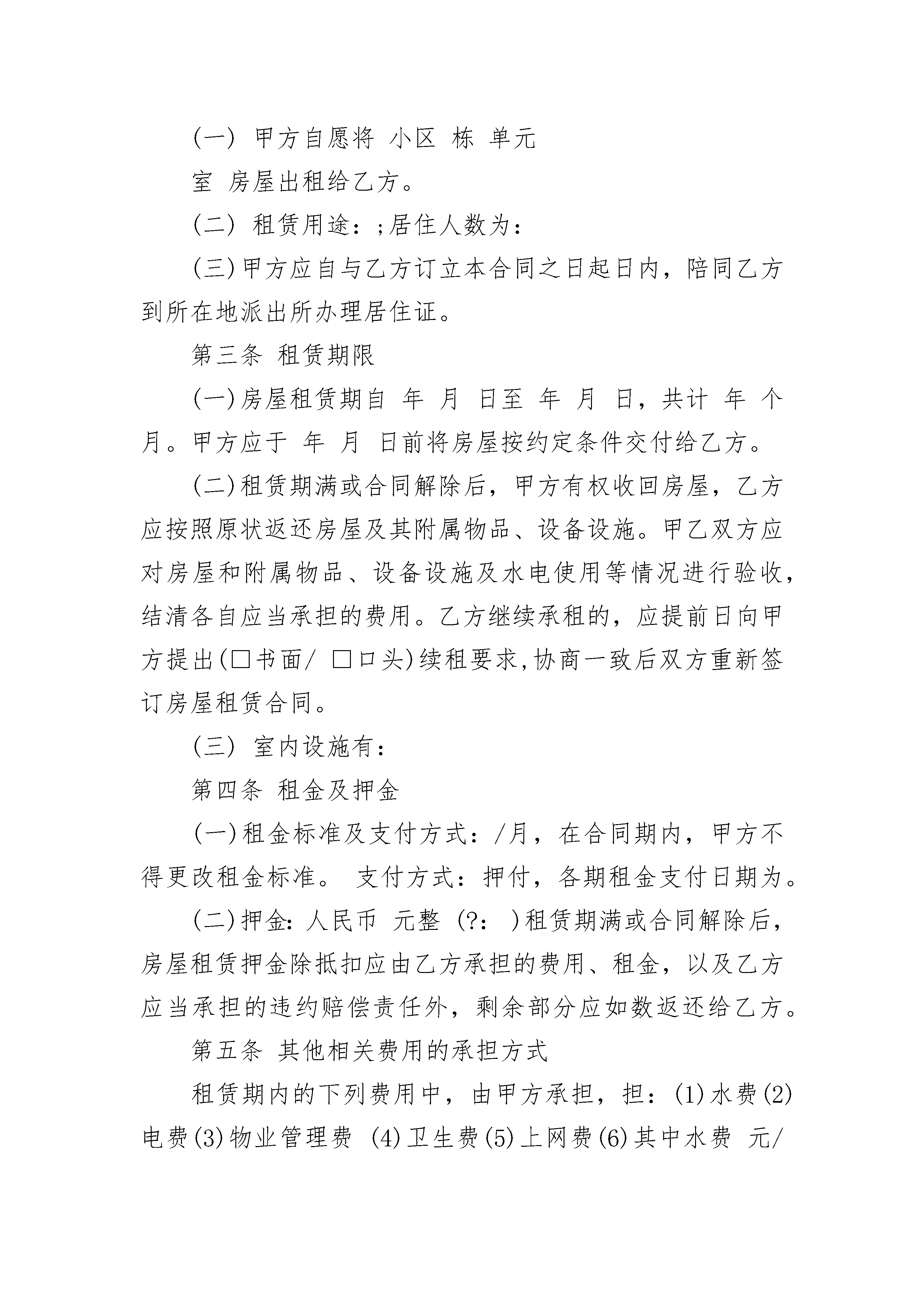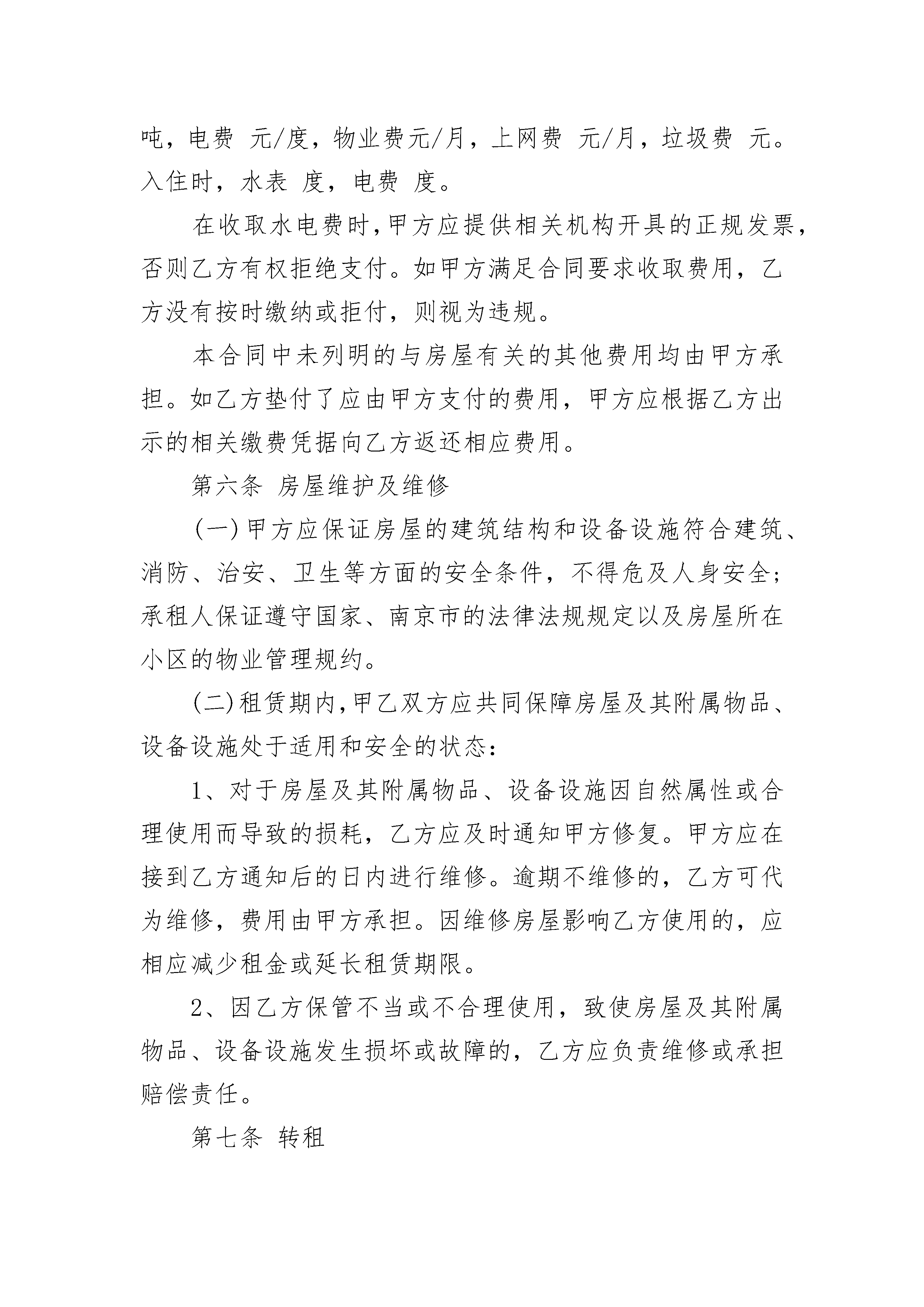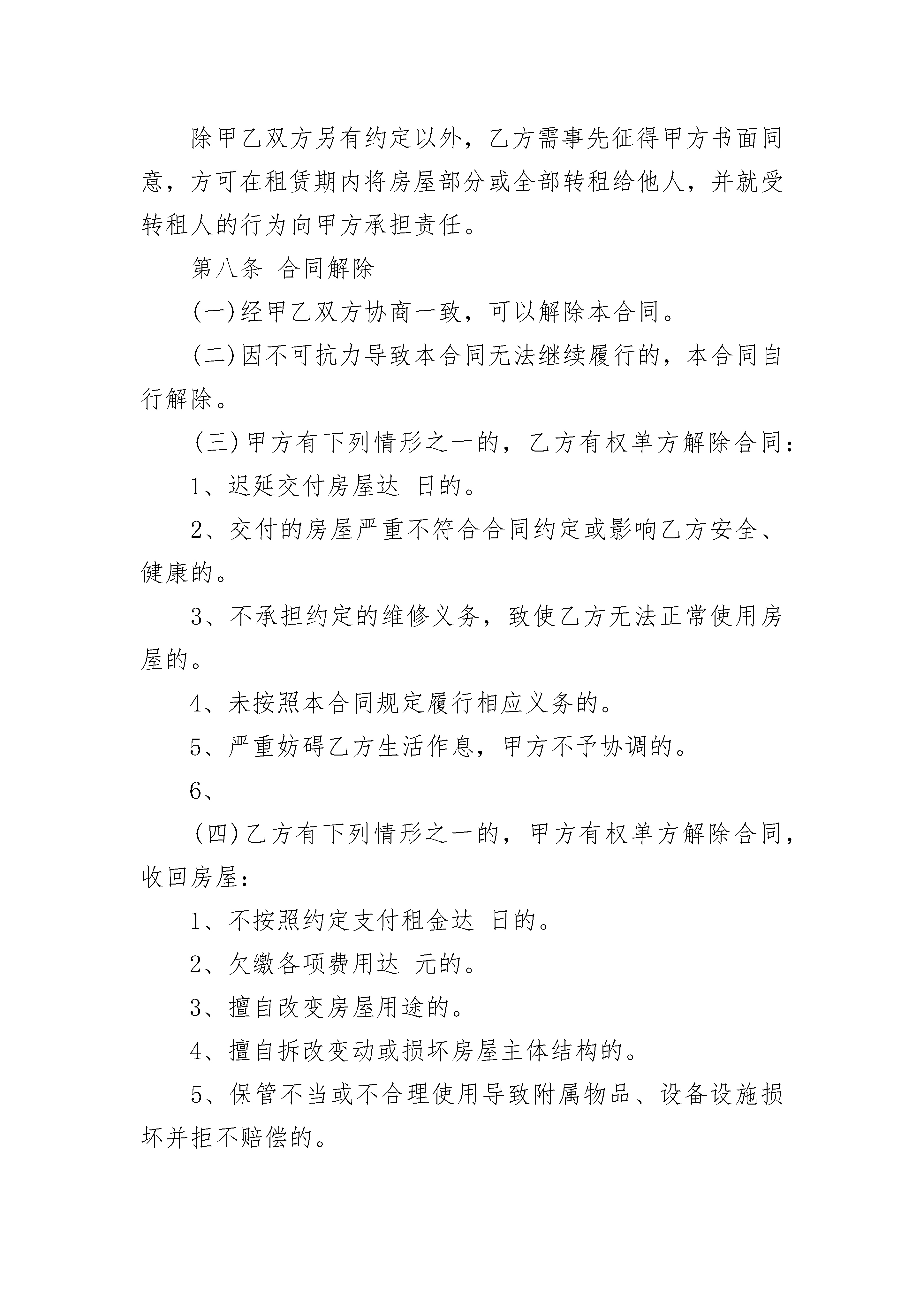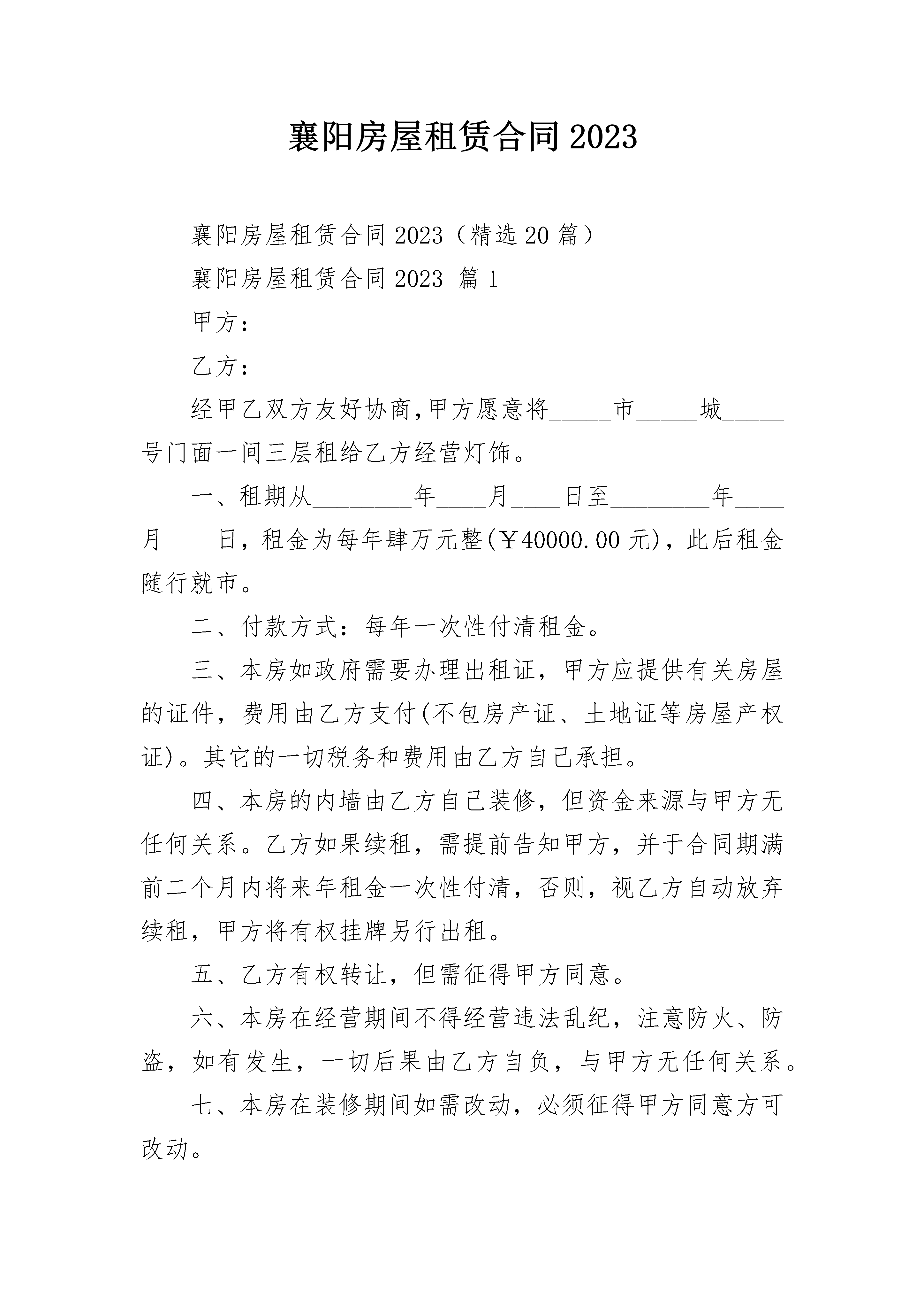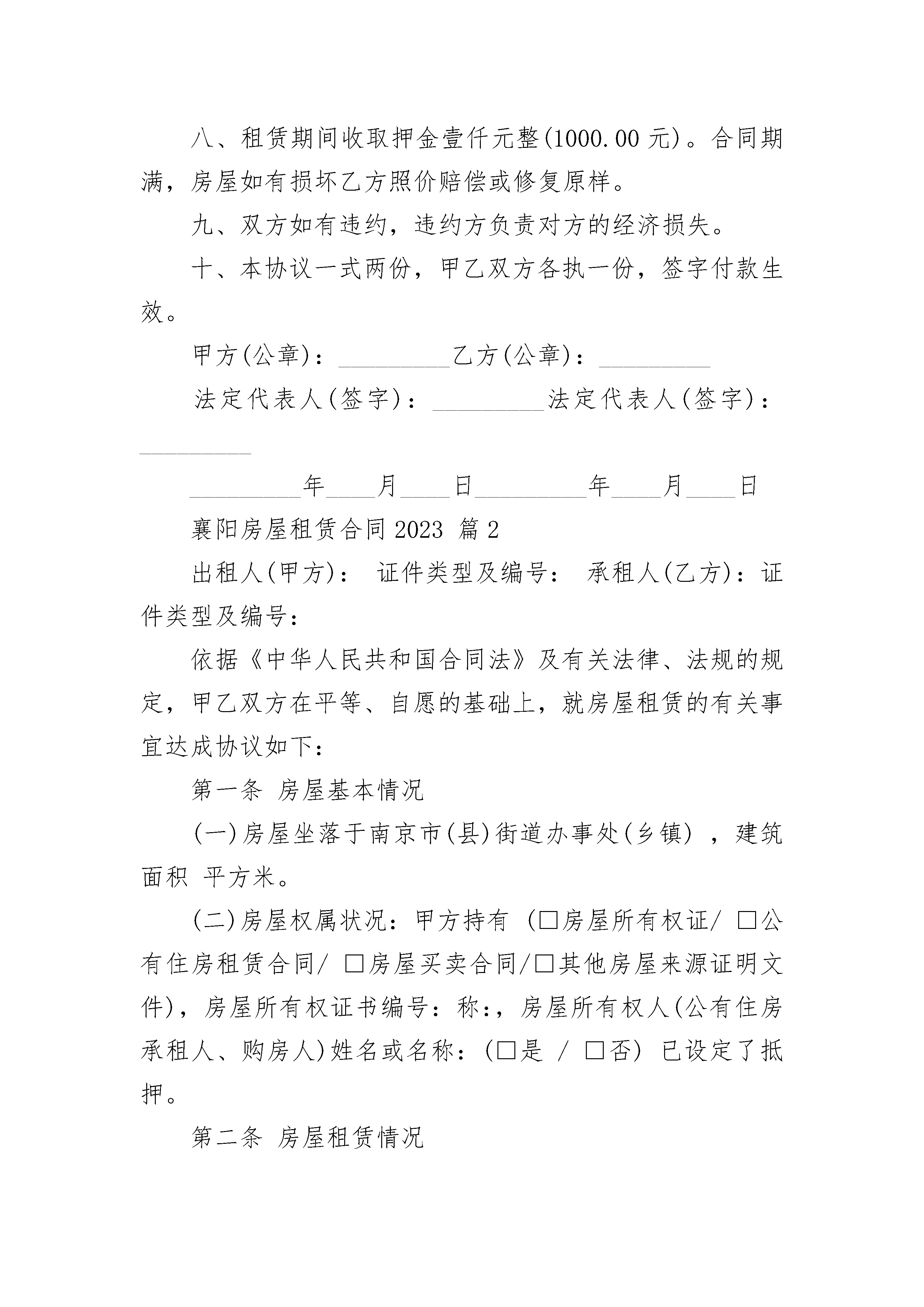 襄阳房屋租赁合同2023襄阳房屋租赁合同2023(精选20篇)襄阳房屋租赁合同2023篇1甲方:乙方:经甲乙双方友好协商,甲方愿意将_____市_____城_____号门面一间三层租给乙方经营灯饰。一、租期从________年____月____日至________年____月____日,租金为每年肆万元整(¥40000.00元),此后租金随行就市。二、付款方式:每年一次性付清租金。三、本房如政府需要办理出租证,甲方应提供有关房屋的证件,费用由乙方支付(不包房产证、土地证等房屋产权证)。其它的一切税务和费用由乙方自己承担。四、本房的内墙由乙方自己装修,但资金来源与甲方无任何关系。乙方如果续租,需提前告知甲方,并于合同期满前二个月内将来年租金一次性付清,否则,视乙方自动放弃续租,甲方将有权挂牌另行出租。五、乙方有权转让,但需征得甲方同意。六、本房在经营期间不得经营违法乱纪,注意防火、防盗,如有发生,一切后果由乙方自负,与甲方无任何关系。七、本房在装修期间如需改动,必须征得甲方同意方可改动。八、租赁期间收取押金壹仟元整(1000.00元)。合同期满,房屋如有损坏乙方照价赔偿或修复原样。九、双方如有违约,违约方负责对方的经济损失。十、本协议一式两份,甲乙双方各执一份,签字付款生效。甲方(公章):_________乙方(公章):_________法定代表人(签字):_________法定代表人(签字):__________________年____月____日_________年____月____日襄阳房屋租赁合同2023篇2出租人(甲方):证件类型及编号:承租人(乙方):证件类型及编号:依据《中华人民共和国合同法》及有关法律、法规的规定,甲乙双方在平等、自愿的基础上,就房屋租赁的有关事宜达成协议如下:第一条房屋基本情况(一)房屋坐落于南京市(县)街道办事处(乡镇),建筑面积平方米。(二)房屋权属状况:甲方持有(□房屋所有权证/□公有住房租赁合同/□房屋买卖合同/□其他房屋来源证明文件),房屋所有权证书编号:称:,房屋所有权人(公有住房承租人、购房人)姓名或名称:(□是/□否)已设定了抵押。第二条房屋租赁情况(一)甲方自愿将小区栋单元室房屋出租给乙方。(二)租赁用途:;居住人数为:(三)甲方应自与乙方订立本合同之日起日内,陪同乙方到所在地派出所办理居住证。第三条租赁期限(一)房屋租赁期自年月日至年月日,共计年个月。甲方应于年月日前将房屋按约定条件交付给乙方。(二)租赁期满或合同解除后,甲方有权收回房屋,乙方应按照原状返还房屋及其附属物品、设备设施。甲乙双方应对房屋和附属物品、设备设施及水电使用等情况进行验收,结清各自应当承担的费用。乙方继续承租的,应提前日向甲方提出(□书面/□口头)续租要求,协商一致后双方重新签订房屋租赁合同。(三)室内设施有:第四条租金及押金(一)租金标准及支付方式:/月,在合同期内,甲方不得更改租金标准。支付方式:押付,各期租金支付日期为。(二)押金:人民币元整(?:)租赁期满或合同解除后,房屋租赁押金除抵扣应由乙方承担的费用、租金,以及乙方应当承担的违约赔偿责任外,剩余部分应如数返还给乙方。第五条其他相关费用的承担方式租赁期内的下列费用中,由甲方承担,担:(1)水费(2)电费(3)物业管理费(4)卫生费(5)上网费(6)其中水费元/吨,电费元/度,物业费元/月,上网费元/月,垃圾费元。入住时,水表度,电费度。在收取水电费时,甲方应提供相关机构开具的正规发票,否则乙方有权拒绝支付。如甲方满足合同要求收取费用,乙方没有按时缴纳或拒付,则视为违规。本合同中未列明的与房屋有关的其他费用均由甲方承担。如乙方垫付了应由甲方支付的费用,甲方应根据乙方出示的相关缴费凭据向乙方返还相应费用。第六条房屋维护及维修(一)甲方应保证房屋的建筑结构和设备设施符合建筑、消防、治安、卫生等方面的安全条件,不得危及人身安全;承租人保证遵守国家、南京市的法律法规规定以及房屋所在小区的物业管理规约。(二)租赁期内,甲乙双方应共同保障房屋及其附属物品、设备设施处于适用和安全的状态:1、对于房屋及其附属物品、设备设施因自然属性或合理使用而导致的损耗,乙方应及时通知甲方修复。甲方应在接到乙方通知后的日内进行维修。逾期不维修的,乙方可代为维修,费用由甲方承担。因维修房屋影响乙方使用的,应相应减少租金或延长租赁期限。2、因乙方保管不当或不合理使用,致使房屋及其附属物品、设备设施发生损坏或故障的,乙方应负责维修或承担赔偿责任。第七条转租除甲乙双方另有约定以外,乙方需事先征得甲方书面同意,方可在租赁期内将房屋部分或全部转租给他人,并就受转租人的行为向甲方承担责任。第八条合同解除(一)经甲乙双方协商一致,可以解除本合同。(二)因不可抗力导致本合同无法继续履行的