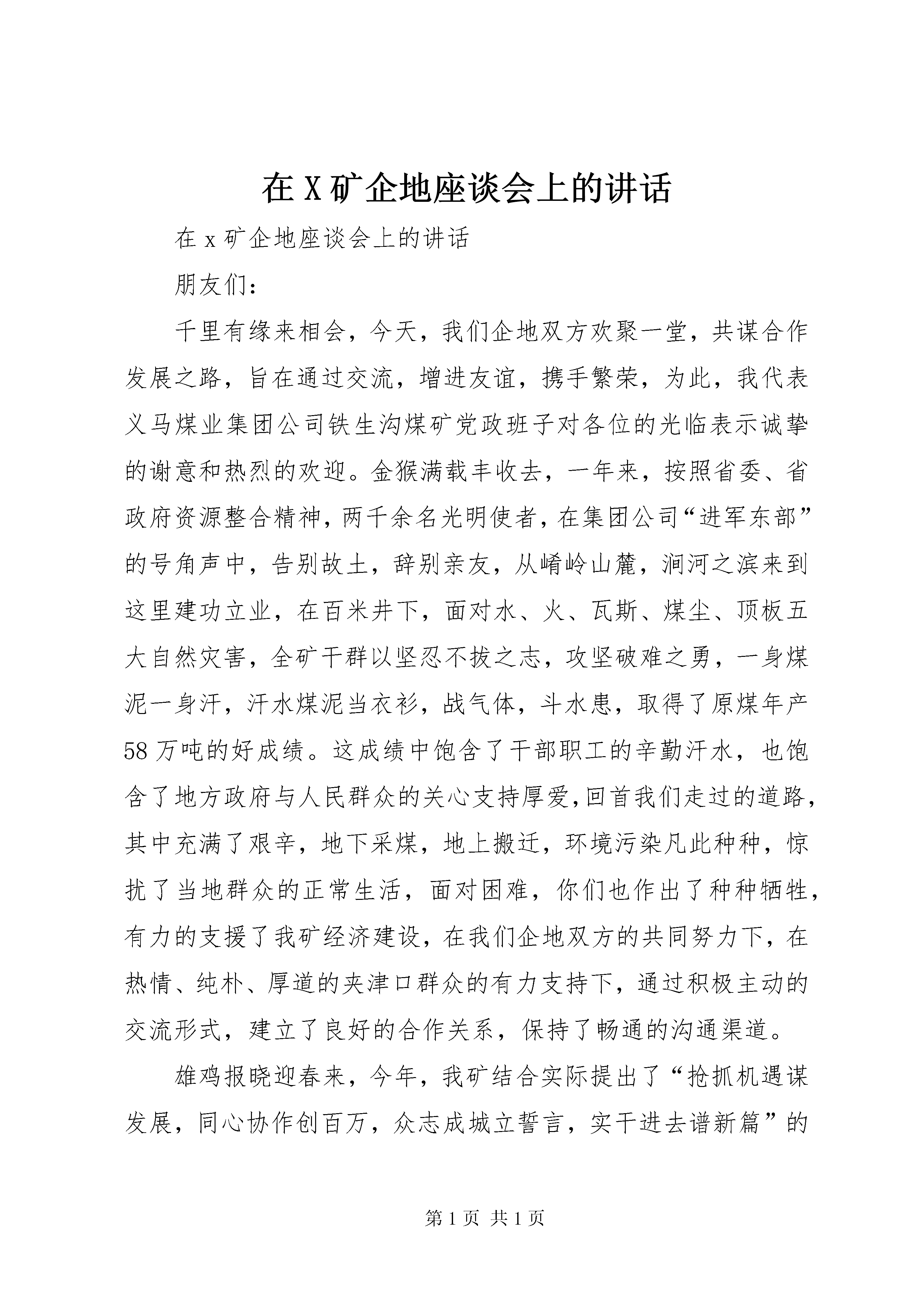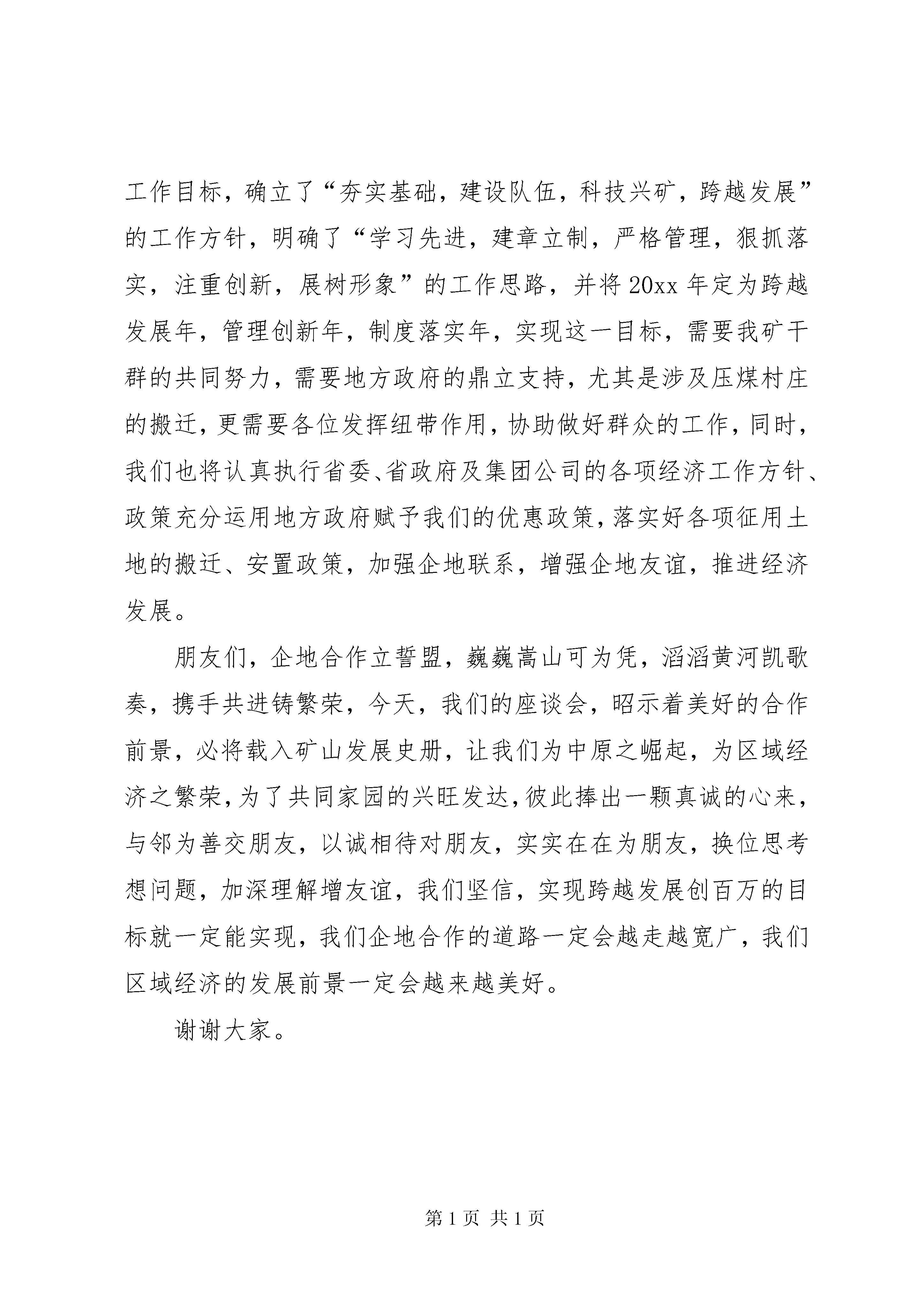 在X矿企地座谈会上的讲话在x矿企地座谈会上的讲话朋友们:千里有缘来相会,今天,我们企地双方欢聚一堂,共谋合作发展之路,旨在通过交流,增进友谊,携手繁荣,为此,我代表义马煤业集团公司铁生沟煤矿党政班子对各位的光临表示诚挚的谢意和热烈的欢迎。金猴满载丰收去,一年来,按照省委、省政府资源整合精神,两千余名光明使者,在集团公司“进军东部”的号角声中,告别故土,辞别亲友,从崤岭山麓,涧河之滨来到这里建功立业,在百米井下,面对水、火、瓦斯、煤尘、顶板五大自然灾害,全矿干群以坚忍不拔之志,攻坚破难之勇,一身煤泥一身汗,汗水煤泥当衣衫,战气体,斗水患,取得了原煤年产58万吨的好成绩。这成绩中饱含了干部职工的辛勤汗水,也饱含了地方政府与人民群众的关心支持厚爱,回首我们走过的道路,其中充满了艰辛,地下采煤,地上搬迁,环境污染凡此种种,惊扰了当地群众的正常生活,面对困难,你们也作出了种种牺牲,有力的支援了我矿经济建设,在我们企地双方的共同努力下,在热情、纯朴、厚道的夹津口群众的有力支持下,通过积极主动的交流形式,建立了良好的合作关系,保持了畅通的沟通渠道。雄鸡报晓迎春来,今年,我矿结合实际提出了“抢抓机遇谋发展,同心协作创百万,众志成城立誓言,实干进去谱新篇”的工作目标,确立了“夯实基础,建设队伍,科技兴矿,跨越发展”的工作方针,明确了“学习先进,建章立制,严格管理,狠抓落实,注重创新,展树形象”的工作思路,并将20xx年定为跨越发展年,管理创新年,制度落实年,实现这一目标,需要我矿干群的共同努力,需要地方政府的鼎立支持,尤其是涉及压煤村庄的搬迁,更需要各位发挥纽带作用,协助做好群众的工作,同时,我们也将认真执行省委、省政府及集团公司的各项经济工作方针、政策充分运用地方政府赋予我们的优惠政策,落实好各项征用土地的搬迁、安置政策,加强企地联系,增强企地友谊,推进经济发展。朋友们,企地合作立誓盟,巍巍嵩山可为凭,滔滔黄河凯歌奏,携手共进铸繁荣,今天,我们的座谈会,昭示着美好的合作前景,必将载入矿山发展史册,让我们为中原之崛起,为区域经济之繁荣,为了共同家园的兴旺发达,彼此捧出一颗真诚的心来,与邻为善交朋友,以诚相待对朋友,实实在在为朋友,换位思考想问题,加深理解增友谊,我们坚信,实现跨越发展创百万的目标就一定能实现,我们企地合作的道路一定会越走越宽广,我们区域经济的发展前景一定会越来越美好。谢谢大家。