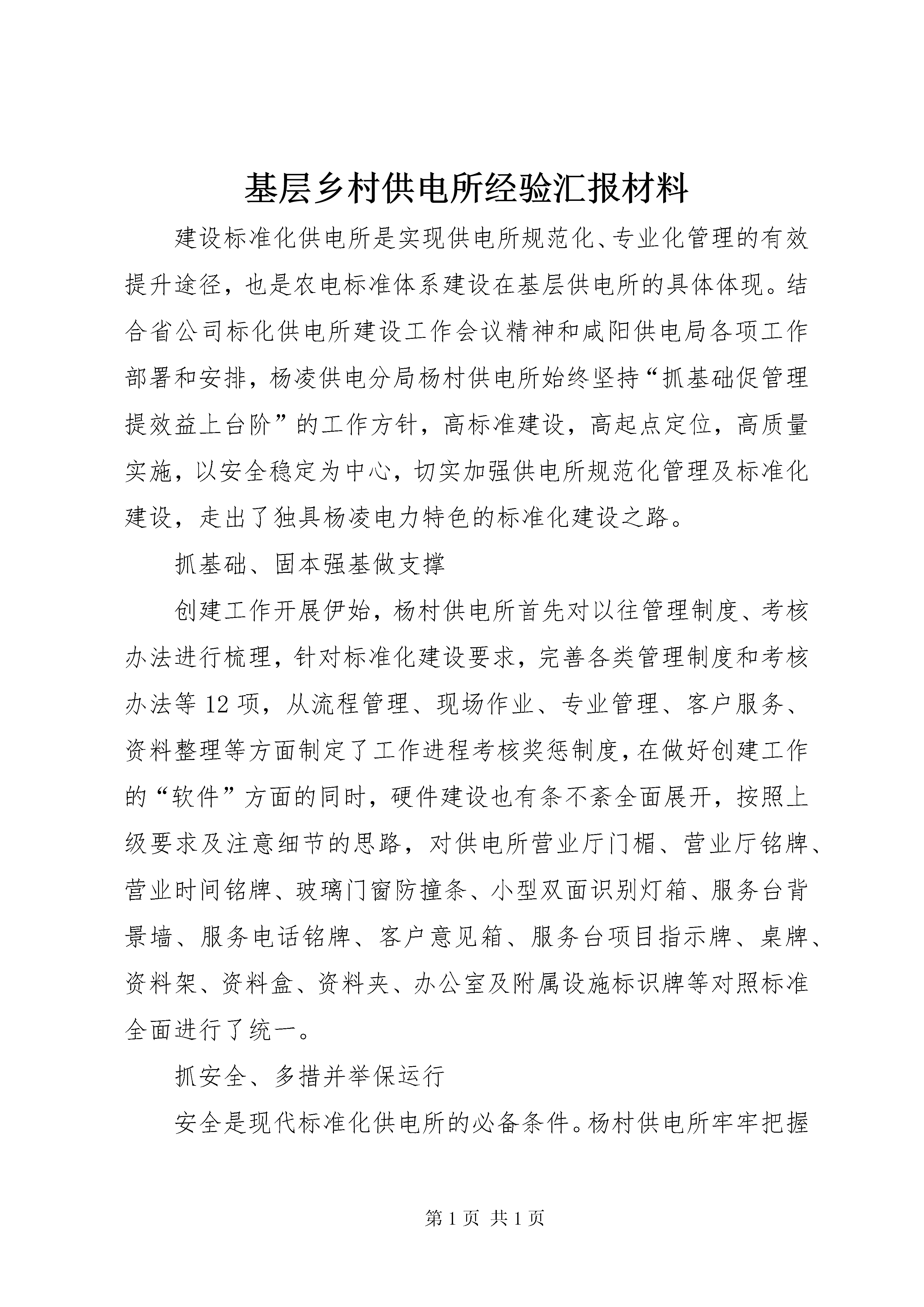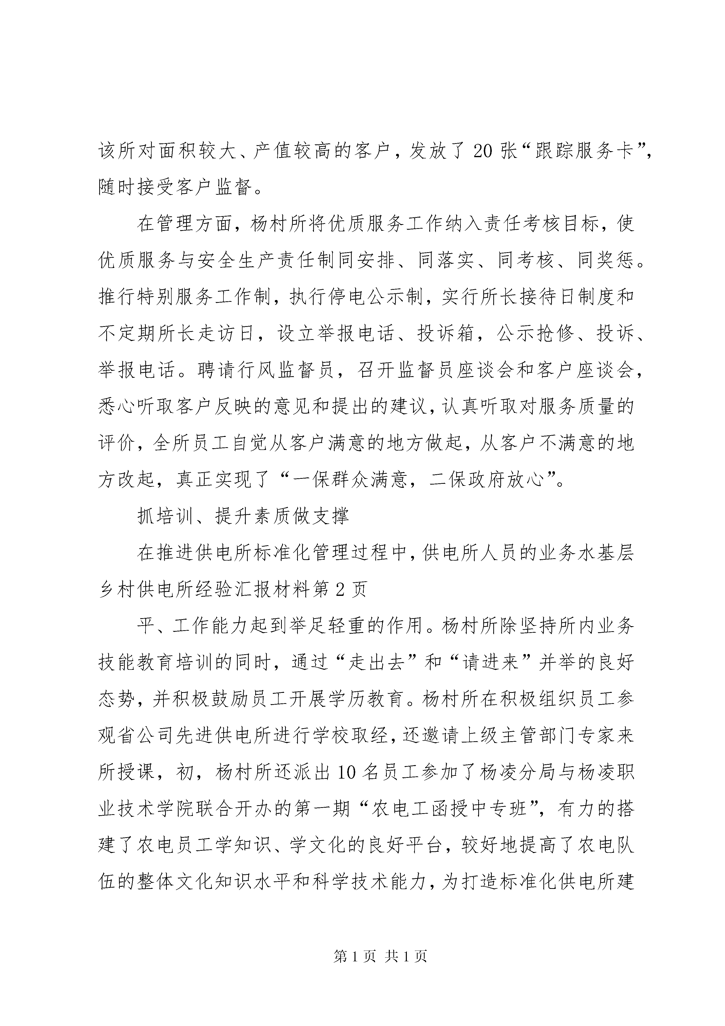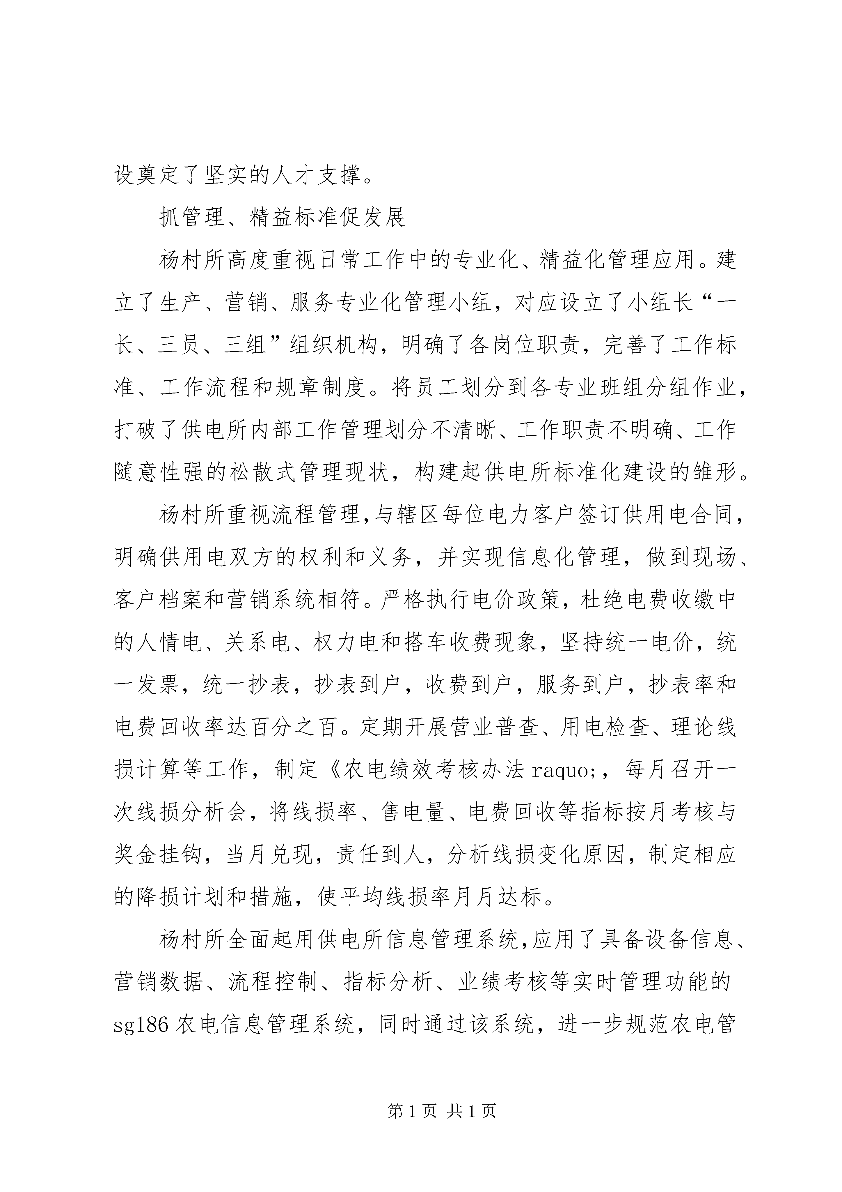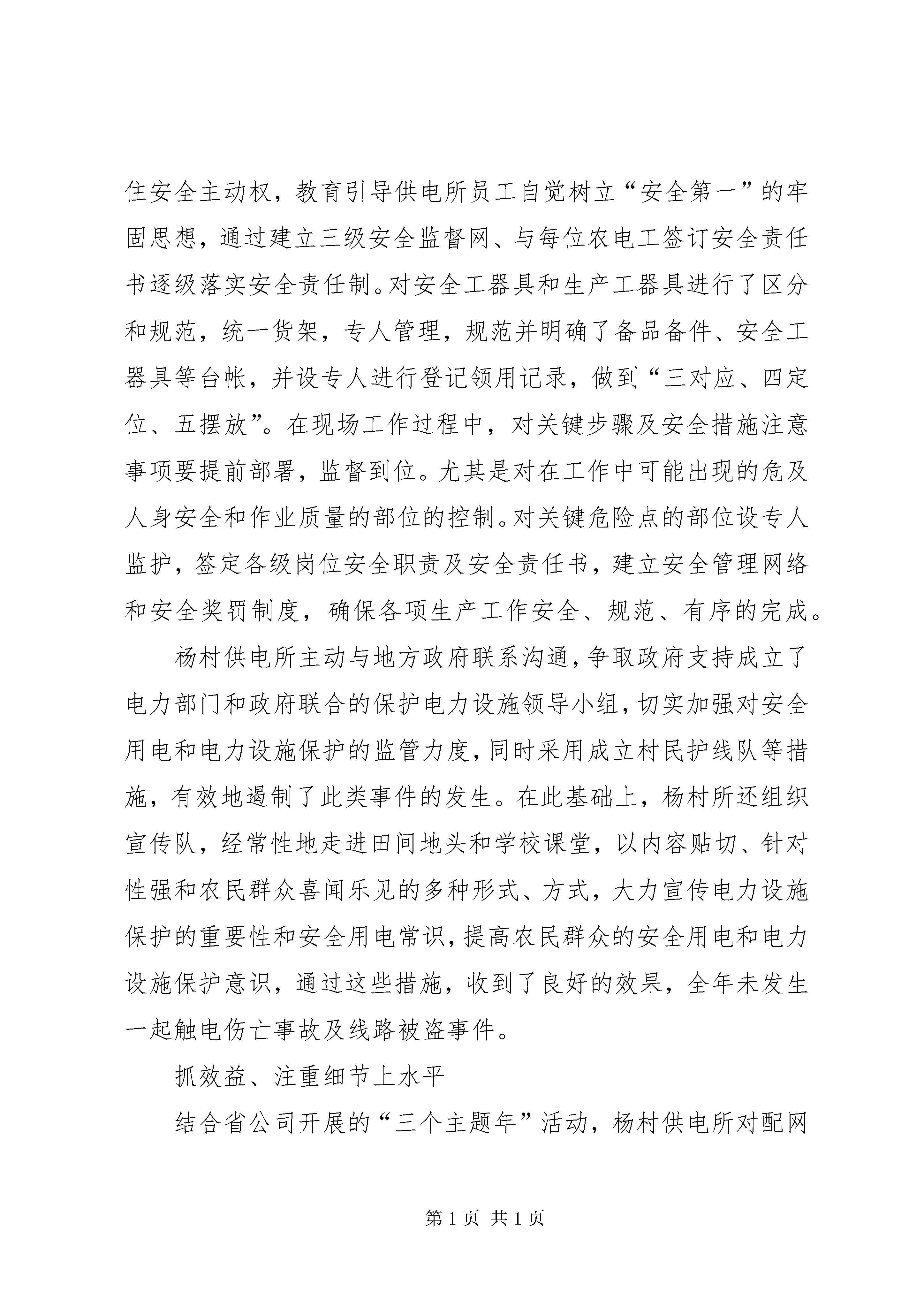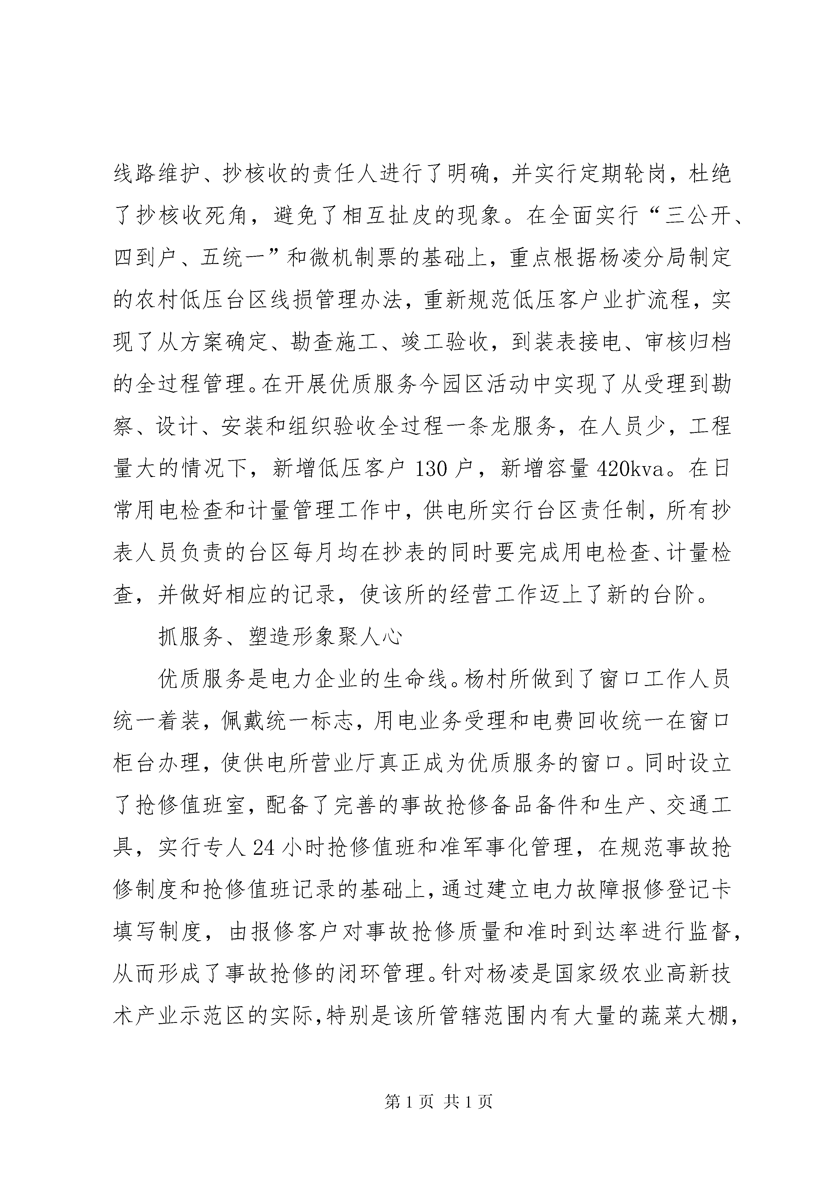 基层乡村供电所经验汇报材料建设标准化供电所是实现供电所规范化、专业化管理的有效提升途径,也是农电标准体系建设在基层供电所的具体体现。结合省公司标化供电所建设工作会议精神和咸阳供电局各项工作部署和安排,杨凌供电分局杨村供电所始终坚持“抓基础促管理提效益上台阶”的工作方针,高标准建设,高起点定位,高质量实施,以安全稳定为中心,切实加强供电所规范化管理及标准化建设,走出了独具杨凌电力特色的标准化建设之路。抓基础、固本强基做支撑创建工作开展伊始,杨村供电所首先对以往管理制度、考核办法进行梳理,针对标准化建设要求,完善各类管理制度和考核办法等12项,从流程管理、现场作业、专业管理、客户服务、资料整理等方面制定了工作进程考核奖惩制度,在做好创建工作的“软件”方面的同时,硬件建设也有条不紊全面展开,按照上级要求及注意细节的思路,对供电所营业厅门楣、营业厅铭牌、营业时间铭牌、玻璃门窗防撞条、小型双面识别灯箱、服务台背景墙、服务电话铭牌、客户意见箱、服务台项目指示牌、桌牌、资料架、资料盒、资料夹、办公室及附属设施标识牌等对照标准全面进行了统一。抓安全、多措并举保运行安全是现代标准化供电所的必备条件。杨村供电所牢牢把握住安全主动权,教育引导供电所员工自觉树立“安全第一”的牢固思想,通过建立三级安全监督网、与每位农电工签订安全责任书逐级落实安全责任制。对安全工器具和生产工器具进行了区分和规范,统一货架,专人管理,规范并明确了备品备件、安全工器具等台帐,并设专人进行登记领用记录,做到“三对应、四定位、五摆放”。在现场工作过程中,对关键步骤及安全措施注意事项要提前部署,监督到位。尤其是对在工作中可能出现的危及人身安全和作业质量的部位的控制。对关键危险点的部位设专人监护,签定各级岗位安全职责及安全责任书,建立安全管理网络和安全奖罚制度,确保各项生产工作安全、规范、有序的完成。杨村供电所主动与地方政府联系沟通,争取政府支持成立了电力部门和政府联合的保护电力设施领导小组,切实加强对安全用电和电力设施保护的监管力度,同时采用成立村民护线队等措施,有效地遏制了此类事件的发生。在此基础上,杨村所还组织宣传队,经常性地走进田间地头和学校课堂,以内容贴切、针对性强和农民群众喜闻乐见的多种形式、方式,大力宣传电力设施保护的重要性和安全用电常识,提高农民群众的安全用电和电力设施保护意识,通过这些措施,收到了良好的效果,全年未发生一起触电伤亡事故及线路被盗事件。抓效益、注重细节上水平结合省公司开展的“三个主题年”活动,杨村供电所对配网线路维护、抄核收的责任人进行了明确,并实行定期轮岗,杜绝了抄核收死角,避免了相互扯皮的现象。在全面实行“三公开、四到户、五统一”和微机制票的基础上,重点根据杨凌分局制定的农村低压台区线损管理办法,重新规范低压客户业扩流程,实现了从方案确定、勘查施工、竣工验收,到装表接电、审核归档的全过程管理。在开展优质服务今园区活动中实现了从受理到勘察、设计、安装和组织验收全过程一条龙服务,在人员少,工程量大的情况下,新增低压客户130户,新增容量420kva。在日常用电检查和计量管理工作中,供电所实行台区责任制,所有抄表人员负责的台区每月均在抄表的同时要完成用电检查、计量检查,并做好相应的记录,使该所的经营工作迈上了新的台阶。抓服务、塑造形象聚人心优质服务是电力企业的生命线。杨村所做到了窗口工作人员统一着装,佩戴统一标志,用电业务受理和电费回收统一在窗口柜台办理,使供电所营业厅真正成为优质服务的窗口。同时设立了抢修值班室,配备了完善的事故抢修备品备件和生产、交通工具,实行专人24小时抢修值班和准军事化管理,在规范事故抢修制度和抢修值班记录的基础上,通过建立电力故障报修登记卡填写制度,由报修客户对事故抢修质量和准时到达率进行监督,从而形成了事故抢修的闭环管理。针对杨凌是国家级农业高新技术产业示范区的实际,特别是该所管辖范围内有大量的蔬菜大棚,该所对面积较大、产值较高的客户,发放了20张“跟踪服务卡”,随时接受客户监督。在管理方面,杨村所将优质服务工作纳入责任考核目标,使优质服务与安全生产责任制同安排、同落实、同考核、同奖惩。推行特别服务工作制,执行停电公示制,实行所长接待日制度和不定期所长走访日,设立举报电话、投诉箱,公示抢修、投诉、举报电话。聘请行风监督员,召开监督员座谈会和客户座谈会,悉心听取客户反映的意见和提出的建议,认真听取对服务质量的评价,全所员工自觉从客户满意的地方做起,从客户不满意的地方改起,真正实现了“一保群众满意,二保政府放心”。抓培训、提升素质做支撑在推进供电所标准化管理过程中,供电所人员的业务水基层乡村供电所经验汇报材料平、工作能力起到举足轻重的作用。杨村所除坚持所内业务技能教育培训的同时,通过“走出去”和