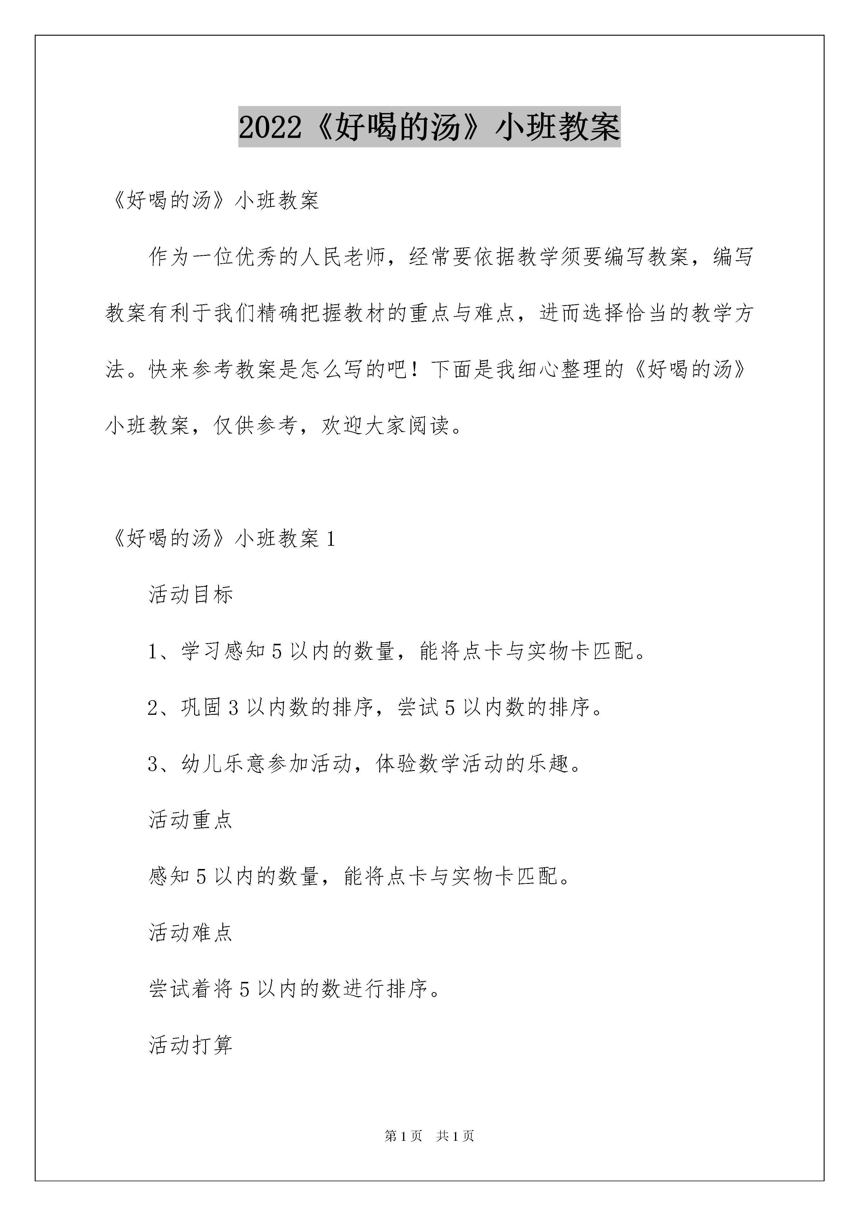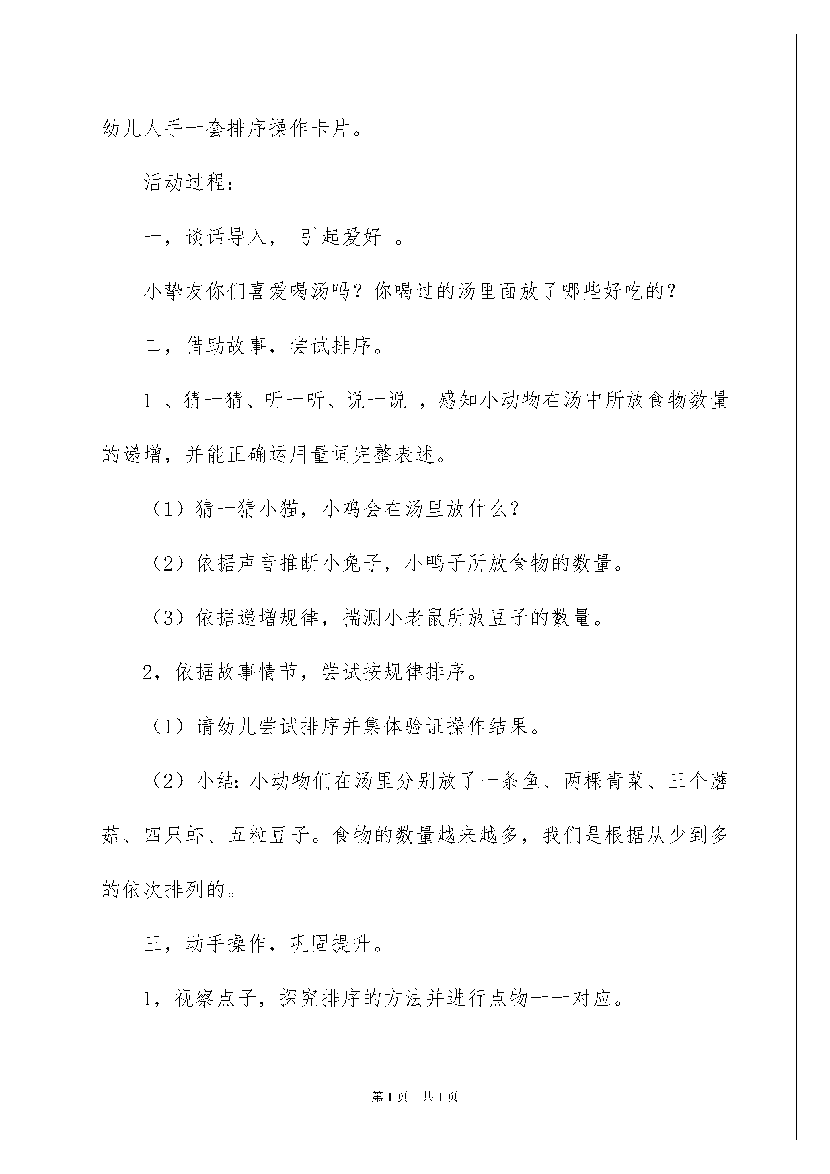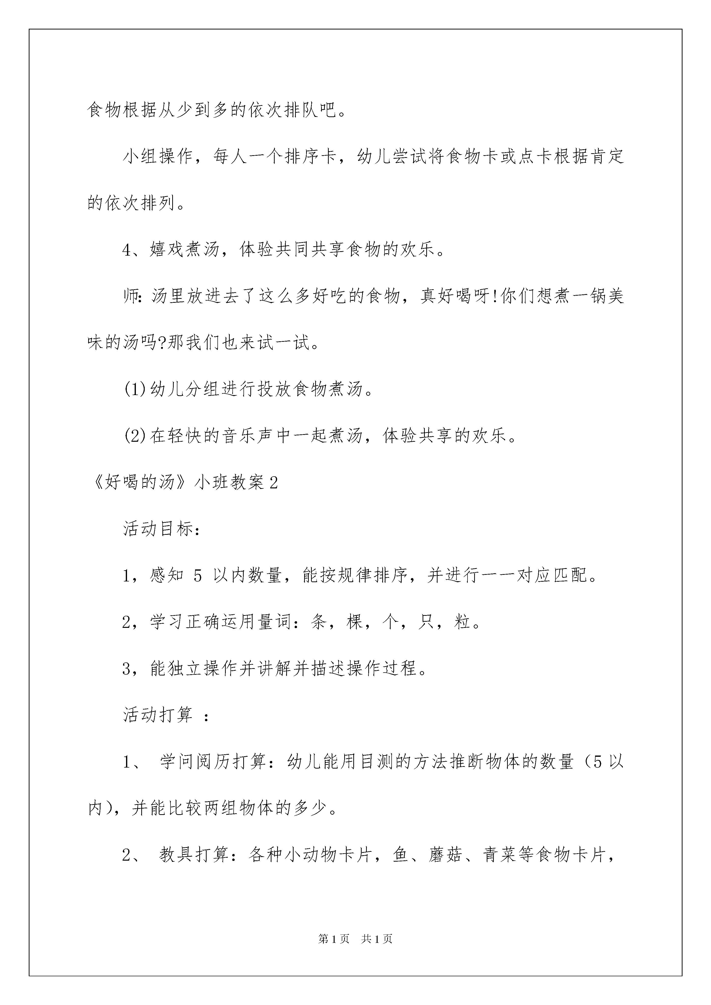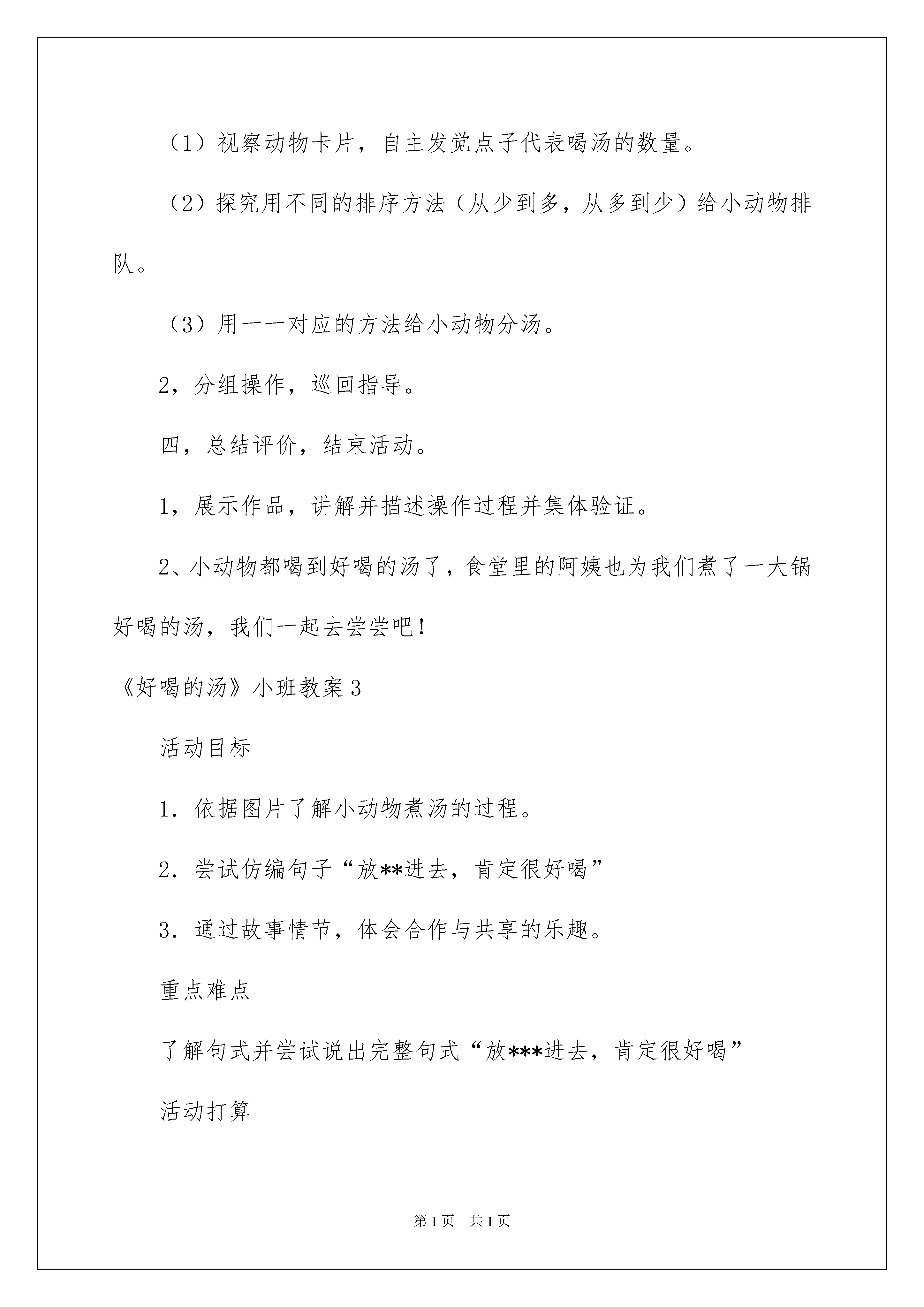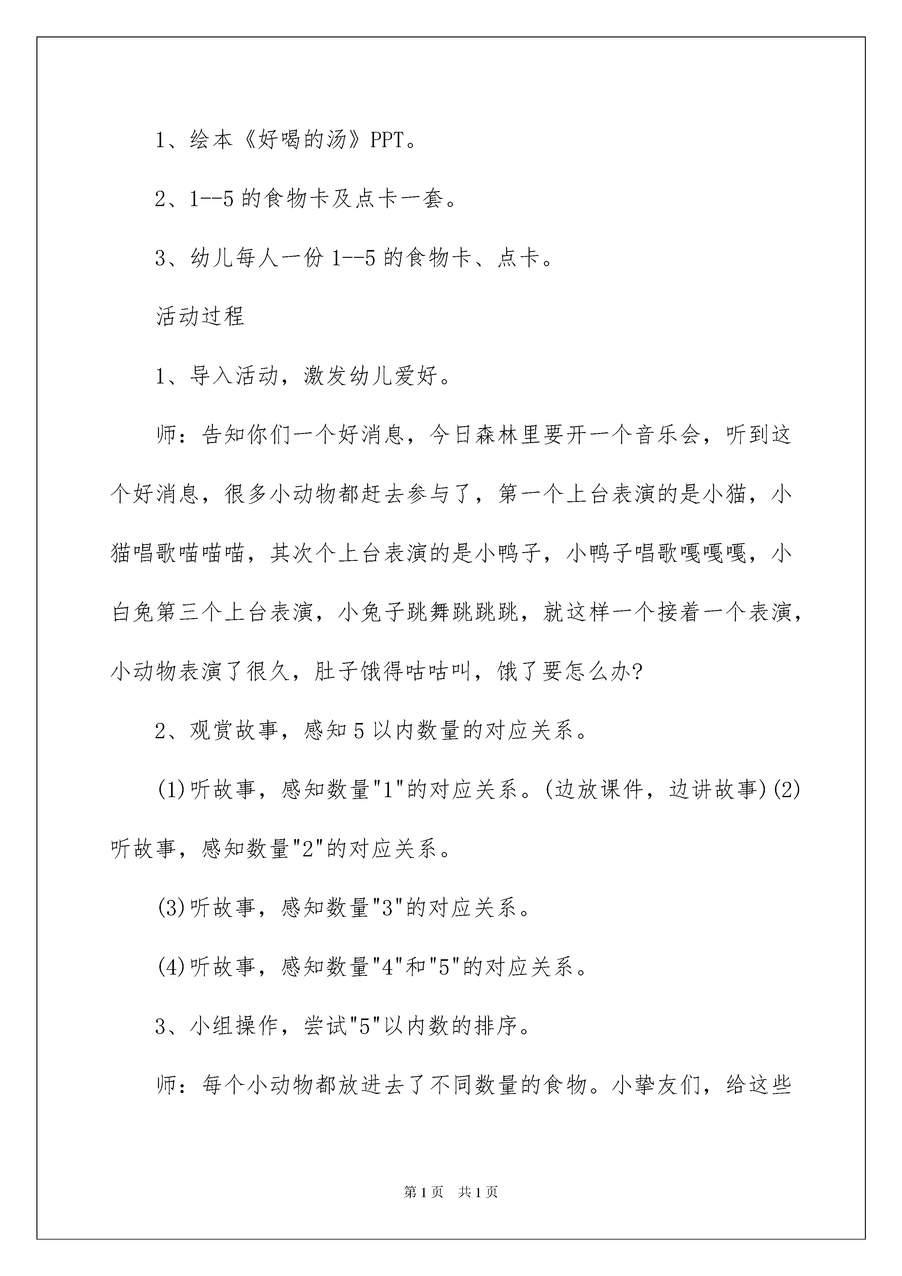 2022《好喝的汤》小班教案《好喝的汤》小班教案作为一位优秀的人民老师,经常要依据教学须要编写教案,编写教案有利于我们精确把握教材的重点与难点,进而选择恰当的教学方法。快来参考教案是怎么写的吧!下面是我细心整理的《好喝的汤》小班教案,仅供参考,欢迎大家阅读。《好喝的汤》小班教案1活动目标1、学习感知5以内的数量,能将点卡与实物卡匹配。2、巩固3以内数的排序,尝试5以内数的排序。3、幼儿乐意参加活动,体验数学活动的乐趣。活动重点感知5以内的数量,能将点卡与实物卡匹配。活动难点尝试着将5以内的数进行排序。活动打算1、绘本《好喝的汤》PPT。2、1--5的食物卡及点卡一套。3、幼儿每人一份1--5的食物卡、点卡。活动过程1、导入活动,激发幼儿爱好。师:告知你们一个好消息,今日森林里要开一个音乐会,听到这个好消息,很多小动物都赶去参与了,第一个上台表演的是小猫,小猫唱歌喵喵喵,其次个上台表演的是小鸭子,小鸭子唱歌嘎嘎嘎,小白兔第三个上台表演,小兔子跳舞跳跳跳,就这样一个接着一个表演,小动物表演了很久,肚子饿得咕咕叫,饿了要怎么办?2、观赏故事,感知5以内数量的对应关系。(1)听故事,感知数量"1"的对应关系。(边放课件,边讲故事)(2)听故事,感知数量"2"的对应关系。(3)听故事,感知数量"3"的对应关系。(4)听故事,感知数量"4"和"5"的对应关系。3、小组操作,尝试"5"以内数的排序。师:每个小动物都放进去了不同数量的食物。小挚友们,给这些食物根据从少到多的依次排队吧。小组操作,每人一个排序卡,幼儿尝试将食物卡或点卡根据肯定的依次排列。4、嬉戏煮汤,体验共同共享食物的欢乐。师:汤里放进去了这么多好吃的食物,真好喝呀!你们想煮一锅美味的汤吗?那我们也来试一试。(1)幼儿分组进行投放食物煮汤。(2)在轻快的音乐声中一起煮汤,体验共享的欢乐。《好喝的汤》小班教案2活动目标:1,感知5以内数量,能按规律排序,并进行一一对应匹配。2,学习正确运用量词:条,棵,个,只,粒。3,能独立操作并讲解并描述操作过程。活动打算:1、学问阅历打算:幼儿能用目测的方法推断物体的数量(5以内),并能比较两组物体的多少。2、教具打算:各种小动物卡片,鱼、蘑菇、青菜等食物卡片,幼儿人手一套排序操作卡片。活动过程:一,谈话导入,引起爱好。小挚友你们喜爱喝汤吗?你喝过的汤里面放了哪些好吃的?二,借助故事,尝试排序。1、猜一猜、听一听、说一说,感知小动物在汤中所放食物数量的递增,并能正确运用量词完整表述。(1)猜一猜小猫,小鸡会在汤里放什么?(2)依据声音推断小兔子,小鸭子所放食物的数量。(3)依据递增规律,揣测小老鼠所放豆子的数量。2,依据故事情节,尝试按规律排序。(1)请幼儿尝试排序并集体验证操作结果。(2)小结:小动物们在汤里分别放了一条鱼、两棵青菜、三个蘑菇、四只虾、五粒豆子。食物的数量越来越多,我们是根据从少到多的依次排列的。三,动手操作,巩固提升。1,视察点子,探究排序的方法并进行点物一一对应。(1)视察动物卡片,自主发觉点子代表喝汤的数量。(2)探究用不同的排序方法(从少到多,从多到少)给小动物排队。(3)用一一对应的方法给小动物分汤。2,分组操作,巡回指导。四,总结评价,结束活动。1,展示作品,讲解并描述操作过程并集体验证。2、小动物都喝到好喝的汤了,食堂里的阿姨也为我们煮了一大锅好喝的汤,我们一起去尝尝吧!《好喝的汤》小班教案3活动目标1.依据图片了解小动物煮汤的过程。2.尝试仿编句子“放**进去,肯定很好喝”3.通过故事情节,体会合作与共享的乐趣。重点难点了解句式并尝试说出完整句式“放***进去,肯定很好喝”活动打算PPT、相关图片、GIF动图、黑板活动过程一、情景导入1.仿照嬉戏导入,激活关于动物习性的已有阅历,产生参加活动的爱好。T:今日上午天气可真好呀,森林里实行了一场唱歌竞赛,听到这个消息,许多小动物都赶来参与。第一个上场的是小猫,小猫怎么唱歌呢?其次个上场的是小老鼠,小老鼠是怎么唱歌的呢?最终上场的是小白兔,小白兔会唱歌吗?小白兔可能不怎么擅长唱歌,但是它会跳跳跳!二、基础部分(一)老师分段讲故事,幼儿依据图片理解故事内容。1、老师出示封面,引导幼儿视察并仿照动物喝汤的动作。T:今日辜妈妈把这群客人也请到了我们的教室里,我们一起来看看她们竞赛完后在干什么?她们在喝汤呀!好喝的汤是在哪里煮出来的呢?对啦在锅里,锅要放在什么上面才能煮呢?T:我们一起来听一听,小动物们之间会发生什么样的故事。第一段:小猪好饿拿着铲子去挖萝卜其次段:小猫:放一条鱼进去,肯定很好喝。第三段:小鸡:放两颗白
