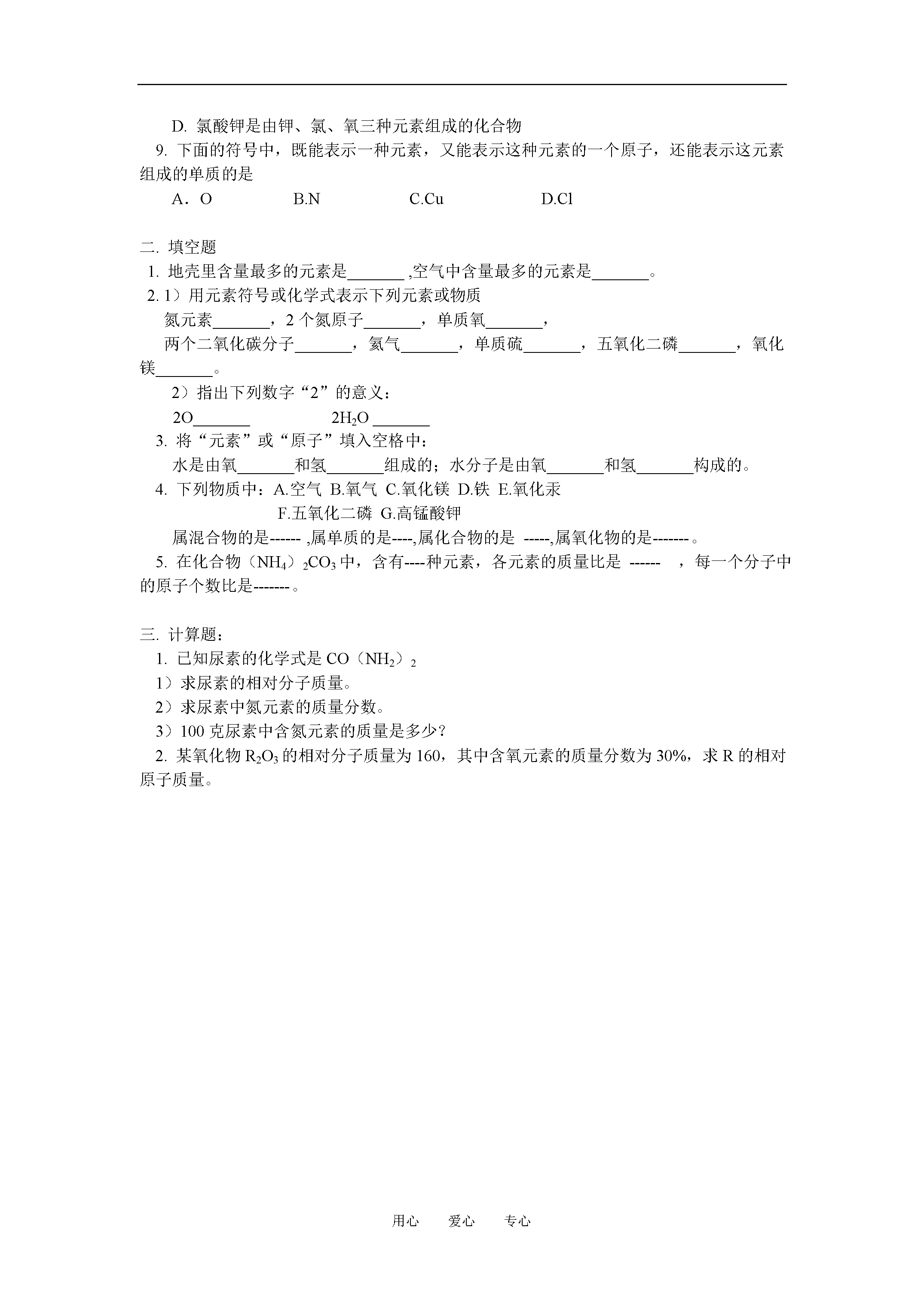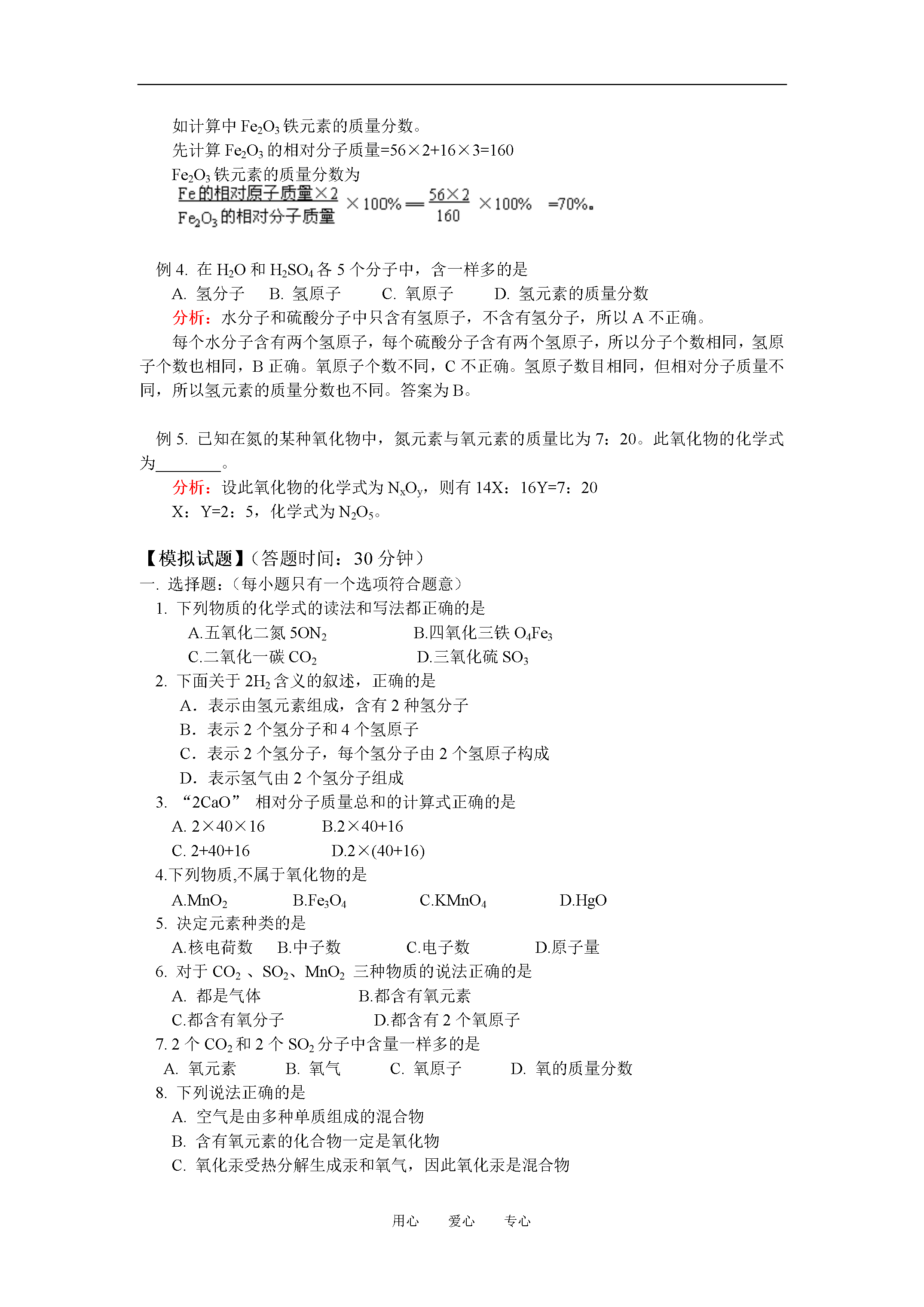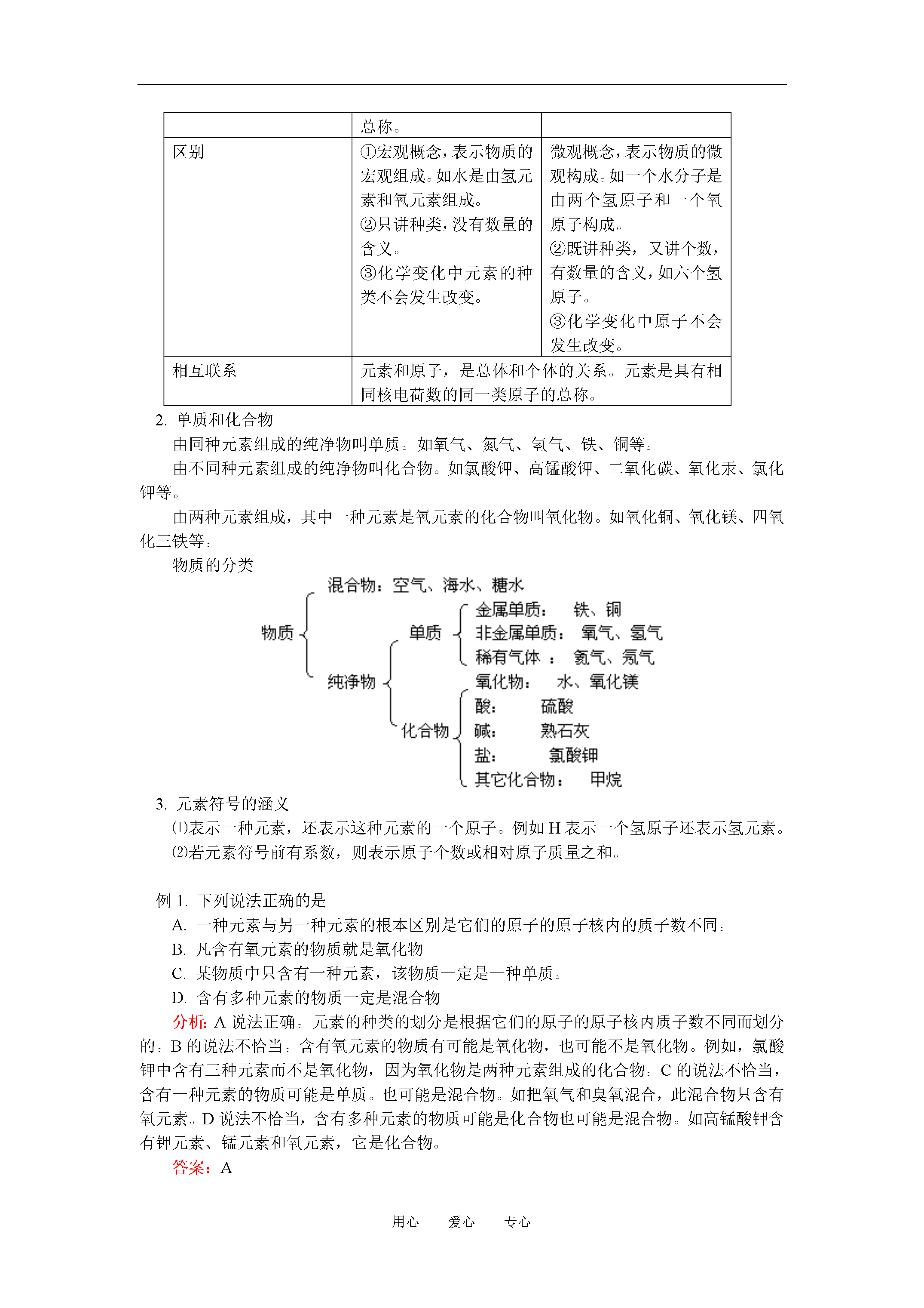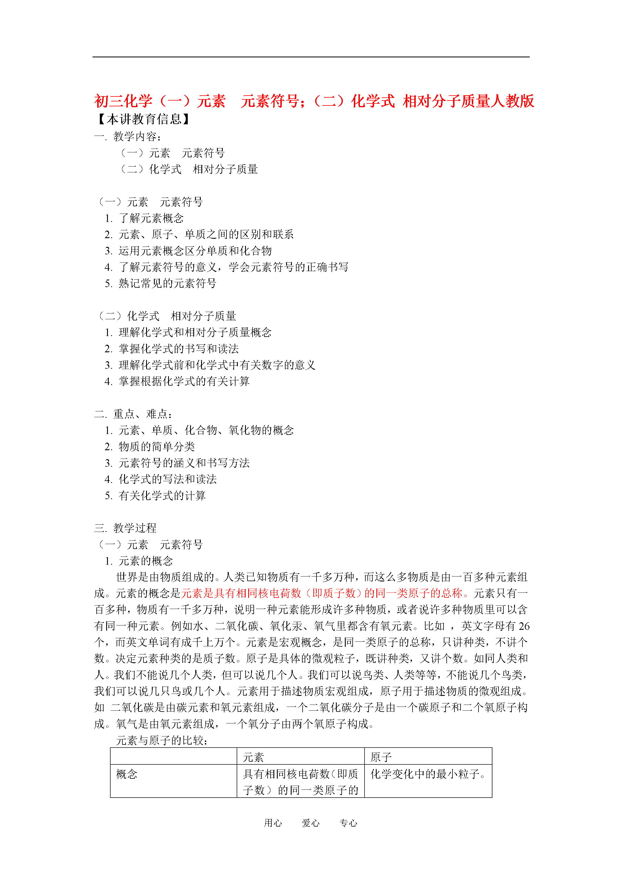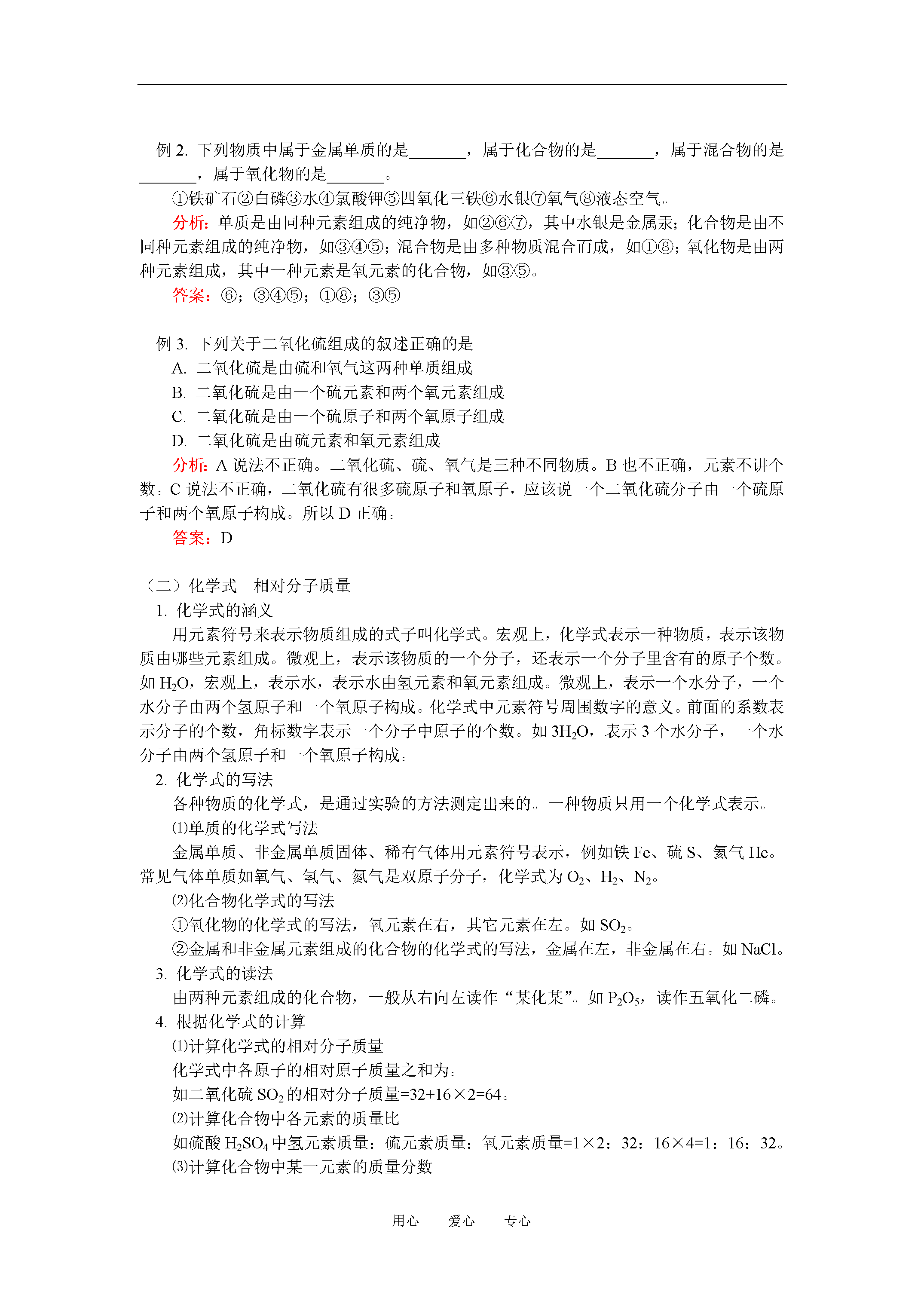 用心爱心专心初三化学(一)元素元素符号;(二)化学式相对分子质量人教版【本讲教育信息】一.教学内容:(一)元素元素符号(二)化学式相对分子质量(一)元素元素符号1.了解元素概念2.元素、原子、单质之间的区别和联系3.运用元素概念区分单质和化合物4.了解元素符号的意义,学会元素符号的正确书写5.熟记常见的元素符号(二)化学式相对分子质量1.理解化学式和相对分子质量概念2.掌握化学式的书写和读法3.理解化学式前和化学式中有关数字的意义4.掌握根据化学式的有关计算二.重点、难点:1.元素、单质、化合物、氧化物的概念2.物质的简单分类3.元素符号的涵义和书写方法4.化学式的写法和读法5.有关化学式的计算三.教学过程(一)元素元素符号1.元素的概念世界是由物质组成的。人类已知物质有一千多万种,而这么多物质是由一百多种元素组成。元素的概念是元素是具有相同核电荷数(即质子数)的同一类原子的总称。元素只有一百多种,物质有一千多万种,说明一种元素能形成许多种物质,或者说许多种物质里可以含有同一种元素。例如水、二氧化碳、氧化汞、氧气里都含有氧元素。比如,英文字母有26个,而英文单词有成千上万个。元素是宏观概念,是同一类原子的总称,只讲种类,不讲个数。决定元素种类的是质子数。原子是具体的微观粒子,既讲种类,又讲个数。如同人类和人。我们不能说几个人类,但可以说几个人。我们可以说鸟类、人类等等,不能说几个鸟类,我们可以说几只鸟或几个人。元素用于描述物质宏观组成,原子用于描述物质的微观组成。如二氧化碳是由碳元素和氧元素组成,一个二氧化碳分子是由一个碳原子和二个氧原子构成。氧气是由氧元素组成,一个氧分子由两个氧原子构成。元素与原子的比较:元素原子概念具有相同核电荷数(即质子数)的同一类原子的总称。化学变化中的最小粒子。区别①宏观概念,表示物质的宏观组成。如水是由氢元素和氧元素组成。②只讲种类,没有数量的含义。③化学变化中元素的种类不会发生改变。微观概念,表示物质的微观构成。如一个水分子是由两个氢原子和一个氧原子构成。②既讲种类,又讲个数,有数量的含义,如六个氢原子。③化学变化中原子不会发生改变。相互联系元素和原子,是总体和个体的关系。元素是具有相同核电荷数的同一类原子的总称。2.单质和化合物由同种元素组成的纯净物叫单质。如氧气、氮气、氢气、铁、铜等。由不同种元素组成的纯净物叫化合物。如氯酸钾、高锰酸钾、二氧化碳、氧化汞、氯化钾等。由两种元素组成,其中一种元素是氧元素的化合物叫氧化物。如氧化铜、氧化镁、四氧化三铁等。物质的分类3.元素符号的涵义⑴表示一种元素,还表示这种元素的一个原子。例如H表示一个氢原子还表示氢元素。⑵若元素符号前有系数,则表示原子个数或相对原子质量之和。例1.下列说法正确的是A.一种元素与另一种元素的根本区别是它们的原子的原子核内的质子数不同。B.凡含有氧元素的物质就是氧化物C.某物质中只含有一种元素,该物质一定是一种单质。D.含有多种元素的物质一定是混合物分析:A说法正确。元素的种类的划分是根据它们的原子的原子核内质子数不同而划分的。B的说法不恰当。含有氧元素的物质有可能是氧化物,也可能不是氧化物。例如,氯酸钾中含有三种元素而不是氧化物,因为氧化物是两种元素组成的化合物。C的说法不恰当,含有一种元素的物质可能是单质。也可能是混合物。如把氧气和臭氧混合,此混合物只含有氧元素。D说法不恰当,含有多种元素的物质可能是化合物也可能是混合物。如高锰酸钾含有钾元素、锰元素和氧元素,它是化合物。答案:A例2.下列物质中属于金属单质的是_______,属于化合物的是_______,属于混合物的是_______,属于氧化物的是_______。①铁矿石②白磷③水④氯酸钾⑤四氧化三铁⑥水银⑦氧气⑧液态空气。分析:单质是由同种元素组成的纯净物,如②⑥⑦,其中水银是金属汞;化合物是由不同种元素组成的纯净物,如③④⑤;混合物是由多种物质混合而成,如①⑧;氧化物是由两种元素组成,其中一种元素是氧元素的化合物,如③⑤。答案:⑥;③④⑤;①⑧;③⑤例3.下列关于二氧化硫组成的叙述正确的是A.二氧化硫是由硫和氧气这两种单质组成B.二氧化硫是由一个硫元素和两个氧元素组成C.二氧化硫是由一个硫原子和两个氧原子组成D.二氧化硫是由硫元素和氧元素组成分析:A说法不正确。二氧化硫、硫、氧气是三种不同物质。B也不正确,元素不讲个数。C说法不正确,二氧化硫有很多硫原子和氧原子,应该说一个二氧化硫分子由一个硫原子和两个氧原子构成。所以D正确。答案:D(二)化学式相对分子质量1.化学式的涵义用元素符号来表示物质组成的式子叫化学式。宏观上,化学式表示一种物质,表示该物质由哪些元素组成。微观上,表示该物质的一个分子,还表示一个分子里含有的原子个数。如H2O,宏观上,表示水,表示水由氢元素和氧元