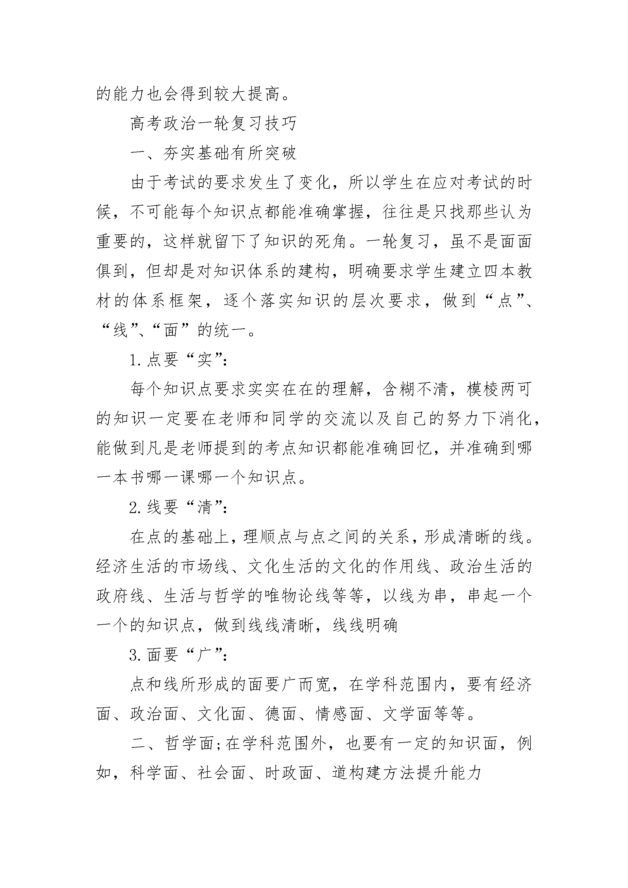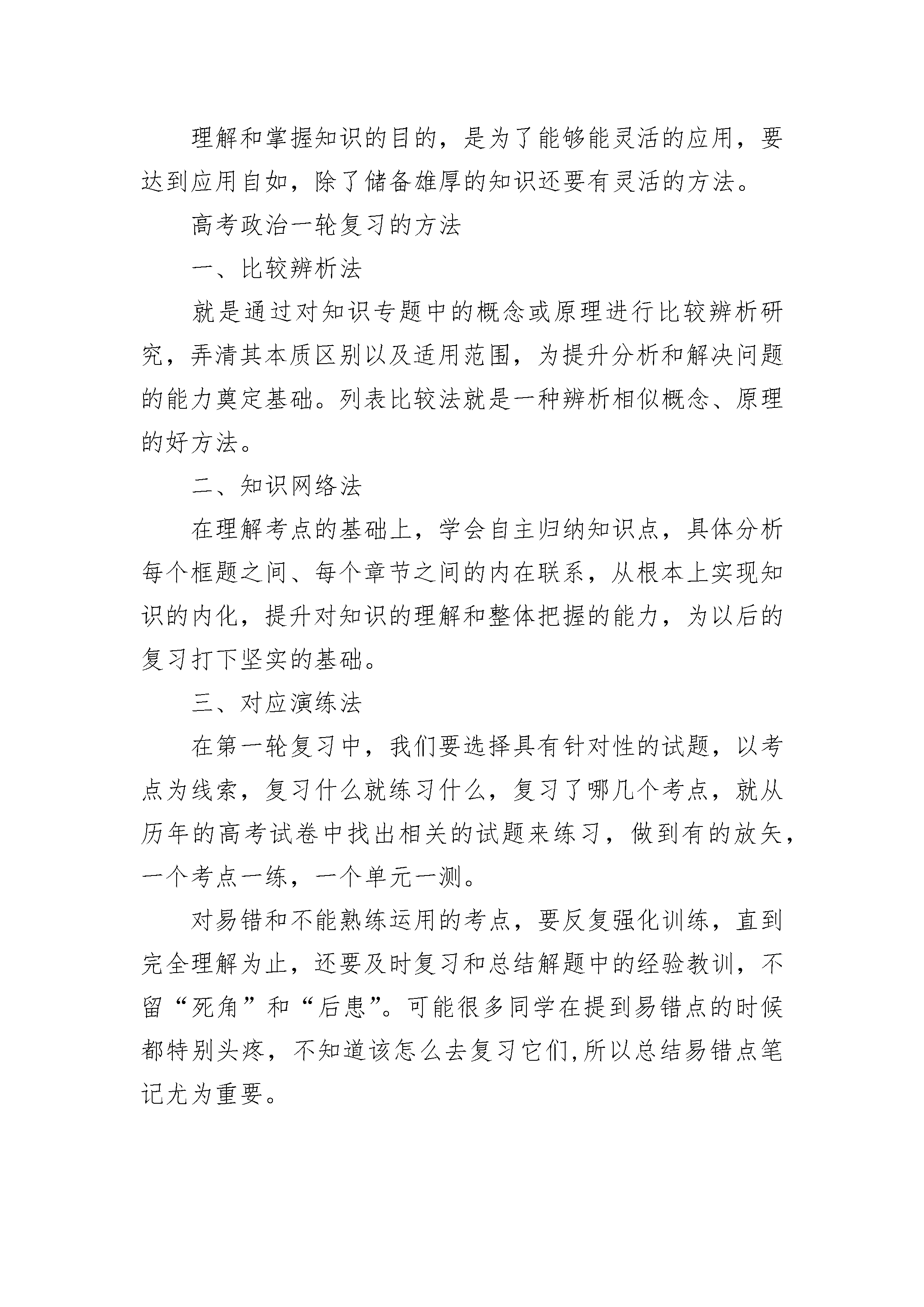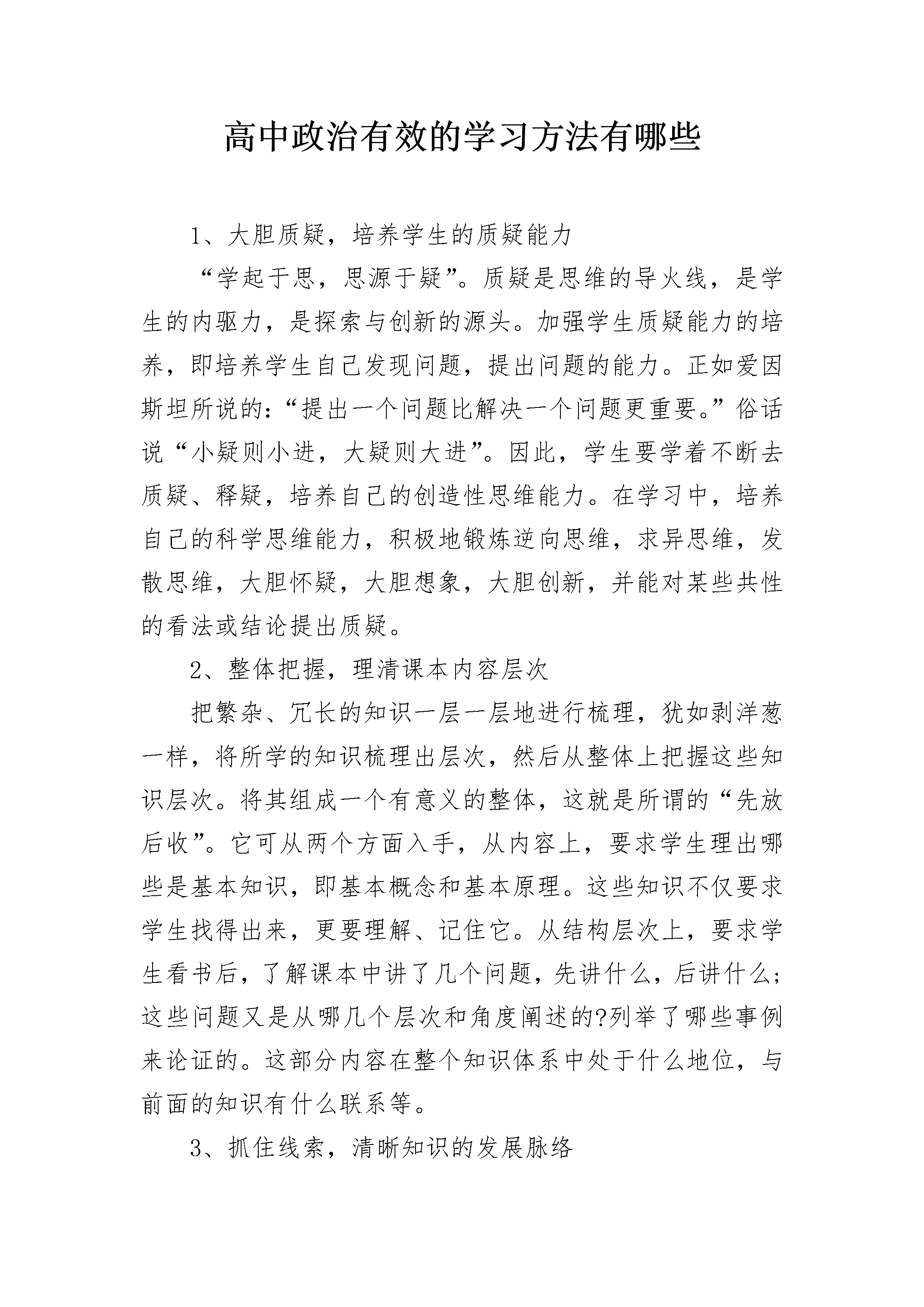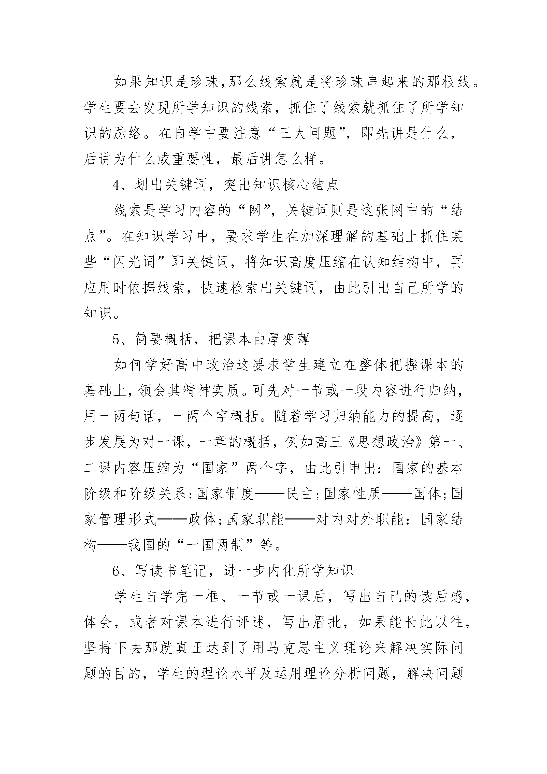 高中政治有效的学习方法有哪些1、大胆质疑,培养学生的质疑能力“学起于思,思源于疑”。质疑是思维的导火线,是学生的内驱力,是探索与创新的源头。加强学生质疑能力的培养,即培养学生自己发现问题,提出问题的能力。正如爱因斯坦所说的:“提出一个问题比解决一个问题更重要。”俗话说“小疑则小进,大疑则大进”。因此,学生要学着不断去质疑、释疑,培养自己的创造性思维能力。在学习中,培养自己的科学思维能力,积极地锻炼逆向思维,求异思维,发散思维,大胆怀疑,大胆想象,大胆创新,并能对某些共性的看法或结论提出质疑。2、整体把握,理清课本内容层次把繁杂、冗长的知识一层一层地进行梳理,犹如剥洋葱一样,将所学的知识梳理出层次,然后从整体上把握这些知识层次。将其组成一个有意义的整体,这就是所谓的“先放后收”。它可从两个方面入手,从内容上,要求学生理出哪些是基本知识,即基本概念和基本原理。这些知识不仅要求学生找得出来,更要理解、记住它。从结构层次上,要求学生看书后,了解课本中讲了几个问题,先讲什么,后讲什么;这些问题又是从哪几个层次和角度阐述的?列举了哪些事例来论证的。这部分内容在整个知识体系中处于什么地位,与前面的知识有什么联系等。3、抓住线索,清晰知识的发展脉络如果知识是珍珠,那么线索就是将珍珠串起来的那根线。学生要去发现所学知识的线索,抓住了线索就抓住了所学知识的脉络。在自学中要注意“三大问题”,即先讲是什么,后讲为什么或重要性,最后讲怎么样。4、划出关键词,突出知识核心结点线索是学习内容的“网”,关键词则是这张网中的“结点”。在知识学习中,要求学生在加深理解的基础上抓住某些“闪光词”即关键词,将知识高度压缩在认知结构中,再应用时依据线索,快速检索出关键词,由此引出自己所学的知识。5、简要概括,把课本由厚变薄如何学好高中政治这要求学生建立在整体把握课本的基础上,领会其精神实质。可先对一节或一段内容进行归纳,用一两句话,一两个字概括。随着学习归纳能力的提高,逐步发展为对一课,一章的概括,例如高三《思想政治》第一、二课内容压缩为“国家”两个字,由此引申出:国家的基本阶级和阶级关系;国家制度──民主;国家性质──国体;国家管理形式──政体;国家职能──对内对外职能:国家结构──我国的“一国两制”等。6、写读书笔记,进一步内化所学知识学生自学完一框、一节或一课后,写出自己的读后感,体会,或者对课本进行评述,写出眉批,如果能长此以往,坚持下去那就真正达到了用马克思主义理论来解决实际问题的目的,学生的理论水平及运用理论分析问题,解决问题的能力也会得到较大提高。高考政治一轮复习技巧一、夯实基础有所突破由于考试的要求发生了变化,所以学生在应对考试的时候,不可能每个知识点都能准确掌握,往往是只找那些认为重要的,这样就留下了知识的死角。一轮复习,虽不是面面俱到,但却是对知识体系的建构,明确要求学生建立四本教材的体系框架,逐个落实知识的层次要求,做到“点”、“线”、“面”的统一。1.点要“实”:每个知识点要求实实在在的理解,含糊不清,模棱两可的知识一定要在老师和同学的交流以及自己的努力下消化,能做到凡是老师提到的考点知识都能准确回忆,并准确到哪一本书哪一课哪一个知识点。2.线要“清”:在点的基础上,理顺点与点之间的关系,形成清晰的线。经济生活的市场线、文化生活的文化的作用线、政治生活的政府线、生活与哲学的唯物论线等等,以线为串,串起一个一个的知识点,做到线线清晰,线线明确3.面要“广”:点和线所形成的面要广而宽,在学科范围内,要有经济面、政治面、文化面、德面、情感面、文学面等等。二、哲学面;在学科范围外,也要有一定的知识面,例如,科学面、社会面、时政面、道构建方法提升能力理解和掌握知识的目的,是为了能够能灵活的应用,要达到应用自如,除了储备雄厚的知识还要有灵活的方法。高考政治一轮复习的方法一、比较辨析法就是通过对知识专题中的概念或原理进行比较辨析研究,弄清其本质区别以及适用范围,为提升分析和解决问题的能力奠定基础。列表比较法就是一种辨析相似概念、原理的好方法。二、知识网络法在理解考点的基础上,学会自主归纳知识点,具体分析每个框题之间、每个章节之间的内在联系,从根本上实现知识的内化,提升对知识的理解和整体把握的能力,为以后的复习打下坚实的基础。三、对应演练法在第一轮复习中,我们要选择具有针对性的试题,以考点为线索,复习什么就练习什么,复习了哪几个考点,就从历年的高考试卷中找出相关的试题来练习,做到有的放矢,一个考点一练,一个单元一测。对易错和不能熟练运用的考点,要反复强化训练,直到完全理解为止,还要及时复习和总结解题中的经验教训,不留“死角”和“后患”。可能很多同学在提到易错点的时候都特别头疼,不知道该怎么去复习它们,所以总结易错点笔记尤为重要。