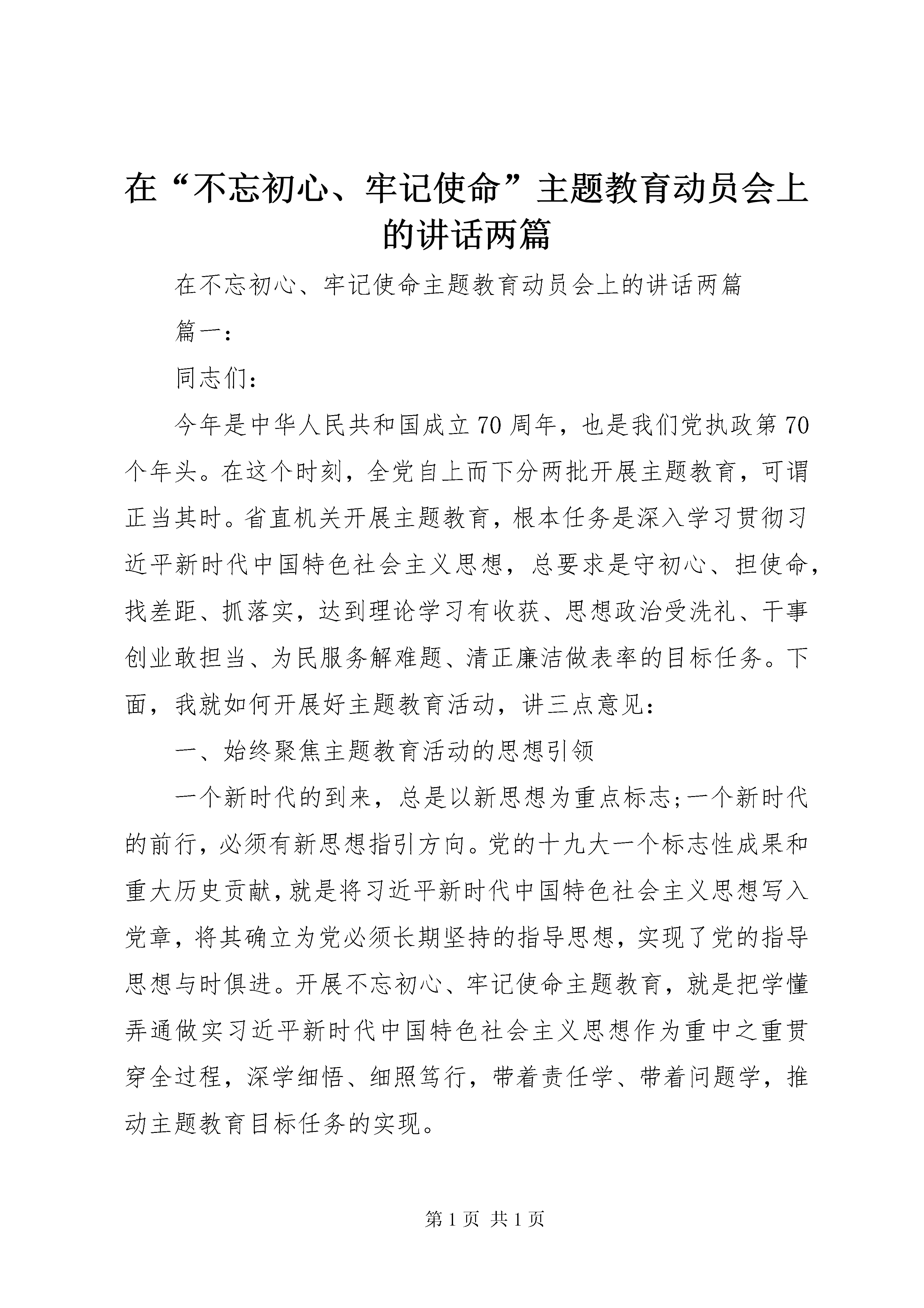 在“不忘初心、牢记使命”主题教育动员会上的讲话两篇在不忘初心、牢记使命主题教育动员会上的讲话两篇篇一:同志们:今年是中华人民共和国成立70周年,也是我们党执政第70个年头。在这个时刻,全党自上而下分两批开展主题教育,可谓正当其时。省直机关开展主题教育,根本任务是深入学习贯彻习近平新时代中国特色社会主义思想,总要求是守初心、担使命,找差距、抓落实,达到理论学习有收获、思想政治受洗礼、干事创业敢担当、为民服务解难题、清正廉洁做表率的目标任务。下面,我就如何开展好主题教育活动,讲三点意见:一、始终聚焦主题教育活动的思想引领一个新时代的到来,总是以新思想为重点标志;一个新时代的前行,必须有新思想指引方向。党的十九大一个标志性成果和重大历史贡献,就是将习近平新时代中国特色社会主义思想写入党章,将其确立为党必须长期坚持的指导思想,实现了党的指导思想与时俱进。开展不忘初心、牢记使命主题教育,就是把学懂弄通做实习近平新时代中国特色社会主义思想作为重中之重贯穿全过程,深学细悟、细照笃行,带着责任学、带着问题学,推动主题教育目标任务的实现。一是把蕴含其中的理想追求内化为坚定政治信仰,强固共产党人的精神支柱。习近平新时代中国特色社会主义思想,贯穿着对共产主义远大理想和中国特色社会主义共同理想的坚定信仰信念,凸显了坚守真理、不忘初心的鲜明理论特色。习近平在十九大报告中开宗明义昭告大会主题,号召全党不忘初心,牢记使命,高举中国特色社会主义伟大旗帜,决胜全面建设小康社会,夺取新时代中国特色社会主义伟大胜利,为实现中华民族伟大复兴的中国梦不懈奋斗。十九大闭幕刚一周,习主席带领新一届政治局常委,瞻仰上海中共一大会址和浙江嘉兴南湖红船,再次强调要铭记党的奋斗历程、时刻不忘初心,担当党的崇高使命、矢志永远奋斗。前不久,在学习贯彻习近平新时代中国特色社会主义思想和党的十九大精神研讨班开班式上,习主席又以宏阔的历史视野、强烈的政治担当,进一步深刻阐述了坚持和发展中国特色社会主义的一系列重大理论和实践问题,突出强调新时代中国特色社会主义是我们党领导人民进行伟大社会革命的成果,也是我们党领导人民进行伟大社会革命的继续,必须一以贯之进行下去。萝卜白菜各有所爱,鞋子的好不好脚最清楚。这个新时代是中国特殊社会主义新时代,而不是别的什么新时代;我们要建设的是中国特色社会主义,而不是其他什么主义。沿着自己的路走来,我们历经千辛万苦,创造了诸多中国速度、中国深度、中国高度;沿着自己的路前行,我们满怀雄心壮志,必将创造更多中国惊叹、中国奇迹、中国震撼。因此,我们走自己的路,具有无比深厚的历史底蕴,具有无比广阔的舞台空间,具有无比强大的前进定力。现在讲,不忘初心,牢记使命,就不要忘记我们是共产党人,我们是革命者,不要丧失了革命精神。但放眼当下,随着我们党执政时间不断延续和人们价值取向、思维方式日益多样,现在有些同志对党的了解浅了、感情淡了、信赖少了,那种与党的命运共存共亡、生死相依的纽带联系虚化弱化了,与党的信仰已渐行渐远,迫切需要经常擦拭信仰之灯,反躬自省信仰问题,真正把共产党人的崇高信仰嵌在心里,从马克思主义基本理论中领悟信仰之真,从不忘初心、牢记使命重大主题教育中汲取信仰之力,从中国特殊社会主义伟大实践中坚定信仰之道,真正做到至信而深厚、坚贞而笃行。二是把蕴含其中的思想方略深化为科学思路理念,进一步提升理性思维层次。习近平新时代中国特色社会主义思想,运用辩证唯物主义和历史唯物主义世界观和方法论,既部署过河的任务,又指导如何解决桥或船的问题,贯穿了科学思想方法和工作方法,为我们认识问题、分析问题、解决问题提供了方法论的金钥匙。我们应悉心体悟新思想的精髓要义,着力掌握当代马克思主义的鲜明立场,深刻领会以人民为中心的发展思想,感受共产党人的赤子情怀;着力掌握从政治和全局上观察处理问题的根本方法,深刻领会观大势谋大事的宏阔视野、大局观念、政治智慧;着力掌握积极经略、主动塑造的战略进取观,深刻领会审时度势的战略素养、开拓作为的进取精神、先机布势的运筹艺术;着力掌握从问题切入推动工作创作的思维方法,深刻领会直面问题的但是魄力、敢于斗争的无私无畏、革弊开新的勇毅锐气,切实用新思想活的灵魂推动理念重塑、思维升级,从历史和现实相贯通、国际和国内相关联、理论和实际相结合的宽广视角,对一些重大理论和实践问题进行思考和把握,一以贯之坚持和发展中国特色社会主义,一以贯之推进党的建设新的伟大工程,一以贯之增强忧患意识、防范风险挑战,不断推进新时代中国特色社会主义事业。三是把蕴含其中的决策部署细化为务实办法举措,努力推动各项建设发展开展新图强。党的十九大以习近平新时代中国特色社会主义思想为统领,立起了引领新时代的旗帜,擘画了开新图强的宏图,布下了赢得未来的胜势。习主席反复告诫我们,空