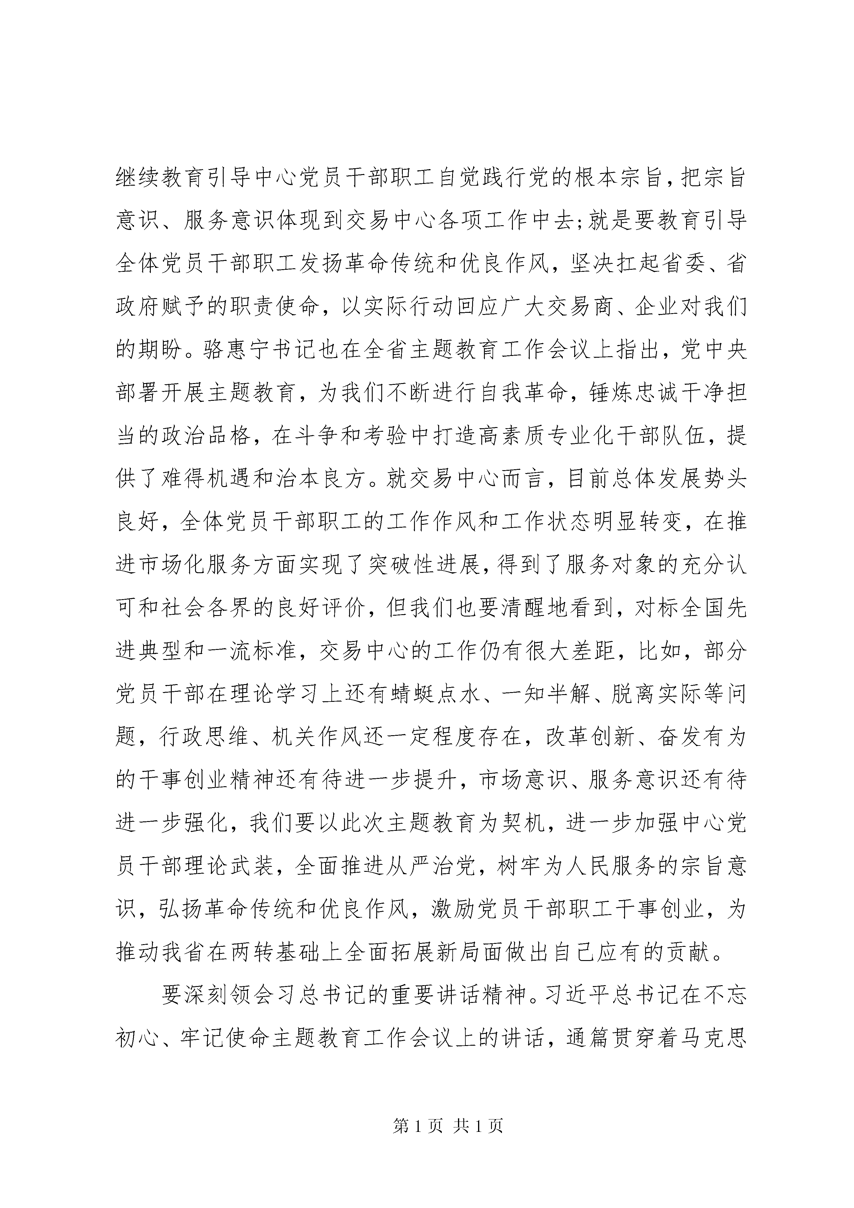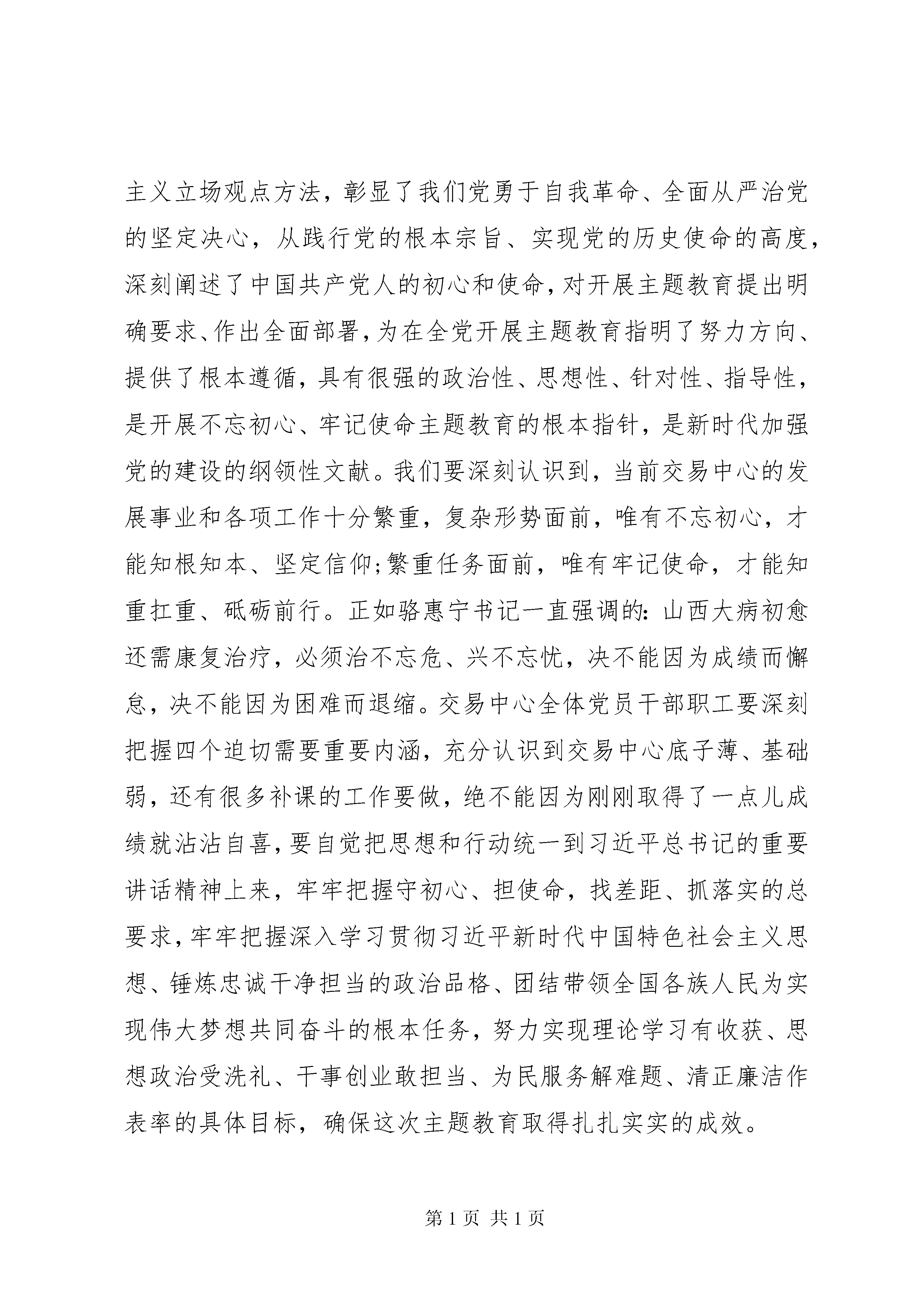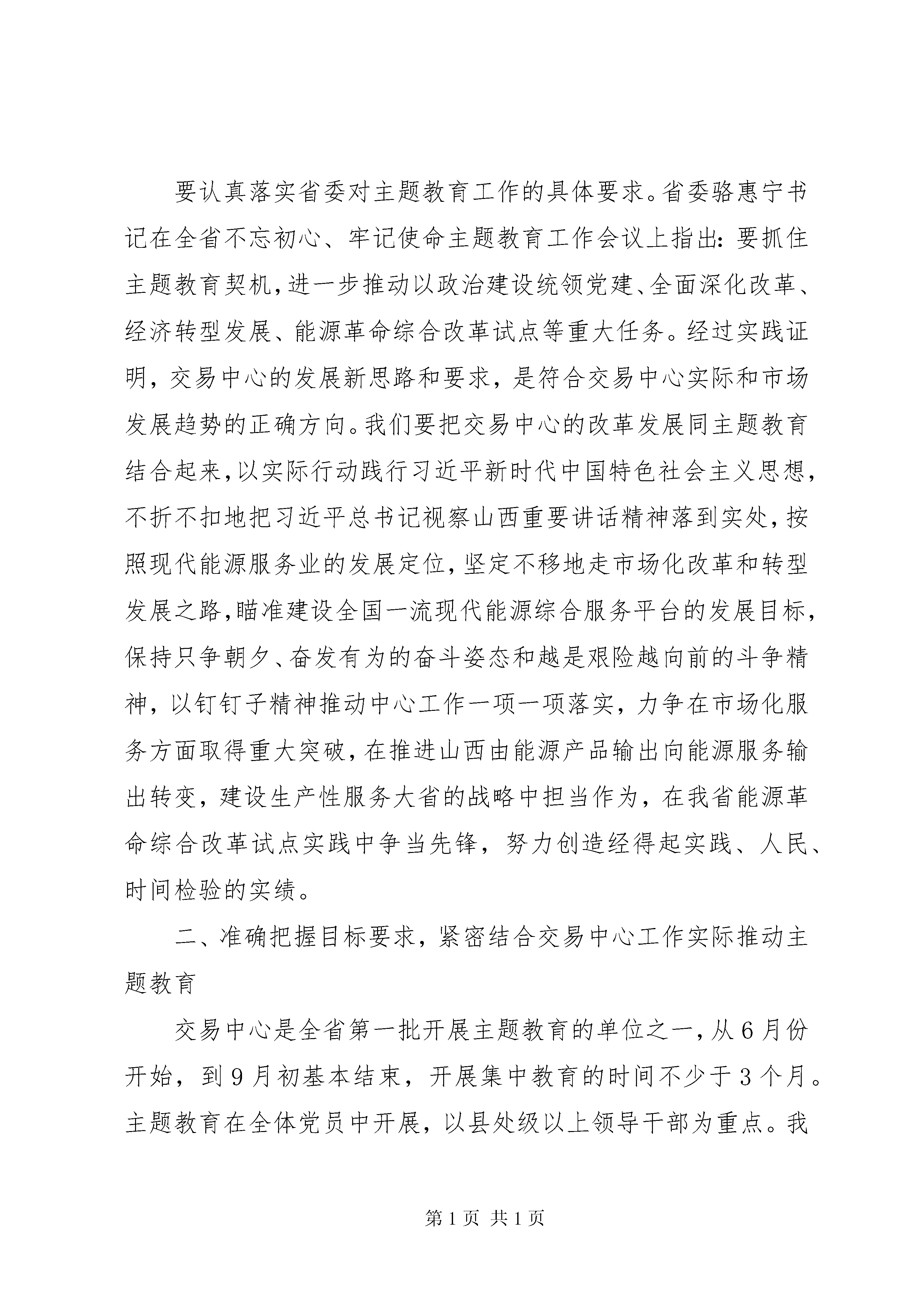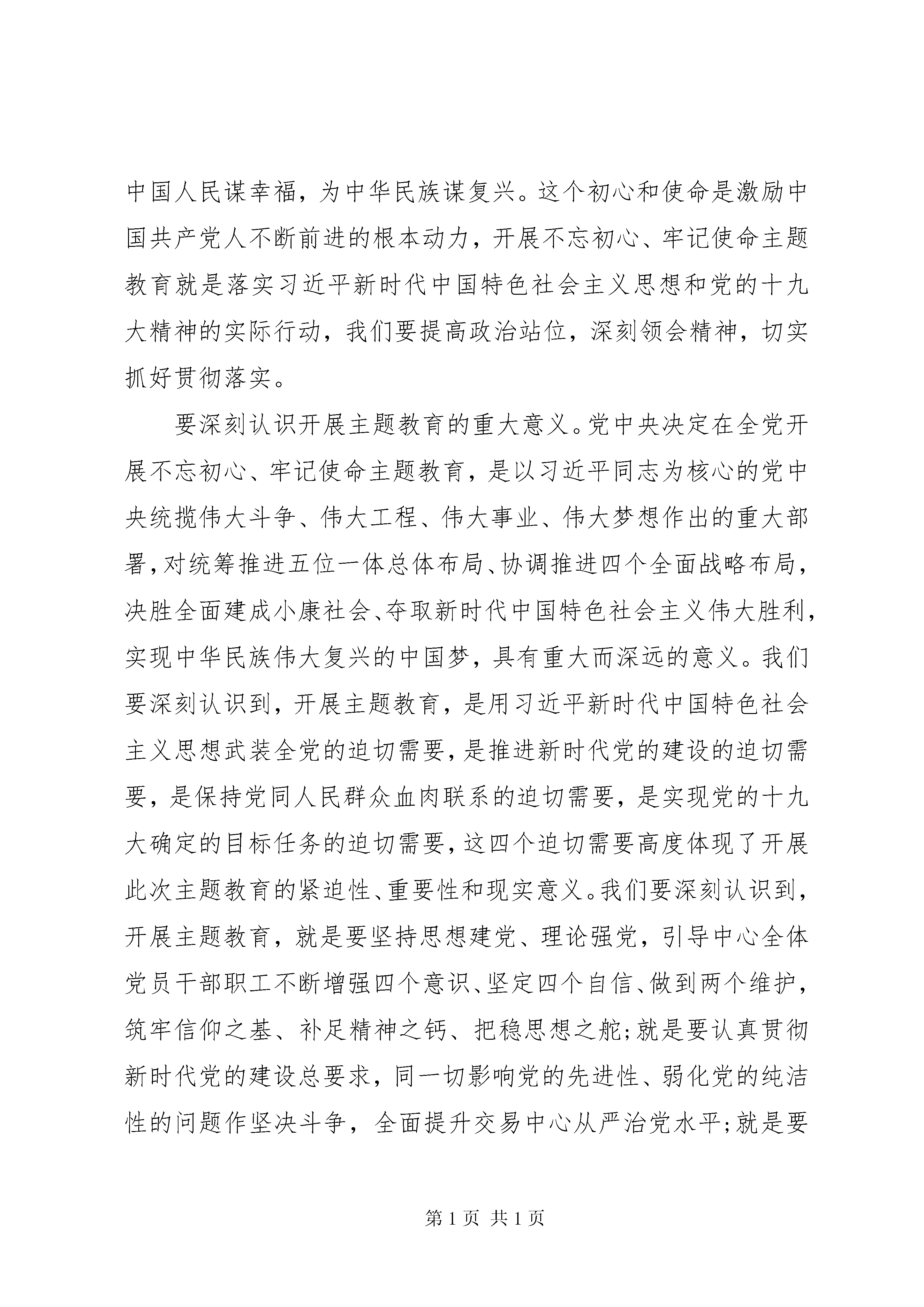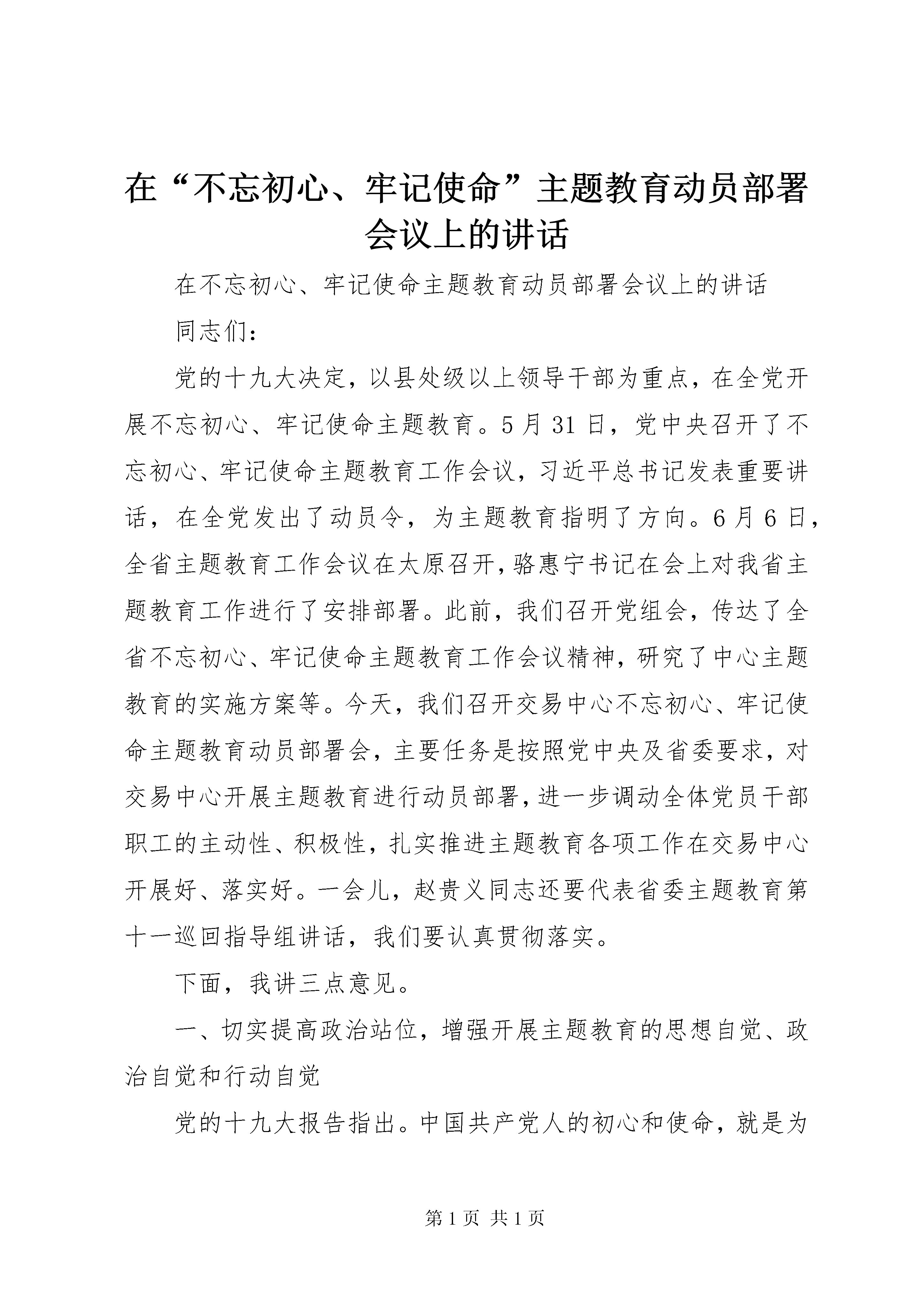 在“不忘初心、牢记使命”主题教育动员部署会议上的讲话在不忘初心、牢记使命主题教育动员部署会议上的讲话同志们:党的十九大决定,以县处级以上领导干部为重点,在全党开展不忘初心、牢记使命主题教育。5月31日,党中央召开了不忘初心、牢记使命主题教育工作会议,习近平总书记发表重要讲话,在全党发出了动员令,为主题教育指明了方向。6月6日,全省主题教育工作会议在太原召开,骆惠宁书记在会上对我省主题教育工作进行了安排部署。此前,我们召开党组会,传达了全省不忘初心、牢记使命主题教育工作会议精神,研究了中心主题教育的实施方案等。今天,我们召开交易中心不忘初心、牢记使命主题教育动员部署会,主要任务是按照党中央及省委要求,对交易中心开展主题教育进行动员部署,进一步调动全体党员干部职工的主动性、积极性,扎实推进主题教育各项工作在交易中心开展好、落实好。一会儿,赵贵义同志还要代表省委主题教育第十一巡回指导组讲话,我们要认真贯彻落实。下面,我讲三点意见。一、切实提高政治站位,增强开展主题教育的思想自觉、政治自觉和行动自觉党的十九大报告指出。中国共产党人的初心和使命,就是为中国人民谋幸福,为中华民族谋复兴。这个初心和使命是激励中国共产党人不断前进的根本动力,开展不忘初心、牢记使命主题教育就是落实习近平新时代中国特色社会主义思想和党的十九大精神的实际行动,我们要提高政治站位,深刻领会精神,切实抓好贯彻落实。要深刻认识开展主题教育的重大意义。党中央决定在全党开展不忘初心、牢记使命主题教育,是以习近平同志为核心的党中央统揽伟大斗争、伟大工程、伟大事业、伟大梦想作出的重大部署,对统筹推进五位一体总体布局、协调推进四个全面战略布局,决胜全面建成小康社会、夺取新时代中国特色社会主义伟大胜利,实现中华民族伟大复兴的中国梦,具有重大而深远的意义。我们要深刻认识到,开展主题教育,是用习近平新时代中国特色社会主义思想武装全党的迫切需要,是推进新时代党的建设的迫切需要,是保持党同人民群众血肉联系的迫切需要,是实现党的十九大确定的目标任务的迫切需要,这四个迫切需要高度体现了开展此次主题教育的紧迫性、重要性和现实意义。我们要深刻认识到,开展主题教育,就是要坚持思想建党、理论强党,引导中心全体党员干部职工不断增强四个意识、坚定四个自信、做到两个维护,筑牢信仰之基、补足精神之钙、把稳思想之舵;就是要认真贯彻新时代党的建设总要求,同一切影响党的先进性、弱化党的纯洁性的问题作坚决斗争,全面提升交易中心从严治党水平;就是要继续教育引导中心党员干部职工自觉践行党的根本宗旨,把宗旨意识、服务意识体现到交易中心各项工作中去;就是要教育引导全体党员干部职工发扬革命传统和优良作风,坚决扛起省委、省政府赋予的职责使命,以实际行动回应广大交易商、企业对我们的期盼。骆惠宁书记也在全省主题教育工作会议上指出,党中央部署开展主题教育,为我们不断进行自我革命,锤炼忠诚干净担当的政治品格,在斗争和考验中打造高素质专业化干部队伍,提供了难得机遇和治本良方。就交易中心而言,目前总体发展势头良好,全体党员干部职工的工作作风和工作状态明显转变,在推进市场化服务方面实现了突破性进展,得到了服务对象的充分认可和社会各界的良好评价,但我们也要清醒地看到,对标全国先进典型和一流标准,交易中心的工作仍有很大差距,比如,部分党员干部在理论学习上还有蜻蜓点水、一知半解、脱离实际等问题,行政思维、机关作风还一定程度存在,改革创新、奋发有为的干事创业精神还有待进一步提升,市场意识、服务意识还有待进一步强化,我们要以此次主题教育为契机,进一步加强中心党员干部理论武装,全面推进从严治党,树牢为人民服务的宗旨意识,弘扬革命传统和优良作风,激励党员干部职工干事创业,为推动我省在两转基础上全面拓展新局面做出自己应有的贡献。要深刻领会习总书记的重要讲话精神。习近平总书记在不忘初心、牢记使命主题教育工作会议上的讲话,通篇贯穿着马克思主义立场观点方法,彰显了我们党勇于自我革命、全面从严治党的坚定决心,从践行党的根本宗旨、实现党的历史使命的高度,深刻阐述了中国共产党人的初心和使命,对开展主题教育提出明确要求、作出全面部署,为在全党开展主题教育指明了努力方向、提供了根本遵循,具有很强的政治性、思想性、针对性、指导性,是开展不忘初心、牢记使命主题教育的根本指针,是新时代加强党的建设的纲领性文献。我们要深刻认识到,当前交易中心的发展事业和各项工作十分繁重,复杂形势面前,唯有不忘初心,才能知根知本、坚定信仰;繁重任务面前,唯有牢记使命,才能知重扛重、砥砺前行。正如骆惠宁书记一直强调的:山西大病初愈还需康复治疗,必须治不忘危、兴不忘忧,决不能因为成绩而懈怠,决不能因为困难而退缩。交易中心全体党员干部职工要深刻把握四个迫切需要重要内涵,充分认识到