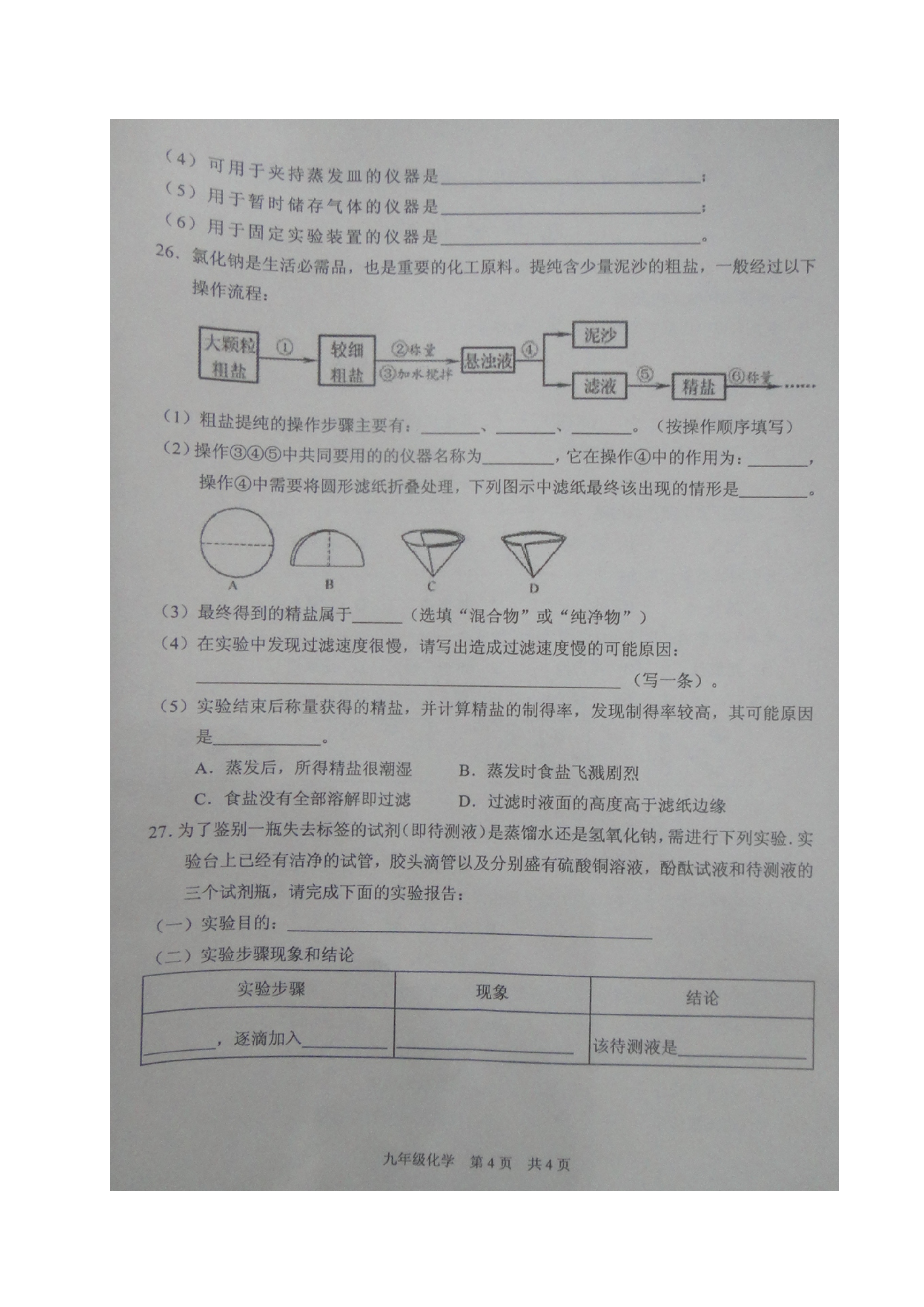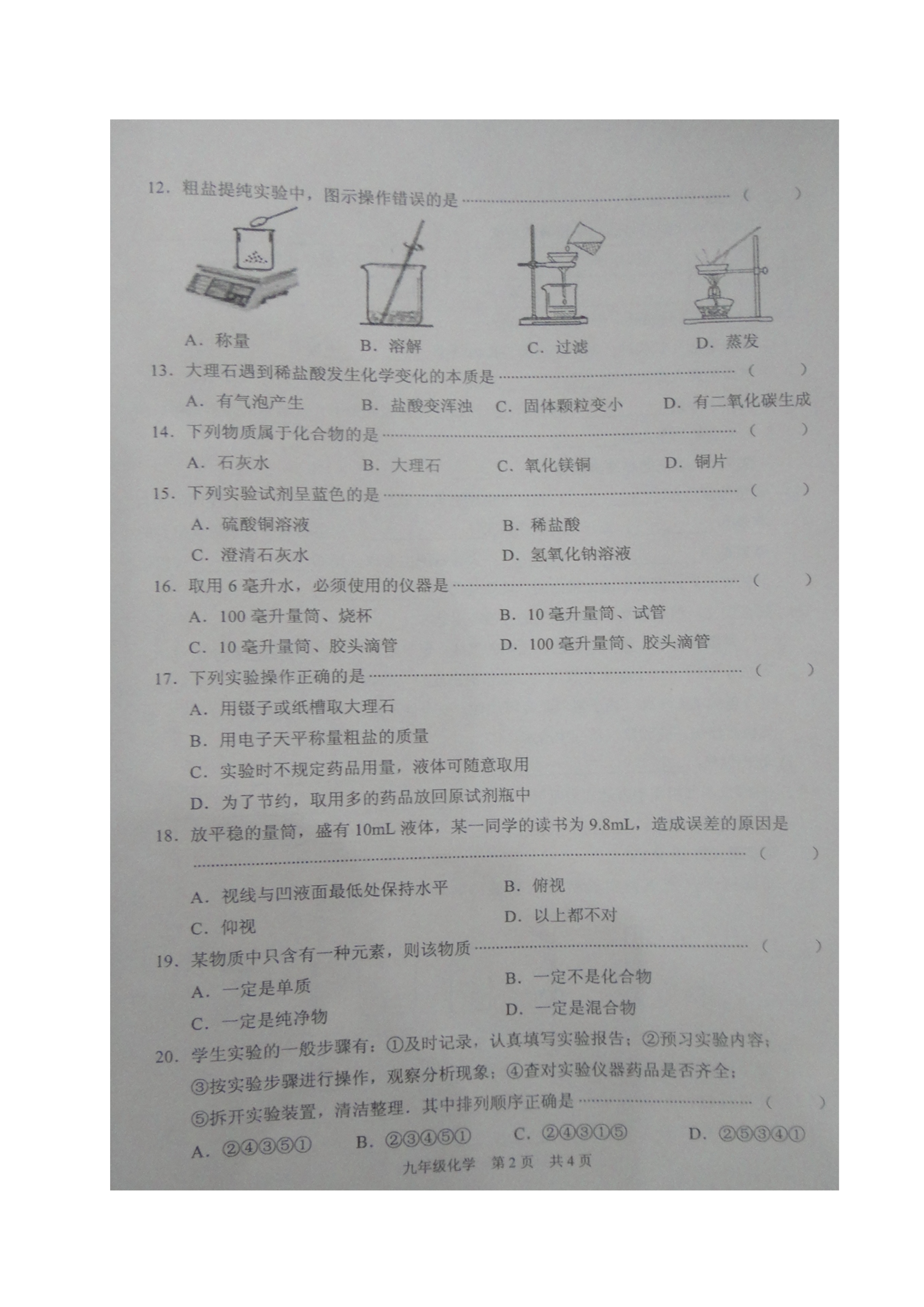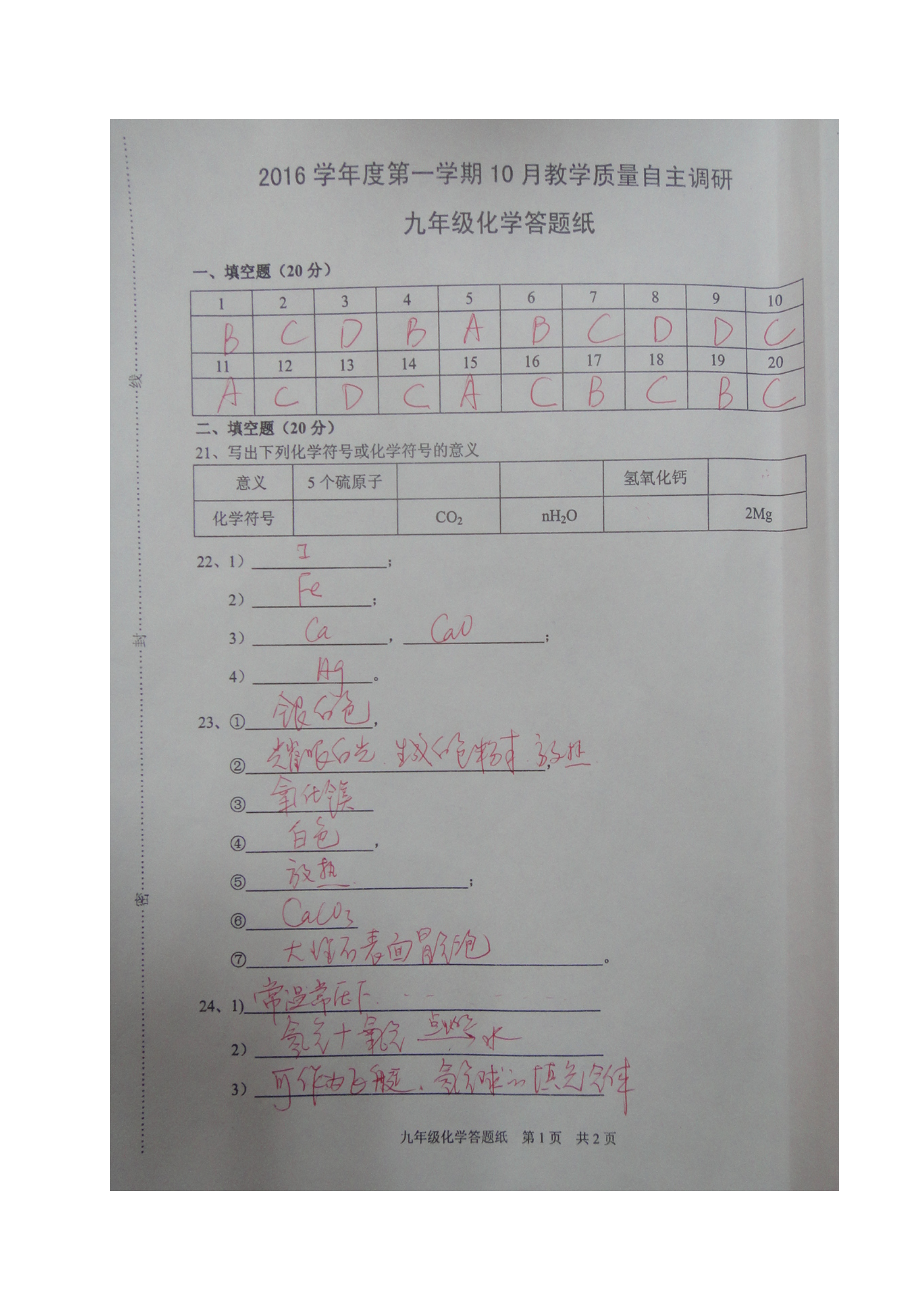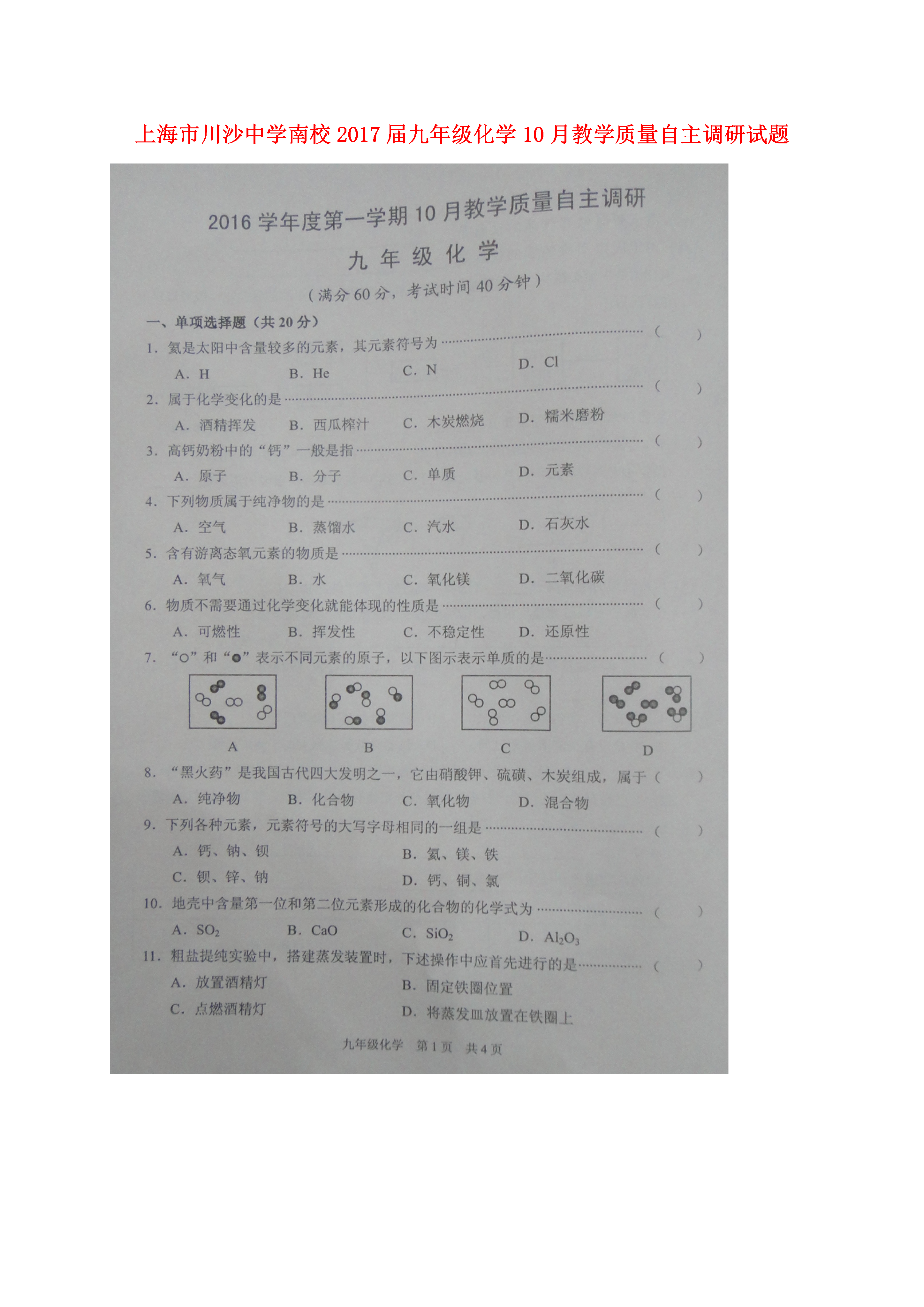 试题-上海-2016_上海市川沙中学南校2017届九年级化学10月教学质量自主调研试题(扫描版) 沪教版五四制