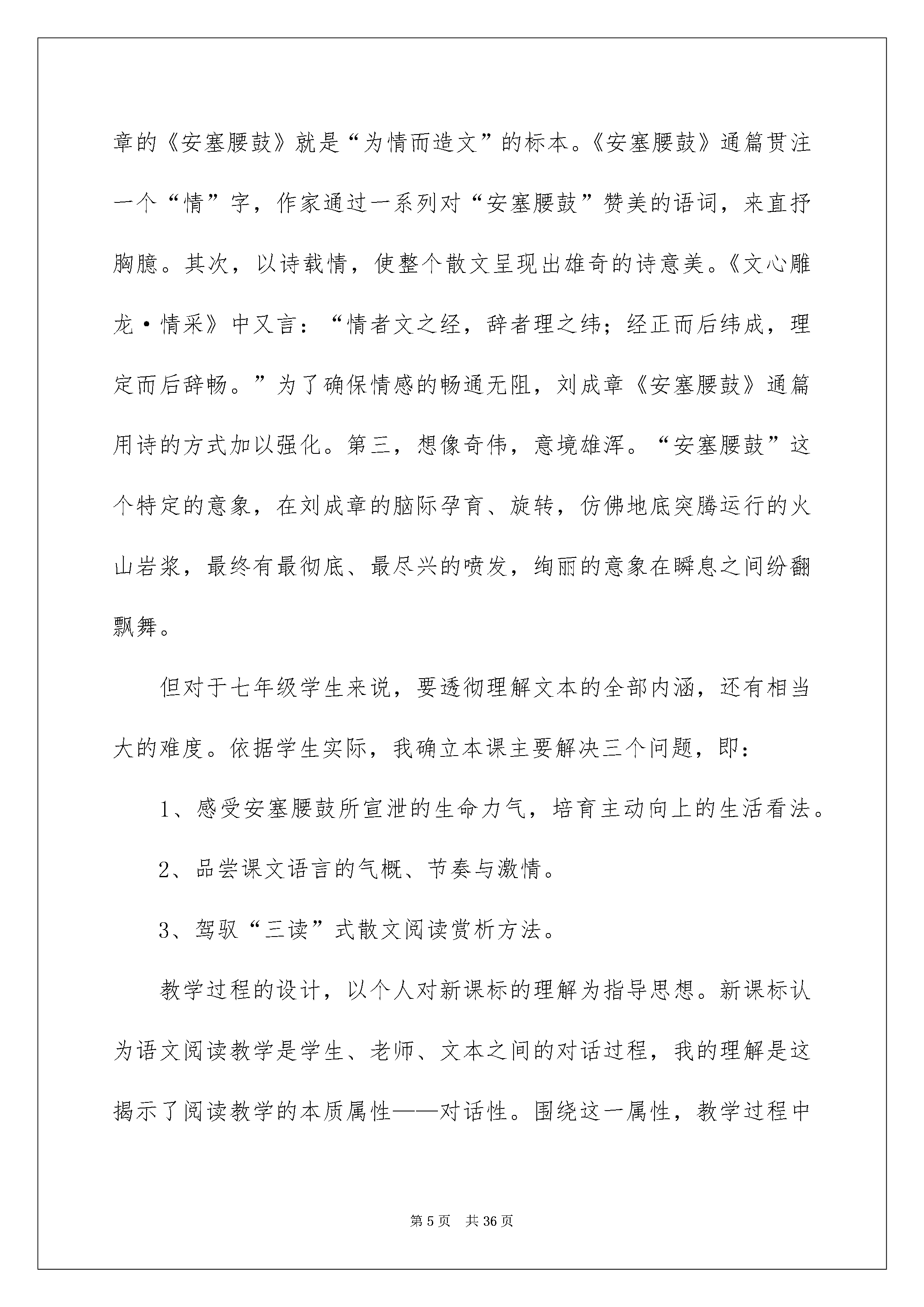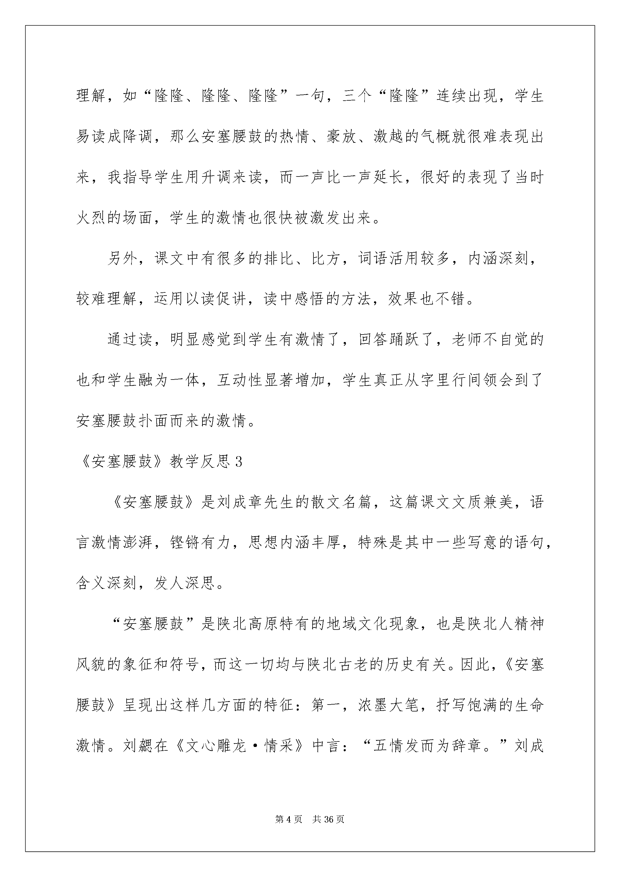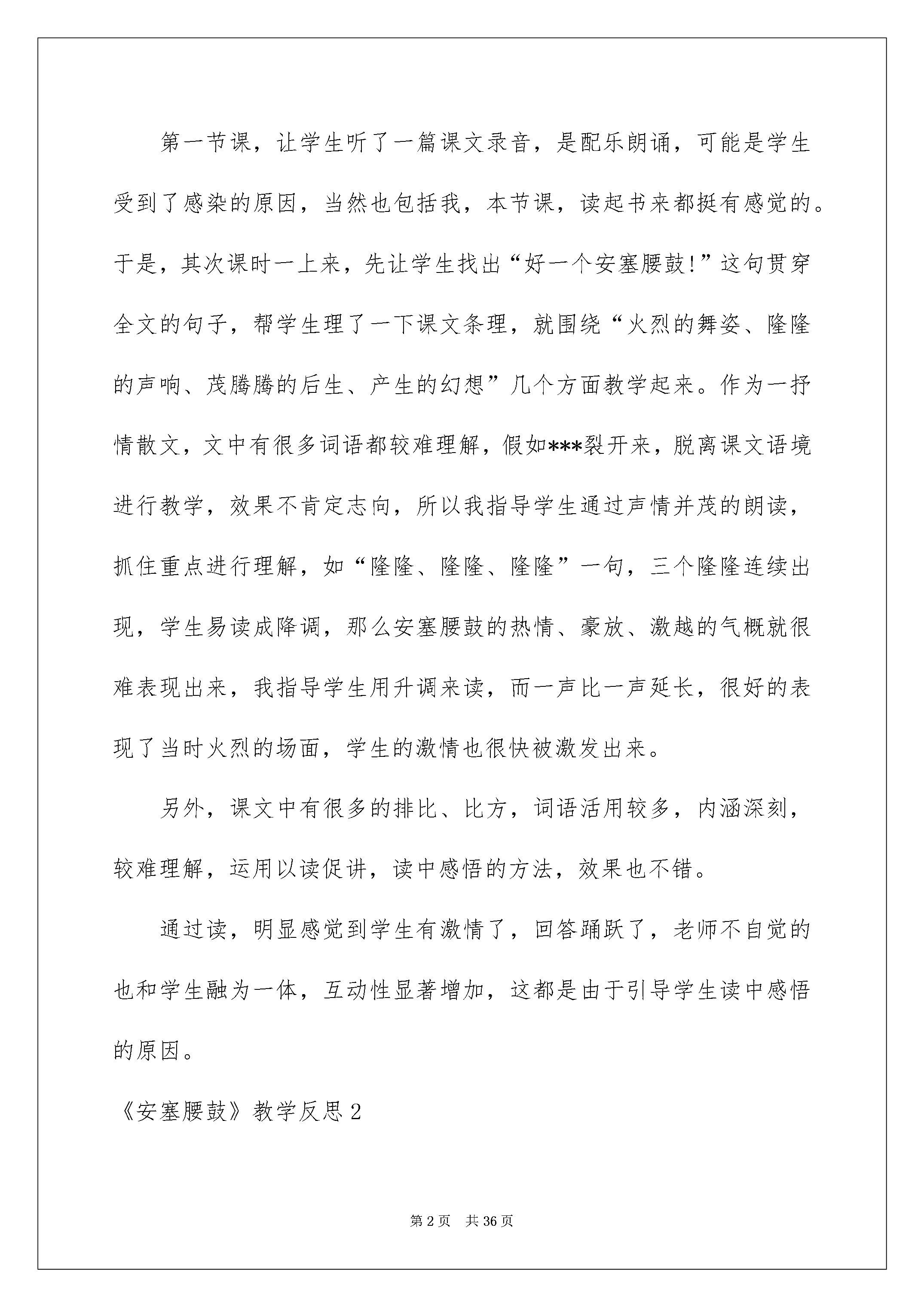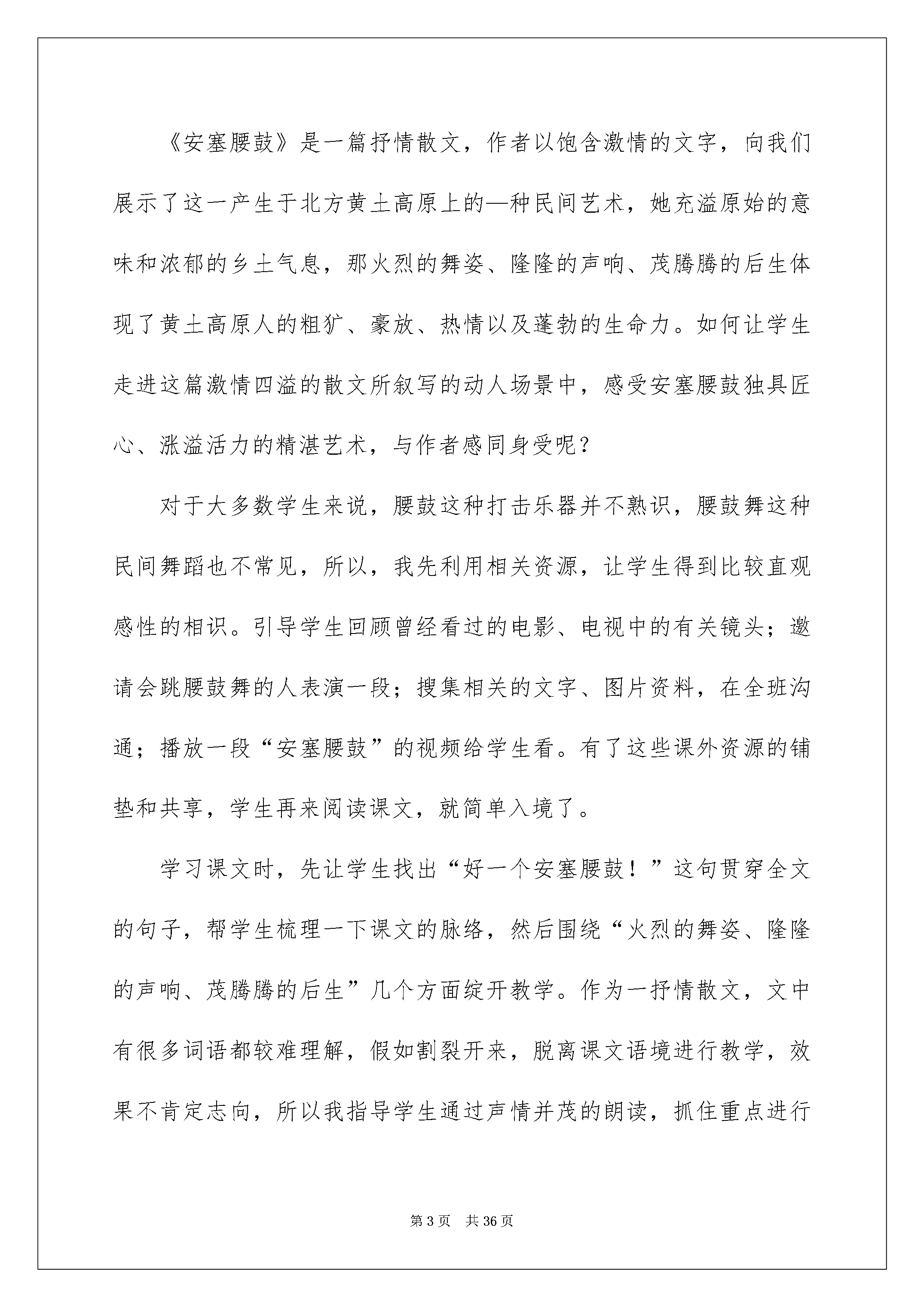 2022《安塞腰鼓》教学反思《安塞腰鼓》教学反思作为一名到岗不久的老师,我们要在教学中快速成长,我们可以把教学过程中的感悟记录在教学反思中,那么优秀的教学反思是什么样的呢?以下是我细心整理的《安塞腰鼓》教学反思,仅供参考,大家一起来看看吧。《安塞腰鼓》教学反思1《安塞腰鼓》是一篇抒情散文,作者以饱含激情的文字,向我们展示了这一产生于北方黄土高原上的—种民间艺术,她充溢原始的意味和浓郁的乡土气息,那火烈的舞姿、隆隆的声响、茂腾腾的后生体现了黄土高原人的粗犷、豪放、热情以及蓬勃的生命力。初看课文,就感觉理解上较难。这只是一节普一般通的课,并没有在电教室运用多媒体,孩子又没有什么生活体验,怎样才能上好呢?本节课下来,感觉还不错,最主要一点,抓住了读,以读促讲,在读中悟。再者,我借助省优质资源进课堂的碟片中关于安塞腰鼓的表演场面,让学生有了初步的感知。第一节课,让学生听了一篇课文录音,是配乐朗诵,可能是学生受到了感染的原因,当然也包括我,本节课,读起书来都挺有感觉的。于是,其次课时一上来,先让学生找出“好一个安塞腰鼓!”这句贯穿全文的句子,帮学生理了一下课文条理,就围绕“火烈的舞姿、隆隆的声响、茂腾腾的后生、产生的幻想”几个方面教学起来。作为一抒情散文,文中有很多词语都较难理解,假如***裂开来,脱离课文语境进行教学,效果不肯定志向,所以我指导学生通过声情并茂的朗读,抓住重点进行理解,如“隆隆、隆隆、隆隆”一句,三个隆隆连续出现,学生易读成降调,那么安塞腰鼓的热情、豪放、激越的气概就很难表现出来,我指导学生用升调来读,而一声比一声延长,很好的表现了当时火烈的场面,学生的激情也很快被激发出来。另外,课文中有很多的排比、比方,词语活用较多,内涵深刻,较难理解,运用以读促讲,读中感悟的方法,效果也不错。通过读,明显感觉到学生有激情了,回答踊跃了,老师不自觉的也和学生融为一体,互动性显著增加,这都是由于引导学生读中感悟的原因。《安塞腰鼓》教学反思2《安塞腰鼓》是一篇抒情散文,作者以饱含激情的文字,向我们展示了这一产生于北方黄土高原上的—种民间艺术,她充溢原始的意味和浓郁的乡土气息,那火烈的舞姿、隆隆的声响、茂腾腾的后生体现了黄土高原人的粗犷、豪放、热情以及蓬勃的生命力。如何让学生走进这篇激情四溢的散文所叙写的动人场景中,感受安塞腰鼓独具匠心、涨溢活力的精湛艺术,与作者感同身受呢?对于大多数学生来说,腰鼓这种打击乐器并不熟识,腰鼓舞这种民间舞蹈也不常见,所以,我先利用相关资源,让学生得到比较直观感性的相识。引导学生回顾曾经看过的电影、电视中的有关镜头;邀请会跳腰鼓舞的人表演一段;搜集相关的文字、图片资料,在全班沟通;播放一段“安塞腰鼓”的视频给学生看。有了这些课外资源的铺垫和共享,学生再来阅读课文,就简单入境了。学习课文时,先让学生找出“好一个安塞腰鼓!”这句贯穿全文的句子,帮学生梳理一下课文的脉络,然后围绕“火烈的舞姿、隆隆的声响、茂腾腾的后生”几个方面绽开教学。作为一抒情散文,文中有很多词语都较难理解,假如割裂开来,脱离课文语境进行教学,效果不肯定志向,所以我指导学生通过声情并茂的朗读,抓住重点进行理解,如“隆隆、隆隆、隆隆”一句,三个“隆隆”连续出现,学生易读成降调,那么安塞腰鼓的热情、豪放、激越的气概就很难表现出来,我指导学生用升调来读,而一声比一声延长,很好的表现了当时火烈的场面,学生的激情也很快被激发出来。另外,课文中有很多的排比、比方,词语活用较多,内涵深刻,较难理解,运用以读促讲,读中感悟的方法,效果也不错。通过读,明显感觉到学生有激情了,回答踊跃了,老师不自觉的也和学生融为一体,互动性显著增加,学生真正从字里行间领会到了安塞腰鼓扑面而来的激情。《安塞腰鼓》教学反思3《安塞腰鼓》是刘成章先生的散文名篇,这篇课文文质兼美,语言激情澎湃,铿锵有力,思想内涵丰厚,特殊是其中一些写意的语句,含义深刻,发人深思。“安塞腰鼓”是陕北高原特有的地域文化现象,也是陕北人精神风貌的象征和符号,而这一切均与陕北古老的历史有关。因此,《安塞腰鼓》呈现出这样几方面的特征:第一,浓墨大笔,抒写饱满的生命激情。刘勰在《文心雕龙·情采》中言:“五情发而为辞章。”刘成章的《安塞腰鼓》就是“为情而造文”的标本。《安塞腰鼓》通篇贯注一个“情”字,作家通过一系列对“安塞腰鼓”赞美的语词,来直抒胸臆。其次,以诗载情,使整个散文呈现出雄奇的诗意美。《文心雕龙·情采》中又言:“情者文之经,辞者理之纬;经正而后纬成,理定而后辞畅。”为了确保情感的畅通无阻,刘成章《安塞腰鼓》通篇用诗的方式加以强化。第三,想像奇伟,意境