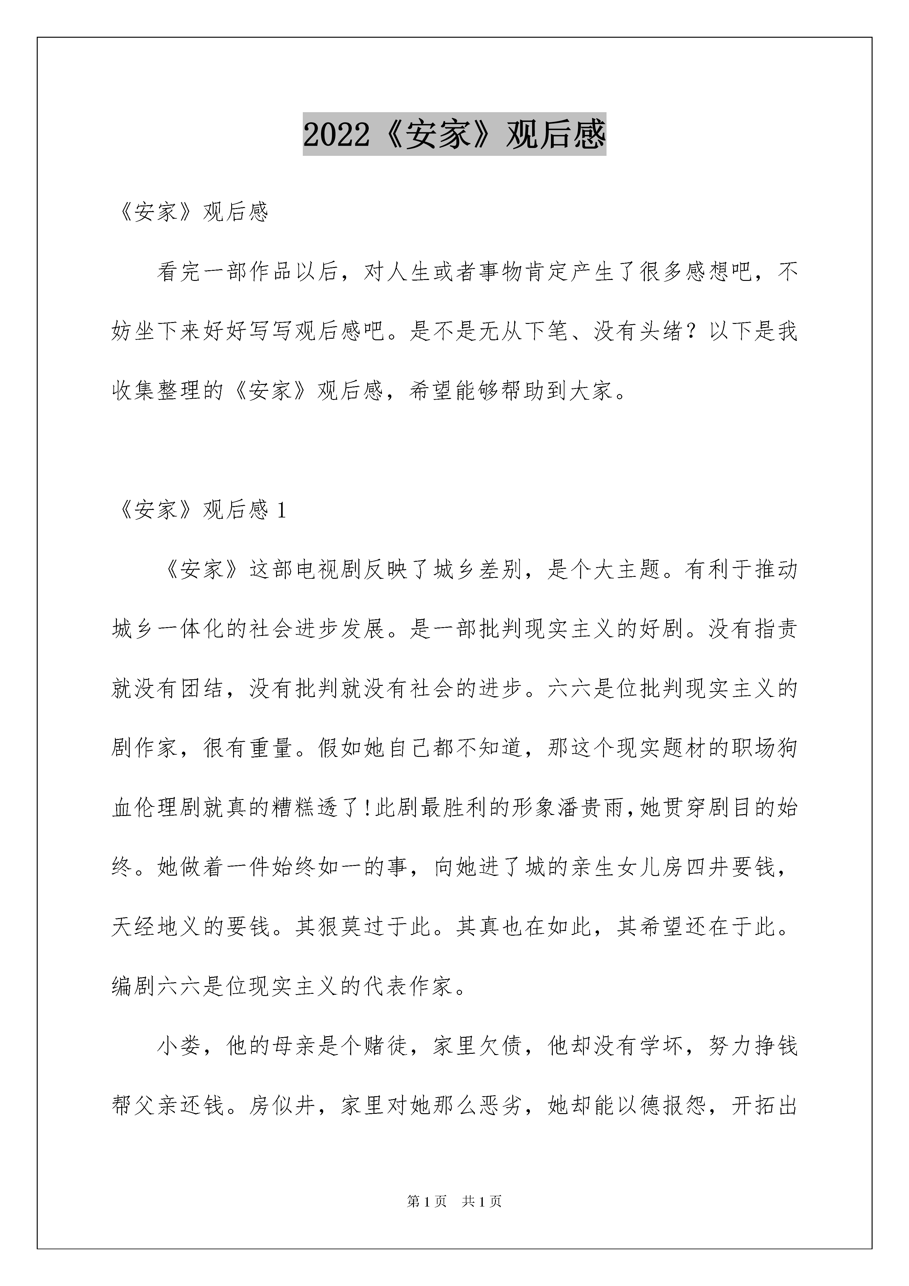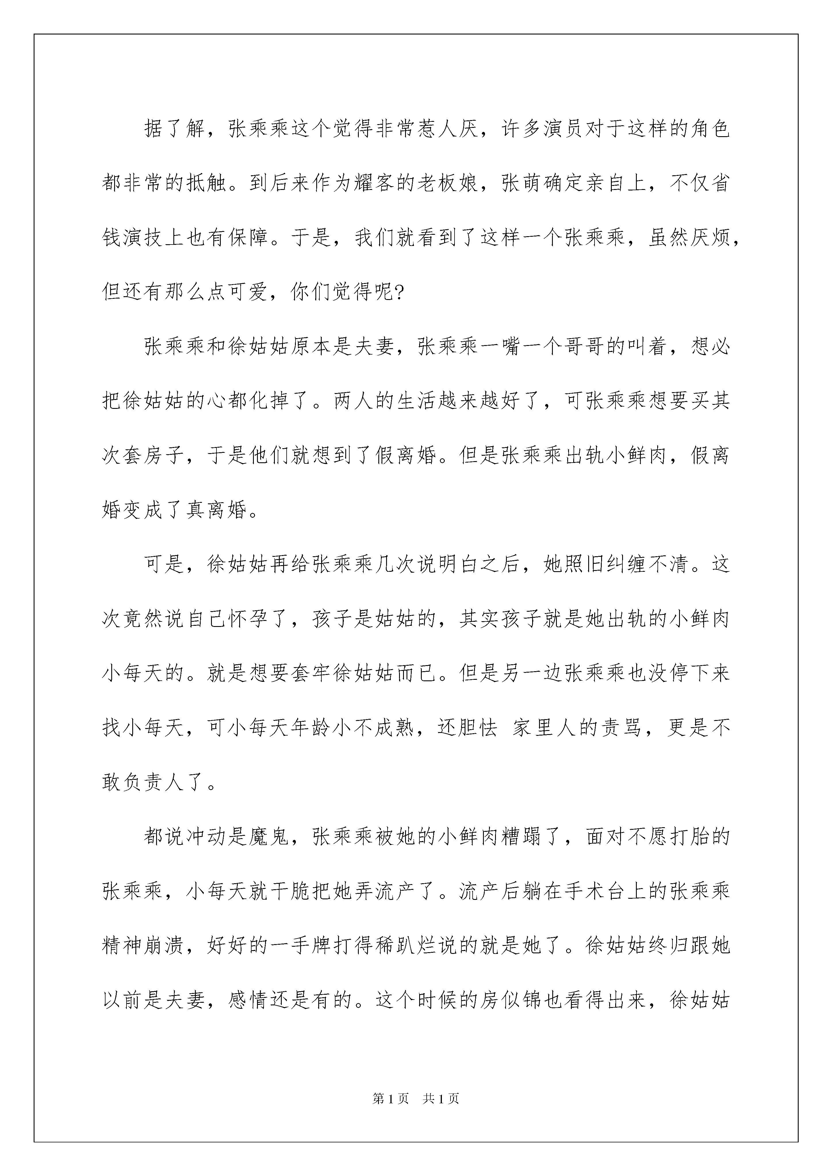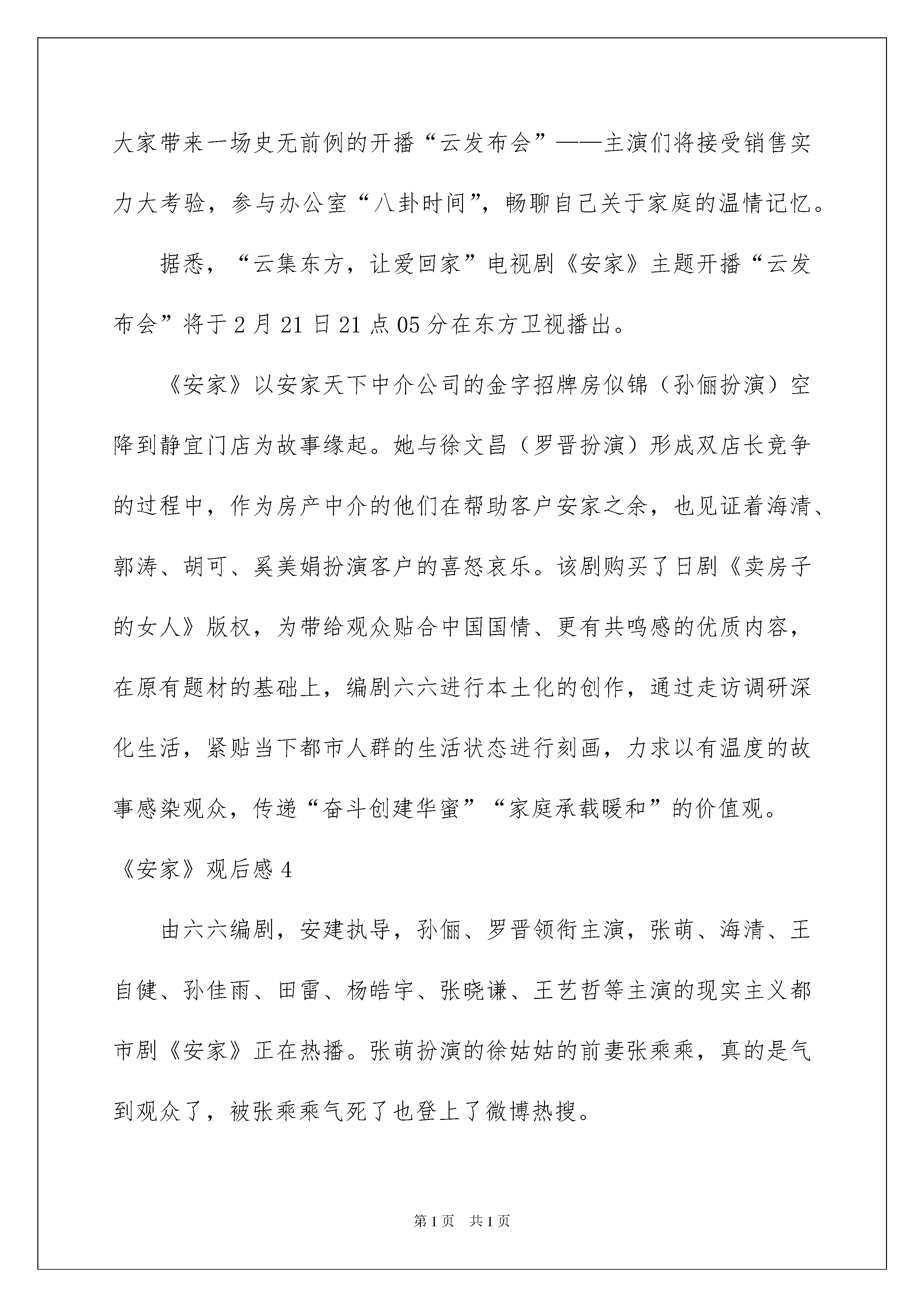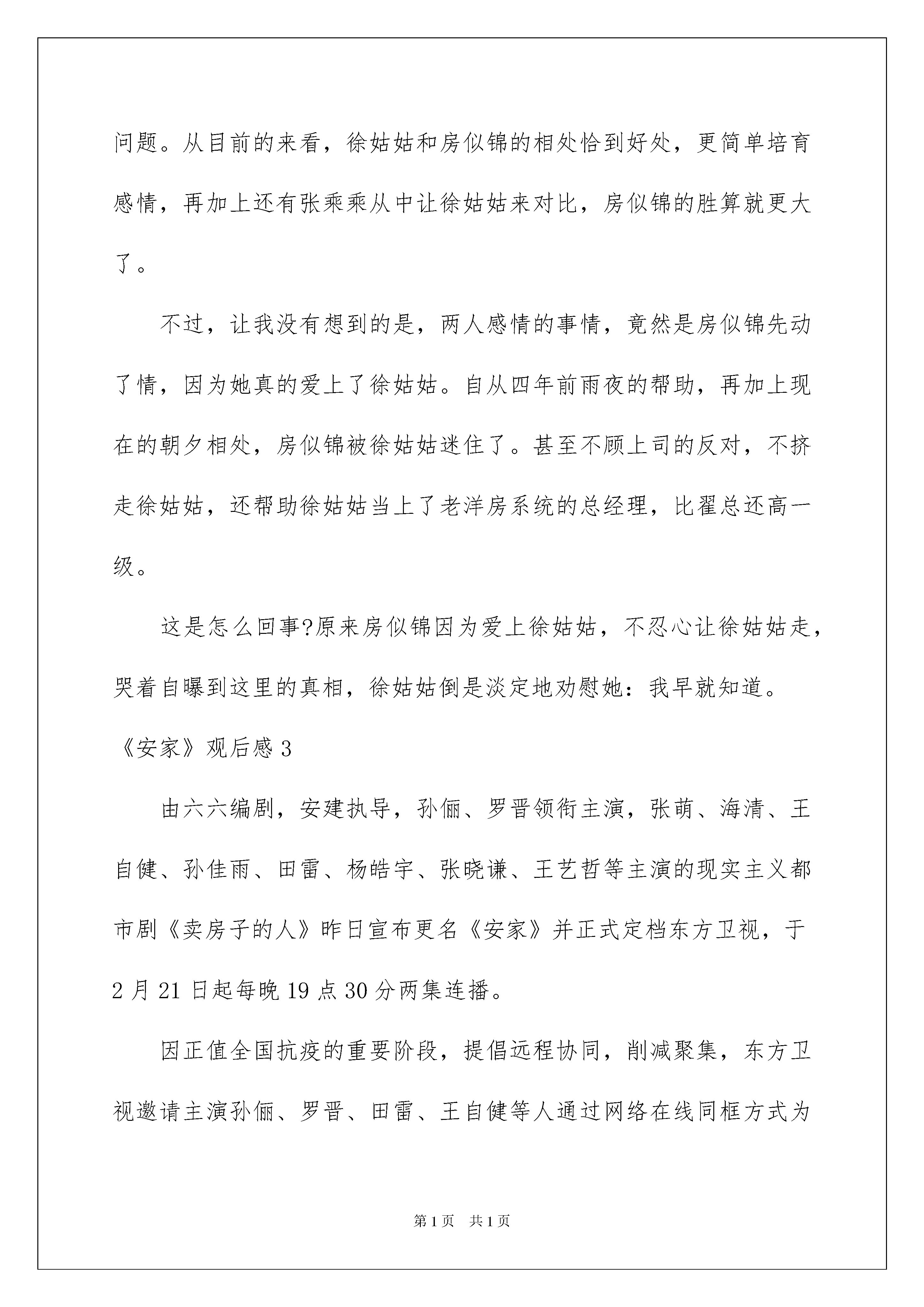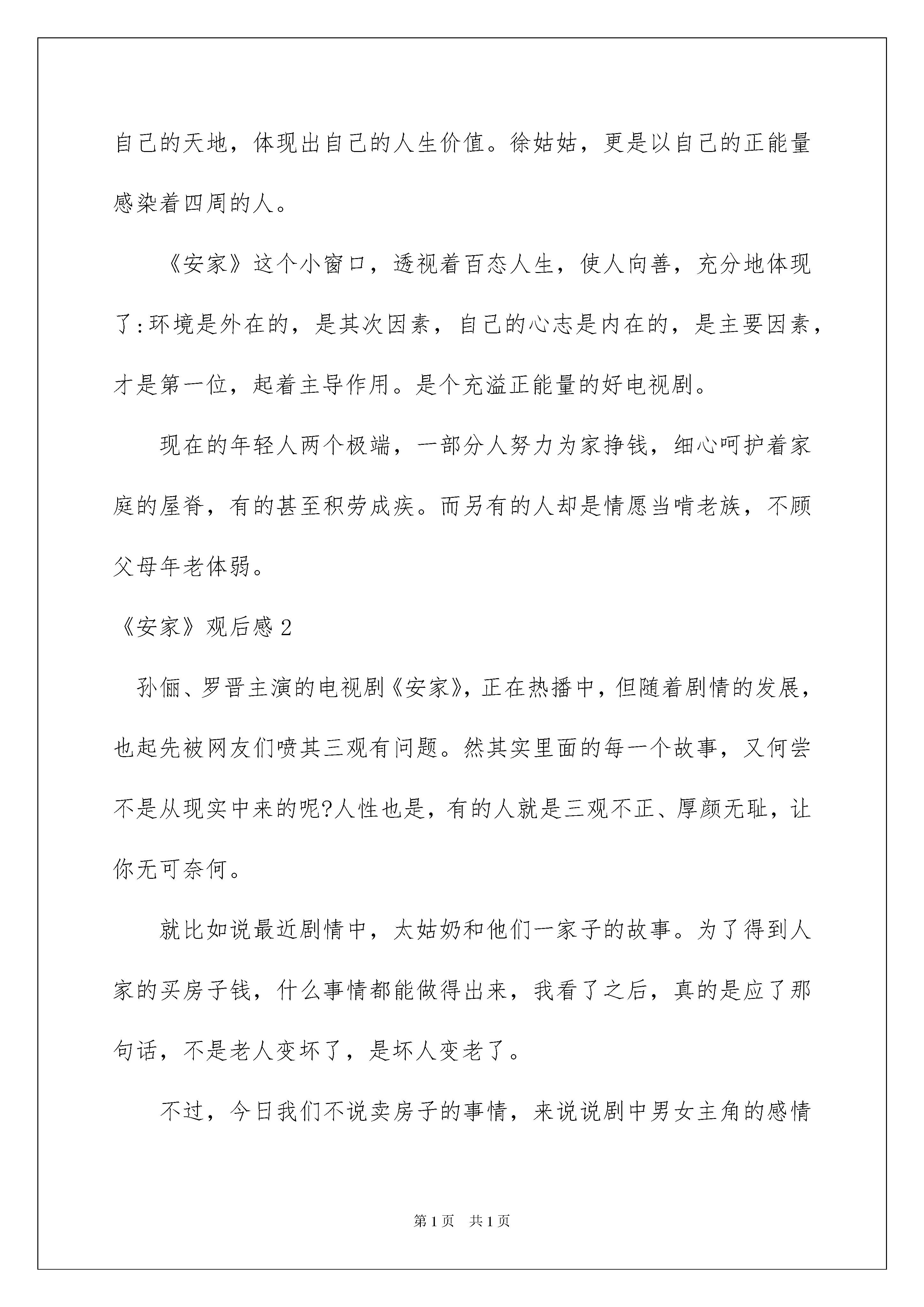 2022《安家》观后感《安家》观后感看完一部作品以后,对人生或者事物肯定产生了很多感想吧,不妨坐下来好好写写观后感吧。是不是无从下笔、没有头绪?以下是我收集整理的《安家》观后感,希望能够帮助到大家。《安家》观后感1《安家》这部电视剧反映了城乡差别,是个大主题。有利于推动城乡一体化的社会进步发展。是一部批判现实主义的好剧。没有指责就没有团结,没有批判就没有社会的进步。六六是位批判现实主义的剧作家,很有重量。假如她自己都不知道,那这个现实题材的职场狗血伦理剧就真的糟糕透了!此剧最胜利的形象潘贵雨,她贯穿剧目的始终。她做着一件始终如一的事,向她进了城的亲生女儿房四井要钱,天经地义的要钱。其狠莫过于此。其真也在如此,其希望还在于此。编剧六六是位现实主义的代表作家。小娄,他的母亲是个赌徒,家里欠债,他却没有学坏,努力挣钱帮父亲还钱。房似井,家里对她那么恶劣,她却能以德报怨,开拓出自己的天地,体现出自己的人生价值。徐姑姑,更是以自己的正能量感染着四周的人。《安家》这个小窗口,透视着百态人生,使人向善,充分地体现了:环境是外在的,是其次因素,自己的心志是内在的,是主要因素,才是第一位,起着主导作用。是个充溢正能量的好电视剧。现在的年轻人两个极端,一部分人努力为家挣钱,细心呵护着家庭的屋脊,有的甚至积劳成疾。而另有的人却是情愿当啃老族,不顾父母年老体弱。《安家》观后感2孙俪、罗晋主演的电视剧《安家》,正在热播中,但随着剧情的发展,也起先被网友们喷其三观有问题。然其实里面的每一个故事,又何尝不是从现实中来的呢?人性也是,有的人就是三观不正、厚颜无耻,让你无可奈何。就比如说最近剧情中,太姑奶和他们一家子的故事。为了得到人家的买房子钱,什么事情都能做得出来,我看了之后,真的是应了那句话,不是老人变坏了,是坏人变老了。不过,今日我们不说卖房子的事情,来说说剧中男女主角的感情问题。从目前的来看,徐姑姑和房似锦的相处恰到好处,更简单培育感情,再加上还有张乘乘从中让徐姑姑来对比,房似锦的胜算就更大了。不过,让我没有想到的是,两人感情的事情,竟然是房似锦先动了情,因为她真的爱上了徐姑姑。自从四年前雨夜的帮助,再加上现在的朝夕相处,房似锦被徐姑姑迷住了。甚至不顾上司的反对,不挤走徐姑姑,还帮助徐姑姑当上了老洋房系统的总经理,比翟总还高一级。这是怎么回事?原来房似锦因为爱上徐姑姑,不忍心让徐姑姑走,哭着自曝到这里的真相,徐姑姑倒是淡定地劝慰她:我早就知道。《安家》观后感3由六六编剧,安建执导,孙俪、罗晋领衔主演,张萌、海清、王自健、孙佳雨、田雷、杨皓宇、张晓谦、王艺哲等主演的现实主义都市剧《卖房子的人》昨日宣布更名《安家》并正式定档东方卫视,于2月21日起每晚19点30分两集连播。因正值全国抗疫的重要阶段,提倡远程协同,削减聚集,东方卫视邀请主演孙俪、罗晋、田雷、王自健等人通过网络在线同框方式为大家带来一场史无前例的开播“云发布会”——主演们将接受销售实力大考验,参与办公室“八卦时间”,畅聊自己关于家庭的温情记忆。据悉,“云集东方,让爱回家”电视剧《安家》主题开播“云发布会”将于2月21日21点05分在东方卫视播出。《安家》以安家天下中介公司的金字招牌房似锦(孙俪扮演)空降到静宜门店为故事缘起。她与徐文昌(罗晋扮演)形成双店长竞争的过程中,作为房产中介的他们在帮助客户安家之余,也见证着海清、郭涛、胡可、奚美娟扮演客户的喜怒哀乐。该剧购买了日剧《卖房子的女人》版权,为带给观众贴合中国国情、更有共鸣感的优质内容,在原有题材的基础上,编剧六六进行本土化的创作,通过走访调研深化生活,紧贴当下都市人群的生活状态进行刻画,力求以有温度的故事感染观众,传递“奋斗创建华蜜”“家庭承载暖和”的价值观。《安家》观后感4由六六编剧,安建执导,孙俪、罗晋领衔主演,张萌、海清、王自健、孙佳雨、田雷、杨皓宇、张晓谦、王艺哲等主演的现实主义都市剧《安家》正在热播。张萌扮演的徐姑姑的前妻张乘乘,真的是气到观众了,被张乘乘气死了也登上了微博热搜。据了解,张乘乘这个觉得非常惹人厌,许多演员对于这样的角色都非常的抵触。到后来作为耀客的老板娘,张萌确定亲自上,不仅省钱演技上也有保障。于是,我们就看到了这样一个张乘乘,虽然厌烦,但还有那么点可爱,你们觉得呢?张乘乘和徐姑姑原本是夫妻,张乘乘一嘴一个哥哥的叫着,想必把徐姑姑的心都化掉了。两人的生活越来越好了,可张乘乘想要买其次套房子,于是他们就想到了假离婚。但是张乘乘出轨小鲜肉,假离婚变成了真离婚。可是,徐姑姑再给张乘乘几次说明白之后,她照旧纠缠不清。这次竟然说自己怀孕了,孩子是姑姑的,其实孩子就是她