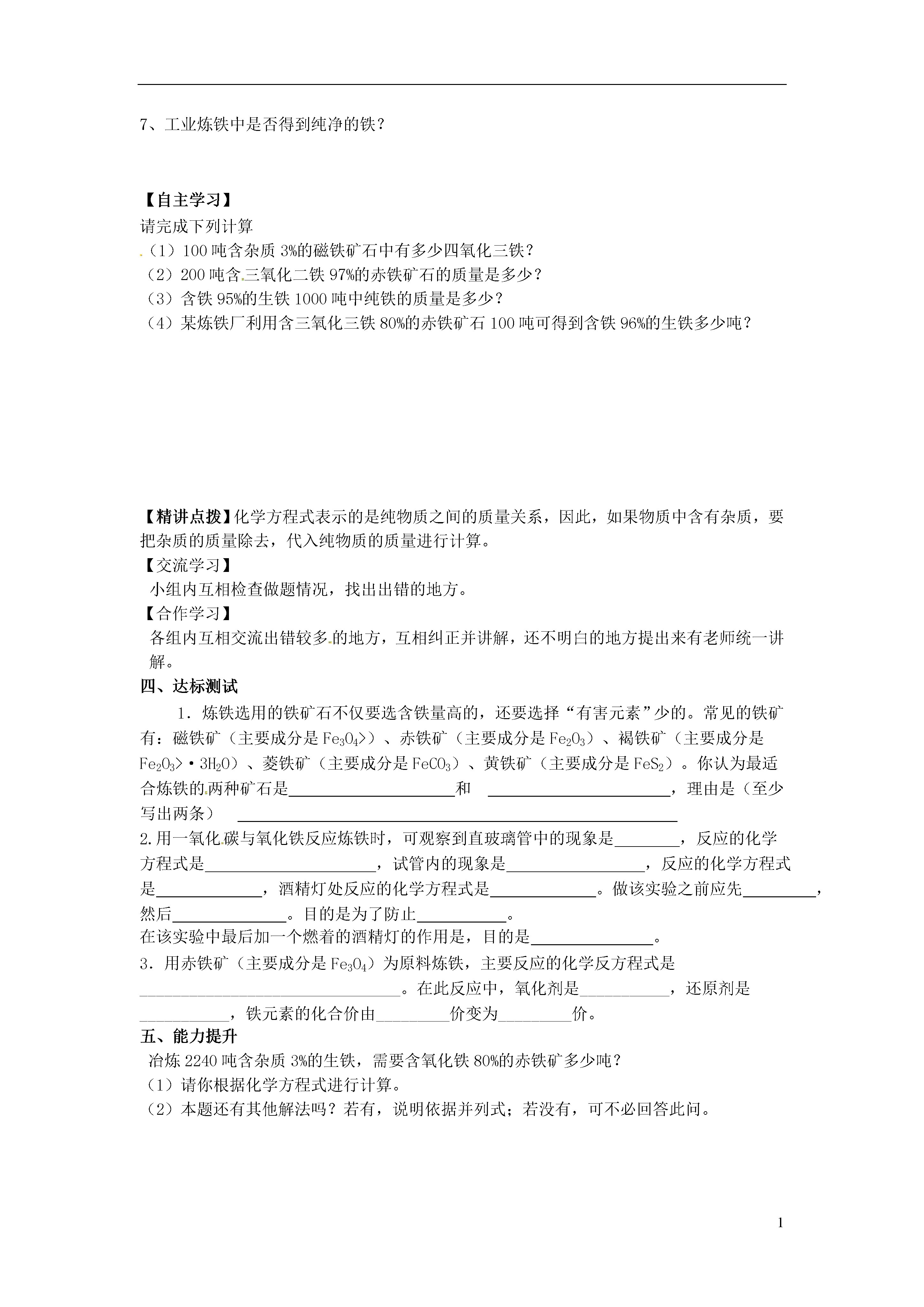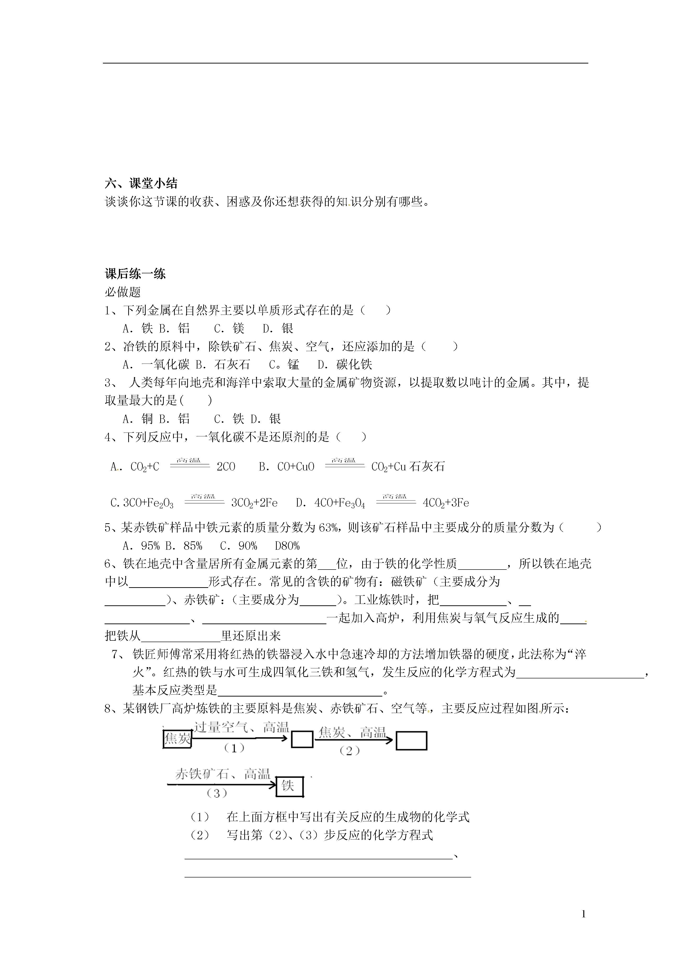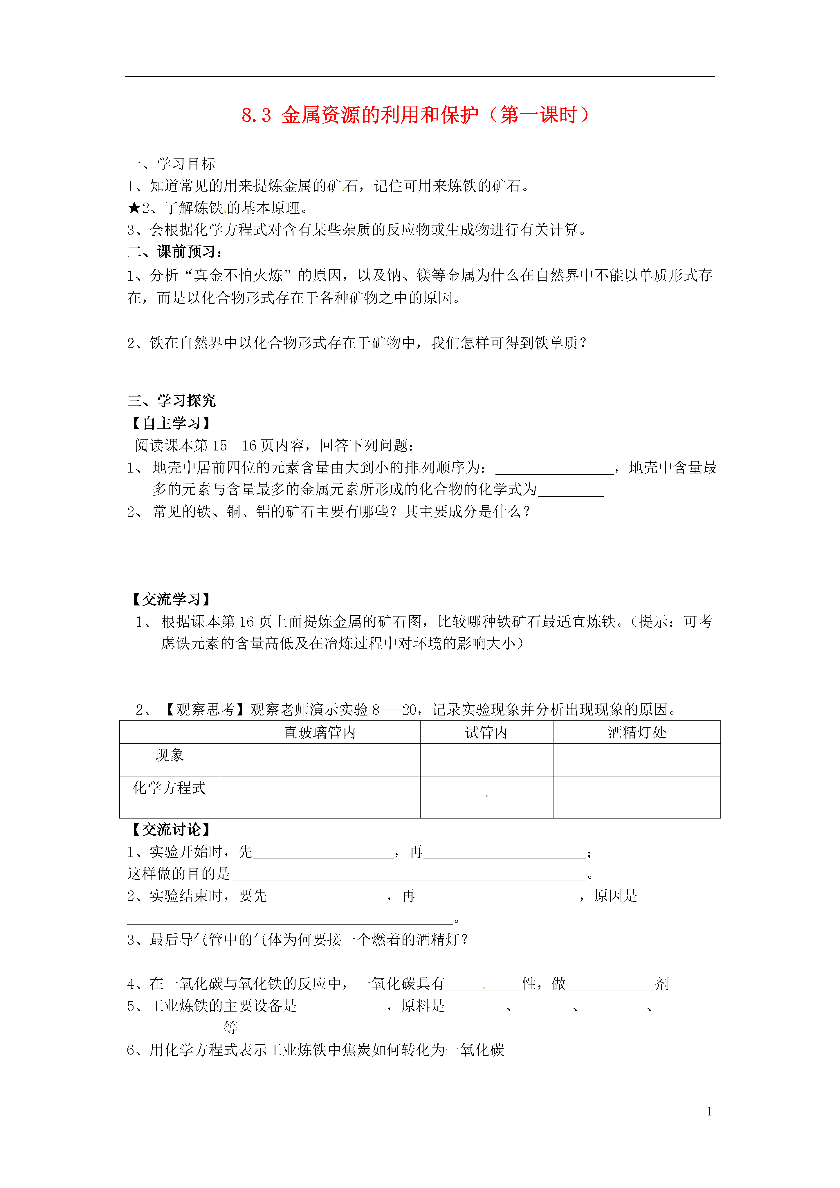 18.3金属资源的利用和保护(第一课时)一、学习目标1、知道常见的用来提炼金属的矿石,记住可用来炼铁的矿石。★2、了解炼铁的基本原理。3、会根据化学方程式对含有某些杂质的反应物或生成物进行有关计算。二、课前预习:1、分析“真金不怕火炼”的原因,以及钠、镁等金属为什么在自然界中不能以单质形式存在,而是以化合物形式存在于各种矿物之中的原因。2、铁在自然界中以化合物形式存在于矿物中,我们怎样可得到铁单质?三、学习探究【自主学习】阅读课本第15—16页内容,回答下列问题:地壳中居前四位的元素含量由大到小的排列顺序为:,地壳中含量最多的元素与含量最多的金属元素所形成的化合物的化学式为常见的铁、铜、铝的矿石主要有哪些?其主要成分是什么?【交流学习】根据课本上面提炼金属的矿石图,比较哪种铁矿石最适宜炼铁。(提示:可考虑铁元素的含量高低及在冶炼过程中对环境的影响大小)【观察思考】观察老师演示实验8---20,记录实验现象并分析出现现象的原因。直玻璃管内试管内酒精灯处现象化学方程式【交流讨论】1、实验开始时,先,再;这样做的目的是。2、实验结束时,要先,再,原因是。3、最后导气管中的气体为何要接一个燃着的酒精灯?4、在一氧化碳与氧化铁的反应中,一氧化碳具有性,做剂5、工业炼铁的主要设备是,原料是、、、等6、用化学方程式表示工业炼铁中焦炭如何转化为一氧化碳7、工业炼铁中是否得到纯净的铁?【自主学习】请完成下列计算(1)100吨含杂质3%的磁铁矿石中有多少四氧化三铁?(2)200吨含三氧化二铁97%的赤铁矿石的质量是多少?(3)含铁95%的生铁1000吨中纯铁的质量是多少?(4)某炼铁厂利用含三氧化三铁80%的赤铁矿石100吨可得到含铁96%的生铁多少吨?【精讲点拨】化学方程式表示的是纯物质之间的质量关系,因此,如果物质中含有杂质,要把杂质的质量除去,代入纯物质的质量进行计算。【交流学习】小组内互相检查做题情况,找出出错的地方。【合作学习】各组内互相交流出错较多的地方,互相纠正并讲解,还不明白的地方提出来有老师统一讲解。四、达标测试1.炼铁选用的铁矿石不仅要选含铁量高的,还要选择“有害元素”少的。常见的铁矿有:磁铁矿(主要成分是Fe3O4>)、赤铁矿(主要成分是Fe2O3)、褐铁矿(主要成分是Fe2O3>·3H2O)、菱铁矿(主要成分是FeCO3)、黄铁矿(主要成分是FeS2)。你认为最适合炼铁的两种矿石是和,理由是(至少写出两条)2.用一氧化碳与氧化铁反应炼铁时,可观察到直玻璃管中的现象是,反应的化学方程式是,试管内的现象是,反应的化学方程式是,酒精灯处反应的化学方程式是。做该实验之前应先,然后。目的是为了防止。在该实验中最后加一个燃着的酒精灯的作用是,目的是。3.用赤铁矿(主要成分是Fe3O4)为原料炼铁,主要反应的化学反方程式是________________________________。在此反应中,氧化剂是___________,还原剂是___________,铁元素的化合价由_________价变为_________价。五、能力提升冶炼2240吨含杂质3%的生铁,需要含氧化铁80%的赤铁矿多少吨?(1)请你根据化学方程式进行计算。(2)本题还有其他解法吗?若有,说明依据并列式;若没有,可不必回答此问。六、课堂小结谈谈你这节课的收获、困惑及你还想获得的知识分别有哪些。课后练一练必做题1、下列金属在自然界主要以单质形式存在的是()A.铁B.铝C.镁D.银2、冶铁的原料中,除铁矿石、焦炭、空气,还应添加的是()A.一氧化碳B.石灰石C。锰D.碳化铁3、人类每年向地壳和海洋中索取大量的金属矿物资源,以提取数以吨计的金属。其中,提取量最大的是()A.铜B.铝C.铁D.银4、下列反应中,一氧化碳不是还原剂的是()A.CO2+C2COB.CO+CuOCO2+Cu石灰石C.3CO+Fe2O33CO2+2FeD.4CO+Fe3O44CO2+3Fe5、某赤铁矿样品中铁元素的质量分数为63%,则该矿石样品中主要成分的质量分数为()A.95%B.85%C.90%D80%6、铁在地壳中含量居所有金属元素的第位,由于铁的化学性质,所以铁在地壳中以形式存在。常见的含铁的矿物有:磁铁矿(主要成分为)、赤铁矿:(主要成分为)。工业炼铁时,把、、一起加入高炉,利用焦炭与氧气反应生成的把铁从里还原出来铁匠师傅常采用将红热的铁器浸入水中急速冷却的方法增加铁器的硬度,此法称为“淬火”。红热的铁与水可生成四氧化三铁和氢气,发