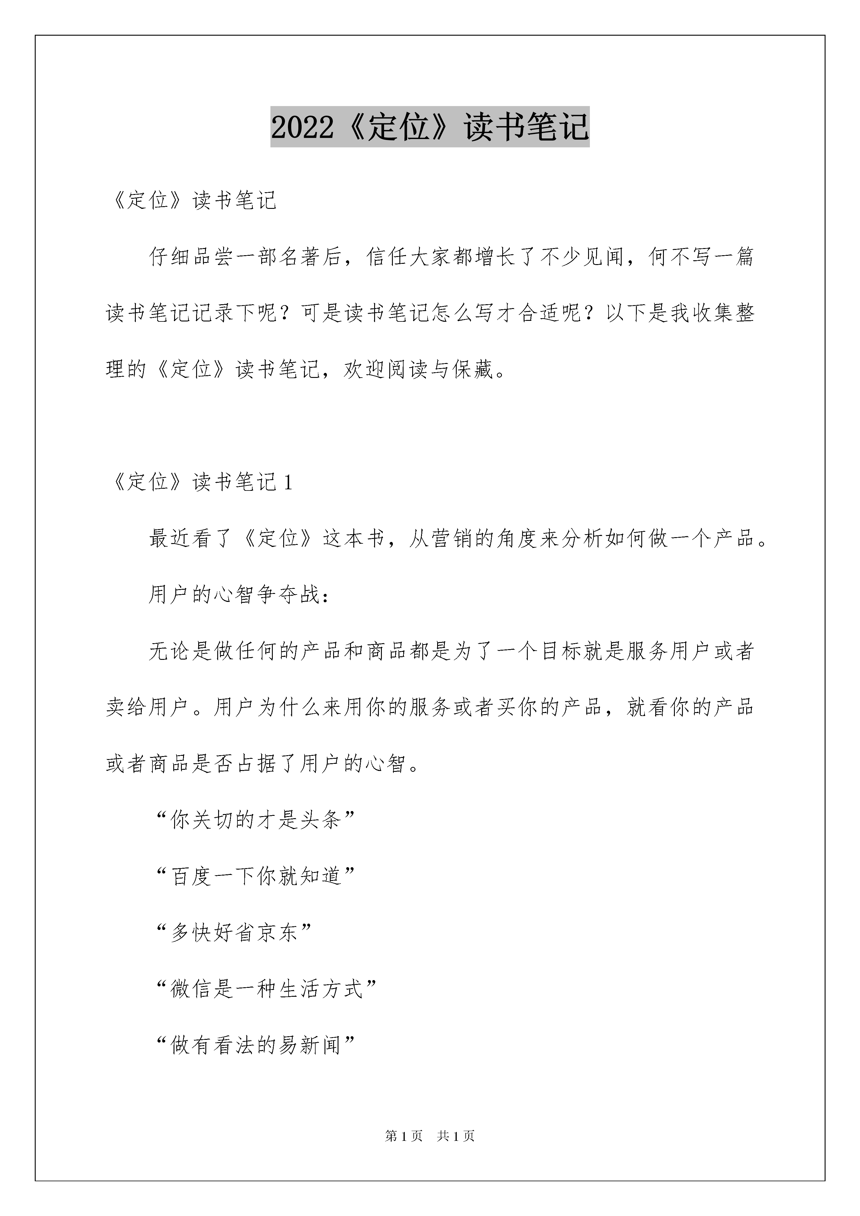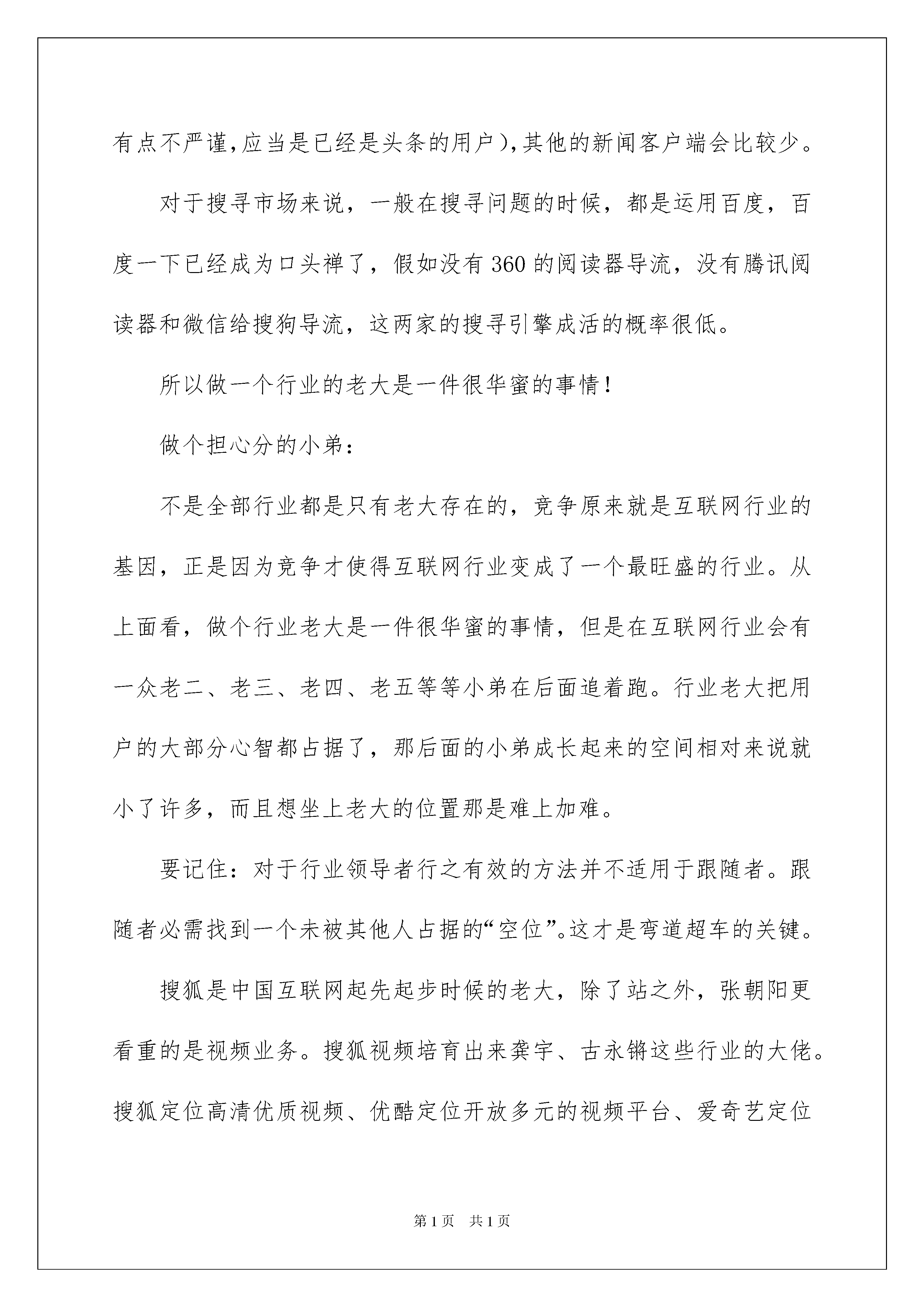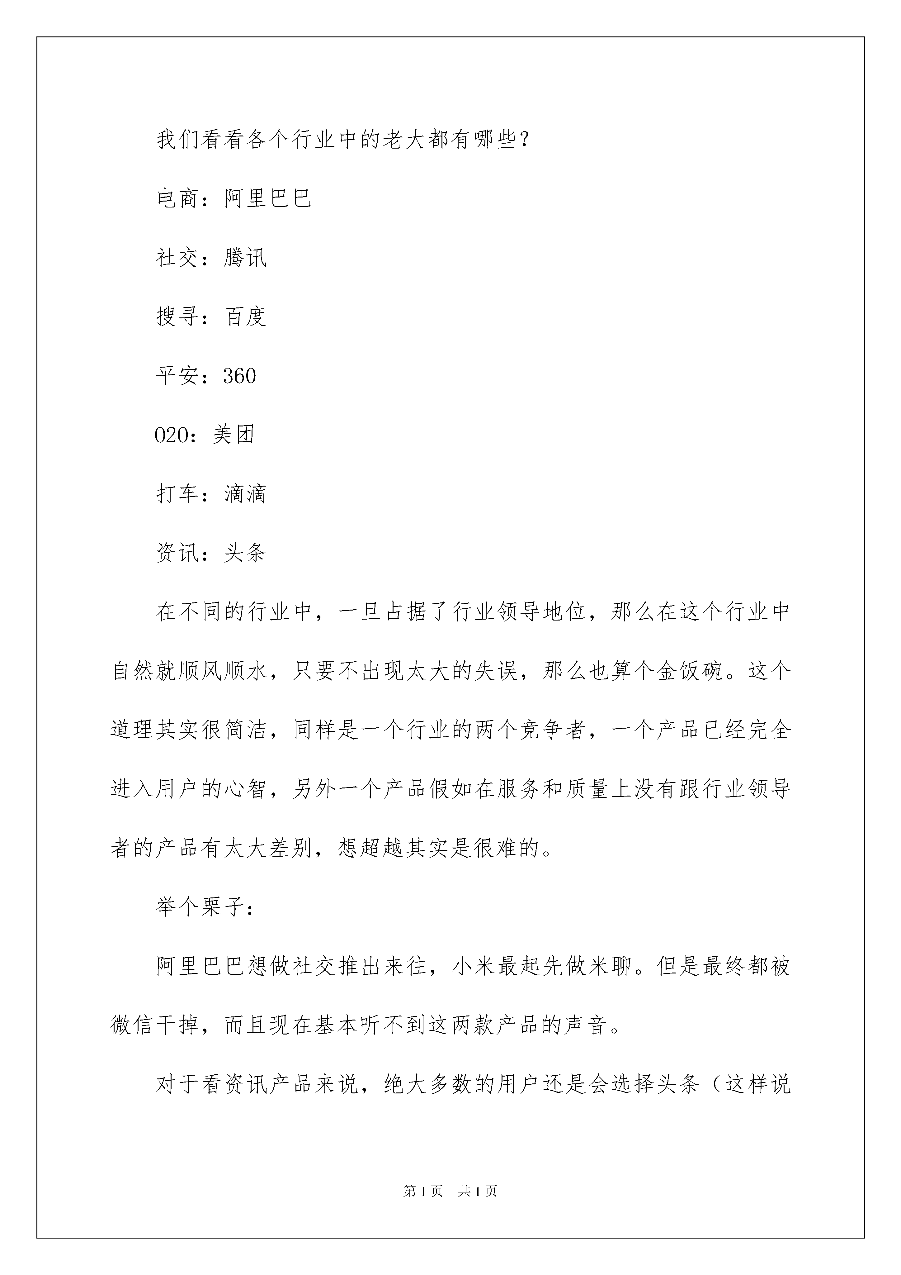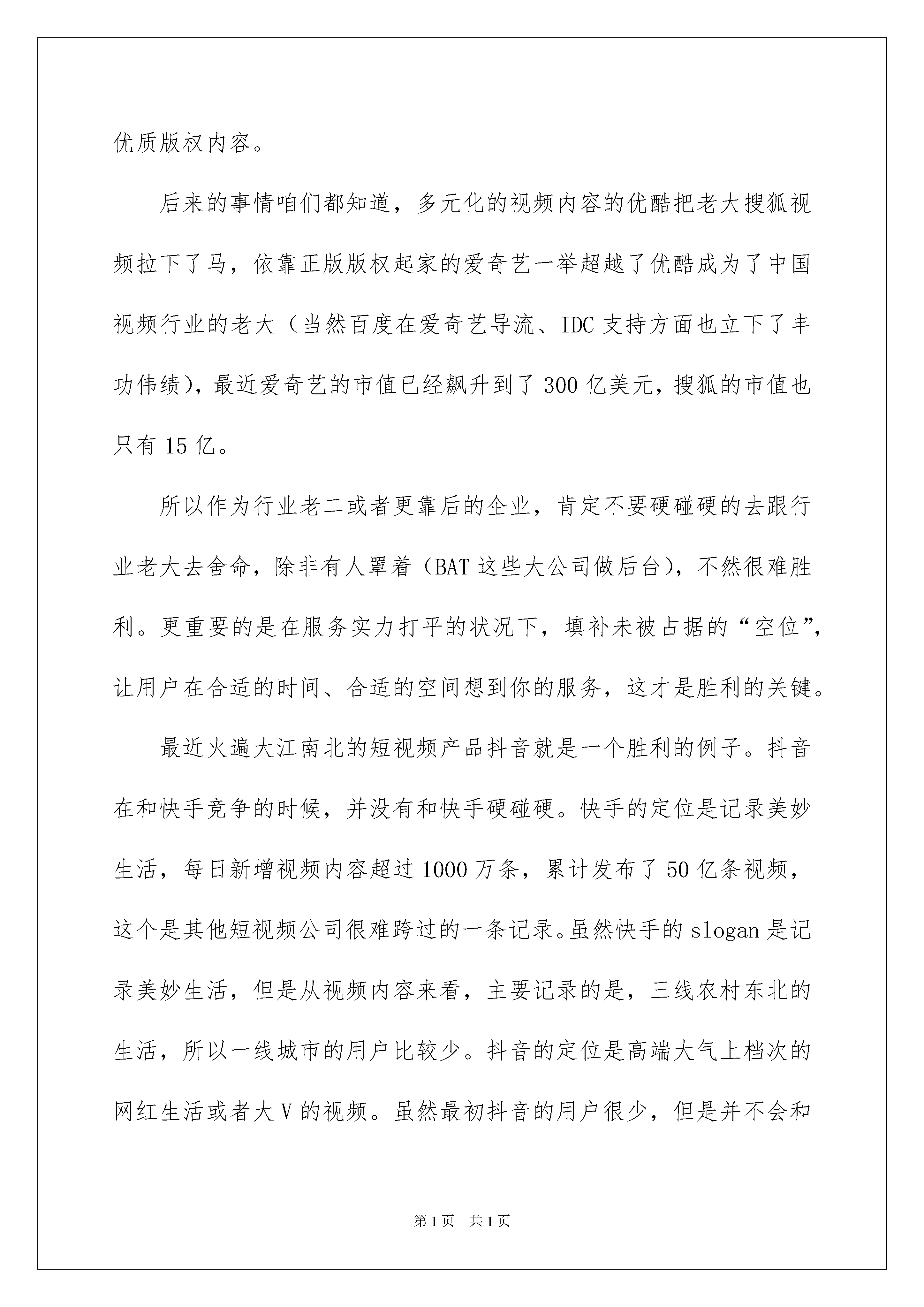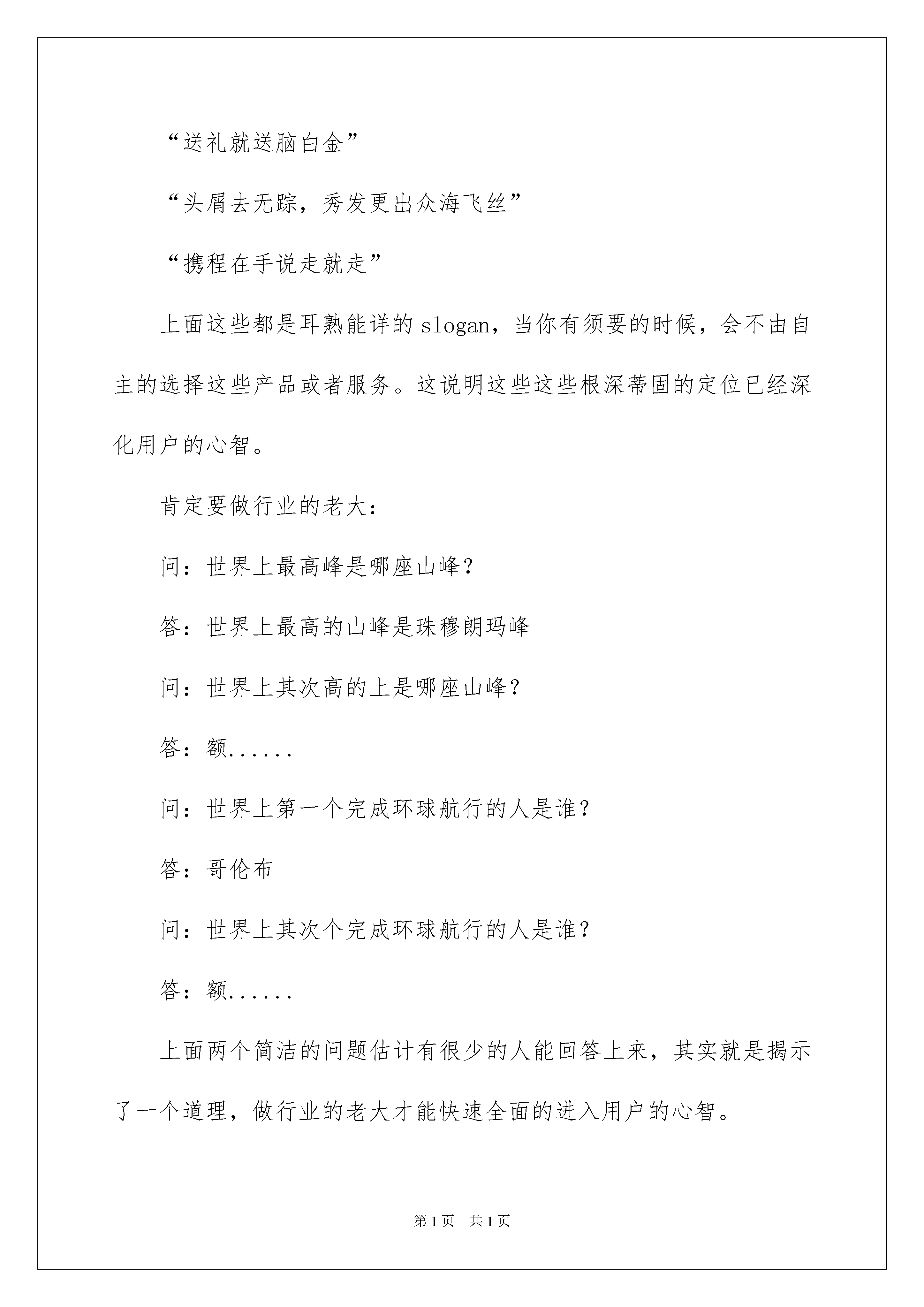 2022《定位》读书笔记《定位》读书笔记仔细品尝一部名著后,信任大家都增长了不少见闻,何不写一篇读书笔记记录下呢?可是读书笔记怎么写才合适呢?以下是我收集整理的《定位》读书笔记,欢迎阅读与保藏。《定位》读书笔记1最近看了《定位》这本书,从营销的角度来分析如何做一个产品。用户的心智争夺战:无论是做任何的产品和商品都是为了一个目标就是服务用户或者卖给用户。用户为什么来用你的服务或者买你的产品,就看你的产品或者商品是否占据了用户的心智。“你关切的才是头条”“百度一下你就知道”“多快好省京东”“微信是一种生活方式”“做有看法的易新闻”“送礼就送脑白金”“头屑去无踪,秀发更出众海飞丝”“携程在手说走就走”上面这些都是耳熟能详的slogan,当你有须要的时候,会不由自主的选择这些产品或者服务。这说明这些这些根深蒂固的定位已经深化用户的心智。肯定要做行业的老大:问:世界上最高峰是哪座山峰?答:世界上最高的山峰是珠穆朗玛峰问:世界上其次高的上是哪座山峰?答:额......问:世界上第一个完成环球航行的人是谁?答:哥伦布问:世界上其次个完成环球航行的人是谁?答:额......上面两个简洁的问题估计有很少的人能回答上来,其实就是揭示了一个道理,做行业的老大才能快速全面的进入用户的心智。我们看看各个行业中的老大都有哪些?电商:阿里巴巴社交:腾讯搜寻:百度平安:360O2O:美团打车:滴滴资讯:头条在不同的行业中,一旦占据了行业领导地位,那么在这个行业中自然就顺风顺水,只要不出现太大的失误,那么也算个金饭碗。这个道理其实很简洁,同样是一个行业的两个竞争者,一个产品已经完全进入用户的心智,另外一个产品假如在服务和质量上没有跟行业领导者的产品有太大差别,想超越其实是很难的。举个栗子:阿里巴巴想做社交推出来往,小米最起先做米聊。但是最终都被微信干掉,而且现在基本听不到这两款产品的声音。对于看资讯产品来说,绝大多数的用户还是会选择头条(这样说有点不严谨,应当是已经是头条的用户),其他的新闻客户端会比较少。对于搜寻市场来说,一般在搜寻问题的时候,都是运用百度,百度一下已经成为口头禅了,假如没有360的阅读器导流,没有腾讯阅读器和微信给搜狗导流,这两家的搜寻引擎成活的概率很低。所以做一个行业的老大是一件很华蜜的事情!做个担心分的小弟:不是全部行业都是只有老大存在的,竞争原来就是互联网行业的基因,正是因为竞争才使得互联网行业变成了一个最旺盛的行业。从上面看,做个行业老大是一件很华蜜的事情,但是在互联网行业会有一众老二、老三、老四、老五等等小弟在后面追着跑。行业老大把用户的大部分心智都占据了,那后面的小弟成长起来的空间相对来说就小了许多,而且想坐上老大的位置那是难上加难。要记住:对于行业领导者行之有效的方法并不适用于跟随者。跟随者必需找到一个未被其他人占据的“空位”。这才是弯道超车的关键。搜狐是中国互联网起先起步时候的老大,除了站之外,张朝阳更看重的是视频业务。搜狐视频培育出来龚宇、古永锵这些行业的大佬。搜狐定位高清优质视频、优酷定位开放多元的视频平台、爱奇艺定位优质版权内容。后来的事情咱们都知道,多元化的视频内容的优酷把老大搜狐视频拉下了马,依靠正版版权起家的爱奇艺一举超越了优酷成为了中国视频行业的老大(当然百度在爱奇艺导流、IDC支持方面也立下了丰功伟绩),最近爱奇艺的市值已经飙升到了300亿美元,搜狐的市值也只有15亿。所以作为行业老二或者更靠后的企业,肯定不要硬碰硬的去跟行业老大去舍命,除非有人罩着(BAT这些大公司做后台),不然很难胜利。更重要的是在服务实力打平的状况下,填补未被占据的“空位”,让用户在合适的时间、合适的空间想到你的服务,这才是胜利的关键。最近火遍大江南北的短视频产品抖音就是一个胜利的例子。抖音在和快手竞争的时候,并没有和快手硬碰硬。快手的定位是记录美妙生活,每日新增视频内容超过1000万条,累计发布了50亿条视频,这个是其他短视频公司很难跨过的一条记录。虽然快手的slogan是记录美妙生活,但是从视频内容来看,主要记录的是,三线农村东北的生活,所以一线城市的用户比较少。抖音的定位是高端大气上档次的网红生活或者大V的视频。虽然最初抖音的用户很少,但是并不会和快手产生太大的冲突,加上大规模的营销、广告轮番轰炸之后,日活快速增长。当产生规模效应之后,传播速度的优势也就显现出来。短视频领域的细分还不够细,将来还会有更多的抖音出来。做产品要懂得自知之明,找准自己的定位,从用户动身,占据用户心智。《定位》读书笔记21969年,《定位》的两位作者有一个预料,就计算机制造业而言,“任何公司向IBM公