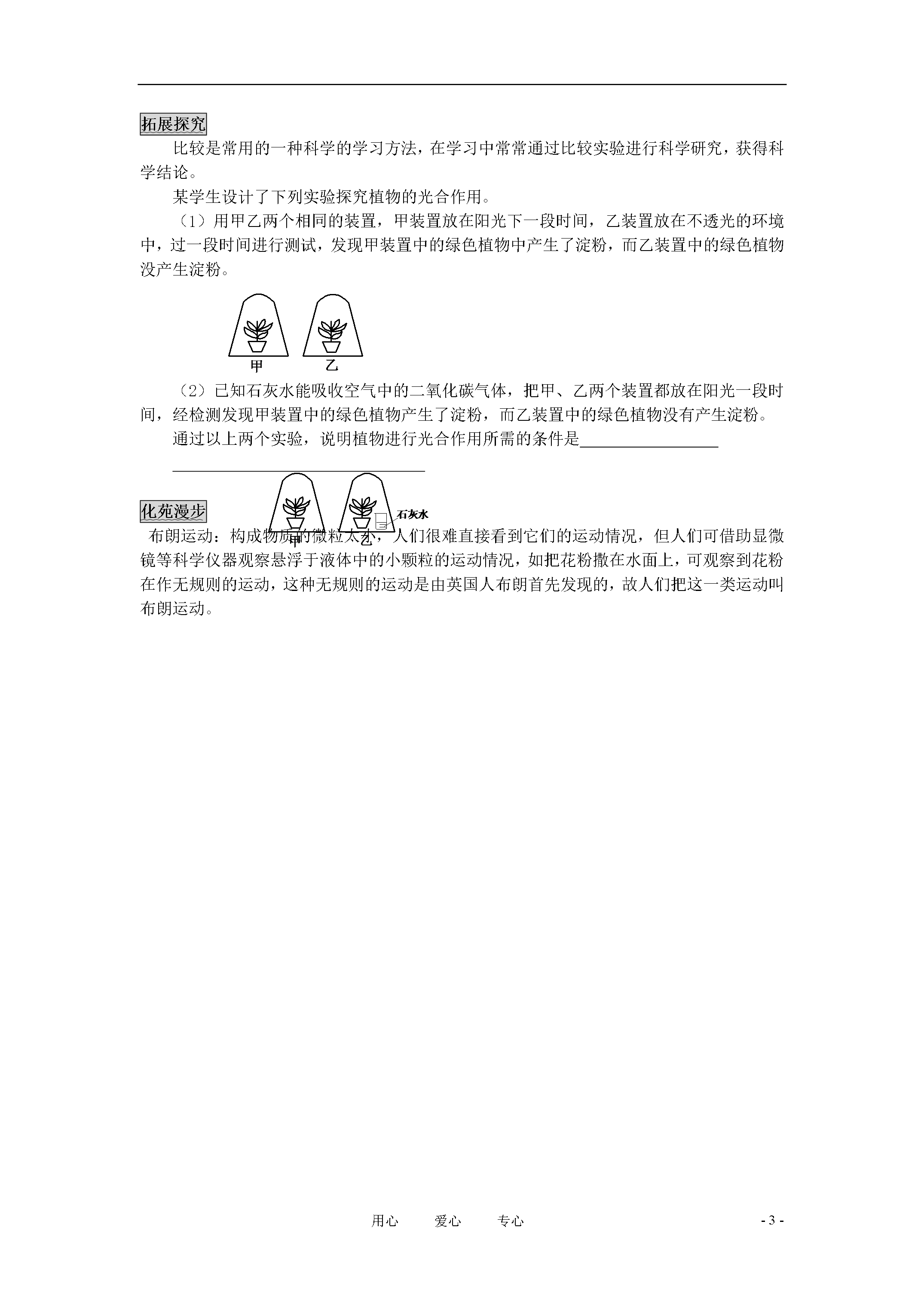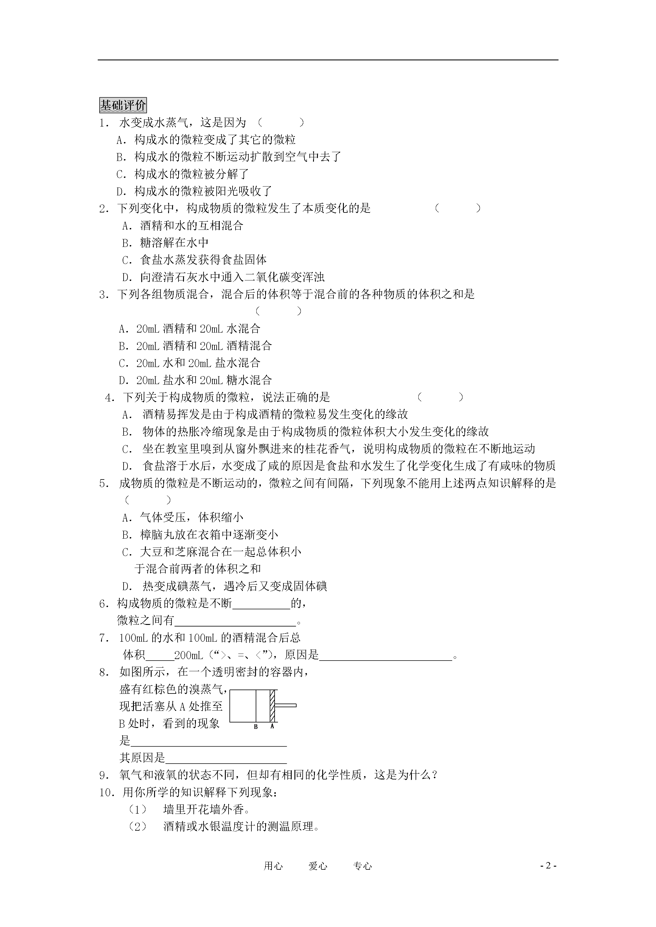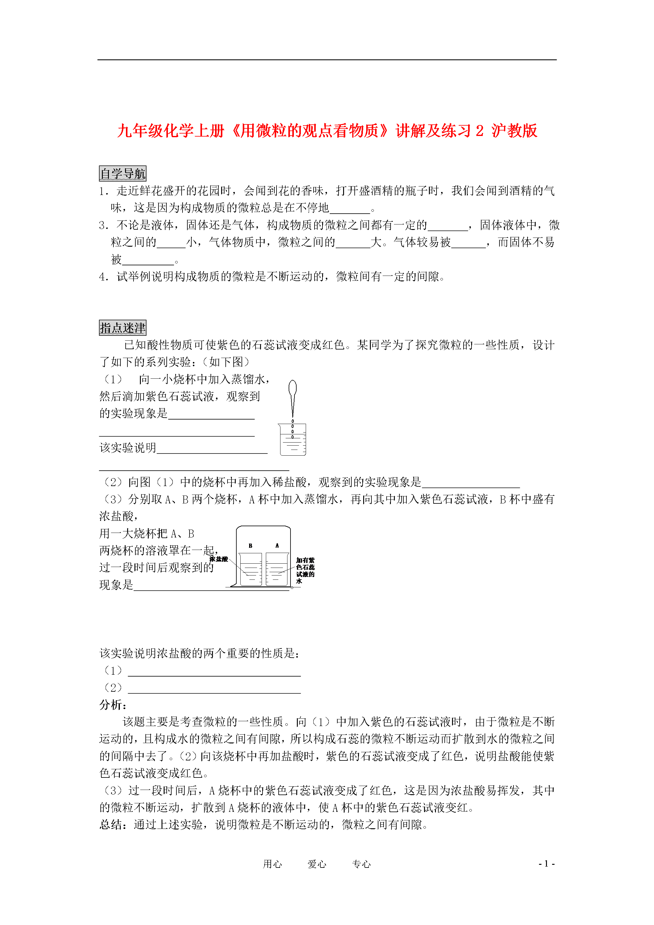 -3-用心爱心专心九年级化学上册《用微粒的观点看物质》讲解及练习2沪教版自学导航1.走近鲜花盛开的花园时,会闻到花的香味,打开盛酒精的瓶子时,我们会闻到酒精的气味,这是因为构成物质的微粒总是在不停地。3.不论是液体,固体还是气体,构成物质的微粒之间都有一定的,固体液体中,微粒之间的小,气体物质中,微粒之间的大。气体较易被,而固体不易被。4.试举例说明构成物质的微粒是不断运动的,微粒间有一定的间隙。指点迷津已知酸性物质可使紫色的石蕊试液变成红色。某同学为了探究微粒的一些性质,设计了如下的系列实验:(如下图)向一小烧杯中加入蒸馏水,然后滴加紫色石蕊试液,观察到的实验现象是该实验说明(2)向图(1)中的烧杯中再加入稀盐酸,观察到的实验现象是(3)分别取A、B两个烧杯,A杯中加入蒸馏水,再向其中加入紫色石蕊试液,B杯中盛有浓盐酸,用一大烧杯把A、B两烧杯的溶液罩在一起,过一段时间后观察到的现象是。该实验说明浓盐酸的两个重要的性质是:(1)(2)分析:该题主要是考查微粒的一些性质。向(1)中加入紫色的石蕊试液时,由于微粒是不断运动的,且构成水的微粒之间有间隙,所以构成石蕊的微粒不断运动而扩散到水的微粒之间的间隔中去了。(2)向该烧杯中再加盐酸时,紫色的石蕊试液变成了红色,说明盐酸能使紫色石蕊试液变成红色。(3)过一段时间后,A烧杯中的紫色石蕊试液变成了红色,这是因为浓盐酸易挥发,其中的微粒不断运动,扩散到A烧杯的液体中,使A杯中的紫色石蕊试液变红。总结:通过上述实验,说明微粒是不断运动的,微粒之间有间隙。基础评价水变成水蒸气,这是因为()A.构成水的微粒变成了其它的微粒B.构成水的微粒不断运动扩散到空气中去了C.构成水的微粒被分解了D.构成水的微粒被阳光吸收了2.下列变化中,构成物质的微粒发生了本质变化的是()A.酒精和水的互相混合B.糖溶解在水中C.食盐水蒸发获得食盐固体D.向澄清石灰水中通入二氧化碳变浑浊3.下列各组物质混合,混合后的体积等于混合前的各种物质的体积之和是()A.20mL酒精和20mL水混合B.20mL酒精和20mL酒精混合C.20mL水和20mL盐水混合D.20mL盐水和20mL糖水混合4.下列关于构成物质的微粒,说法正确的是()酒精易挥发是由于构成酒精的微粒易发生变化的缘故物体的热胀冷缩现象是由于构成物质的微粒体积大小发生变化的缘故坐在教室里嗅到从窗外飘进来的桂花香气,说明构成物质的微粒在不断地运动食盐溶于水后,水变成了咸的原因是食盐和水发生了化学变化生成了有咸味的物质成物质的微粒是不断运动的,微粒之间有间隔,下列现象不能用上述两点知识解释的是()A.气体受压,体积缩小B.樟脑丸放在衣箱中逐渐变小C.大豆和芝麻混合在一起总体积小于混合前两者的体积之和热变成碘蒸气,遇冷后又变成固体碘6.构成物质的微粒是不断的,微粒之间有。100mL的水和100mL的酒精混合后总体积200mL(“>、=、<”),原因是。如图所示,在一个透明密封的容器内,盛有红棕色的溴蒸气,现把活塞从A处推至B处时,看到的现象是其原因是氧气和液氧的状态不同,但却有相同的化学性质,这是为什么?10.用你所学的知识解释下列现象:墙里开花墙外香。酒精或水银温度计的测温原理。拓展探究比较是常用的一种科学的学习方法,在学习中常常通过比较实验进行科学研究,获得科学结论。某学生设计了下列实验探究植物的光合作用。(1)用甲乙两个相同的装置,甲装置放在阳光下一段时间,乙装置放在不透光的环境中,过一段时间进行测试,发现甲装置中的绿色植物中产生了淀粉,而乙装置中的绿色植物没产生淀粉。(2)已知石灰水能吸收空气中的二氧化碳气体,把甲、乙两个装置都放在阳光一段时间,经检测发现甲装置中的绿色植物产生了淀粉,而乙装置中的绿色植物没有产生淀粉。通过以上两个实验,说明植物进行光合作用所需的条件是化苑漫步布朗运动:构成物质的微粒太小,人们很难直接看到它们的运动情况,但人们可借助显微镜等科学仪器观察悬浮于液体中的小颗粒的运动情况,如把花粉撒在水面上,可观察到花粉在作无规则的运动,这种无规则的运动是由英国人布朗首先发现的,故人们把这一类运动叫布朗运动。