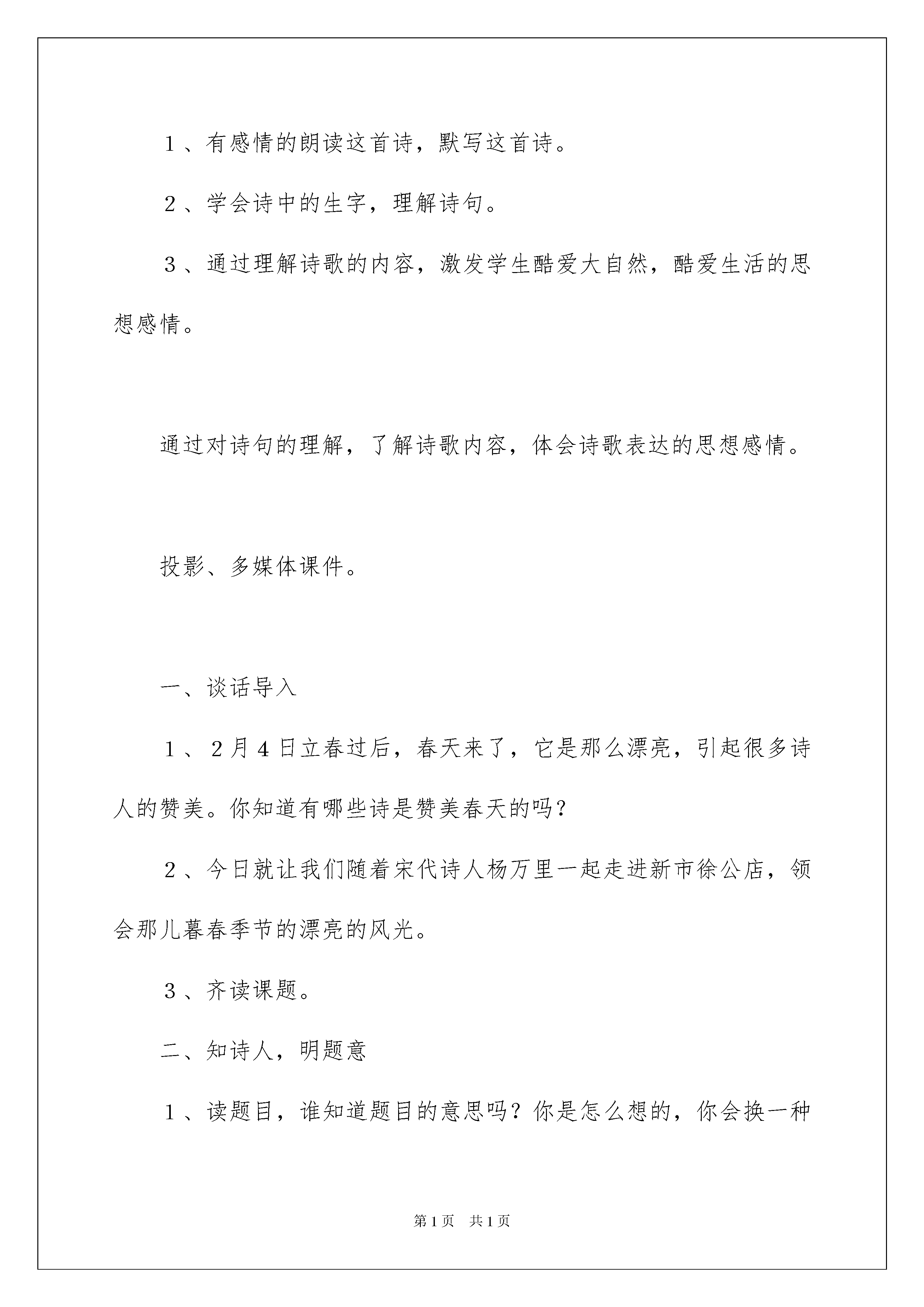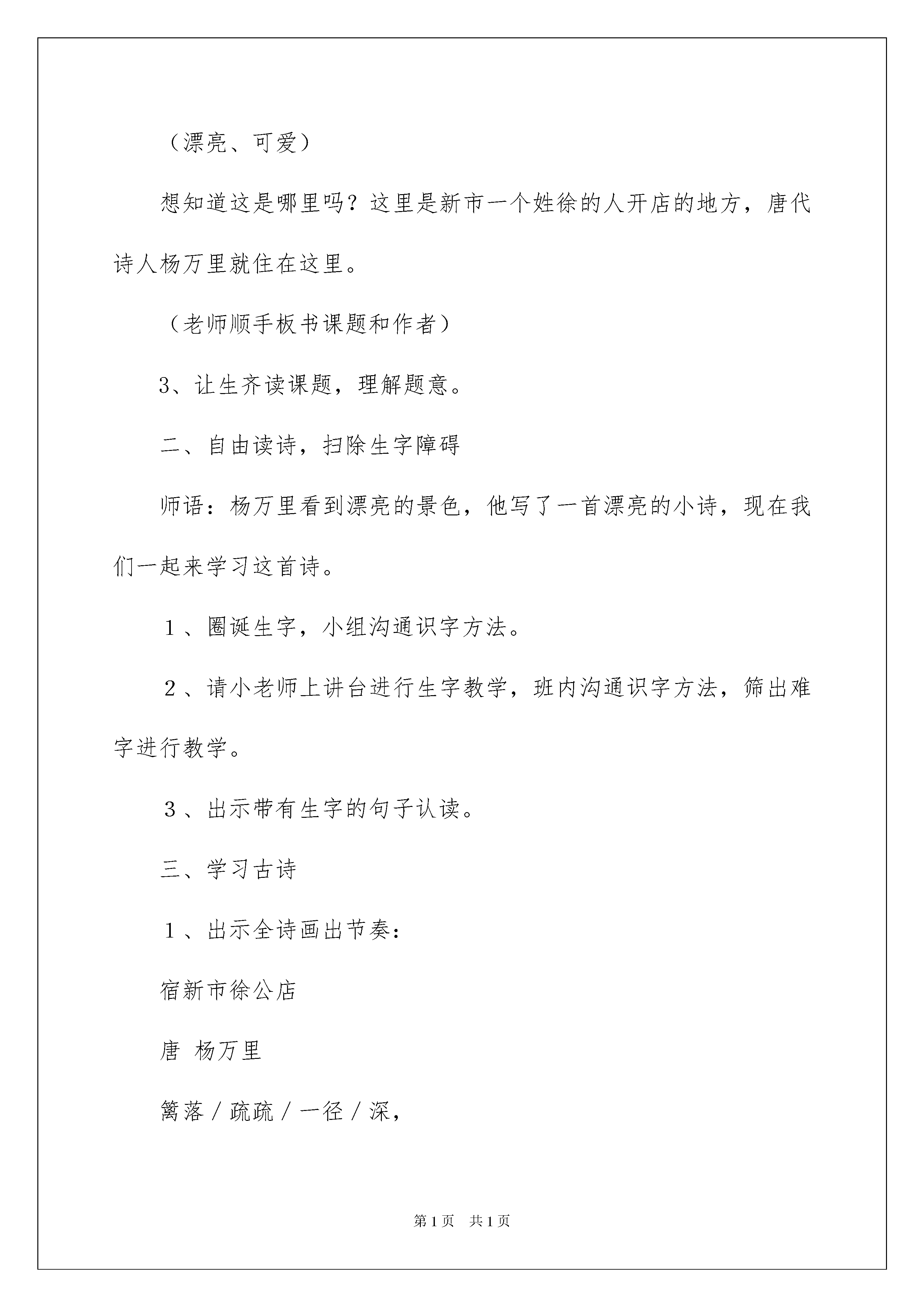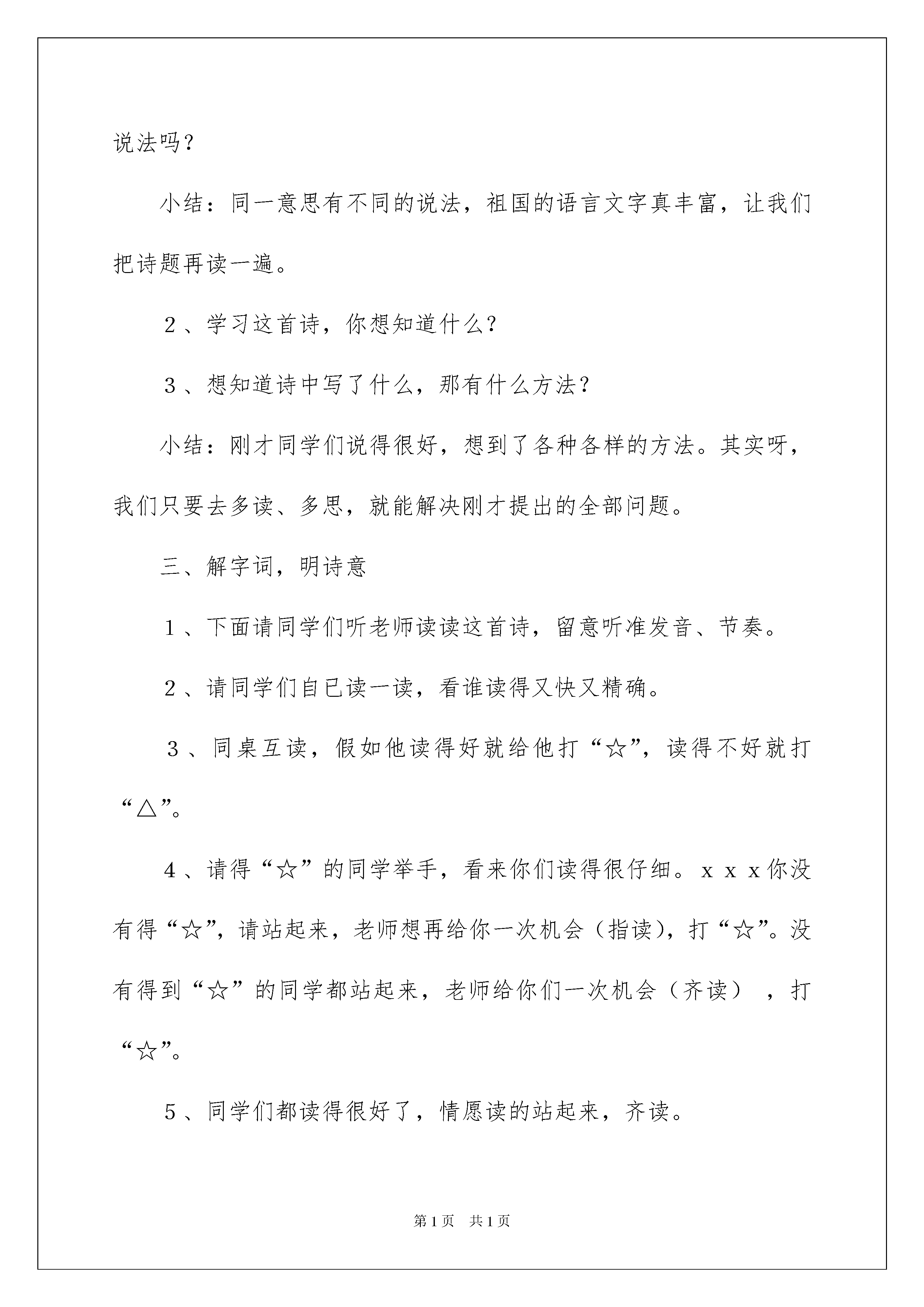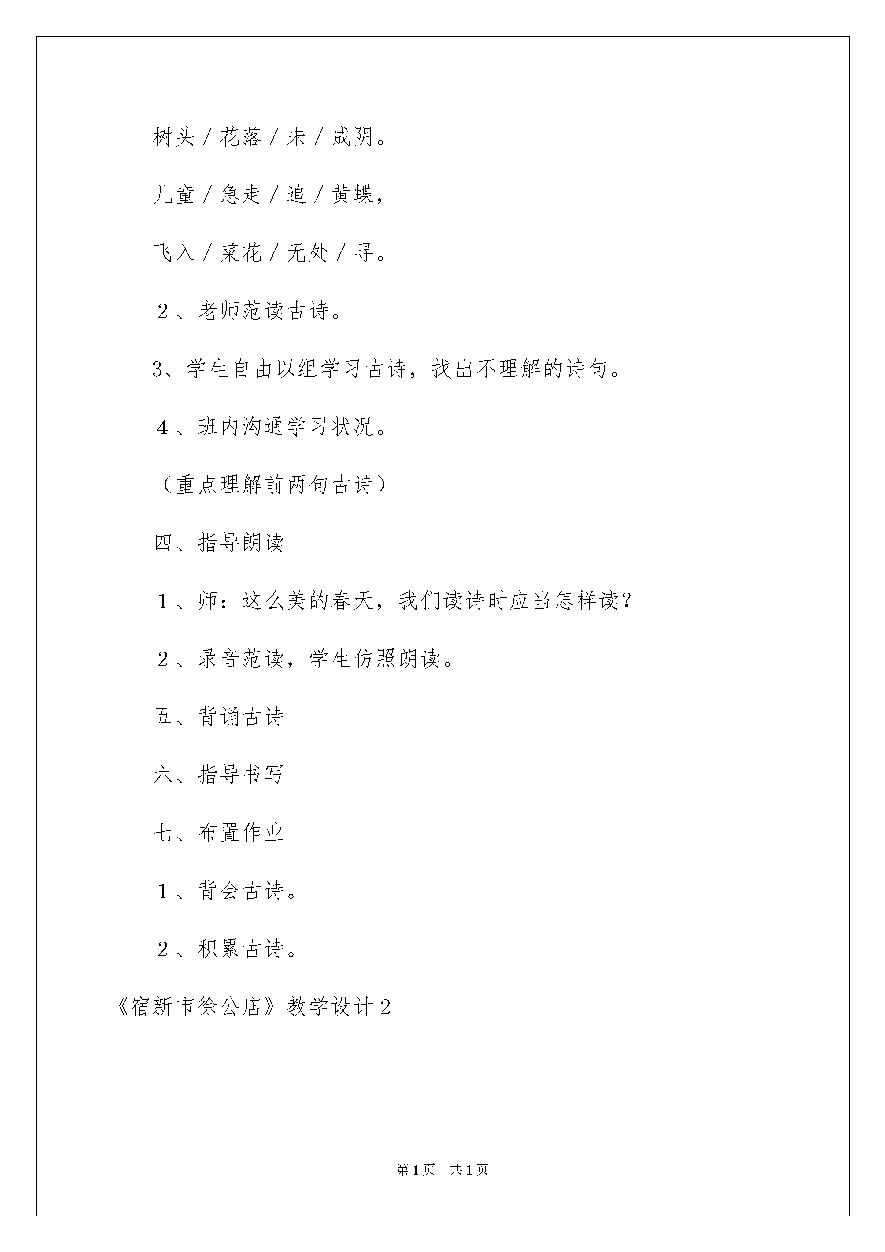 2022《宿新市徐公店》教学设计《宿新市徐公店》教学设计作为一名专为他人授业解惑的人民老师,有必要进行细致的教学设计打算工作,教学设计是连接基础理论与实践的桥梁,对于教学理论与实践的紧密结合具有沟通作用。那么写教学设计须要留意哪些问题呢?以下是我帮大家整理的《宿新市徐公店》教学设计,希望对大家有所帮助。《宿新市徐公店》教学设计11、认读5个生字,会写7个生字。2、朗读课文,背诵课文。一、以图引文1、出示幻灯图片,请大家细致视察图片,把你看到的告知大家。(小男孩、黄蝶、花、小路。)2、大家来到这里,你认为这里的景色怎样?人呢?(漂亮、可爱)想知道这是哪里吗?这里是新市一个姓徐的人开店的地方,唐代诗人杨万里就住在这里。(老师顺手板书课题和作者)3、让生齐读课题,理解题意。二、自由读诗,扫除生字障碍师语:杨万里看到漂亮的景色,他写了一首漂亮的小诗,现在我们一起来学习这首诗。1、圈诞生字,小组沟通识字方法。2、请小老师上讲台进行生字教学,班内沟通识字方法,筛出难字进行教学。3、出示带有生字的句子认读。三、学习古诗1、出示全诗画出节奏:宿新市徐公店唐杨万里篱落/疏疏/一径/深,树头/花落/未/成阴。儿童/急走/追/黄蝶,飞入/菜花/无处/寻。2、老师范读古诗。3、学生自由以组学习古诗,找出不理解的诗句。4、班内沟通学习状况。(重点理解前两句古诗)四、指导朗读1、师:这么美的春天,我们读诗时应当怎样读?2、录音范读,学生仿照朗读。五、背诵古诗六、指导书写七、布置作业1、背会古诗。2、积累古诗。《宿新市徐公店》教学设计21、有感情的朗读这首诗,默写这首诗。2、学会诗中的生字,理解诗句。3、通过理解诗歌的内容,激发学生酷爱大自然,酷爱生活的思想感情。通过对诗句的理解,了解诗歌内容,体会诗歌表达的思想感情。投影、多媒体课件。一、谈话导入1、2月4日立春过后,春天来了,它是那么漂亮,引起很多诗人的赞美。你知道有哪些诗是赞美春天的吗?2、今日就让我们随着宋代诗人杨万里一起走进新市徐公店,领会那儿暮春季节的漂亮的风光。3、齐读课题。二、知诗人,明题意1、读题目,谁知道题目的意思吗?你是怎么想的,你会换一种说法吗?小结:同一意思有不同的说法,祖国的语言文字真丰富,让我们把诗题再读一遍。2、学习这首诗,你想知道什么?3、想知道诗中写了什么,那有什么方法?小结:刚才同学们说得很好,想到了各种各样的方法。其实呀,我们只要去多读、多思,就能解决刚才提出的全部问题。三、解字词,明诗意1、下面请同学们听老师读读这首诗,留意听准发音、节奏。2、请同学们自已读一读,看谁读得又快又精确。3、同桌互读,假如他读得好就给他打“☆”,读得不好就打“△”。4、请得“☆”的同学举手,看来你们读得很仔细。xxx你没有得“☆”,请站起来,老师想再给你一次机会(指读),打“☆”。没有得到“☆”的同学都站起来,老师给你们一次机会(齐读),打“☆”。5、同学们都读得很好了,情愿读的站起来,齐读。6、你觉得这首诗也许写出了什么?下面就让我们仔细学习,以对这首诗了解得更清晰:⑴自由轻声读诗,边读边划出不懂的词或句。⑵有哪些地方你不懂?⑶同学们问得真好,这说明你们真正已做到边读边思索了,不懂的地方请别的同学帮帮忙,四人小组探讨一下。⑷同学们探讨得真热情,那么对刚才的问题,你弄懂了哪些呢?我们先来学习前二句:(齐读)①你弄懂了什么?②我们把这两句话再读一遍。读完之后,你仿佛看到了什么景物?你能把这些画下来吗?下面请同学们拿出打算好的纸和水彩笔,简洁地画一画。(指一学生的投影出示)问:你为什么这样画?⑸导:有一位画家,也把它画出来了。(出示画)你觉得这画面怎么样?篱笆立在那儿,枝头的叶子一动也不动,这画面又是多美啊!你能读出它的美、它的静吗?自读;指读;赛读;范读;齐读。7、导:突然间,那种安静被打破了,画面动了起来,请看:(出示课件)⑴你看到了什么?(指说)⑵同学们说得真好,下面就请同学们再去读读后两句诗,依据你刚才看到的画面完成这个填空题:()的儿童,()的蝴蝶,()的菜花。⑶你还有什么不理解吗?(重点指导理解“急走”)⑷你会说说这两句的意思了吗?(指说。)⑸让我们再来看一看这好玩的景象。(出示课件)说→读。⑹你能通过朗读来读出它的好玩吗?自读→指读(评价)→齐读。小结:诗人采纳动静结合的方法,向我们展示了新市徐公店漂亮动人的田园风光,让我们把这首诗齐读一遍。四、入诗境,悟诗情1、这么美、这么好玩的画面你们想亲眼看一看吗?下面请同学们微微闭上眼,静静听老师读,在脑海申出现画面,跟老师进入这如诗如画的新市徐公店。(配乐范读)2、你看到了什么呢