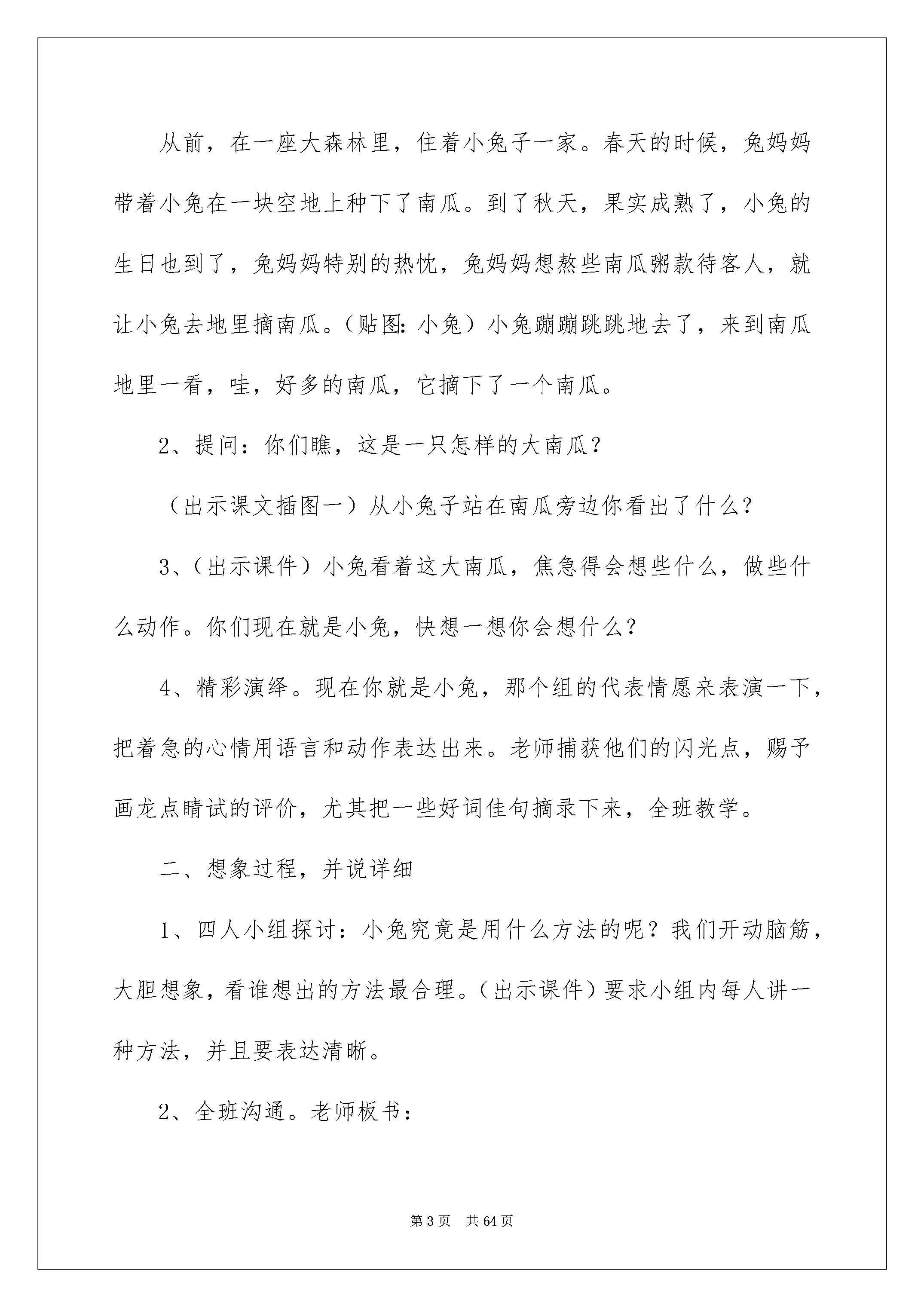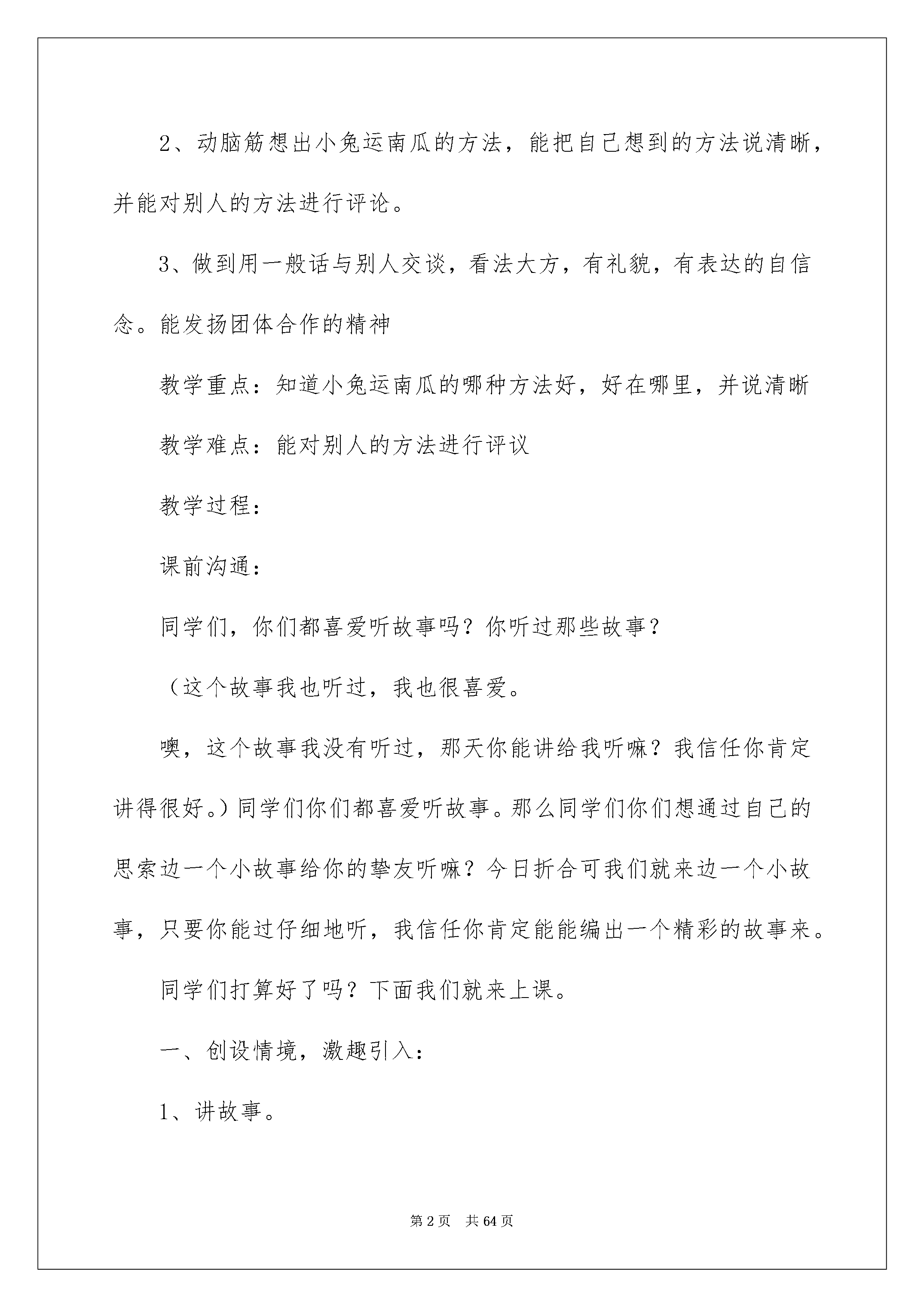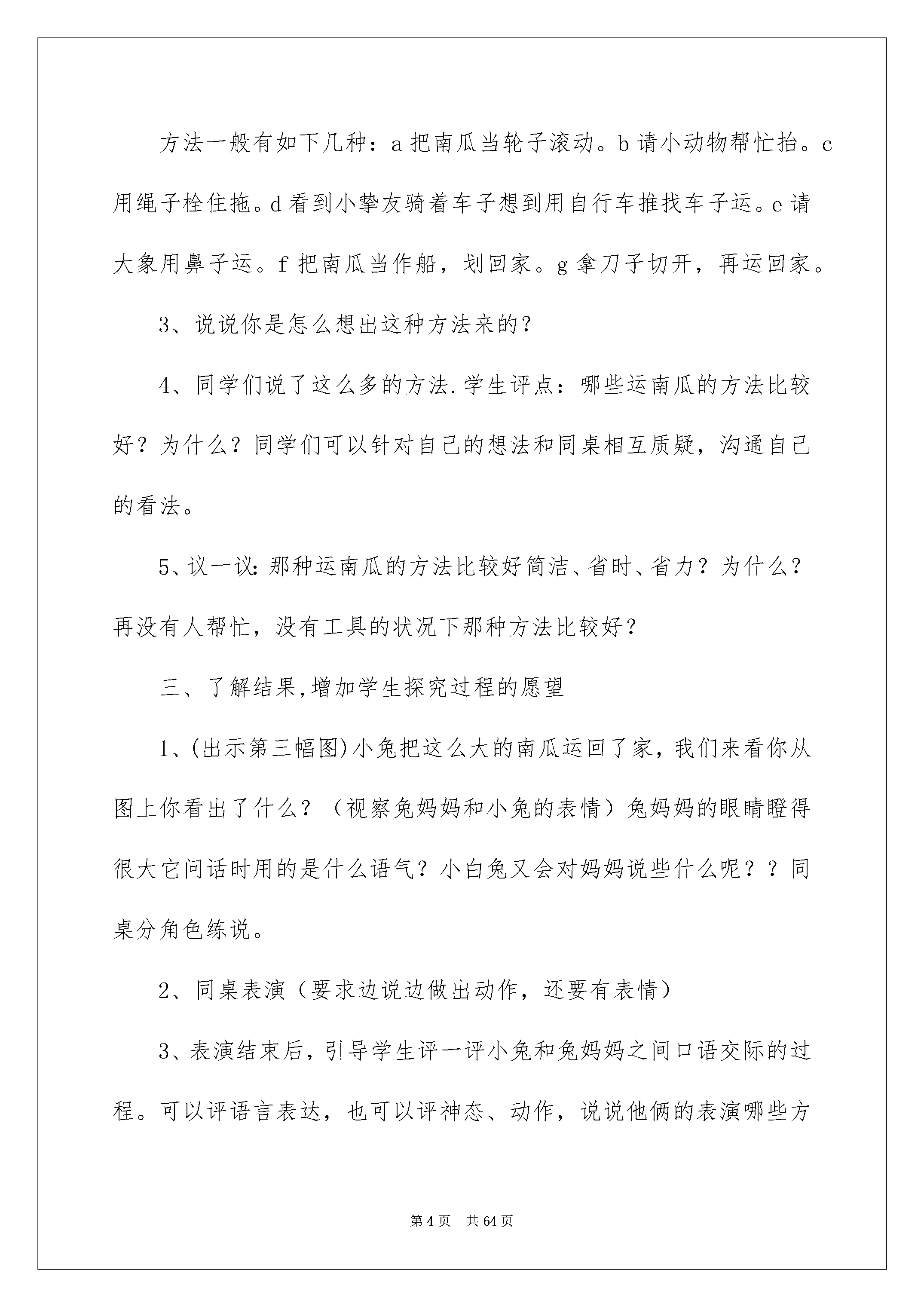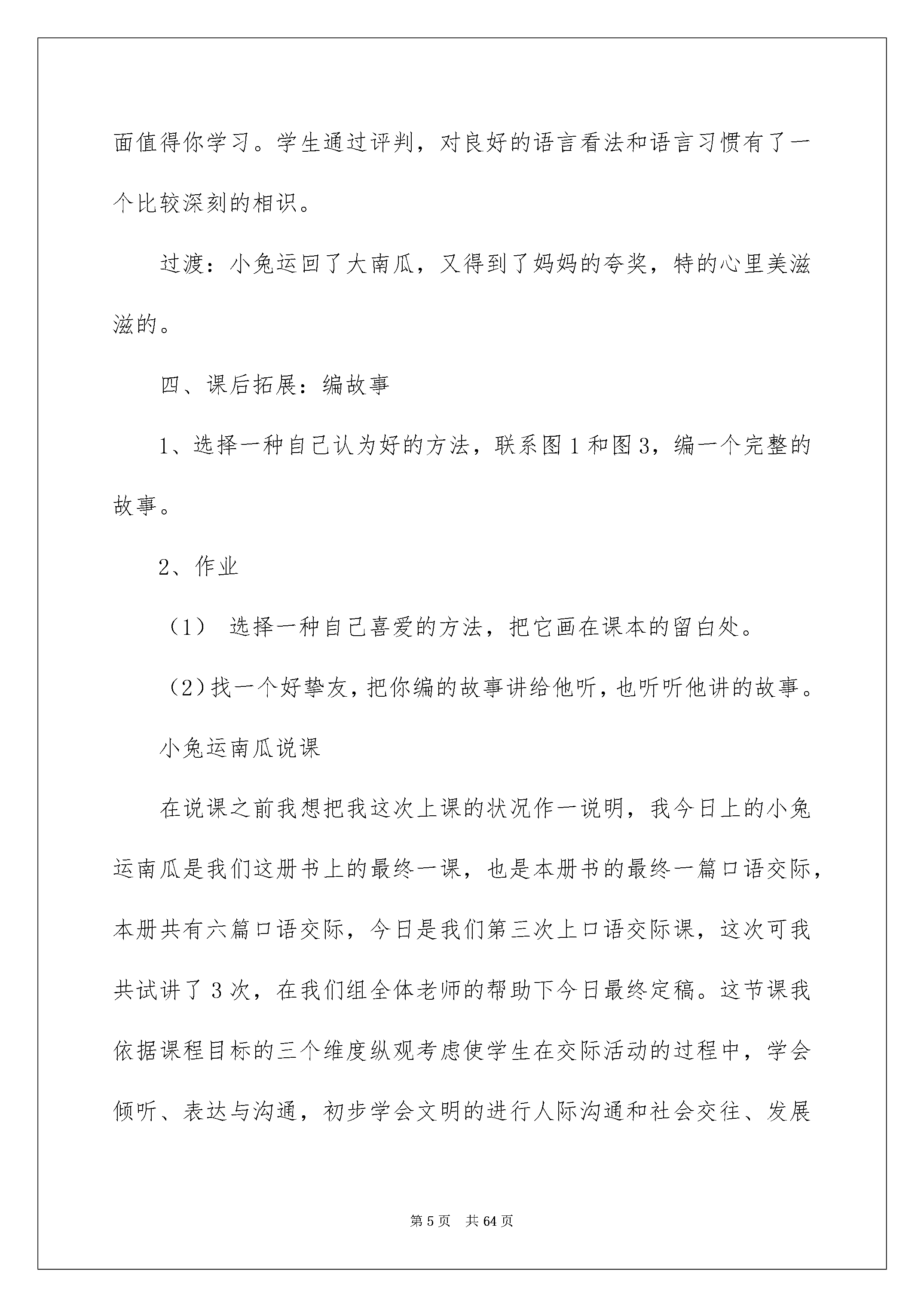 2022《小兔运南瓜》教学设计《小兔运南瓜》教学设计作为一名人民老师,经常要依据教学须要编写教学设计,教学设计要遵循教学过程的基本规律,选择教学目标,以解决教什么的问题。那么什么样的教学设计才是好的呢?以下是我为大家整理的《小兔运南瓜》教学设计,希望能够帮助到大家。《小兔运南瓜》教学设计1教材分析:本课有三幅图。第一幅图,小兔站在南瓜的边望着大南瓜想:怎么运走呢?第三幅图,南瓜已经运到家,土妈妈惊奇的文小兔是怎么运回来的,小兔安静地告知了妈妈命。小兔原委是怎样运南瓜,是其次幅图,这幅图是一个空缺,留给学生想象的空间。为学生创设广袤的思维空间。说出小兔运南瓜的方法,指导什么方法好事本课的重点。教学目标:1、通过自学说一说一、三幅图的内容,通过想象补充其次幅图的画面。2、动脑筋想出小兔运南瓜的方法,能把自己想到的方法说清晰,并能对别人的方法进行评论。3、做到用一般话与别人交谈,看法大方,有礼貌,有表达的自信念。能发扬团体合作的精神教学重点:知道小兔运南瓜的哪种方法好,好在哪里,并说清晰教学难点:能对别人的方法进行评议教学过程:课前沟通:同学们,你们都喜爱听故事吗?你听过那些故事?(这个故事我也听过,我也很喜爱。噢,这个故事我没有听过,那天你能讲给我听嘛?我信任你肯定讲得很好。)同学们你们都喜爱听故事。那么同学们你们想通过自己的思索边一个小故事给你的挚友听嘛?今日折合可我们就来边一个小故事,只要你能过仔细地听,我信任你肯定能能编出一个精彩的故事来。同学们打算好了吗?下面我们就来上课。一、创设情境,激趣引入:1、讲故事。从前,在一座大森林里,住着小兔子一家。春天的时候,兔妈妈带着小兔在一块空地上种下了南瓜。到了秋天,果实成熟了,小兔的生日也到了,兔妈妈特别的热忱,兔妈妈想熬些南瓜粥款待客人,就让小兔去地里摘南瓜。(贴图:小兔)小兔蹦蹦跳跳地去了,来到南瓜地里一看,哇,好多的南瓜,它摘下了一个南瓜。2、提问:你们瞧,这是一只怎样的大南瓜?(出示课文插图一)从小兔子站在南瓜旁边你看出了什么?3、(出示课件)小兔看着这大南瓜,焦急得会想些什么,做些什么动作。你们现在就是小兔,快想一想你会想什么?4、精彩演绎。现在你就是小兔,那个组的代表情愿来表演一下,把着急的心情用语言和动作表达出来。老师捕获他们的闪光点,赐予画龙点睛试的评价,尤其把一些好词佳句摘录下来,全班教学。二、想象过程,并说详细1、四人小组探讨:小兔究竟是用什么方法的呢?我们开动脑筋,大胆想象,看谁想出的方法最合理。(出示课件)要求小组内每人讲一种方法,并且要表达清晰。2、全班沟通。老师板书:方法一般有如下几种:a把南瓜当轮子滚动。b请小动物帮忙抬。c用绳子栓住拖。d看到小挚友骑着车子想到用自行车推找车子运。e请大象用鼻子运。f把南瓜当作船,划回家。g拿刀子切开,再运回家。3、说说你是怎么想出这种方法来的?4、同学们说了这么多的方法.学生评点:哪些运南瓜的方法比较好?为什么?同学们可以针对自己的想法和同桌相互质疑,沟通自己的看法。5、议一议:那种运南瓜的方法比较好简洁、省时、省力?为什么?再没有人帮忙,没有工具的状况下那种方法比较好?三、了解结果,增加学生探究过程的愿望1、(出示第三幅图)小兔把这么大的南瓜运回了家,我们来看你从图上你看出了什么?(视察兔妈妈和小兔的表情)兔妈妈的眼睛瞪得很大它问话时用的是什么语气?小白兔又会对妈妈说些什么呢??同桌分角色练说。2、同桌表演(要求边说边做出动作,还要有表情)3、表演结束后,引导学生评一评小兔和兔妈妈之间口语交际的过程。可以评语言表达,也可以评神态、动作,说说他俩的表演哪些方面值得你学习。学生通过评判,对良好的语言看法和语言习惯有了一个比较深刻的相识。过渡:小兔运回了大南瓜,又得到了妈妈的夸奖,特的心里美滋滋的。四、课后拓展:编故事1、选择一种自己认为好的方法,联系图1和图3,编一个完整的故事。2、作业(1)选择一种自己喜爱的方法,把它画在课本的留白处。(2)找一个好挚友,把你编的故事讲给他听,也听听他讲的故事。小兔运南瓜说课在说课之前我想把我这次上课的状况作一说明,我今日上的小兔运南瓜是我们这册书上的最终一课,也是本册书的最终一篇口语交际,本册共有六篇口语交际,今日是我们第三次上口语交际课,这次可我共试讲了3次,在我们组全体老师的帮助下今日最终定稿。这节课我依据课程目标的三个维度纵观考虑使学生在交际活动的过程中,学会倾听、表达与沟通,初步学会文明的进行人际沟通和社会交往、发展合作的精神以及第一学段提出的“与人家谈,看法自然大方,有礼貌,它要求学生与别人沟通是要姿态自然,面带微笑
