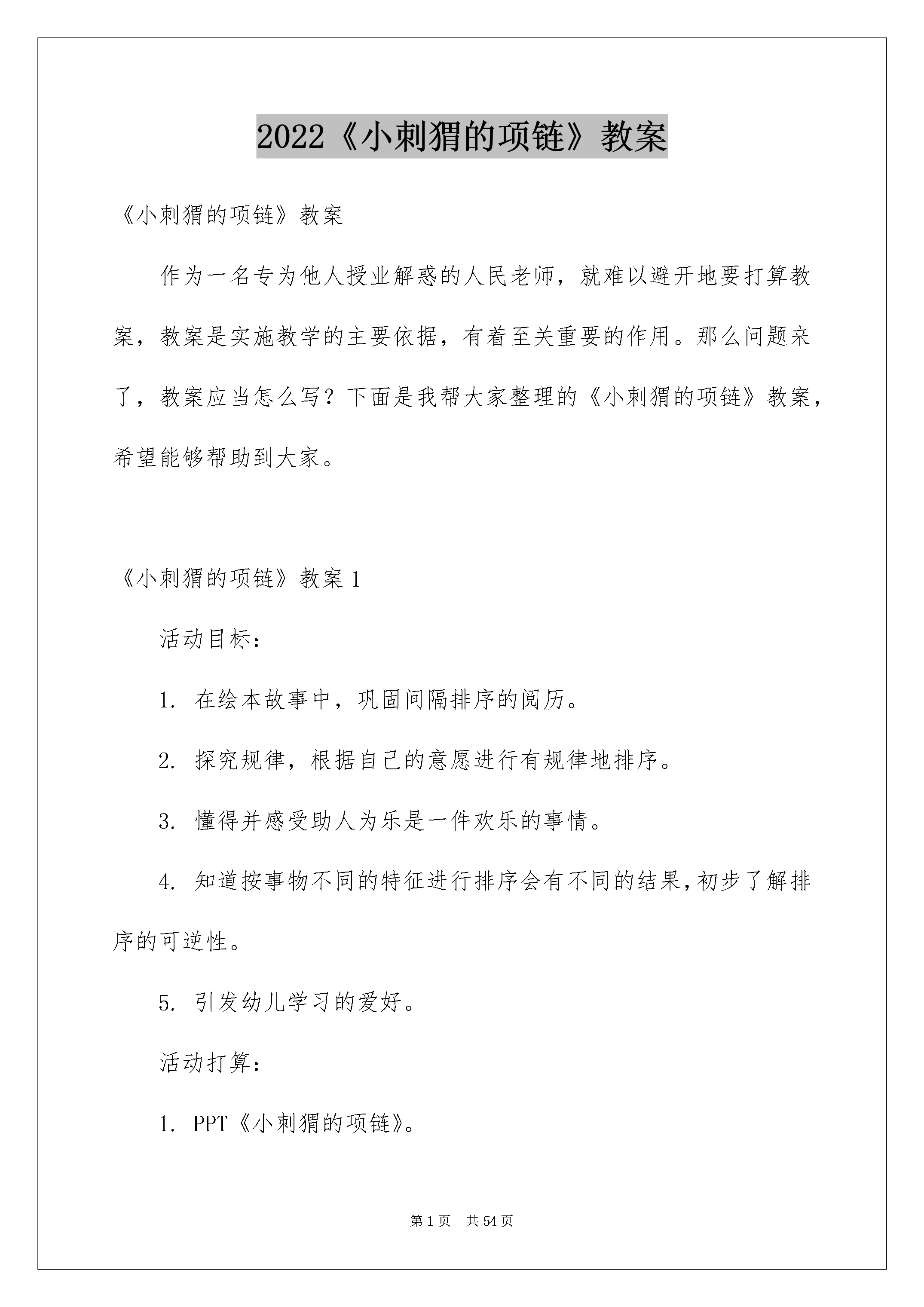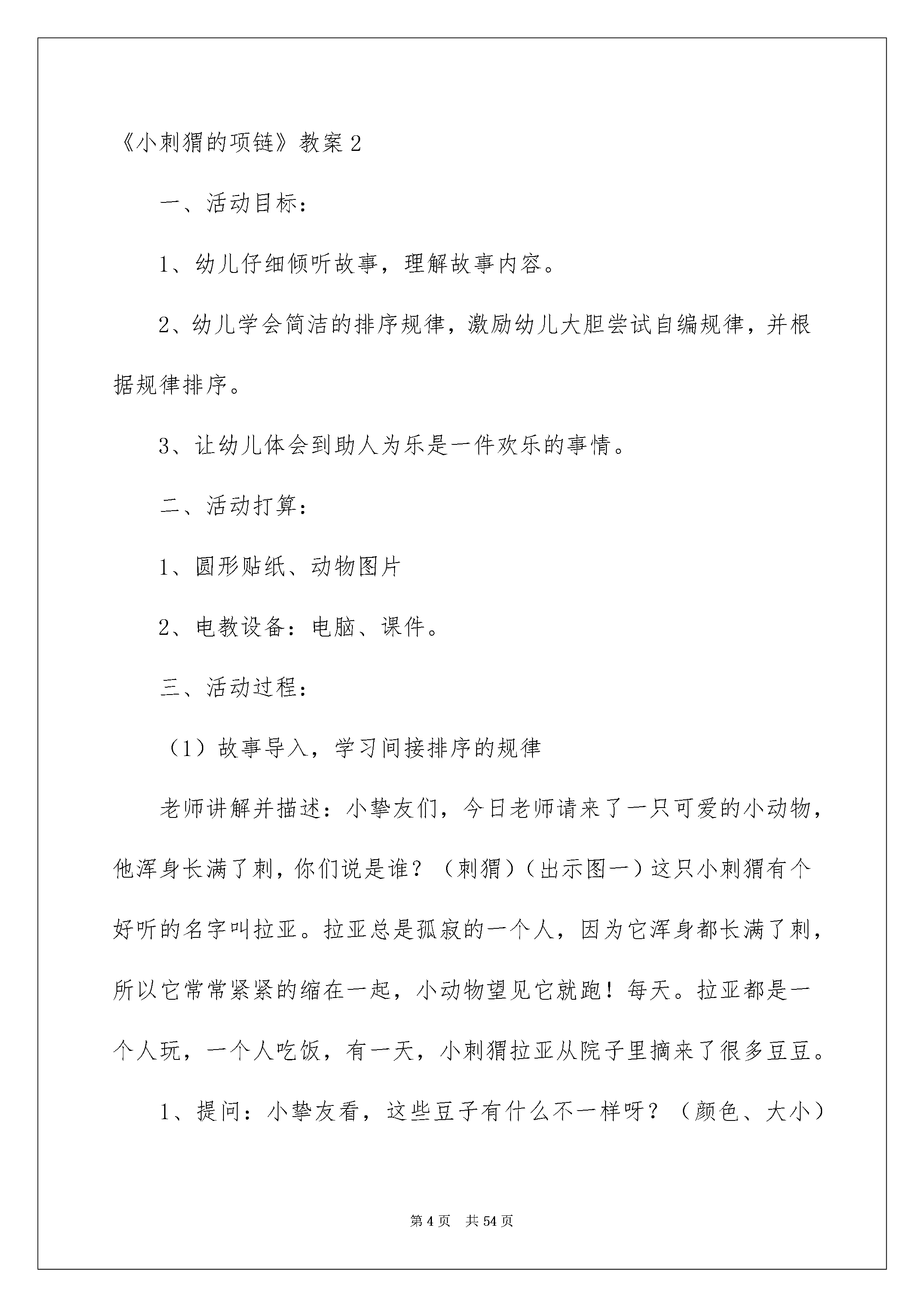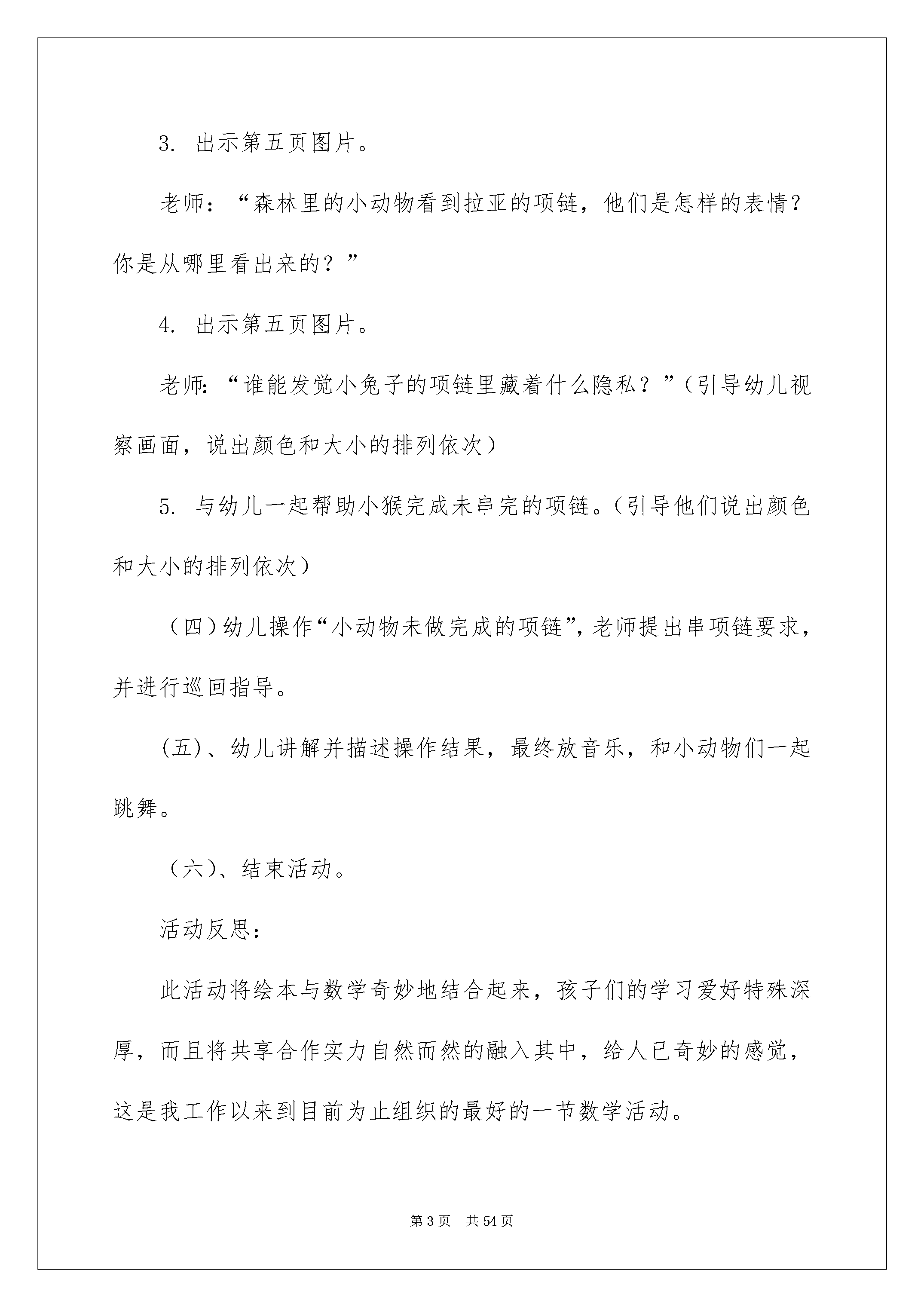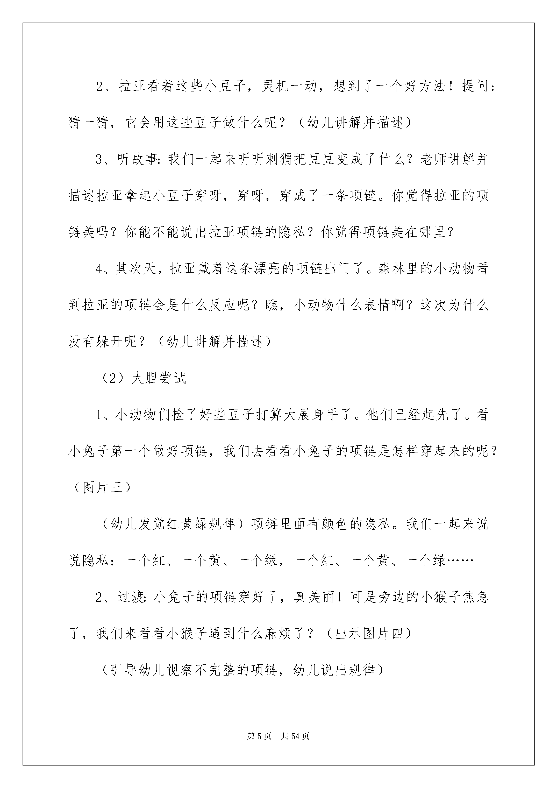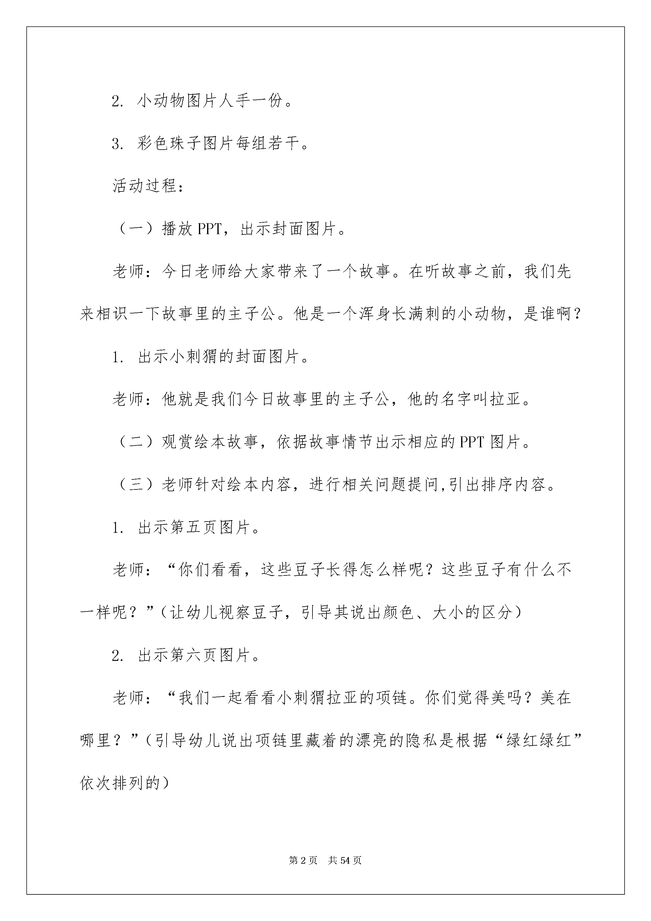 2022《小刺猬的项链》教案《小刺猬的项链》教案作为一名专为他人授业解惑的人民老师,就难以避开地要打算教案,教案是实施教学的主要依据,有着至关重要的作用。那么问题来了,教案应当怎么写?下面是我帮大家整理的《小刺猬的项链》教案,希望能够帮助到大家。《小刺猬的项链》教案1活动目标:1.在绘本故事中,巩固间隔排序的阅历。2.探究规律,根据自己的意愿进行有规律地排序。3.懂得并感受助人为乐是一件欢乐的事情。4.知道按事物不同的特征进行排序会有不同的结果,初步了解排序的可逆性。5.引发幼儿学习的爱好。活动打算:1.PPT《小刺猬的项链》。2.小动物图片人手一份。3.彩色珠子图片每组若干。活动过程:(一)播放PPT,出示封面图片。老师:今日老师给大家带来了一个故事。在听故事之前,我们先来相识一下故事里的主子公。他是一个浑身长满刺的小动物,是谁啊?1.出示小刺猬的封面图片。老师:他就是我们今日故事里的主子公,他的名字叫拉亚。(二)观赏绘本故事,依据故事情节出示相应的PPT图片。(三)老师针对绘本内容,进行相关问题提问,引出排序内容。1.出示第五页图片。老师:“你们看看,这些豆子长得怎么样呢?这些豆子有什么不一样呢?”(让幼儿视察豆子,引导其说出颜色、大小的区分)2.出示第六页图片。老师:“我们一起看看小刺猬拉亚的项链。你们觉得美吗?美在哪里?”(引导幼儿说出项链里藏着的漂亮的隐私是根据“绿红绿红”依次排列的)3.出示第五页图片。老师:“森林里的小动物看到拉亚的项链,他们是怎样的表情?你是从哪里看出来的?”4.出示第五页图片。老师:“谁能发觉小兔子的项链里藏着什么隐私?”(引导幼儿视察画面,说出颜色和大小的排列依次)5.与幼儿一起帮助小猴完成未串完的项链。(引导他们说出颜色和大小的排列依次)(四)幼儿操作“小动物未做完成的项链”,老师提出串项链要求,并进行巡回指导。(五)、幼儿讲解并描述操作结果,最终放音乐,和小动物们一起跳舞。(六)、结束活动。活动反思:此活动将绘本与数学奇妙地结合起来,孩子们的学习爱好特殊深厚,而且将共享合作实力自然而然的融入其中,给人已奇妙的感觉,这是我工作以来到目前为止组织的最好的一节数学活动。《小刺猬的项链》教案2一、活动目标:1、幼儿仔细倾听故事,理解故事内容。2、幼儿学会简洁的排序规律,激励幼儿大胆尝试自编规律,并根据规律排序。3、让幼儿体会到助人为乐是一件欢乐的事情。二、活动打算:1、圆形贴纸、动物图片2、电教设备:电脑、课件。三、活动过程:(1)故事导入,学习间接排序的规律老师讲解并描述:小挚友们,今日老师请来了一只可爱的小动物,他浑身长满了刺,你们说是谁?(刺猬)(出示图一)这只小刺猬有个好听的名字叫拉亚。拉亚总是孤寂的一个人,因为它浑身都长满了刺,所以它常常紧紧的缩在一起,小动物望见它就跑!每天。拉亚都是一个人玩,一个人吃饭,有一天,小刺猬拉亚从院子里摘来了很多豆豆。1、提问:小挚友看,这些豆子有什么不一样呀?(颜色、大小)2、拉亚看着这些小豆子,灵机一动,想到了一个好方法!提问:猜一猜,它会用这些豆子做什么呢?(幼儿讲解并描述)3、听故事:我们一起来听听刺猬把豆豆变成了什么?老师讲解并描述拉亚拿起小豆子穿呀,穿呀,穿成了一条项链。你觉得拉亚的项链美吗?你能不能说出拉亚项链的隐私?你觉得项链美在哪里?4、其次天,拉亚戴着这条漂亮的项链出门了。森林里的小动物看到拉亚的项链会是什么反应呢?瞧,小动物什么表情啊?这次为什么没有躲开呢?(幼儿讲解并描述)(2)大胆尝试1、小动物们捡了好些豆子打算大展身手了。他们已经起先了。看小兔子第一个做好项链,我们去看看小兔子的项链是怎样穿起来的呢?(图片三)(幼儿发觉红黄绿规律)项链里面有颜色的隐私。我们一起来说说隐私:一个红、一个黄、一个绿,一个红、一个黄、一个绿……2、过渡:小兔子的项链穿好了,真美丽!可是旁边的小猴子焦急了,我们来看看小猴子遇到什么麻烦了?(出示图片四)(引导幼儿视察不完整的项链,幼儿说出规律)3、老师这儿也帮小挚友打算了一些串项链用的红、黄、绿豆豆,你们能根据规律,帮小猴子穿好项链吗?小结:小挚友可真厉害,一起举起来给老师看看好吗?真的每个小挚友串的项链都和它的一样诶!小猴子太快乐了,他感谢你们。三、幼儿操作1、小挚友,先想看,你打算用什么样的规律帮小动物做项链?小挚友还有什么不同的排放规律吗?2、幼儿操作,老师巡回指导。(先请一个小挚友说说自己的排放规律,出示在黑板上,再说说有什么不同的规律)四、情感升华,体验互帮互助的欢乐小鸭子在大家的帮助下有了一条美丽的项链,你帮助了他,你欢乐吗?华蜜吗?