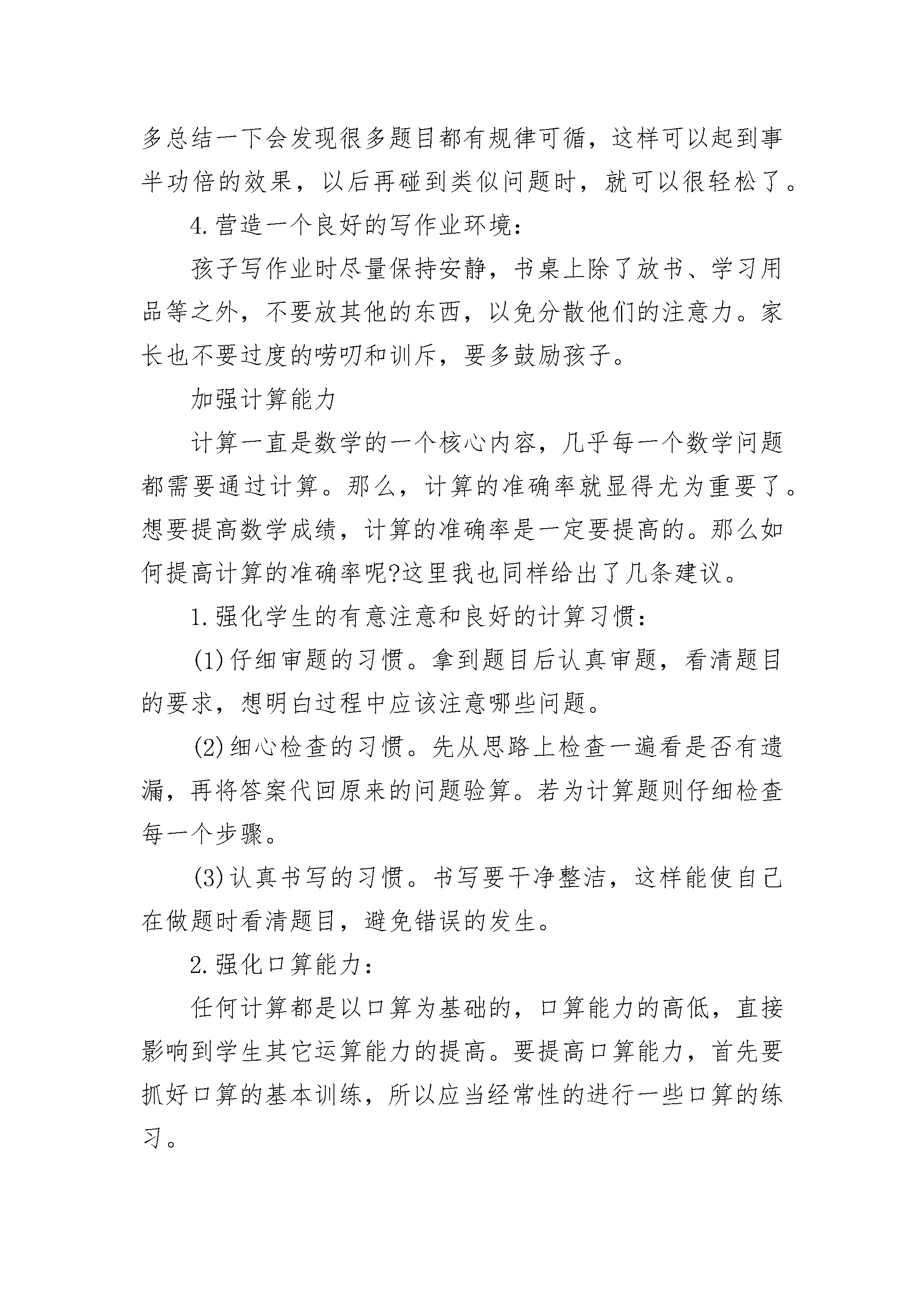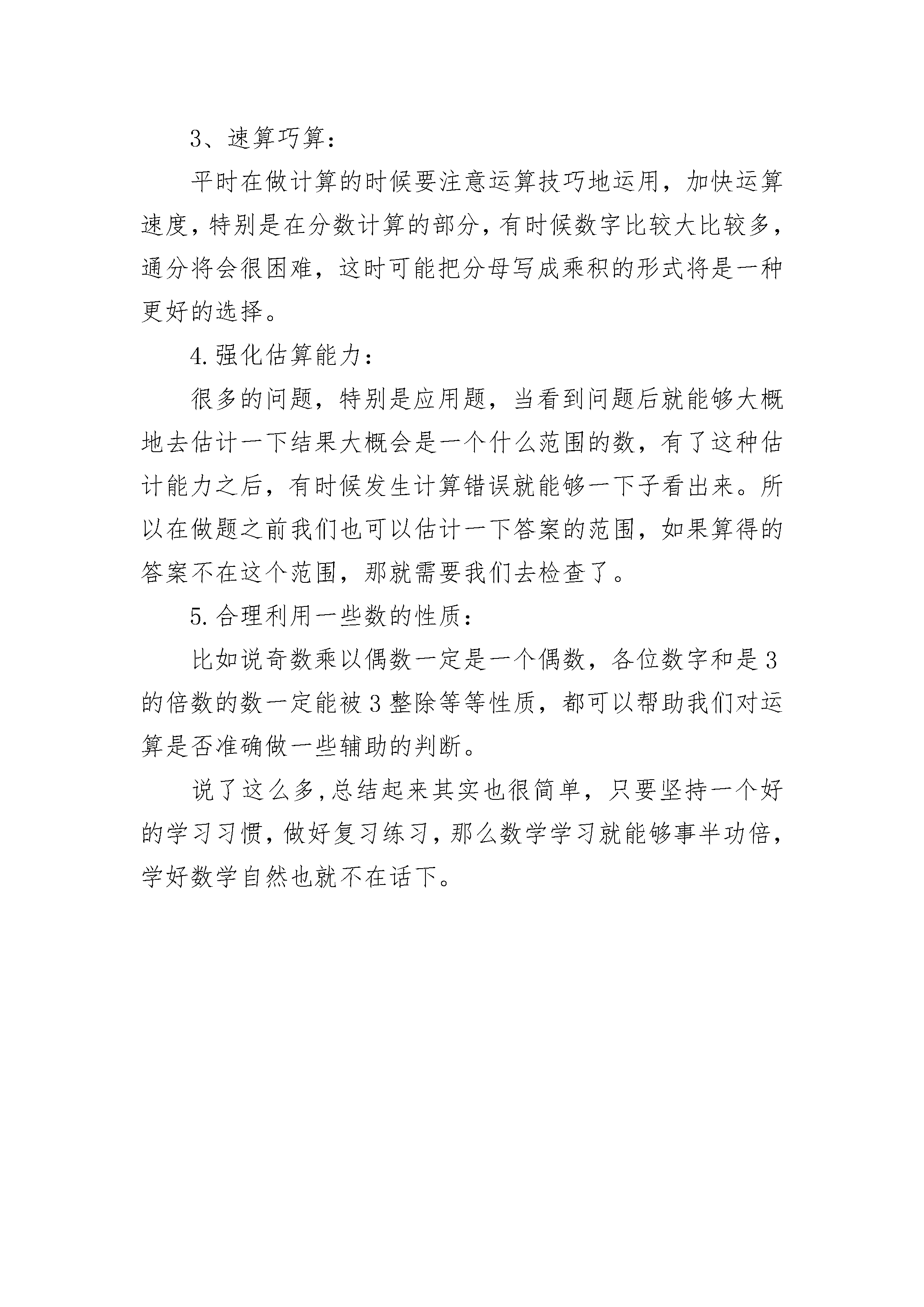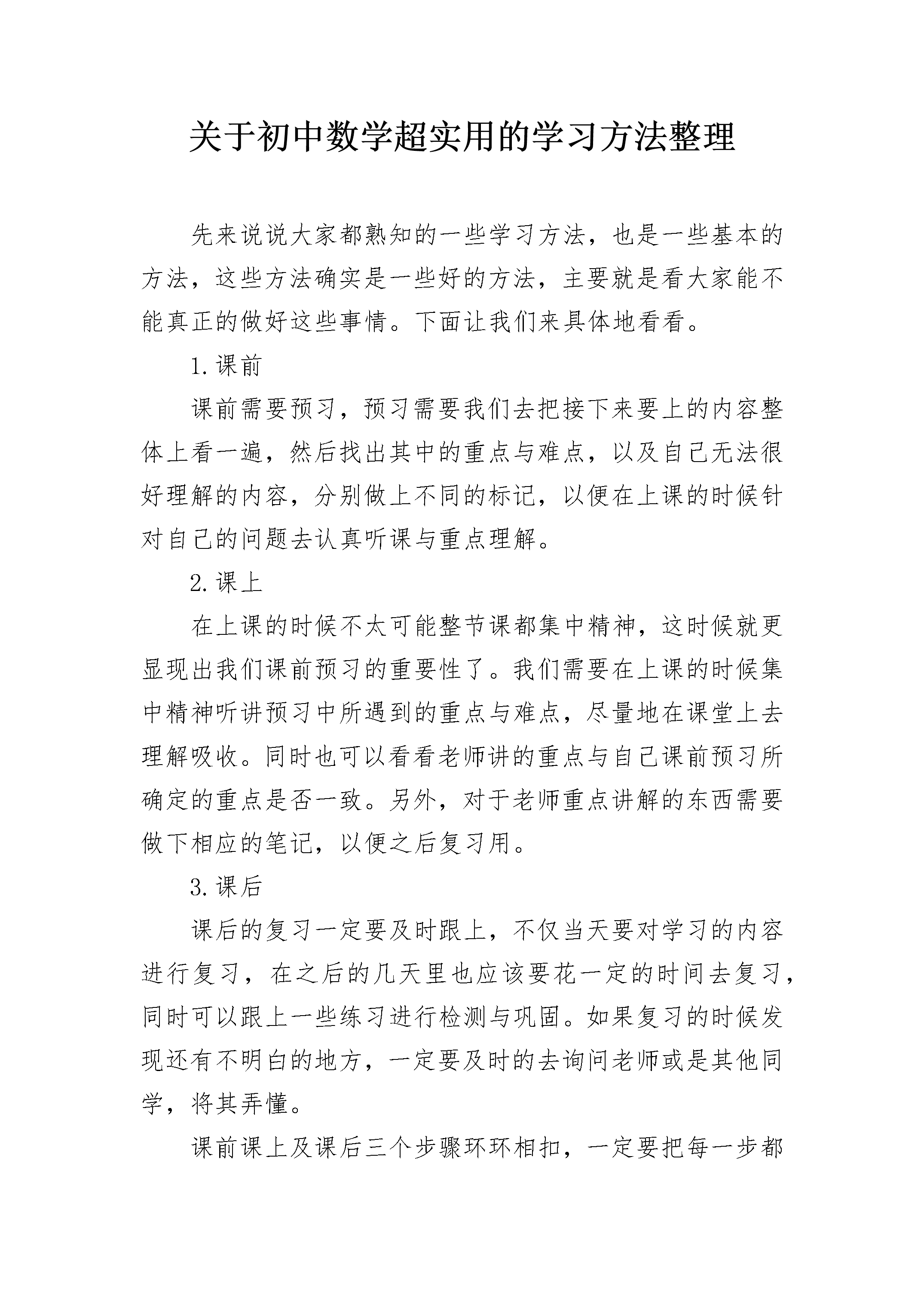 关于初中数学超实用的学习方法整理先来说说大家都熟知的一些学习方法,也是一些基本的方法,这些方法确实是一些好的方法,主要就是看大家能不能真正的做好这些事情。下面让我们来具体地看看。1.课前课前需要预习,预习需要我们去把接下来要上的内容整体上看一遍,然后找出其中的重点与难点,以及自己无法很好理解的内容,分别做上不同的标记,以便在上课的时候针对自己的问题去认真听课与重点理解。2.课上在上课的时候不太可能整节课都集中精神,这时候就更显现出我们课前预习的重要性了。我们需要在上课的时候集中精神听讲预习中所遇到的重点与难点,尽量地在课堂上去理解吸收。同时也可以看看老师讲的重点与自己课前预习所确定的重点是否一致。另外,对于老师重点讲解的东西需要做下相应的笔记,以便之后复习用。3.课后课后的复习一定要及时跟上,不仅当天要对学习的内容进行复习,在之后的几天里也应该要花一定的时间去复习,同时可以跟上一些练习进行检测与巩固。如果复习的时候发现还有不明白的地方,一定要及时的去询问老师或是其他同学,将其弄懂。课前课上及课后三个步骤环环相扣,一定要把每一步都做到位。提高作业效率现在很多学生以及家长都反应说作业太多,来不及或是没有时间去完成作业,导致学习成绩不佳。但是我们应该要想一想,我们大家的时间都是一样多的,而大家的作业也是一样多的,为什么有的人能够完成,而有的人不能够完成呢。这里就要说到学习的效率了,是因为一种不好的学习习惯,导致了做作业的效率不高。那么我们应该如何去提高做作业的效率呢?下面我给出了几个建议,供大家参考一下。1.要有端正的写作业的态度:从思想上要认真对待,如果养成懒散的习惯了,以后问题就会更多,今日不努力,明日就会失去更多,再要改善起来,就更难了。因为一个好习惯的养成是要下决心去坚持的,虽然由于以前的习惯不好或者遗留问题太多导致在坚持的过程中会容易产生抵触的情绪,甚至有时还容易放弃,但是要知道,一旦好习惯养成之后,原来所经常遇到的问题就会越来越少,成绩也自然提高了起来。2.注意力一定要集中:不要在写作业的时候干其他的事或想其他事,一心不能二用。尽快地把作业做完了才能够去做别的事情。3.要学会总结:如果在看到题目后能很快反映出这题目所需要的知识点,那么做题速度就会提高,在做题之后也要总结一下思路。多总结一下会发现很多题目都有规律可循,这样可以起到事半功倍的效果,以后再碰到类似问题时,就可以很轻松了。4.营造一个良好的写作业环境:孩子写作业时尽量保持安静,书桌上除了放书、学习用品等之外,不要放其他的东西,以免分散他们的注意力。家长也不要过度的唠叨和训斥,要多鼓励孩子。加强计算能力计算一直是数学的一个核心内容,几乎每一个数学问题都需要通过计算。那么,计算的准确率就显得尤为重要了。想要提高数学成绩,计算的准确率是一定要提高的。那么如何提高计算的准确率呢?这里我也同样给出了几条建议。1.强化学生的有意注意和良好的计算习惯:(1)仔细审题的习惯。拿到题目后认真审题,看清题目的要求,想明白过程中应该注意哪些问题。(2)细心检查的习惯。先从思路上检查一遍看是否有遗漏,再将答案代回原来的问题验算。若为计算题则仔细检查每一个步骤。(3)认真书写的习惯。书写要干净整洁,这样能使自己在做题时看清题目,避免错误的发生。2.强化口算能力:任何计算都是以口算为基础的,口算能力的高低,直接影响到学生其它运算能力的提高。要提高口算能力,首先要抓好口算的基本训练,所以应当经常性的进行一些口算的练习。3、速算巧算:平时在做计算的时候要注意运算技巧地运用,加快运算速度,特别是在分数计算的部分,有时候数字比较大比较多,通分将会很困难,这时可能把分母写成乘积的形式将是一种更好的选择。4.强化估算能力:很多的问题,特别是应用题,当看到问题后就能够大概地去估计一下结果大概会是一个什么范围的数,有了这种估计能力之后,有时候发生计算错误就能够一下子看出来。所以在做题之前我们也可以估计一下答案的范围,如果算得的答案不在这个范围,那就需要我们去检查了。5.合理利用一些数的性质:比如说奇数乘以偶数一定是一个偶数,各位数字和是3的倍数的数一定能被3整除等等性质,都可以帮助我们对运算是否准确做一些辅助的判断。说了这么多,总结起来其实也很简单,只要坚持一个好的学习习惯,做好复习练习,那么数学学习就能够事半功倍,学好数学自然也就不在话下。