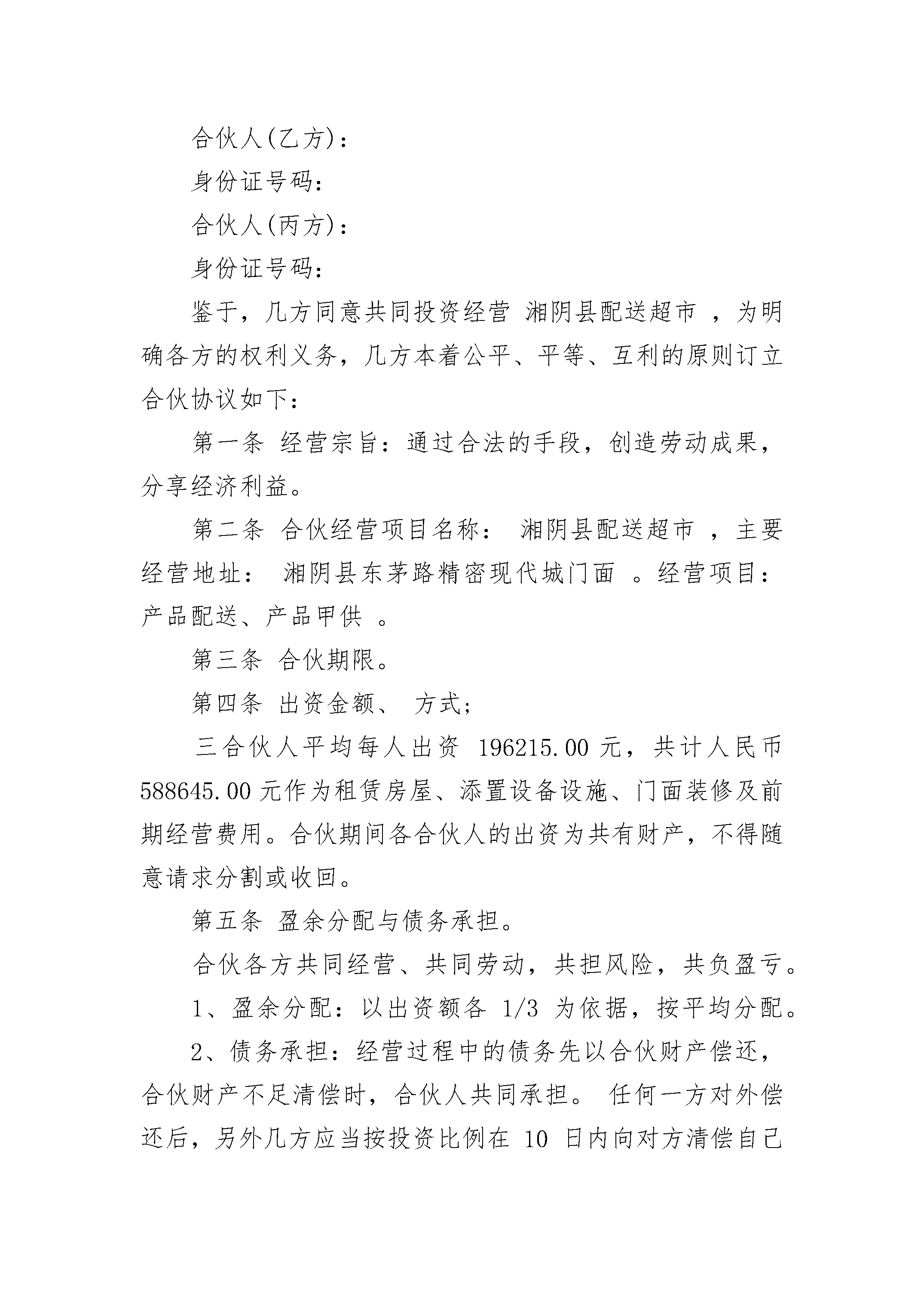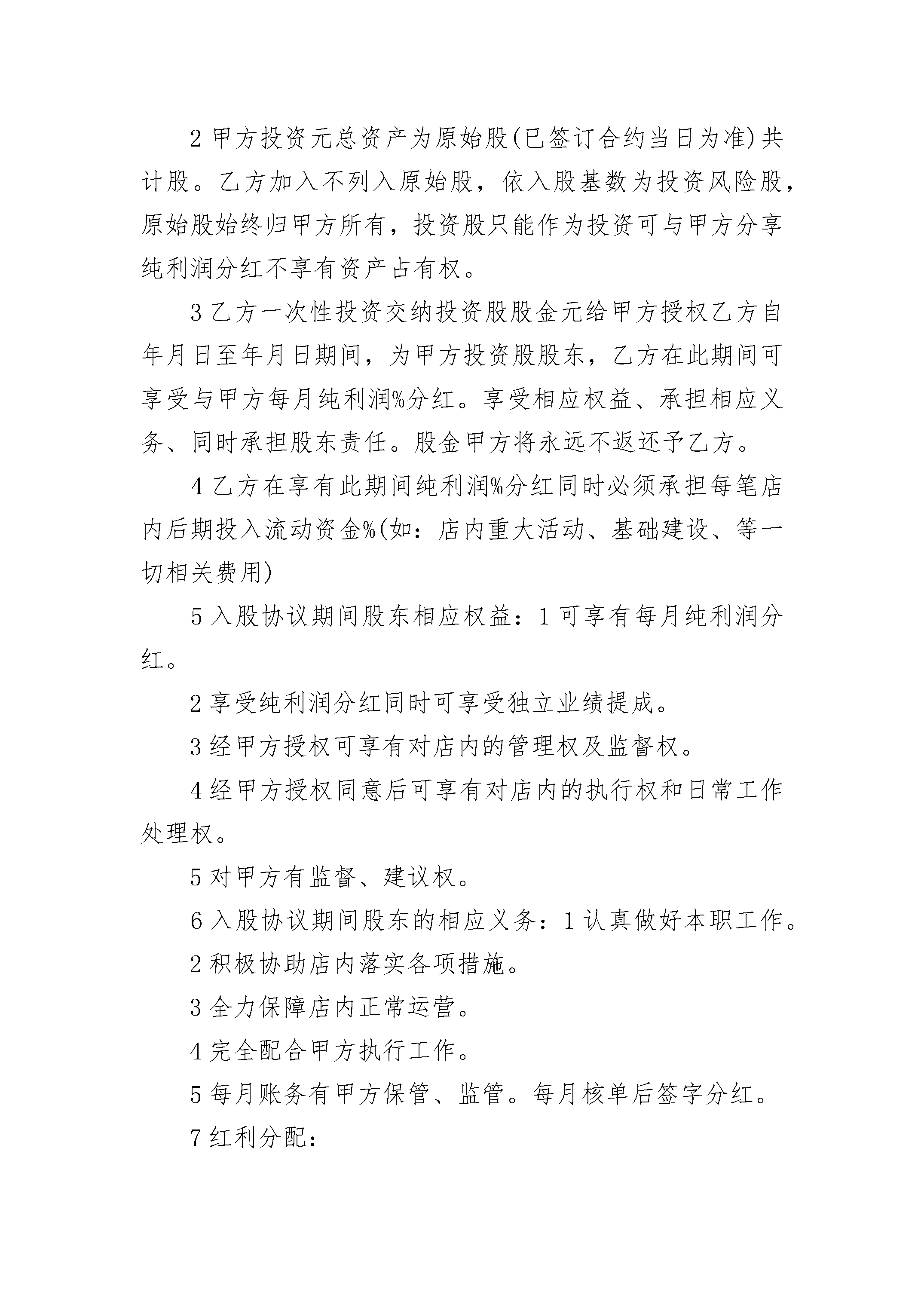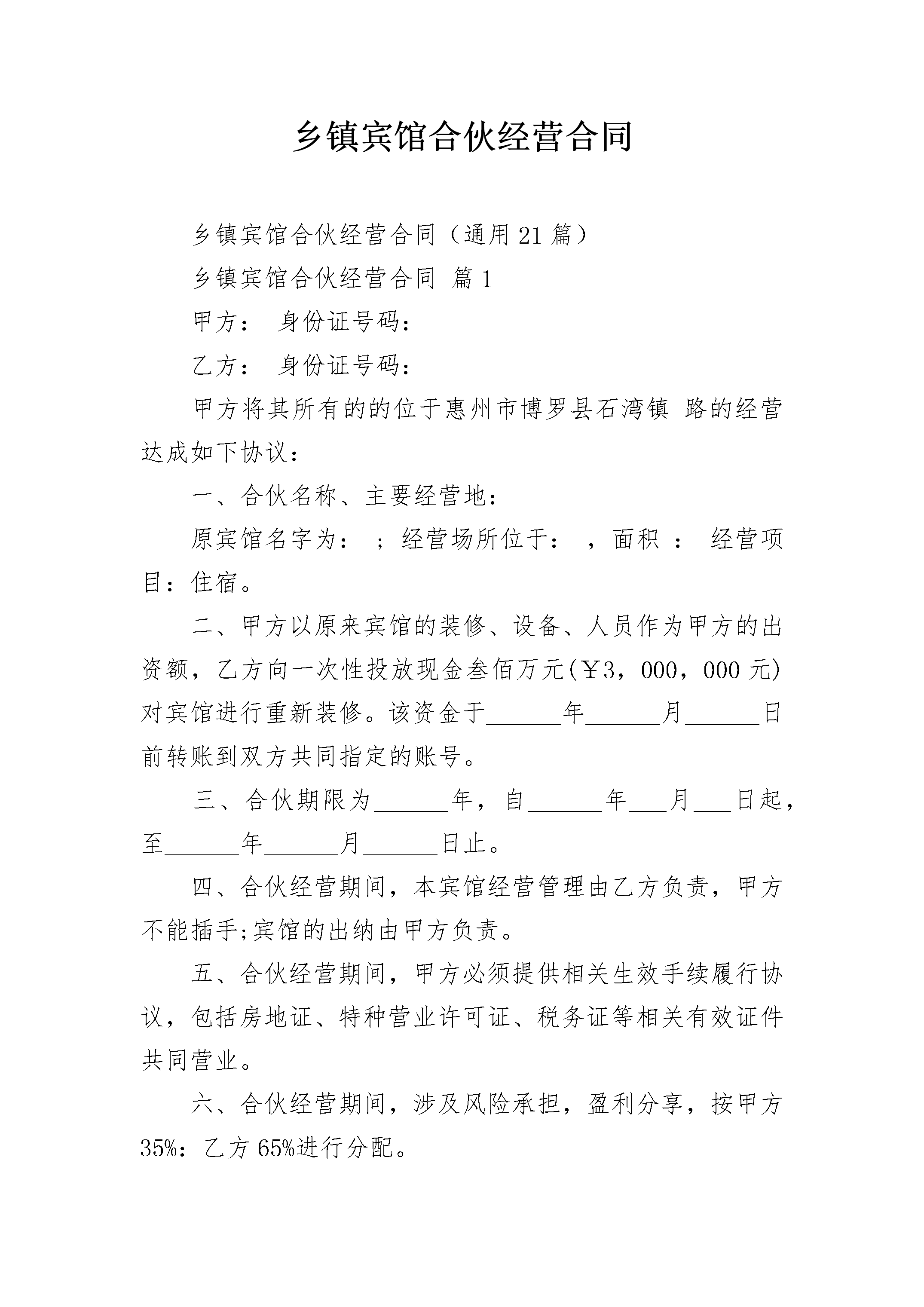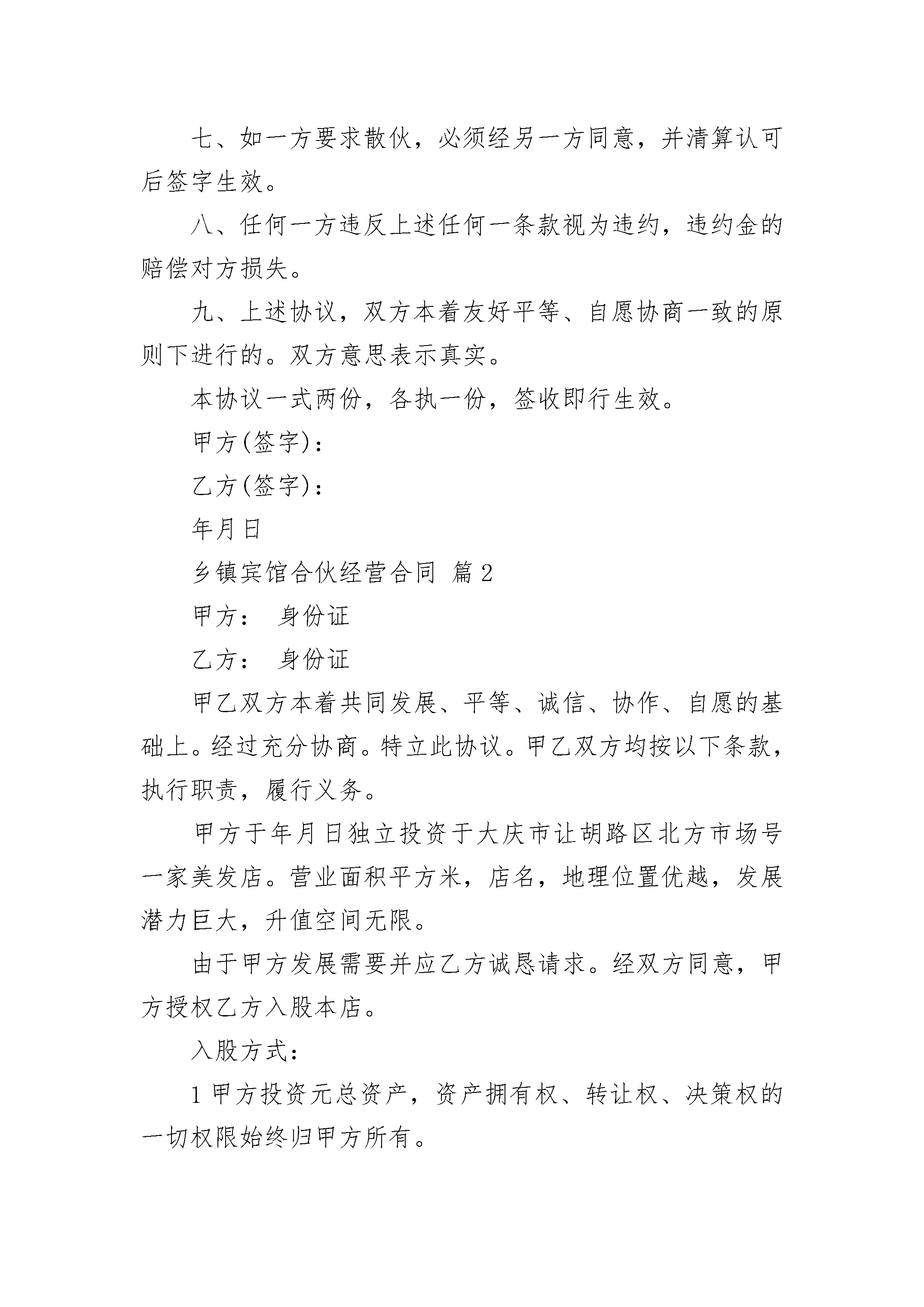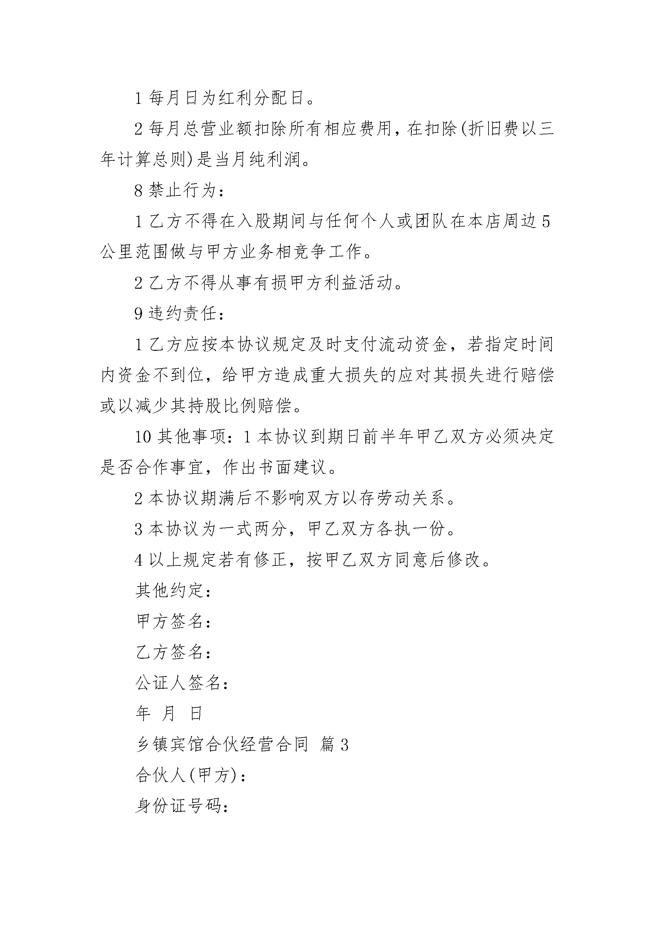 乡镇宾馆合伙经营合同乡镇宾馆合伙经营合同(通用21篇)乡镇宾馆合伙经营合同篇1甲方:身份证号码:乙方:身份证号码:甲方将其所有的的位于惠州市博罗县石湾镇路的经营达成如下协议:一、合伙名称、主要经营地:原宾馆名字为:;经营场所位于:,面积:经营项目:住宿。二、甲方以原来宾馆的装修、设备、人员作为甲方的出资额,乙方向一次性投放现金叁佰万元(¥3,000,000元)对宾馆进行重新装修。该资金于______年______月______日前转账到双方共同指定的账号。三、合伙期限为______年,自______年___月___日起,至______年______月______日止。四、合伙经营期间,本宾馆经营管理由乙方负责,甲方不能插手;宾馆的出纳由甲方负责。五、合伙经营期间,甲方必须提供相关生效手续履行协议,包括房地证、特种营业许可证、税务证等相关有效证件共同营业。六、合伙经营期间,涉及风险承担,盈利分享,按甲方35%:乙方65%进行分配。七、如一方要求散伙,必须经另一方同意,并清算认可后签字生效。八、任何一方违反上述任何一条款视为违约,违约金的赔偿对方损失。九、上述协议,双方本着友好平等、自愿协商一致的原则下进行的。双方意思表示真实。本协议一式两份,各执一份,签收即行生效。甲方(签字):乙方(签字):年月日乡镇宾馆合伙经营合同篇2甲方:身份证乙方:身份证甲乙双方本着共同发展、平等、诚信、协作、自愿的基础上。经过充分协商。特立此协议。甲乙双方均按以下条款,执行职责,履行义务。甲方于年月日独立投资于大庆市让胡路区北方市场号一家美发店。营业面积平方米,店名,地理位置优越,发展潜力巨大,升值空间无限。由于甲方发展需要并应乙方诚恳请求。经双方同意,甲方授权乙方入股本店。入股方式:1甲方投资元总资产,资产拥有权、转让权、决策权的一切权限始终归甲方所有。2甲方投资元总资产为原始股(已签订合约当日为准)共计股。乙方加入不列入原始股,依入股基数为投资风险股,原始股始终归甲方所有,投资股只能作为投资可与甲方分享纯利润分红不享有资产占有权。3乙方一次性投资交纳投资股股金元给甲方授权乙方自年月日至年月日期间,为甲方投资股股东,乙方在此期间可享受与甲方每月纯利润%分红。享受相应权益、承担相应义务、同时承担股东责任。股金甲方将永远不返还予乙方。4乙方在享有此期间纯利润%分红同时必须承担每笔店内后期投入流动资金%(如:店内重大活动、基础建设、等一切相关费用)5入股协议期间股东相应权益:1可享有每月纯利润分红。2享受纯利润分红同时可享受独立业绩提成。3经甲方授权可享有对店内的管理权及监督权。4经甲方授权同意后可享有对店内的执行权和日常工作处理权。5对甲方有监督、建议权。6入股协议期间股东的相应义务:1认真做好本职工作。2积极协助店内落实各项措施。3全力保障店内正常运营。4完全配合甲方执行工作。5每月账务有甲方保管、监管。每月核单后签字分红。7红利分配:1每月日为红利分配日。2每月总营业额扣除所有相应费用,在扣除(折旧费以三年计算总则)是当月纯利润。8禁止行为:1乙方不得在入股期间与任何个人或团队在本店周边5公里范围做与甲方业务相竞争工作。2乙方不得从事有损甲方利益活动。9违约责任:1乙方应按本协议规定及时支付流动资金,若指定时间内资金不到位,给甲方造成重大损失的应对其损失进行赔偿或以减少其持股比例赔偿。10其他事项:1本协议到期日前半年甲乙双方必须决定是否合作事宜,作出书面建议。2本协议期满后不影响双方以存劳动关系。3本协议为一式两分,甲乙双方各执一份。4以上规定若有修正,按甲乙双方同意后修改。其他约定:甲方签名:乙方签名:公证人签名:年月日乡镇宾馆合伙经营合同篇3合伙人(甲方):身份证号码:合伙人(乙方):身份证号码:合伙人(丙方):身份证号码:鉴于,几方同意共同投资经营湘阴县配送超市,为明确各方的权利义务,几方本着公平、平等、互利的原则订立合伙协议如下:第一条经营宗旨:通过合法的手段,创造劳动成果,分享经济利益。第二条合伙经营项目名称:湘阴县配送超市,主要经营地址:湘阴县东茅路精密现代城门面。经营项目:产品配送、产品甲供。第三条合伙期限。第四条出资金额、方式;三合伙人平均每人出资196215.00元,共计人民币588645.00元作为租赁房屋、添置设备设施、门面装修及前期经营费用。合伙期间各合伙人的出资为共有财产,不得随意请求分割或收回。第五条盈余分配与债务承担。合伙各方共同经营、共同劳动,共担风险,共负盈亏。1、盈余分配:以出资额各1/3为依据,按平均分配。2、债务承担:经营过程中的债务先以合伙财产偿还,合伙财产不足清偿时,合伙人共同承担。任何一方对外偿还后,另外几方应当按投资比例在10日内向对方清偿自己应负担的部分。第六条入伙、退出、出资的转让。(一)入伙。1