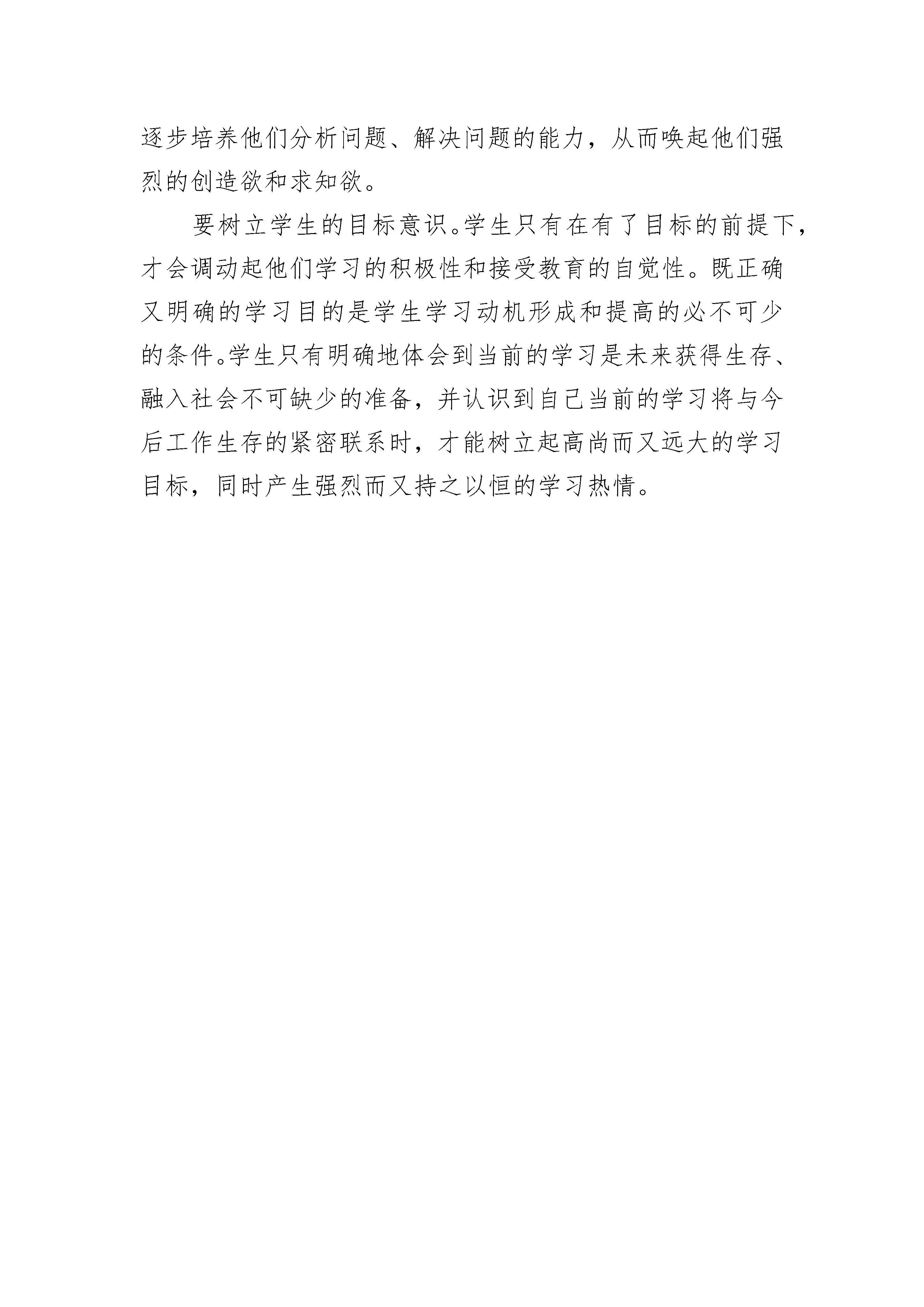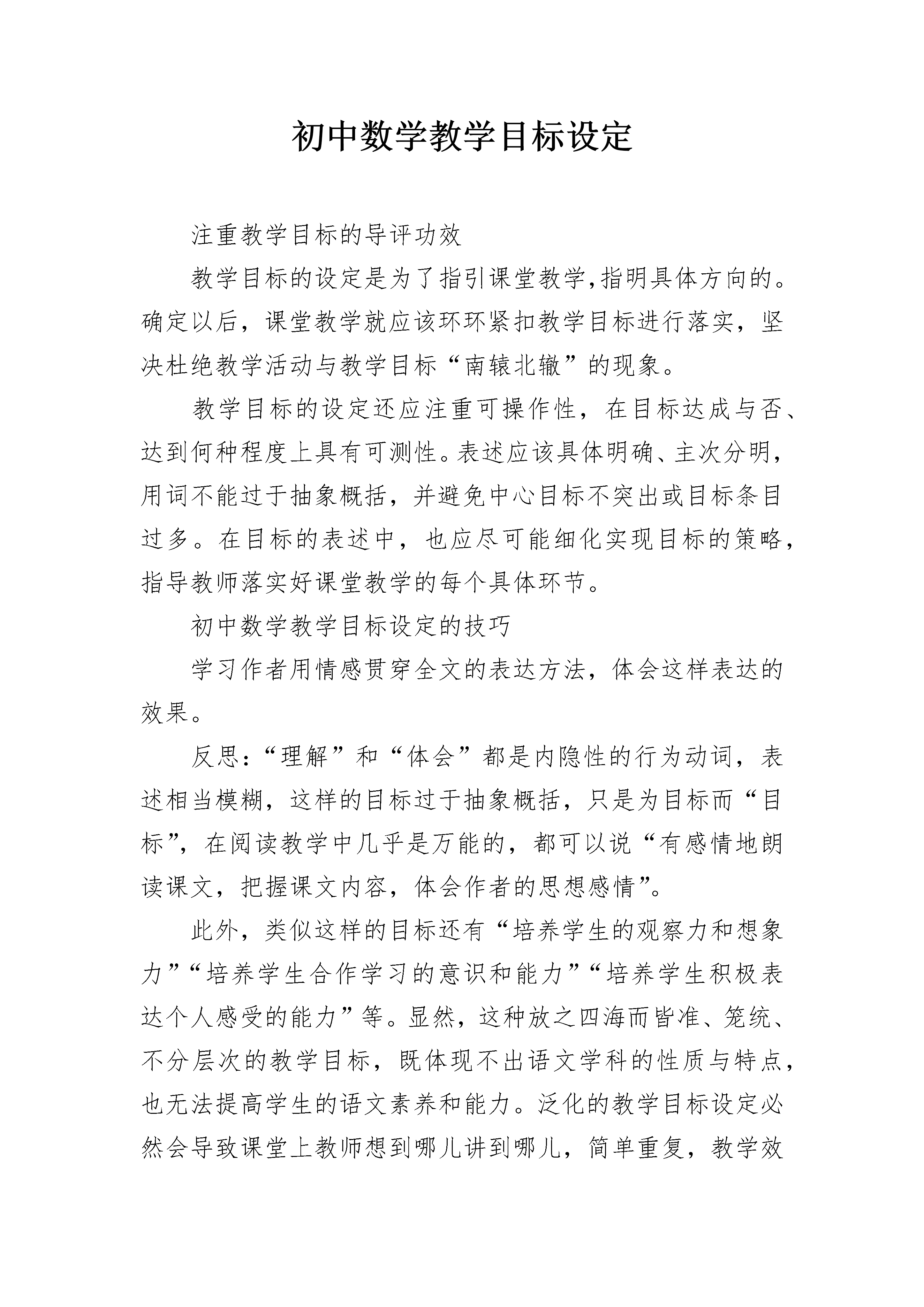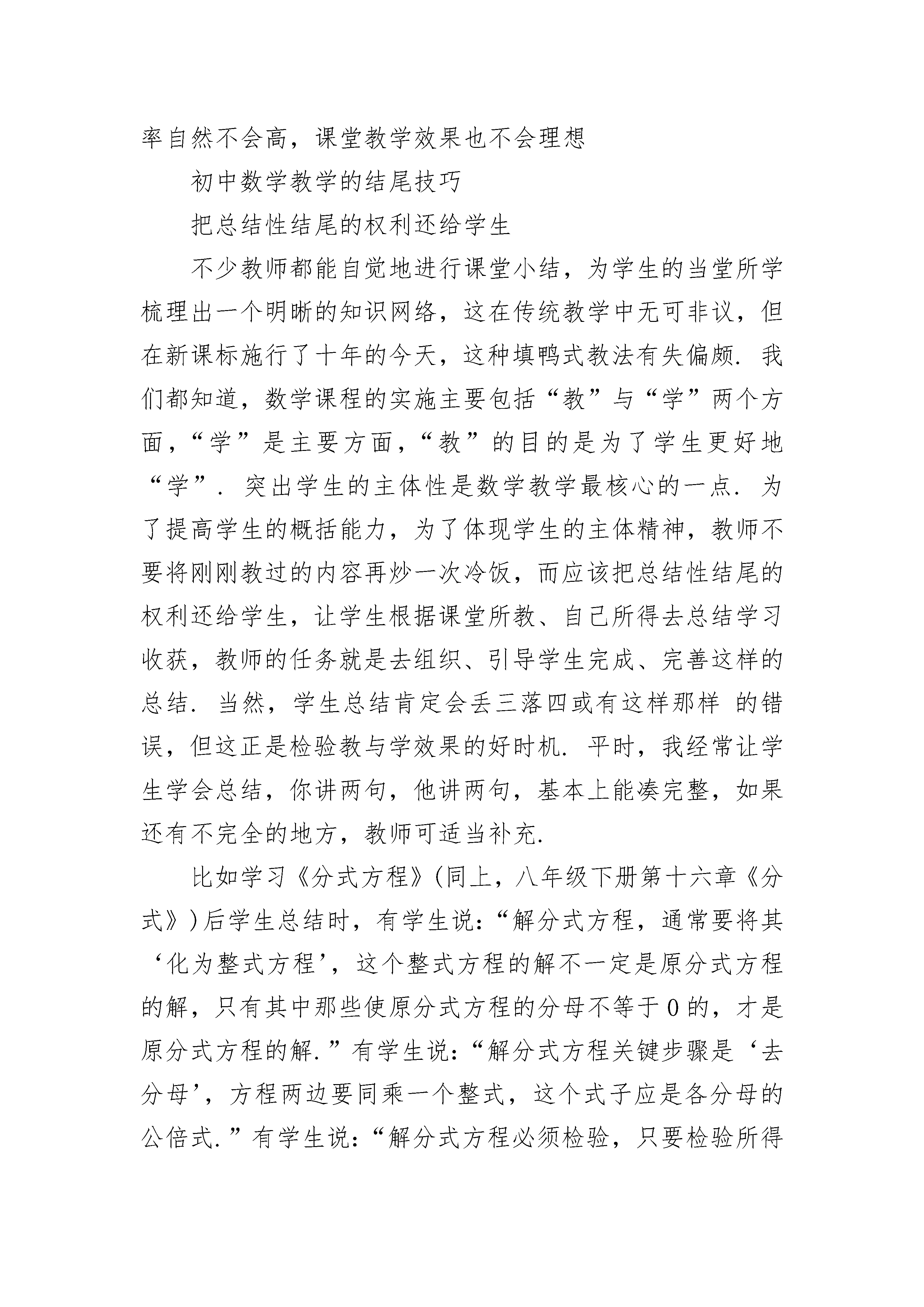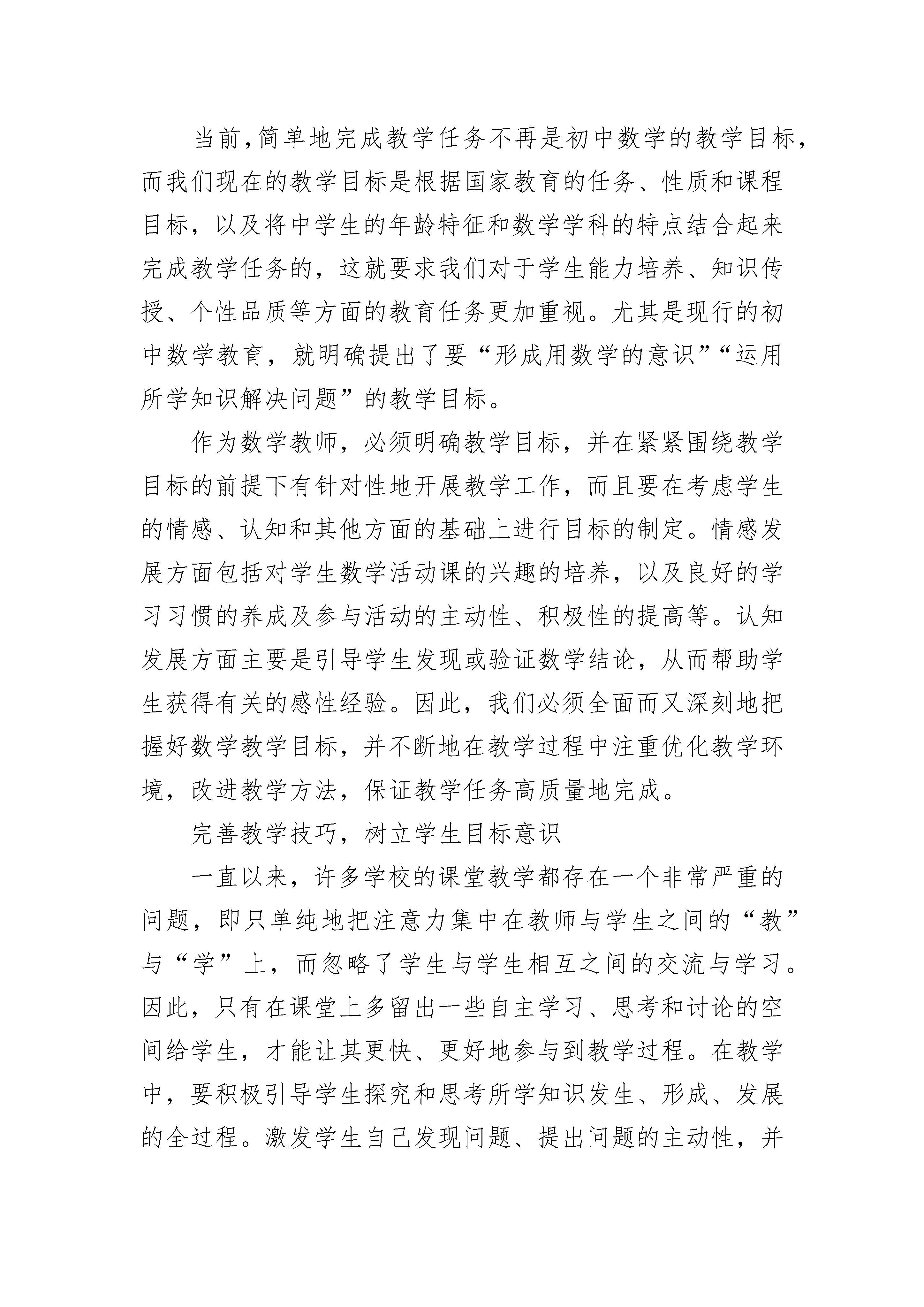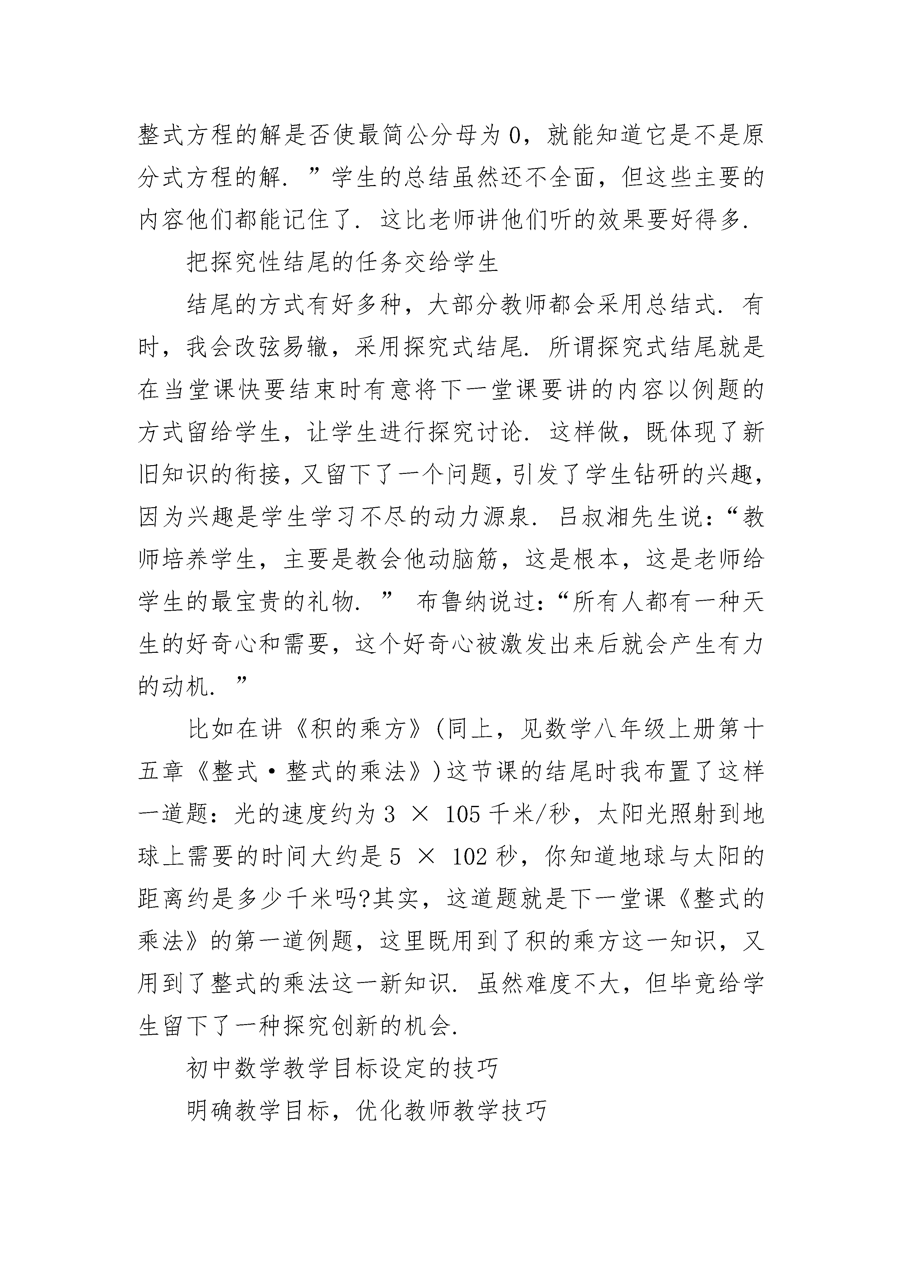 初中数学教学目标设定注重教学目标的导评功效教学目标的设定是为了指引课堂教学,指明具体方向的。确定以后,课堂教学就应该环环紧扣教学目标进行落实,坚决杜绝教学活动与教学目标“南辕北辙”的现象。教学目标的设定还应注重可操作性,在目标达成与否、达到何种程度上具有可测性。表述应该具体明确、主次分明,用词不能过于抽象概括,并避免中心目标不突出或目标条目过多。在目标的表述中,也应尽可能细化实现目标的策略,指导教师落实好课堂教学的每个具体环节。初中数学教学目标设定的技巧学习作者用情感贯穿全文的表达方法,体会这样表达的效果。反思:“理解”和“体会”都是内隐性的行为动词,表述相当模糊,这样的目标过于抽象概括,只是为目标而“目标”,在阅读教学中几乎是万能的,都可以说“有感情地朗读课文,把握课文内容,体会作者的思想感情”。此外,类似这样的目标还有“培养学生的观察力和想象力”“培养学生合作学习的意识和能力”“培养学生积极表达个人感受的能力”等。显然,这种放之四海而皆准、笼统、不分层次的教学目标,既体现不出语文学科的性质与特点,也无法提高学生的语文素养和能力。泛化的教学目标设定必然会导致课堂上教师想到哪儿讲到哪儿,简单重复,教学效率自然不会高,课堂教学效果也不会理想初中数学教学的结尾技巧把总结性结尾的权利还给学生不少教师都能自觉地进行课堂小结,为学生的当堂所学梳理出一个明晰的知识网络,这在传统教学中无可非议,但在新课标施行了十年的今天,这种填鸭式教法有失偏颇.我们都知道,数学课程的实施主要包括“教”与“学”两个方面,“学”是主要方面,“教”的目的是为了学生更好地“学”.突出学生的主体性是数学教学最核心的一点.为了提高学生的概括能力,为了体现学生的主体精神,教师不要将刚刚教过的内容再炒一次冷饭,而应该把总结性结尾的权利还给学生,让学生根据课堂所教、自己所得去总结学习收获,教师的任务就是去组织、引导学生完成、完善这样的总结.当然,学生总结肯定会丢三落四或有这样那样的错误,但这正是检验教与学效果的好时机.平时,我经常让学生学会总结,你讲两句,他讲两句,基本上能凑完整,如果还有不完全的地方,教师可适当补充.比如学习《分式方程》(同上,八年级下册第十六章《分式》)后学生总结时,有学生说:“解分式方程,通常要将其‘化为整式方程’,这个整式方程的解不一定是原分式方程的解,只有其中那些使原分式方程的分母不等于0的,才是原分式方程的解.”有学生说:“解分式方程关键步骤是‘去分母’,方程两边要同乘一个整式,这个式子应是各分母的公倍式.”有学生说:“解分式方程必须检验,只要检验所得整式方程的解是否使最简公分母为0,就能知道它是不是原分式方程的解.”学生的总结虽然还不全面,但这些主要的内容他们都能记住了.这比老师讲他们听的效果要好得多.把探究性结尾的任务交给学生结尾的方式有好多种,大部分教师都会采用总结式.有时,我会改弦易辙,采用探究式结尾.所谓探究式结尾就是在当堂课快要结束时有意将下一堂课要讲的内容以例题的方式留给学生,让学生进行探究讨论.这样做,既体现了新旧知识的衔接,又留下了一个问题,引发了学生钻研的兴趣,因为兴趣是学生学习不尽的动力源泉.吕叔湘先生说:“教师培养学生,主要是教会他动脑筋,这是根本,这是老师给学生的最宝贵的礼物.”布鲁纳说过:“所有人都有一种天生的好奇心和需要,这个好奇心被激发出来后就会产生有力的动机.”比如在讲《积的乘方》(同上,见数学八年级上册第十五章《整式·整式的乘法》)这节课的结尾时我布置了这样一道题:光的速度约为3×105千米/秒,太阳光照射到地球上需要的时间大约是5×102秒,你知道地球与太阳的距离约是多少千米吗?其实,这道题就是下一堂课《整式的乘法》的第一道例题,这里既用到了积的乘方这一知识,又用到了整式的乘法这一新知识.虽然难度不大,但毕竟给学生留下了一种探究创新的机会.初中数学教学目标设定的技巧明确教学目标,优化教师教学技巧当前,简单地完成教学任务不再是初中数学的教学目标,而我们现在的教学目标是根据国家教育的任务、性质和课程目标,以及将中学生的年龄特征和数学学科的特点结合起来完成教学任务的,这就要求我们对于学生能力培养、知识传授、个性品质等方面的教育任务更加重视。尤其是现行的初中数学教育,就明确提出了要“形成用数学的意识”“运用所学知识解决问题”的教学目标。作为数学教师,必须明确教学目标,并在紧紧围绕教学目标的前提下有针对性地开展教学工作,而且要在考虑学生的情感、认知和其他方面的基础上进行目标的制定。情感发展方面包括对学生数学活动课的兴趣的培养,以及良好的学习习惯的养成及参与活动的主动性、积极性的提高等。认知发展方面主要是引导学生发现或验证数学结论,从而帮助学生获得有关的感性经验。因此,我们必须全面而又深刻地把握好数学教学目标,并不断
