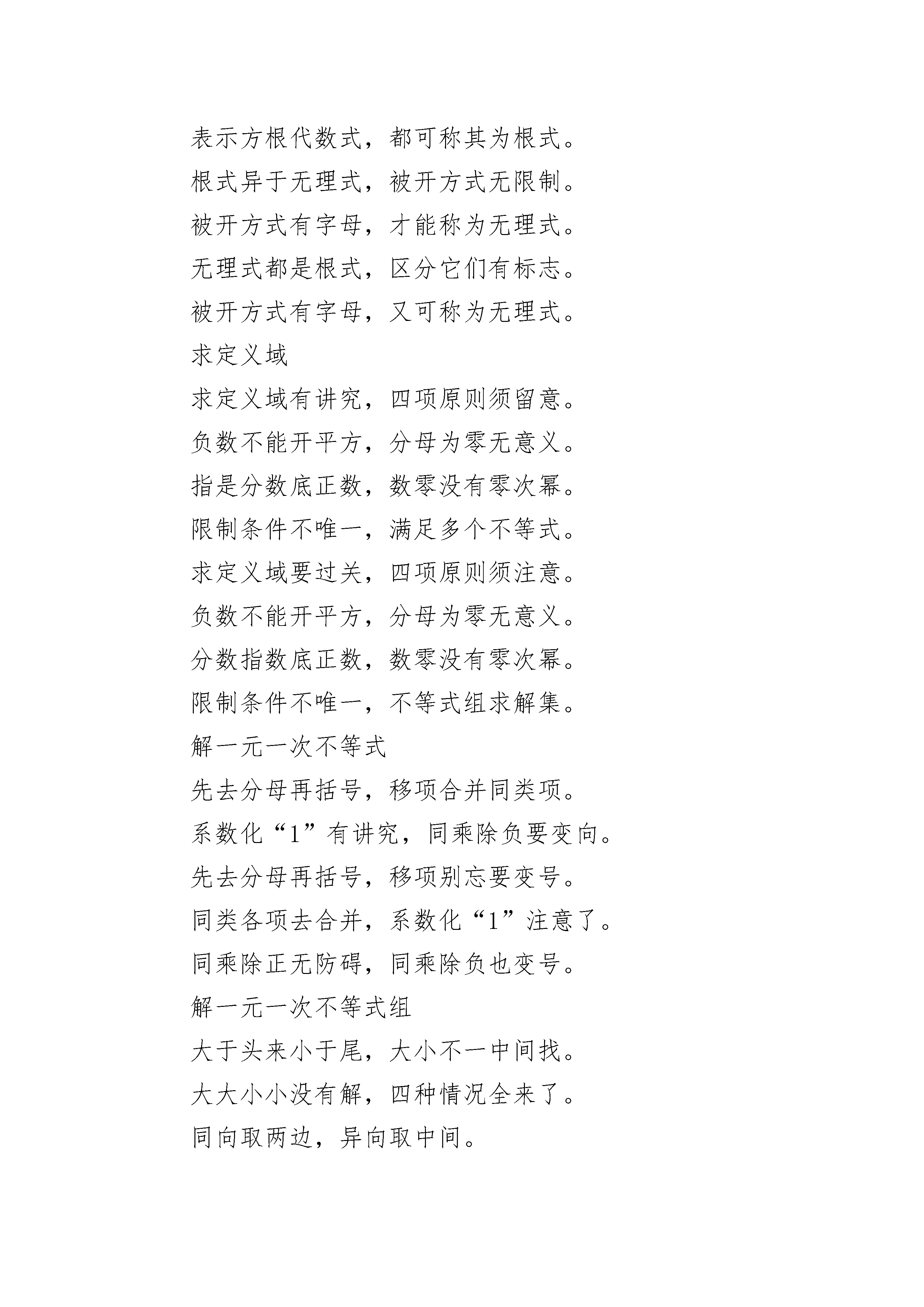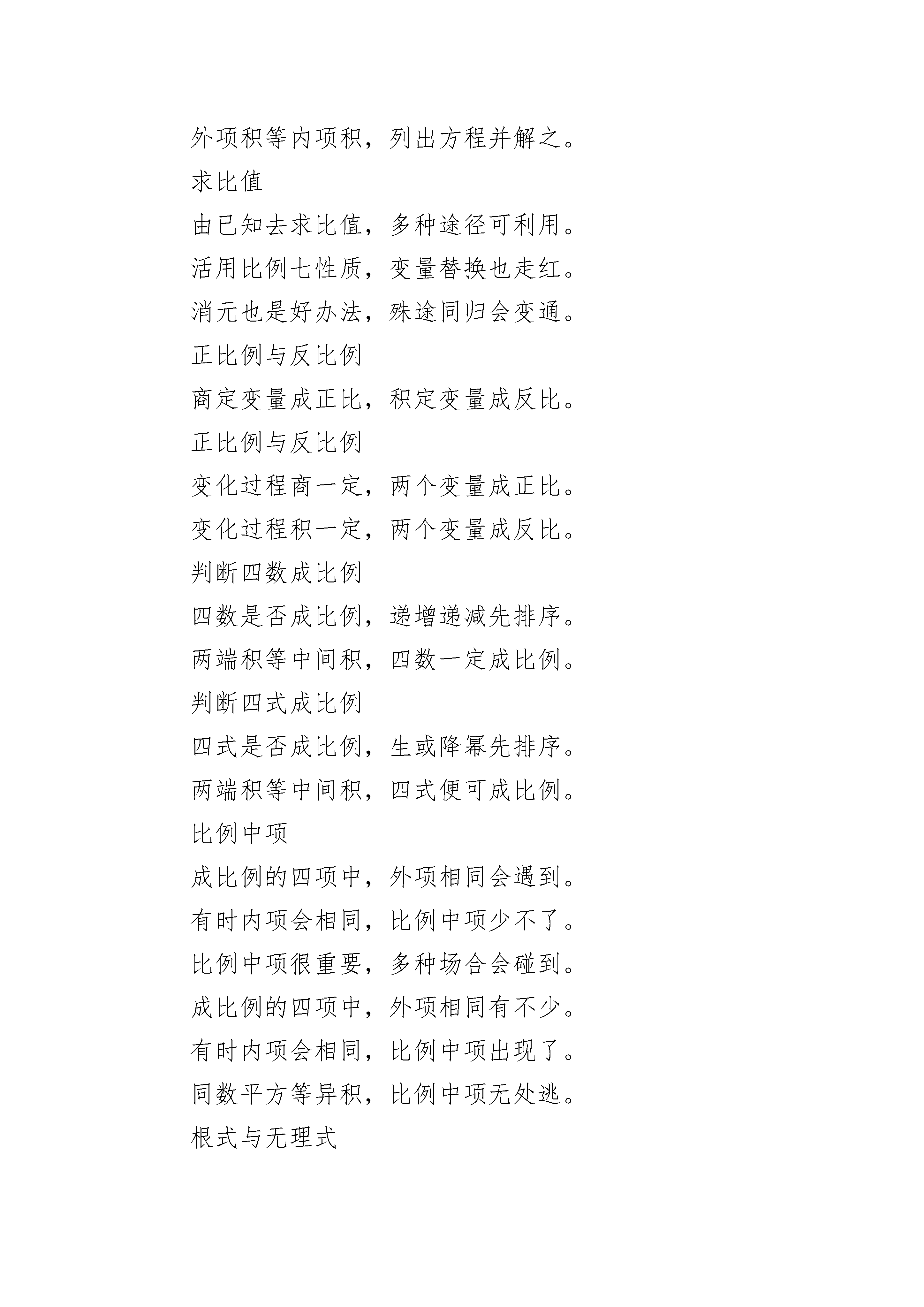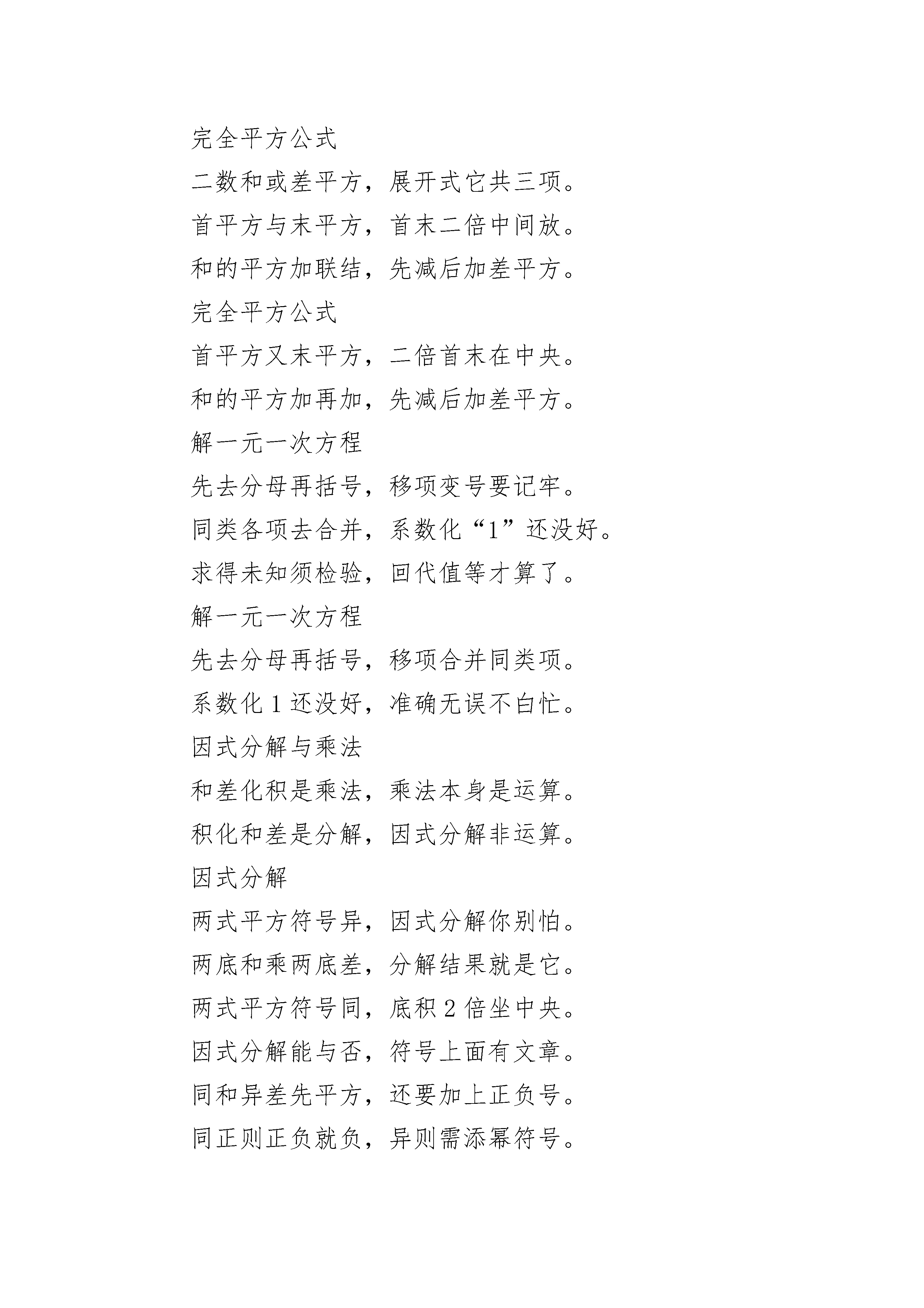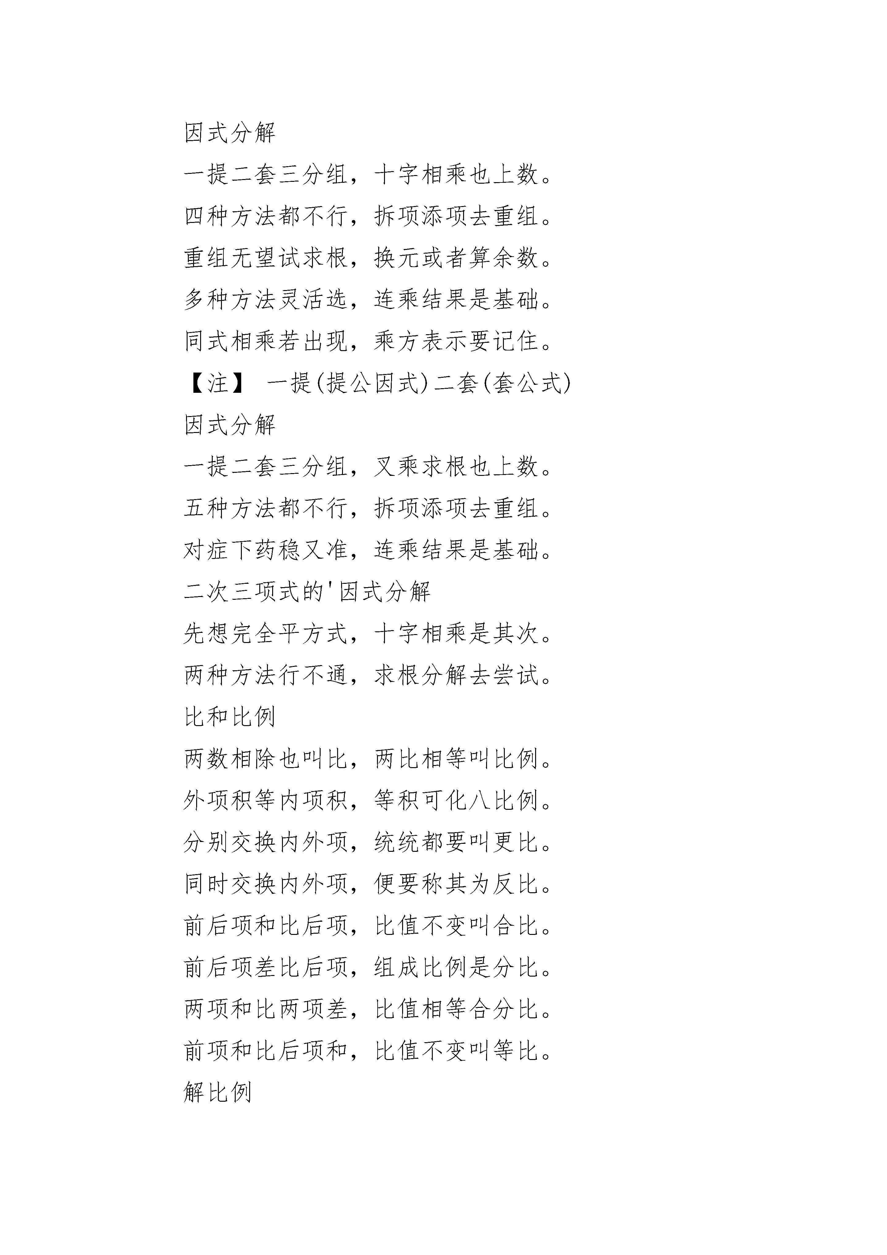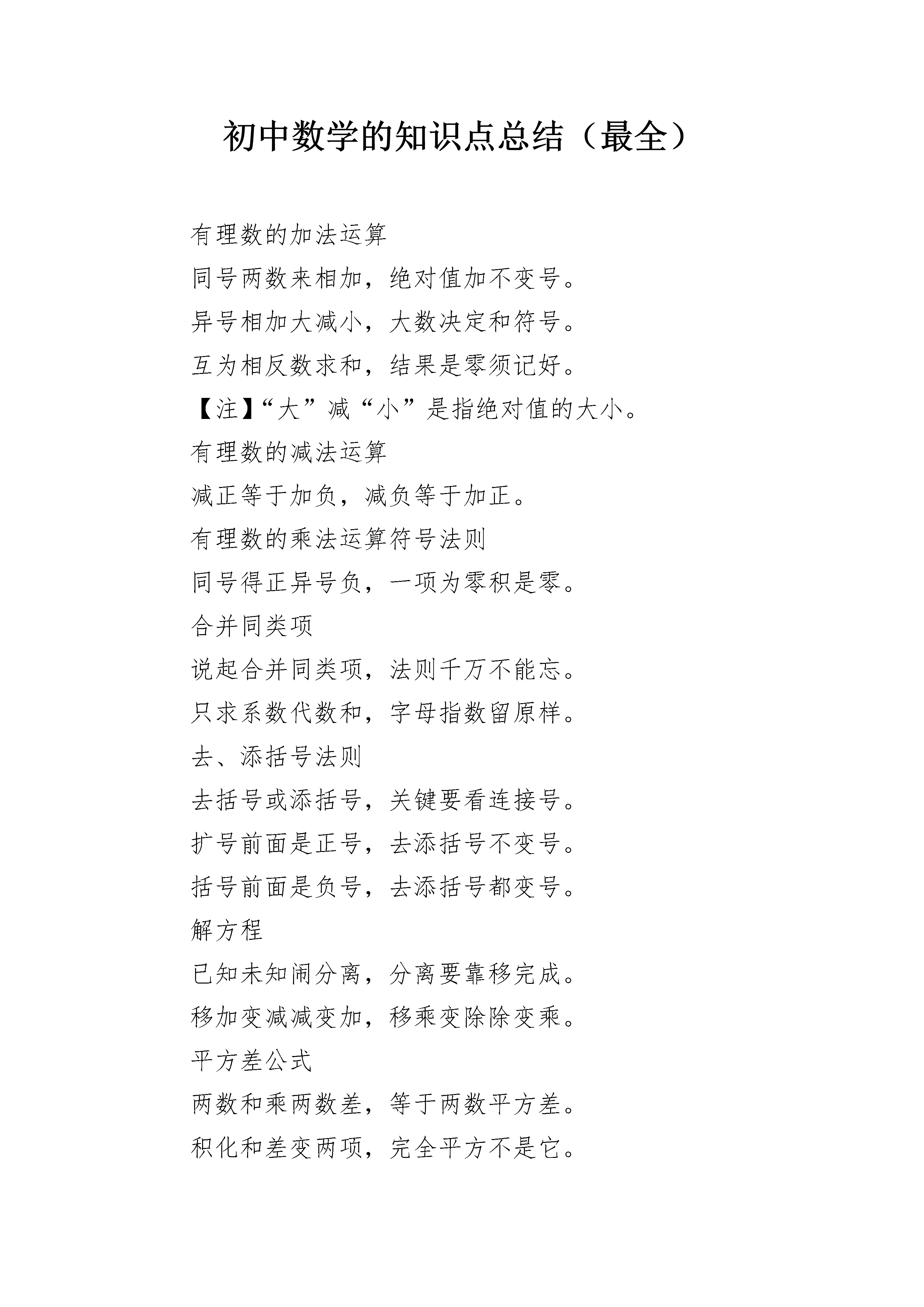 初中数学的知识点总结(最全)有理数的加法运算同号两数来相加,绝对值加不变号。异号相加大减小,大数决定和符号。互为相反数求和,结果是零须记好。【注】“大”减“小”是指绝对值的大小。有理数的减法运算减正等于加负,减负等于加正。有理数的乘法运算符号法则同号得正异号负,一项为零积是零。合并同类项说起合并同类项,法则千万不能忘。只求系数代数和,字母指数留原样。去、添括号法则去括号或添括号,关键要看连接号。扩号前面是正号,去添括号不变号。括号前面是负号,去添括号都变号。解方程已知未知闹分离,分离要靠移完成。移加变减减变加,移乘变除除变乘。平方差公式两数和乘两数差,等于两数平方差。积化和差变两项,完全平方不是它。完全平方公式二数和或差平方,展开式它共三项。首平方与末平方,首末二倍中间放。和的平方加联结,先减后加差平方。完全平方公式首平方又末平方,二倍首末在中央。和的平方加再加,先减后加差平方。解一元一次方程先去分母再括号,移项变号要记牢。同类各项去合并,系数化“1”还没好。求得未知须检验,回代值等才算了。解一元一次方程先去分母再括号,移项合并同类项。系数化1还没好,准确无误不白忙。因式分解与乘法和差化积是乘法,乘法本身是运算。积化和差是分解,因式分解非运算。因式分解两式平方符号异,因式分解你别怕。两底和乘两底差,分解结果就是它。两式平方符号同,底积2倍坐中央。因式分解能与否,符号上面有文章。同和异差先平方,还要加上正负号。同正则正负就负,异则需添幂符号。因式分解一提二套三分组,十字相乘也上数。四种方法都不行,拆项添项去重组。重组无望试求根,换元或者算余数。多种方法灵活选,连乘结果是基础。同式相乘若出现,乘方表示要记住。【注】一提(提公因式)二套(套公式)因式分解一提二套三分组,叉乘求根也上数。五种方法都不行,拆项添项去重组。对症下药稳又准,连乘结果是基础。二次三项式的'因式分解先想完全平方式,十字相乘是其次。两种方法行不通,求根分解去尝试。比和比例两数相除也叫比,两比相等叫比例。外项积等内项积,等积可化八比例。分别交换内外项,统统都要叫更比。同时交换内外项,便要称其为反比。前后项和比后项,比值不变叫合比。前后项差比后项,组成比例是分比。两项和比两项差,比值相等合分比。前项和比后项和,比值不变叫等比。解比例外项积等内项积,列出方程并解之。求比值由已知去求比值,多种途径可利用。活用比例七性质,变量替换也走红。消元也是好办法,殊途同归会变通。正比例与反比例商定变量成正比,积定变量成反比。正比例与反比例变化过程商一定,两个变量成正比。变化过程积一定,两个变量成反比。判断四数成比例四数是否成比例,递增递减先排序。两端积等中间积,四数一定成比例。判断四式成比例四式是否成比例,生或降幂先排序。两端积等中间积,四式便可成比例。比例中项成比例的四项中,外项相同会遇到。有时内项会相同,比例中项少不了。比例中项很重要,多种场合会碰到。成比例的四项中,外项相同有不少。有时内项会相同,比例中项出现了。同数平方等异积,比例中项无处逃。根式与无理式表示方根代数式,都可称其为根式。根式异于无理式,被开方式无限制。被开方式有字母,才能称为无理式。无理式都是根式,区分它们有标志。被开方式有字母,又可称为无理式。求定义域求定义域有讲究,四项原则须留意。负数不能开平方,分母为零无意义。指是分数底正数,数零没有零次幂。限制条件不唯一,满足多个不等式。求定义域要过关,四项原则须注意。负数不能开平方,分母为零无意义。分数指数底正数,数零没有零次幂。限制条件不唯一,不等式组求解集。解一元一次不等式先去分母再括号,移项合并同类项。系数化“1”有讲究,同乘除负要变向。先去分母再括号,移项别忘要变号。同类各项去合并,系数化“1”注意了。同乘除正无防碍,同乘除负也变号。解一元一次不等式组大于头来小于尾,大小不一中间找。大大小小没有解,四种情况全来了。同向取两边,异向取中间。中间无元素,无解便出现。幼儿园小鬼当家,(同小相对取较小)敬老院以老为荣,(同大就要取较大)军营里没老没少。(大小小大就是它)大大小小解集空。(小小大大哪有哇)解一元二次不等式首先化成一般式,构造函数第二站。判别式值若非负,曲线横轴有交点。a正开口它向上,大于零则取两边。代数式若小于零,解集交点数之间。方程若无实数根,口上大零解为全。小于零将没有解,开口向下正相反。用平方差公式因式分解异号两个平方项,因式分解有办法。两底和乘两底差,分解结果就是它。用完全平方公式因式分解两平方项在两端,底积2倍在中部。同正两底和平方,全负和方相反数。分成两底差平方,方正倍积要为负。两边为负中间正,底差平方相反数。一平方又一平方,底积2倍在中路。三正两底和平方,全负和方相反数。分成两底差平方,两端为正倍积负。两边若负中间正,底差平方相反数。用