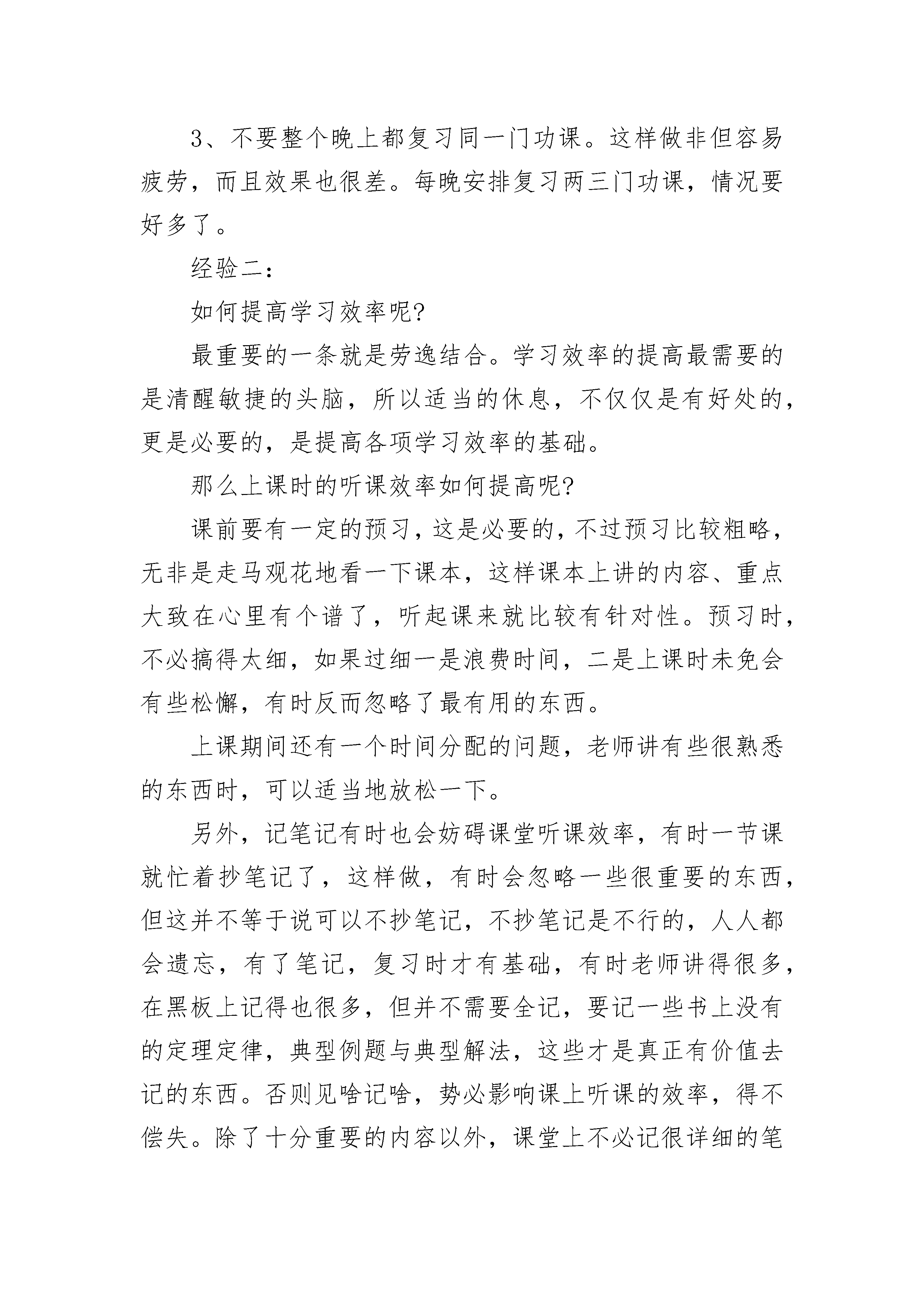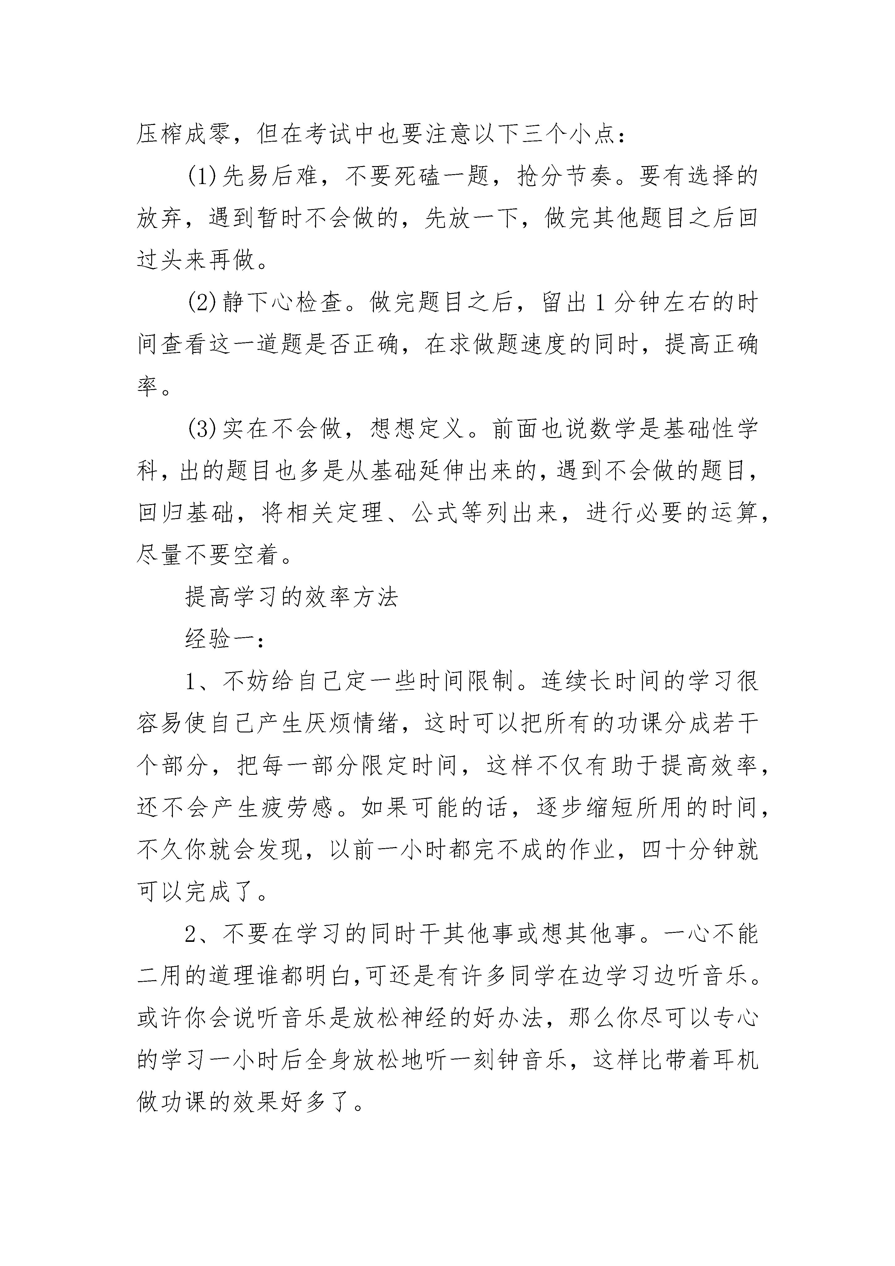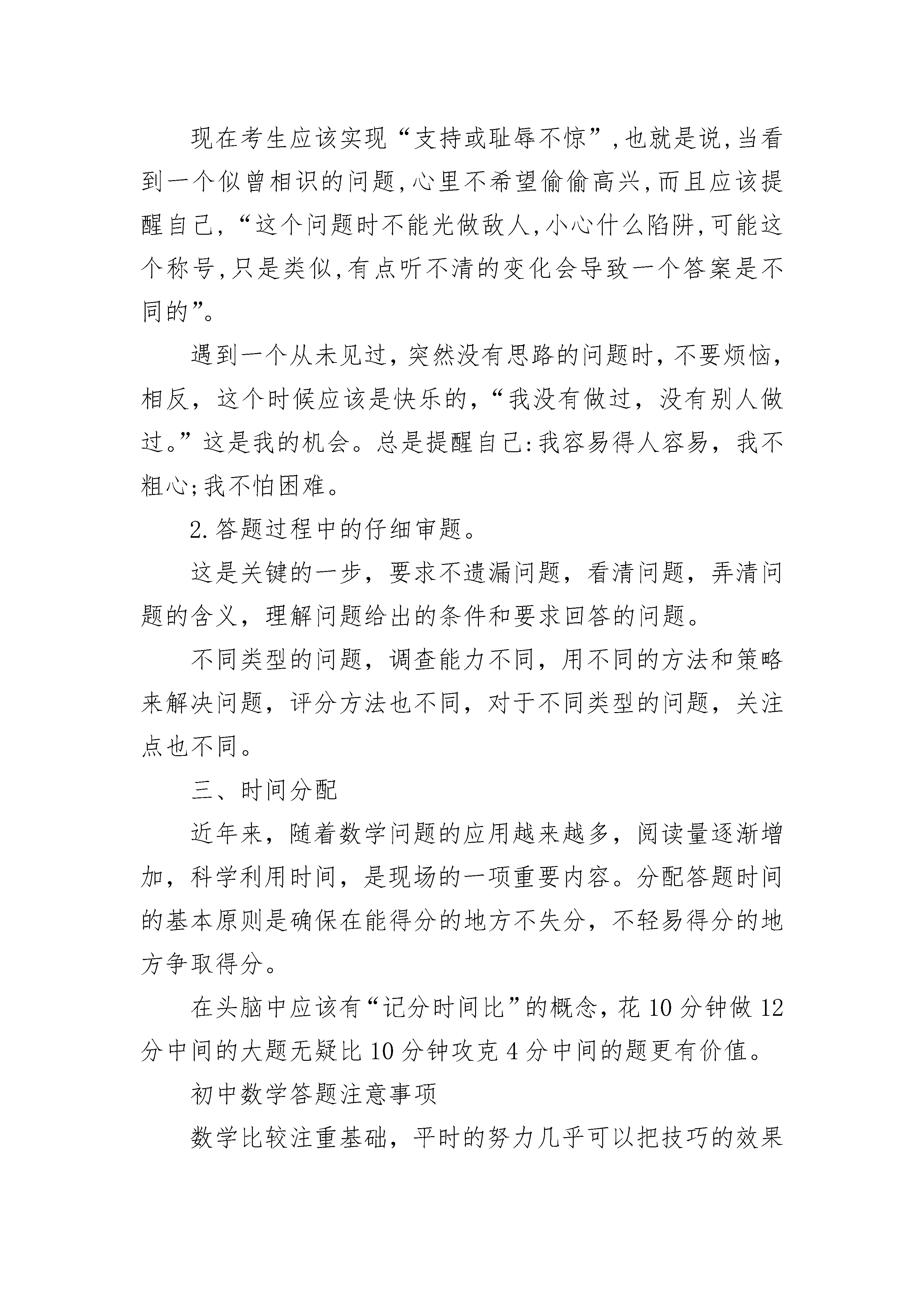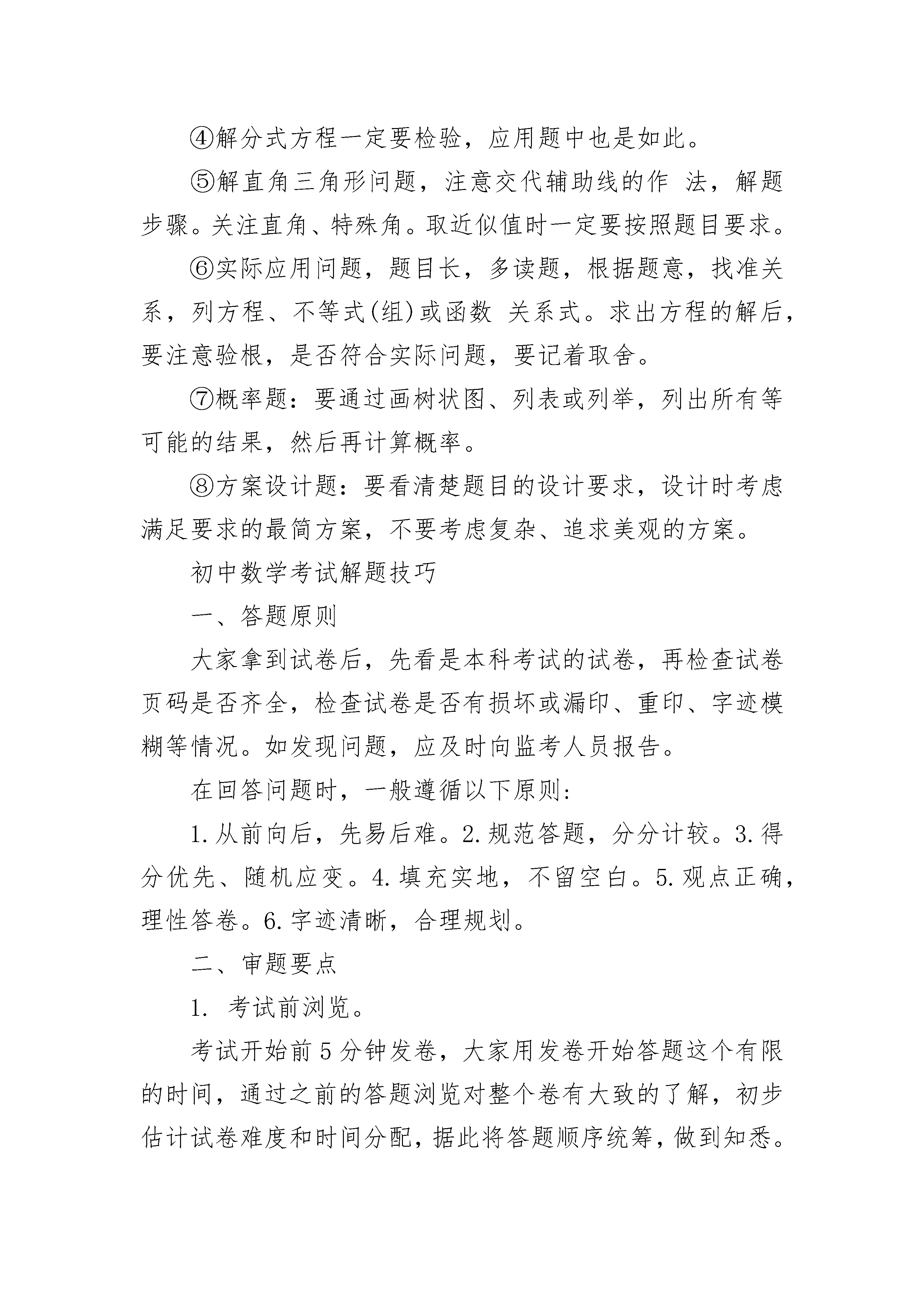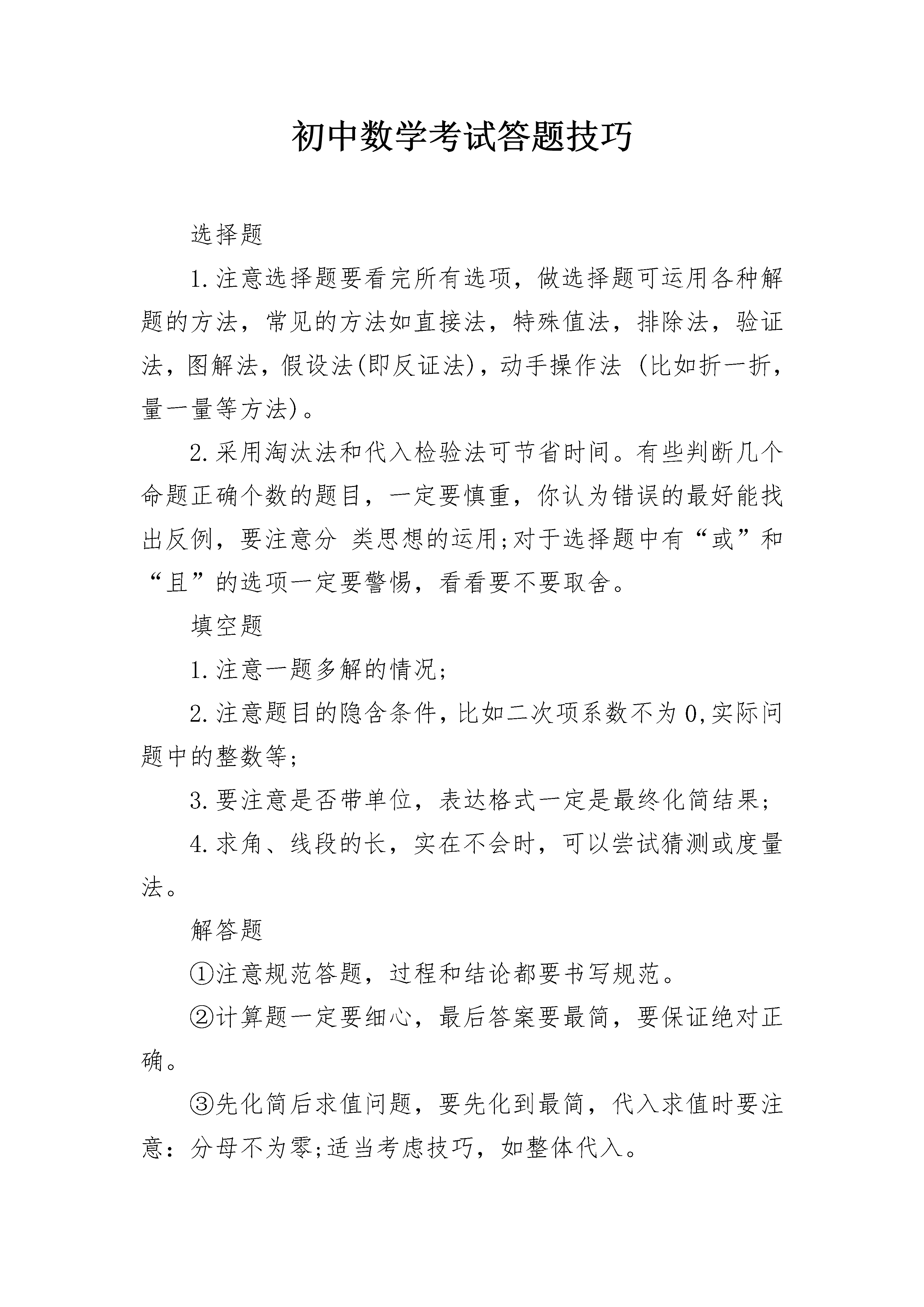 初中数学考试答题技巧选择题1.注意选择题要看完所有选项,做选择题可运用各种解题的方法,常见的方法如直接法,特殊值法,排除法,验证法,图解法,假设法(即反证法),动手操作法(比如折一折,量一量等方法)。2.采用淘汰法和代入检验法可节省时间。有些判断几个命题正确个数的题目,一定要慎重,你认为错误的最好能找出反例,要注意分类思想的运用;对于选择题中有“或”和“且”的选项一定要警惕,看看要不要取舍。填空题1.注意一题多解的情况;2.注意题目的隐含条件,比如二次项系数不为0,实际问题中的整数等;3.要注意是否带单位,表达格式一定是最终化简结果;4.求角、线段的长,实在不会时,可以尝试猜测或度量法。解答题①注意规范答题,过程和结论都要书写规范。②计算题一定要细心,最后答案要最简,要保证绝对正确。③先化简后求值问题,要先化到最简,代入求值时要注意:分母不为零;适当考虑技巧,如整体代入。④解分式方程一定要检验,应用题中也是如此。⑤解直角三角形问题,注意交代辅助线的作法,解题步骤。关注直角、特殊角。取近似值时一定要按照题目要求。⑥实际应用问题,题目长,多读题,根据题意,找准关系,列方程、不等式(组)或函数关系式。求出方程的解后,要注意验根,是否符合实际问题,要记着取舍。⑦概率题:要通过画树状图、列表或列举,列出所有等可能的结果,然后再计算概率。⑧方案设计题:要看清楚题目的设计要求,设计时考虑满足要求的最简方案,不要考虑复杂、追求美观的方案。初中数学考试解题技巧一、答题原则大家拿到试卷后,先看是本科考试的试卷,再检查试卷页码是否齐全,检查试卷是否有损坏或漏印、重印、字迹模糊等情况。如发现问题,应及时向监考人员报告。在回答问题时,一般遵循以下原则:1.从前向后,先易后难。2.规范答题,分分计较。3.得分优先、随机应变。4.填充实地,不留空白。5.观点正确,理性答卷。6.字迹清晰,合理规划。二、审题要点1.考试前浏览。考试开始前5分钟发卷,大家用发卷开始答题这个有限的时间,通过之前的答题浏览对整个卷有大致的了解,初步估计试卷难度和时间分配,据此将答题顺序统筹,做到知悉。现在考生应该实现“支持或耻辱不惊”,也就是说,当看到一个似曾相识的问题,心里不希望偷偷高兴,而且应该提醒自己,“这个问题时不能光做敌人,小心什么陷阱,可能这个称号,只是类似,有点听不清的变化会导致一个答案是不同的”。遇到一个从未见过,突然没有思路的问题时,不要烦恼,相反,这个时候应该是快乐的,“我没有做过,没有别人做过。”这是我的机会。总是提醒自己:我容易得人容易,我不粗心;我不怕困难。2.答题过程中的仔细审题。这是关键的一步,要求不遗漏问题,看清问题,弄清问题的含义,理解问题给出的条件和要求回答的问题。不同类型的问题,调查能力不同,用不同的方法和策略来解决问题,评分方法也不同,对于不同类型的问题,关注点也不同。三、时间分配近年来,随着数学问题的应用越来越多,阅读量逐渐增加,科学利用时间,是现场的一项重要内容。分配答题时间的基本原则是确保在能得分的地方不失分,不轻易得分的地方争取得分。在头脑中应该有“记分时间比”的概念,花10分钟做12分中间的大题无疑比10分钟攻克4分中间的题更有价值。初中数学答题注意事项数学比较注重基础,平时的努力几乎可以把技巧的效果压榨成零,但在考试中也要注意以下三个小点:(1)先易后难,不要死磕一题,抢分节奏。要有选择的放弃,遇到暂时不会做的,先放一下,做完其他题目之后回过头来再做。(2)静下心检查。做完题目之后,留出1分钟左右的时间查看这一道题是否正确,在求做题速度的同时,提高正确率。(3)实在不会做,想想定义。前面也说数学是基础性学科,出的题目也多是从基础延伸出来的,遇到不会做的题目,回归基础,将相关定理、公式等列出来,进行必要的运算,尽量不要空着。提高学习的效率方法经验一:1、不妨给自己定一些时间限制。连续长时间的学习很容易使自己产生厌烦情绪,这时可以把所有的功课分成若干个部分,把每一部分限定时间,这样不仅有助于提高效率,还不会产生疲劳感。如果可能的话,逐步缩短所用的时间,不久你就会发现,以前一小时都完不成的作业,四十分钟就可以完成了。2、不要在学习的同时干其他事或想其他事。一心不能二用的道理谁都明白,可还是有许多同学在边学习边听音乐。或许你会说听音乐是放松神经的好办法,那么你尽可以专心的学习一小时后全身放松地听一刻钟音乐,这样比带着耳机做功课的效果好多了。3、不要整个晚上都复习同一门功课。这样做非但容易疲劳,而且效果也很差。每晚安排复习两三门功课,情况要好多了。经验二:如何提高学习效率呢?最重要的一条就是劳逸结合。学习效率的提高最需要的是清醒敏捷的头脑,所以适当的休息,不仅仅是有好处的,更是必要的,是提高各项学习效率的基础。那么上课时的听课效率如何提