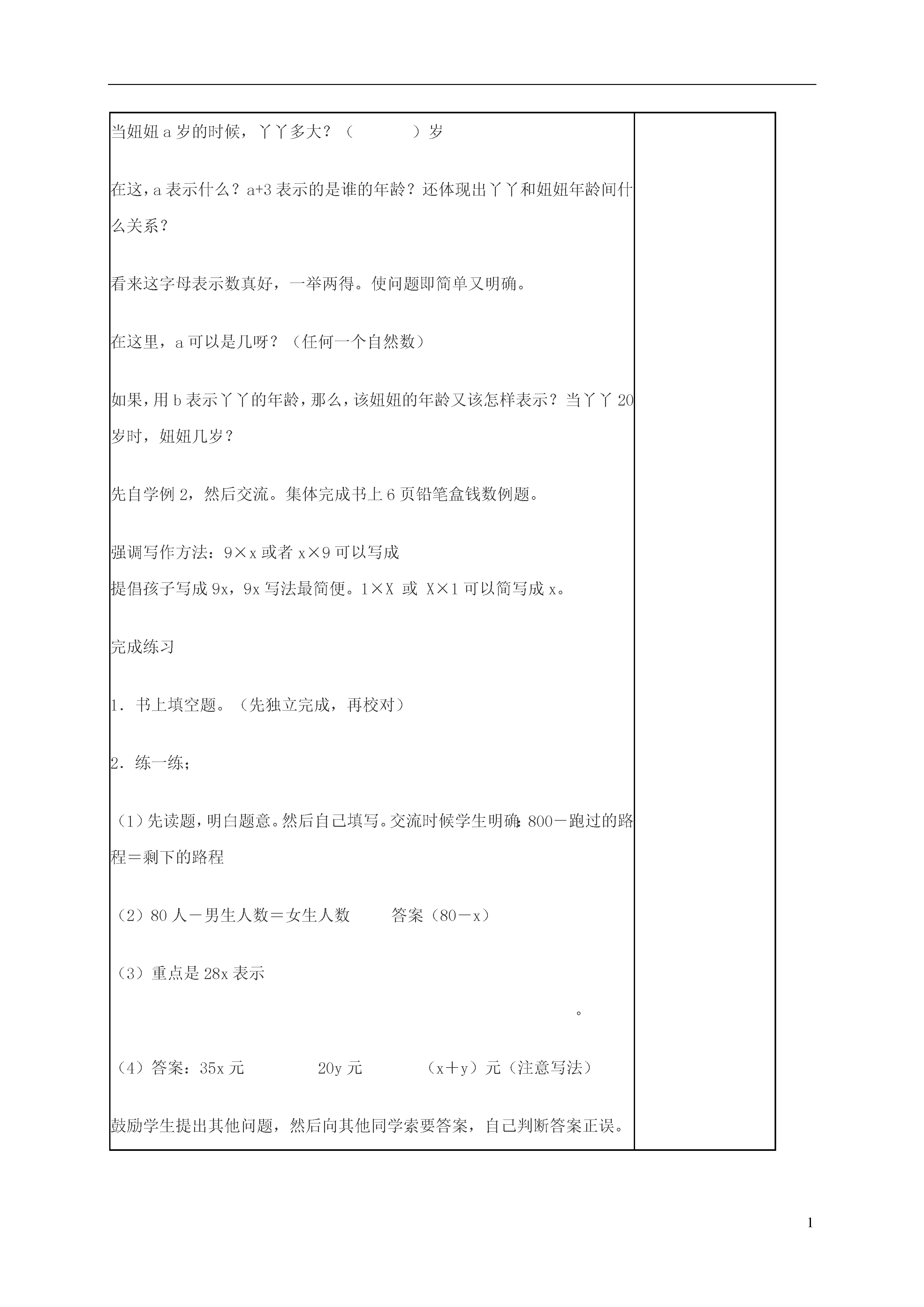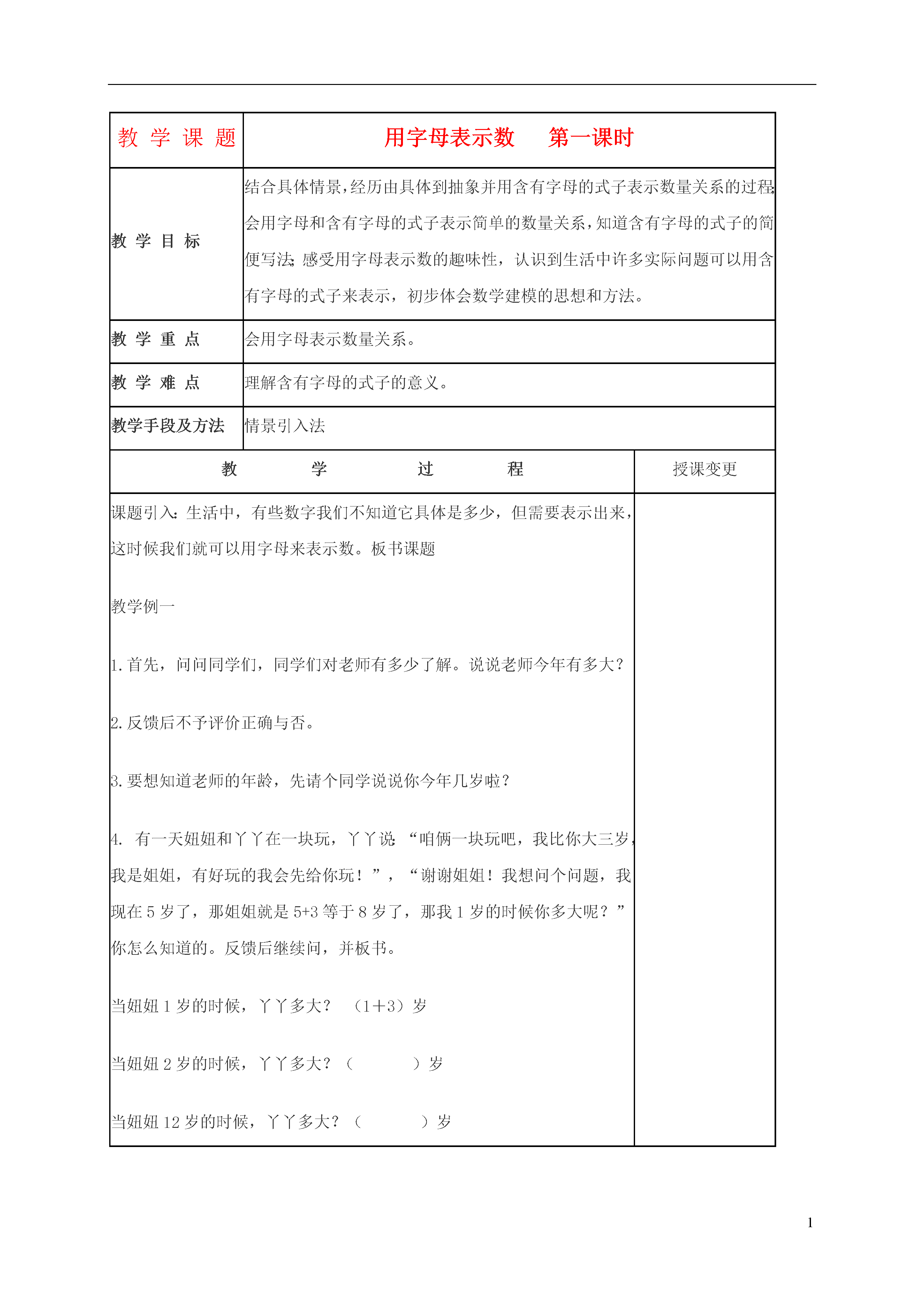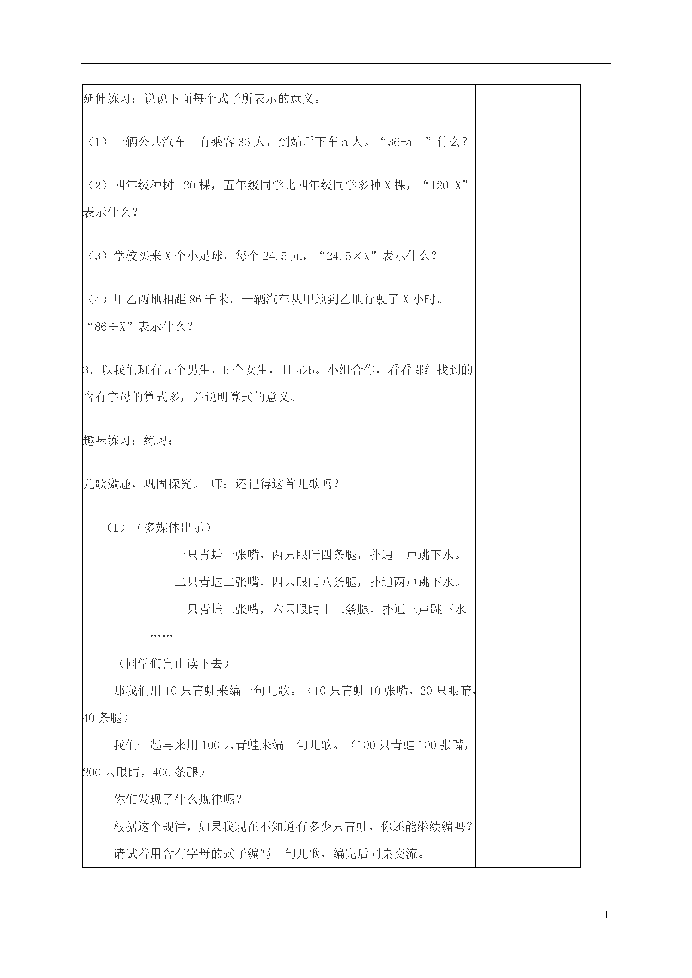 1教学课题用字母表示数第一课时教学目标结合具体情景,经历由具体到抽象并用含有字母的式子表示数量关系的过程;会用字母和含有字母的式子表示简单的数量关系,知道含有字母的式子的简便写法;感受用字母表示数的趣味性,认识到生活中许多实际问题可以用含有字母的式子来表示,初步体会数学建模的思想和方法。教学重点会用字母表示数量关系。教学难点理解含有字母的式子的意义。教学手段及方法情景引入法教学过程授课变更课题引入:生活中,有些数字我们不知道它具体是多少,但需要表示出来,这时候我们就可以用字母来表示数。板书课题教学例一1.首先,问问同学们,同学们对老师有多少了解。说说老师今年有多大?2.反馈后不予评价正确与否。3.要想知道老师的年龄,先请个同学说说你今年几岁啦?4.有一天妞妞和丫丫在一块玩,丫丫说:“咱俩一块玩吧,我比你大三岁,我是姐姐,有好玩的我会先给你玩!”,“谢谢姐姐!我想问个问题,我现在5岁了,那姐姐就是5+3等于8岁了,那我1岁的时候你多大呢?”你怎么知道的。反馈后继续问,并板书。当妞妞1岁的时候,丫丫多大?(1+3)岁当妞妞2岁的时候,丫丫多大?()岁当妞妞12岁的时候,丫丫多大?()岁当妞妞a岁的时候,丫丫多大?()岁在这,a表示什么?a+3表示的是谁的年龄?还体现出丫丫和妞妞年龄间什么关系?看来这字母表示数真好,一举两得。使问题即简单又明确。在这里,a可以是几呀?(任何一个自然数)如果,用b表示丫丫的年龄,那么,该妞妞的年龄又该怎样表示?当丫丫20岁时,妞妞几岁?先自学例2,然后交流。集体完成书上6页铅笔盒钱数例题。强调写作方法:9×x或者x×9可以写成,提倡孩子写成9x,9x写法最简便。1×X或X×1可以简写成x。完成练习1.书上填空题。(先独立完成,再校对)2.练一练;(1)先读题,明白题意。然后自己填写。交流时候学生明确:800-跑过的路程=剩下的路程(2)80人-男生人数=女生人数答案(80-x)(3)重点是28x表示。(4)答案:35x元20y元(x+y)元(注意写法)鼓励学生提出其他问题,然后向其他同学索要答案,自己判断答案正误。延伸练习:说说下面每个式子所表示的意义。(1)一辆公共汽车上有乘客36人,到站后下车a人。“36-a”什么?(2)四年级种树120棵,五年级同学比四年级同学多种X棵,“120+X”表示什么?(3)学校买来X个小足球,每个24.5元,“24.5×X”表示什么?(4)甲乙两地相距86千米,一辆汽车从甲地到乙地行驶了X小时。“86÷X”表示什么?3.以我们班有a个男生,b个女生,且a>b。小组合作,看看哪组找到的含有字母的算式多,并说明算式的意义。趣味练习:练习:儿歌激趣,巩固探究。师:还记得这首儿歌吗?(1)(多媒体出示)一只青蛙一张嘴,两只眼睛四条腿,扑通一声跳下水。二只青蛙二张嘴,四只眼睛八条腿,扑通两声跳下水。三只青蛙三张嘴,六只眼睛十二条腿,扑通三声跳下水。……(同学们自由读下去)那我们用10只青蛙来编一句儿歌。(10只青蛙10张嘴,20只眼睛,40条腿)我们一起再来用100只青蛙来编一句儿歌。(100只青蛙100张嘴,200只眼睛,400条腿)你们发现了什么规律呢?根据这个规律,如果我现在不知道有多少只青蛙,你还能继续编吗?请试着用含有字母的式子编写一句儿歌,编完后同桌交流。“a只青蛙a张嘴,a×2只眼睛a×4条腿”师:现在我们感到很自豪吧,把一首读不完的儿歌,通过用含有字母的式子表示其中的数量关系,结果一句话就可以读完了。字母在数学王国中的作用还真不小啊!教学反思