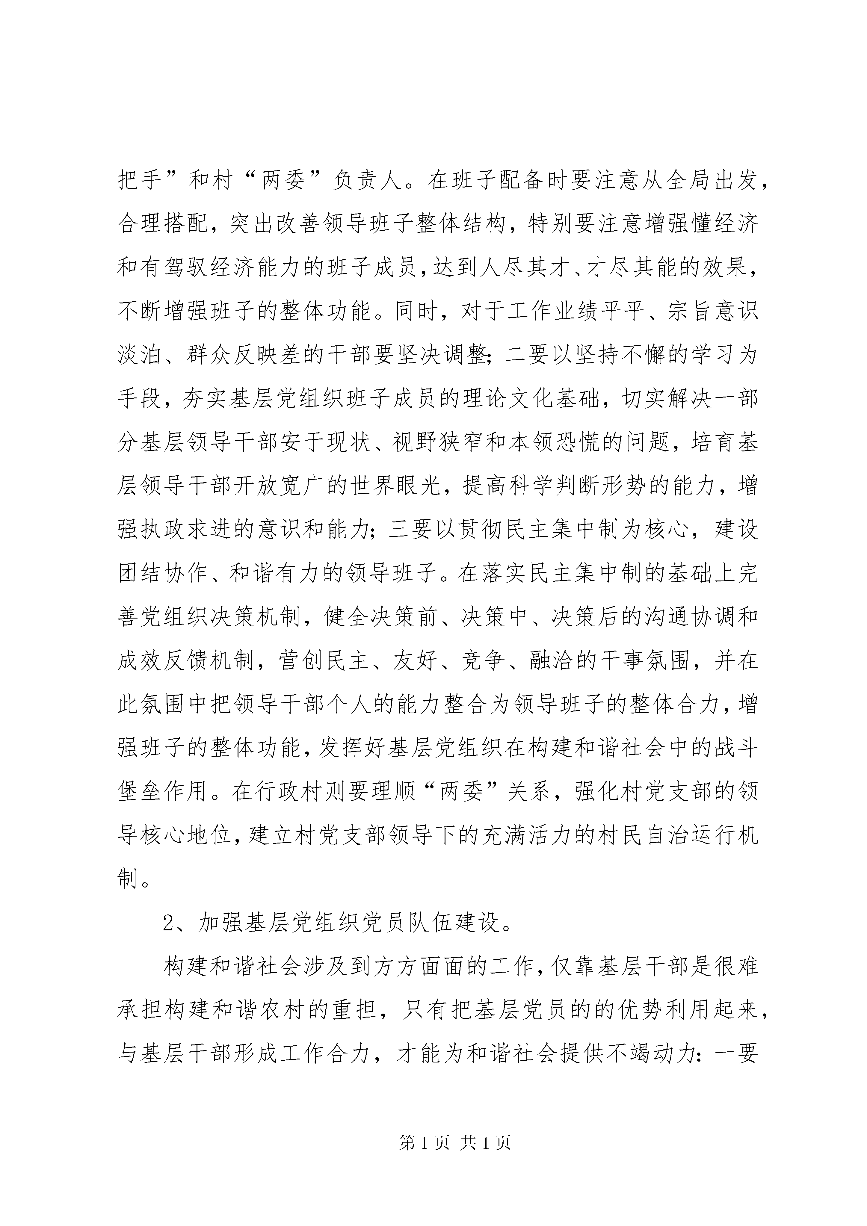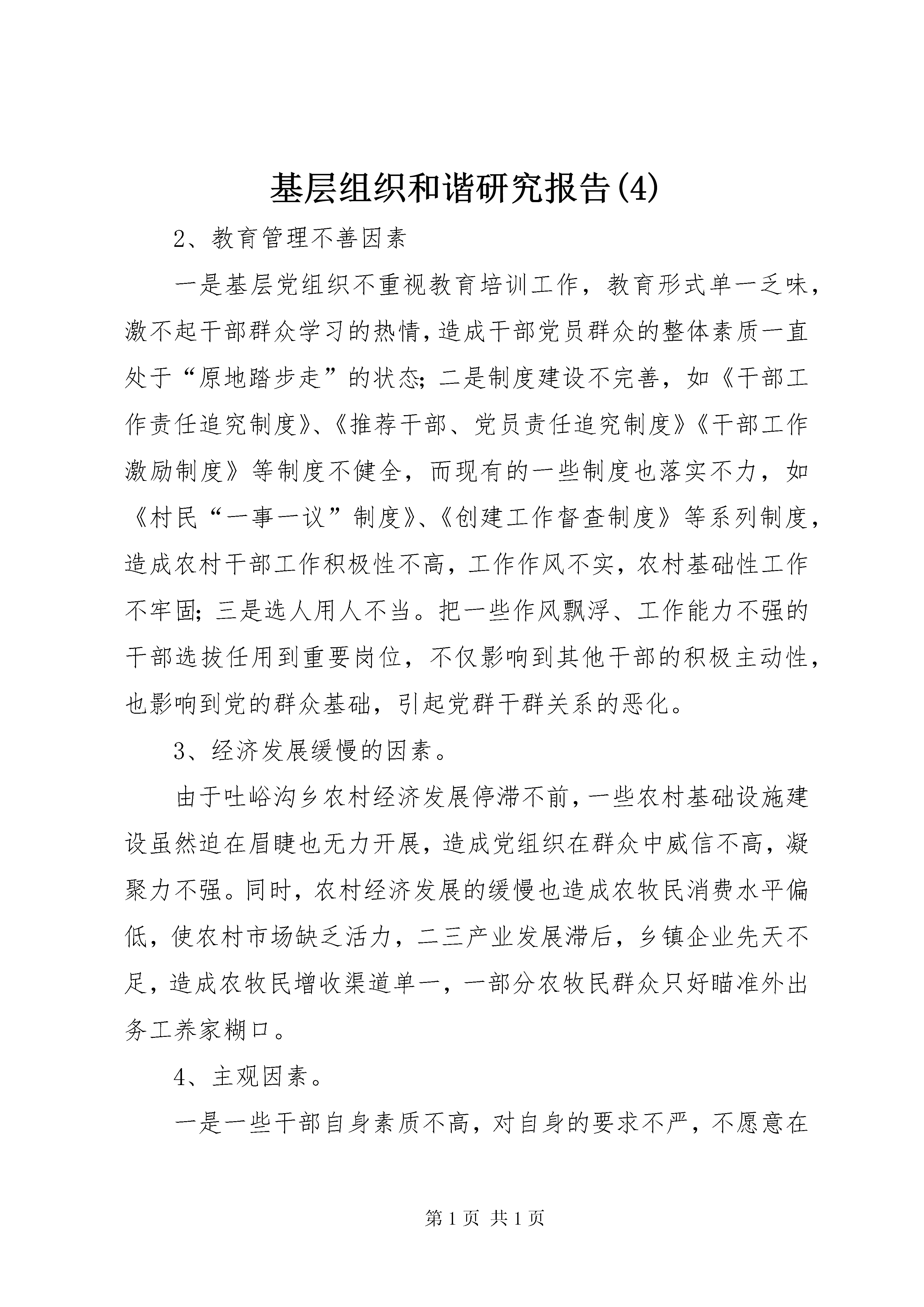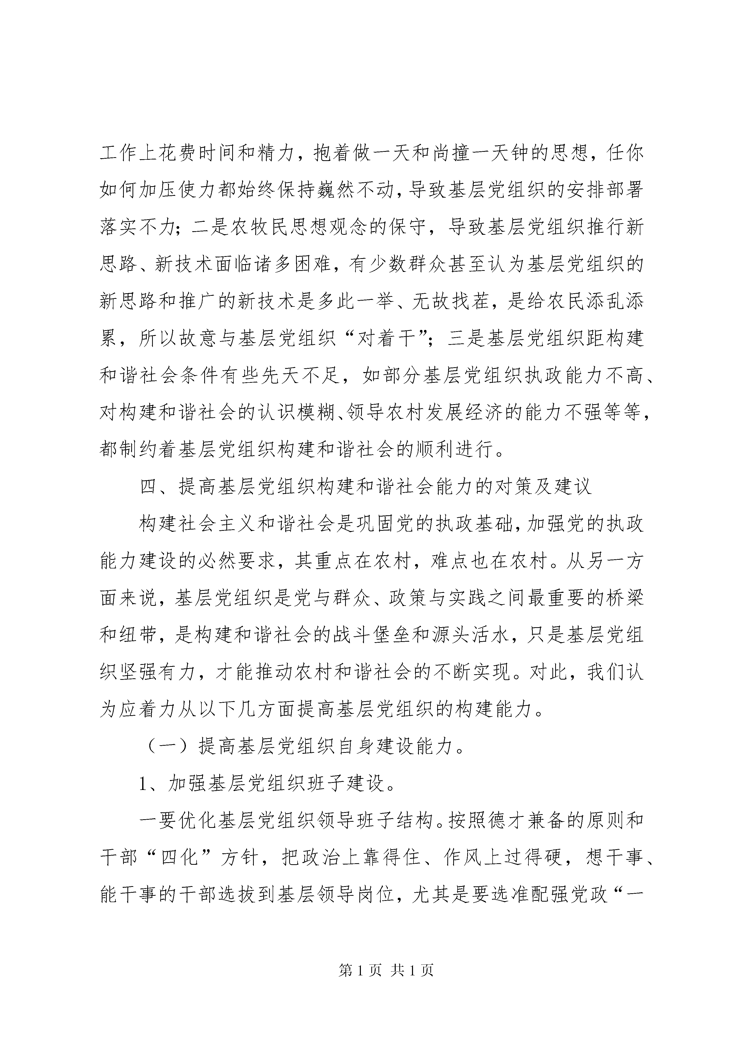 基层组织和谐研究报告(4)2、教育管理不善因素一是基层党组织不重视教育培训工作,教育形式单一乏味,激不起干部群众学习的热情,造成干部党员群众的整体素质一直处于“原地踏步走”的状态;二是制度建设不完善,如《干部工作责任追究制度》、《推荐干部、党员责任追究制度》《干部工作激励制度》等制度不健全,而现有的一些制度也落实不力,如《村民“一事一议”制度》、《创建工作督查制度》等系列制度,造成农村干部工作积极性不高,工作作风不实,农村基础性工作不牢固;三是选人用人不当。把一些作风飘浮、工作能力不强的干部选拔任用到重要岗位,不仅影响到其他干部的积极主动性,也影响到党的群众基础,引起党群干群关系的恶化。3、经济发展缓慢的因素。由于吐峪沟乡农村经济发展停滞不前,一些农村基础设施建设虽然迫在眉睫也无力开展,造成党组织在群众中威信不高,凝聚力不强。同时,农村经济发展的缓慢也造成农牧民消费水平偏低,使农村市场缺乏活力,二三产业发展滞后,乡镇企业先天不足,造成农牧民增收渠道单一,一部分农牧民群众只好瞄准外出务工养家糊口。4、主观因素。一是一些干部自身素质不高,对自身的要求不严,不愿意在工作上花费时间和精力,抱着做一天和尚撞一天钟的思想,任你如何加压使力都始终保持巍然不动,导致基层党组织的安排部署落实不力;二是农牧民思想观念的保守,导致基层党组织推行新思路、新技术面临诸多困难,有少数群众甚至认为基层党组织的新思路和推广的新技术是多此一举、无故找茬,是给农民添乱添累,所以故意与基层党组织“对着干”;三是基层党组织距构建和谐社会条件有些先天不足,如部分基层党组织执政能力不高、对构建和谐社会的认识模糊、领导农村发展经济的能力不强等等,都制约着基层党组织构建和谐社会的顺利进行。四、提高基层党组织构建和谐社会能力的对策及建议构建社会主义和谐社会是巩固党的执政基础,加强党的执政能力建设的必然要求,其重点在农村,难点也在农村。从另一方面来说,基层党组织是党与群众、政策与实践之间最重要的桥梁和纽带,是构建和谐社会的战斗堡垒和源头活水,只是基层党组织坚强有力,才能推动农村和谐社会的不断实现。对此,我们认为应着力从以下几方面提高基层党组织的构建能力。(一)提高基层党组织自身建设能力。1、加强基层党组织班子建设。一要优化基层党组织领导班子结构。按照德才兼备的原则和干部“四化”方针,把政治上靠得住、作风上过得硬,想干事、能干事的干部选拔到基层领导岗位,尤其是要选准配强党政“一把手”和村“两委”负责人。在班子配备时要注意从全局出发,合理搭配,突出改善领导班子整体结构,特别要注意增强懂经济和有驾驭经济能力的班子成员,达到人尽其才、才尽其能的效果,不断增强班子的整体功能。同时,对于工作业绩平平、宗旨意识淡泊、群众反映差的干部要坚决调整;二要以坚持不懈的学习为手段,夯实基层党组织班子成员的理论文化基础,切实解决一部分基层领导干部安于现状、视野狭窄和本领恐慌的问题,培育基层领导干部开放宽广的世界眼光,提高科学判断形势的能力,增强执政求进的意识和能力;三要以贯彻民主集中制为核心,建设团结协作、和谐有力的领导班子。在落实民主集中制的基础上完善党组织决策机制,健全决策前、决策中、决策后的沟通协调和成效反馈机制,营创民主、友好、竞争、融洽的干事氛围,并在此氛围中把领导干部个人的能力整合为领导班子的整体合力,增强班子的整体功能,发挥好基层党组织在构建和谐社会中的战斗堡垒作用。在行政村则要理顺“两委”关系,强化村党支部的领导核心地位,建立村党支部领导下的充满活力的村民自治运行机制。2、加强基层党组织党员队伍建设。构建和谐社会涉及到方方面面的工作,仅靠基层干部是很难承担构建和谐农村的重担,只有把基层党员的的优势利用起来,与基层干部形成工作合力,才能为和谐社会提供不竭动力:一要按照“实际、实用、实效”的原则,强化对党员的教育培训。要改进教育培训的方式方法,根据不同层次、不同岗位的党员进行分类分层教育,通过远程教育、党校培训、实地学习等多种教育形式,增强教育的针对性、主动性、前瞻性,使教育工作充满鲜明的时代气息,使基层广大党员在教育培训中成长为实用人才、致富能手,成为自觉自觉践行“三个代表”的典范;三要健全党内生活制度,并充分利用基层党员在思想上、感情上贴近群众的优势,激活党员发挥作用的工作机制和考评机制。同时,基层党组织要对党员政治上给予关怀、物质上给予扶持、生活上给予关心,增强党员的荣誉感,坚定为群众服务的信心,也带动和影响更多的先进分子向党组织靠拢,使基层党员队伍成为构建和谐社会的生力军。