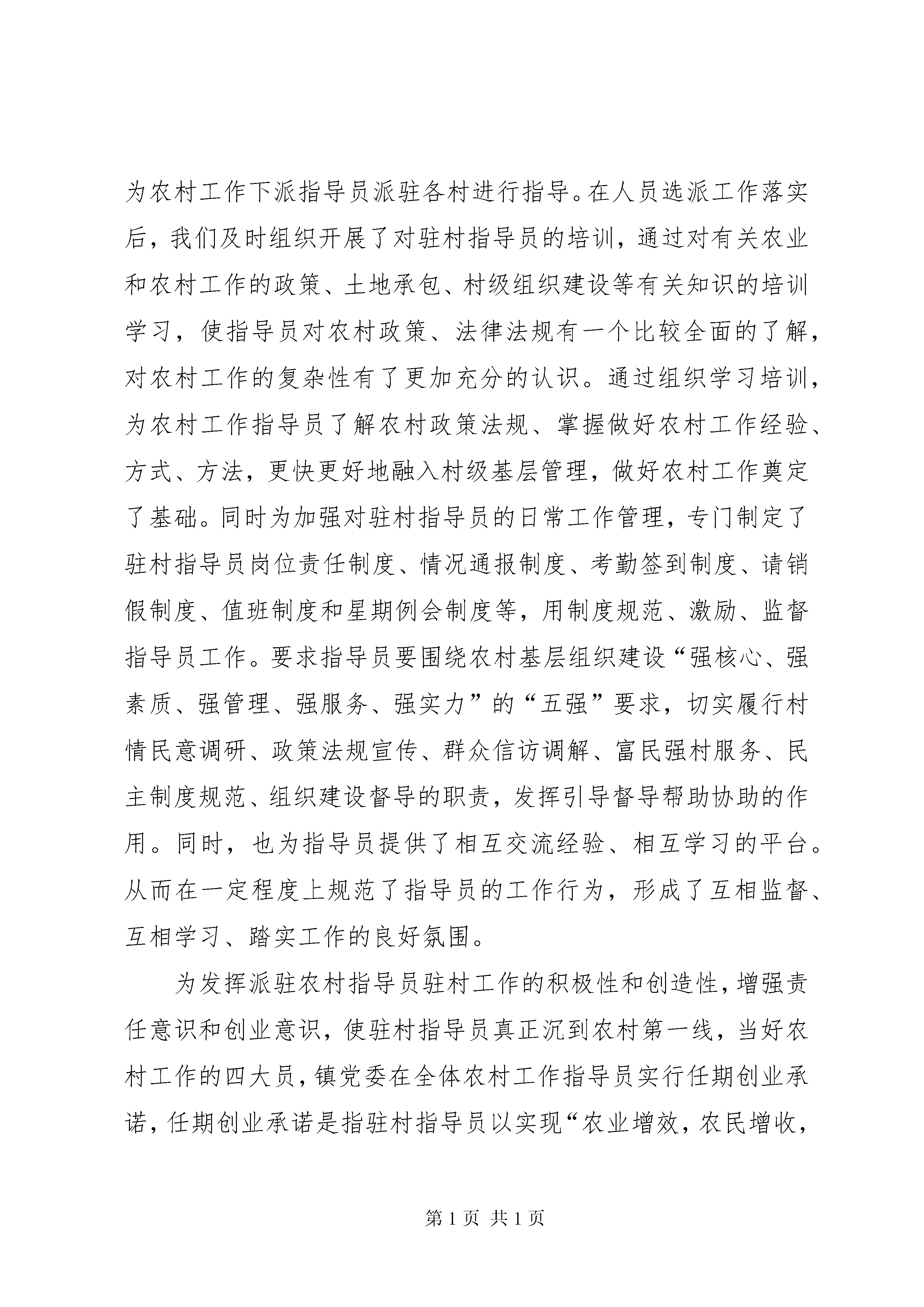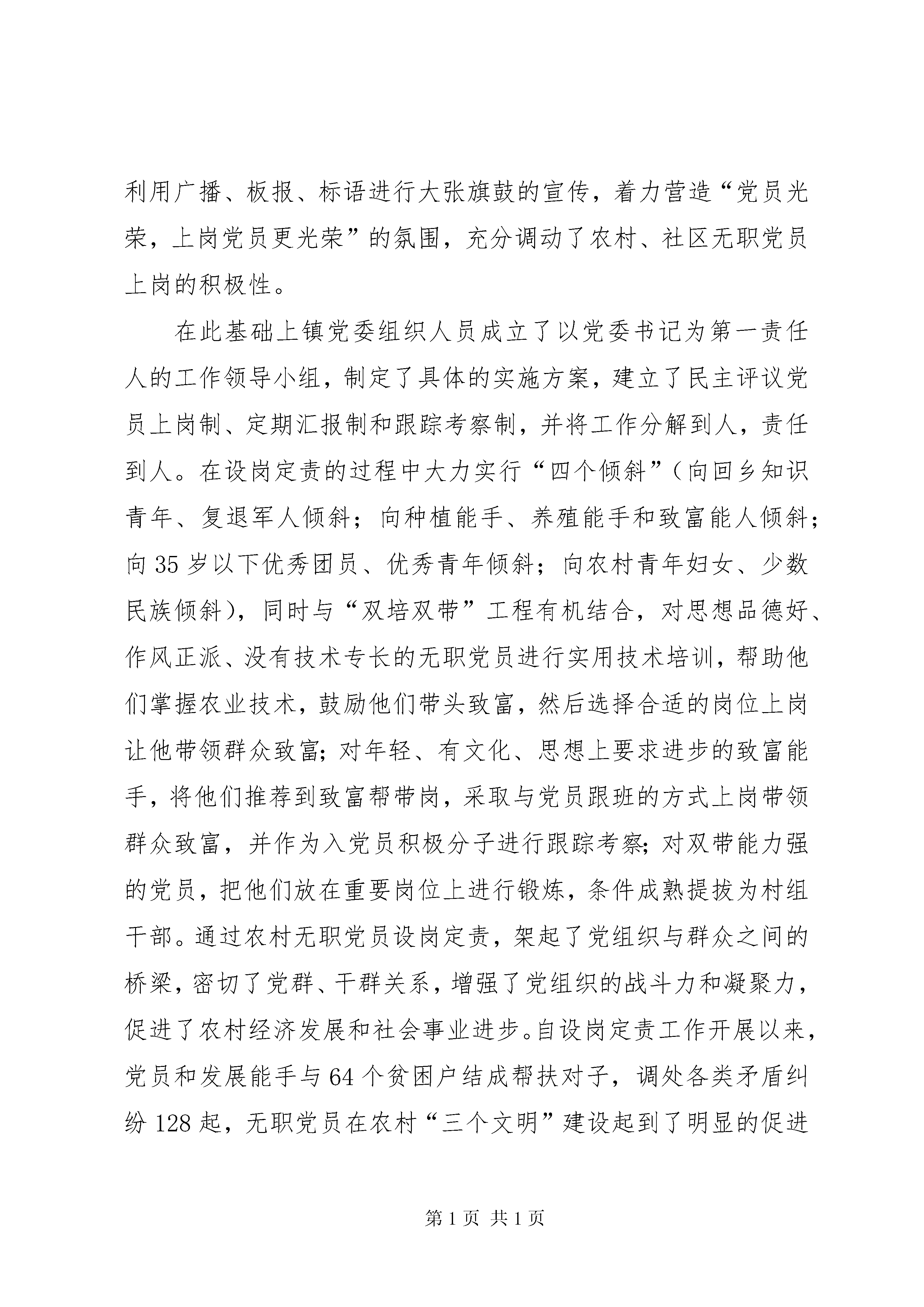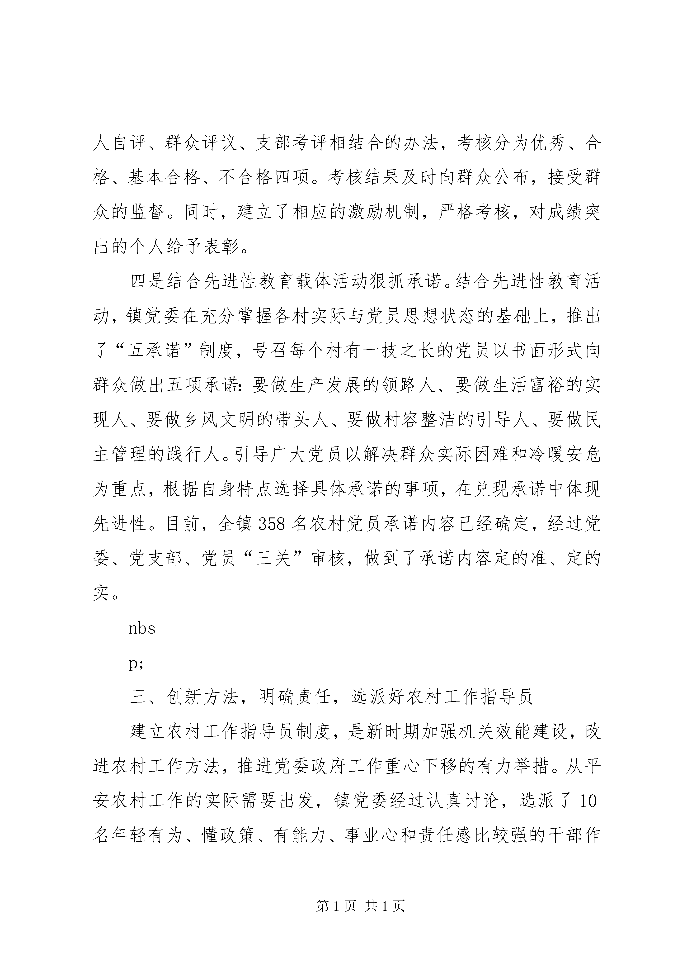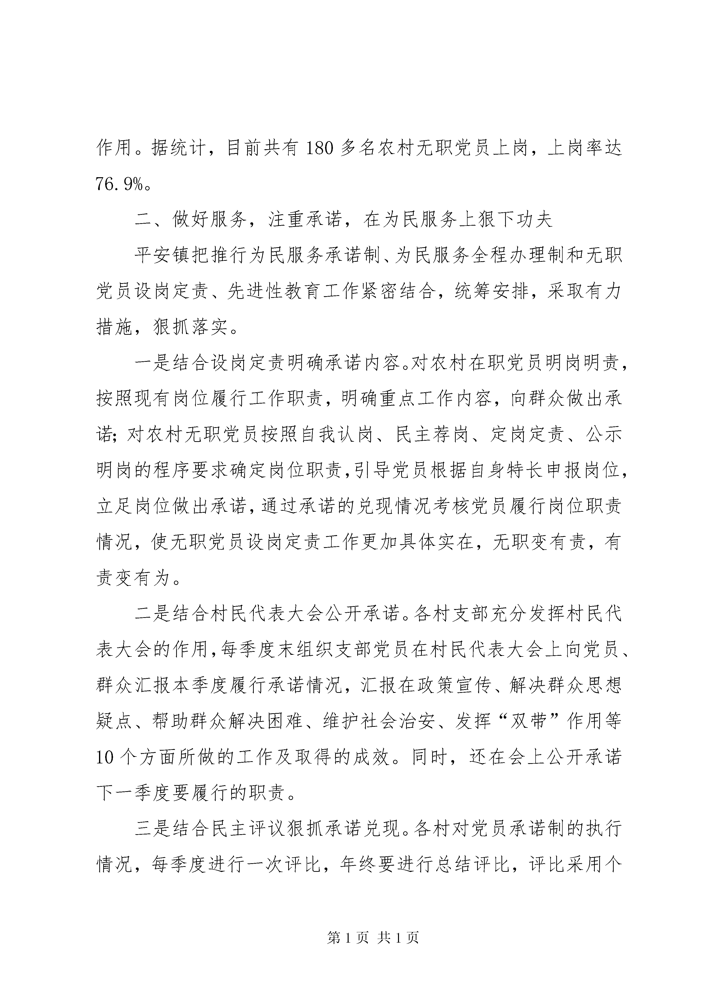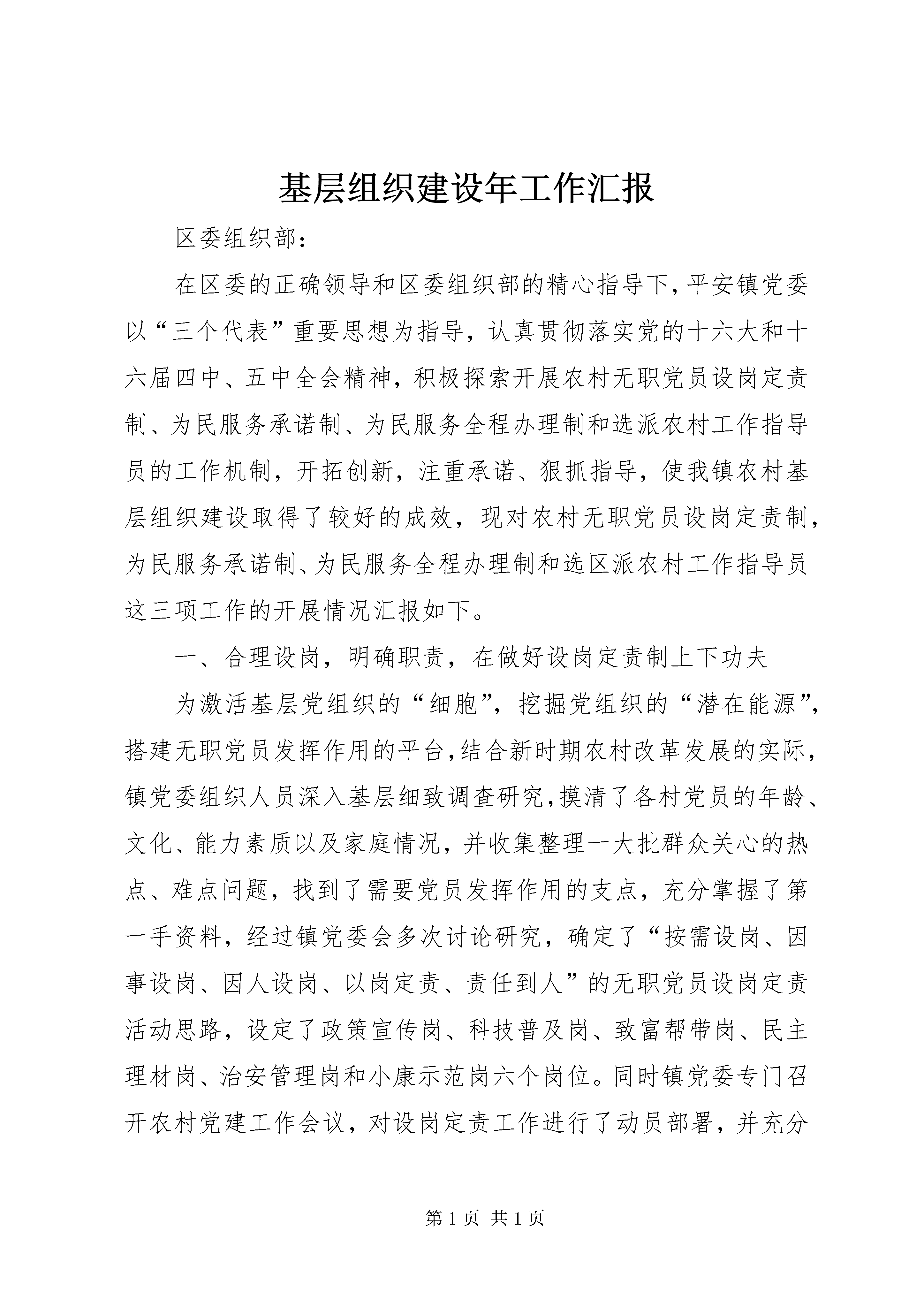 基层组织建设年工作汇报区委组织部:在区委的正确领导和区委组织部的精心指导下,平安镇党委以“三个代表”重要思想为指导,认真贯彻落实党的十六大和十六届四中、五中全会精神,积极探索开展农村无职党员设岗定责制、为民服务承诺制、为民服务全程办理制和选派农村工作指导员的工作机制,开拓创新,注重承诺、狠抓指导,使我镇农村基层组织建设取得了较好的成效,现对农村无职党员设岗定责制,为民服务承诺制、为民服务全程办理制和选区派农村工作指导员这三项工作的开展情况汇报如下。一、合理设岗,明确职责,在做好设岗定责制上下功夫为激活基层党组织的“细胞”,挖掘党组织的“潜在能源”,搭建无职党员发挥作用的平台,结合新时期农村改革发展的实际,镇党委组织人员深入基层细致调查研究,摸清了各村党员的年龄、文化、能力素质以及家庭情况,并收集整理一大批群众关心的热点、难点问题,找到了需要党员发挥作用的支点,充分掌握了第一手资料,经过镇党委会多次讨论研究,确定了“按需设岗、因事设岗、因人设岗、以岗定责、责任到人”的无职党员设岗定责活动思路,设定了政策宣传岗、科技普及岗、致富帮带岗、民主理材岗、治安管理岗和小康示范岗六个岗位。同时镇党委专门召开农村党建工作会议,对设岗定责工作进行了动员部署,并充分利用广播、板报、标语进行大张旗鼓的宣传,着力营造“党员光荣,上岗党员更光荣”的氛围,充分调动了农村、社区无职党员上岗的积极性。在此基础上镇党委组织人员成立了以党委书记为第一责任人的工作领导小组,制定了具体的实施方案,建立了民主评议党员上岗制、定期汇报制和跟踪考察制,并将工作分解到人,责任到人。在设岗定责的过程中大力实行“四个倾斜”(向回乡知识青年、复退军人倾斜;向种植能手、养殖能手和致富能人倾斜;向35岁以下优秀团员、优秀青年倾斜;向农村青年妇女、少数民族倾斜),同时与“双培双带”工程有机结合,对思想品德好、作风正派、没有技术专长的无职党员进行实用技术培训,帮助他们掌握农业技术,鼓励他们带头致富,然后选择合适的岗位上岗让他带领群众致富;对年轻、有文化、思想上要求进步的致富能手,将他们推荐到致富帮带岗,采取与党员跟班的方式上岗带领群众致富,并作为入党员积极分子进行跟踪考察;对双带能力强的党员,把他们放在重要岗位上进行锻炼,条件成熟提拔为村组干部。通过农村无职党员设岗定责,架起了党组织与群众之间的桥梁,密切了党群、干群关系,增强了党组织的战斗力和凝聚力,促进了农村经济发展和社会事业进步。自设岗定责工作开展以来,党员和发展能手与64个贫困户结成帮扶对子,调处各类矛盾纠纷128起,无职党员在农村“三个文明”建设起到了明显的促进作用。据统计,目前共有180多名农村无职党员上岗,上岗率达76.9%。二、做好服务,注重承诺,在为民服务上狠下功夫平安镇把推行为民服务承诺制、为民服务全程办理制和无职党员设岗定责、先进性教育工作紧密结合,统筹安排,采取有力措施,狠抓落实。一是结合设岗定责明确承诺内容。对农村在职党员明岗明责,按照现有岗位履行工作职责,明确重点工作内容,向群众做出承诺;对农村无职党员按照自我认岗、民主荐岗、定岗定责、公示明岗的程序要求确定岗位职责,引导党员根据自身特长申报岗位,立足岗位做出承诺,通过承诺的兑现情况考核党员履行岗位职责情况,使无职党员设岗定责工作更加具体实在,无职变有责,有责变有为。二是结合村民代表大会公开承诺。各村支部充分发挥村民代表大会的作用,每季度末组织支部党员在村民代表大会上向党员、群众汇报本季度履行承诺情况,汇报在政策宣传、解决群众思想疑点、帮助群众解决困难、维护社会治安、发挥“双带”作用等10个方面所做的工作及取得的成效。同时,还在会上公开承诺下一季度要履行的职责。三是结合民主评议狠抓承诺兑现。各村对党员承诺制的执行情况,每季度进行一次评比,年终要进行总结评比,评比采用个人自评、群众评议、支部考评相结合的办法,考核分为优秀、合格、基本合格、不合格四项。考核结果及时向群众公布,接受群众的监督。同时,建立了相应的激励机制,严格考核,对成绩突出的个人给予表彰。四是结合先进性教育载体活动狠抓承诺。结合先进性教育活动,镇党委在充分掌握各村实际与党员思想状态的基础上,推出了“五承诺”制度,号召每个村有一技之长的党员以书面形式向群众做出五项承诺:要做生产发展的领路人、要做生活富裕的实现人、要做乡风文明的带头人、要做村容整洁的引导人、要做民主管理的践行人。引导广大党员以解决群众实际困难和冷暖安危为重点,根据自身特点选择具体承诺的事项,在兑现承诺中体现先进性。目前,全镇358名农村党员承诺内容已经确定,经过党委、党支部、党员“三关”审核,做到了承诺内容定的准、定的实。nbsp;三、创新方法,明确责任,选派好农村工作指导员建立农村工作指导员制度,是新时期加强机