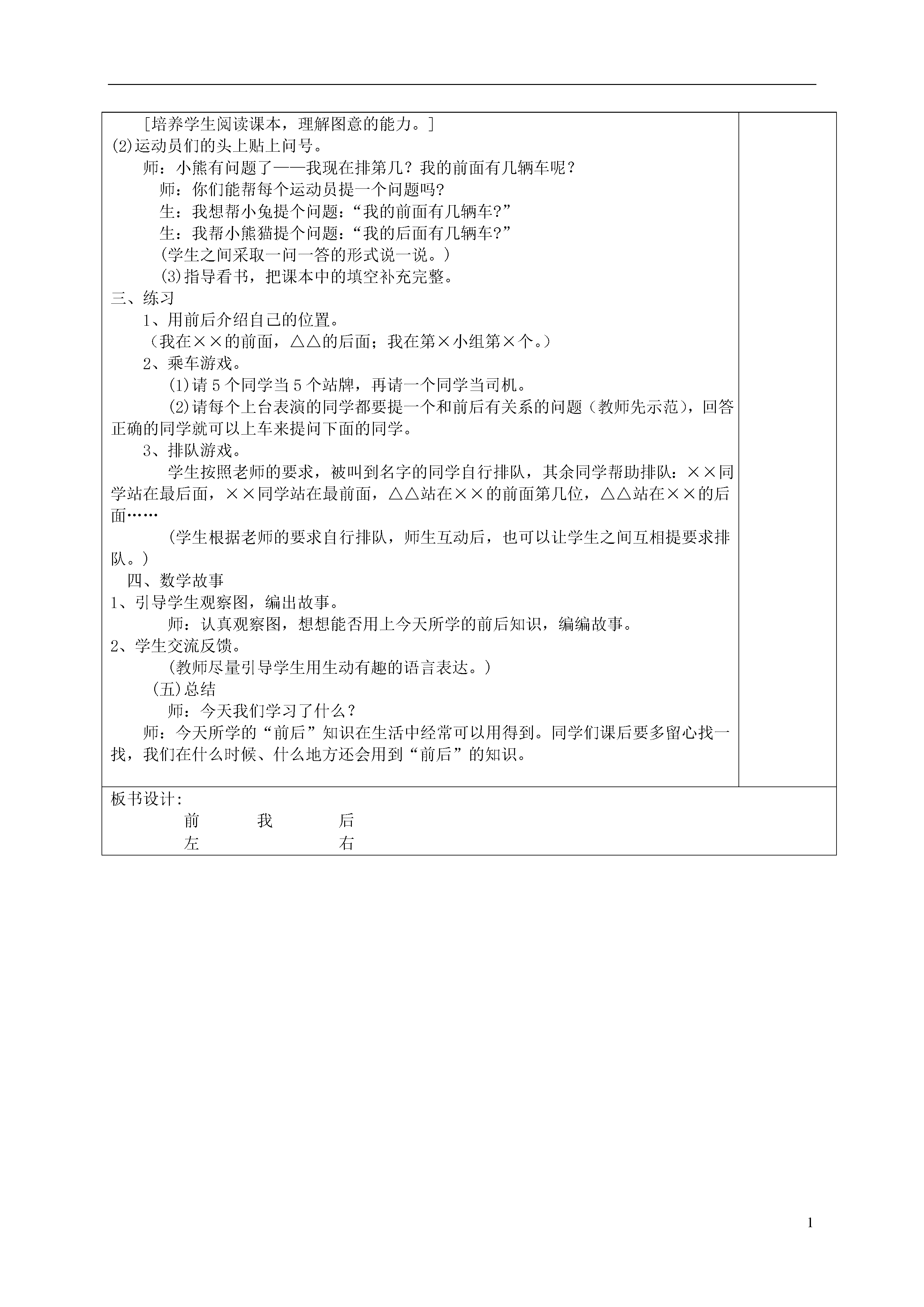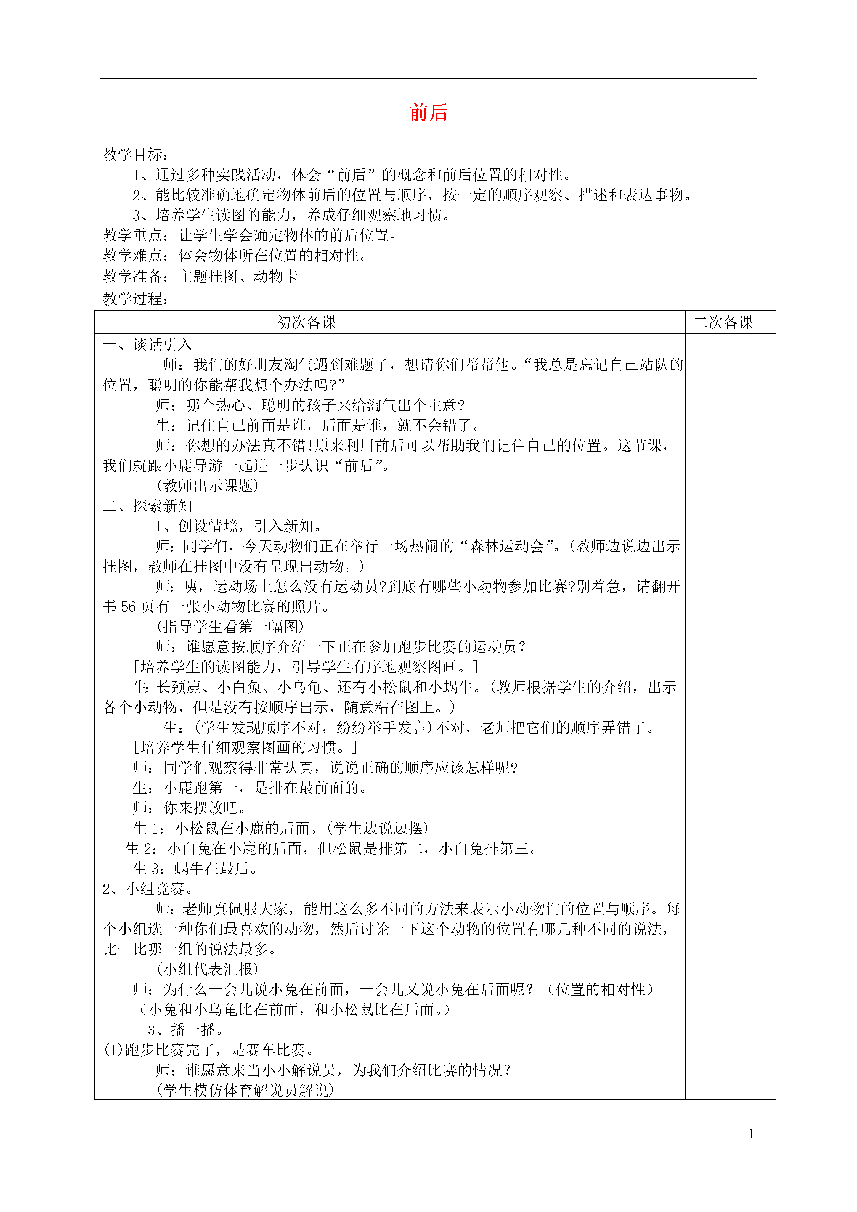1前后教学目标:1、通过多种实践活动,体会“前后”的概念和前后位置的相对性。2、能比较准确地确定物体前后的位置与顺序,按一定的顺序观察、描述和表达事物。3、培养学生读图的能力,养成仔细观察地习惯。教学重点:让学生学会确定物体的前后位置。教学难点:体会物体所在位置的相对性。教学准备:主题挂图、动物卡教学过程:初次备课二次备课一、谈话引入师:我们的好朋友淘气遇到难题了,想请你们帮帮他。“我总是忘记自己站队的位置,聪明的你能帮我想个办法吗?”师:哪个热心、聪明的孩子来给淘气出个主意?生:记住自己前面是谁,后面是谁,就不会错了。师:你想的办法真不错!原来利用前后可以帮助我们记住自己的位置。这节课,我们就跟小鹿导游一起进一步认识“前后”。(教师出示课题)二、探索新知1、创设情境,引入新知。师:同学们,今天动物们正在举行一场热闹的“森林运动会”。(教师边说边出示挂图,教师在挂图中没有呈现出动物。)师:咦,运动场上怎么没有运动员?到底有哪些小动物参加比赛?别着急,请翻开书56页有一张小动物比赛的照片。(指导学生看第一幅图)师:谁愿意按顺序介绍一下正在参加跑步比赛的运动员?[培养学生的读图能力,引导学生有序地观察图画。]生:长颈鹿、小白兔、小乌龟、还有小松鼠和小蜗牛。(教师根据学生的介绍,出示各个小动物,但是没有按顺序出示,随意粘在图上。)生:(学生发现顺序不对,纷纷举手发言)不对,老师把它们的顺序弄错了。[培养学生仔细观察图画的习惯。]师:同学们观察得非常认真,说说正确的顺序应该怎样呢?生:小鹿跑第一,是排在最前面的。师:你来摆放吧。生1:小松鼠在小鹿的后面。(学生边说边摆)生2:小白兔在小鹿的后面,但松鼠是排第二,小白兔排第三。生3:蜗牛在最后。2、小组竞赛。师:老师真佩服大家,能用这么多不同的方法来表示小动物们的位置与顺序。每个小组选一种你们最喜欢的动物,然后讨论一下这个动物的位置有哪几种不同的说法,比一比哪一组的说法最多。(小组代表汇报)师:为什么一会儿说小兔在前面,一会儿又说小兔在后面呢?(位置的相对性)(小兔和小乌龟比在前面,和小松鼠比在后面。)3、播一播。(1)跑步比赛完了,是赛车比赛。师:谁愿意来当小小解说员,为我们介绍比赛的情况?(学生模仿体育解说员解说)[培养学生阅读课本,理解图意的能力。](2)运动员们的头上贴上问号。师:小熊有问题了——我现在排第几?我的前面有几辆车呢?师:你们能帮每个运动员提一个问题吗?生:我想帮小兔提个问题:“我的前面有几辆车?”生:我帮小熊猫提个问题:“我的后面有几辆车?”(学生之间采取一问一答的形式说一说。)(3)指导看书,把课本中的填空补充完整。三、练习1、用前后介绍自己的位置。(我在××的前面,△△的后面;我在第×小组第×个。)2、乘车游戏。(1)请5个同学当5个站牌,再请一个同学当司机。(2)请每个上台表演的同学都要提一个和前后有关系的问题(教师先示范),回答正确的同学就可以上车来提问下面的同学。3、排队游戏。学生按照老师的要求,被叫到名字的同学自行排队,其余同学帮助排队:××同学站在最后面,××同学站在最前面,△△站在××的前面第几位,△△站在××的后面……(学生根据老师的要求自行排队,师生互动后,也可以让学生之间互相提要求排队。)四、数学故事1、引导学生观察图,编出故事。师:认真观察图,想想能否用上今天所学的前后知识,编编故事。2、学生交流反馈。(教师尽量引导学生用生动有趣的语言表达。)(五)总结师:今天我们学习了什么?师:今天所学的“前后”知识在生活中经常可以用得到。同学们课后要多留心找一找,我们在什么时候、什么地方还会用到“前后”的知识。板书设计:前我后左右