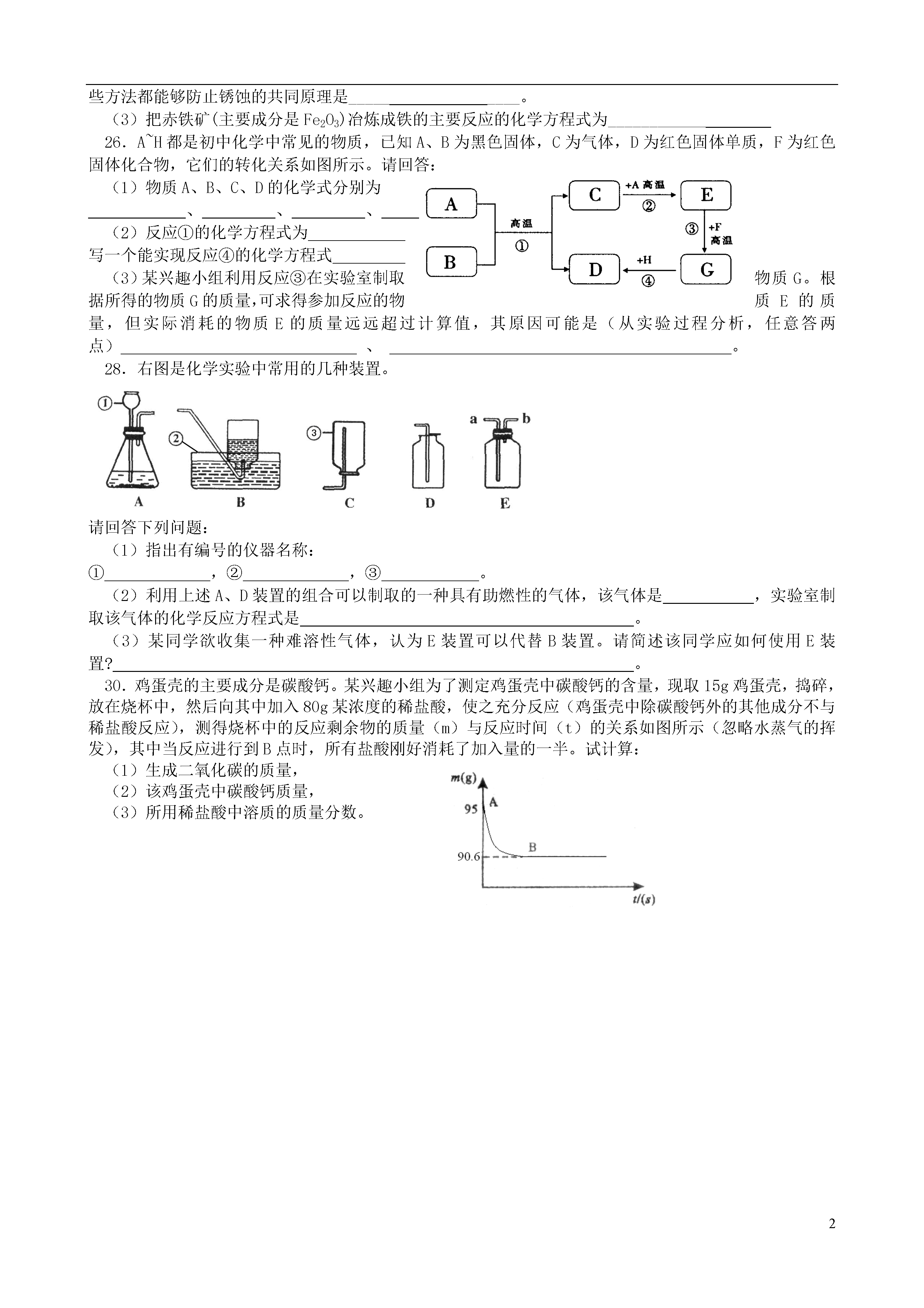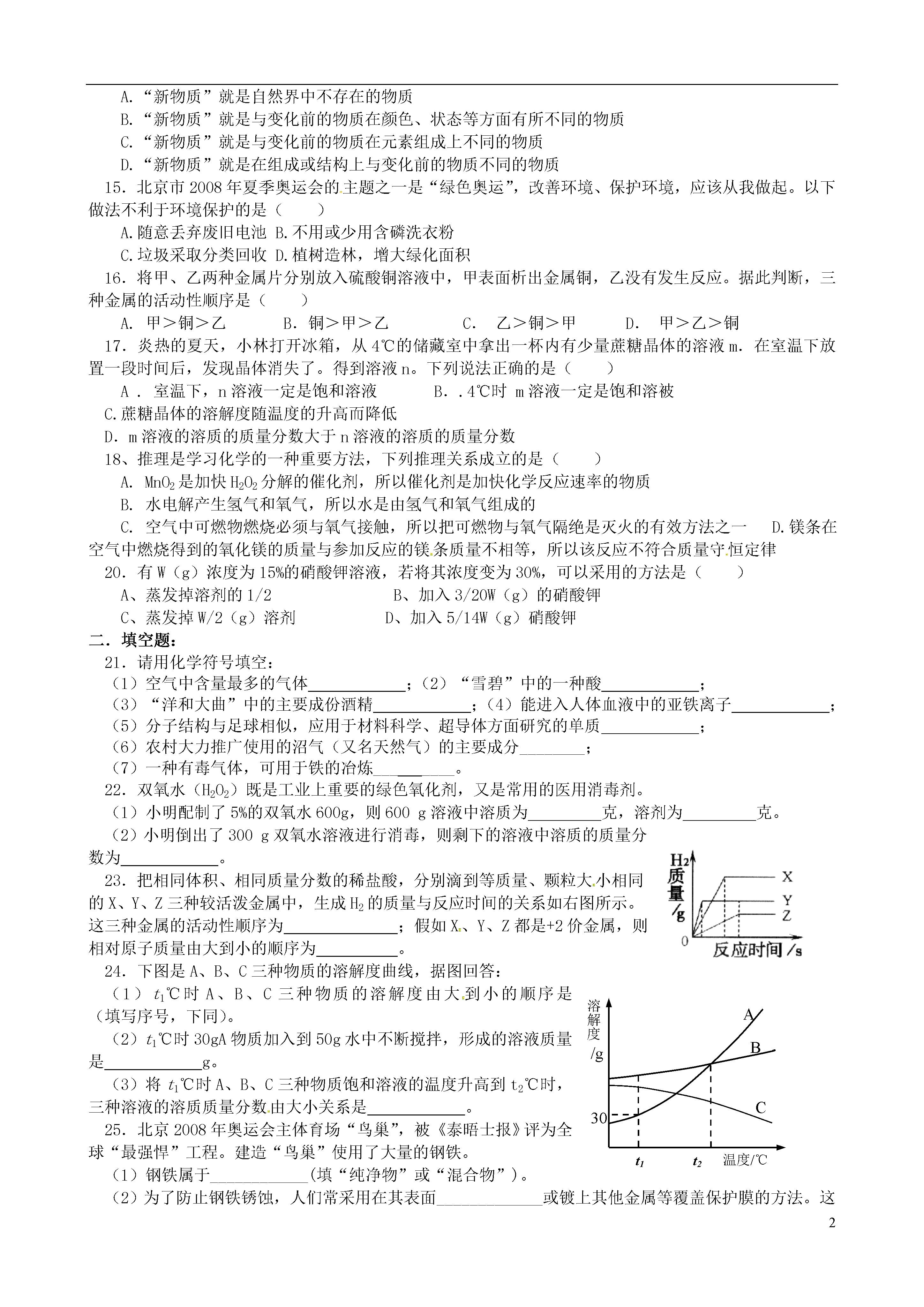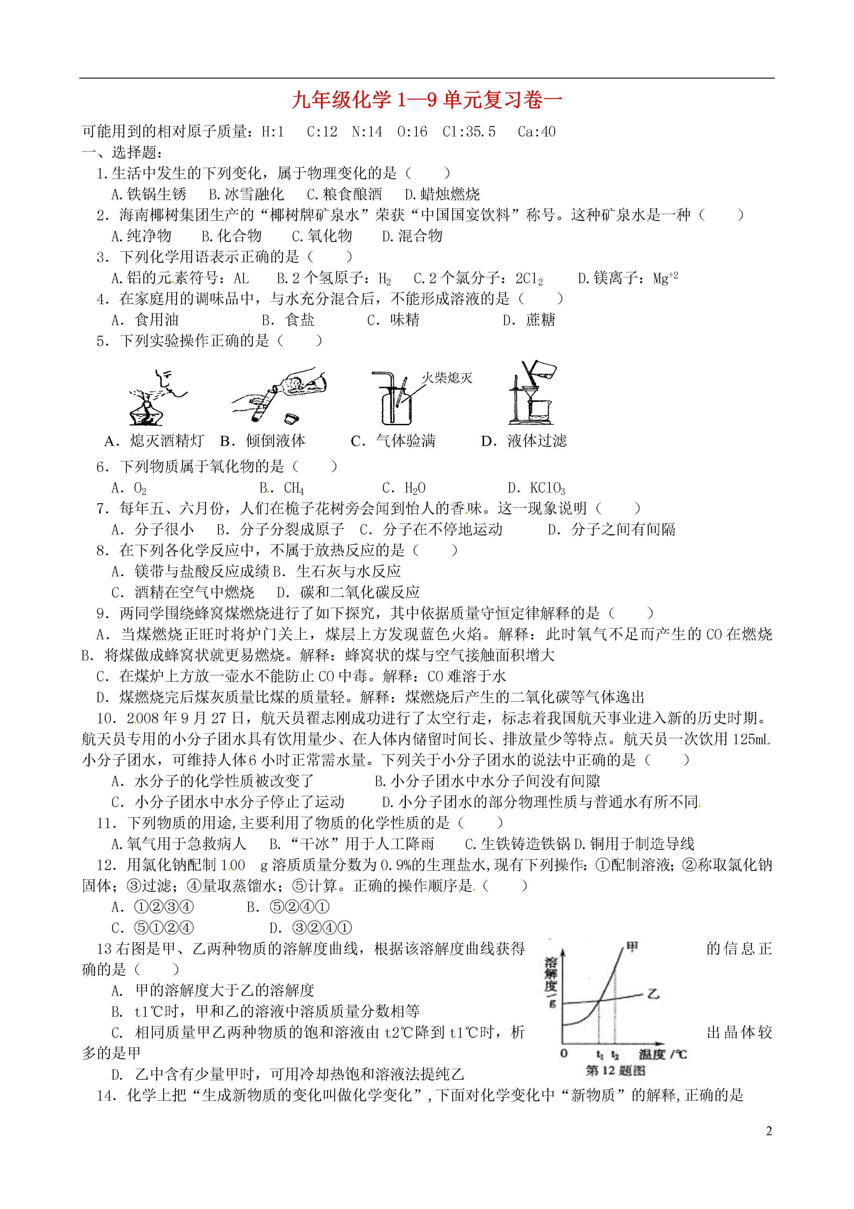 2九年级化学1—9单元复习卷一可能用到的相对原子质量:H:1C:12N:14O:16Cl:35.5Ca:40一、选择题:1.生活中发生的下列变化,属于物理变化的是()A.铁锅生锈B.冰雪融化C.粮食酿酒D.蜡烛燃烧2.海南椰树集团生产的“椰树牌矿泉水”荣获“中国国宴饮料”称号。这种矿泉水是一种()A.纯净物B.化合物C.氧化物D.混合物3.下列化学用语表示正确的是()A.铝的元素符号:ALB.2个氢原子:H2C.2个氯分子:2Cl2D.镁离子:Mg+24.在家庭用的调味品中,与水充分混合后,不能形成溶液的是()A.食用油B.食盐C.味精D.蔗糖5.下列实验操作正确的是()A.熄灭酒精灯B.倾倒液体C.气体验满D.液体过滤火柴熄灭6.下列物质属于氧化物的是()A.O2B.CH4C.H2OD.KClO37.每年五、六月份,人们在桅子花树旁会闻到怡人的香味。这一现象说明()A.分子很小B.分子分裂成原子C.分子在不停地运动D.分子之间有间隔8.在下列各化学反应中,不属于放热反应的是()A.镁带与盐酸反应成绩B.生石灰与水反应C.酒精在空气中燃烧D.碳和二氧化碳反应9.两同学围绕蜂窝煤燃烧进行了如下探究,其中依据质量守恒定律解释的是()A.当煤燃烧正旺时将炉门关上,煤层上方发现蓝色火焰。解释:此时氧气不足而产生的CO在燃烧B.将煤做成蜂窝状就更易燃烧。解释:蜂窝状的煤与空气接触面积增大C.在煤炉上方放一壶水不能防止CO中毒。解释:CO难溶于水D.煤燃烧完后煤灰质量比煤的质量轻。解释:煤燃烧后产生的二氧化碳等气体逸出10.2008年9月27日,航天员翟志刚成功进行了太空行走,标志着我国航天事业进入新的历史时期。航天员专用的小分子团水具有饮用量少、在人体内储留时间长、排放量少等特点。航天员一次饮用125mL小分子团水,可维持人体6小时正常需水量。下列关于小分子团水的说法中正确的是()A.水分子的化学性质被改变了B.小分子团水中水分子间没有间隙C.小分子团水中水分子停止了运动D.小分子团水的部分物理性质与普通水有所不同11.下列物质的用途,主要利用了物质的化学性质的是()A.氧气用于急救病人B.“干冰”用于人工降雨C.生铁铸造铁锅D.铜用于制造导线12.用氯化钠配制100g溶质质量分数为0.9%的生理盐水,现有下列操作:①配制溶液;②称取氯化钠固体;③过滤;④量取蒸馏水;⑤计算。正确的操作顺序是()A.①②③④B.⑤②④①C.⑤①②④D.③②④①13右图是甲、乙两种物质的溶解度曲线,根据该溶解度曲线获得的信息正确的是()A.甲的溶解度大于乙的溶解度B.t1℃时,甲和乙的溶液中溶质质量分数相等C.相同质量甲乙两种物质的饱和溶液由t2℃降到t1℃时,析出晶体较多的是甲D.乙中含有少量甲时,可用冷却热饱和溶液法提纯乙14.化学上把“生成新物质的变化叫做化学变化”,下面对化学变化中“新物质”的解释,正确的是A.“新物质”就是自然界中不存在的物质B.“新物质”就是与变化前的物质在颜色、状态等方面有所不同的物质C.“新物质”就是与变化前的物质在元素组成上不同的物质D.“新物质”就是在组成或结构上与变化前的物质不同的物质15.北京市2008年夏季奥运会的主题之一是“绿色奥运”,改善环境、保护环境,应该从我做起。以下做法不利于环境保护的是()A.随意丢弃废旧电池B.不用或少用含磷洗衣粉C.垃圾采取分类回收D.植树造林,增大绿化面积16.将甲、乙两种金属片分别放入硫酸铜溶液中,甲表面析出金属铜,乙没有发生反应。据此判断,三种金属的活动性顺序是()A.甲>铜>乙B.铜>甲>乙C.乙>铜>甲D.甲>乙>铜17.炎热的夏天,小林打开冰箱,从4℃的储藏室中拿出一杯内有少量蔗糖晶体的溶液m.在室温下放置一段时间后,发现晶体消失了。得到溶液n。下列说法正确的是()A.室温下,n溶液一定是饱和溶液B..4℃时m溶液一定是饱和溶被C.蔗糖晶体的溶解度随温度的升高而降低D.m溶液的溶质的质量分数大于n溶液的溶质的质量分数18、推理是学习化学的一种重要方法,下列推理关系成立的是()A.MnO2是加快H2O2分解的催化剂,所以催化剂是加快化学反应速率的物质B.水电解产生氢气和氧气,所以水是由氢气和氧气组成的C.空气中可燃物燃烧必须与氧气接触,所以把可燃物与氧气隔绝是灭火的有效方法之一D.镁条在空气中燃烧得到的氧化镁的质量与参加反应的镁条质量不相等,所以该反应不符合质量守恒定律20.有W(g)浓度为15%的硝酸钾溶液,若将其浓度变为30%,可以采用的方法是()A、蒸发掉溶剂的1/2B、加入3/20W(g)的硝酸钾C、蒸发掉W/2(g)溶剂D、加入5