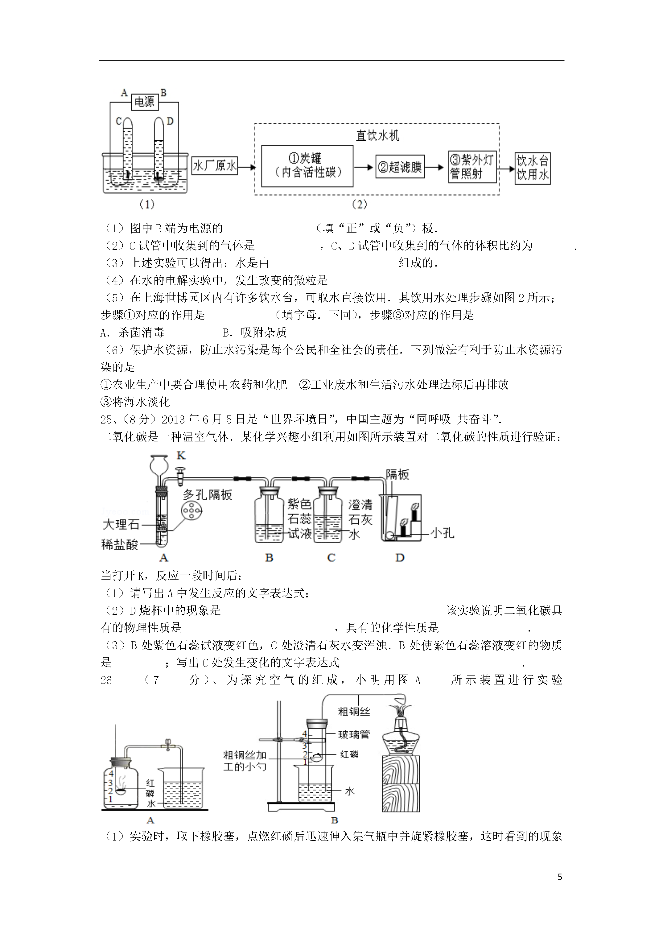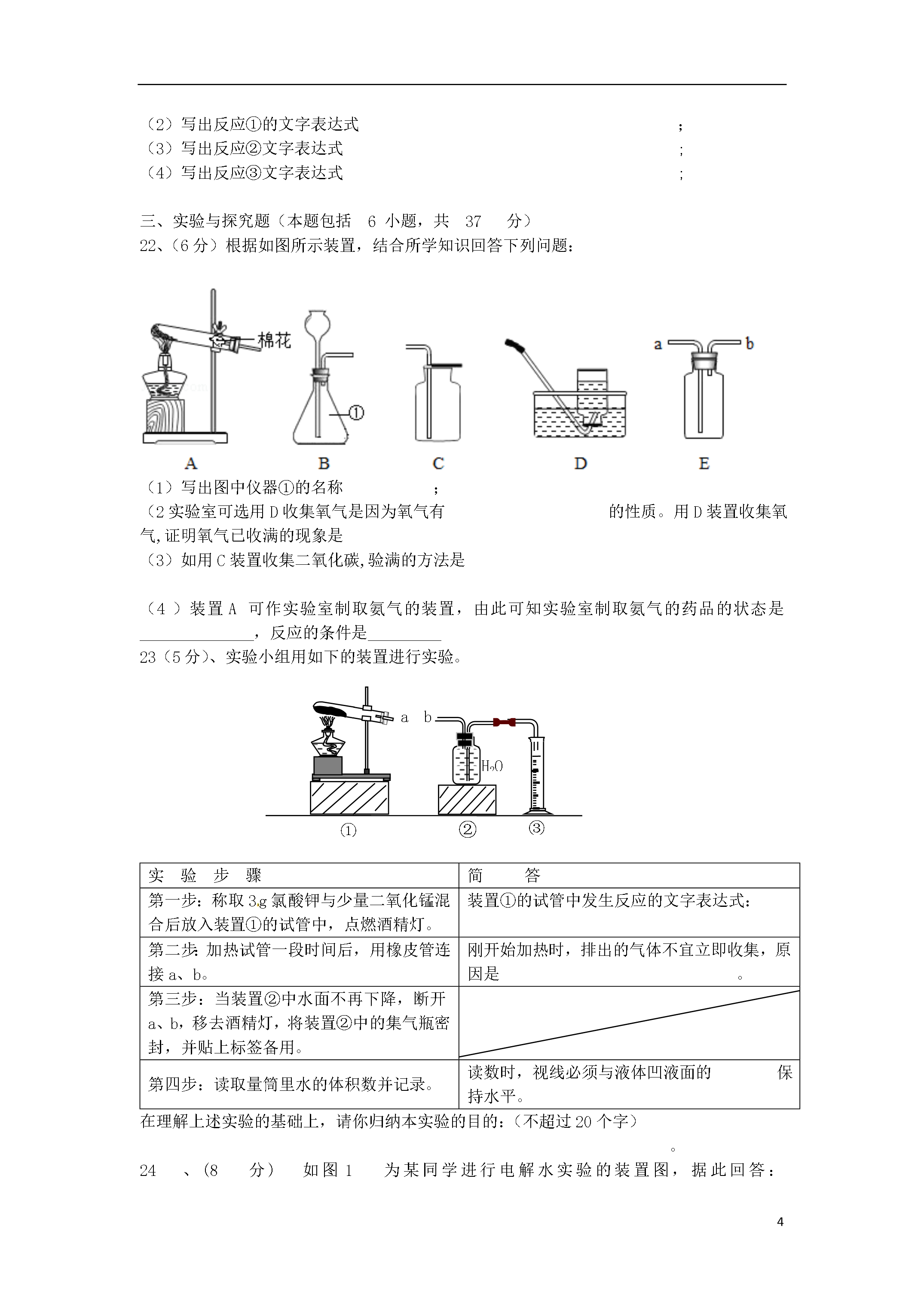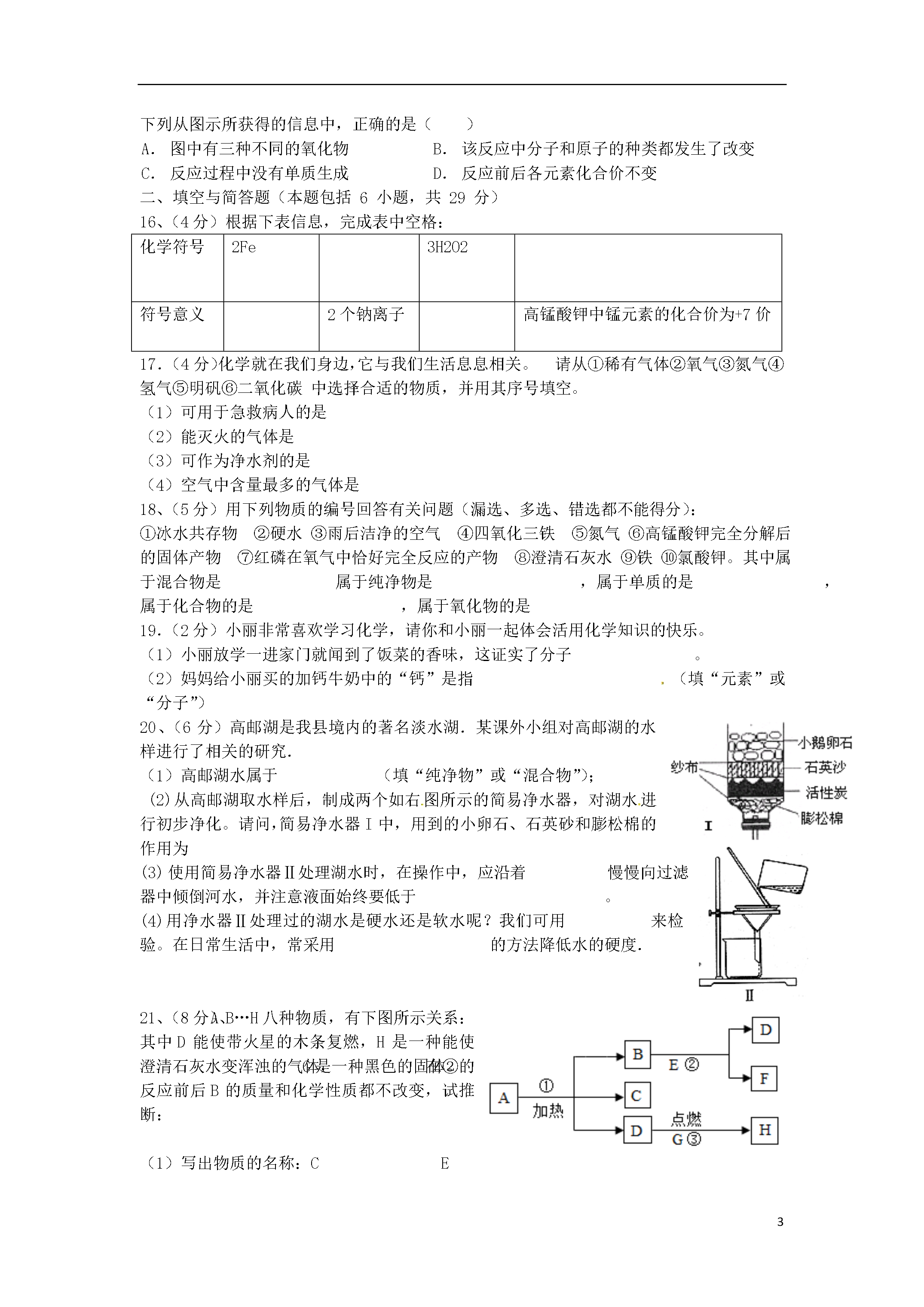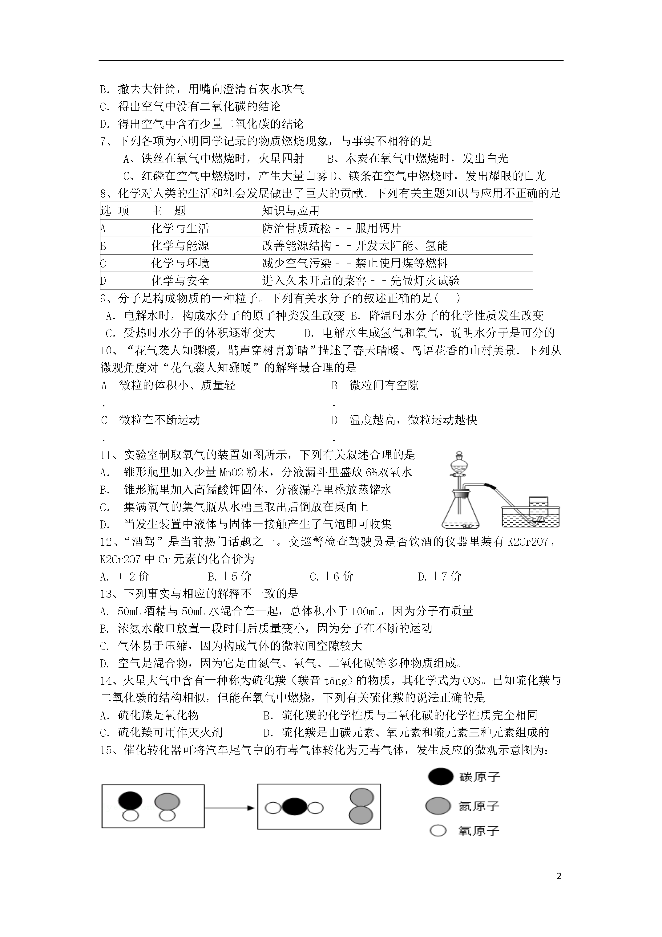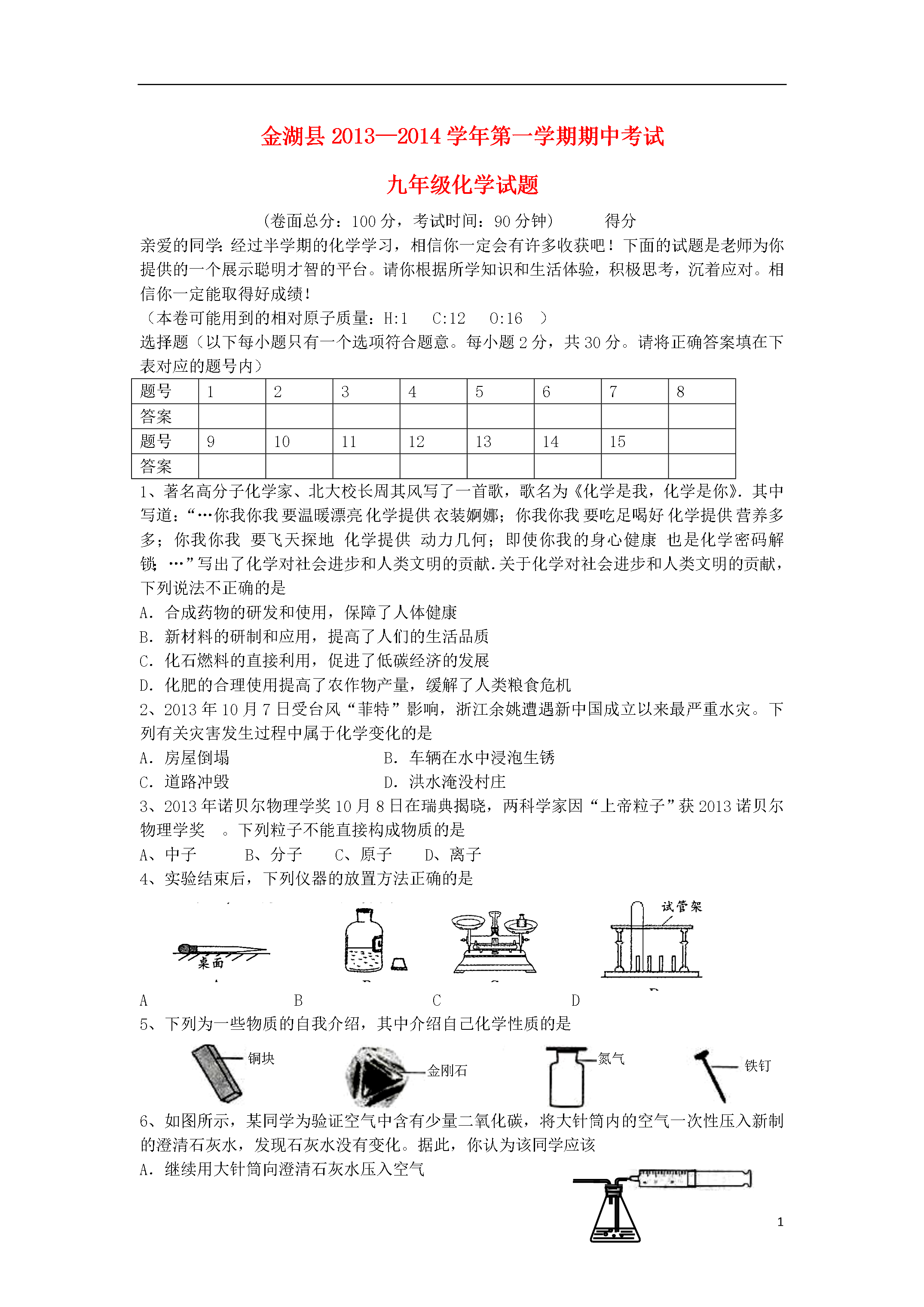 8金湖县2013—2014学年第一学期期中考试九年级化学试题(卷面总分:100分,考试时间:90分钟)得分亲爱的同学:经过半学期的化学学习,相信你一定会有许多收获吧!下面的试题是老师为你提供的一个展示聪明才智的平台。请你根据所学知识和生活体验,积极思考,沉着应对。相信你一定能取得好成绩!(本卷可能用到的相对原子质量:H:1C:12O:16)选择题(以下每小题只有一个选项符合题意。每小题2分,共30分。请将正确答案填在下表对应的题号内)题号12345678答案题号9101112131415答案1、著名高分子化学家、北大校长周其风写了一首歌,歌名为《化学是我,化学是你》.其中写道:“…你我你我要温暖漂亮化学提供衣装婀娜;你我你我要吃足喝好化学提供营养多多;你我你我要飞天探地化学提供动力几何;即使你我的身心健康也是化学密码解锁;…”写出了化学对社会进步和人类文明的贡献.关于化学对社会进步和人类文明的贡献,下列说法不正确的是A.合成药物的研发和使用,保障了人体健康B.新材料的研制和应用,提高了人们的生活品质C.化石燃料的直接利用,促进了低碳经济的发展D.化肥的合理使用提高了农作物产量,缓解了人类粮食危机2、2013年10月7日受台风“菲特”影响,浙江余姚遭遇新中国成立以来最严重水灾。下列有关灾害发生过程中属于化学变化的是A.房屋倒塌B.车辆在水中浸泡生锈C.道路冲毁D.洪水淹没村庄3、2013年诺贝尔物理学奖10月8日在瑞典揭晓,两科学家因“上帝粒子”获2013诺贝尔物理学奖。下列粒子不能直接构成物质的是A、中子B、分子C、原子D、离子4、实验结束后,下列仪器的放置方法正确的是ABCD5、下列为一些物质的自我介绍,其中介绍自己化学性质的是金刚石铜块氮气铁钉A.我是紫红色固体B.我在自然界中硬度最大C.我在常温下是气体D.我会生锈6、如图所示,某同学为验证空气中含有少量二氧化碳,将大针筒内的空气一次性压入新制的澄清石灰水,发现石灰水没有变化。据此,你认为该同学应该A.继续用大针筒向澄清石灰水压入空气B.撤去大针筒,用嘴向澄清石灰水吹气C.得出空气中没有二氧化碳的结论D.得出空气中含有少量二氧化碳的结论7、下列各项为小明同学记录的物质燃烧现象,与事实不相符的是A、铁丝在氧气中燃烧时,火星四射B、木炭在氧气中燃烧时,发出白光C、红磷在空气中燃烧时,产生大量白雾D、镁条在空气中燃烧时,发出耀眼的白光8、化学对人类的生活和社会发展做出了巨大的贡献.下列有关主题知识与应用不正确的是选项主题知识与应用A化学与生活防治骨质疏松﹣﹣服用钙片B化学与能源改善能源结构﹣﹣开发太阳能、氢能C化学与环境减少空气污染﹣﹣禁止使用煤等燃料D化学与安全进入久未开启的菜窖﹣﹣先做灯火试验9、分子是构成物质的一种粒子。下列有关水分子的叙述正确的是()A.电解水时,构成水分子的原子种类发生改变B.降温时水分子的化学性质发生改变C.受热时水分子的体积逐渐变大D.电解水生成氢气和氧气,说明水分子是可分的10、“花气袭人知骤暖,鹊声穿树喜新晴”描述了春天晴暖、鸟语花香的山村美景.下列从微观角度对“花气袭人知骤暖”的解释最合理的是A.微粒的体积小、质量轻B.微粒间有空隙C.微粒在不断运动D.温度越高,微粒运动越快11、实验室制取氧气的装置如图所示,下列有关叙述合理的是A.锥形瓶里加入少量MnO2粉末,分液漏斗里盛放6%双氧水B.锥形瓶里加入高锰酸钾固体,分液漏斗里盛放蒸馏水C.集满氧气的集气瓶从水槽里取出后倒放在桌面上D.当发生装置中液体与固体一接触产生了气泡即可收集12、“酒驾”是当前热门话题之一。交巡警检查驾驶员是否饮酒的仪器里装有K2Cr2O7,K2Cr2O7中Cr元素的化合价为A.+2价B.+5价C.+6价D.+7价13、下列事实与相应的解释不一致的是A.50mL酒精与50mL水混合在一起,总体积小于100mL,因为分子有质量B.浓氨水敞口放置一段时间后质量变小,因为分子在不断的运动C.气体易于压缩,因为构成气体的微粒间空隙较大D.空气是混合物,因为它是由氮气、氧气、二氧化碳等多种物质组成。14、火星大气中含有一种称为硫化羰(羰音tāng)的物质,其化学式为COS。已知硫化羰与二氧化碳的结构相似,但能在氧气中燃烧,下列有关硫化羰的说法正确的是A.硫化羰是氧化物B.硫化羰的化学性质与二氧化碳的化学性质完全相同C.硫化羰可用作灭火剂D.硫化羰是由碳元素、氧元素和硫元素三种元素组成的15、催化转化器可将汽车尾气中的有毒气体转化为无毒气体,发生反应的微观示意图为:下列从图示所获得的信息中,正确的是()A.图中有三种不同的氧化物B.该反应中分子和原子的种类都发生了改变C.反应过程中没有单质生成D.反应前后各元素化合价不变二、填空与简答题(本题包括6小题,共29分)16、(4分)根据