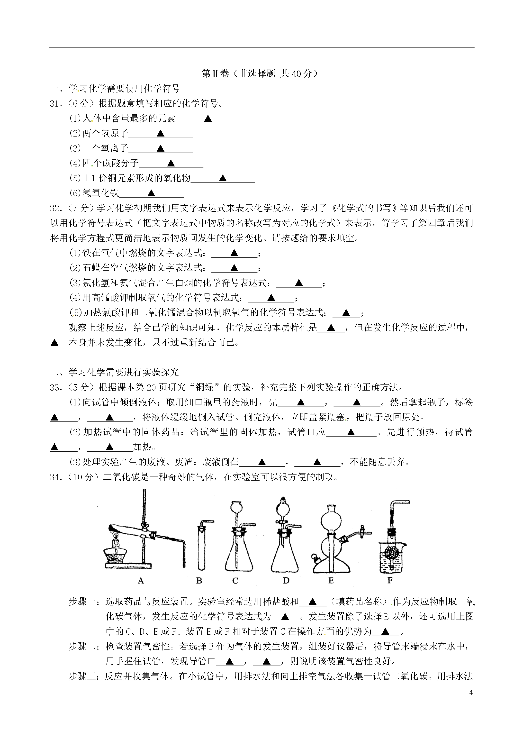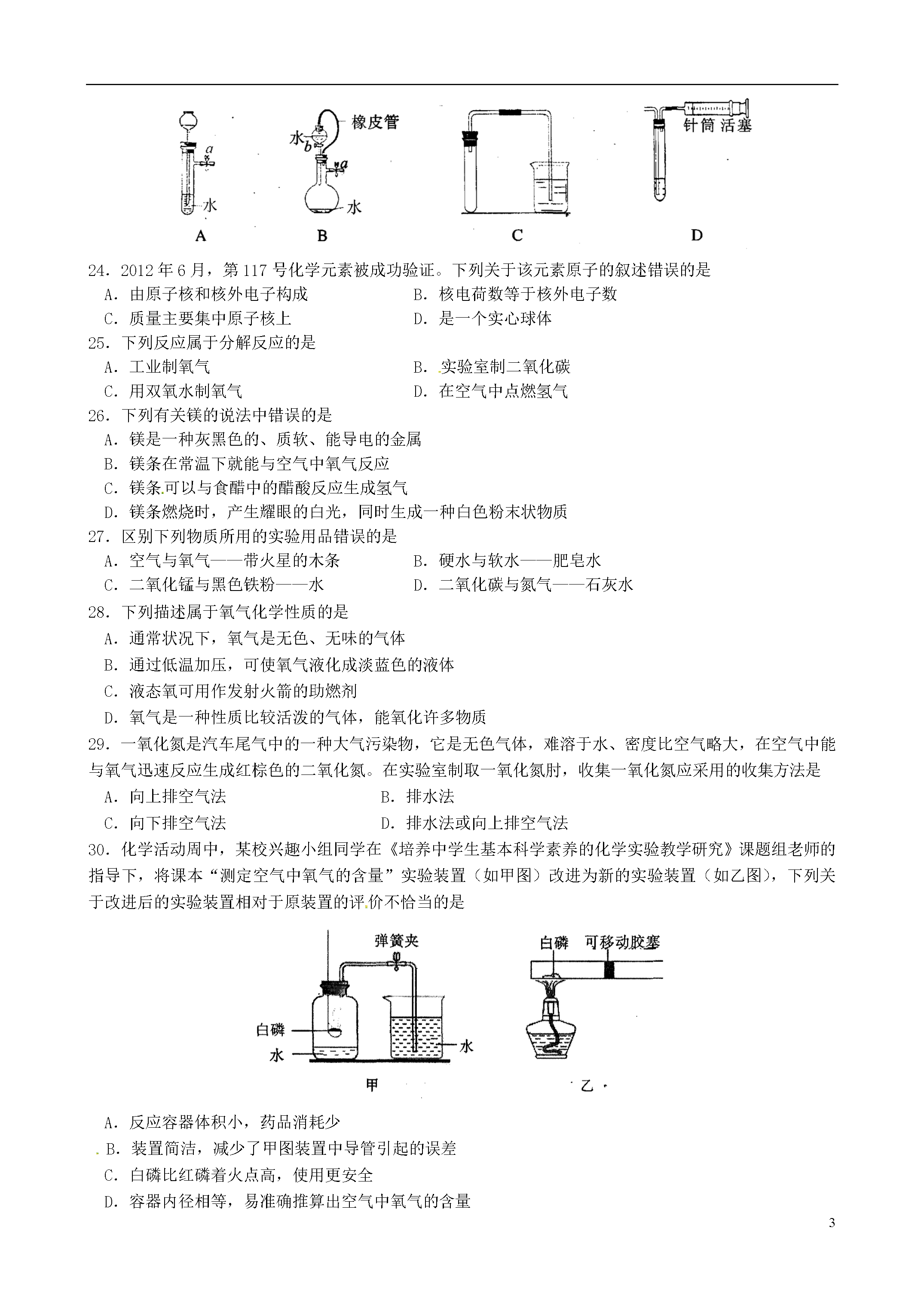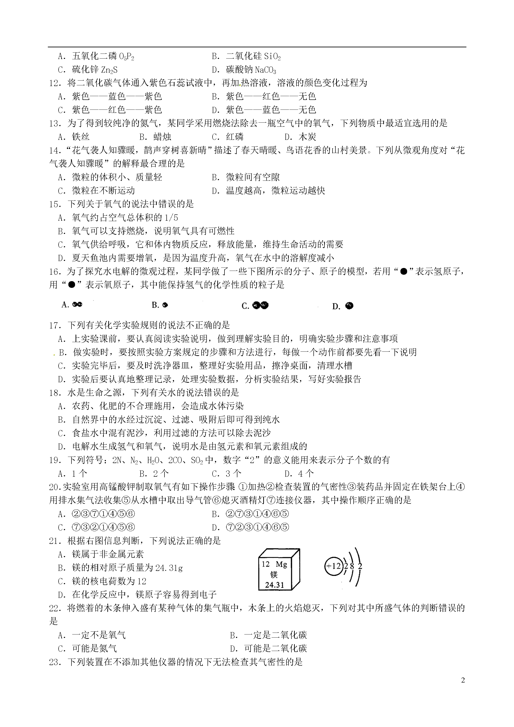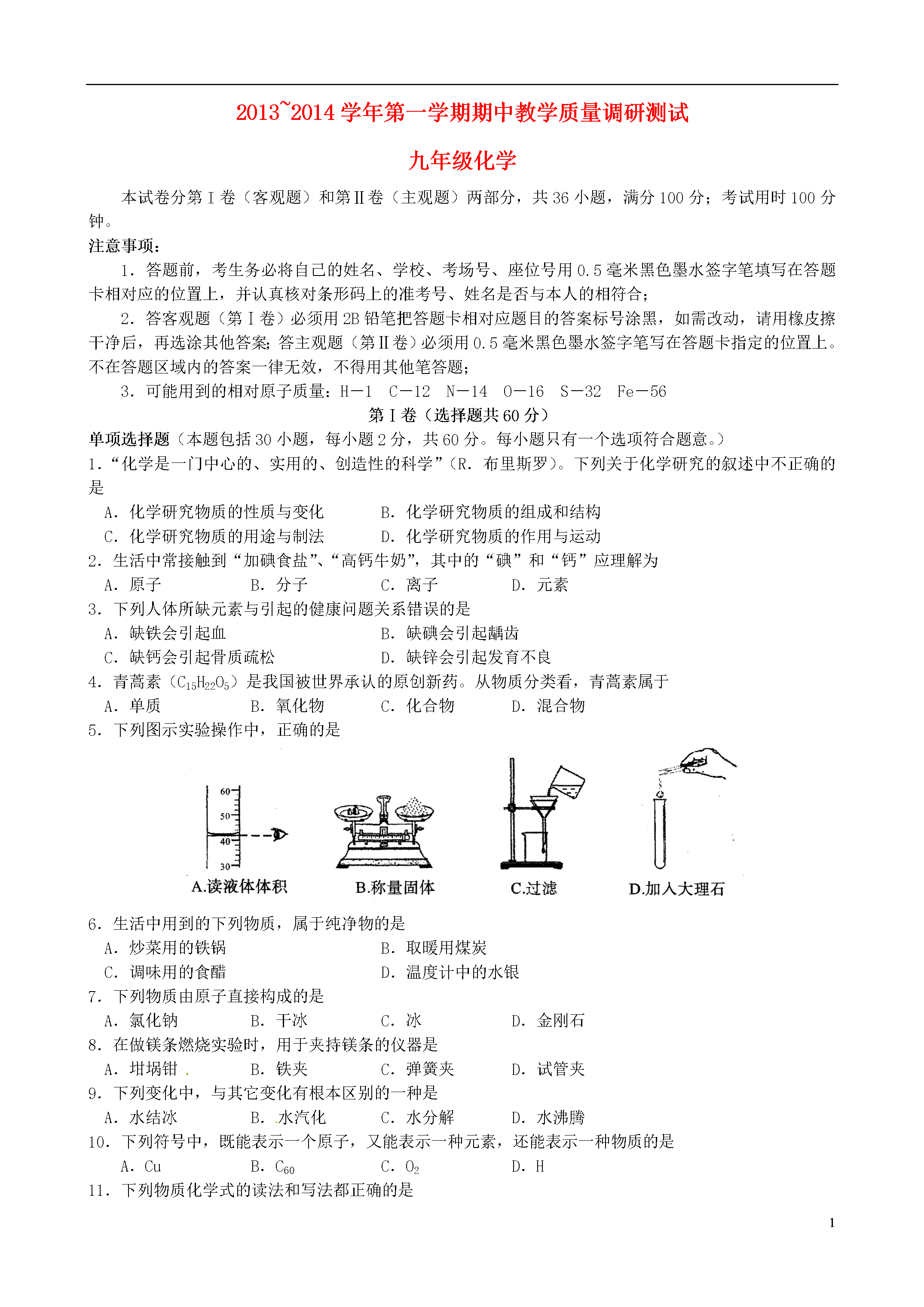 52013~2014学年第一学期期中教学质量调研测试九年级化学本试卷分第I卷(客观题)和第Ⅱ卷(主观题)两部分,共36小题,满分100分;考试用时100分钟。注意事项:1.答题前,考生务必将自己的姓名、学校、考场号、座位号用0.5毫米黑色墨水签字笔填写在答题卡相对应的位置上,并认真核对条形码上的准考号、姓名是否与本人的相符合;2.答客观题(第Ⅰ卷)必须用2B铅笔把答题卡相对应题目的答案标号涂黑,如需改动,请用橡皮擦干净后,再选涂其他答案;答主观题(第Ⅱ卷)必须用0.5毫米黑色墨水签字笔写在答题卡指定的位置上。不在答题区域内的答案一律无效,不得用其他笔答题;3.可能用到的相对原子质量:H-1C-12N-14O-16S-32Fe-56第Ⅰ卷(选择题共60分)单项选择题(本题包括30小题,每小题2分,共60分。每小题只有一个选项符合题意。)1.“化学是一门中心的、实用的、创造性的科学”(R.布里斯罗)。下列关于化学研究的叙述中不正确的是A.化学研究物质的性质与变化B.化学研究物质的组成和结构C.化学研究物质的用途与制法D.化学研究物质的作用与运动2.生活中常接触到“加碘食盐”、“高钙牛奶”,其中的“碘”和“钙”应理解为A.原子B.分子C.离子D.元素3.下列人体所缺元素与引起的健康问题关系错误的是A.缺铁会引起血B.缺碘会引起龋齿C.缺钙会引起骨质疏松D.缺锌会引起发育不良4.青蒿素(C15H22O5)是我国被世界承认的原创新药。从物质分类看,青蒿素属于A.单质B.氧化物C.化合物D.混合物5.下列图示实验操作中,正确的是6.生活中用到的下列物质,属于纯净物的是A.炒菜用的铁锅B.取暖用煤炭C.调味用的食醋D.温度计中的水银7.下列物质由原子直接构成的是A.氯化钠B.干冰C.冰D.金刚石8.在做镁条燃烧实验时,用于夹持镁条的仪器是A.坩埚钳B.铁夹C.弹簧夹D.试管夹9.下列变化中,与其它变化有根本区别的一种是A.水结冰B.水汽化C.水分解D.水沸腾10.下列符号中,既能表示一个原子,又能表示一种元素,还能表示一种物质的是A.CuB.C60C.O2D.H11.下列物质化学式的读法和写法都正确的是A.五氧化二磷O5P2B.二氧化硅SiO2C.硫化锌Zn2SD.碳酸钠NaCO312.将二氧化碳气体通入紫色石蕊试液中,再加热溶液,溶液的颜色变化过程为A.紫色——蓝色——紫色B.紫色——红色——无色C.紫色——红色——紫色D.紫色——蓝色——无色13.为了得到较纯净的氮气,某同学采用燃烧法除去一瓶空气中的氧气,下列物质中最适宜选用的是A.铁丝B.蜡烛C.红磷D.木炭14.“花气袭人知骤暖,鹊声穿树喜新晴”描述了春天晴暖、鸟语花香的山村美景。下列从微观角度对“花气袭人知骤暖”的解释最合理的是A.微粒的体积小、质量轻B.微粒间有空隙C.微粒在不断运动D.温度越高,微粒运动越快15.下列关于氧气的说法中错误的是A.氧气约占空气总体积的1/5B.氧气可以支持燃烧,说明氧气具有可燃性C.氧气供给呼吸,它和体内物质反应,释放能量,维持生命活动的需要D.夏天鱼池内需要增氧,是因为温度升高,氧气在水中的溶解度减小16.为了探究水电解的微观过程,某同学做了一些下图所示的分子、原子的模型,若用“●”表示氢原子,用“●”表示氧原子,其中能保持氢气的化学性质的粒子是17.下列有关化学实验规则的说法不正确的是A.上实验课前,要认真阅读实验说明,做到理解实验目的,明确实验步骤和注意事项B.做实验时,要按照实验方案规定的步骤和方法进行,每做一个动作前都要先看一下说明C.实验完毕后,要及时洗净器皿,整理好实验用品,擦净桌面,清理水槽D.实验后要认真地整理记录,处理实验数据,分析实验结果,写好实验报告18.水是生命之源,下列有关水的说法错误的是A.农药、化肥的不合理施用,会造成水体污染B.自然界中的水经过沉淀、过滤、吸附后即可得到纯水C.食盐水中混有泥沙,利用过滤的方法可以除去泥沙D.电解水生成氢气和氧气,说明水是由氢元素和氧元素组成的19.下列符号:2N、N2、H2O、2CO、SO2中,数字“2”的意义能用来表示分子个数的有A.1个B.2个C.3个D.4个20.实验室用高锰酸钾制取氧气有如下操作步骤:①加热②检查装置的气密性③装药品并固定在铁架台上④用排水集气法收集⑤从水槽中取出导气管⑥熄灭酒精灯⑦连接仪器,其中操作顺序正确的是A.②③⑦①④⑤⑥B.②⑦③①④⑥⑤C.⑦③②①④⑤⑥D.⑦②③①④⑥⑤21.根据右图信息判断,下列说法正确的是A.镁属于非金属元素B.镁的相对原子质量为24.31gC.镁的核电荷数为12D.在化学反应中,镁原子容易得到电子22.将燃着的木条伸入盛有某种气体的集气瓶中,木条上的火焰熄灭,下列对其中所盛气体的判断错误的是A.一定不是氧气B.一定是二氧